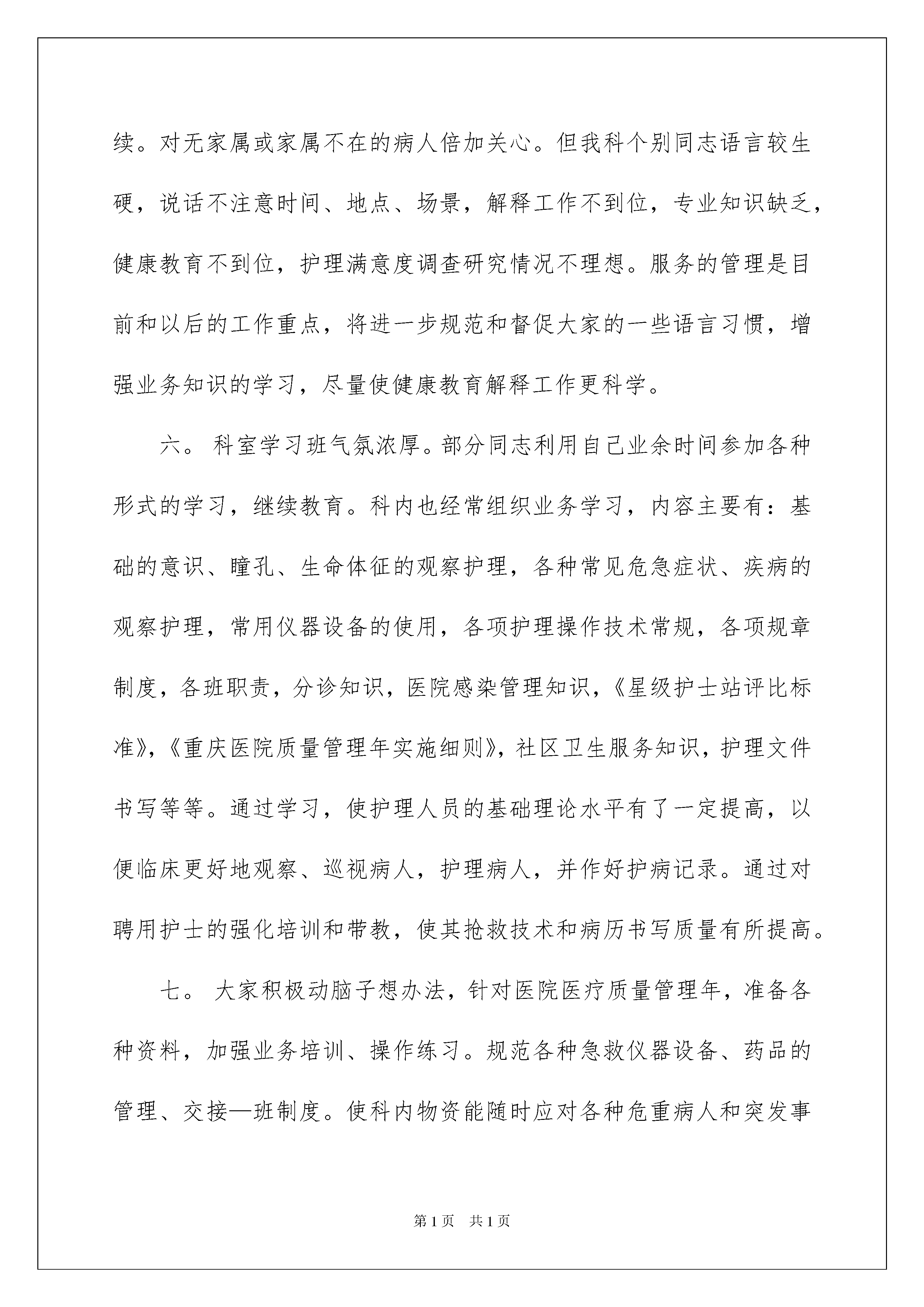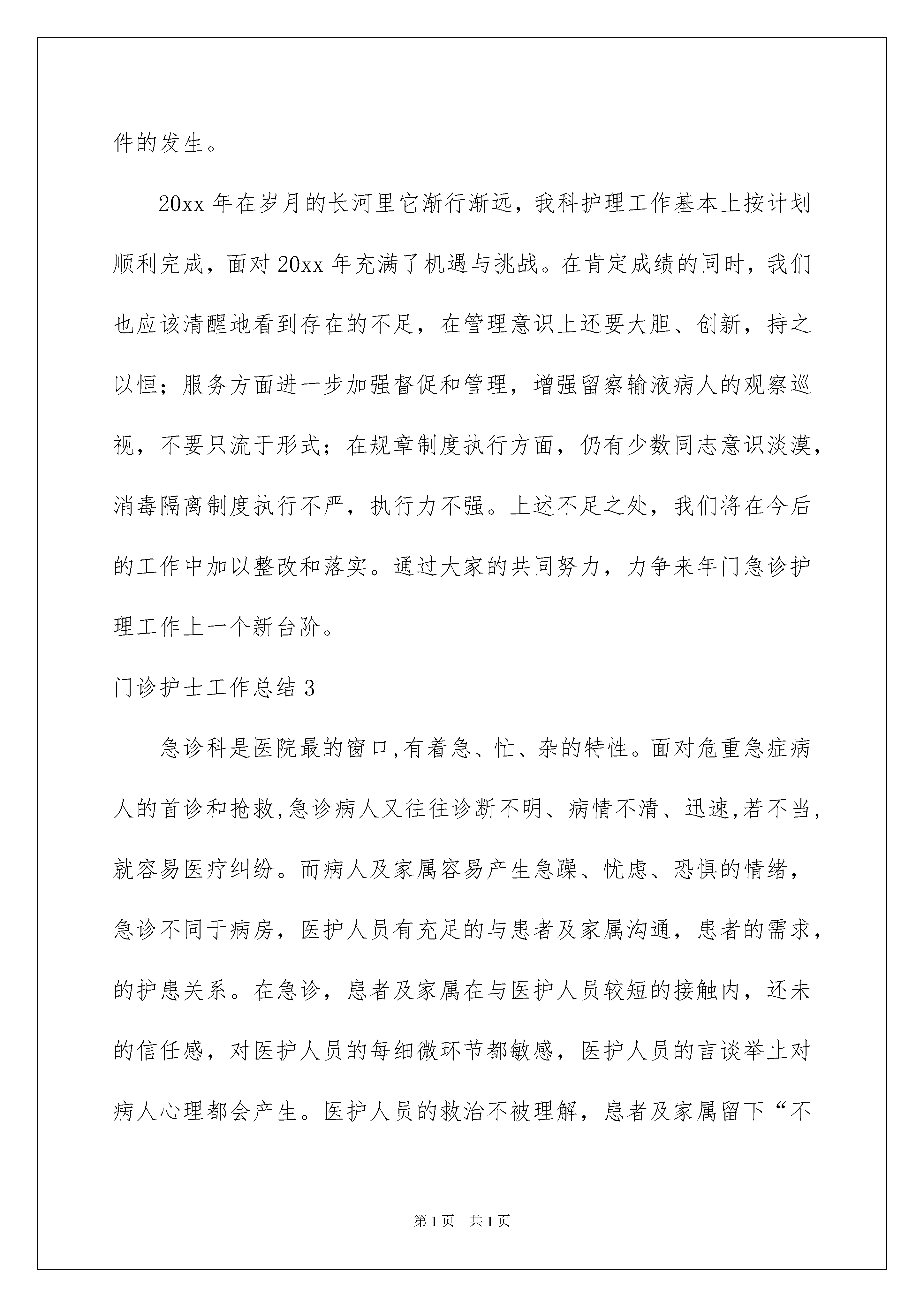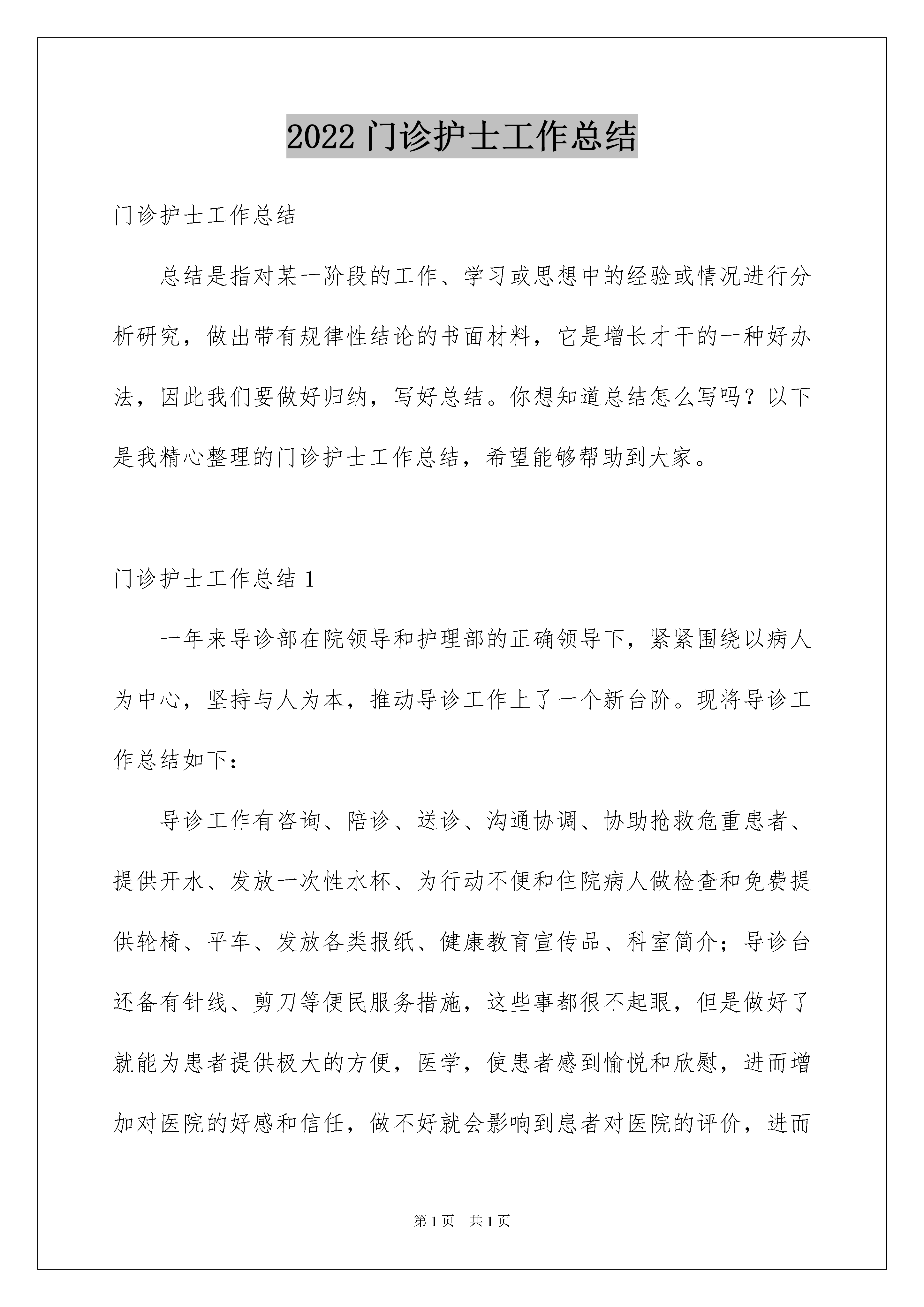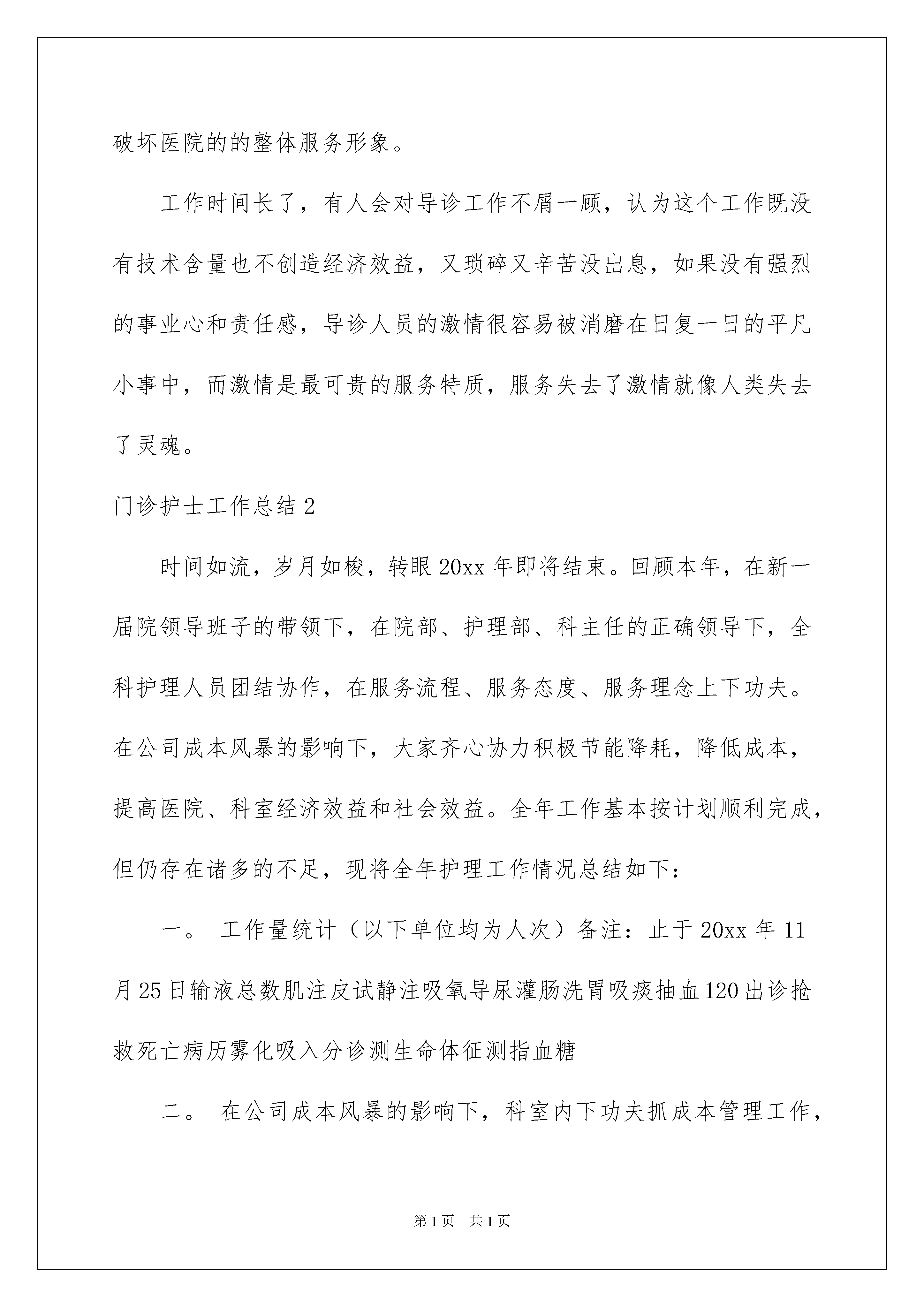2022门诊护士工作总结门诊护士工作总结总结是指对某一阶段的工作、学习或思想中的经验或情况进行分析研究,做出带有规律性结论的书面材料,它是增长才干的一种好办法,因此我们要做好归纳,写好总结。你想知道总结怎么写吗?以下是我精心整理的门诊护士工作总结,希望能够帮助到大家。门诊护士工作总结1一年来导诊部在院领导和护理部的正确领导下,紧紧围绕以病人为中心,坚持与人为本,推动导诊工作上了一个新台阶。现将导诊工作总结如下:导诊工作有咨询、陪诊、送诊、沟通协调、协助抢救危重患者、提供开水、发放一次性水杯、为行动不便和住院病人做检查和免费提供轮椅、平车、发放各类报纸、健康教育宣传品、科室简介;导诊台还备有针线、剪刀等便民服务措施,这些事都很不起眼,但是做好了就能为患者提供极大的方便,医学,使患者感到愉悦和欣慰,进而增加对医院的好感和信任,做不好就会影响到患者对医院的评价,进而破坏医院的的整体服务形象。工作时间长了,有人会对导诊工作不屑一顾,认为这个工作既没有技术含量也不创造经济效益,又琐碎又辛苦没出息,如果没有强烈的事业心和责任感,导诊人员的激情很容易被消磨在日复一日的平凡小事中,而激情是最可贵的服务特质,服务失去了激情就像人类失去了灵魂。门诊护士工作总结2时间如流,岁月如梭,转眼20xx年即将结束。回顾本年,在新一届院领导班子的带领下,在院部、护理部、科主任的正确领导下,全科护理人员团结协作,在服务流程、服务态度、服务理念上下功夫。在公司成本风暴的影响下,大家齐心协力积极节能降耗,降低成本,提高医院、科室经济效益和社会效益。全年工作基本按计划顺利完成,但仍存在诸多的不足,现将全年护理工作情况总结如下:一。工作量统计(以下单位均为人次)备注:止于20xx年11月25日输液总数肌注皮试静注吸氧导尿灌肠洗胃吸痰抽血120出诊抢救死亡病历雾化吸入分诊测生命体征测指血糖二。在公司成本风暴的影响下,科室内下功夫抓成本管理工作,尽量减少低值易耗品的领用。每个人都从节约一滴水。一度电。一张纸出发,人走灯灭电扇空调关。随手关门窗。防火防盗。三。全体护理人员认真学习"5。7振兴行动计划"讲话内容,随着市医保制度的改革和公司对医院剥离分流步伐力度的加大,大家的危机意识大大增强,积极想法,节能降耗,改善服务态度,学习市医保相关知识,树立新形象,为科室为医院提高经济和社会效益。四。在迎接"五里店社区卫生服务中心"的检查工作中,大家团结一心,作好各项资料的准备,如完成社区居民基本健康调查工作。刻苦练习操作技术。围绕检查工作,完成治疗室的搬迁改造工作。进一步规范输液操作规程、留察输液病人观察记录单的书写、各种消毒剂的使用和登记、医用垃圾的处理等等。积极学习"五里店社区卫生服务中心"的相关知识,并作好宣传工作。协助"富强村社区卫生服务中心"创建和工作的开展。积极作好检查团到来的迎接工作和被查工作。五。科室下功夫抓服务质量、服务态度。大多数同志的服务意识,服务观念有所转变,主动服务台的意识也正在形成。大家尽量为病人着想,减轻病人的经济负担,减少病人来回跑路。开设绿色通道,重危病人先抢救,帮助其交费、拿药、护送检查、住院,后补办相关手续。对无家属或家属不在的病人倍加关心。但我科个别同志语言较生硬,说话不注意时间、地点、场景,解释工作不到位,专业知识缺乏,健康教育不到位,护理满意度调查研究情况不理想。服务的管理是目前和以后的工作重点,将进一步规范和督促大家的一些语言习惯,增强业务知识的学习,尽量使健康教育解释工作更科学。六。科室学习班气氛浓厚。部分同志利用自己业余时间参加各种形式的学习,继续教育。科内也经常组织业务学习,内容主要有:基础的意识、瞳孔、生命体征的观察护理,各种常见危急症状、疾病的观察护理,常用仪器设备的使用,各项护理操作技术常规,各项规章制度,各班职责,分诊知识,医院感染管理知识,《星级护士站评比标准》,《重庆医院质量管理年实施细则》,社区卫生服务知识,护理文件书写等等。通过学习,使护理人员的基础理论水平有了一定提高,以便临床更好地观察、巡视病人,护理病人,并作好护病记录。通过对聘用护士的强化培训和带教,使其抢救技术和病历书写质量有所提高。七。大家积极动脑子想办法,针对医院医疗质量管理年,准备各种资料,加强业务培训、操作练习。规范各种急救仪器设备、药品的管理、交接—班制度。使科内物资能随时应对各种危重病人和突发事件的发生。20xx年在岁月的长河里它渐行渐远,我科护理工作基本上按计划顺利完成,面对20xx年充满了机遇与挑战。在肯定成绩的同时,我们也应该清醒地看到存在的不足,在管理意识上还要大胆、创新,持之以恒;