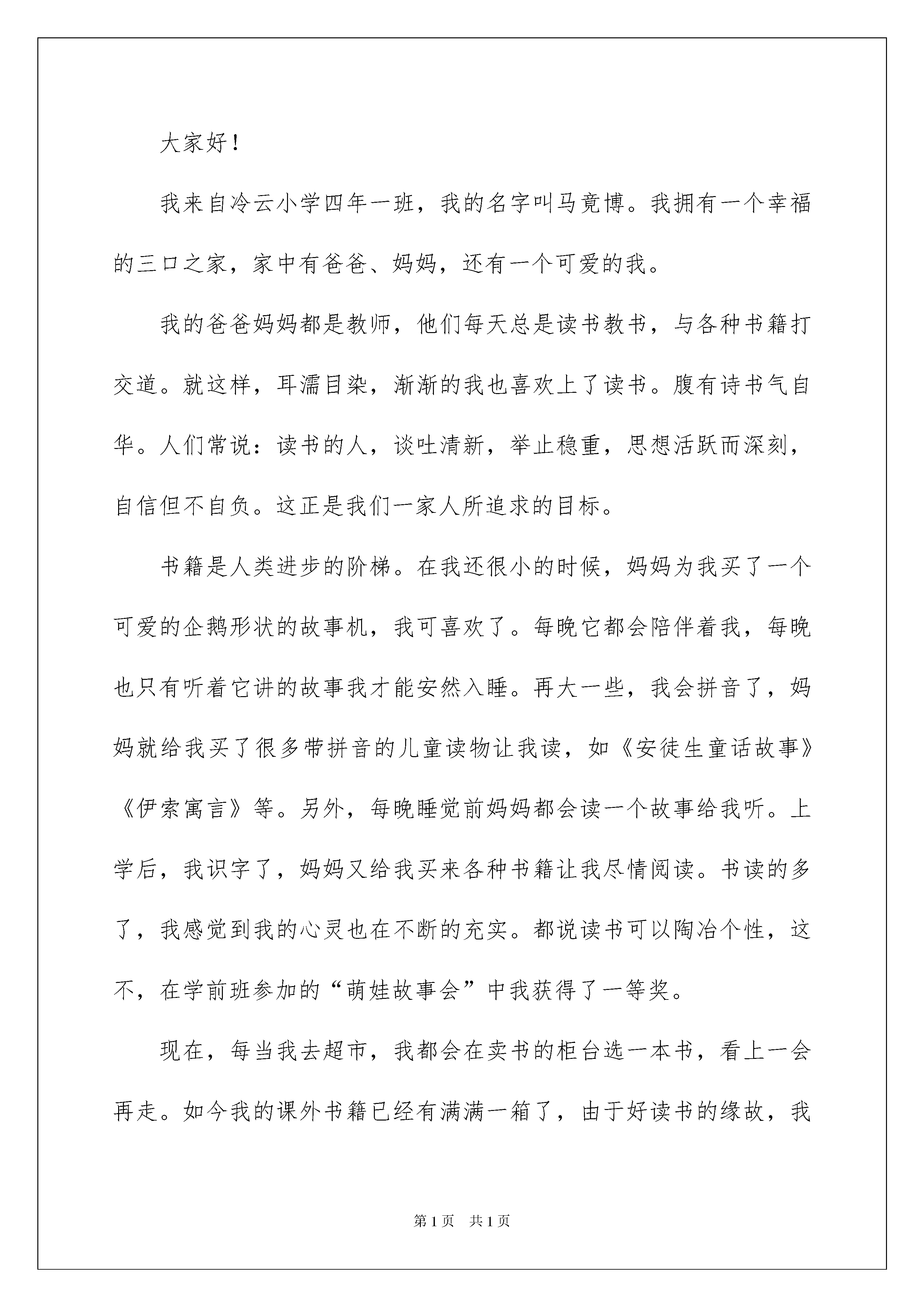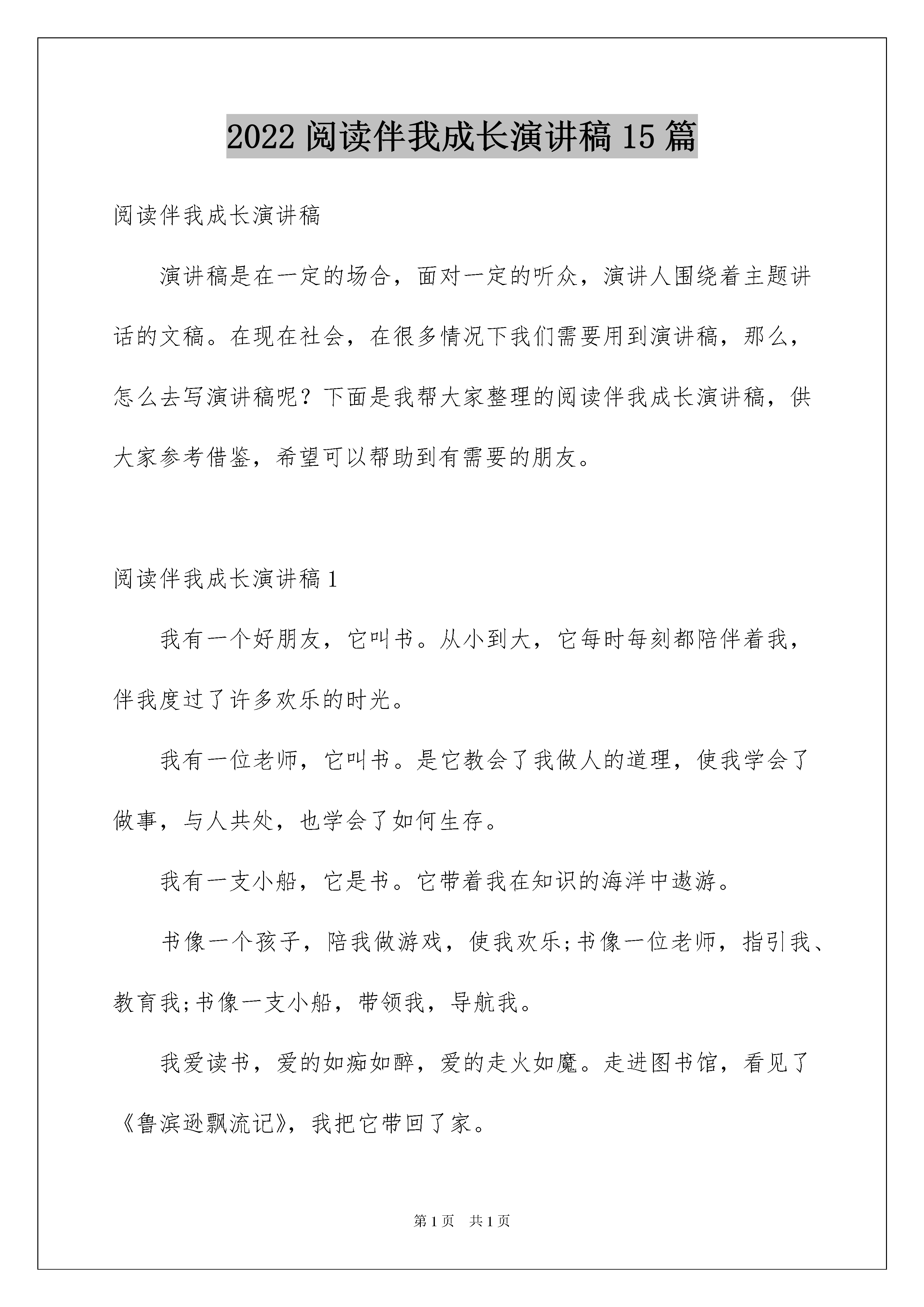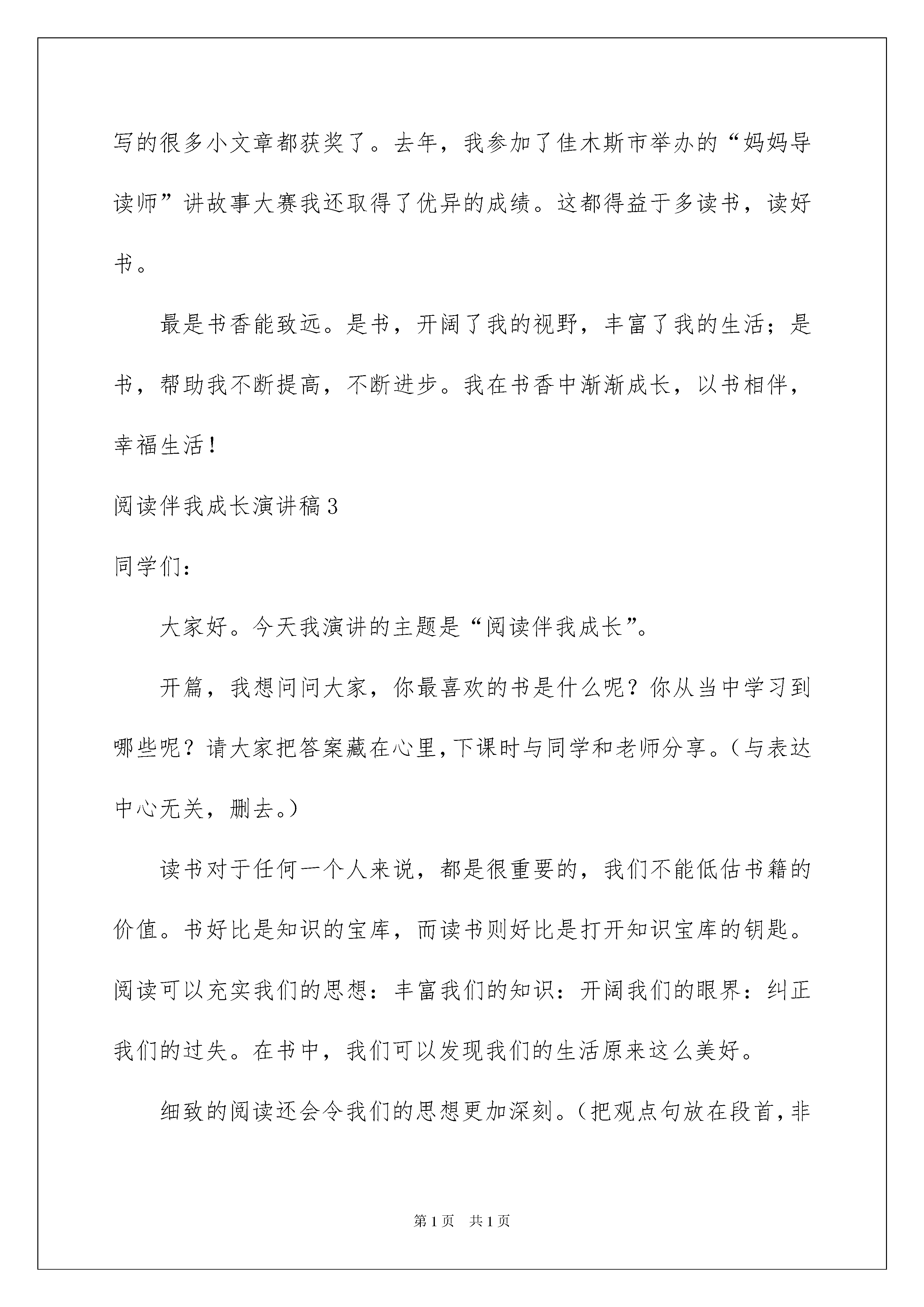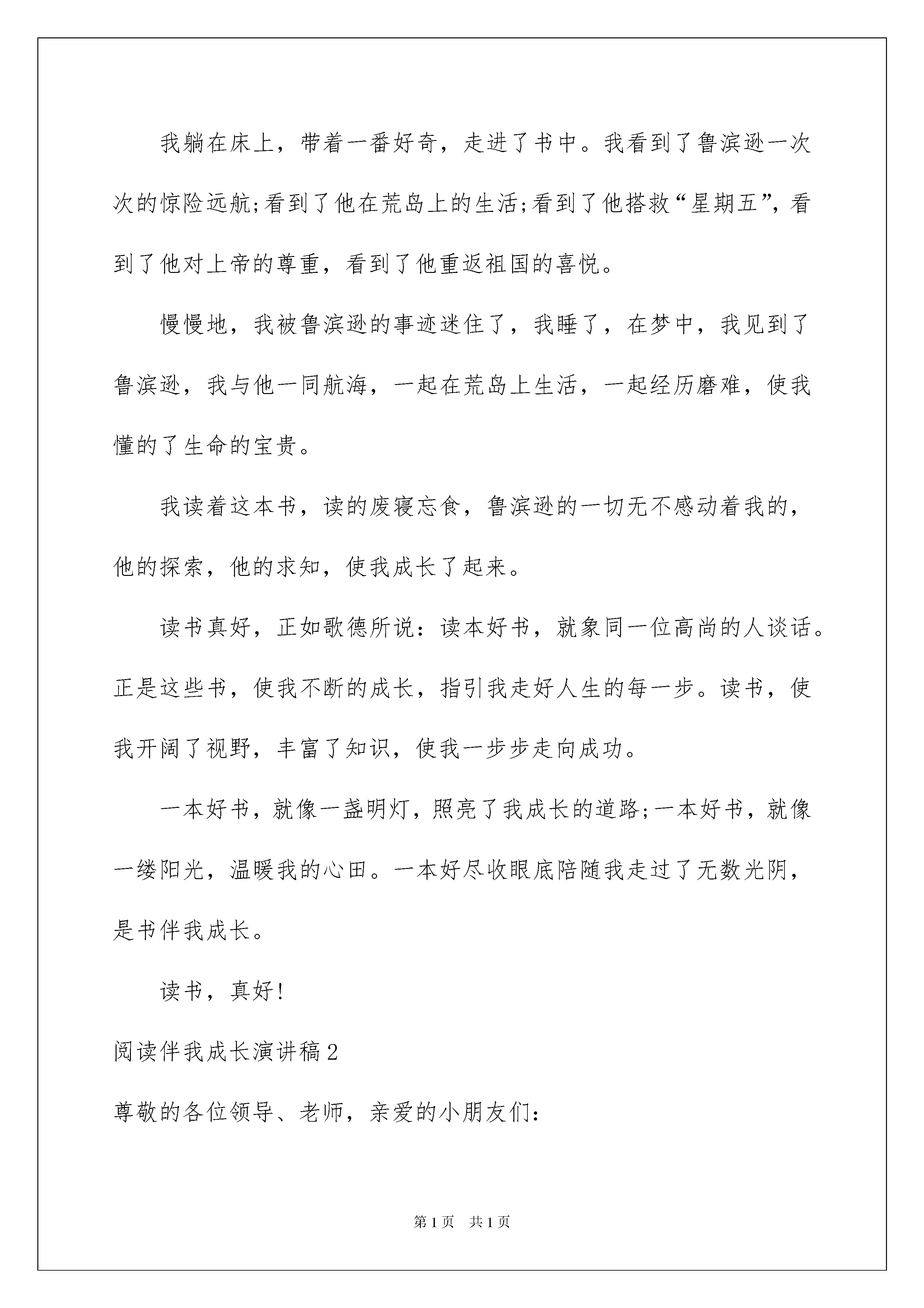 2022阅读伴我成长演讲稿15篇阅读伴我成长演讲稿演讲稿是在一定的场合,面对一定的听众,演讲人围绕着主题讲话的文稿。在现在社会,在很多情况下我们需要用到演讲稿,那么,怎么去写演讲稿呢?下面是我帮大家整理的阅读伴我成长演讲稿,供大家参考借鉴,希望可以帮助到有需要的朋友。阅读伴我成长演讲稿1我有一个好朋友,它叫书。从小到大,它每时每刻都陪伴着我,伴我度过了许多欢乐的时光。我有一位老师,它叫书。是它教会了我做人的道理,使我学会了做事,与人共处,也学会了如何生存。我有一支小船,它是书。它带着我在知识的海洋中遨游。书像一个孩子,陪我做游戏,使我欢乐;书像一位老师,指引我、教育我;书像一支小船,带领我,导航我。我爱读书,爱的如痴如醉,爱的走火如魔。走进图书馆,看见了《鲁滨逊飘流记》,我把它带回了家。我躺在床上,带着一番好奇,走进了书中。我看到了鲁滨逊一次次的惊险远航;看到了他在荒岛上的生活;看到了他搭救“星期五”,看到了他对上帝的尊重,看到了他重返祖国的喜悦。慢慢地,我被鲁滨逊的事迹迷住了,我睡了,在梦中,我见到了鲁滨逊,我与他一同航海,一起在荒岛上生活,一起经历磨难,使我懂的了生命的宝贵。我读着这本书,读的废寝忘食,鲁滨逊的一切无不感动着我的,他的探索,他的求知,使我成长了起来。读书真好,正如歌德所说:读本好书,就象同一位高尚的人谈话。正是这些书,使我不断的成长,指引我走好人生的每一步。读书,使我开阔了视野,丰富了知识,使我一步步走向成功。一本好书,就像一盏明灯,照亮了我成长的道路;一本好书,就像一缕阳光,温暖我的心田。一本好尽收眼底陪随我走过了无数光阴,是书伴我成长。读书,真好!阅读伴我成长演讲稿2尊敬的各位领导、老师,亲爱的小朋友们:大家好!我来自冷云小学四年一班,我的名字叫马竟博。我拥有一个幸福的三口之家,家中有爸爸、妈妈,还有一个可爱的我。我的爸爸妈妈都是教师,他们每天总是读书教书,与各种书籍打交道。就这样,耳濡目染,渐渐的我也喜欢上了读书。腹有诗书气自华。人们常说:读书的人,谈吐清新,举止稳重,思想活跃而深刻,自信但不自负。这正是我们一家人所追求的目标。书籍是人类进步的阶梯。在我还很小的时候,妈妈为我买了一个可爱的企鹅形状的故事机,我可喜欢了。每晚它都会陪伴着我,每晚也只有听着它讲的故事我才能安然入睡。再大一些,我会拼音了,妈妈就给我买了很多带拼音的儿童读物让我读,如《安徒生童话故事》《伊索寓言》等。另外,每晚睡觉前妈妈都会读一个故事给我听。上学后,我识字了,妈妈又给我买来各种书籍让我尽情阅读。书读的多了,我感觉到我的心灵也在不断的充实。都说读书可以陶冶个性,这不,在学前班参加的“萌娃故事会”中我获得了一等奖。现在,每当我去超市,我都会在卖书的柜台选一本书,看上一会再走。如今我的课外书籍已经有满满一箱了,由于好读书的缘故,我写的很多小文章都获奖了。去年,我参加了佳木斯市举办的“妈妈导读师”讲故事大赛我还取得了优异的成绩。这都得益于多读书,读好书。最是书香能致远。是书,开阔了我的视野,丰富了我的生活;是书,帮助我不断提高,不断进步。我在书香中渐渐成长,以书相伴,幸福生活!阅读伴我成长演讲稿3同学们:大家好。今天我演讲的主题是“阅读伴我成长”。开篇,我想问问大家,你最喜欢的书是什么呢?你从当中学习到哪些呢?请大家把答案藏在心里,下课时与同学和老师分享。(与表达中心无关,删去。)读书对于任何一个人来说,都是很重要的,我们不能低估书籍的价值。书好比是知识的宝库,而读书则好比是打开知识宝库的钥匙。阅读可以充实我们的思想:丰富我们的知识:开阔我们的眼界:纠正我们的过失。在书中,我们可以发现我们的生活原来这么美好。细致的阅读还会令我们的思想更加深刻。(把观点句放在段首,非常好。)举一个我的例子吧:那时我还小,读书往往都是一目十行,只求赶快读完书,再让妈妈去买一本新的。所以到了现在,我应经积累了整整一书柜的书了,但是每次只是粗略地看,知识大都没有进入脑子,所以写出来的语言都是干巴巴的,缺少灵魂,作文水平一直停留在原地。有一次,老师上课讲了一篇很枯燥的文章,但却能从文中价格出很多深刻的道理,联想到很多相关知识点。从那时起,我懂得了,看完书并不算真正的阅读,还要有所思考。渐渐地,我读书越来越细,总会体会其中的内涵,越来越多的知识进入了我的脑海,作文水平也因此提高了不少。(这个事例并不是说明阅读让“我”懂得了,而是老师的讲解让我懂得了。建议:前面部分删去,一句话概括从老师那里得知了这个道理,然后重点写自己在阅读实践中是如何验证了它的正确性,并因此而收获了哪些成长和变化。)在阅读好的书籍中,我们