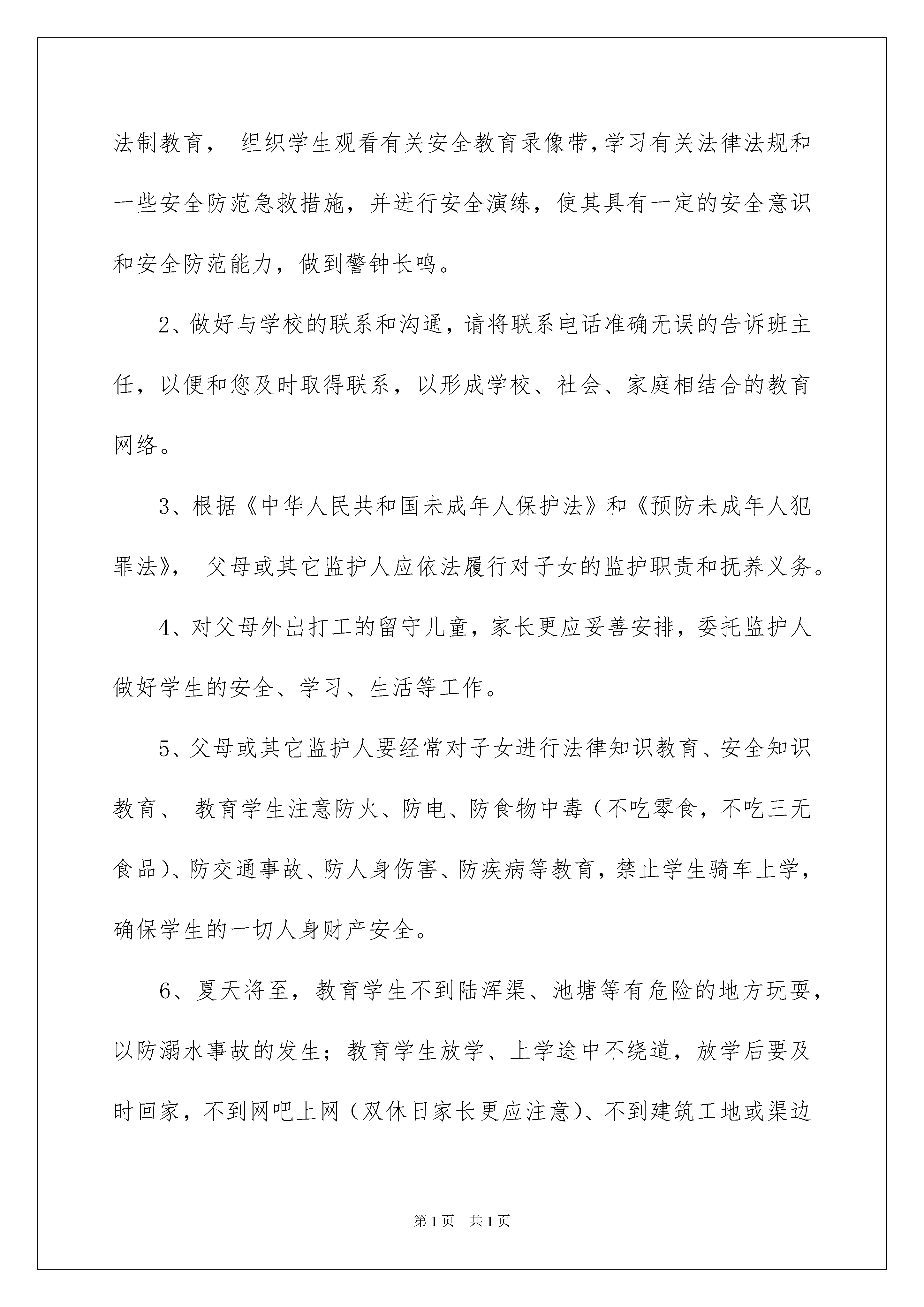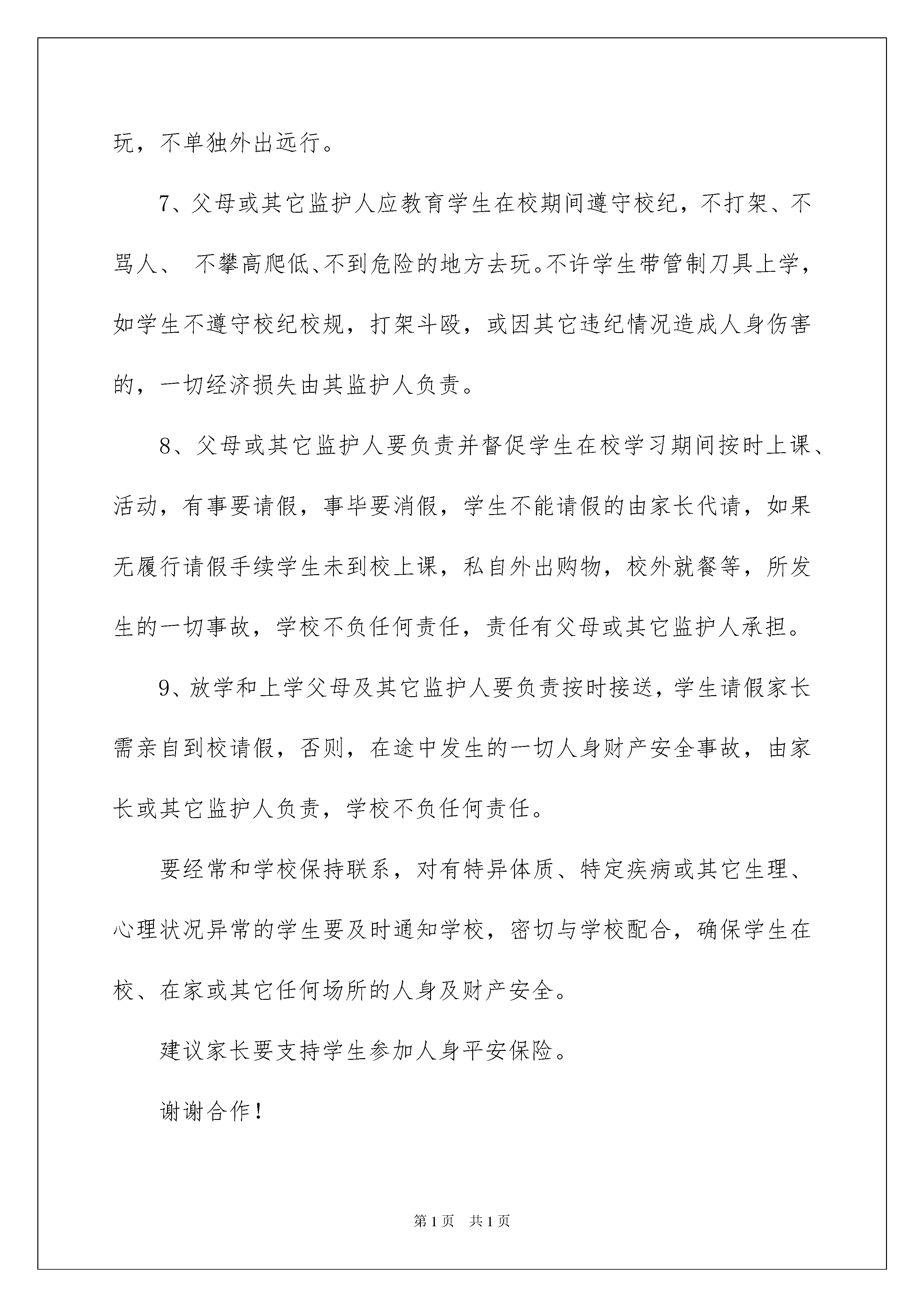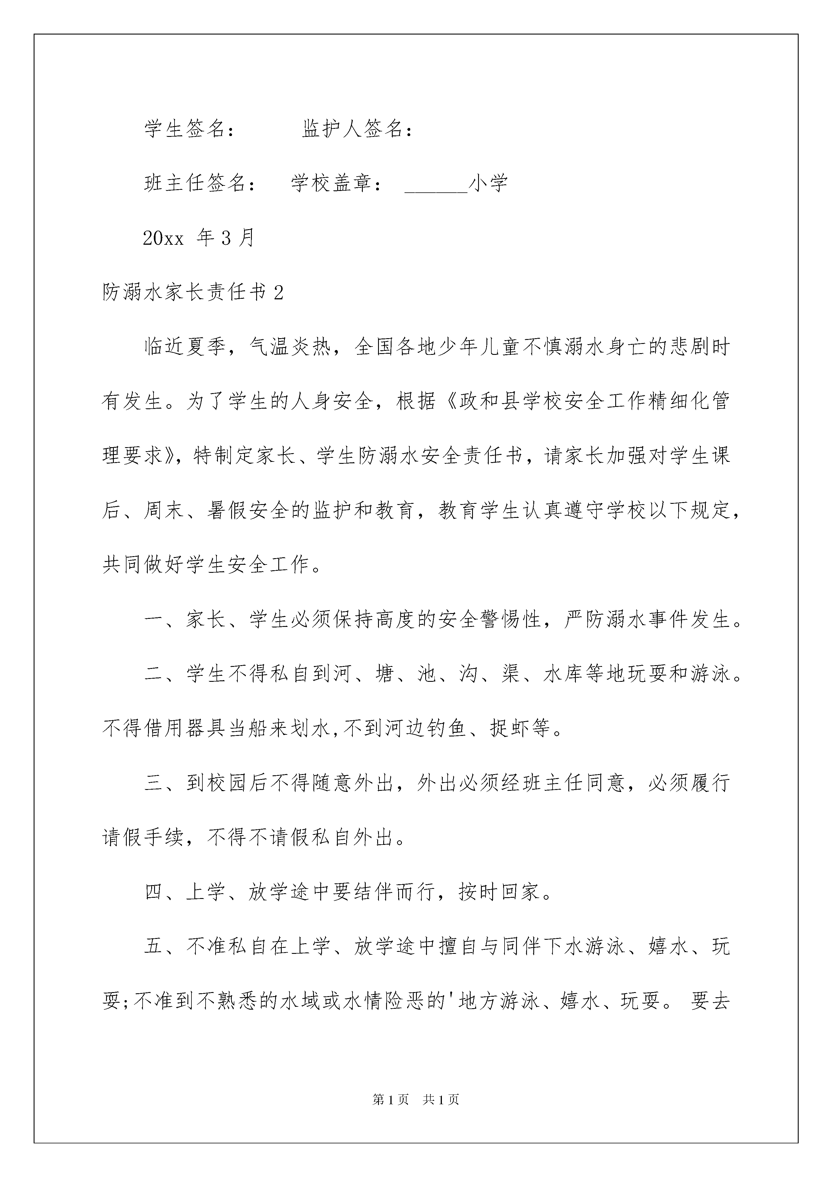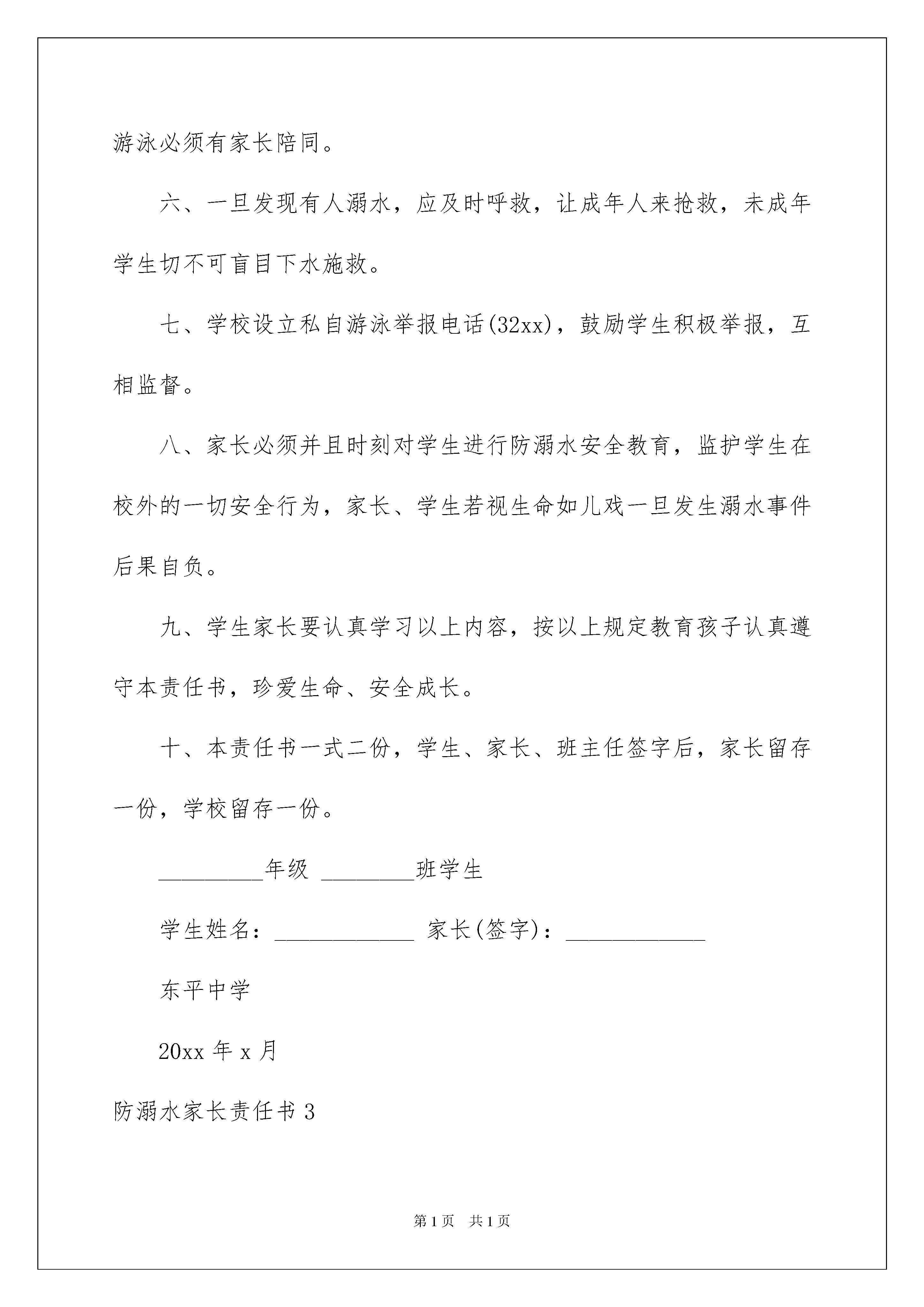 2022防溺水家长责任书防溺水家长责任书在现实社会中,大家逐渐认识到责任书的重要性,通过签订责任书,我们可以清楚地认识到自己的责任和职责。拟定责任书的注意事项有许多,你确定会写吗?以下是我整理的防溺水家长责任书,希望能够帮助到大家。防溺水家长责任书1贵家长同志:学生是家庭的希望,祖国的未来,与学校共同教育好自己的孩子是每个家长应尽的责任和义务;让每一个学生都健康成长,早日成为国家栋梁,也是学校和家长共同的愿望。安全重于泰山,是学校工作的重中之重,为进一步加强学生安全管理工作,建立健全安全管理制度,使安全防范措施落到实处,切实保障广大师生的生命安全和学校财产安全,为青少年健康成长创造良好的环境,学校特与家长签订学生人身安全责任书。1、学校要经常对学生进行安全教育、文明礼貌教育、道德教育、法制教育,组织学生观看有关安全教育录像带,学习有关法律法规和一些安全防范急救措施,并进行安全演练,使其具有一定的安全意识和安全防范能力,做到警钟长鸣。2、做好与学校的联系和沟通,请将联系电话准确无误的告诉班主任,以便和您及时取得联系,以形成学校、社会、家庭相结合的教育网络。3、根据《中华人民共和国未成年人保护法》和《预防未成年人犯罪法》,父母或其它监护人应依法履行对子女的监护职责和抚养义务。4、对父母外出打工的留守儿童,家长更应妥善安排,委托监护人做好学生的安全、学习、生活等工作。5、父母或其它监护人要经常对子女进行法律知识教育、安全知识教育、教育学生注意防火、防电、防食物中毒(不吃零食,不吃三无食品)、防交通事故、防人身伤害、防疾病等教育,禁止学生骑车上学,确保学生的一切人身财产安全。6、夏天将至,教育学生不到陆浑渠、池塘等有危险的地方玩耍,以防溺水事故的发生;教育学生放学、上学途中不绕道,放学后要及时回家,不到网吧上网(双休日家长更应注意)、不到建筑工地或渠边玩,不单独外出远行。7、父母或其它监护人应教育学生在校期间遵守校纪,不打架、不骂人、不攀高爬低、不到危险的地方去玩。不许学生带管制刀具上学,如学生不遵守校纪校规,打架斗殴,或因其它违纪情况造成人身伤害的,一切经济损失由其监护人负责。8、父母或其它监护人要负责并督促学生在校学习期间按时上课、活动,有事要请假,事毕要消假,学生不能请假的由家长代请,如果无履行请假手续学生未到校上课,私自外出购物,校外就餐等,所发生的一切事故,学校不负任何责任,责任有父母或其它监护人承担。9、放学和上学父母及其它监护人要负责按时接送,学生请假家长需亲自到校请假,否则,在途中发生的一切人身财产安全事故,由家长或其它监护人负责,学校不负任何责任。要经常和学校保持联系,对有特异体质、特定疾病或其它生理、心理状况异常的学生要及时通知学校,密切与学校配合,确保学生在校、在家或其它任何场所的人身及财产安全。建议家长要支持学生参加人身平安保险。谢谢合作!学生签名:监护人签名:班主任签名:学校盖章:______小学20xx年3月防溺水家长责任书2临近夏季,气温炎热,全国各地少年儿童不慎溺水身亡的悲剧时有发生。为了学生的人身安全,根据《政和县学校安全工作精细化管理要求》,特制定家长、学生防溺水安全责任书,请家长加强对学生课后、周末、暑假安全的监护和教育,教育学生认真遵守学校以下规定,共同做好学生安全工作。一、家长、学生必须保持高度的安全警惕性,严防溺水事件发生。二、学生不得私自到河、塘、池、沟、渠、水库等地玩耍和游泳。不得借用器具当船来划水,不到河边钓鱼、捉虾等。三、到校园后不得随意外出,外出必须经班主任同意,必须履行请假手续,不得不请假私自外出。四、上学、放学途中要结伴而行,按时回家。五、不准私自在上学、放学途中擅自与同伴下水游泳、嬉水、玩耍;不准到不熟悉的水域或水情险恶的'地方游泳、嬉水、玩耍。要去游泳必须有家长陪同。六、一旦发现有人溺水,应及时呼救,让成年人来抢救,未成年学生切不可盲目下水施救。七、学校设立私自游泳举报电话(32xx),鼓励学生积极举报,互相监督。八、家长必须并且时刻对学生进行防溺水安全教育,监护学生在校外的一切安全行为,家长、学生若视生命如儿戏一旦发生溺水事件后果自负。九、学生家长要认真学习以上内容,按以上规定教育孩子认真遵守本责任书,珍爱生命、安全成长。十、本责任书一式二份,学生、家长、班主任签字后,家长留存一份,学校留存一份。_________年级________班学生学生姓名:____________家长(签字):____________东平中学20xx年x月防溺水家长责任书3尊敬的家长朋友:您好!目前已进入夏季,是学生溺水事件的高发期,务必引