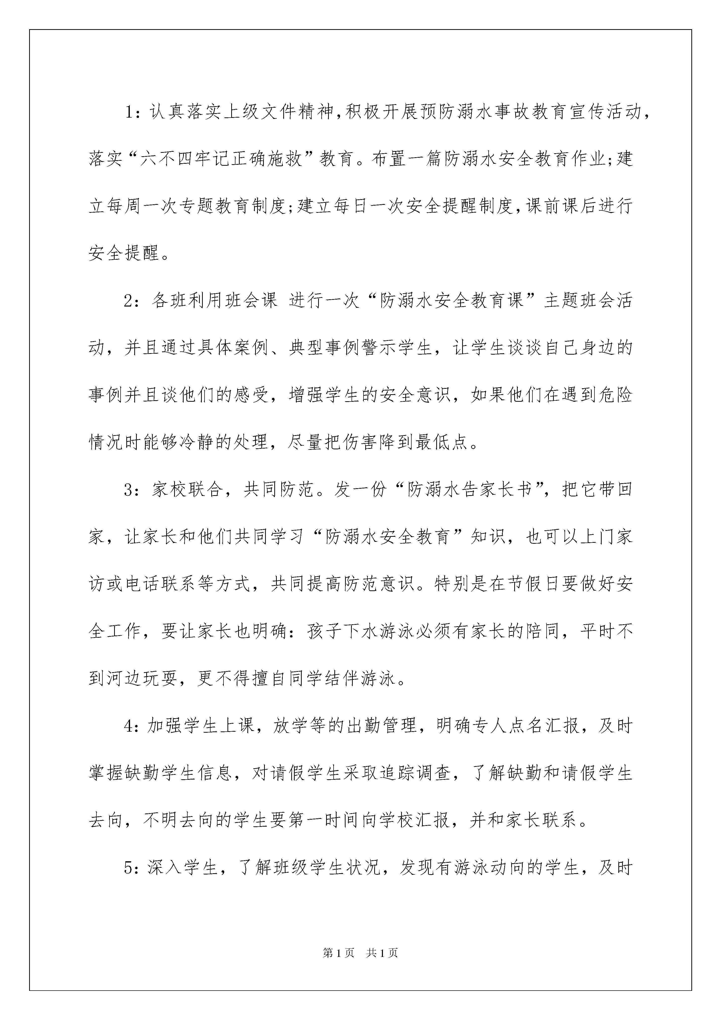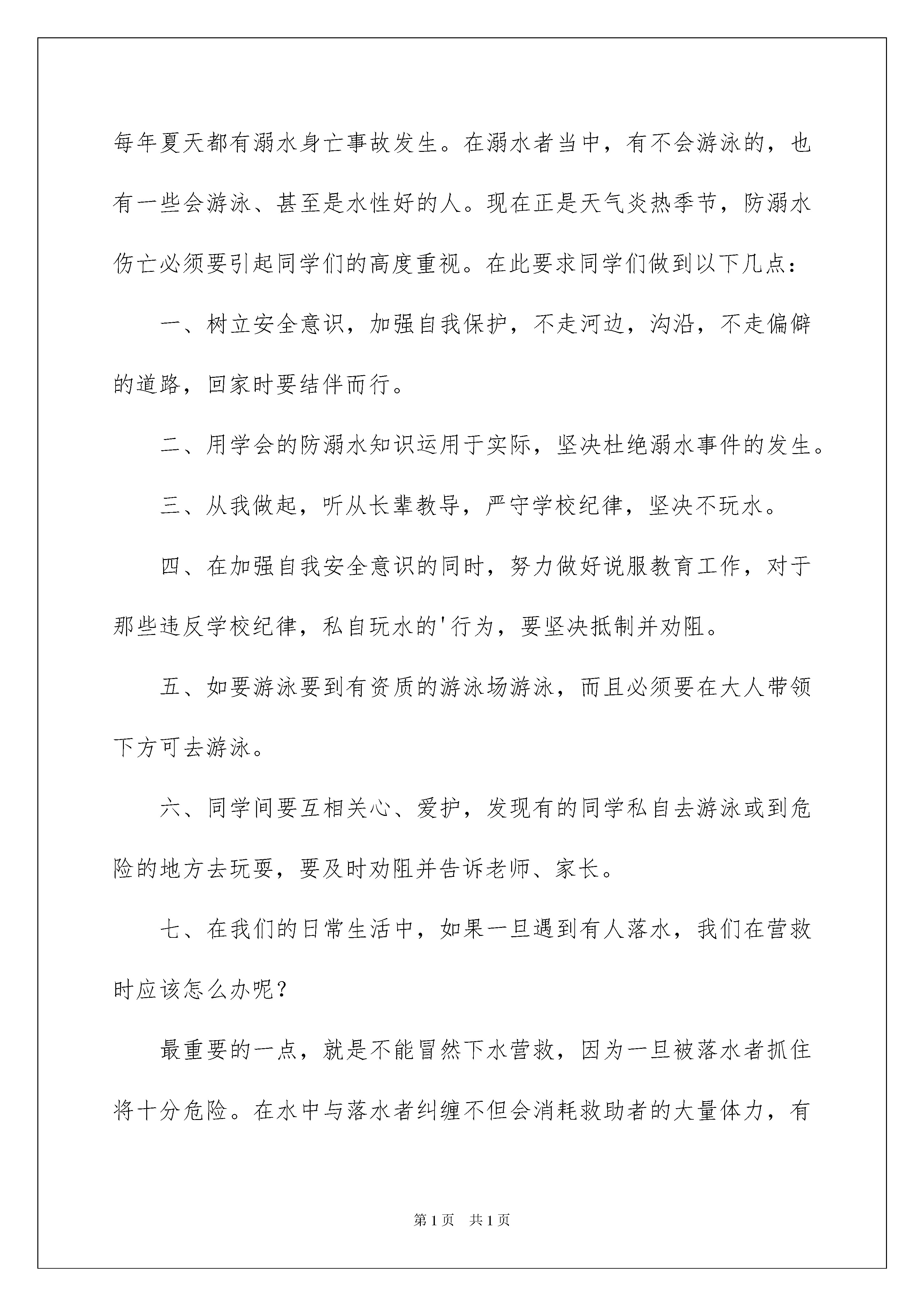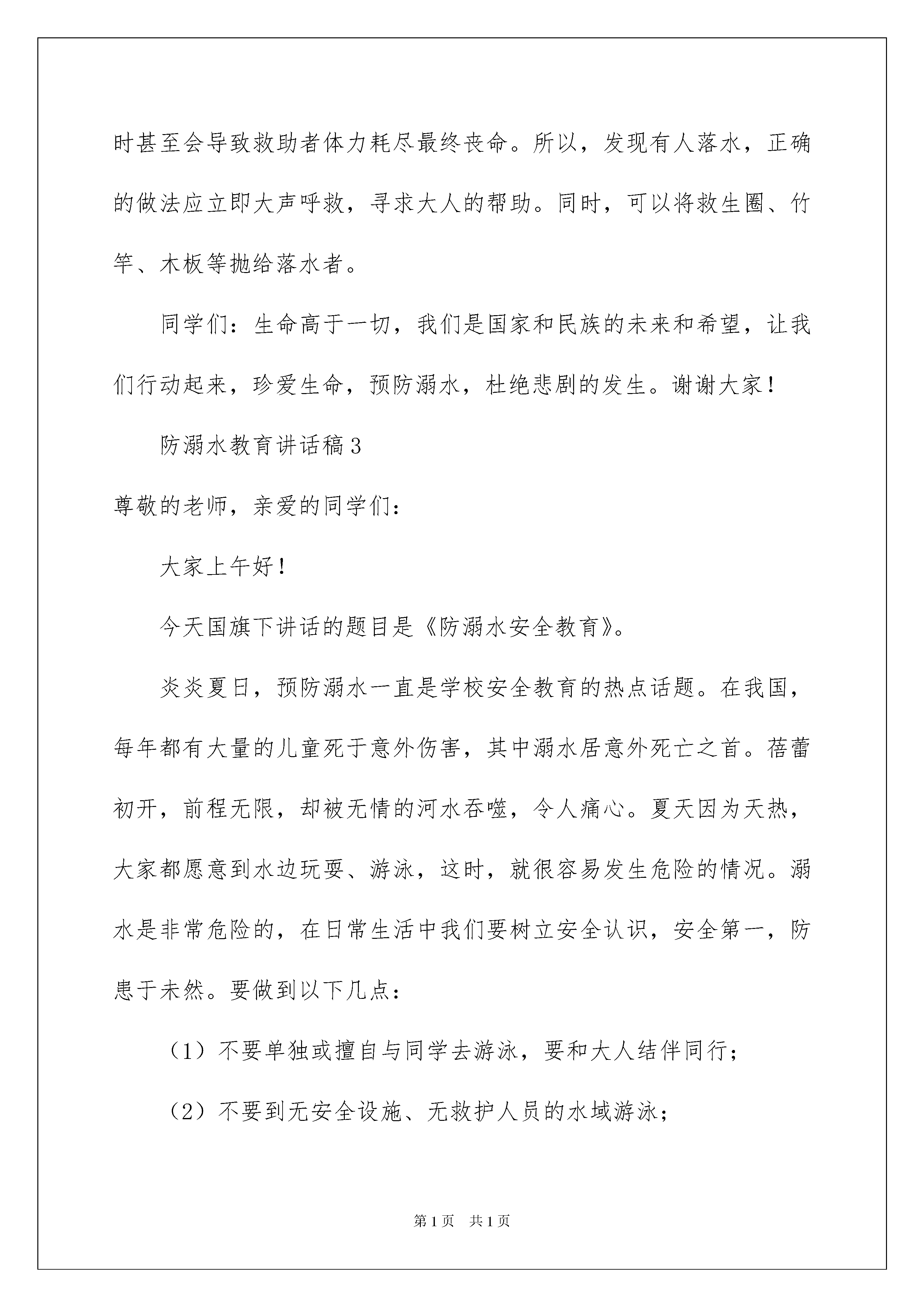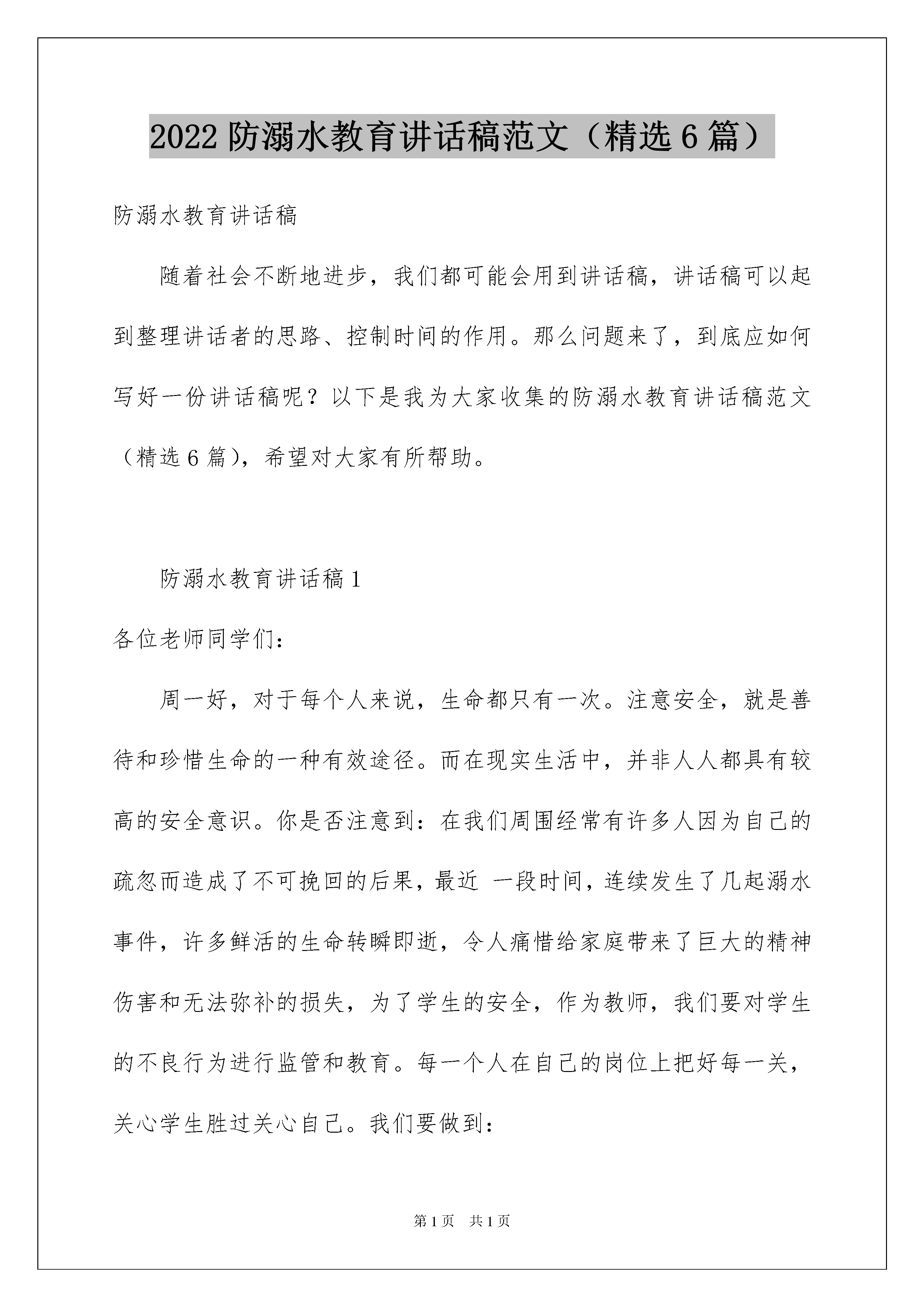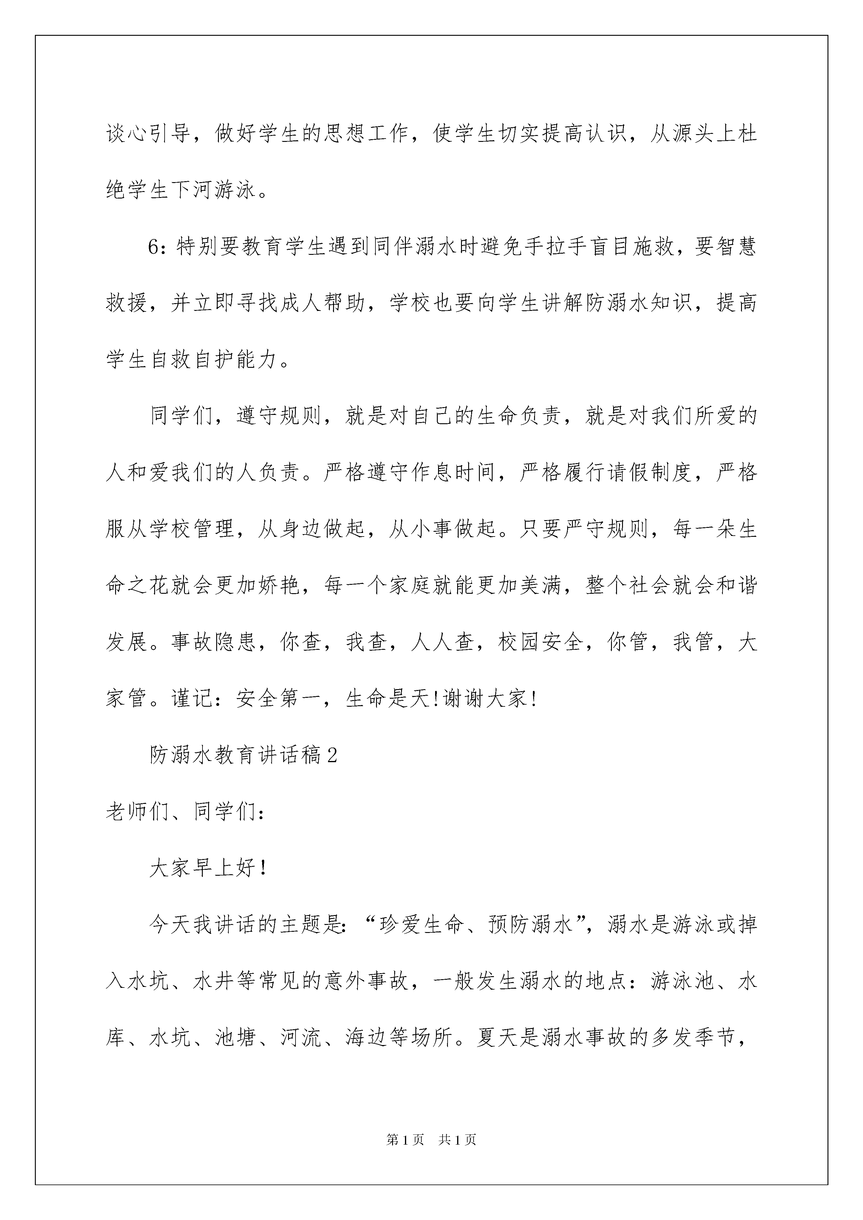 2022防溺水教育讲话稿范文(精选6篇)防溺水教育讲话稿随着社会不断地进步,我们都可能会用到讲话稿,讲话稿可以起到整理讲话者的思路、控制时间的作用。那么问题来了,到底应如何写好一份讲话稿呢?以下是我为大家收集的防溺水教育讲话稿范文(精选6篇),希望对大家有所帮助。防溺水教育讲话稿1各位老师同学们:周一好,对于每个人来说,生命都只有一次。注意安全,就是善待和珍惜生命的一种有效途径。而在现实生活中,并非人人都具有较高的安全意识。你是否注意到:在我们周围经常有许多人因为自己的疏忽而造成了不可挽回的后果,最近一段时间,连续发生了几起溺水事件,许多鲜活的生命转瞬即逝,令人痛惜给家庭带来了巨大的精神伤害和无法弥补的损失,为了学生的安全,作为教师,我们要对学生的不良行为进行监管和教育。每一个人在自己的岗位上把好每一关,关心学生胜过关心自己。我们要做到:1:认真落实上级文件精神,积极开展预防溺水事故教育宣传活动,落实“六不四牢记正确施救”教育。布置一篇防溺水安全教育作业;建立每周一次专题教育制度;建立每日一次安全提醒制度,课前课后进行安全提醒。2:各班利用班会课进行一次“防溺水安全教育课”主题班会活动,并且通过具体案例、典型事例警示学生,让学生谈谈自己身边的事例并且谈他们的感受,增强学生的安全意识,如果他们在遇到危险情况时能够冷静的处理,尽量把伤害降到最低点。3:家校联合,共同防范。发一份“防溺水告家长书”,把它带回家,让家长和他们共同学习“防溺水安全教育”知识,也可以上门家访或电话联系等方式,共同提高防范意识。特别是在节假日要做好安全工作,要让家长也明确:孩子下水游泳必须有家长的陪同,平时不到河边玩耍,更不得擅自同学结伴游泳。4:加强学生上课,放学等的出勤管理,明确专人点名汇报,及时掌握缺勤学生信息,对请假学生采取追踪调查,了解缺勤和请假学生去向,不明去向的学生要第一时间向学校汇报,并和家长联系。5:深入学生,了解班级学生状况,发现有游泳动向的学生,及时谈心引导,做好学生的思想工作,使学生切实提高认识,从源头上杜绝学生下河游泳。6:特别要教育学生遇到同伴溺水时避免手拉手盲目施救,要智慧救援,并立即寻找成人帮助,学校也要向学生讲解防溺水知识,提高学生自救自护能力。同学们,遵守规则,就是对自己的生命负责,就是对我们所爱的人和爱我们的人负责。严格遵守作息时间,严格履行请假制度,严格服从学校管理,从身边做起,从小事做起。只要严守规则,每一朵生命之花就会更加娇艳,每一个家庭就能更加美满,整个社会就会和谐发展。事故隐患,你查,我查,人人查,校园安全,你管,我管,大家管。谨记:安全第一,生命是天!谢谢大家!防溺水教育讲话稿2老师们、同学们:大家早上好!今天我讲话的主题是:“珍爱生命、预防溺水”,溺水是游泳或掉入水坑、水井等常见的意外事故,一般发生溺水的地点:游泳池、水库、水坑、池塘、河流、海边等场所。夏天是溺水事故的多发季节,每年夏天都有溺水身亡事故发生。在溺水者当中,有不会游泳的,也有一些会游泳、甚至是水性好的人。现在正是天气炎热季节,防溺水伤亡必须要引起同学们的高度重视。在此要求同学们做到以下几点:一、树立安全意识,加强自我保护,不走河边,沟沿,不走偏僻的道路,回家时要结伴而行。二、用学会的防溺水知识运用于实际,坚决杜绝溺水事件的发生。三、从我做起,听从长辈教导,严守学校纪律,坚决不玩水。四、在加强自我安全意识的同时,努力做好说服教育工作,对于那些违反学校纪律,私自玩水的'行为,要坚决抵制并劝阻。五、如要游泳要到有资质的游泳场游泳,而且必须要在大人带领下方可去游泳。六、同学间要互相关心、爱护,发现有的同学私自去游泳或到危险的地方去玩耍,要及时劝阻并告诉老师、家长。七、在我们的日常生活中,如果一旦遇到有人落水,我们在营救时应该怎么办呢?最重要的一点,就是不能冒然下水营救,因为一旦被落水者抓住将十分危险。在水中与落水者纠缠不但会消耗救助者的大量体力,有时甚至会导致救助者体力耗尽最终丧命。所以,发现有人落水,正确的做法应立即大声呼救,寻求大人的帮助。同时,可以将救生圈、竹竿、木板等抛给落水者。同学们:生命高于一切,我们是国家和民族的未来和希望,让我们行动起来,珍爱生命,预防溺水,杜绝悲剧的发生。谢谢大家!防溺水教育讲话稿3尊敬的老师,亲爱的同学们:大家上午好!今天国旗下讲话的题目是《防溺水安全教育》。炎炎夏日,预防溺水一直是学校安全教育的热点话题。在我国,每年都有大量的儿童死于意外伤害,其中溺水居意外死亡之首。蓓蕾初开,前程无限,却被无情的河水吞噬,令人痛心。夏天因为天热,大家都愿意到水边玩耍、游泳,