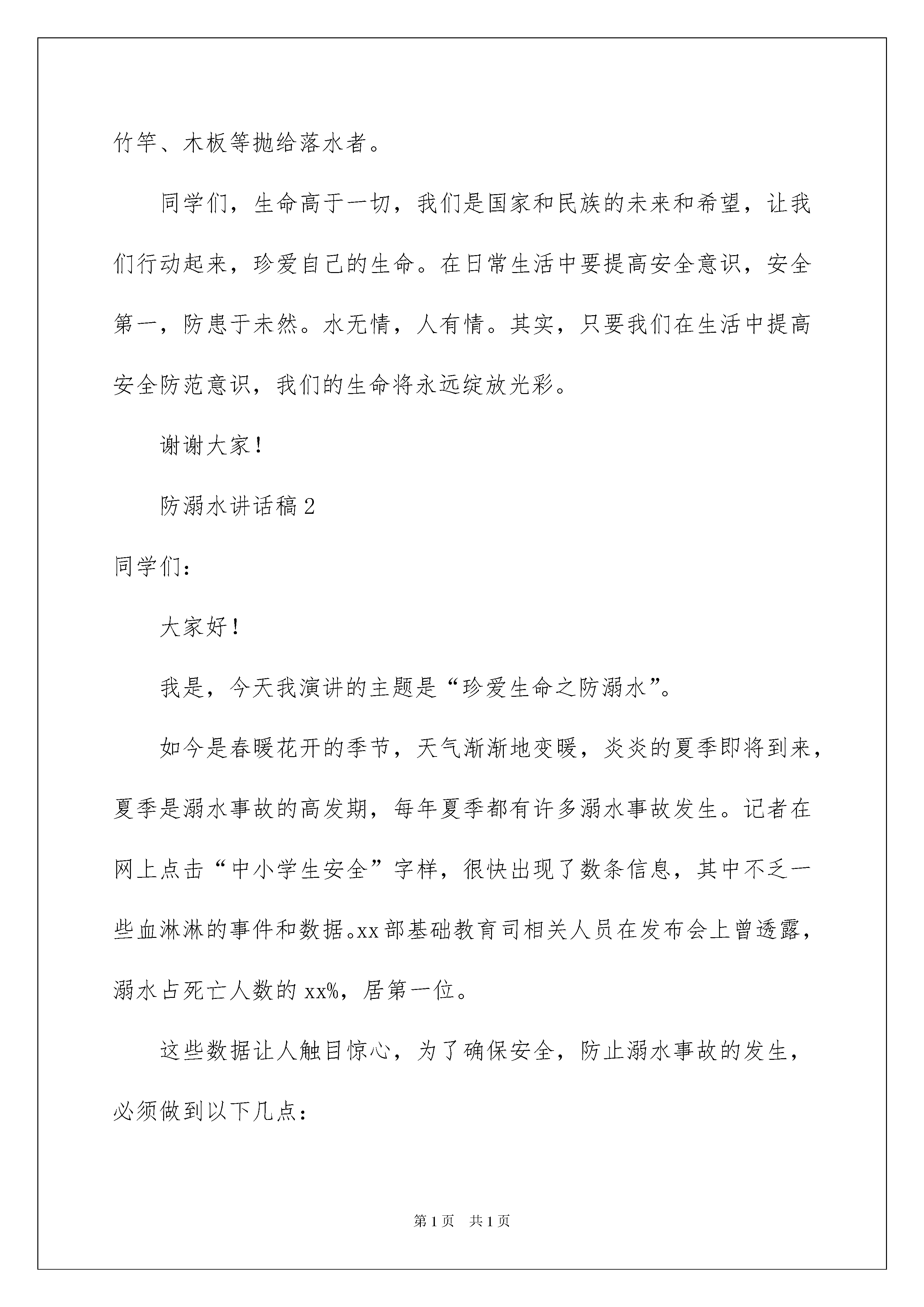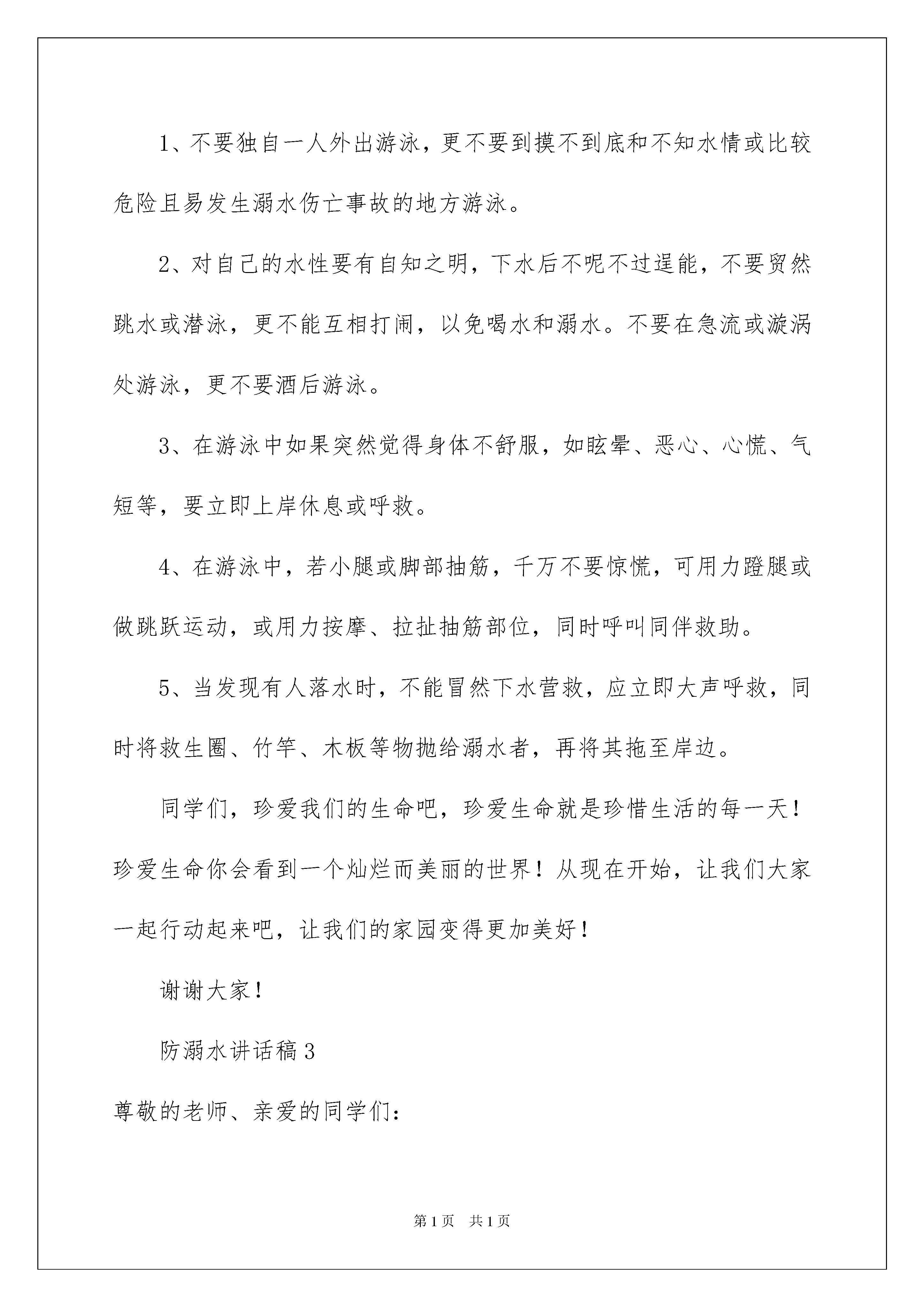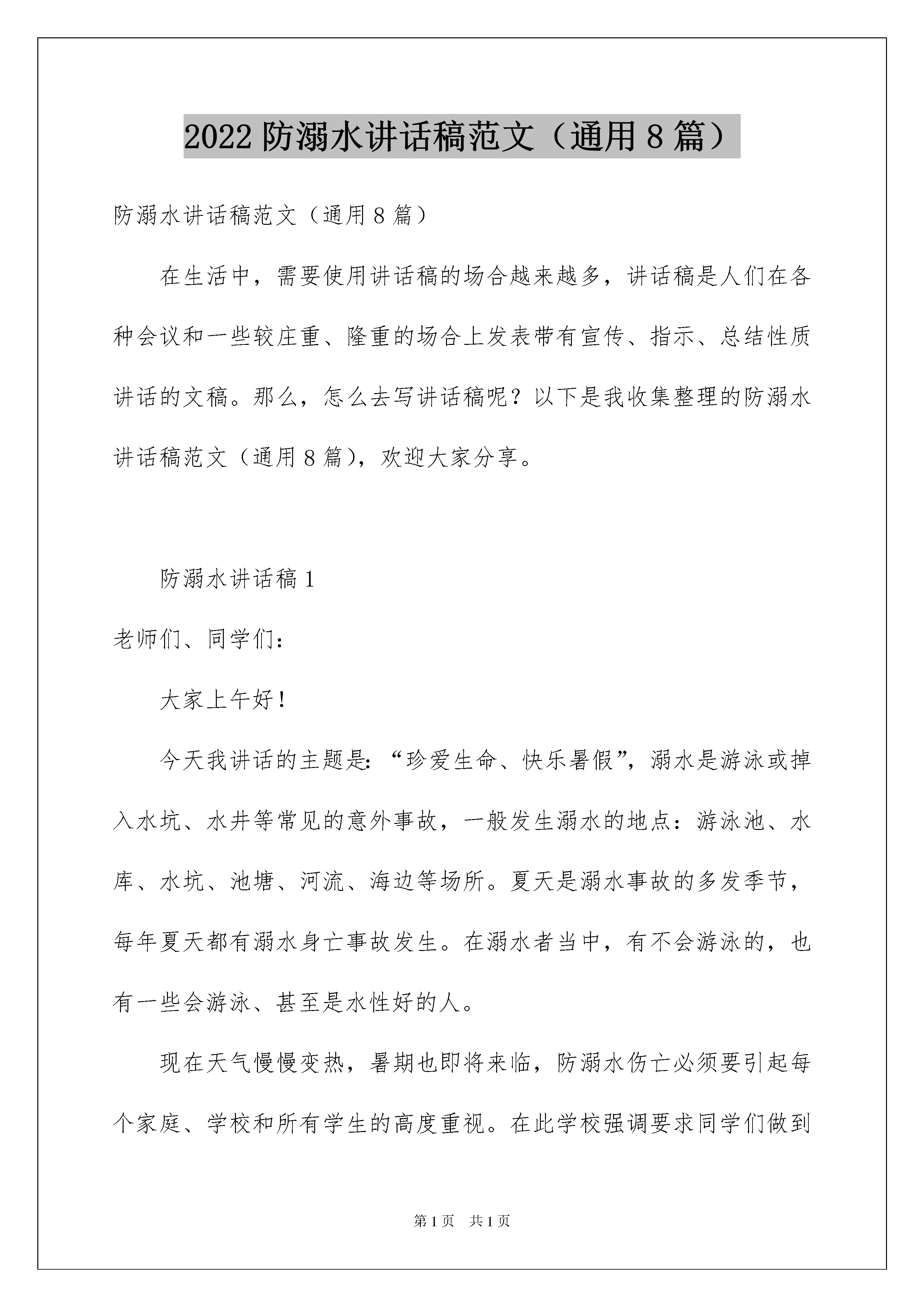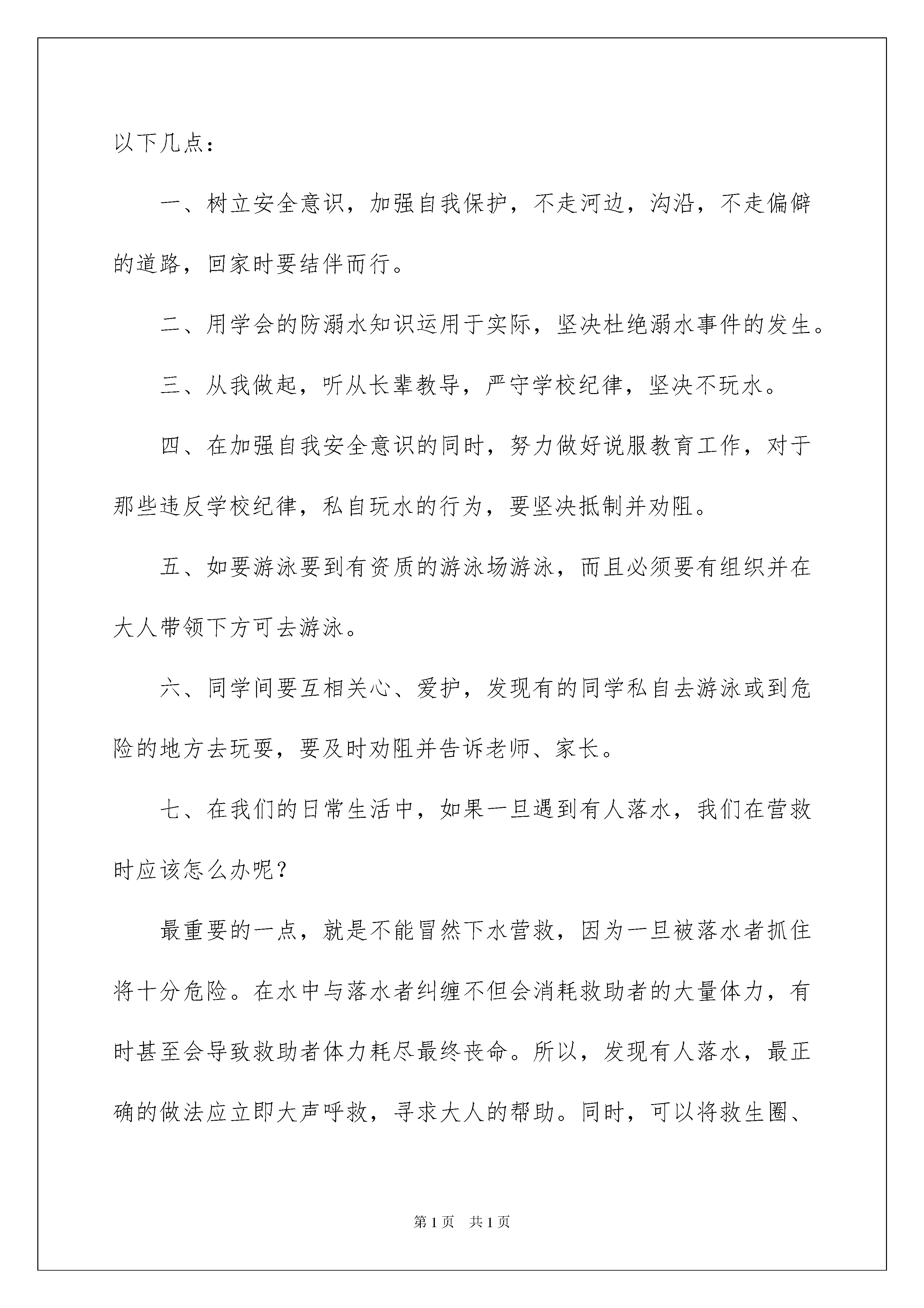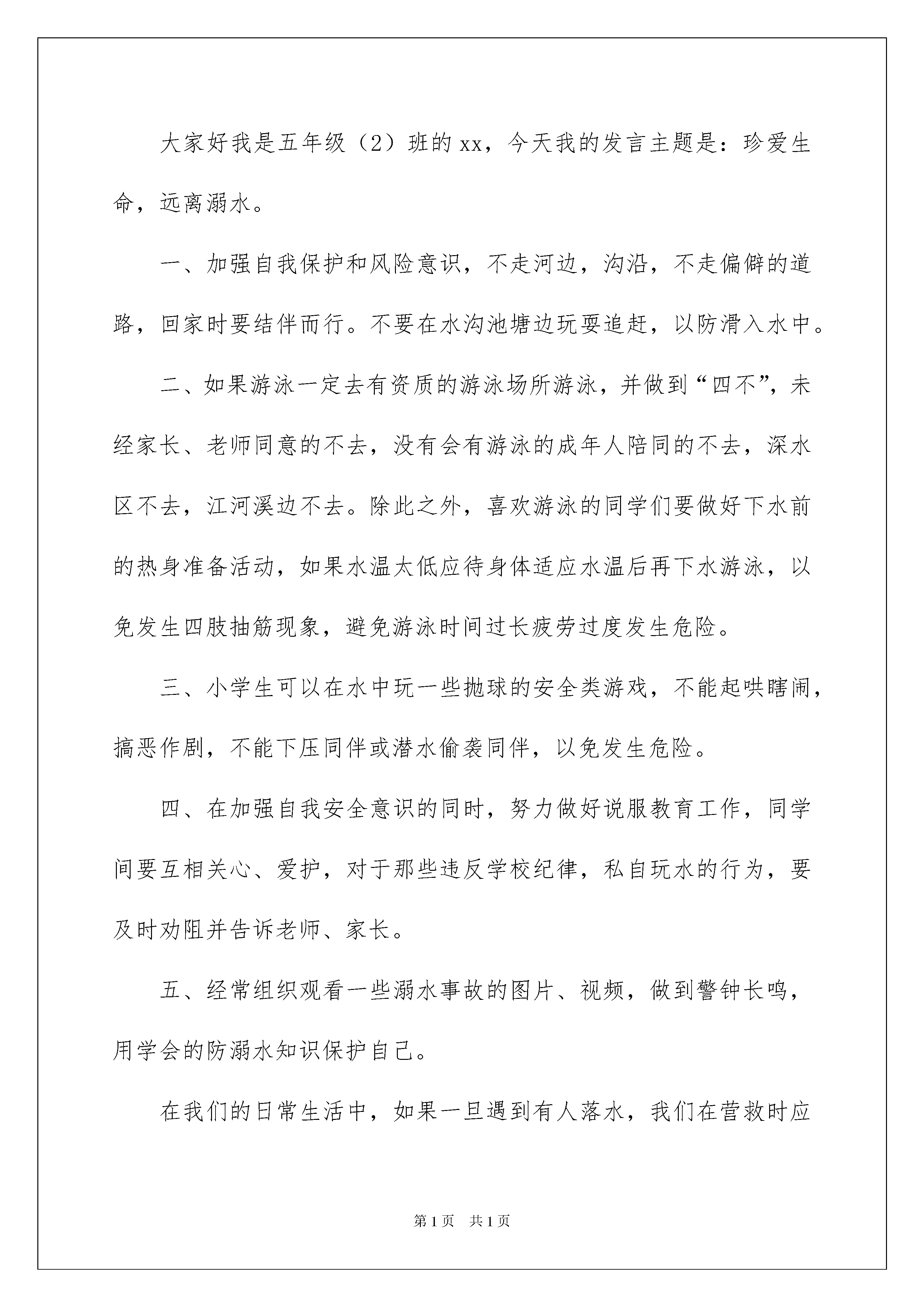 2022防溺水讲话稿范文(通用8篇)防溺水讲话稿范文(通用8篇)在生活中,需要使用讲话稿的场合越来越多,讲话稿是人们在各种会议和一些较庄重、隆重的场合上发表带有宣传、指示、总结性质讲话的文稿。那么,怎么去写讲话稿呢?以下是我收集整理的防溺水讲话稿范文(通用8篇),欢迎大家分享。防溺水讲话稿1老师们、同学们:大家上午好!今天我讲话的主题是:“珍爱生命、快乐暑假”,溺水是游泳或掉入水坑、水井等常见的意外事故,一般发生溺水的地点:游泳池、水库、水坑、池塘、河流、海边等场所。夏天是溺水事故的多发季节,每年夏天都有溺水身亡事故发生。在溺水者当中,有不会游泳的,也有一些会游泳、甚至是水性好的人。现在天气慢慢变热,暑期也即将来临,防溺水伤亡必须要引起每个家庭、学校和所有学生的高度重视。在此学校强调要求同学们做到以下几点:一、树立安全意识,加强自我保护,不走河边,沟沿,不走偏僻的道路,回家时要结伴而行。二、用学会的防溺水知识运用于实际,坚决杜绝溺水事件的发生。三、从我做起,听从长辈教导,严守学校纪律,坚决不玩水。四、在加强自我安全意识的同时,努力做好说服教育工作,对于那些违反学校纪律,私自玩水的行为,要坚决抵制并劝阻。五、如要游泳要到有资质的游泳场游泳,而且必须要有组织并在大人带领下方可去游泳。六、同学间要互相关心、爱护,发现有的同学私自去游泳或到危险的地方去玩耍,要及时劝阻并告诉老师、家长。七、在我们的日常生活中,如果一旦遇到有人落水,我们在营救时应该怎么办呢?最重要的一点,就是不能冒然下水营救,因为一旦被落水者抓住将十分危险。在水中与落水者纠缠不但会消耗救助者的大量体力,有时甚至会导致救助者体力耗尽最终丧命。所以,发现有人落水,最正确的做法应立即大声呼救,寻求大人的帮助。同时,可以将救生圈、竹竿、木板等抛给落水者。同学们,生命高于一切,我们是国家和民族的未来和希望,让我们行动起来,珍爱自己的生命。在日常生活中要提高安全意识,安全第一,防患于未然。水无情,人有情。其实,只要我们在生活中提高安全防范意识,我们的生命将永远绽放光彩。谢谢大家!防溺水讲话稿2同学们:大家好!我是,今天我演讲的主题是“珍爱生命之防溺水”。如今是春暖花开的季节,天气渐渐地变暖,炎炎的夏季即将到来,夏季是溺水事故的高发期,每年夏季都有许多溺水事故发生。记者在网上点击“中小学生安全”字样,很快出现了数条信息,其中不乏一些血淋淋的事件和数据。xx部基础教育司相关人员在发布会上曾透露,溺水占死亡人数的xx%,居第一位。这些数据让人触目惊心,为了确保安全,防止溺水事故的发生,必须做到以下几点:1、不要独自一人外出游泳,更不要到摸不到底和不知水情或比较危险且易发生溺水伤亡事故的地方游泳。2、对自己的水性要有自知之明,下水后不呢不过逞能,不要贸然跳水或潜泳,更不能互相打闹,以免喝水和溺水。不要在急流或漩涡处游泳,更不要酒后游泳。3、在游泳中如果突然觉得身体不舒服,如眩晕、恶心、心慌、气短等,要立即上岸休息或呼救。4、在游泳中,若小腿或脚部抽筋,千万不要惊慌,可用力蹬腿或做跳跃运动,或用力按摩、拉扯抽筋部位,同时呼叫同伴救助。5、当发现有人落水时,不能冒然下水营救,应立即大声呼救,同时将救生圈、竹竿、木板等物抛给溺水者,再将其拖至岸边。同学们,珍爱我们的生命吧,珍爱生命就是珍惜生活的每一天!珍爱生命你会看到一个灿烂而美丽的世界!从现在开始,让我们大家一起行动起来吧,让我们的家园变得更加美好!谢谢大家!防溺水讲话稿3尊敬的老师、亲爱的同学们:大家好我是五年级(2)班的xx,今天我的发言主题是:珍爱生命,远离溺水。一、加强自我保护和风险意识,不走河边,沟沿,不走偏僻的道路,回家时要结伴而行。不要在水沟池塘边玩耍追赶,以防滑入水中。二、如果游泳一定去有资质的游泳场所游泳,并做到“四不”,未经家长、老师同意的不去,没有会有游泳的成年人陪同的不去,深水区不去,江河溪边不去。除此之外,喜欢游泳的同学们要做好下水前的热身准备活动,如果水温太低应待身体适应水温后再下水游泳,以免发生四肢抽筋现象,避免游泳时间过长疲劳过度发生危险。三、小学生可以在水中玩一些抛球的安全类游戏,不能起哄瞎闹,搞恶作剧,不能下压同伴或潜水偷袭同伴,以免发生危险。四、在加强自我安全意识的同时,努力做好说服教育工作,同学间要互相关心、爱护,对于那些违反学校纪律,私自玩水的行为,要及时劝阻并告诉老师、家长。五、经常组织观看一些溺水事故的图片、视频,做到警钟长鸣,用学会的防溺水知识保护自己。在我们的日常生活中,如果一旦遇到有人落水,我们在营救时应该怎么办呢?大声呼救!同时,可以