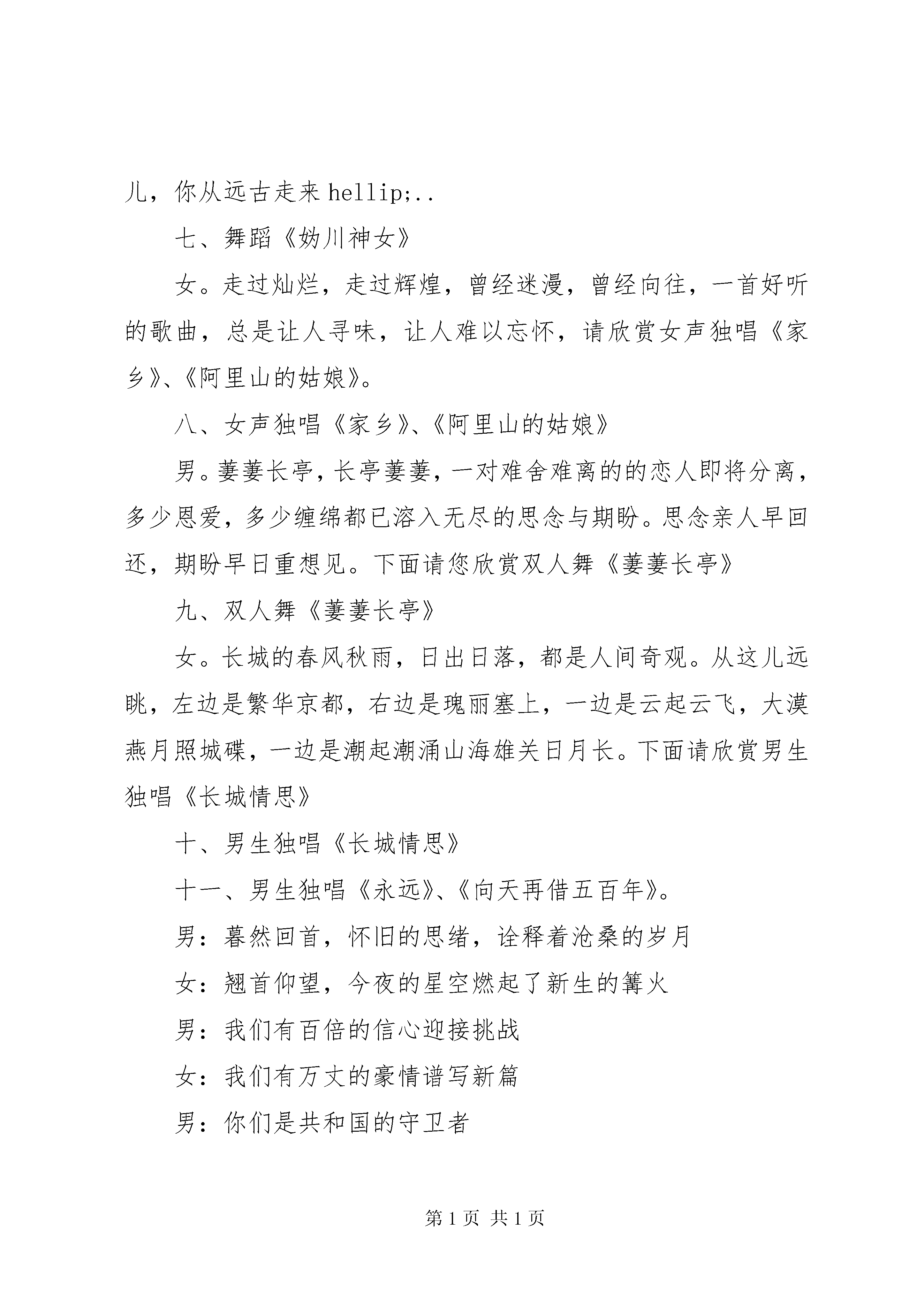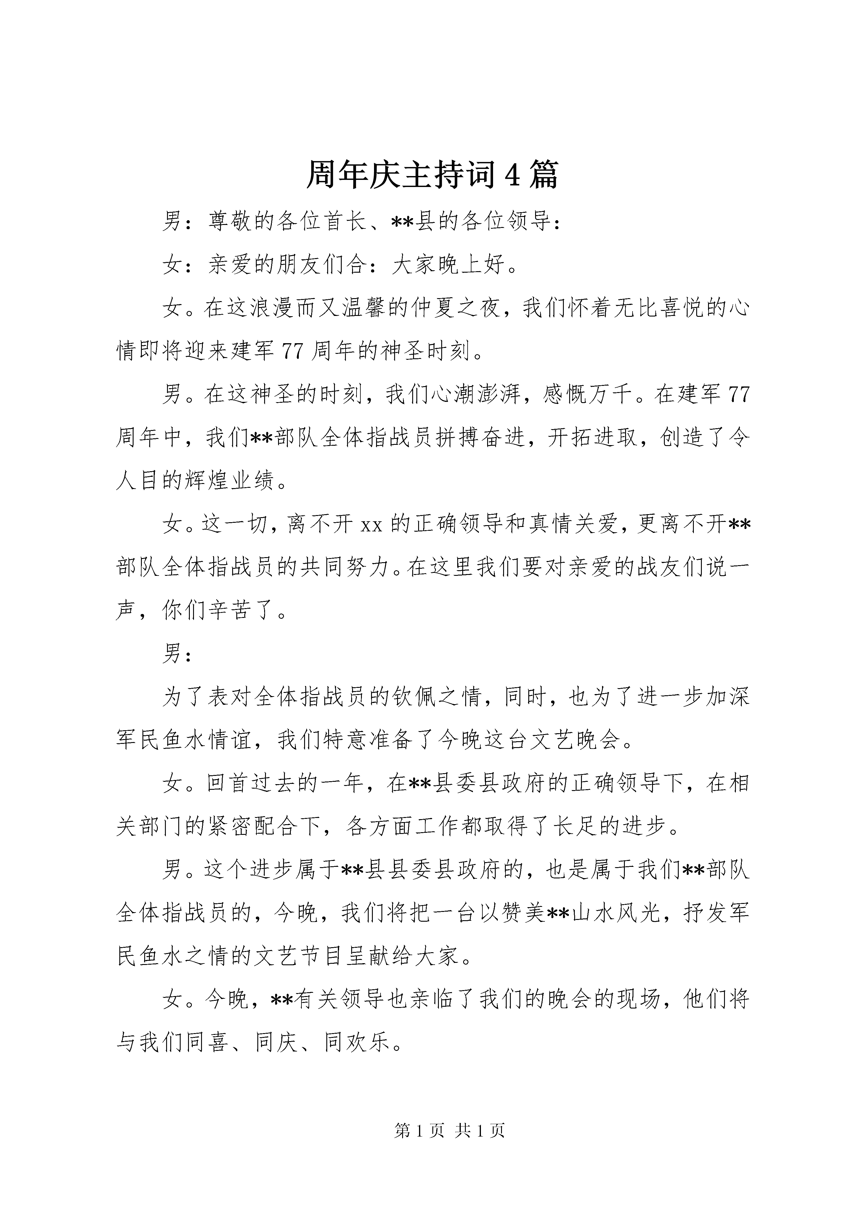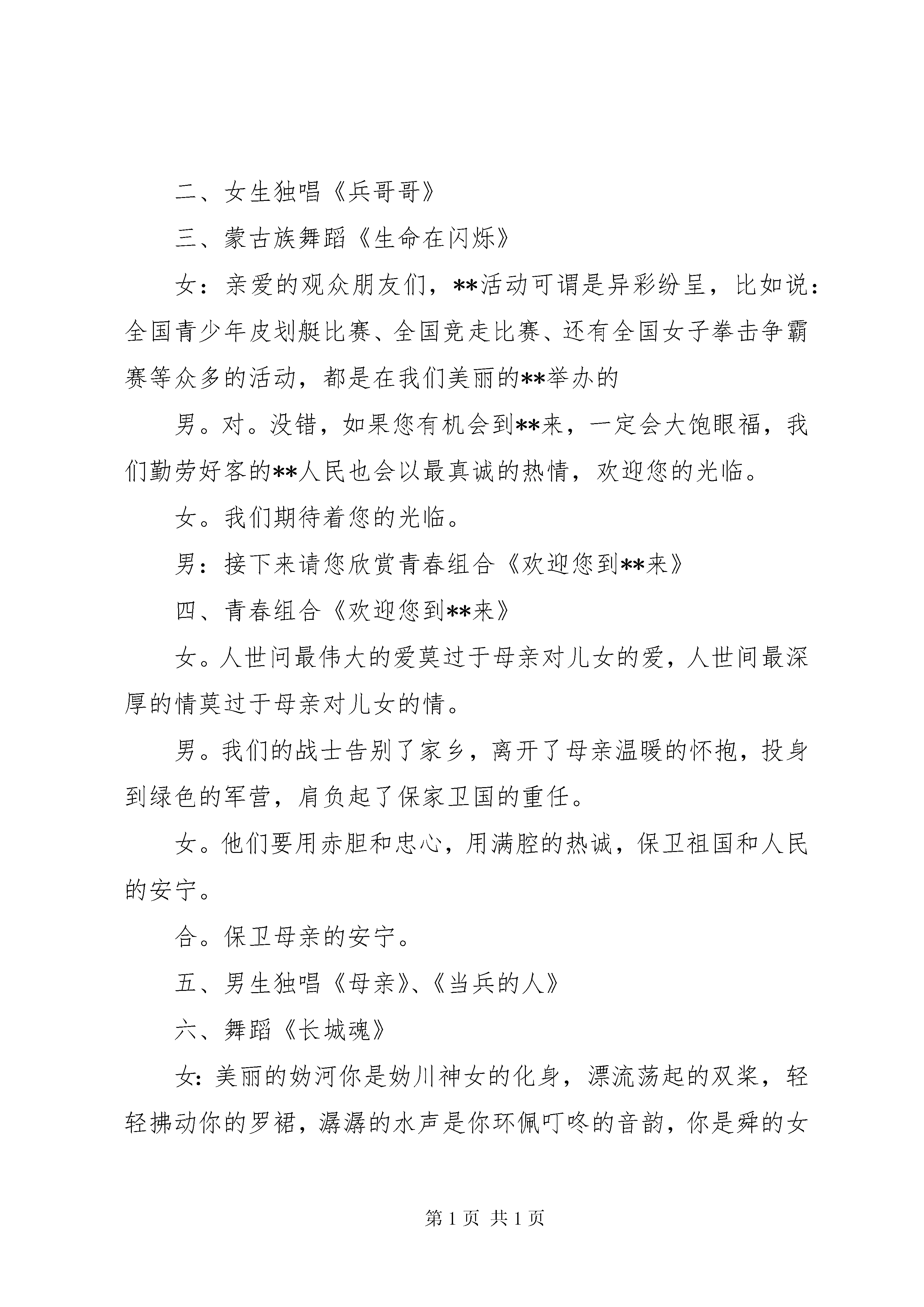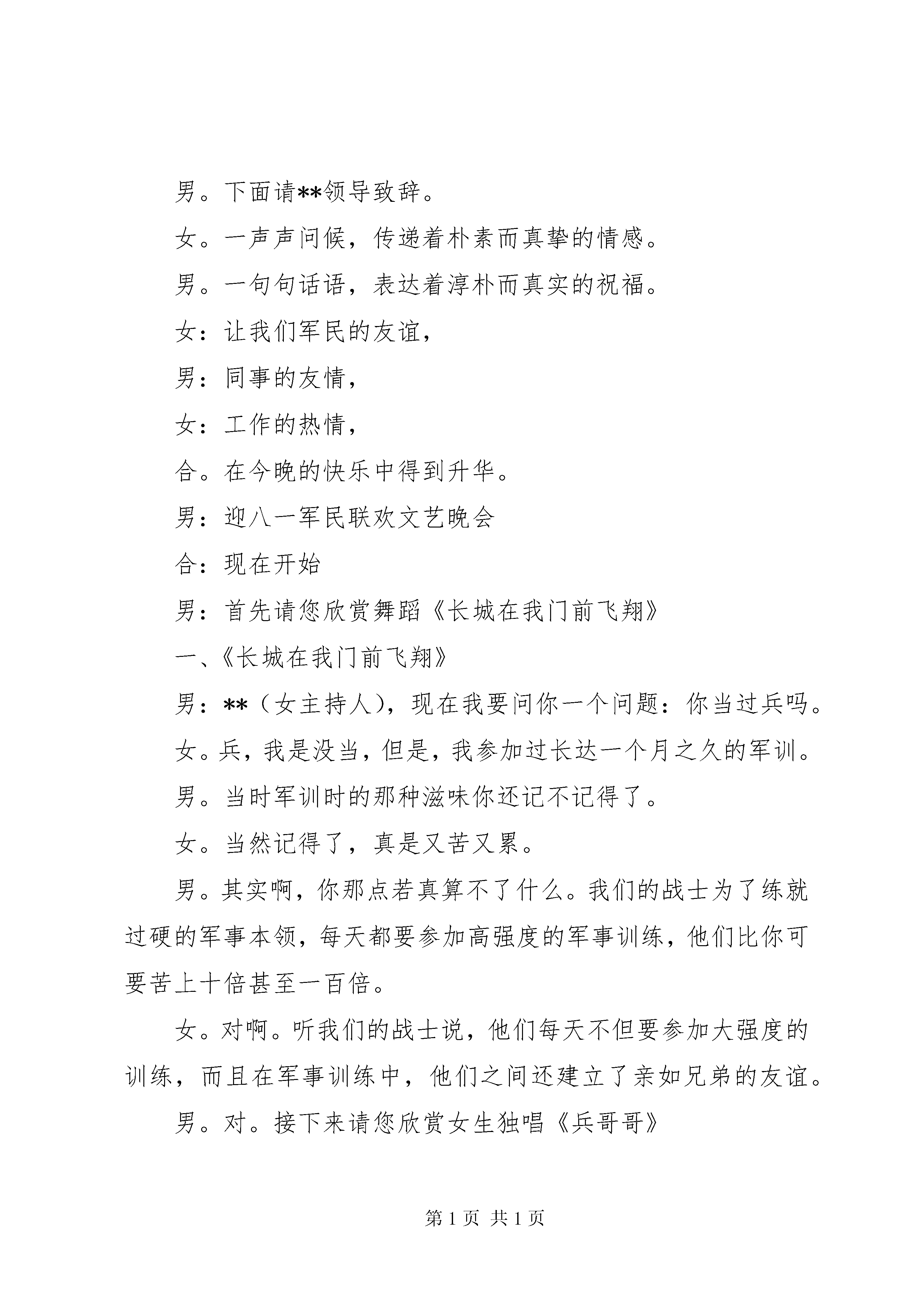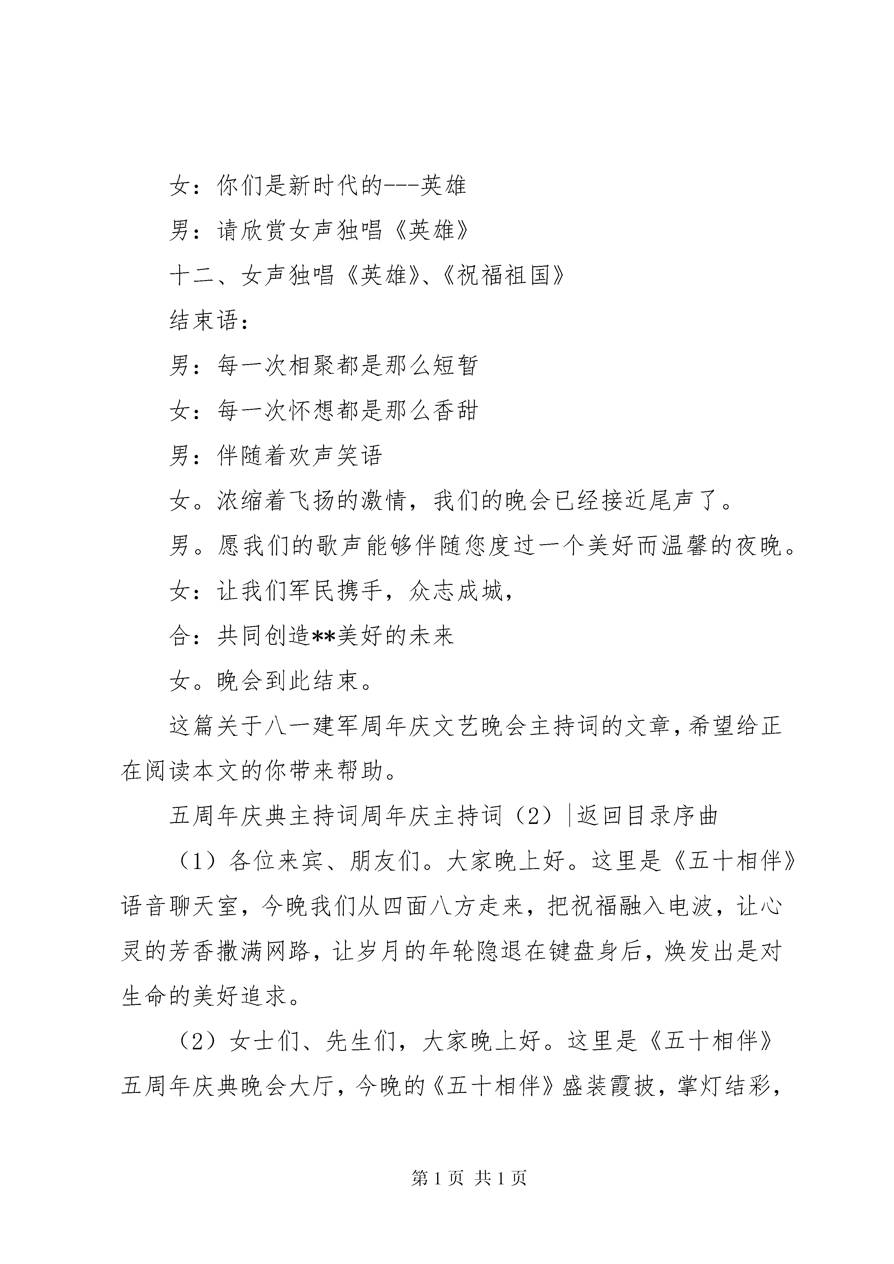 周年庆主持词4篇男:尊敬的各位首长、**县的各位领导:女:亲爱的朋友们合:大家晚上好。女。在这浪漫而又温馨的仲夏之夜,我们怀着无比喜悦的心情即将迎来建军77周年的神圣时刻。男。在这神圣的时刻,我们心潮澎湃,感慨万千。在建军77周年中,我们**部队全体指战员拼搏奋进,开拓进取,创造了令人目的辉煌业绩。女。这一切,离不开xx的正确领导和真情关爱,更离不开**部队全体指战员的共同努力。在这里我们要对亲爱的战友们说一声,你们辛苦了。男:为了表对全体指战员的钦佩之情,同时,也为了进一步加深军民鱼水情谊,我们特意准备了今晚这台文艺晚会。女。回首过去的一年,在**县委县政府的正确领导下,在相关部门的紧密配合下,各方面工作都取得了长足的进步。男。这个进步属于**县县委县政府的,也是属于我们**部队全体指战员的,今晚,我们将把一台以赞美**山水风光,抒发军民鱼水之情的文艺节目呈献给大家。女。今晚,**有关领导也亲临了我们的晚会的现场,他们将与我们同喜、同庆、同欢乐。男。下面请**领导致辞。女。一声声问候,传递着朴素而真挚的情感。男。一句句话语,表达着淳朴而真实的祝福。女:让我们军民的友谊,男:同事的友情,女:工作的热情,合。在今晚的快乐中得到升华。男:迎八一军民联欢文艺晚会合:现在开始男:首先请您欣赏舞蹈《长城在我门前飞翔》一、《长城在我门前飞翔》男:**(女主持人),现在我要问你一个问题:你当过兵吗。女。兵,我是没当,但是,我参加过长达一个月之久的军训。男。当时军训时的那种滋味你还记不记得了。女。当然记得了,真是又苦又累。男。其实啊,你那点若真算不了什么。我们的战士为了练就过硬的军事本领,每天都要参加高强度的军事训练,他们比你可要苦上十倍甚至一百倍。女。对啊。听我们的战士说,他们每天不但要参加大强度的训练,而且在军事训练中,他们之间还建立了亲如兄弟的友谊。男。对。接下来请您欣赏女生独唱《兵哥哥》二、女生独唱《兵哥哥》三、蒙古族舞蹈《生命在闪烁》女:亲爱的观众朋友们,**活动可谓是异彩纷呈,比如说:全国青少年皮划艇比赛、全国竞走比赛、还有全国女子拳击争霸赛等众多的活动,都是在我们美丽的**举办的男。对。没错,如果您有机会到**来,一定会大饱眼福,我们勤劳好客的**人民也会以最真诚的热情,欢迎您的光临。女。我们期待着您的光临。男:接下来请您欣赏青春组合《欢迎您到**来》四、青春组合《欢迎您到**来》女。人世问最伟大的爱莫过于母亲对儿女的爱,人世间最深厚的情莫过于母亲对儿女的情。男。我们的战士告别了家乡,离开了母亲温暖的怀抱,投身到绿色的军营,肩负起了保家卫国的重任。女。他们要用赤胆和忠心,用满腔的热诚,保卫祖国和人民的安宁。合。保卫母亲的安宁。五、男生独唱《母亲》、《当兵的人》六、舞蹈《长城魂》女:美丽的妫河你是妫川神女的化身,漂流荡起的双桨,轻轻拂动你的罗裙,潺潺的水声是你环佩叮咚的音韵,你是舜的女儿,你从远古走来hellip;..七、舞蹈《妫川神女》女。走过灿烂,走过辉煌,曾经迷漫,曾经向往,一首好听的歌曲,总是让人寻味,让人难以忘怀,请欣赏女声独唱《家乡》、《阿里山的姑娘》。八、女声独唱《家乡》、《阿里山的姑娘》男。萋萋长亭,长亭萋萋,一对难舍难离的的恋人即将分离,多少恩爱,多少缠绵都已溶入无尽的思念与期盼。思念亲人早回还,期盼早日重想见。下面请您欣赏双人舞《萋萋长亭》九、双人舞《萋萋长亭》女。长城的春风秋雨,日出日落,都是人间奇观。从这儿远眺,左边是繁华京都,右边是瑰丽塞上,一边是云起云飞,大漠燕月照城碟,一边是潮起潮涌山海雄关日月长。下面请欣赏男生独唱《长城情思》十、男生独唱《长城情思》十一、男生独唱《永远》、《向天再借五百年》。男:暮然回首,怀旧的思绪,诠释着沧桑的岁月女:翘首仰望,今夜的星空燃起了新生的篝火男:我们有百倍的信心迎接挑战女:我们有万丈的豪情谱写新篇男:你们是共和国的守卫者女:你们是新时代的---英雄男:请欣赏女声独唱《英雄》十二、女声独唱《英雄》、《祝福祖国》结束语:男:每一次相聚都是那么短暂女:每一次怀想都是那么香甜男:伴随着欢声笑语女。浓缩着飞扬的激情,我们的晚会已经接近尾声了。男。愿我们的歌声能够伴随您度过一个美好而温馨的夜晚。女:让我们军民携手,众志成城,合:共同创造**美好的未来女。晚会到此结束。这篇关于八一建军周年庆文艺晚会主持词的文章,希望给正在阅读本文的你带来帮助。五周年庆典主持词周年庆主持词(2)|返回目录序曲(1)各位来宾、朋友们。大家晚上好。这里是《五十相伴》语音聊天室,今晚我们从四面八方走来,把祝福融入电波,让心灵的芳香撒满网路,让岁月的年轮隐退在键盘身后,焕发出是对生命的美好追求。(2)女士们、先生们,大家晚上好。这里是《五十相伴》五周年庆典晚会大厅,今晚的《五十相伴
