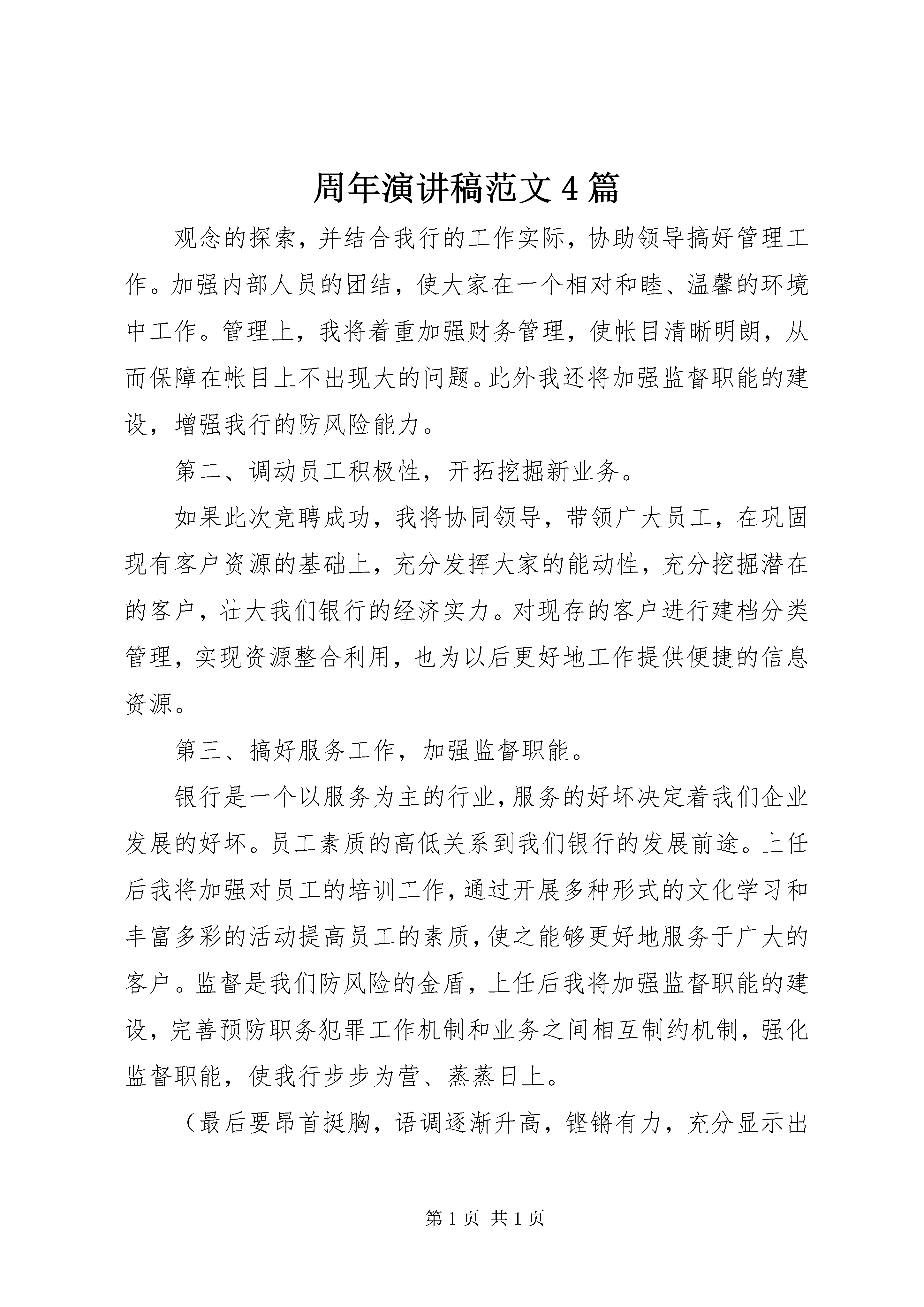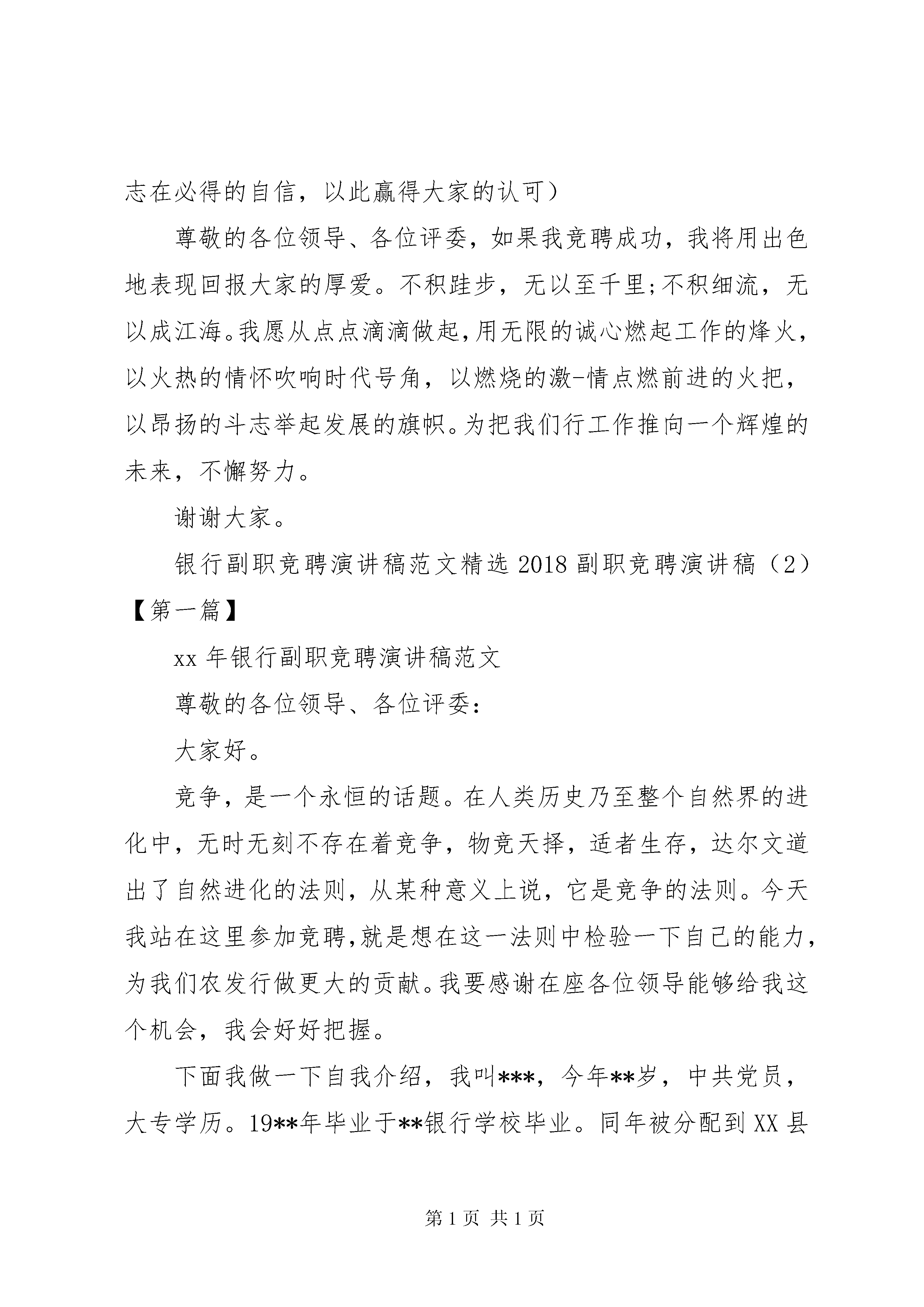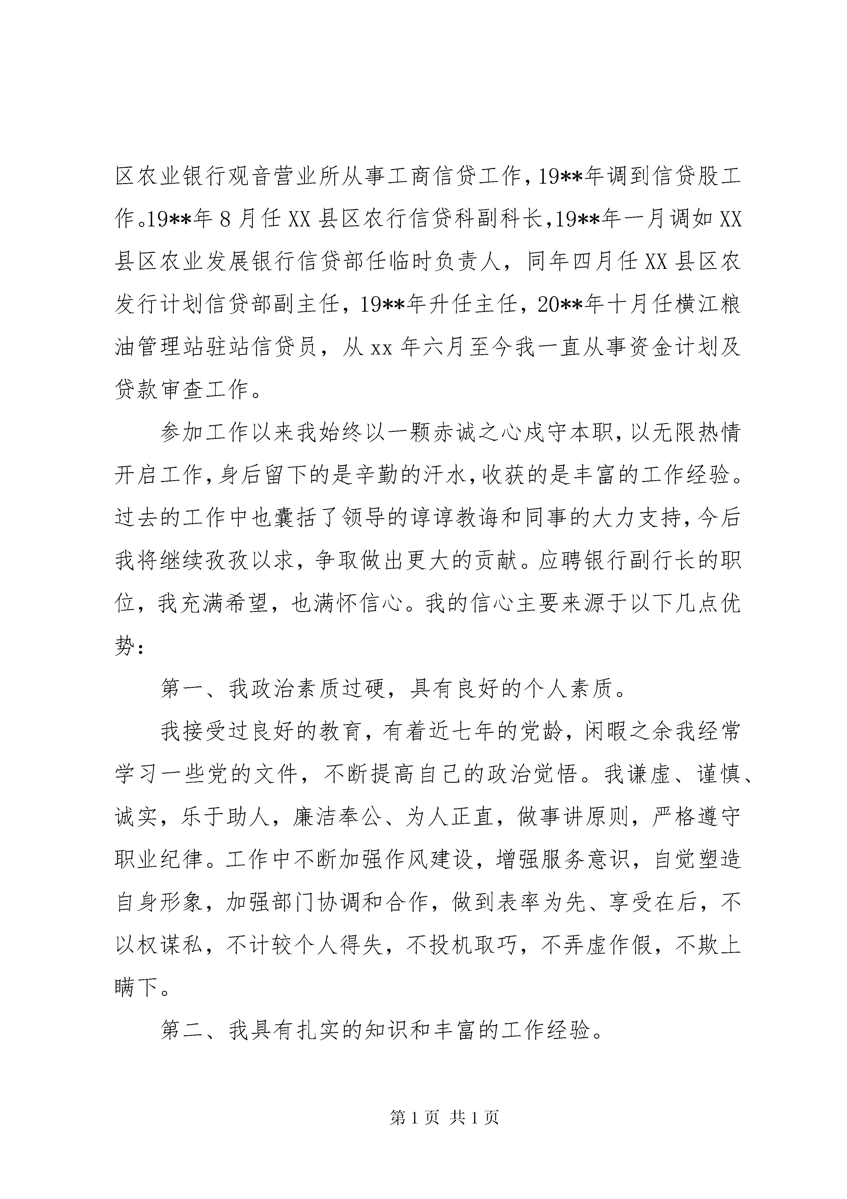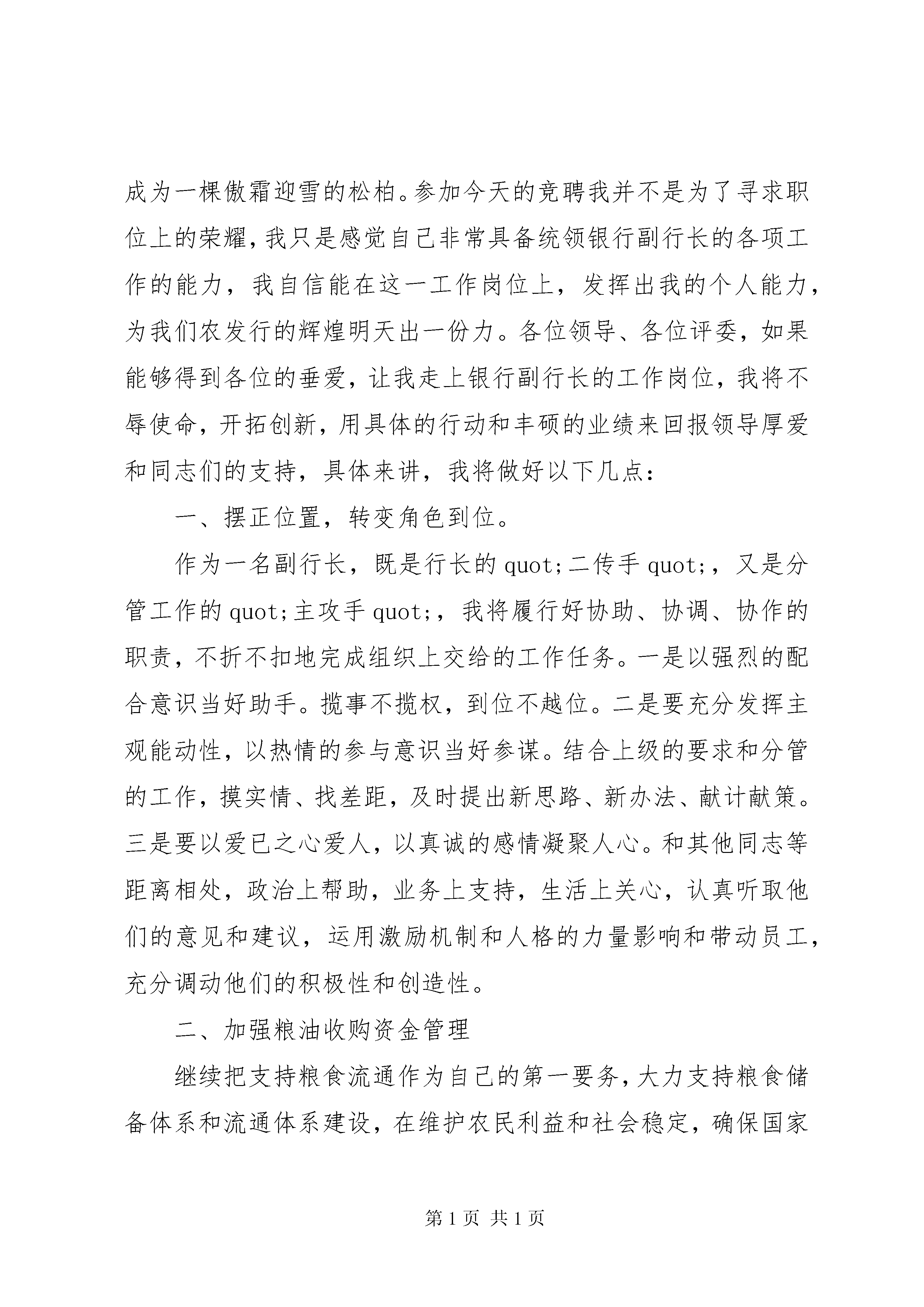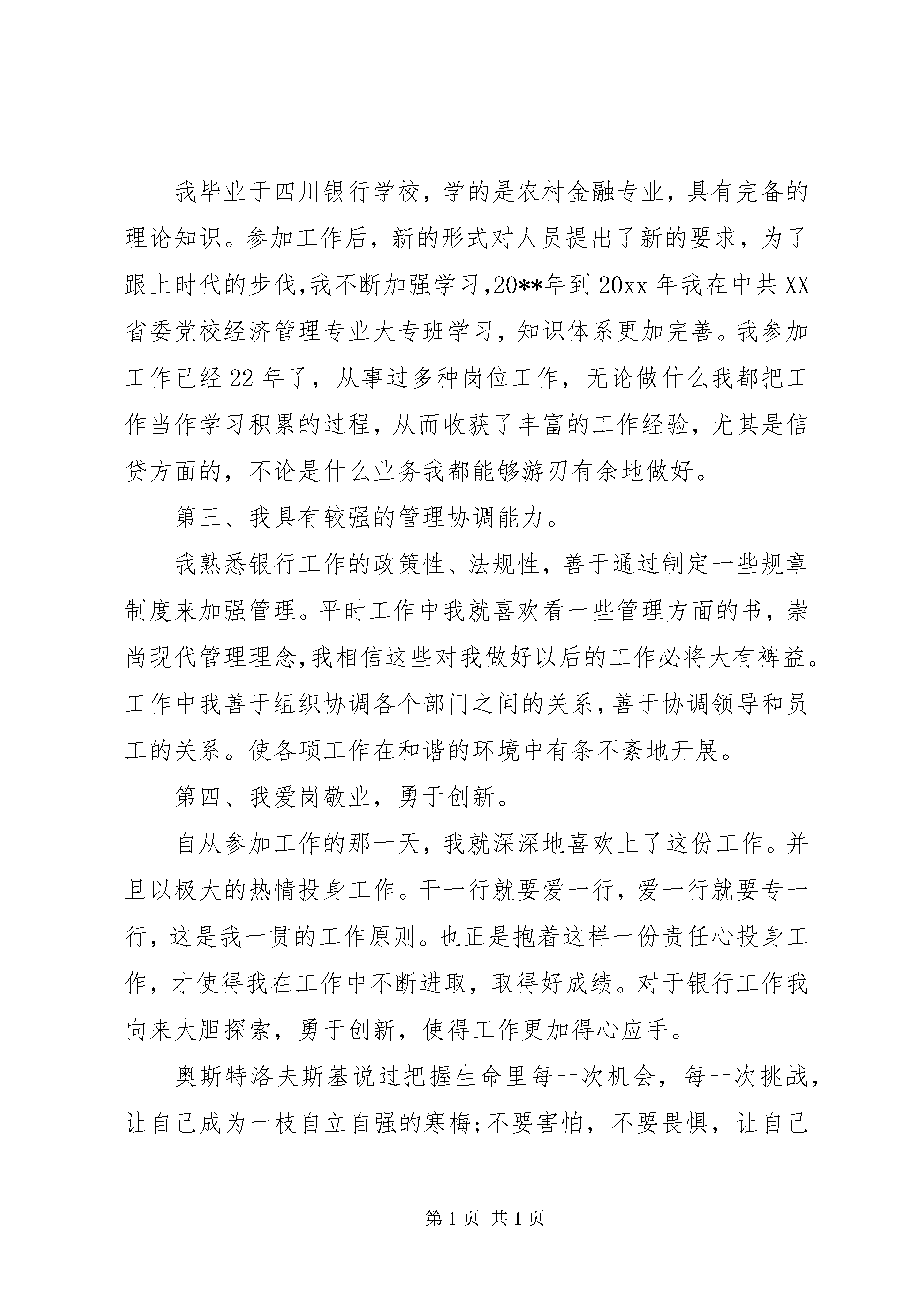 周年演讲稿范文4篇观念的探索,并结合我行的工作实际,协助领导搞好管理工作。加强内部人员的团结,使大家在一个相对和睦、温馨的环境中工作。管理上,我将着重加强财务管理,使帐目清晰明朗,从而保障在帐目上不出现大的问题。此外我还将加强监督职能的建设,增强我行的防风险能力。第二、调动员工积极性,开拓挖掘新业务。如果此次竞聘成功,我将协同领导,带领广大员工,在巩固现有客户资源的基础上,充分发挥大家的能动性,充分挖掘潜在的客户,壮大我们银行的经济实力。对现存的客户进行建档分类管理,实现资源整合利用,也为以后更好地工作提供便捷的信息资源。第三、搞好服务工作,加强监督职能。银行是一个以服务为主的行业,服务的好坏决定着我们企业发展的好坏。员工素质的高低关系到我们银行的发展前途。上任后我将加强对员工的培训工作,通过开展多种形式的文化学习和丰富多彩的活动提高员工的素质,使之能够更好地服务于广大的客户。监督是我们防风险的金盾,上任后我将加强监督职能的建设,完善预防职务犯罪工作机制和业务之间相互制约机制,强化监督职能,使我行步步为营、蒸蒸日上。(最后要昂首挺胸,语调逐渐升高,铿锵有力,充分显示出志在必得的自信,以此赢得大家的认可)尊敬的各位领导、各位评委,如果我竞聘成功,我将用出色地表现回报大家的厚爱。不积跬步,无以至千里;不积细流,无以成江海。我愿从点点滴滴做起,用无限的诚心燃起工作的烽火,以火热的情怀吹响时代号角,以燃烧的激-情点燃前进的火把,以昂扬的斗志举起发展的旗帜。为把我们行工作推向一个辉煌的未来,不懈努力。谢谢大家。银行副职竞聘演讲稿范文精选2018副职竞聘演讲稿(2)【第一篇】xx年银行副职竞聘演讲稿范文尊敬的各位领导、各位评委:大家好。竞争,是一个永恒的话题。在人类历史乃至整个自然界的进化中,无时无刻不存在着竞争,物竞天择,适者生存,达尔文道出了自然进化的法则,从某种意义上说,它是竞争的法则。今天我站在这里参加竞聘,就是想在这一法则中检验一下自己的能力,为我们农发行做更大的贡献。我要感谢在座各位领导能够给我这个机会,我会好好把握。下面我做一下自我介绍,我叫***,今年**岁,中共党员,大专学历。19**年毕业于**银行学校毕业。同年被分配到XX县区农业银行观音营业所从事工商信贷工作,19**年调到信贷股工作。19**年8月任XX县区农行信贷科副科长,19**年一月调如XX县区农业发展银行信贷部任临时负责人,同年四月任XX县区农发行计划信贷部副主任,19**年升任主任,20**年十月任横江粮油管理站驻站信贷员,从xx年六月至今我一直从事资金计划及贷款审查工作。参加工作以来我始终以一颗赤诚之心戍守本职,以无限热情开启工作,身后留下的是辛勤的汗水,收获的是丰富的工作经验。过去的工作中也囊括了领导的谆谆教诲和同事的大力支持,今后我将继续孜孜以求,争取做出更大的贡献。应聘银行副行长的职位,我充满希望,也满怀信心。我的信心主要来源于以下几点优势:第一、我政治素质过硬,具有良好的个人素质。我接受过良好的教育,有着近七年的党龄,闲暇之余我经常学习一些党的文件,不断提高自己的政治觉悟。我谦虚、谨慎、诚实,乐于助人,廉洁奉公、为人正直,做事讲原则,严格遵守职业纪律。工作中不断加强作风建设,增强服务意识,自觉塑造自身形象,加强部门协调和合作,做到表率为先、享受在后,不以权谋私,不计较个人得失,不投机取巧,不弄虚作假,不欺上瞒下。第二、我具有扎实的知识和丰富的工作经验。我毕业于四川银行学校,学的是农村金融专业,具有完备的理论知识。参加工作后,新的形式对人员提出了新的要求,为了跟上时代的步伐,我不断加强学习,20**年到20xx年我在中共XX省委党校经济管理专业大专班学习,知识体系更加完善。我参加工作已经22年了,从事过多种岗位工作,无论做什么我都把工作当作学习积累的过程,从而收获了丰富的工作经验,尤其是信贷方面的,不论是什么业务我都能够游刃有余地做好。第三、我具有较强的管理协调能力。我熟悉银行工作的政策性、法规性,善于通过制定一些规章制度来加强管理。平时工作中我就喜欢看一些管理方面的书,崇尚现代管理理念,我相信这些对我做好以后的工作必将大有裨益。工作中我善于组织协调各个部门之间的关系,善于协调领导和员工的关系。使各项工作在和谐的环境中有条不紊地开展。第四、我爱岗敬业,勇于创新。自从参加工作的那一天,我就深深地喜欢上了这份工作。并且以极大的热情投身工作。干一行就要爱一行,爱一行就要专一行,这是我一贯的工作原则。也正是抱着这样一份责任心投身工作,才使得我在工作中不断进取,取得好成绩。对于银行工作我向来大胆探索,勇于创新,使得工作更加得心应手。奥斯特洛夫斯基说过把握生命里每一次机会,每一次挑战,让自己成为一枝自立自强的寒梅;不要害怕,不要畏惧
