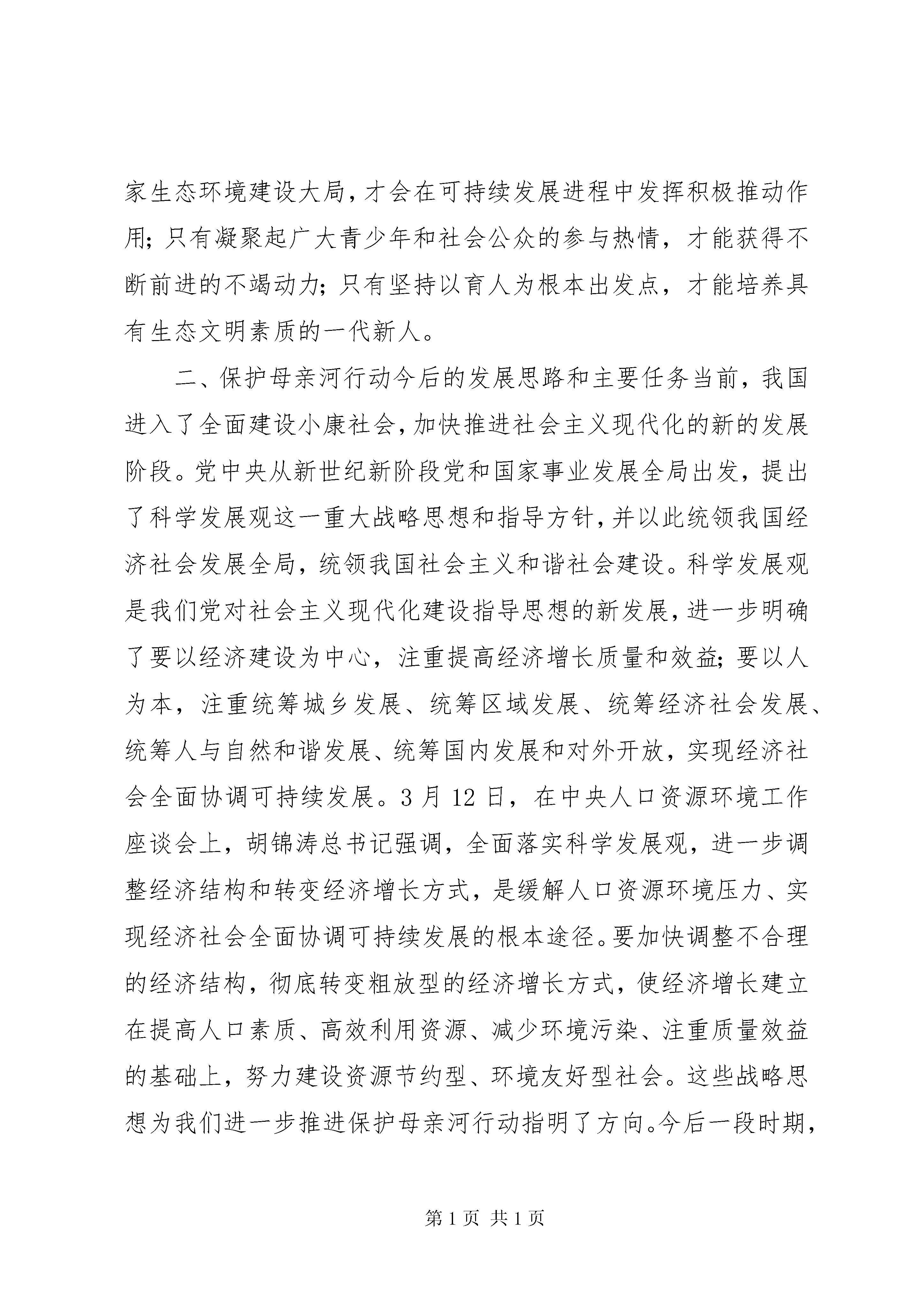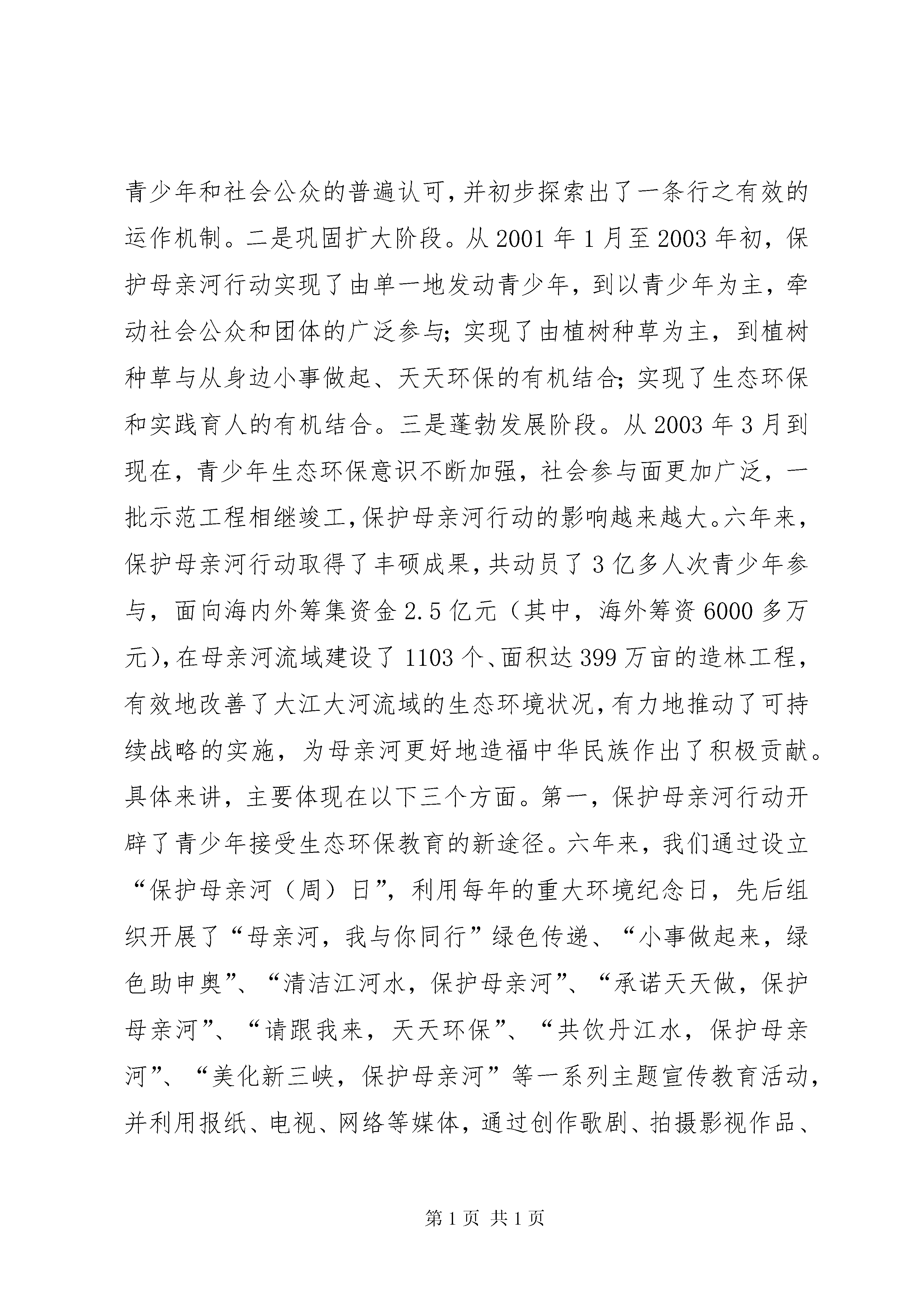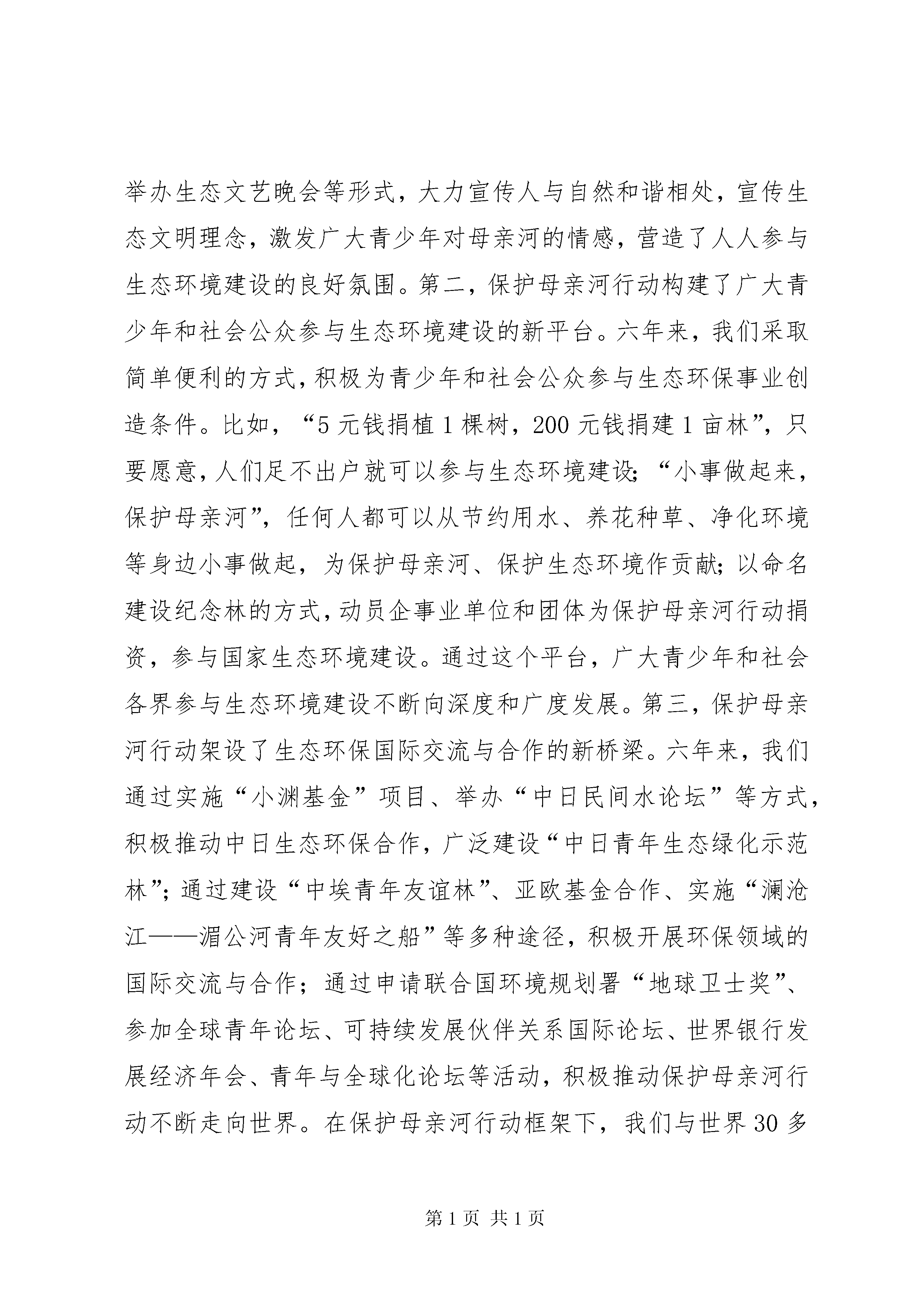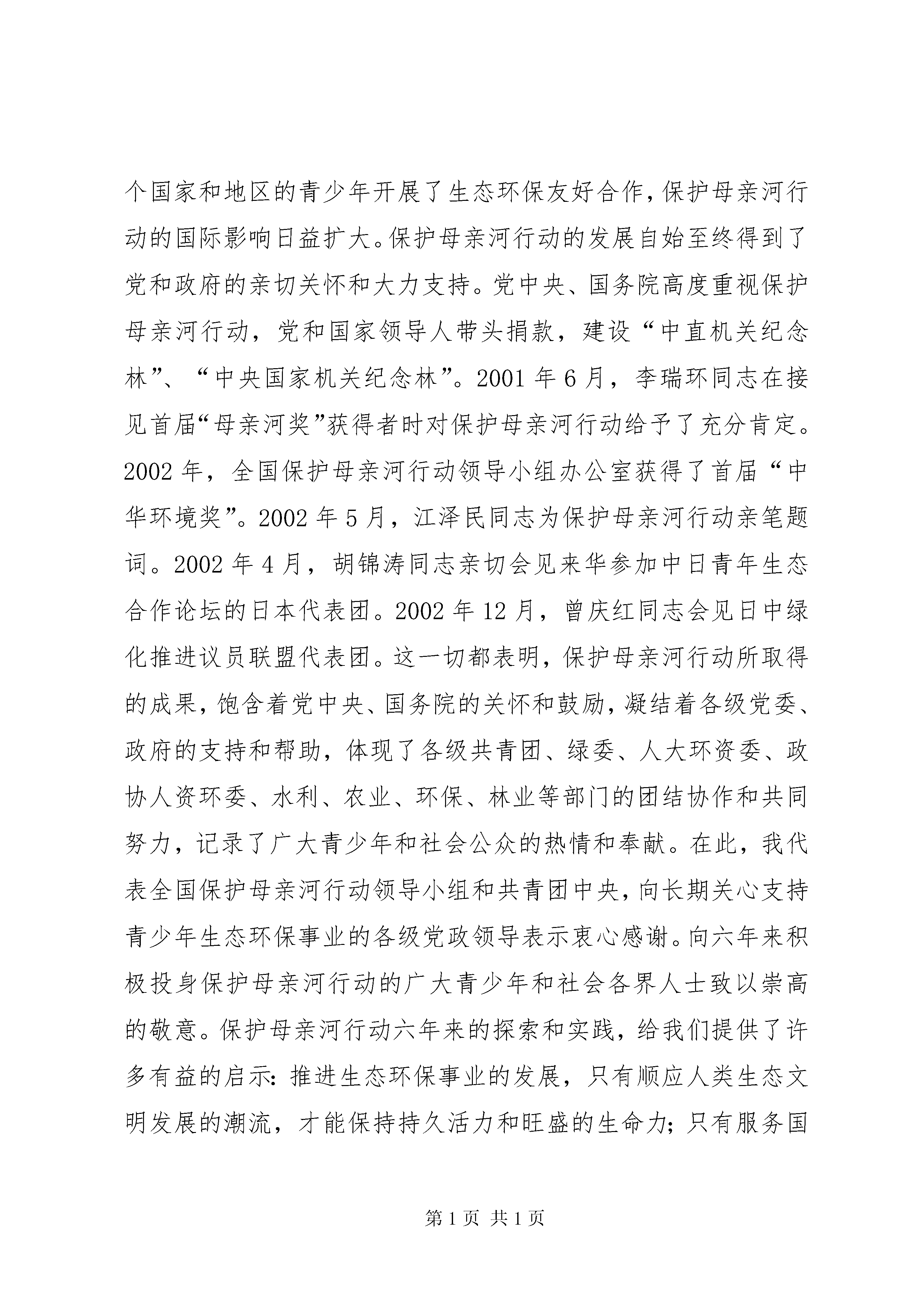 周强同志在保护母亲河行动大会上的讲话今天,共青团中央联合全国绿化委员会、全国人大环境与资源保护委员会、全国政协人口资源环境委员会、水利部、农业部、国家环境保护总局、国家林业局、国务院三峡工程建设委员会办公室,隆重召开保护母亲河行动大会。会议的主要任务是,以邓小平理论和“三个代表”重要思想为指导,贯彻落实科学发展观,总结回顾六年来保护母亲河行动的成绩和经验,部署今后一个时期保护母亲河行动的各项工作,进一步动员引导广大青少年积极参与生态环境保护和建设,为构建社会主义和谐社会作贡献。党中央、国务院对这项工作十分重视,中共中央政治局委员、国务院副总理曾培炎同志在百忙之中出席大会并将发表重要讲话,我们深受鼓舞,倍感振奋,会后要狠抓落实。下面,我代表全国保护母亲河行动领导小组,讲三点意见。一、六年来保护母亲河行动工作的简要回顾保护母亲河行动以保护哺育中华民族的母亲河为主题,以社会化参与、工程化建设、项目化管理的方式,组织动员广大青少年和社会公众参与我国生态环境建设,在保护环境、改善生态、促进经济社会可持续发展等方面具有十分重要的作用。以1999年1月召开保护母亲河行动第一次电视电话会议为起点,六年来,保护母亲河行动的发展大体经过了三个阶段:一是探索起步阶段。从1999年初至2000年底,保护母亲河行动从无到有、从小到大,得到了广大青少年和社会公众的普遍认可,并初步探索出了一条行之有效的运作机制。二是巩固扩大阶段。从2001年1月至2003年初,保护母亲河行动实现了由单一地发动青少年,到以青少年为主,牵动社会公众和团体的广泛参与;实现了由植树种草为主,到植树种草与从身边小事做起、天天环保的有机结合;实现了生态环保和实践育人的有机结合。三是蓬勃发展阶段。从2003年3月到现在,青少年生态环保意识不断加强,社会参与面更加广泛,一批示范工程相继竣工,保护母亲河行动的影响越来越大。六年来,保护母亲河行动取得了丰硕成果,共动员了3亿多人次青少年参与,面向海内外筹集资金2.5亿元(其中,海外筹资6000多万元),在母亲河流域建设了1103个、面积达399万亩的造林工程,有效地改善了大江大河流域的生态环境状况,有力地推动了可持续战略的实施,为母亲河更好地造福中华民族作出了积极贡献。具体来讲,主要体现在以下三个方面。第一,保护母亲河行动开辟了青少年接受生态环保教育的新途径。六年来,我们通过设立“保护母亲河(周)日”,利用每年的重大环境纪念日,先后组织开展了“母亲河,我与你同行”绿色传递、“小事做起来,绿色助申奥”、“清洁江河水,保护母亲河”、“承诺天天做,保护母亲河”、“请跟我来,天天环保”、“共饮丹江水,保护母亲河”、“美化新三峡,保护母亲河”等一系列主题宣传教育活动,并利用报纸、电视、网络等媒体,通过创作歌剧、拍摄影视作品、举办生态文艺晚会等形式,大力宣传人与自然和谐相处,宣传生态文明理念,激发广大青少年对母亲河的情感,营造了人人参与生态环境建设的良好氛围。第二,保护母亲河行动构建了广大青少年和社会公众参与生态环境建设的新平台。六年来,我们采取简单便利的方式,积极为青少年和社会公众参与生态环保事业创造条件。比如,“5元钱捐植1棵树,200元钱捐建1亩林”,只要愿意,人们足不出户就可以参与生态环境建设;“小事做起来,保护母亲河”,任何人都可以从节约用水、养花种草、净化环境等身边小事做起,为保护母亲河、保护生态环境作贡献;以命名建设纪念林的方式,动员企事业单位和团体为保护母亲河行动捐资,参与国家生态环境建设。通过这个平台,广大青少年和社会各界参与生态环境建设不断向深度和广度发展。第三,保护母亲河行动架设了生态环保国际交流与合作的新桥梁。六年来,我们通过实施“小渊基金”项目、举办“中日民间水论坛”等方式,积极推动中日生态环保合作,广泛建设“中日青年生态绿化示范林”;通过建设“中埃青年友谊林”、亚欧基金合作、实施“澜沧江——湄公河青年友好之船”等多种途径,积极开展环保领域的国际交流与合作;通过申请联合国环境规划署“地球卫士奖”、参加全球青年论坛、可持续发展伙伴关系国际论坛、世界银行发展经济年会、青年与全球化论坛等活动,积极推动保护母亲河行动不断走向世界。在保护母亲河行动框架下,我们与世界30多个国家和地区的青少年开展了生态环保友好合作,保护母亲河行动的国际影响日益扩大。保护母亲河行动的发展自始至终得到了党和政府的亲切关怀和大力支持。党中央、国务院高度重视保护母亲河行动,党和国家领导人带头捐款,建设“中直机关纪念林”、“中央国家机关纪念林”。2001年6月,李瑞环同志在接见首届“母亲河奖”获得者时对保护母亲河行动给予了充分肯定。2002年,全国保护母亲河行动领导小组办公室获得了首届“中华环境奖”。2002年5月,江泽民同志为保护母亲河行