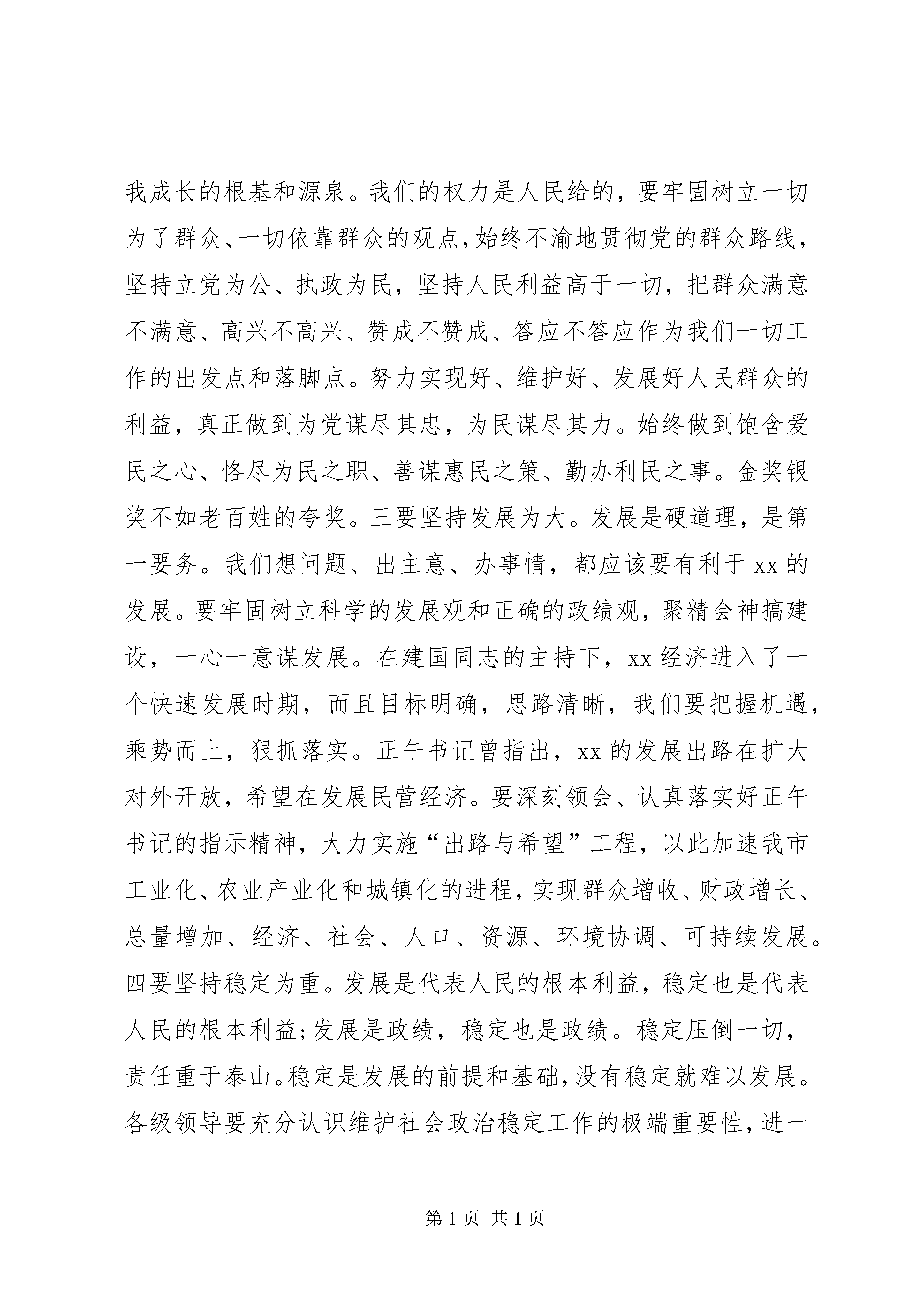 周德睿同志任XX市委书记!(周书记在领导干部大会上讲话全文)尊敬的各位领导,各位老同志,同志们:省委安排我来全省第一人口大市--xx市任书记,能与xx人民一起工作、生活,我感到非常荣幸和高兴。在此,我要衷心感谢组织上对我的培养、教育、信任;感谢阳生部长、宗文处长送我到岗;感谢大家对我的欢迎;刚才,阳生部长、建国书记作了重要讲话,我们一定要认真学习、深刻领会,在工作中贯彻落实好。xx物华天宝、人杰地灵。灵秀的山水,淳厚的民风,孕育出一代又一代风云人物。大家所熟知的中国第一个“睁眼看世界”的著名思想家魏源,叱咤风云、讨袁护国的民主革命先驱蔡锷,当代音乐家贺绿汀等就是他们中的杰出代表。改革开放以来,xx市经济社会加快发展。特别是近几年来,在省委、省政府的正确领导下,以建国同志为首的xx市委领导班子率领全市人民真抓实干、改革创新、励精图治、团结战斗,发展思路大步提升,经济建设快速发展,各项改革深入推进,社会大局保持稳定,人民生活水平显著提高,三个文明建设取得巨大成就,创造了xx发展史上的辉煌时期。现在,建国同志要离开xx就任省委常委、宣传部长,担负起更重要的领导责任,作为继任者,我除了衷心祝贺他荣升之外,更对他在xx留下的光辉业绩怀有深深的敬意。借此机会,我提议,让我们以热烈的掌声衷心感谢建国同志为xx三个文明建设作出的重大贡献。同时,衷心地祝愿他在新的领导岗位上大展宏图,也热切期盼他一如既往地关心xx工作,重视xx建设,支持xx发展。带着组织的重托,今天我走上xx市市委书记岗位,我深知省委这一任命的份量,肩上的担子有多重,承接的责任有多大。我更明白,作为一名年纪较轻的领导干部,我的知识、能力、经验有限,与xx这样一个大市市委书记这一职务的要求还有相当的距离。尤其这几年,xx在建国同志的坚强领导下,进步快,变化大,起点高,我深感压力很大。但我深信,有省委、省政府的正确领导,有历届市委、市政府打下的坚实基础,有市委一班人和人大、政府、政协、军分区几大家班子的密切配合,有各位老领导、老同志的指导帮助,尤其是天锡、刚强、新民、胡奇、太平等同志的鼎力相助和在座各位的配合以及全市的领导干部和广大人民群众的支持,我对xx的发展充满信心。我一直相信,事在人为,勤能补拙,只要我们勤奋努力,扎实苦干,就会有所作为。刚才,阳生部长对我个人的工作作了过高评价,我深感受之有愧,我将把它当作鼓励和鞭策,竭尽全力做好工作,以回报省委的重托、xx人民的期望。跳出xx看xx,我们改革发展稳定的任务还十分艰巨。我们还面临许多问题和困难,但这些都是前进中的问题,发展中的困难。关于xx当前和今后的工作,下车伊始,没有调查研究,没有更多发言权。但有一点是非常明确的,那就是要努力维护好、发展好来之不易的大好局面,坚定不移、不折不扣、一步一个脚印地实施好市第八次党代会确定的发展思路和奋斗目标。现在,作为xx市委书记,我已是xx人民中的一员。我将同市委一班人一起,同全市人民一道,同甘共苦,风雨同舟,以最大的决心和意志,认真学习,深入调研、开拓进取,励精图治,在继承中创新,在创新中发展,不断推进xx的改革发展和现代化建设事业,共同创造xx美好的明天。这里,我就如何做事、做人、做官谈点自己的看法和意见,既是个人的自律,也与同志们共勉:第一,要认真办事。一要坚持正确的政治方向。要始终保持政治上的清醒和坚定,认真贯彻落实党的路线方针政策,认真实践“三个代表”,自觉与党中央保持高度一致,切实维护党委政府的权威,保证政令畅通,这是我们认真办事的前提和基础。如果犯了方向性错误,无论你怎么认真,所办之事很难达到预期的目的,甚至会贻害我们的事业。因此,要不断提高政治敏锐性和洞察力,善于从政治上认识问题、处理问题。从这个意义上讲,认真办事,首先要在大是大非问题上“认真”。二要坚持以民为本。我出生于矿工家庭,由一个普通工人逐步成长为一名市级领导干部。党的教育、组织的培养、人民的抚育、同志们的帮助是我成长的根基和源泉。我们的权力是人民给的,要牢固树立一切为了群众、一切依靠群众的观点,始终不渝地贯彻党的群众路线,坚持立党为公、执政为民,坚持人民利益高于一切,把群众满意不满意、高兴不高兴、赞成不赞成、答应不答应作为我们一切工作的出发点和落脚点。努力实现好、维护好、发展好人民群众的利益,真正做到为党谋尽其忠,为民谋尽其力。始终做到饱含爱民之心、恪尽为民之职、善谋惠民之策、勤办利民之事。金奖银奖不如老百姓的夸奖。三要坚持发展为大。发展是硬道理,是第一要务。我们想问题、出主意、办事情,都应该要有利于xx的发展。要牢固树立科学的发展观和正确的政绩观,聚精会神搞建设,一心一意谋发展。在建国同志的主持下,xx经济进入了一个快速发展时期,而且目标明确,思路清晰,我们要把握机遇,乘势而上,狠抓落实