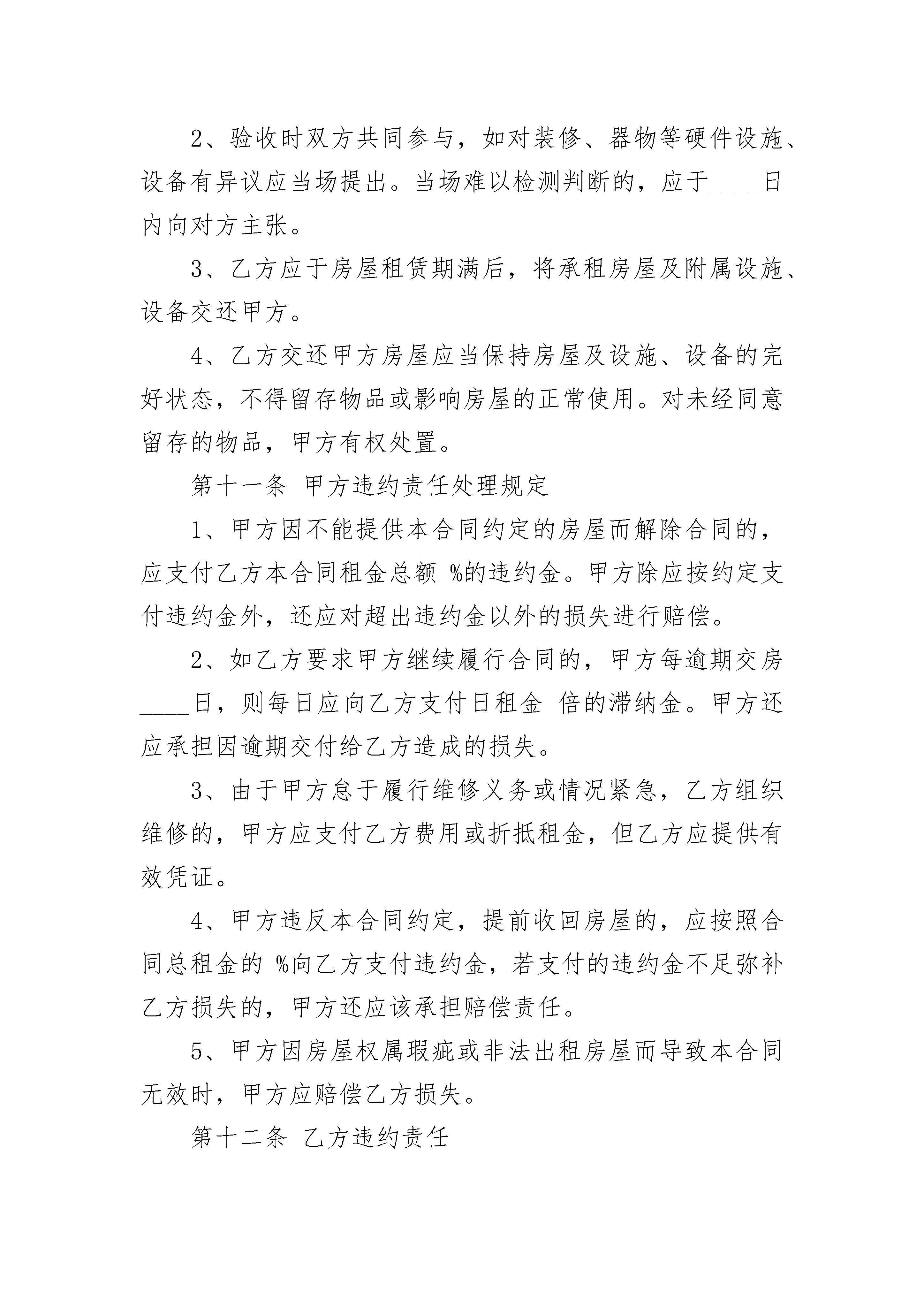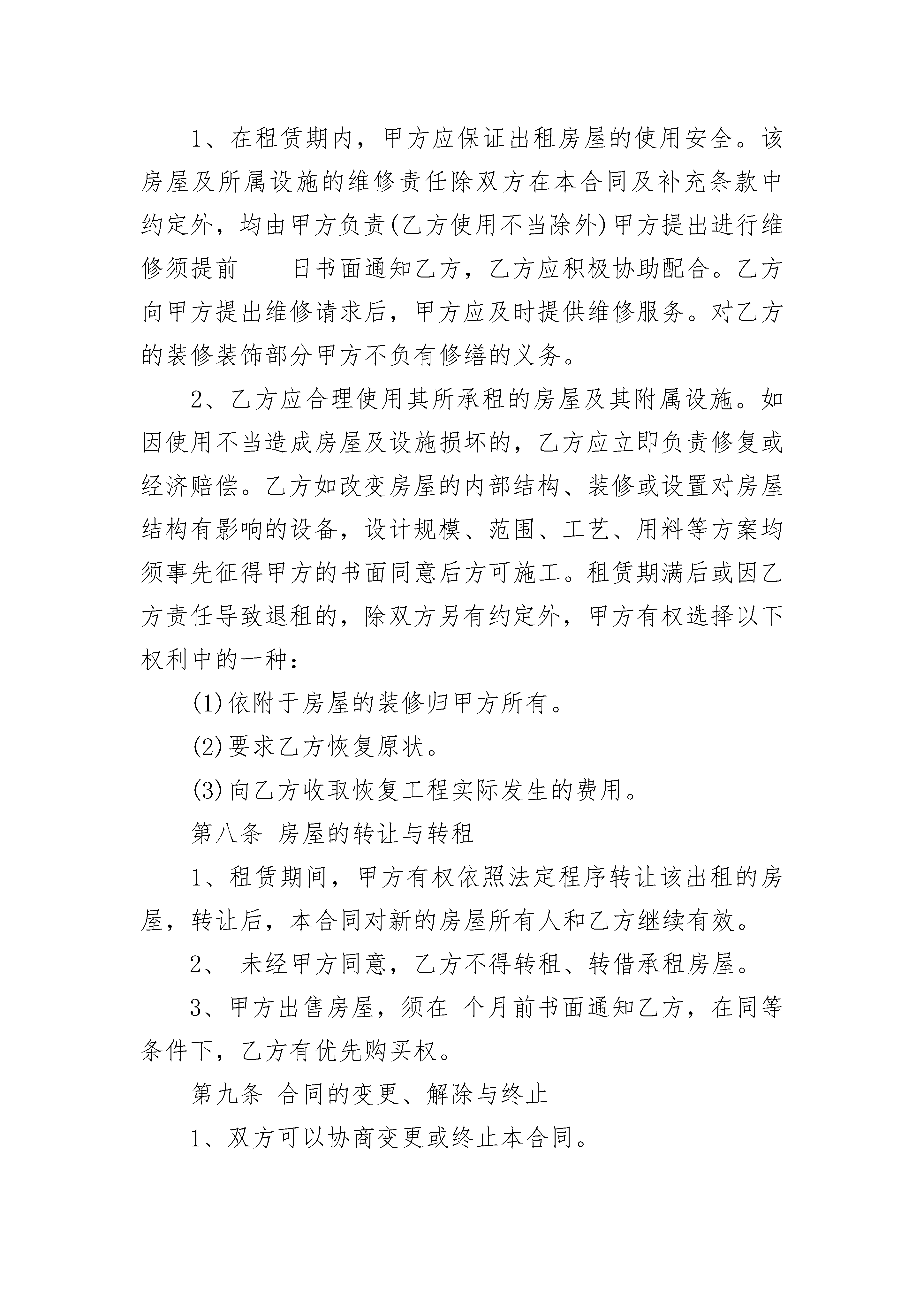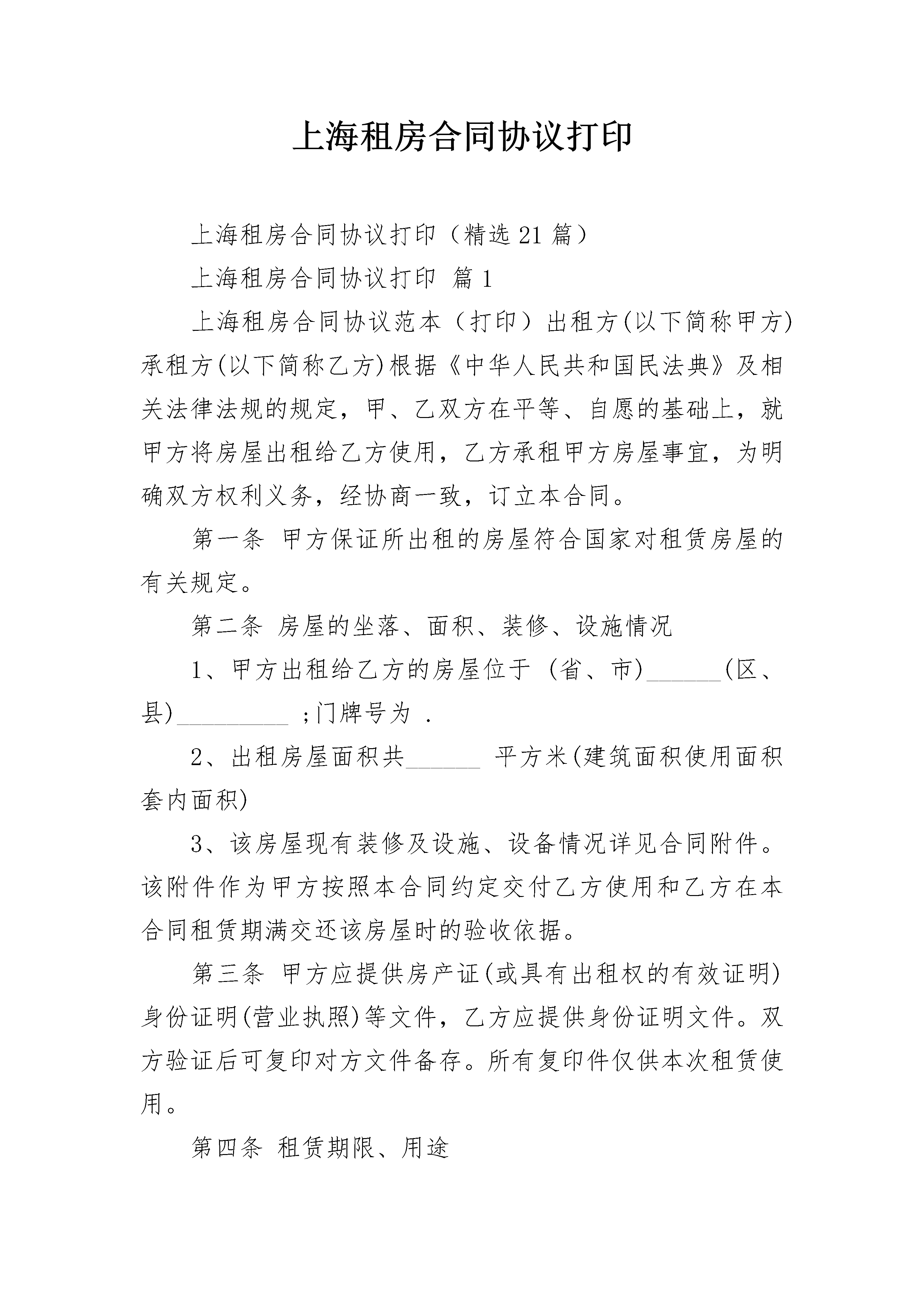上海租房合同协议打印上海租房合同协议打印(精选21篇)上海租房合同协议打印篇1上海租房合同协议范本(打印)出租方(以下简称甲方)承租方(以下简称乙方)根据《中华人民共和国民法典》及相关法律法规的规定,甲、乙双方在平等、自愿的基础上,就甲方将房屋出租给乙方使用,乙方承租甲方房屋事宜,为明确双方权利义务,经协商一致,订立本合同。第一条甲方保证所出租的房屋符合国家对租赁房屋的有关规定。第二条房屋的坐落、面积、装修、设施情况1、甲方出租给乙方的房屋位于(省、市)______(区、县)_________;门牌号为.2、出租房屋面积共______平方米(建筑面积使用面积套内面积)3、该房屋现有装修及设施、设备情况详见合同附件。该附件作为甲方按照本合同约定交付乙方使用和乙方在本合同租赁期满交还该房屋时的验收依据。第三条甲方应提供房产证(或具有出租权的有效证明)身份证明(营业执照)等文件,乙方应提供身份证明文件。双方验证后可复印对方文件备存。所有复印件仅供本次租赁使用。第四条租赁期限、用途1、该房屋租赁期共___个月。自________年____月____日起至________年____月____日止。2、乙方向甲方承诺,租赁该房屋仅作为_______使用。3、租赁期满,甲方有权收回出租房屋,乙方应如期交还。乙方如要求续租,则必须在租赁期满个月之前书面通知甲方,经甲方同意后,重新签订租赁合同。第五条租金及支付方式1、该房屋每月租金为________元(大写____万____仟____佰____拾____元整)租金总额为________元(大写____万____仟____佰____拾____元整)2、房屋租金支付方式如下:__________________________________.甲方收款后应提供给乙方有效的收款凭证。第六条租赁期间相关费用及税金1、甲方应承担的费用:(1)租赁期间,房屋和土地的产权税由甲方依法交纳。如果发生政府有关部门征收本合同中未列出项目但与该房屋有关的费用,应由甲方负担。(2)2、乙方交纳以下费用:(1)(2)乙方应按时交纳自行负担的费用。甲方不得擅自增加本合同未明确由乙方交纳的费用。第七条房屋修缮与使用1、在租赁期内,甲方应保证出租房屋的使用安全。该房屋及所属设施的维修责任除双方在本合同及补充条款中约定外,均由甲方负责(乙方使用不当除外)甲方提出进行维修须提前____日书面通知乙方,乙方应积极协助配合。乙方向甲方提出维修请求后,甲方应及时提供维修服务。对乙方的装修装饰部分甲方不负有修缮的义务。2、乙方应合理使用其所承租的房屋及其附属设施。如因使用不当造成房屋及设施损坏的,乙方应立即负责修复或经济赔偿。乙方如改变房屋的内部结构、装修或设置对房屋结构有影响的设备,设计规模、范围、工艺、用料等方案均须事先征得甲方的书面同意后方可施工。租赁期满后或因乙方责任导致退租的,除双方另有约定外,甲方有权选择以下权利中的一种:(1)依附于房屋的装修归甲方所有。(2)要求乙方恢复原状。(3)向乙方收取恢复工程实际发生的费用。第八条房屋的转让与转租1、租赁期间,甲方有权依照法定程序转让该出租的房屋,转让后,本合同对新的房屋所有人和乙方继续有效。2、未经甲方同意,乙方不得转租、转借承租房屋。3、甲方出售房屋,须在个月前书面通知乙方,在同等条件下,乙方有优先购买权。第九条合同的变更、解除与终止1、双方可以协商变更或终止本合同。2、甲方有以下行为之一的,乙方有权解除合同:(1)不能提供房屋或所提供房屋不符合约定条件,严重影响居住。(2)甲方未尽房屋修缮义务,严重影响居住的。3、房屋租赁期间,乙方有下列行为之一的,甲方有权解除合同,收回出租房屋;(1)未经甲方书面同意,转租、转借承租房屋。(2)未经甲方书面同意,拆改变动房屋结构。(3)损坏承租房屋,在甲方提出的合理期限内仍未修复的。(4)未经甲方书面同意,改变本合同约定的房屋租赁用途。(5)利用承租房屋存放危险物品或进行违法活动。(6)逾期未交纳按约定应当由乙方交纳的各项费用,已经给甲方造成严重损害的。(7)拖欠房租累计个月以上。4、租赁期满前,乙方要继续租赁的,应当在租赁期满个月前书面通知甲方。如甲方在租期届满后仍要对外出租的,在同等条件下,乙方享有优先承租权。5、租赁期满合同自然终止。6、因不可抗力因素导致合同无法履行的,合同终止。第十条房屋交付及收回的验收1、甲方应保证租赁房屋本身及附属设施、设备处于能够正常使用状态。2、验收时双方共同参与,如对装修、器物等硬件设施、设备有异议应当场提出。当场难以检测判断的,应于____日内向对方主张。3、乙方应于房屋租赁期满后,将承租房屋及附属设施、设备交还甲方。4、乙方交还甲方房屋应当保持房屋及设施、设备的完好状态,不得留存物品或影响房屋的正
