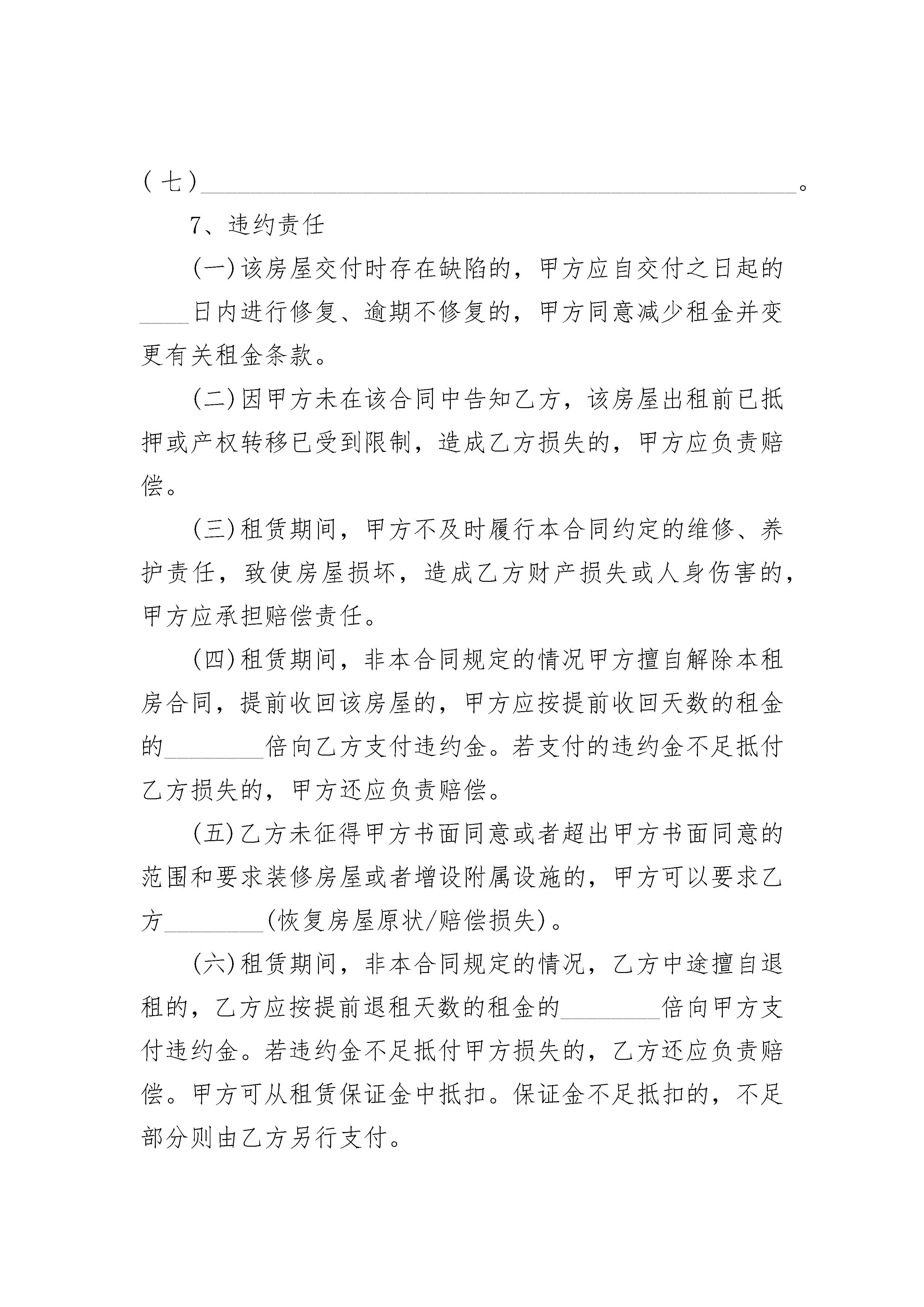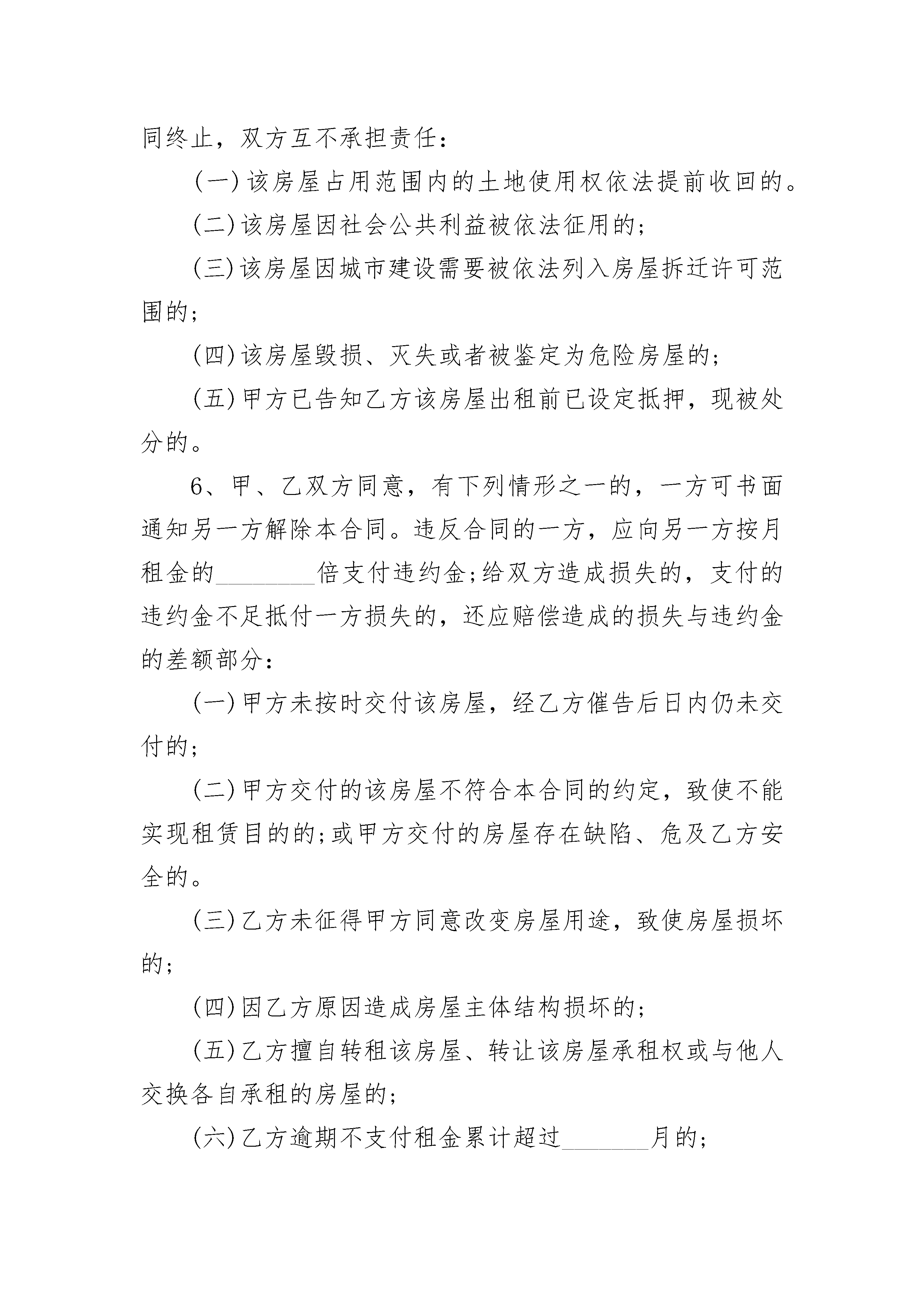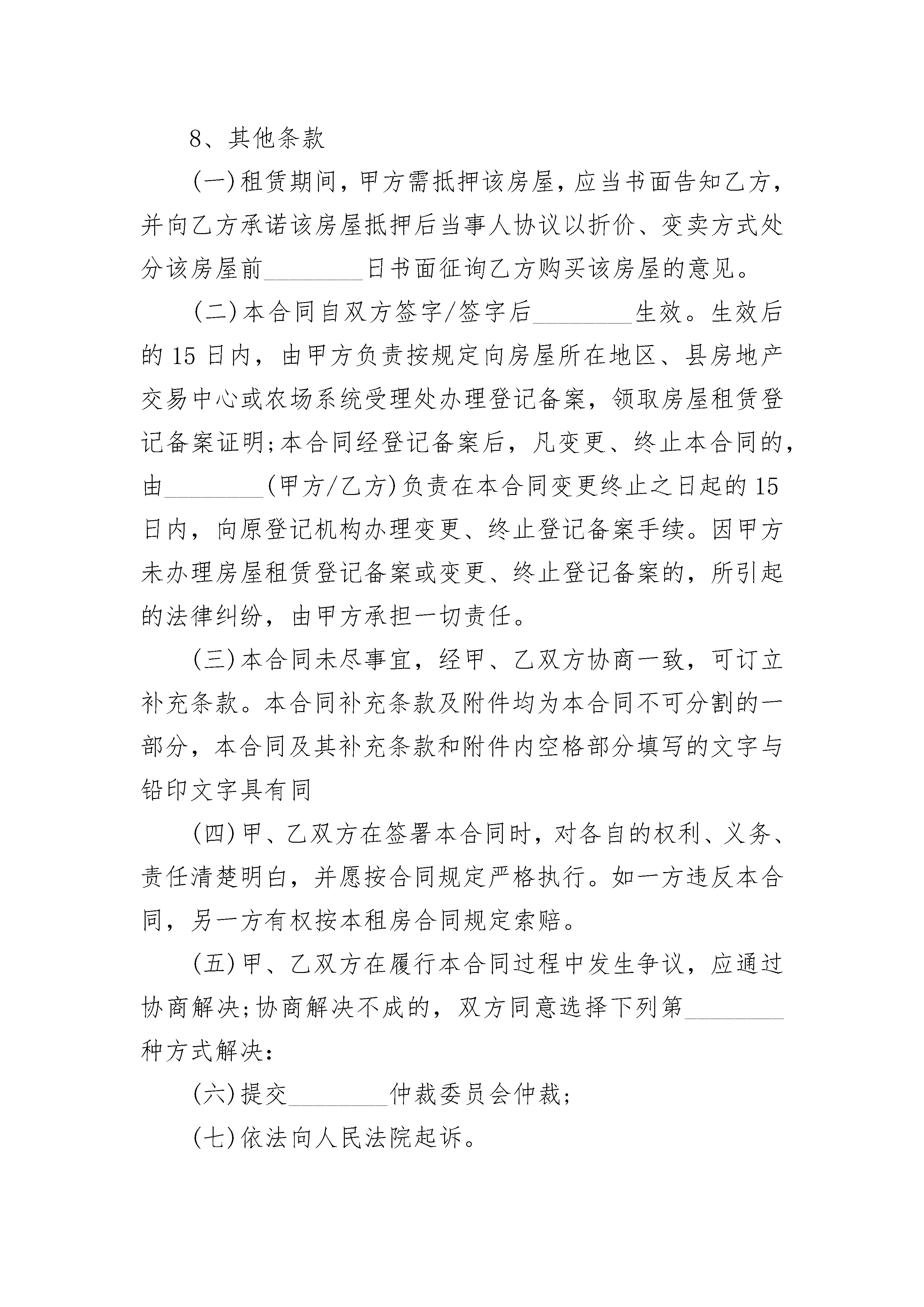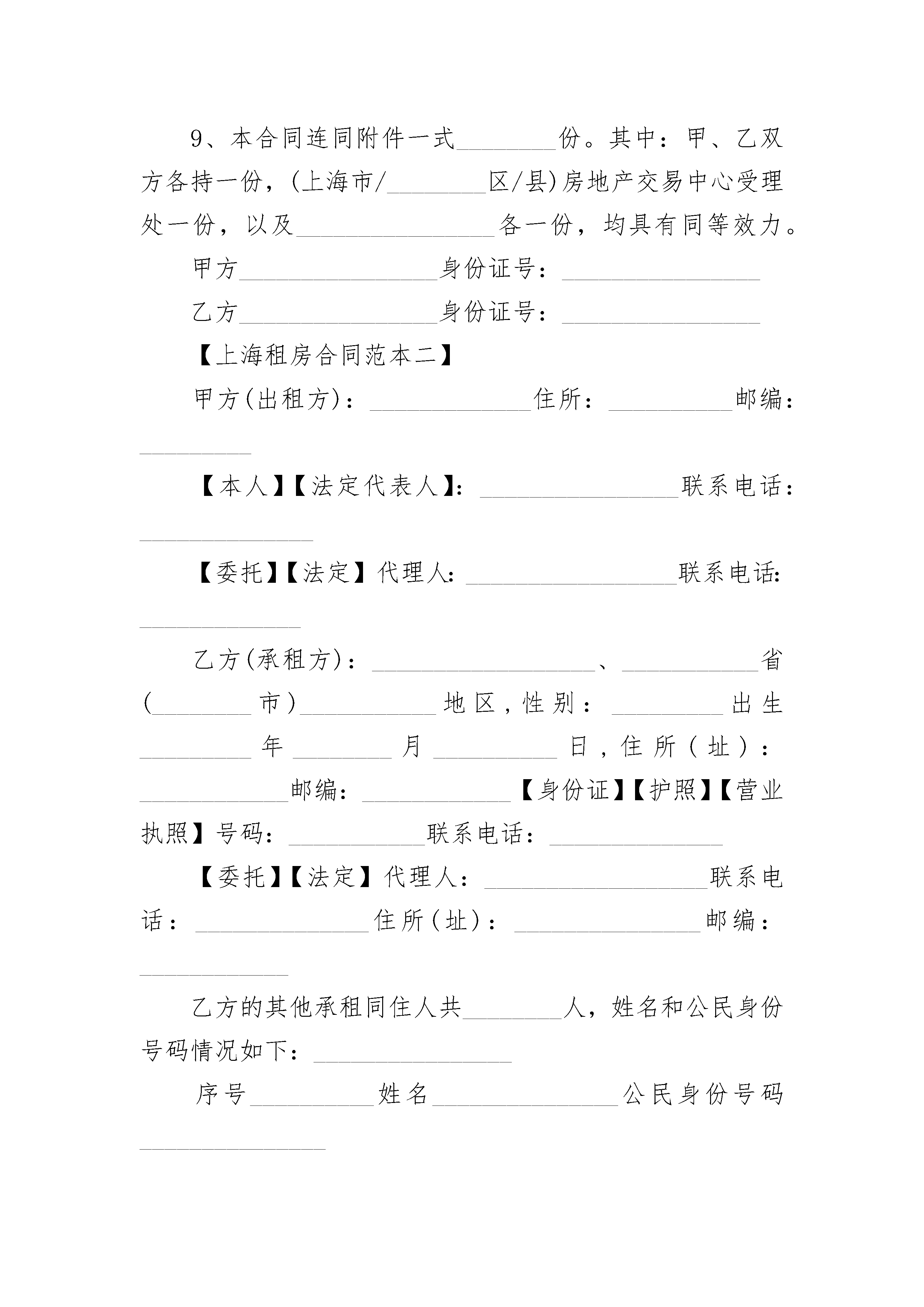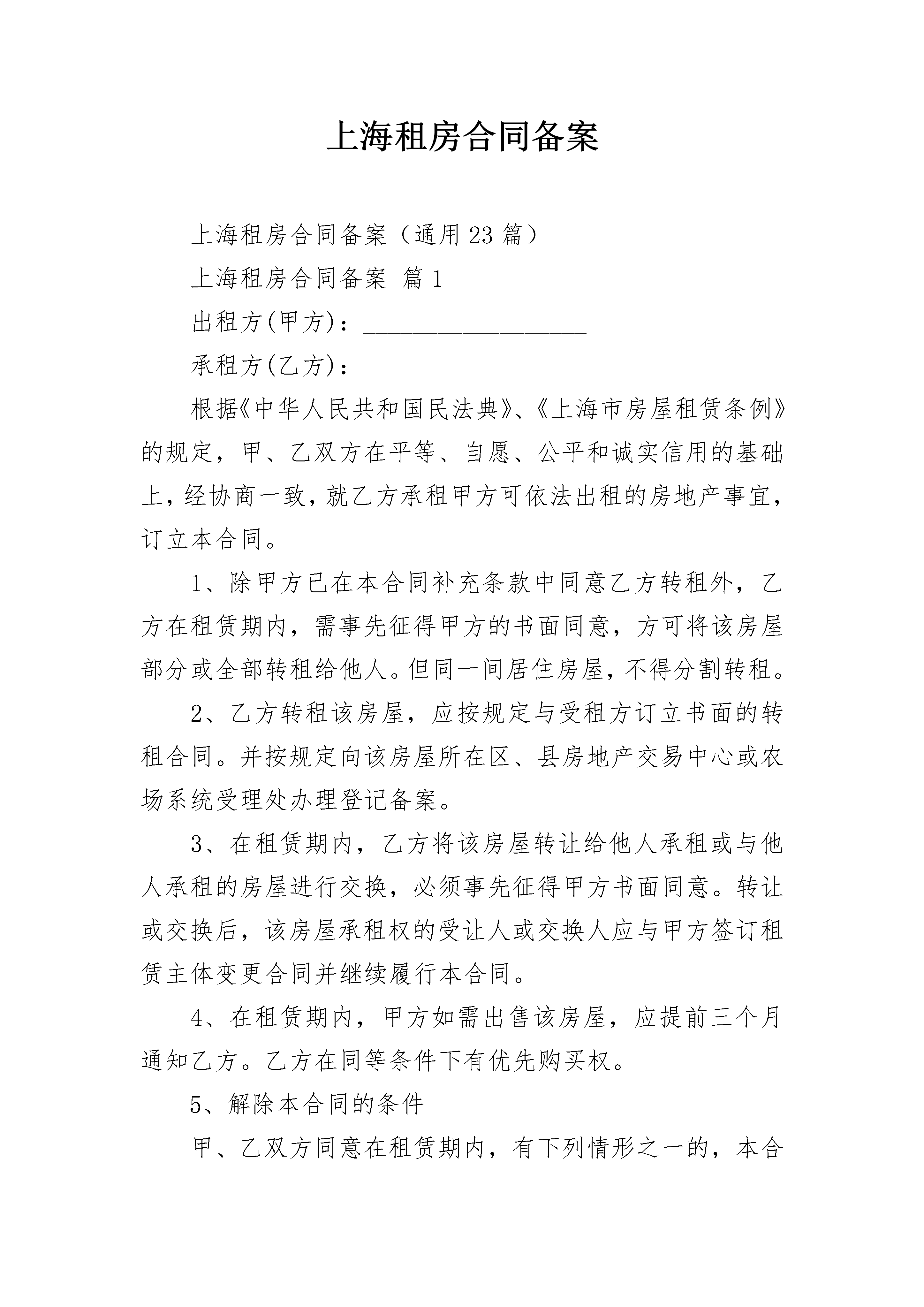上海租房合同备案上海租房合同备案(通用23篇)上海租房合同备案篇1出租方(甲方):__________________承租方(乙方):_______________________根据《中华人民共和国民法典》、《上海市房屋租赁条例》的规定,甲、乙双方在平等、自愿、公平和诚实信用的基础上,经协商一致,就乙方承租甲方可依法出租的房地产事宜,订立本合同。1、除甲方已在本合同补充条款中同意乙方转租外,乙方在租赁期内,需事先征得甲方的书面同意,方可将该房屋部分或全部转租给他人。但同一间居住房屋,不得分割转租。2、乙方转租该房屋,应按规定与受租方订立书面的转租合同。并按规定向该房屋所在区、县房地产交易中心或农场系统受理处办理登记备案。3、在租赁期内,乙方将该房屋转让给他人承租或与他人承租的房屋进行交换,必须事先征得甲方书面同意。转让或交换后,该房屋承租权的受让人或交换人应与甲方签订租赁主体变更合同并继续履行本合同。4、在租赁期内,甲方如需出售该房屋,应提前三个月通知乙方。乙方在同等条件下有优先购买权。5、解除本合同的条件甲、乙双方同意在租赁期内,有下列情形之一的,本合同终止,双方互不承担责任:(一)该房屋占用范围内的土地使用权依法提前收回的。(二)该房屋因社会公共利益被依法征用的;(三)该房屋因城市建设需要被依法列入房屋拆迁许可范围的;(四)该房屋毁损、灭失或者被鉴定为危险房屋的;(五)甲方已告知乙方该房屋出租前已设定抵押,现被处分的。6、甲、乙双方同意,有下列情形之一的,一方可书面通知另一方解除本合同。违反合同的一方,应向另一方按月租金的________倍支付违约金;给双方造成损失的,支付的违约金不足抵付一方损失的,还应赔偿造成的损失与违约金的差额部分:(一)甲方未按时交付该房屋,经乙方催告后日内仍未交付的;(二)甲方交付的该房屋不符合本合同的约定,致使不能实现租赁目的的;或甲方交付的房屋存在缺陷、危及乙方安全的。(三)乙方未征得甲方同意改变房屋用途,致使房屋损坏的;(四)因乙方原因造成房屋主体结构损坏的;(五)乙方擅自转租该房屋、转让该房屋承租权或与他人交换各自承租的房屋的;(六)乙方逾期不支付租金累计超过_______月的;(七)________________________________________________。7、违约责任(一)该房屋交付时存在缺陷的,甲方应自交付之日起的____日内进行修复、逾期不修复的,甲方同意减少租金并变更有关租金条款。(二)因甲方未在该合同中告知乙方,该房屋出租前已抵押或产权转移已受到限制,造成乙方损失的,甲方应负责赔偿。(三)租赁期间,甲方不及时履行本合同约定的维修、养护责任,致使房屋损坏,造成乙方财产损失或人身伤害的,甲方应承担赔偿责任。(四)租赁期间,非本合同规定的情况甲方擅自解除本租房合同,提前收回该房屋的,甲方应按提前收回天数的租金的________倍向乙方支付违约金。若支付的违约金不足抵付乙方损失的,甲方还应负责赔偿。(五)乙方未征得甲方书面同意或者超出甲方书面同意的范围和要求装修房屋或者增设附属设施的,甲方可以要求乙方________(恢复房屋原状/赔偿损失)。(六)租赁期间,非本合同规定的情况,乙方中途擅自退租的,乙方应按提前退租天数的租金的________倍向甲方支付违约金。若违约金不足抵付甲方损失的,乙方还应负责赔偿。甲方可从租赁保证金中抵扣。保证金不足抵扣的,不足部分则由乙方另行支付。8、其他条款(一)租赁期间,甲方需抵押该房屋,应当书面告知乙方,并向乙方承诺该房屋抵押后当事人协议以折价、变卖方式处分该房屋前________日书面征询乙方购买该房屋的意见。(二)本合同自双方签字/签字后________生效。生效后的15日内,由甲方负责按规定向房屋所在地区、县房地产交易中心或农场系统受理处办理登记备案,领取房屋租赁登记备案证明;本合同经登记备案后,凡变更、终止本合同的,由________(甲方/乙方)负责在本合同变更终止之日起的15日内,向原登记机构办理变更、终止登记备案手续。因甲方未办理房屋租赁登记备案或变更、终止登记备案的,所引起的法律纠纷,由甲方承担一切责任。(三)本合同未尽事宜,经甲、乙双方协商一致,可订立补充条款。本合同补充条款及附件均为本合同不可分割的一部分,本合同及其补充条款和附件内空格部分填写的文字与铅印文字具有同(四)甲、乙双方在签署本合同时,对各自的权利、义务、责任清楚明白,并愿按合同规定严格执行。如一方违反本合同,另一方有权按本租房合同规定索赔。(五)甲、乙双方在履行本合同过程中发生争议,应通过协商解决;协商解决不成的,双方同意选择下列第________种方式解决:(六)提交________仲裁委员会仲裁;(七)依法向人民法院起诉。9、本合同连同附