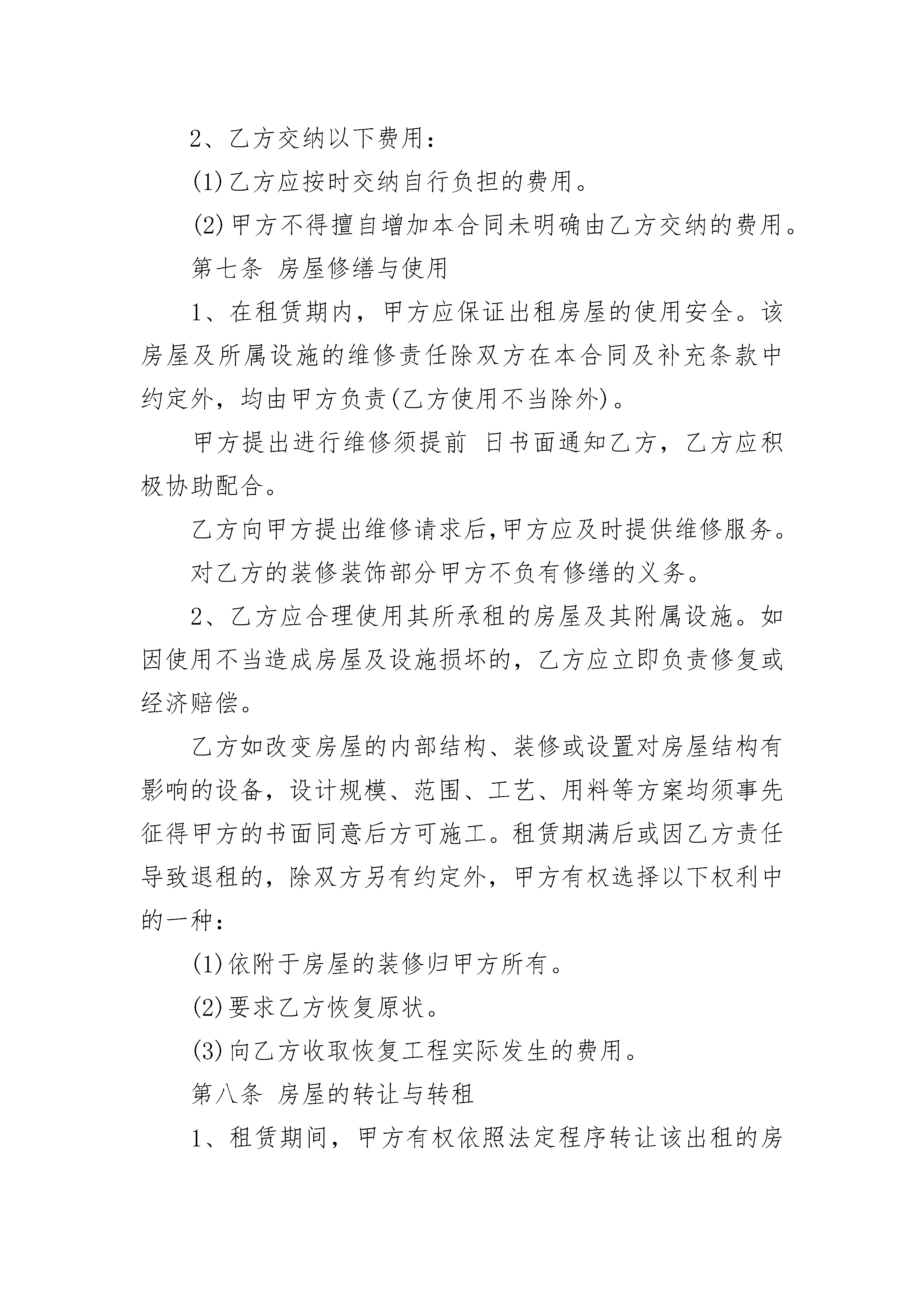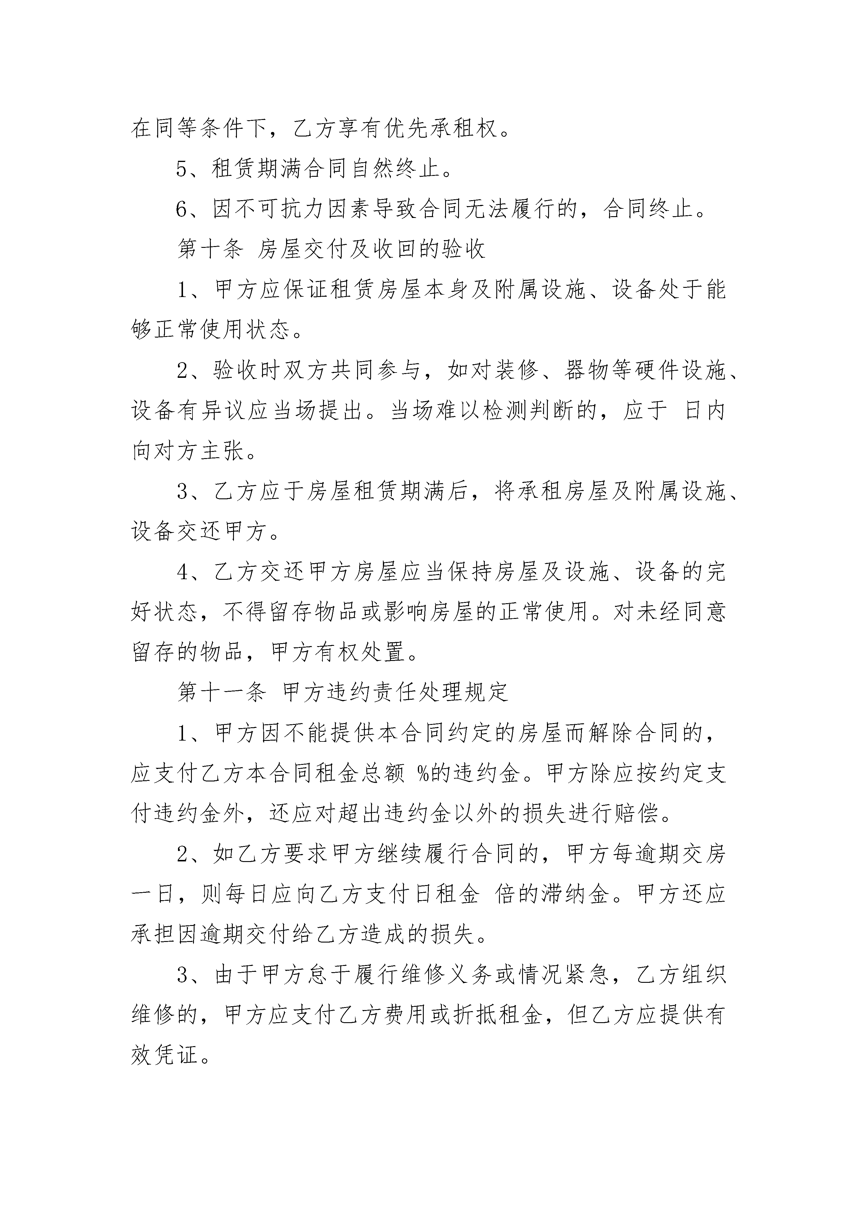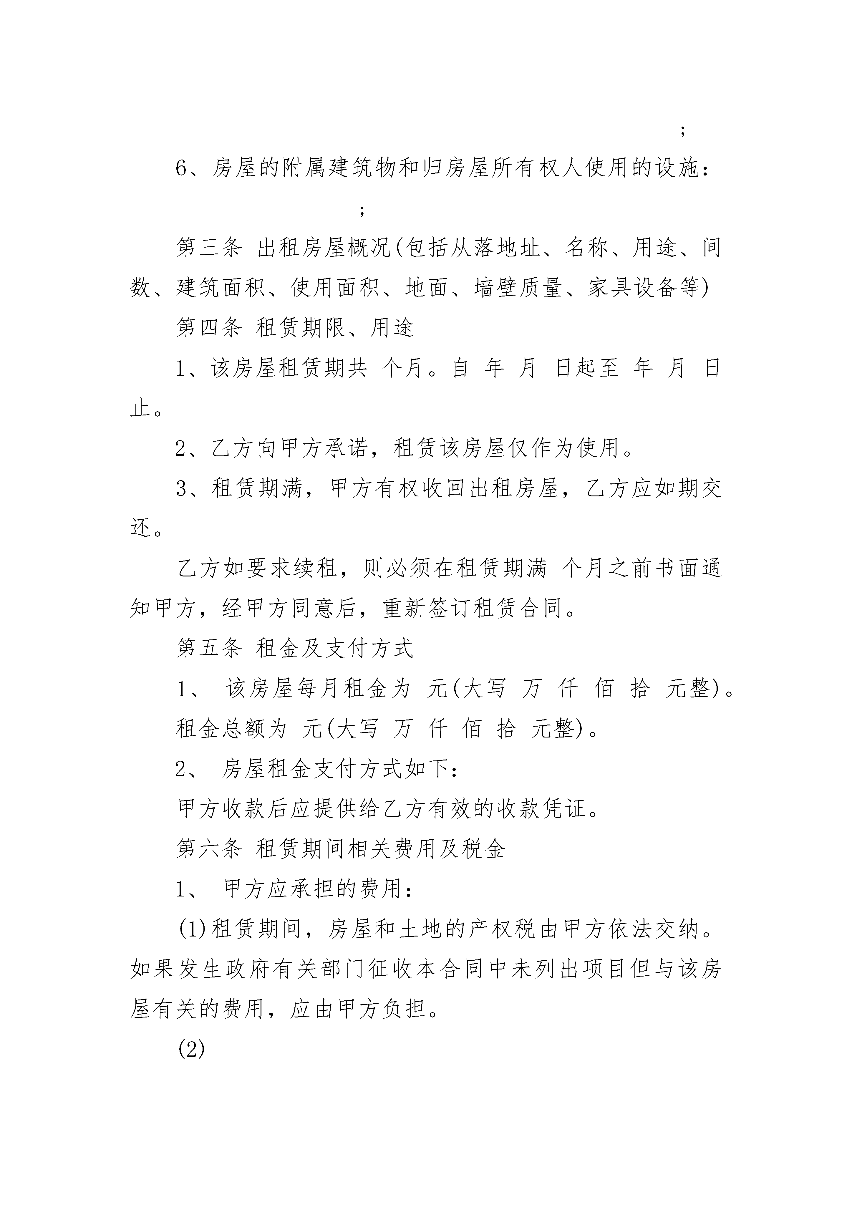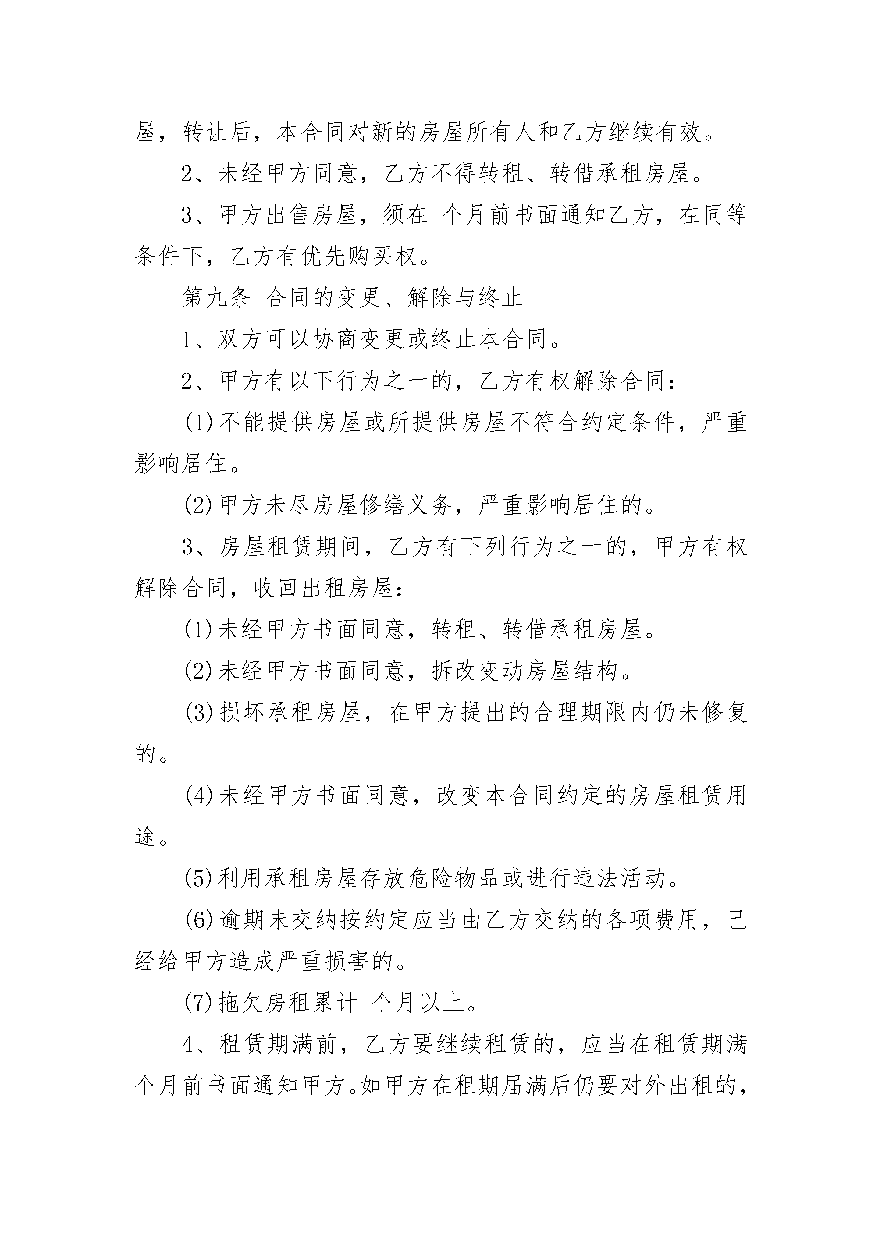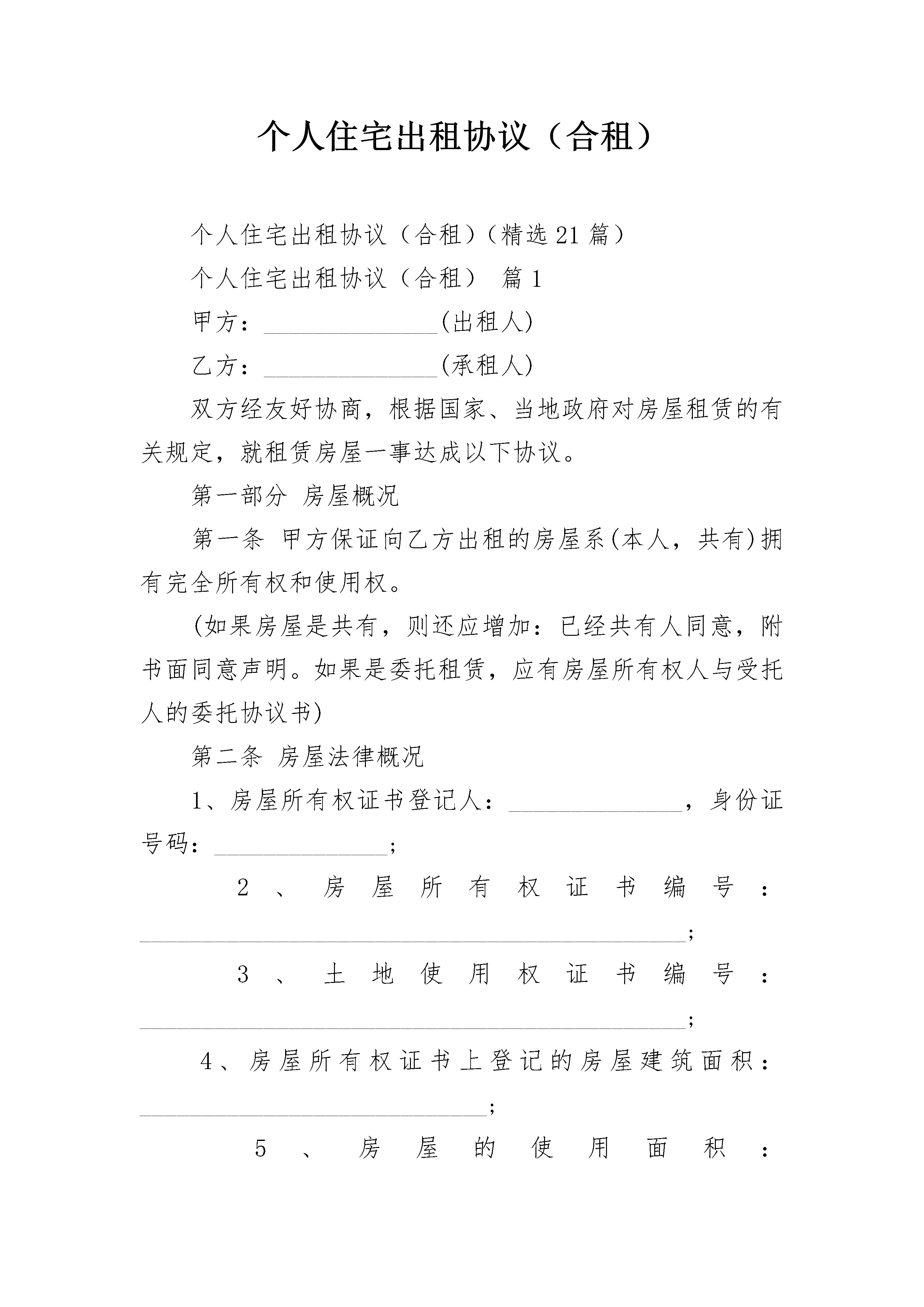 个人住宅出租协议(合租)个人住宅出租协议(合租)(精选21篇)个人住宅出租协议(合租)篇1甲方:______________(出租人)乙方:______________(承租人)双方经友好协商,根据国家、当地政府对房屋租赁的有关规定,就租赁房屋一事达成以下协议。第一部分房屋概况第一条甲方保证向乙方出租的房屋系(本人,共有)拥有完全所有权和使用权。(如果房屋是共有,则还应增加:已经共有人同意,附书面同意声明。如果是委托租赁,应有房屋所有权人与受托人的委托协议书)第二条房屋法律概况1、房屋所有权证书登记人:______________,身份证号码:______________;2、房屋所有权证书编号:____________________________________________;3、土地使用权证书编号:____________________________________________;4、房屋所有权证书上登记的房屋建筑面积:____________________________;5、房屋的使用面积:________________________________________________;6、房屋的附属建筑物和归房屋所有权人使用的设施:____________________;第三条出租房屋概况(包括从落地址、名称、用途、间数、建筑面积、使用面积、地面、墙壁质量、家具设备等)第四条租赁期限、用途1、该房屋租赁期共个月。自年月日起至年月日止。2、乙方向甲方承诺,租赁该房屋仅作为使用。3、租赁期满,甲方有权收回出租房屋,乙方应如期交还。乙方如要求续租,则必须在租赁期满个月之前书面通知甲方,经甲方同意后,重新签订租赁合同。第五条租金及支付方式1、该房屋每月租金为元(大写万仟佰拾元整)。租金总额为元(大写万仟佰拾元整)。2、房屋租金支付方式如下:甲方收款后应提供给乙方有效的收款凭证。第六条租赁期间相关费用及税金1、甲方应承担的费用:(1)租赁期间,房屋和土地的产权税由甲方依法交纳。如果发生政府有关部门征收本合同中未列出项目但与该房屋有关的费用,应由甲方负担。(2)2、乙方交纳以下费用:(1)乙方应按时交纳自行负担的费用。(2)甲方不得擅自增加本合同未明确由乙方交纳的费用。第七条房屋修缮与使用1、在租赁期内,甲方应保证出租房屋的使用安全。该房屋及所属设施的维修责任除双方在本合同及补充条款中约定外,均由甲方负责(乙方使用不当除外)。甲方提出进行维修须提前日书面通知乙方,乙方应积极协助配合。乙方向甲方提出维修请求后,甲方应及时提供维修服务。对乙方的装修装饰部分甲方不负有修缮的义务。2、乙方应合理使用其所承租的房屋及其附属设施。如因使用不当造成房屋及设施损坏的,乙方应立即负责修复或经济赔偿。乙方如改变房屋的内部结构、装修或设置对房屋结构有影响的设备,设计规模、范围、工艺、用料等方案均须事先征得甲方的书面同意后方可施工。租赁期满后或因乙方责任导致退租的,除双方另有约定外,甲方有权选择以下权利中的一种:(1)依附于房屋的装修归甲方所有。(2)要求乙方恢复原状。(3)向乙方收取恢复工程实际发生的费用。第八条房屋的转让与转租1、租赁期间,甲方有权依照法定程序转让该出租的房屋,转让后,本合同对新的房屋所有人和乙方继续有效。2、未经甲方同意,乙方不得转租、转借承租房屋。3、甲方出售房屋,须在个月前书面通知乙方,在同等条件下,乙方有优先购买权。第九条合同的变更、解除与终止1、双方可以协商变更或终止本合同。2、甲方有以下行为之一的,乙方有权解除合同:(1)不能提供房屋或所提供房屋不符合约定条件,严重影响居住。(2)甲方未尽房屋修缮义务,严重影响居住的。3、房屋租赁期间,乙方有下列行为之一的,甲方有权解除合同,收回出租房屋:(1)未经甲方书面同意,转租、转借承租房屋。(2)未经甲方书面同意,拆改变动房屋结构。(3)损坏承租房屋,在甲方提出的合理期限内仍未修复的。(4)未经甲方书面同意,改变本合同约定的房屋租赁用途。(5)利用承租房屋存放危险物品或进行违法活动。(6)逾期未交纳按约定应当由乙方交纳的各项费用,已经给甲方造成严重损害的。(7)拖欠房租累计个月以上。4、租赁期满前,乙方要继续租赁的,应当在租赁期满个月前书面通知甲方。如甲方在租期届满后仍要对外出租的,在同等条件下,乙方享有优先承租权。5、租赁期满合同自然终止。6、因不可抗力因素导致合同无法履行的,合同终止。第十条房屋交付及收回的验收1、甲方应保证租赁房屋本身及附属设施、设备处于能够正常使用状态。2、验收时双方共同参与,如对装修、器物等硬件设施、设备有异议应当场提出。当场难以检测判断的,应于日内向对方主张。3、乙方应于房屋租赁期满后,将承租房屋及附属设施、设备交还甲方。4、乙方交