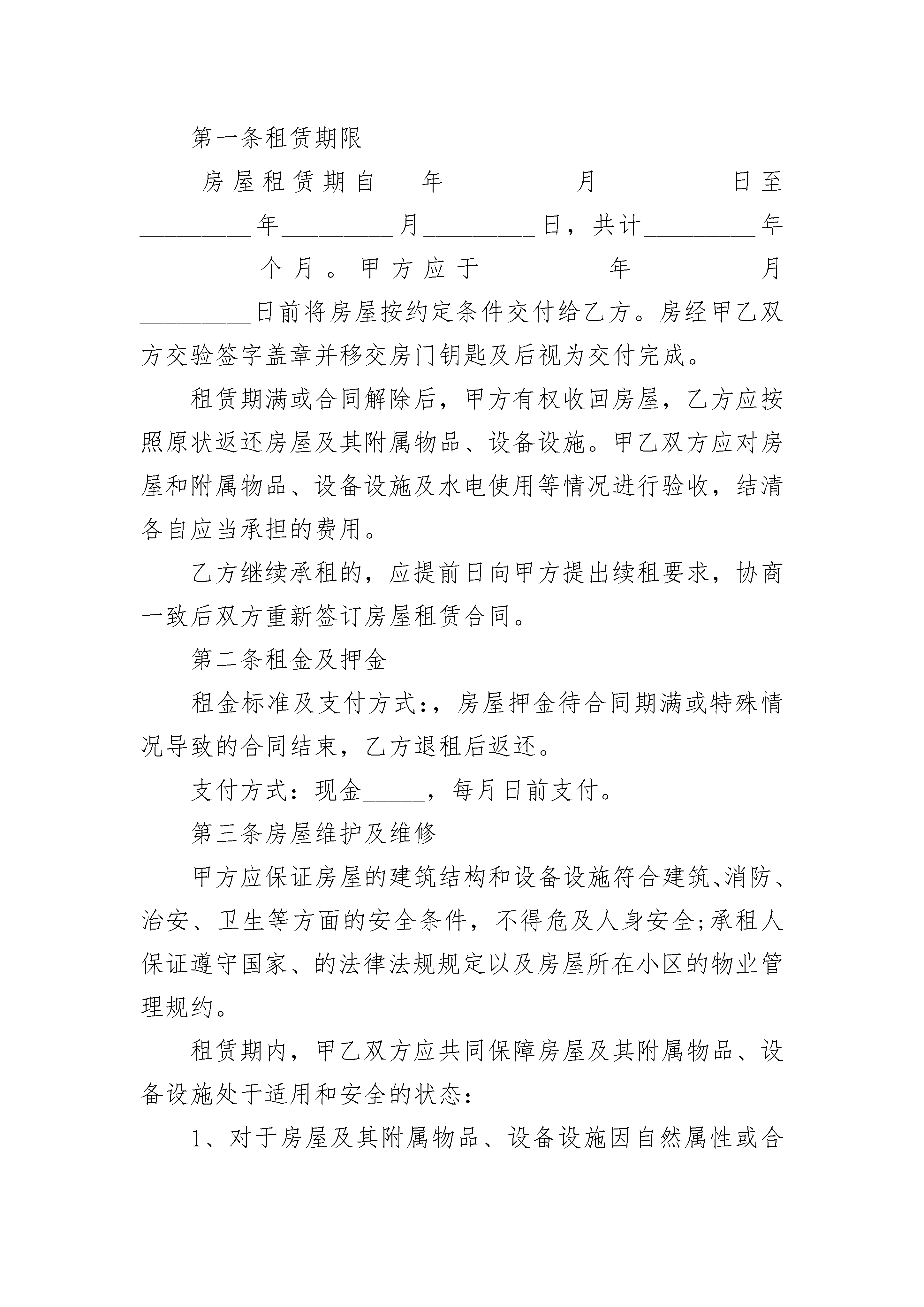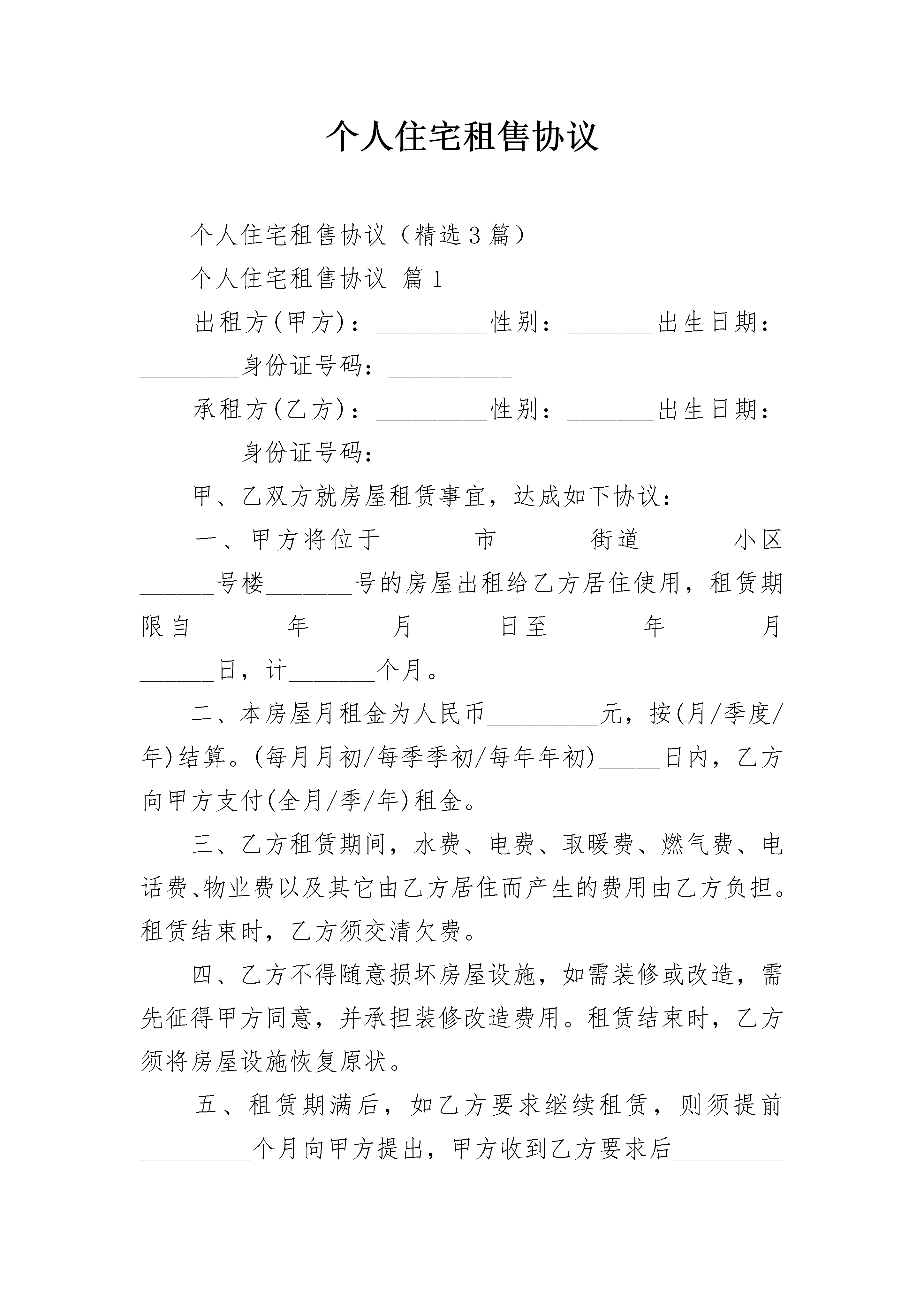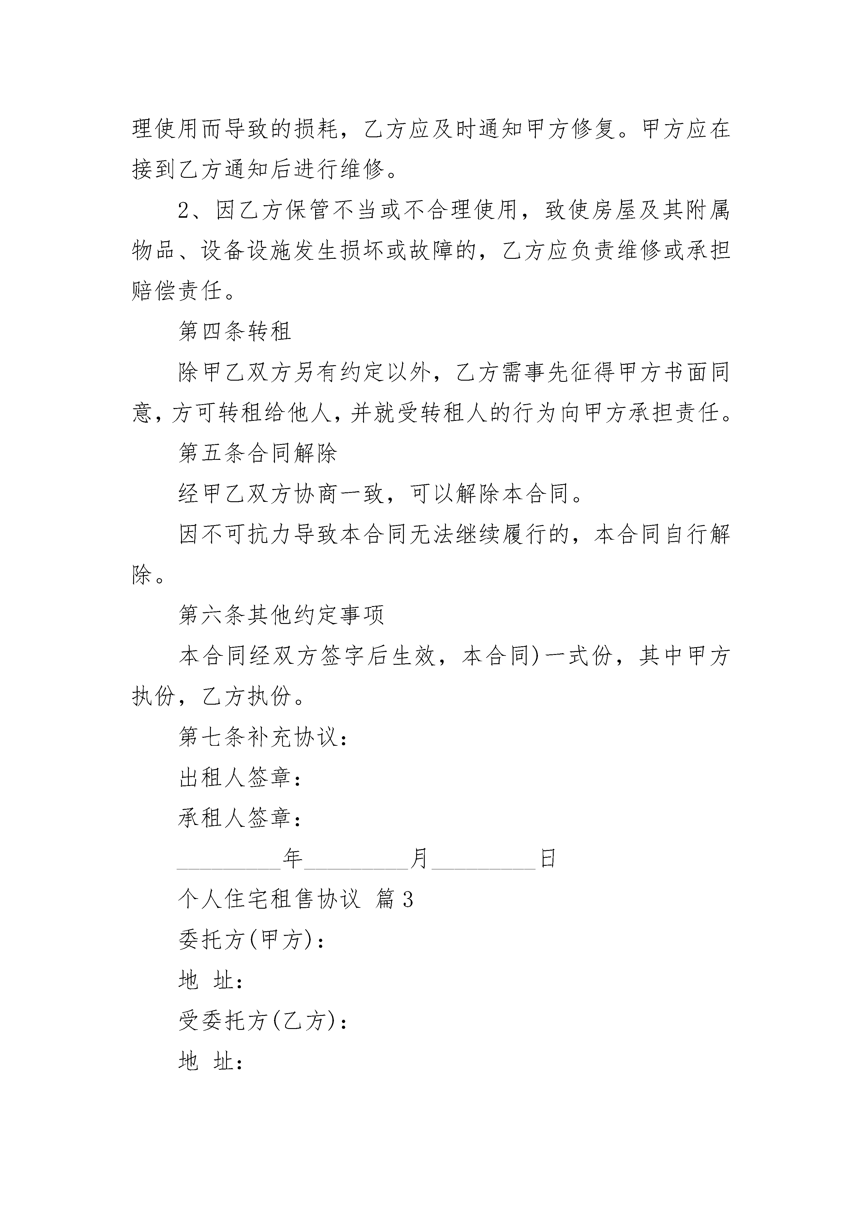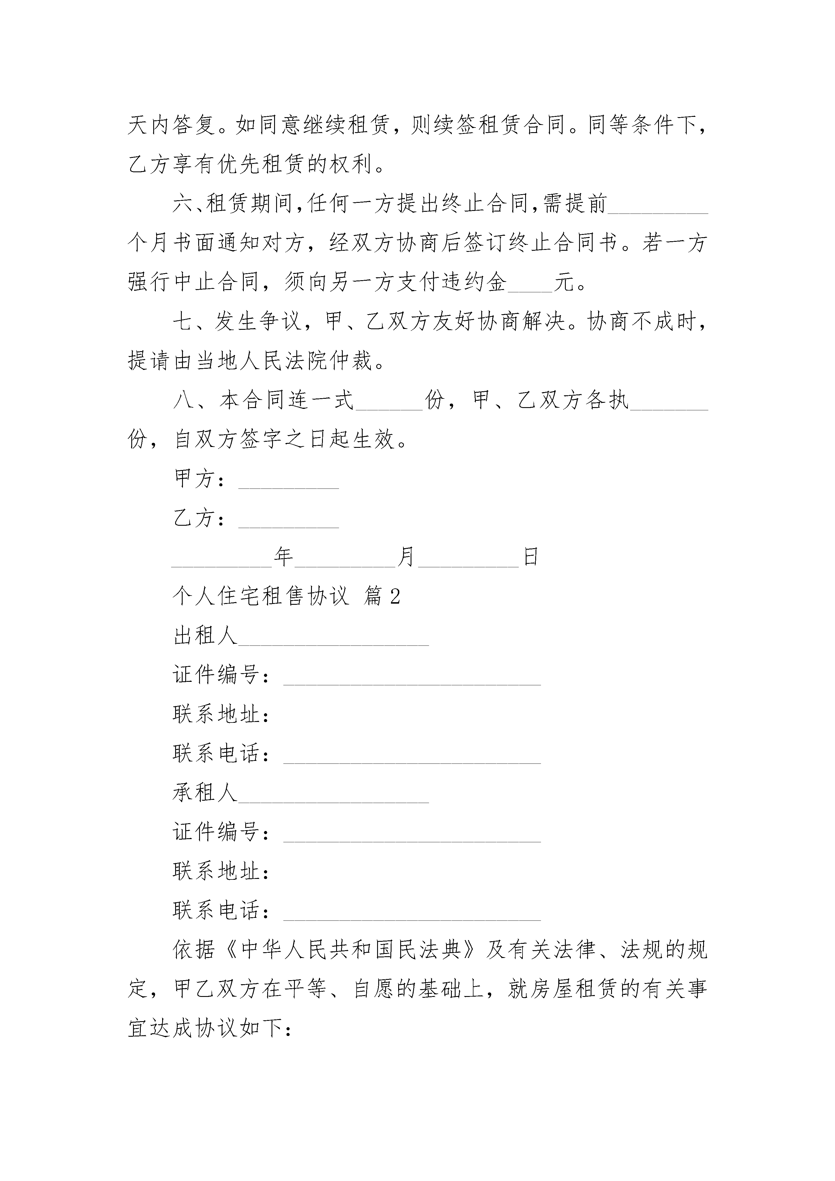 个人住宅租售协议个人住宅租售协议(精选3篇)个人住宅租售协议篇1出租方(甲方):_________性别:_______出生日期:________身份证号码:__________承租方(乙方):_________性别:_______出生日期:________身份证号码:__________甲、乙双方就房屋租赁事宜,达成如下协议:一、甲方将位于_______市_______街道_______小区______号楼_______号的房屋出租给乙方居住使用,租赁期限自_______年______月______日至_______年_______月______日,计_______个月。二、本房屋月租金为人民币_________元,按(月/季度/年)结算。(每月月初/每季季初/每年年初)_____日内,乙方向甲方支付(全月/季/年)租金。三、乙方租赁期间,水费、电费、取暖费、燃气费、电话费、物业费以及其它由乙方居住而产生的费用由乙方负担。租赁结束时,乙方须交清欠费。四、乙方不得随意损坏房屋设施,如需装修或改造,需先征得甲方同意,并承担装修改造费用。租赁结束时,乙方须将房屋设施恢复原状。五、租赁期满后,如乙方要求继续租赁,则须提前_________个月向甲方提出,甲方收到乙方要求后_________天内答复。如同意继续租赁,则续签租赁合同。同等条件下,乙方享有优先租赁的权利。六、租赁期间,任何一方提出终止合同,需提前_________个月书面通知对方,经双方协商后签订终止合同书。若一方强行中止合同,须向另一方支付违约金____元。七、发生争议,甲、乙双方友好协商解决。协商不成时,提请由当地人民法院仲裁。八、本合同连一式______份,甲、乙双方各执_______份,自双方签字之日起生效。甲方:_________乙方:__________________年_________月_________日个人住宅租售协议篇2出租人_________________证件编号:_______________________联系地址:联系电话:_______________________承租人_________________证件编号:_______________________联系地址:联系电话:_______________________依据《中华人民共和国民法典》及有关法律、法规的规定,甲乙双方在平等、自愿的基础上,就房屋租赁的有关事宜达成协议如下:第一条租赁期限房屋租赁期自__年_________月_________日至_________年_________月_________日,共计_________年_________个月。甲方应于_________年_________月_________日前将房屋按约定条件交付给乙方。房经甲乙双方交验签字盖章并移交房门钥匙及后视为交付完成。租赁期满或合同解除后,甲方有权收回房屋,乙方应按照原状返还房屋及其附属物品、设备设施。甲乙双方应对房屋和附属物品、设备设施及水电使用等情况进行验收,结清各自应当承担的费用。乙方继续承租的,应提前日向甲方提出续租要求,协商一致后双方重新签订房屋租赁合同。第二条租金及押金租金标准及支付方式:,房屋押金待合同期满或特殊情况导致的合同结束,乙方退租后返还。支付方式:现金_____,每月日前支付。第三条房屋维护及维修甲方应保证房屋的建筑结构和设备设施符合建筑、消防、治安、卫生等方面的安全条件,不得危及人身安全;承租人保证遵守国家、的法律法规规定以及房屋所在小区的物业管理规约。租赁期内,甲乙双方应共同保障房屋及其附属物品、设备设施处于适用和安全的状态:1、对于房屋及其附属物品、设备设施因自然属性或合理使用而导致的损耗,乙方应及时通知甲方修复。甲方应在接到乙方通知后进行维修。2、因乙方保管不当或不合理使用,致使房屋及其附属物品、设备设施发生损坏或故障的,乙方应负责维修或承担赔偿责任。第四条转租除甲乙双方另有约定以外,乙方需事先征得甲方书面同意,方可转租给他人,并就受转租人的行为向甲方承担责任。第五条合同解除经甲乙双方协商一致,可以解除本合同。因不可抗力导致本合同无法继续履行的,本合同自行解除。第六条其他约定事项本合同经双方签字后生效,本合同)一式份,其中甲方执份,乙方执份。第七条补充协议:出租人签章:承租人签章:_________年_________月_________日个人住宅租售协议篇3委托方(甲方):地址:受委托方(乙方):地址:身份证号码:甲方系房地产开发公司,有意取得德阳市旌阳区杏花巷和水利设计院德阳分院西小区家属院小二楼旧房拆迁改造项目,基于乙方在该项目上前期付出了一定的心血并取得了一定的成果,现甲方继续将该项目的部分工作委托给乙方进行,双方经协商一致,本着平等自愿的原则