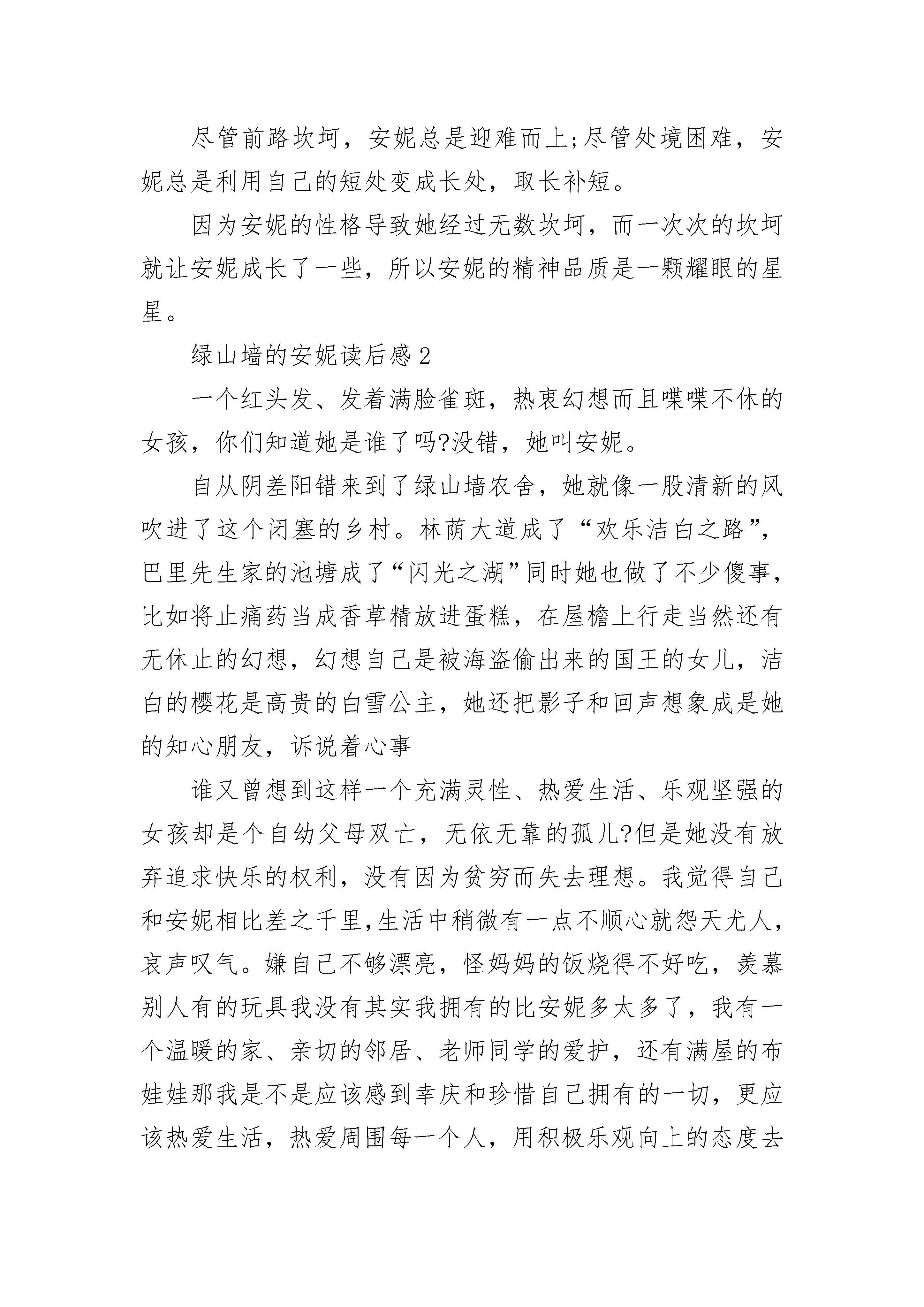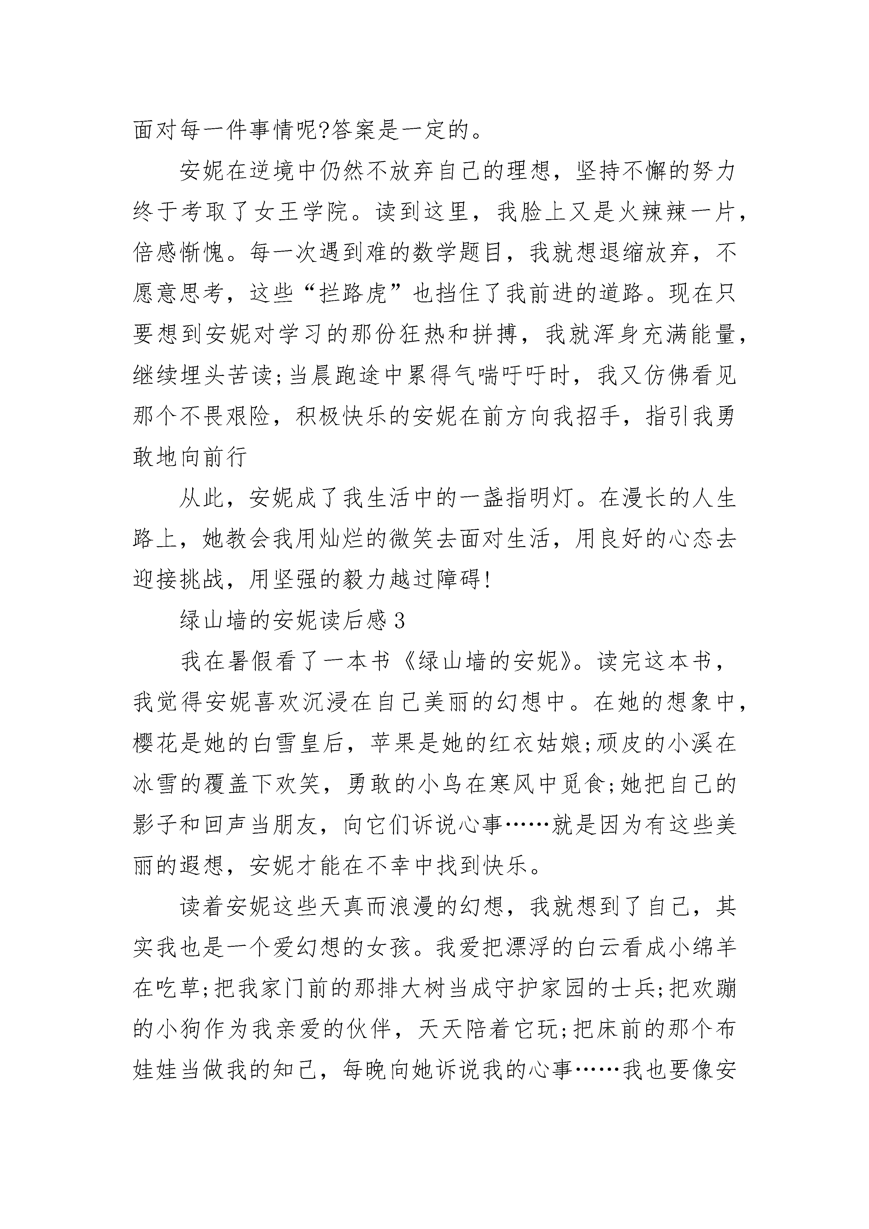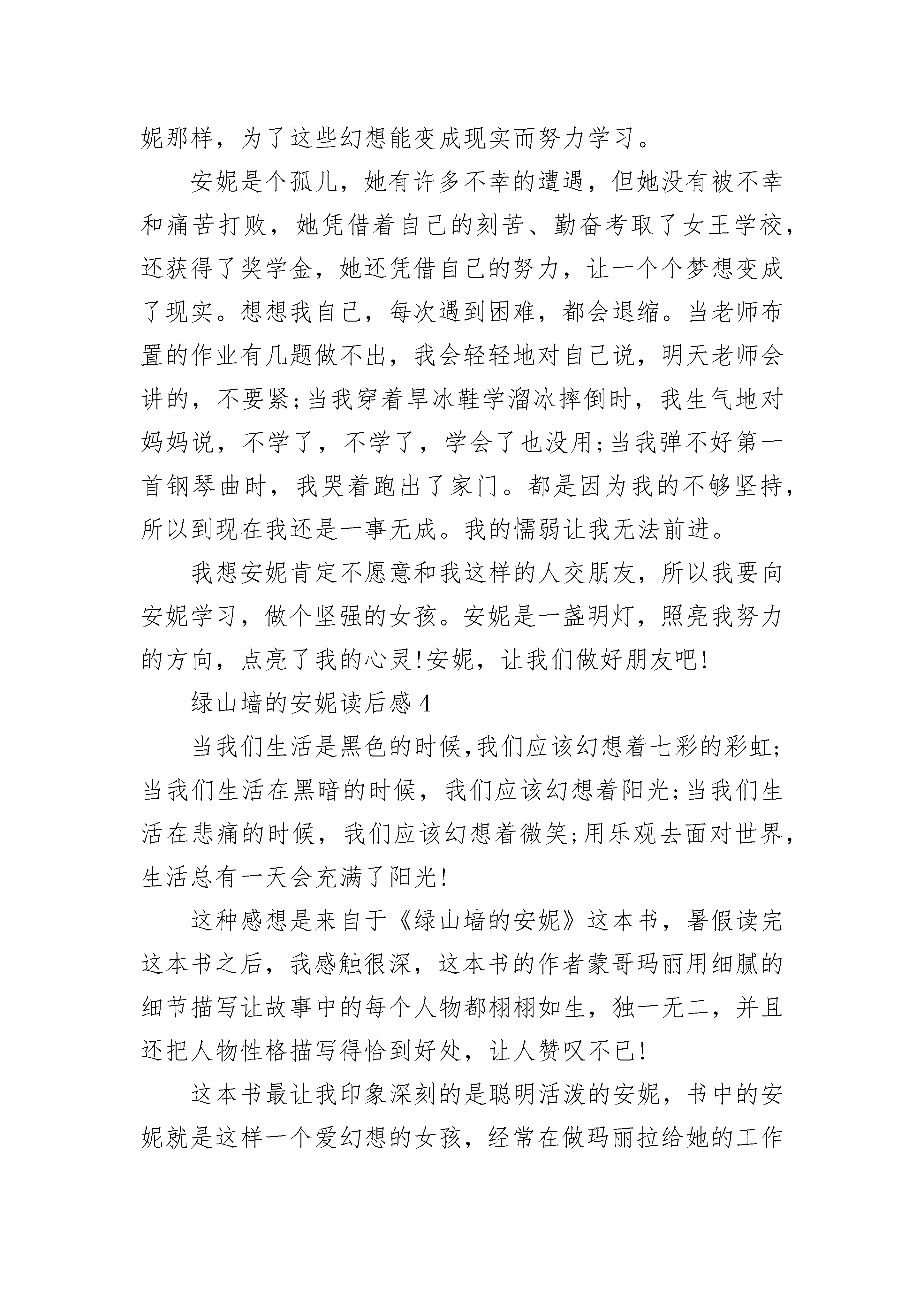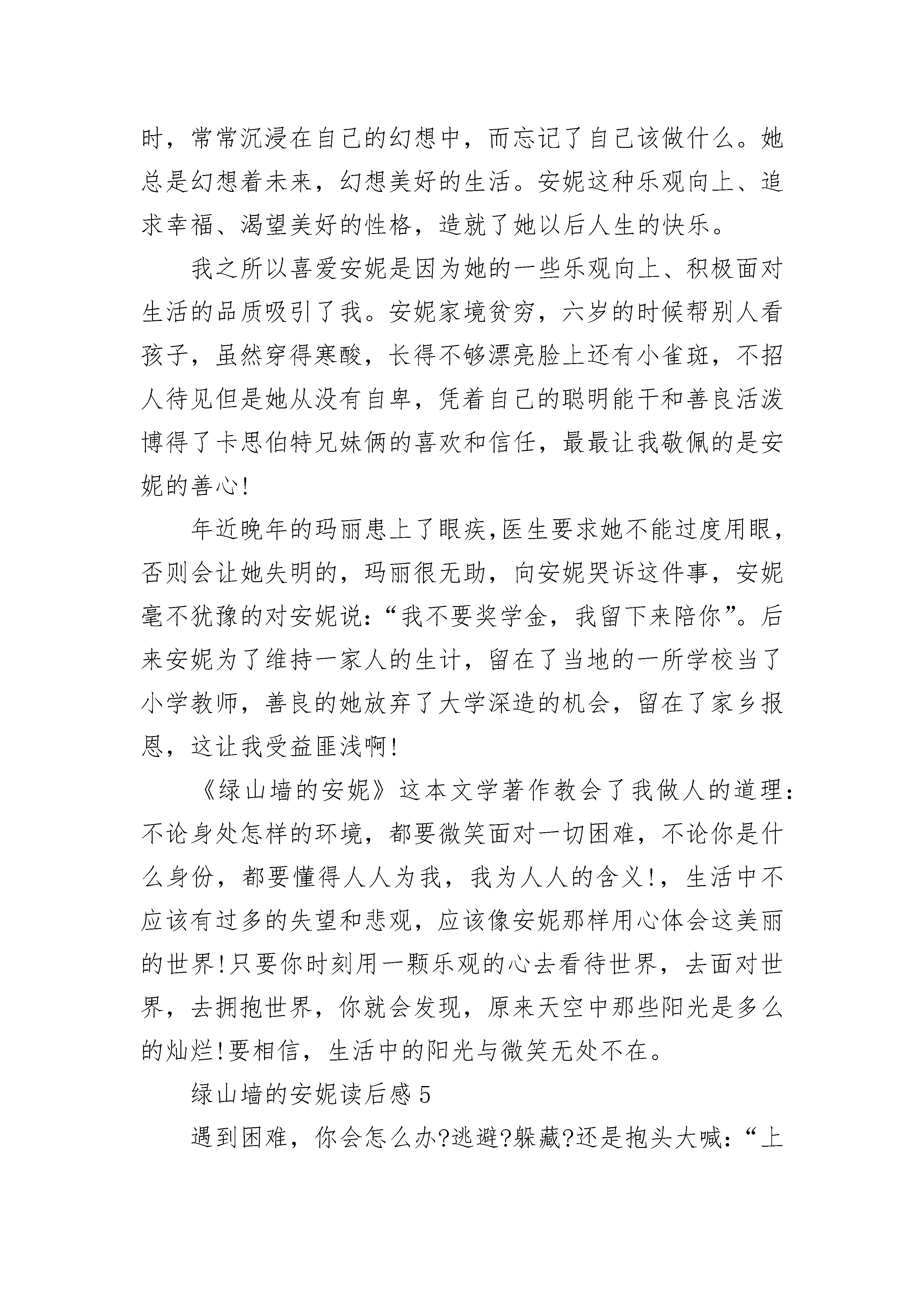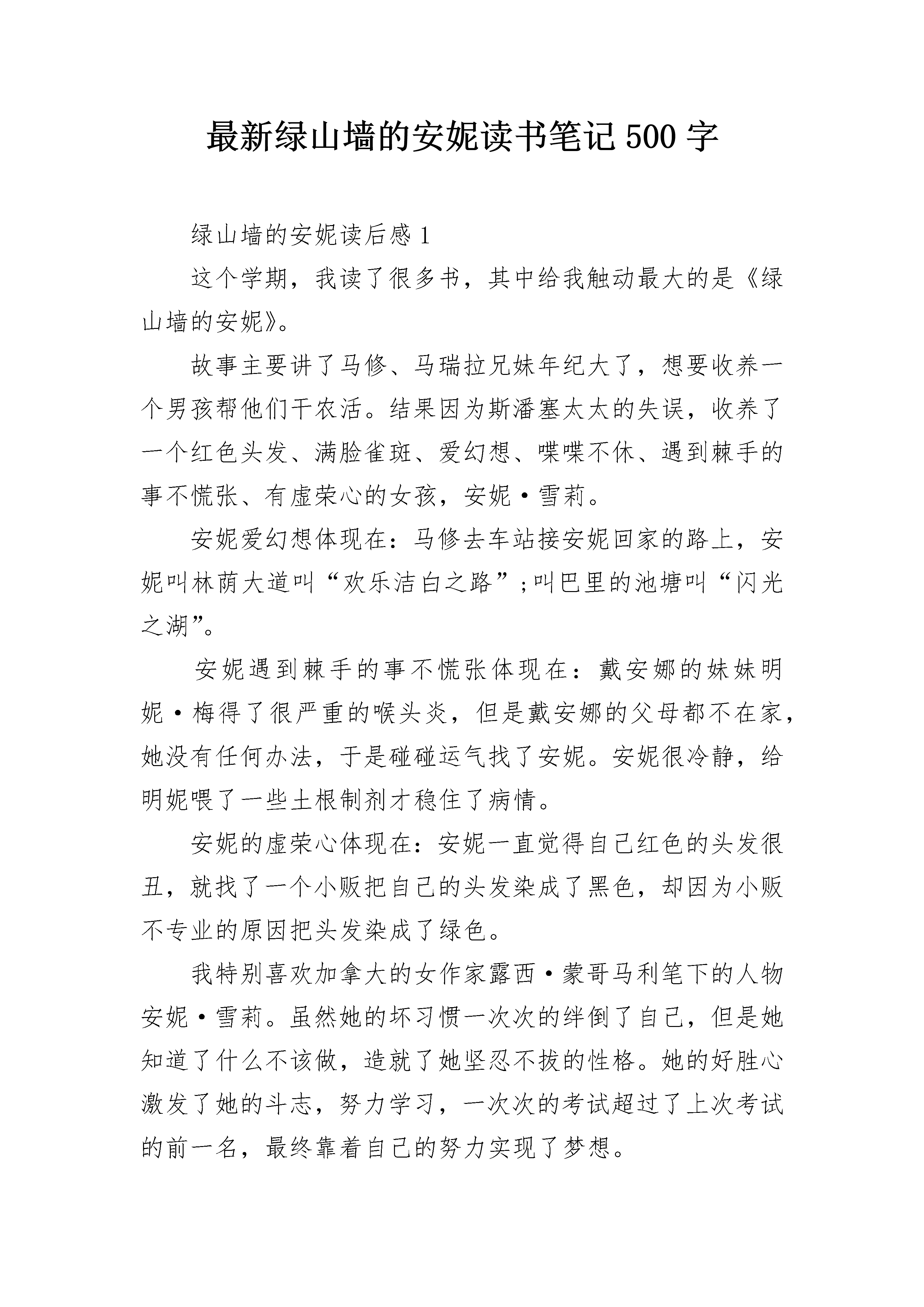 最新绿山墙的安妮读书笔记500字绿山墙的安妮读后感1这个学期,我读了很多书,其中给我触动最大的是《绿山墙的安妮》。故事主要讲了马修、马瑞拉兄妹年纪大了,想要收养一个男孩帮他们干农活。结果因为斯潘塞太太的失误,收养了一个红色头发、满脸雀斑、爱幻想、喋喋不休、遇到棘手的事不慌张、有虚荣心的女孩,安妮·雪莉。安妮爱幻想体现在:马修去车站接安妮回家的路上,安妮叫林荫大道叫“欢乐洁白之路”;叫巴里的池塘叫“闪光之湖”。安妮遇到棘手的事不慌张体现在:戴安娜的妹妹明妮·梅得了很严重的喉头炎,但是戴安娜的父母都不在家,她没有任何办法,于是碰碰运气找了安妮。安妮很冷静,给明妮喂了一些土根制剂才稳住了病情。安妮的虚荣心体现在:安妮一直觉得自己红色的头发很丑,就找了一个小贩把自己的头发染成了黑色,却因为小贩不专业的原因把头发染成了绿色。我特别喜欢加拿大的女作家露西·蒙哥马利笔下的人物安妮·雪莉。虽然她的坏习惯一次次的绊倒了自己,但是她知道了什么不该做,造就了她坚忍不拔的性格。她的好胜心激发了她的斗志,努力学习,一次次的考试超过了上次考试的前一名,最终靠着自己的努力实现了梦想。尽管前路坎坷,安妮总是迎难而上;尽管处境困难,安妮总是利用自己的短处变成长处,取长补短。因为安妮的性格导致她经过无数坎坷,而一次次的坎坷就让安妮成长了一些,所以安妮的精神品质是一颗耀眼的星星。绿山墙的安妮读后感2一个红头发、发着满脸雀斑,热衷幻想而且喋喋不休的女孩,你们知道她是谁了吗?没错,她叫安妮。自从阴差阳错来到了绿山墙农舍,她就像一股清新的风吹进了这个闭塞的乡村。林荫大道成了“欢乐洁白之路”,巴里先生家的池塘成了“闪光之湖”同时她也做了不少傻事,比如将止痛药当成香草精放进蛋糕,在屋檐上行走当然还有无休止的幻想,幻想自己是被海盗偷出来的国王的女儿,洁白的樱花是高贵的白雪公主,她还把影子和回声想象成是她的知心朋友,诉说着心事谁又曾想到这样一个充满灵性、热爱生活、乐观坚强的女孩却是个自幼父母双亡,无依无靠的孤儿?但是她没有放弃追求快乐的权利,没有因为贫穷而失去理想。我觉得自己和安妮相比差之千里,生活中稍微有一点不顺心就怨天尤人,哀声叹气。嫌自己不够漂亮,怪妈妈的饭烧得不好吃,羡慕别人有的玩具我没有其实我拥有的比安妮多太多了,我有一个温暖的家、亲切的邻居、老师同学的爱护,还有满屋的布娃娃那我是不是应该感到幸庆和珍惜自己拥有的一切,更应该热爱生活,热爱周围每一个人,用积极乐观向上的态度去面对每一件事情呢?答案是一定的。安妮在逆境中仍然不放弃自己的理想,坚持不懈的努力终于考取了女王学院。读到这里,我脸上又是火辣辣一片,倍感惭愧。每一次遇到难的数学题目,我就想退缩放弃,不愿意思考,这些“拦路虎”也挡住了我前进的道路。现在只要想到安妮对学习的那份狂热和拼搏,我就浑身充满能量,继续埋头苦读;当晨跑途中累得气喘吁吁时,我又仿佛看见那个不畏艰险,积极快乐的安妮在前方向我招手,指引我勇敢地向前行从此,安妮成了我生活中的一盏指明灯。在漫长的人生路上,她教会我用灿烂的微笑去面对生活,用良好的心态去迎接挑战,用坚强的毅力越过障碍!绿山墙的安妮读后感3我在暑假看了一本书《绿山墙的安妮》。读完这本书,我觉得安妮喜欢沉浸在自己美丽的幻想中。在她的想象中,樱花是她的白雪皇后,苹果是她的红衣姑娘;顽皮的小溪在冰雪的覆盖下欢笑,勇敢的小鸟在寒风中觅食;她把自己的影子和回声当朋友,向它们诉说心事……就是因为有这些美丽的遐想,安妮才能在不幸中找到快乐。读着安妮这些天真而浪漫的幻想,我就想到了自己,其实我也是一个爱幻想的女孩。我爱把漂浮的白云看成小绵羊在吃草;把我家门前的那排大树当成守护家园的士兵;把欢蹦的小狗作为我亲爱的伙伴,天天陪着它玩;把床前的那个布娃娃当做我的知己,每晚向她诉说我的心事……我也要像安妮那样,为了这些幻想能变成现实而努力学习。安妮是个孤儿,她有许多不幸的遭遇,但她没有被不幸和痛苦打败,她凭借着自己的刻苦、勤奋考取了女王学校,还获得了奖学金,她还凭借自己的努力,让一个个梦想变成了现实。想想我自己,每次遇到困难,都会退缩。当老师布置的作业有几题做不出,我会轻轻地对自己说,明天老师会讲的,不要紧;当我穿着旱冰鞋学溜冰摔倒时,我生气地对妈妈说,不学了,不学了,学会了也没用;当我弹不好第一首钢琴曲时,我哭着跑出了家门。都是因为我的不够坚持,所以到现在我还是一事无成。我的懦弱让我无法前进。我想安妮肯定不愿意和我这样的人交朋友,所以我要向安妮学习,做个坚强的女孩。安妮是一盏明灯,照亮我努力的方向,点亮了我的心灵!安妮,让我们做好朋友吧!绿山墙的安妮读后感4当我们生活是黑色的时候,我们应该幻想着七彩的彩虹;当我们生活在黑暗的时候,我们应该幻想着阳光;当我们生活在悲痛的时候,我们应该幻想着微笑;用乐观去面对世界