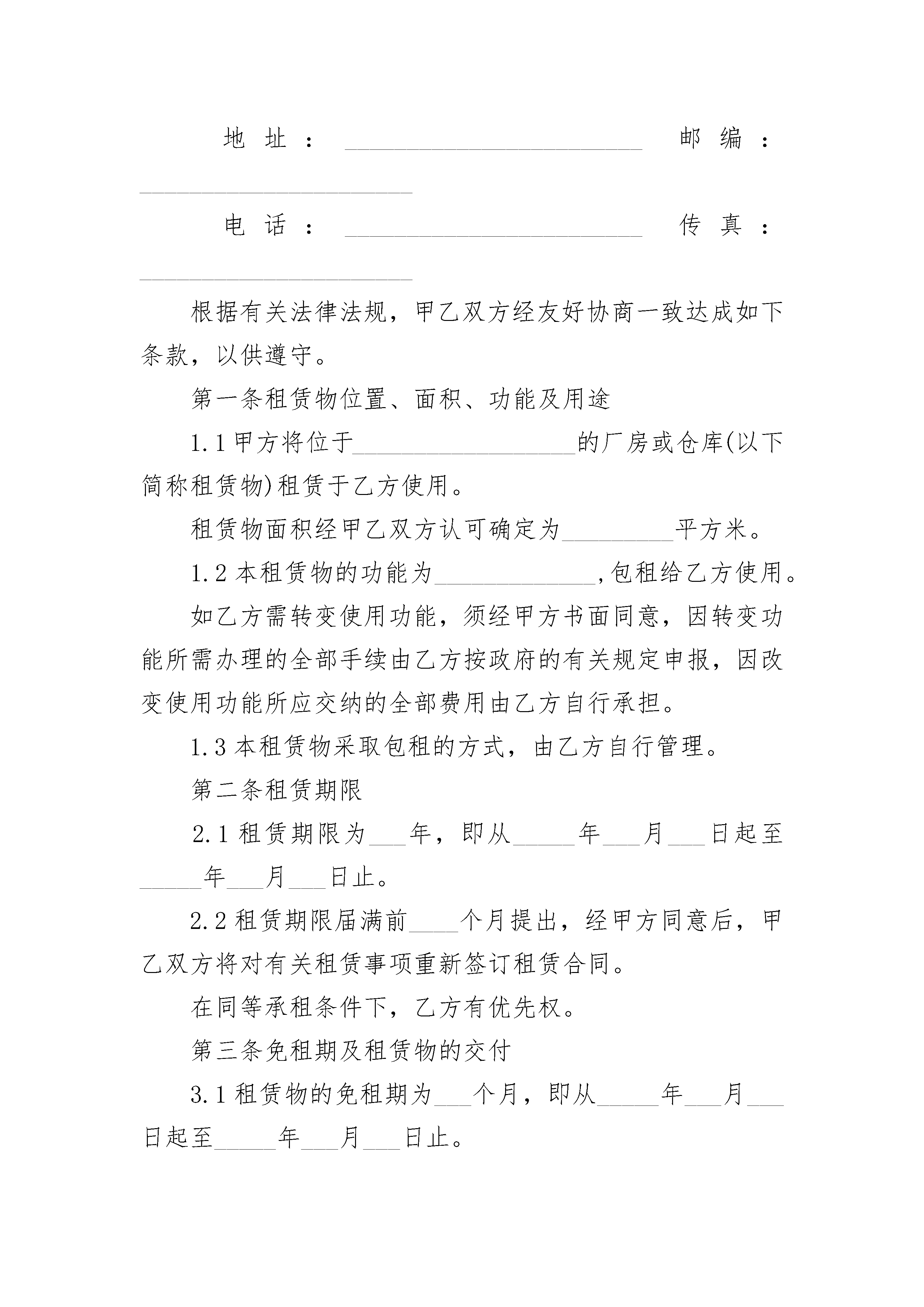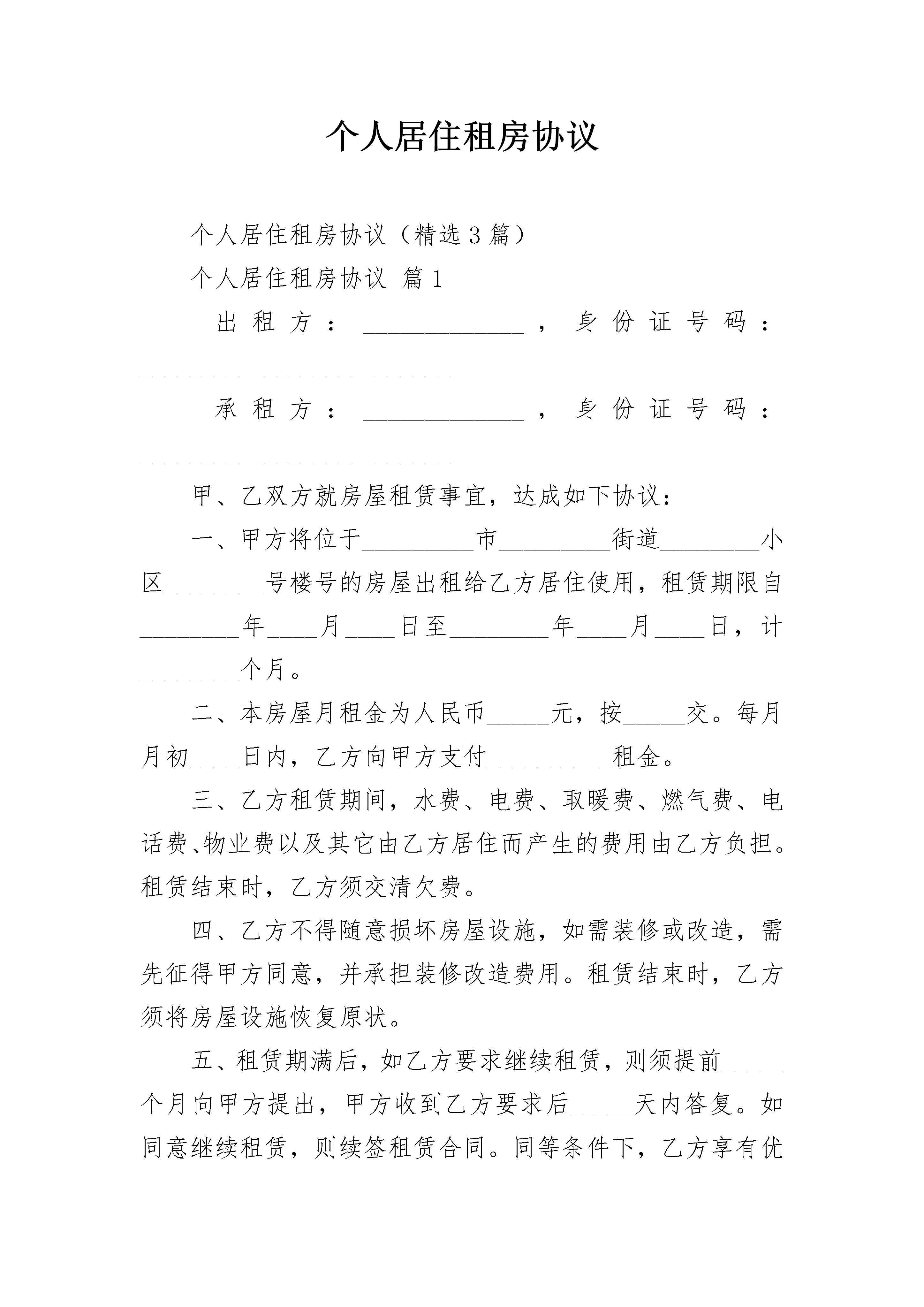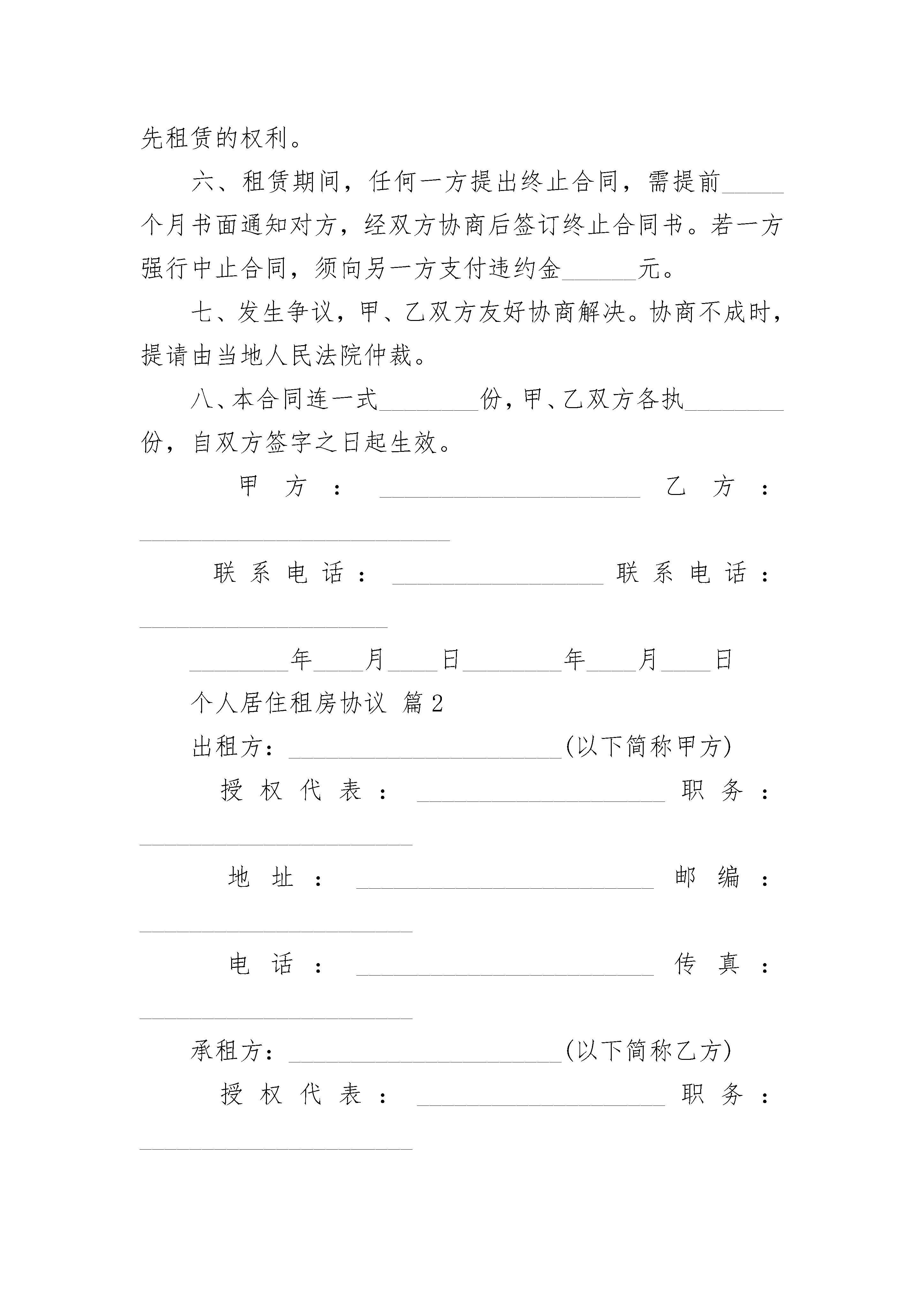 个人居住租房协议个人居住租房协议(精选3篇)个人居住租房协议篇1出租方:_____________,身份证号码:_________________________承租方:_____________,身份证号码:_________________________甲、乙双方就房屋租赁事宜,达成如下协议:一、甲方将位于_________市_________街道________小区________号楼号的房屋出租给乙方居住使用,租赁期限自________年____月____日至________年____月____日,计________个月。二、本房屋月租金为人民币_____元,按_____交。每月月初____日内,乙方向甲方支付__________租金。三、乙方租赁期间,水费、电费、取暖费、燃气费、电话费、物业费以及其它由乙方居住而产生的费用由乙方负担。租赁结束时,乙方须交清欠费。四、乙方不得随意损坏房屋设施,如需装修或改造,需先征得甲方同意,并承担装修改造费用。租赁结束时,乙方须将房屋设施恢复原状。五、租赁期满后,如乙方要求继续租赁,则须提前_____个月向甲方提出,甲方收到乙方要求后_____天内答复。如同意继续租赁,则续签租赁合同。同等条件下,乙方享有优先租赁的权利。六、租赁期间,任何一方提出终止合同,需提前_____个月书面通知对方,经双方协商后签订终止合同书。若一方强行中止合同,须向另一方支付违约金______元。七、发生争议,甲、乙双方友好协商解决。协商不成时,提请由当地人民法院仲裁。八、本合同连一式________份,甲、乙双方各执________份,自双方签字之日起生效。甲方:_____________________乙方:_________________________联系电话:_________________联系电话:____________________________年____月____日________年____月____日个人居住租房协议篇2出租方:______________________(以下简称甲方)授权代表:____________________职务:______________________地址:________________________邮编:______________________电话:________________________传真:______________________承租方:______________________(以下简称乙方)授权代表:____________________职务:______________________地址:________________________邮编:______________________电话:________________________传真:______________________根据有关法律法规,甲乙双方经友好协商一致达成如下条款,以供遵守。第一条租赁物位置、面积、功能及用途1.1甲方将位于__________________的厂房或仓库(以下简称租赁物)租赁于乙方使用。租赁物面积经甲乙双方认可确定为_________平方米。1.2本租赁物的功能为_____________,包租给乙方使用。如乙方需转变使用功能,须经甲方书面同意,因转变功能所需办理的全部手续由乙方按政府的有关规定申报,因改变使用功能所应交纳的全部费用由乙方自行承担。1.3本租赁物采取包租的方式,由乙方自行管理。第二条租赁期限2.1租赁期限为___年,即从_____年___月___日起至_____年___月___日止。2.2租赁期限届满前____个月提出,经甲方同意后,甲乙双方将对有关租赁事项重新签订租赁合同。在同等承租条件下,乙方有优先权。第三条免租期及租赁物的交付3.1租赁物的免租期为___个月,即从_____年___月___日起至_____年___月___日止。免租期届满次日为起租日,由起租日开始计收租金。3.2在本出租合同生效之日起___日内,甲方将租赁物按现状交付乙方使用,且乙方同意按租赁物及设施的现状承租。第四条租赁费用4.1租赁保证金本出租合同的租赁保证金为首月租金的___倍,即人民币_______元(大写:_______)。4.2租金租金第1年至第2年为每月每平方米人民币_________元,第3年至第5年每年租金将在上年的基础上递增____%;第6年起的租金,将以届时同等位置房屋的租金水平为依据,由甲乙双方另行共同商定。每年的____月___日作为每年租金调整日。4.3物业管理费物业管理费为每月每平方米人民币________元。4.4供电增容费供电增容的手续由甲方负责申办,因办理供电增容所需缴纳的全部费用由承担。第