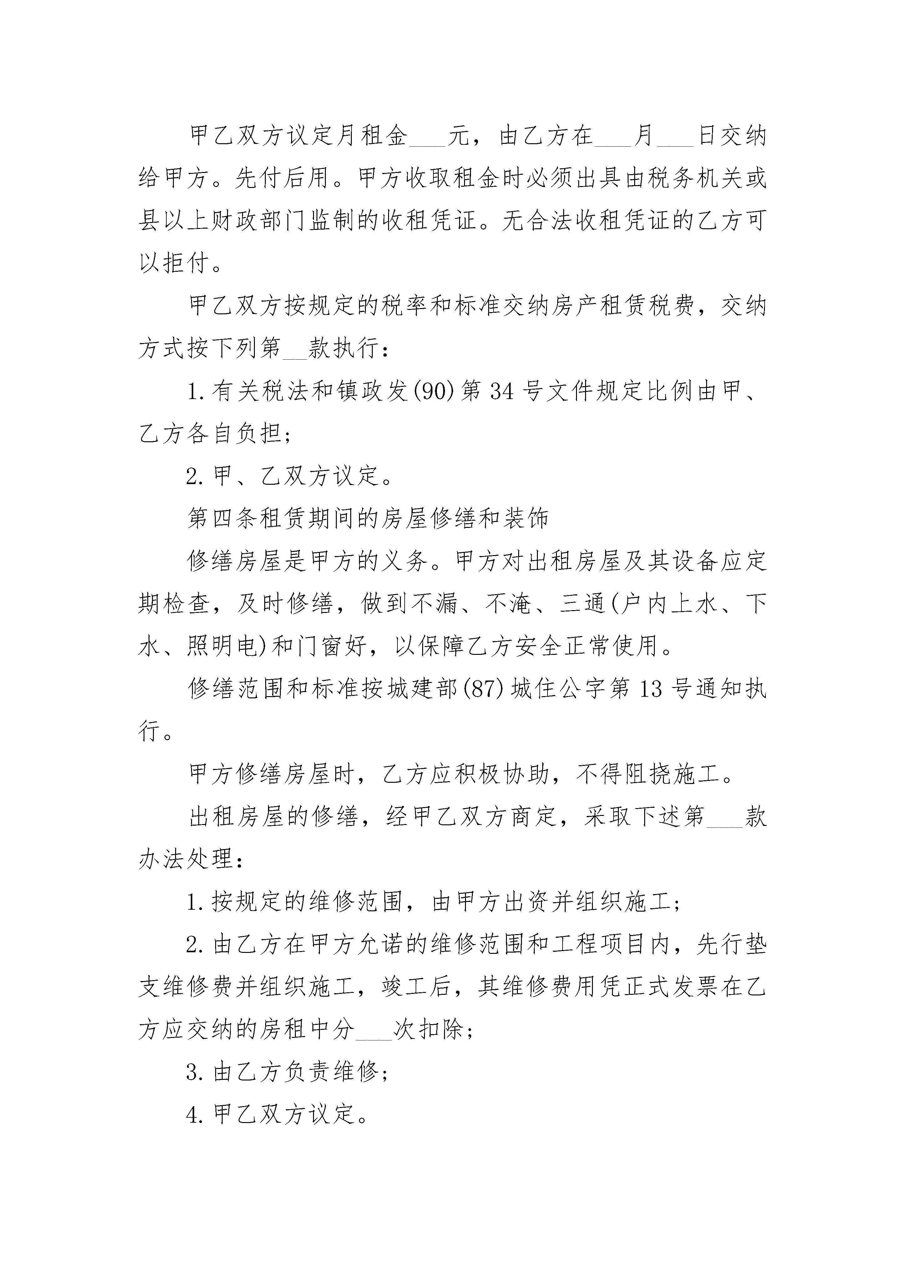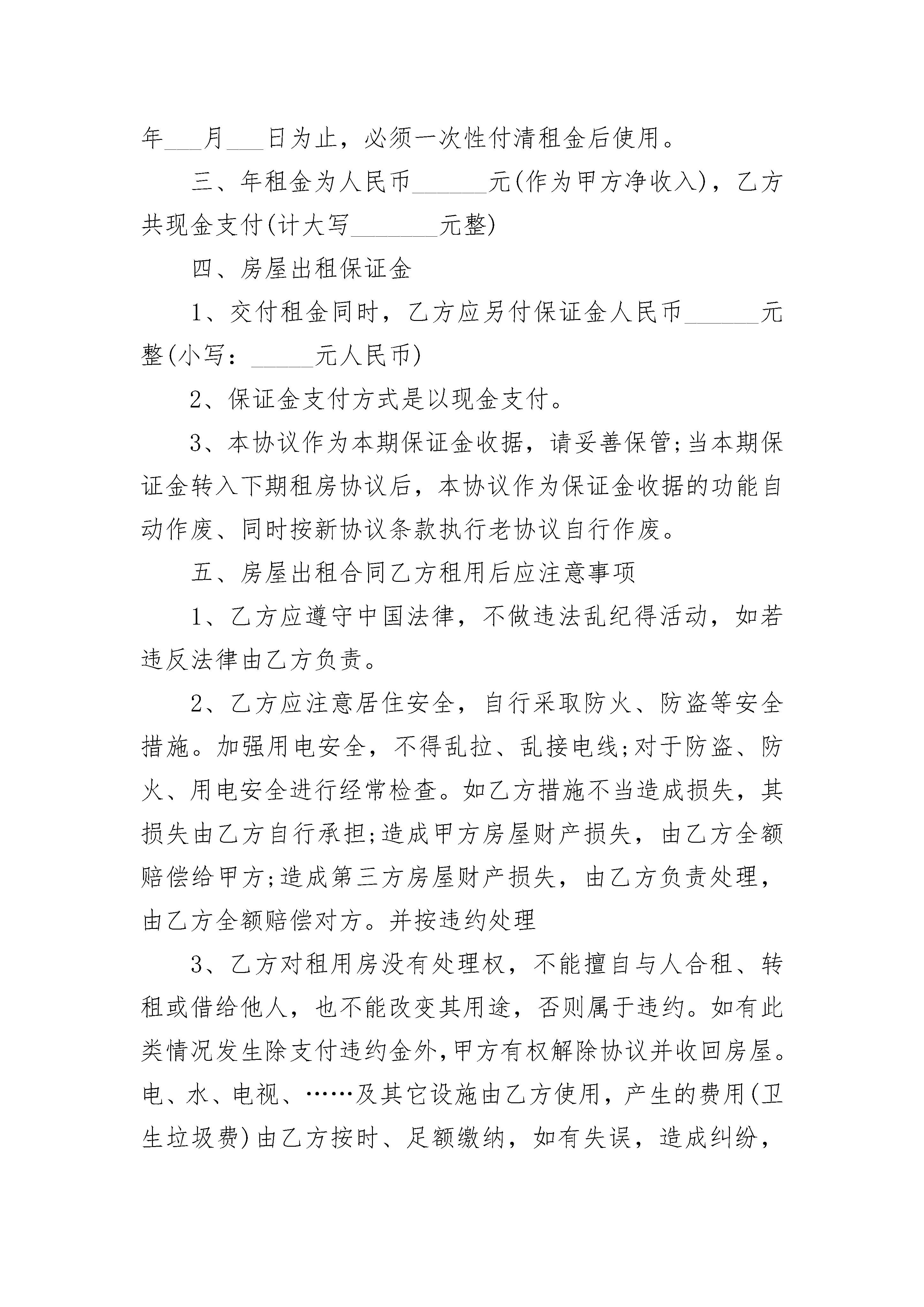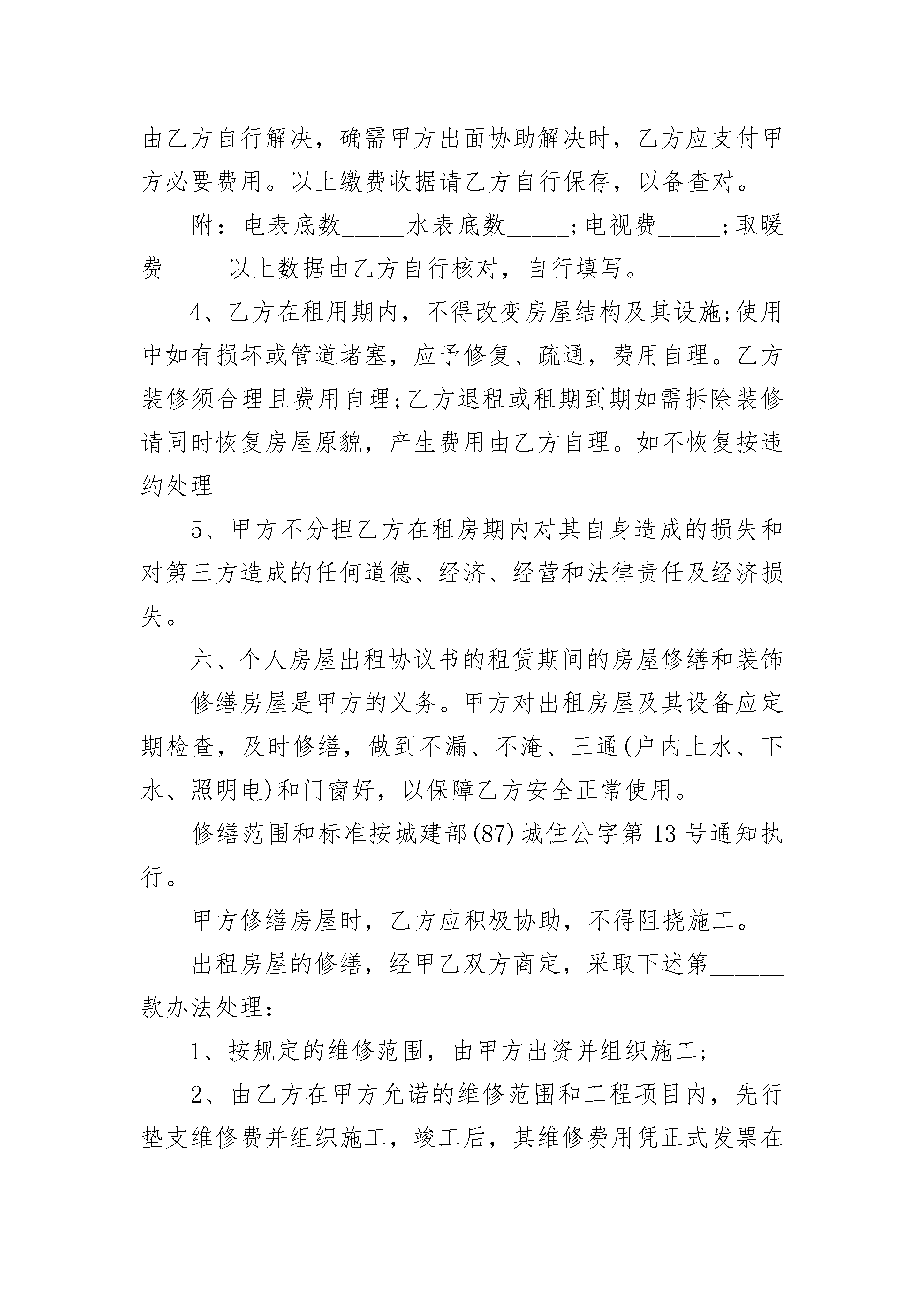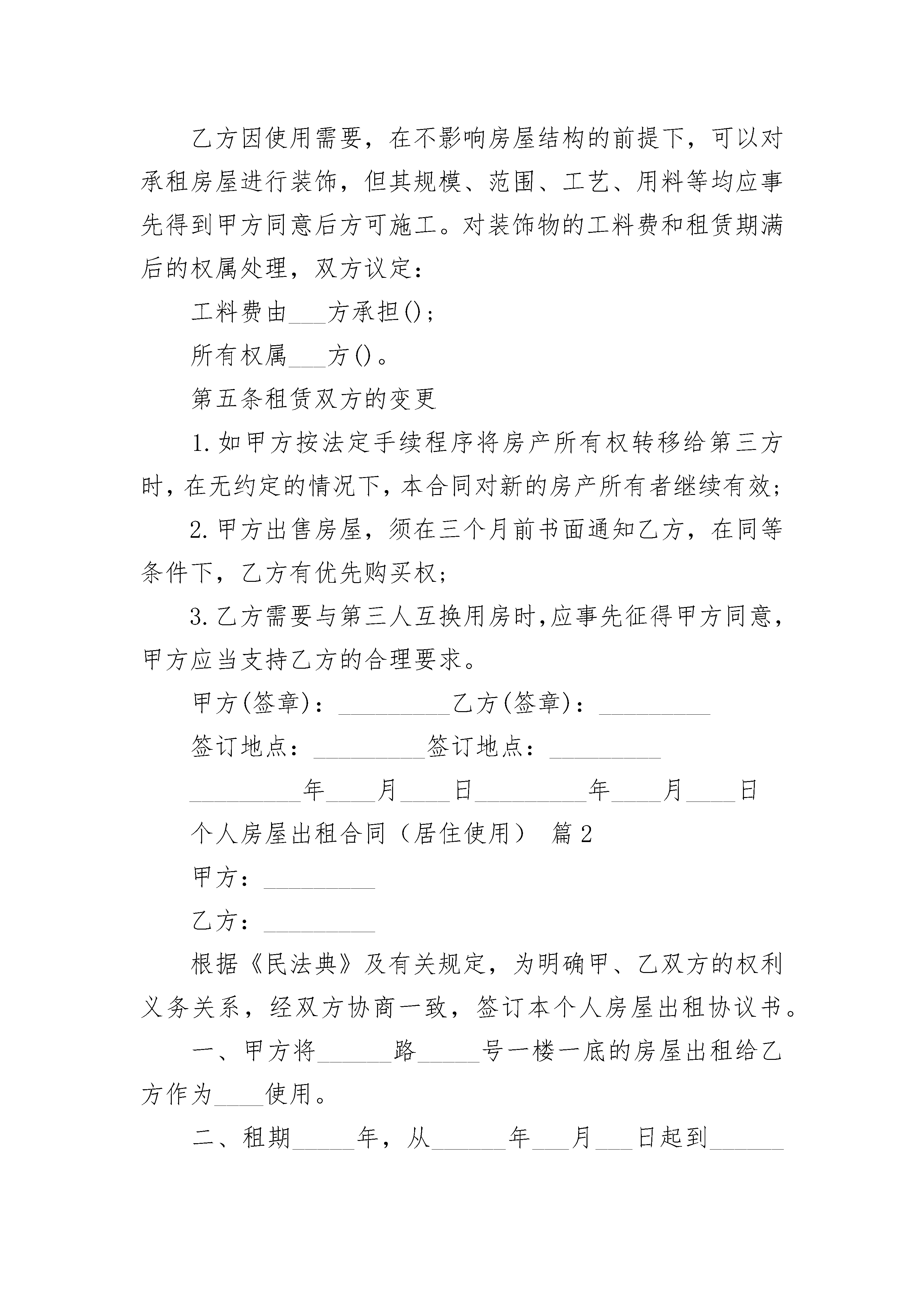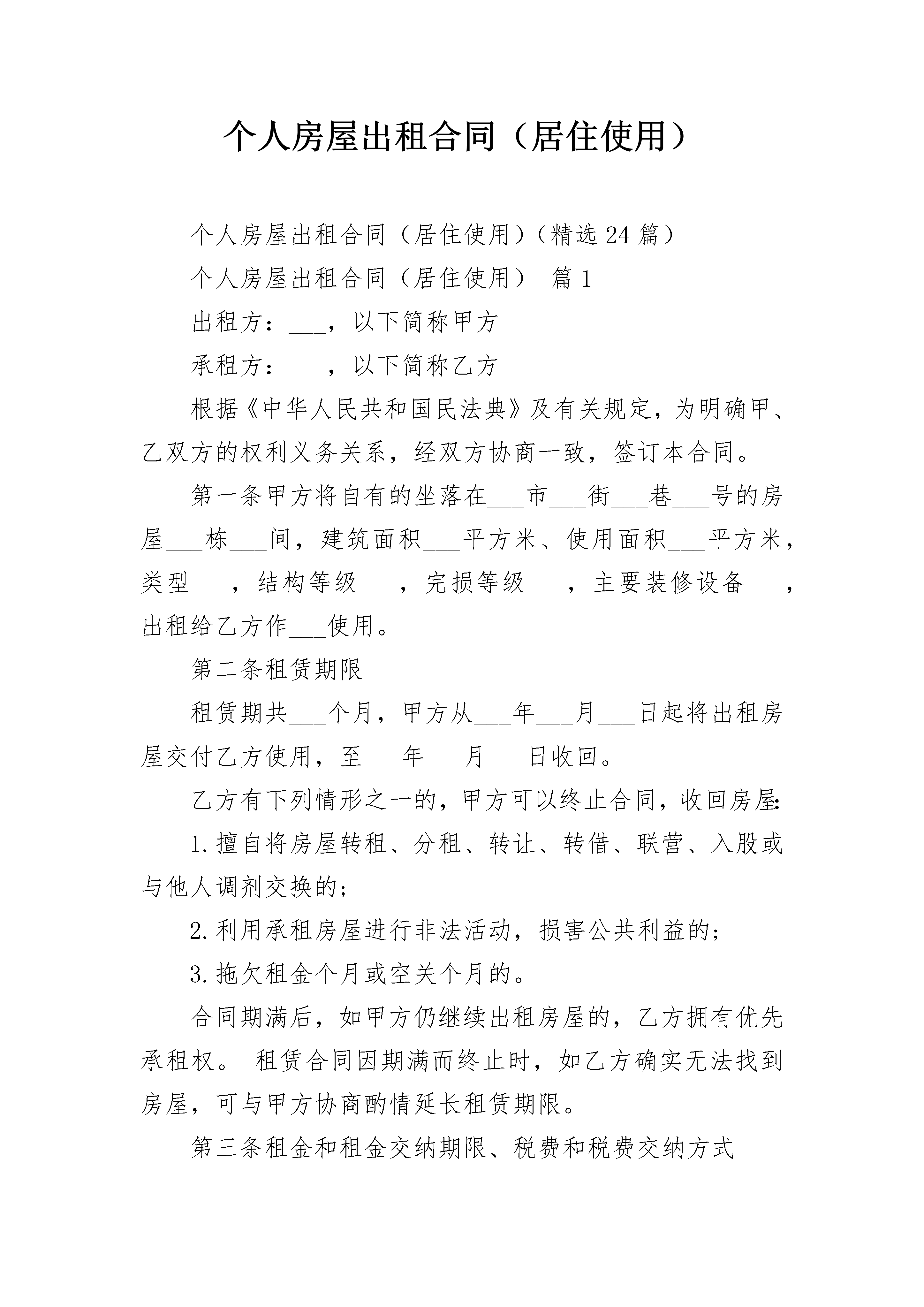 个人房屋出租合同(居住使用)个人房屋出租合同(居住使用)(精选24篇)个人房屋出租合同(居住使用)篇1出租方:___,以下简称甲方承租方:___,以下简称乙方根据《中华人民共和国民法典》及有关规定,为明确甲、乙双方的权利义务关系,经双方协商一致,签订本合同。第一条甲方将自有的坐落在___市___街___巷___号的房屋___栋___间,建筑面积___平方米、使用面积___平方米,类型___,结构等级___,完损等级___,主要装修设备___,出租给乙方作___使用。第二条租赁期限租赁期共___个月,甲方从___年___月___日起将出租房屋交付乙方使用,至___年___月___日收回。乙方有下列情形之一的,甲方可以终止合同,收回房屋:1.擅自将房屋转租、分租、转让、转借、联营、入股或与他人调剂交换的;2.利用承租房屋进行非法活动,损害公共利益的;3.拖欠租金个月或空关个月的。合同期满后,如甲方仍继续出租房屋的,乙方拥有优先承租权。租赁合同因期满而终止时,如乙方确实无法找到房屋,可与甲方协商酌情延长租赁期限。第三条租金和租金交纳期限、税费和税费交纳方式甲乙双方议定月租金___元,由乙方在___月___日交纳给甲方。先付后用。甲方收取租金时必须出具由税务机关或县以上财政部门监制的收租凭证。无合法收租凭证的乙方可以拒付。甲乙双方按规定的税率和标准交纳房产租赁税费,交纳方式按下列第__款执行:1.有关税法和镇政发(90)第34号文件规定比例由甲、乙方各自负担;2.甲、乙双方议定。第四条租赁期间的房屋修缮和装饰修缮房屋是甲方的义务。甲方对出租房屋及其设备应定期检查,及时修缮,做到不漏、不淹、三通(户内上水、下水、照明电)和门窗好,以保障乙方安全正常使用。修缮范围和标准按城建部(87)城住公字第13号通知执行。甲方修缮房屋时,乙方应积极协助,不得阻挠施工。出租房屋的修缮,经甲乙双方商定,采取下述第___款办法处理:1.按规定的维修范围,由甲方出资并组织施工;2.由乙方在甲方允诺的维修范围和工程项目内,先行垫支维修费并组织施工,竣工后,其维修费用凭正式发票在乙方应交纳的房租中分___次扣除;3.由乙方负责维修;4.甲乙双方议定。乙方因使用需要,在不影响房屋结构的前提下,可以对承租房屋进行装饰,但其规模、范围、工艺、用料等均应事先得到甲方同意后方可施工。对装饰物的工料费和租赁期满后的权属处理,双方议定:工料费由___方承担();所有权属___方()。第五条租赁双方的变更1.如甲方按法定手续程序将房产所有权转移给第三方时,在无约定的情况下,本合同对新的房产所有者继续有效;2.甲方出售房屋,须在三个月前书面通知乙方,在同等条件下,乙方有优先购买权;3.乙方需要与第三人互换用房时,应事先征得甲方同意,甲方应当支持乙方的合理要求。甲方(签章):_________乙方(签章):_________签订地点:_________签订地点:__________________年____月____日_________年____月____日个人房屋出租合同(居住使用)篇2甲方:_________乙方:_________根据《民法典》及有关规定,为明确甲、乙双方的权利义务关系,经双方协商一致,签订本个人房屋出租协议书。一、甲方将______路_____号一楼一底的房屋出租给乙方作为____使用。二、租期_____年,从______年___月___日起到______年___月___日为止,必须一次性付清租金后使用。三、年租金为人民币______元(作为甲方净收入),乙方共现金支付(计大写_______元整)四、房屋出租保证金1、交付租金同时,乙方应另付保证金人民币______元整(小写:_____元人民币)2、保证金支付方式是以现金支付。3、本协议作为本期保证金收据,请妥善保管;当本期保证金转入下期租房协议后,本协议作为保证金收据的功能自动作废、同时按新协议条款执行老协议自行作废。五、房屋出租合同乙方租用后应注意事项1、乙方应遵守中国法律,不做违法乱纪得活动,如若违反法律由乙方负责。2、乙方应注意居住安全,自行采取防火、防盗等安全措施。加强用电安全,不得乱拉、乱接电线;对于防盗、防火、用电安全进行经常检查。如乙方措施不当造成损失,其损失由乙方自行承担;造成甲方房屋财产损失,由乙方全额赔偿给甲方;造成第三方房屋财产损失,由乙方负责处理,由乙方全额赔偿对方。并按违约处理3、乙方对租用房没有处理权,不能擅自与人合租、转租或借给他人,也不能改变其用途,否则属于违约。如有此类情况发生除支付违约金外,甲方有权解除协议并收回房屋。电、水、电视、……及其它设施由乙方使用,产生的费用(卫生垃圾费)由乙方按时、足额缴纳,如有失误,造成纠纷,由乙方自行解决,确需甲方出面协助解决时,乙方