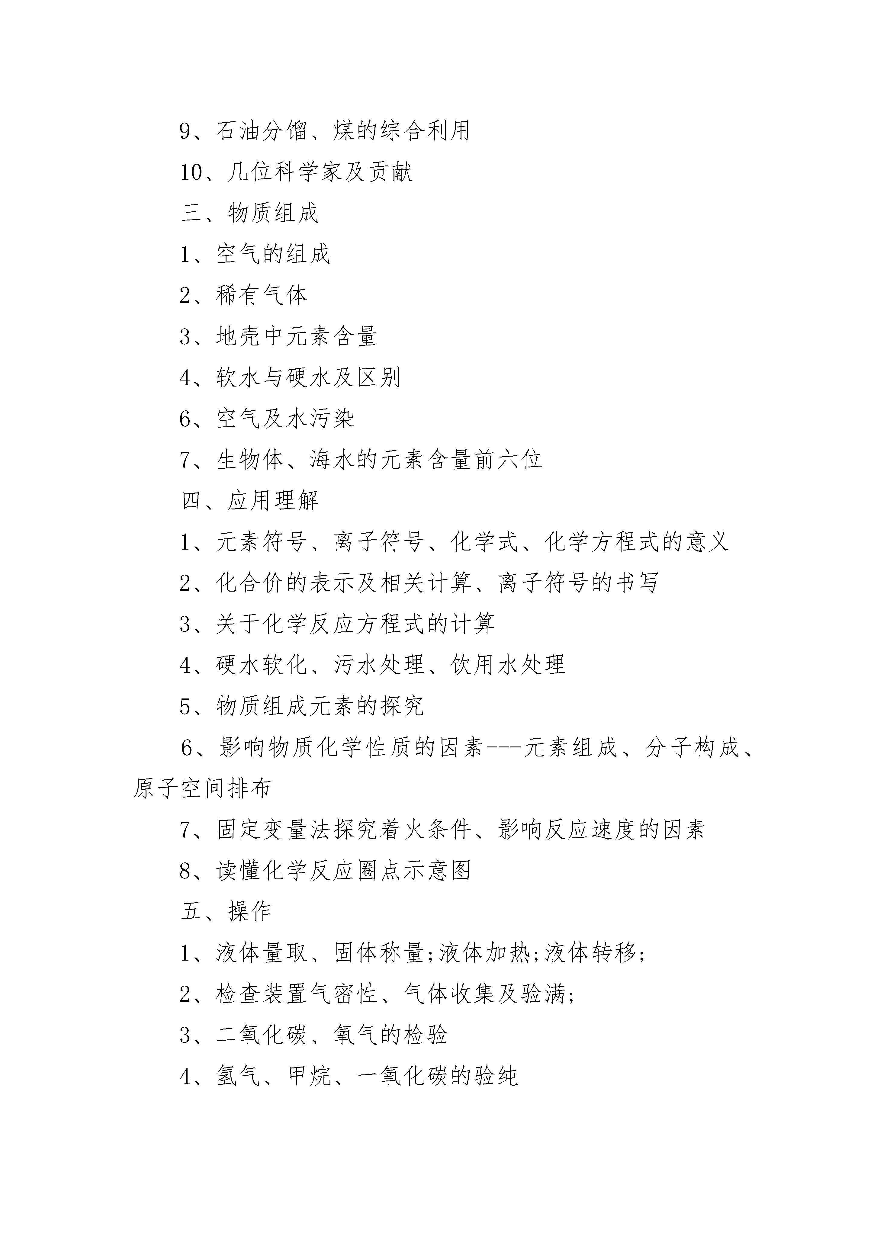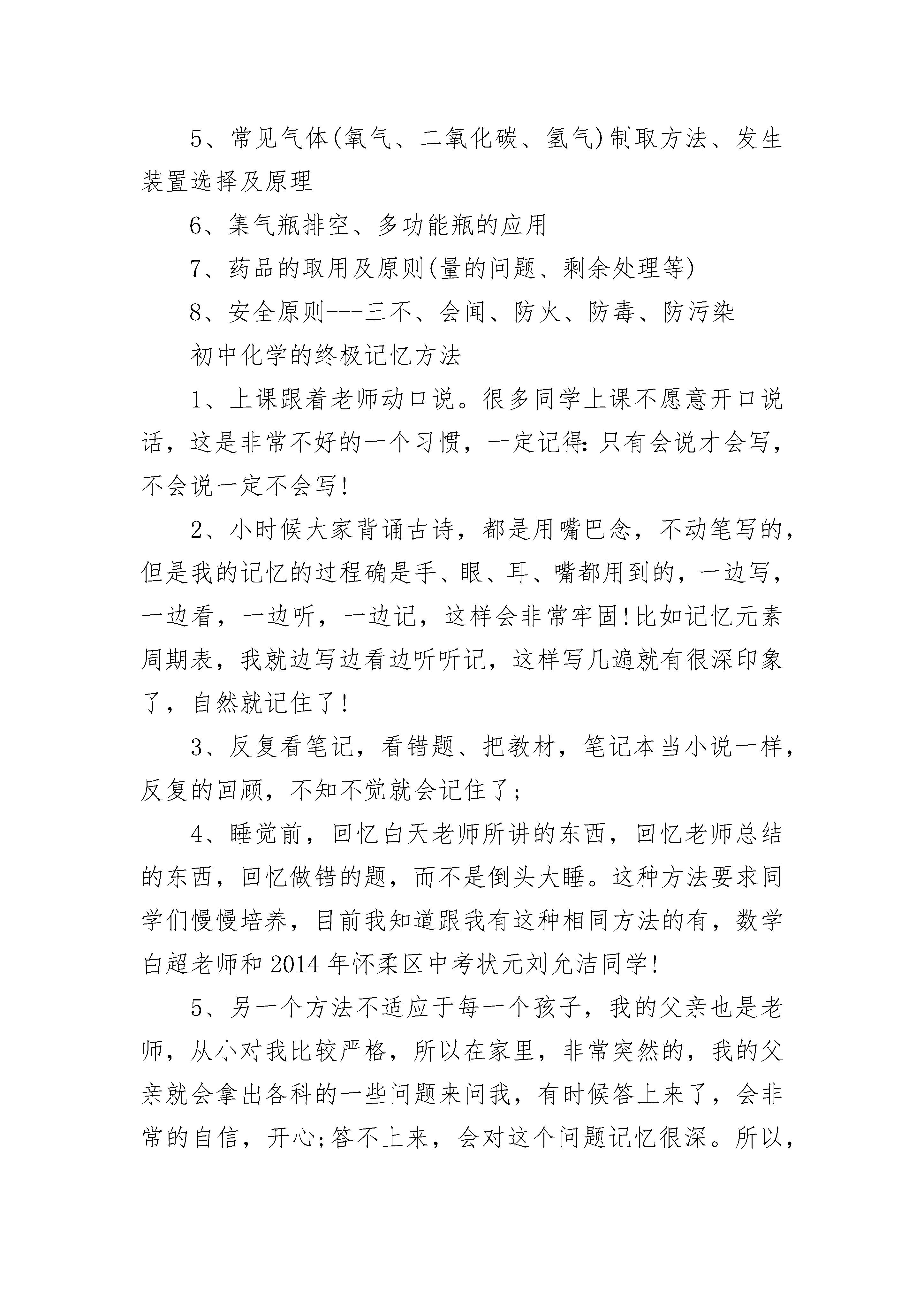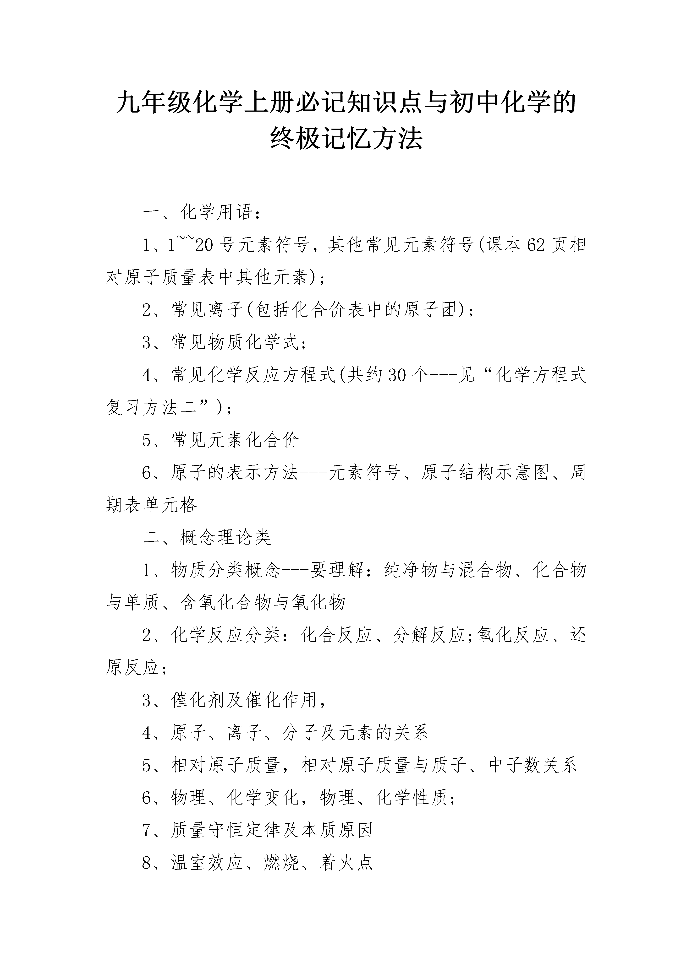 九年级化学上册必记知识点与初中化学的终极记忆方法一、化学用语:1、1~~20号元素符号,其他常见元素符号(课本62页相对原子质量表中其他元素);2、常见离子(包括化合价表中的原子团);3、常见物质化学式;4、常见化学反应方程式(共约30个---见“化学方程式复习方法二”);5、常见元素化合价6、原子的表示方法---元素符号、原子结构示意图、周期表单元格二、概念理论类1、物质分类概念---要理解:纯净物与混合物、化合物与单质、含氧化合物与氧化物2、化学反应分类:化合反应、分解反应;氧化反应、还原反应;3、催化剂及催化作用,4、原子、离子、分子及元素的关系5、相对原子质量,相对原子质量与质子、中子数关系6、物理、化学变化,物理、化学性质;7、质量守恒定律及本质原因8、温室效应、燃烧、着火点9、石油分馏、煤的综合利用10、几位科学家及贡献三、物质组成1、空气的组成2、稀有气体3、地壳中元素含量4、软水与硬水及区别6、空气及水污染7、生物体、海水的元素含量前六位四、应用理解1、元素符号、离子符号、化学式、化学方程式的意义2、化合价的表示及相关计算、离子符号的书写3、关于化学反应方程式的计算4、硬水软化、污水处理、饮用水处理5、物质组成元素的探究6、影响物质化学性质的因素---元素组成、分子构成、原子空间排布7、固定变量法探究着火条件、影响反应速度的因素8、读懂化学反应圈点示意图五、操作1、液体量取、固体称量;液体加热;液体转移;2、检查装置气密性、气体收集及验满;3、二氧化碳、氧气的检验4、氢气、甲烷、一氧化碳的验纯5、常见气体(氧气、二氧化碳、氢气)制取方法、发生装置选择及原理6、集气瓶排空、多功能瓶的应用7、药品的取用及原则(量的问题、剩余处理等)8、安全原则---三不、会闻、防火、防毒、防污染初中化学的终极记忆方法1、上课跟着老师动口说。很多同学上课不愿意开口说话,这是非常不好的一个习惯,一定记得:只有会说才会写,不会说一定不会写!2、小时候大家背诵古诗,都是用嘴巴念,不动笔写的,但是我的记忆的过程确是手、眼、耳、嘴都用到的,一边写,一边看,一边听,一边记,这样会非常牢固!比如记忆元素周期表,我就边写边看边听听记,这样写几遍就有很深印象了,自然就记住了!3、反复看笔记,看错题、把教材,笔记本当小说一样,反复的回顾,不知不觉就会记住了;4、睡觉前,回忆白天老师所讲的东西,回忆老师总结的东西,回忆做错的题,而不是倒头大睡。这种方法要求同学们慢慢培养,目前我知道跟我有这种相同方法的有,数学白超老师和2014年怀柔区中考状元刘允洁同学!5、另一个方法不适应于每一个孩子,我的父亲也是老师,从小对我比较严格,所以在家里,非常突然的,我的父亲就会拿出各科的一些问题来问我,有时候答上来了,会非常的自信,开心;答不上来,会对这个问题记忆很深。所以,如果您和孩子关系非常不多,建议您可以尝试这样的方法。6、记忆的终极方法,可能大家会觉得可笑,就是多练!多做多练多看,比什么都管用!我不相信理科学得好的同学不是从题海战术中爬出来的!九年级化学上册