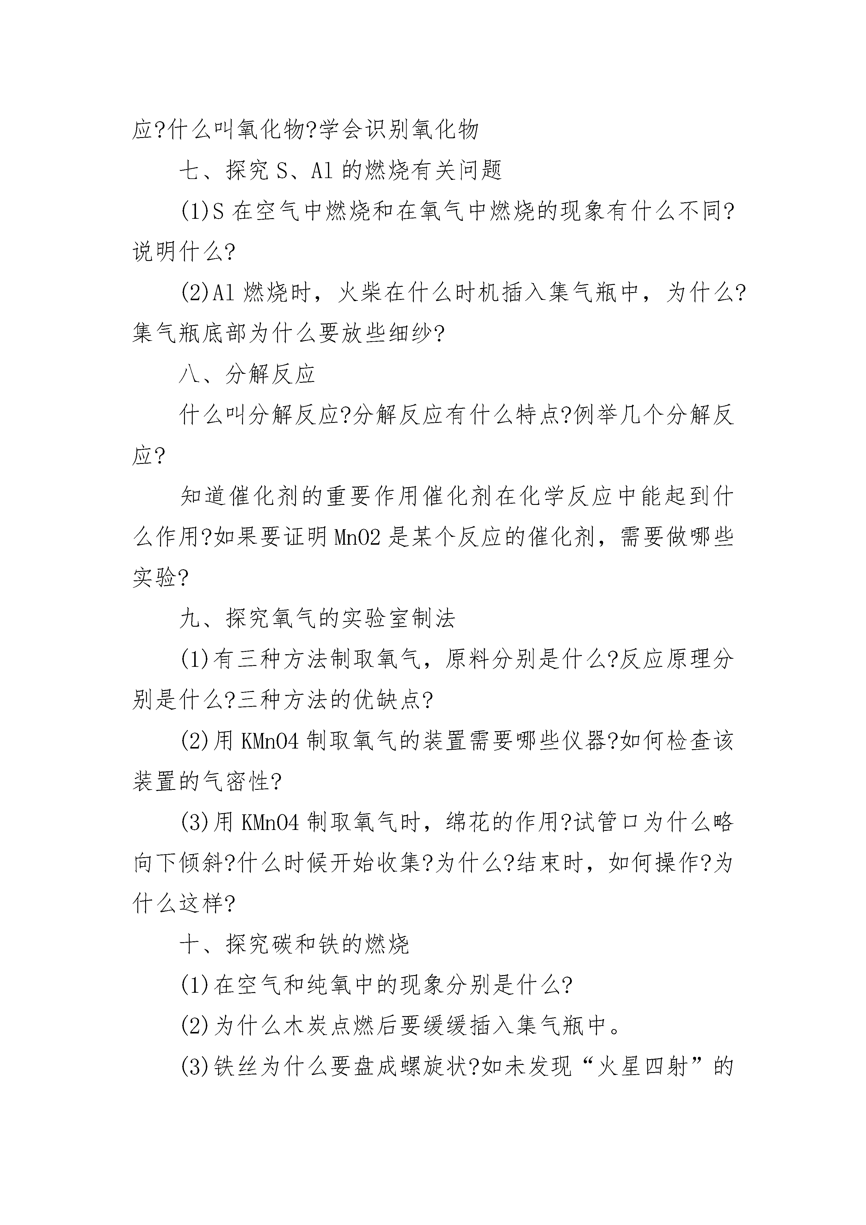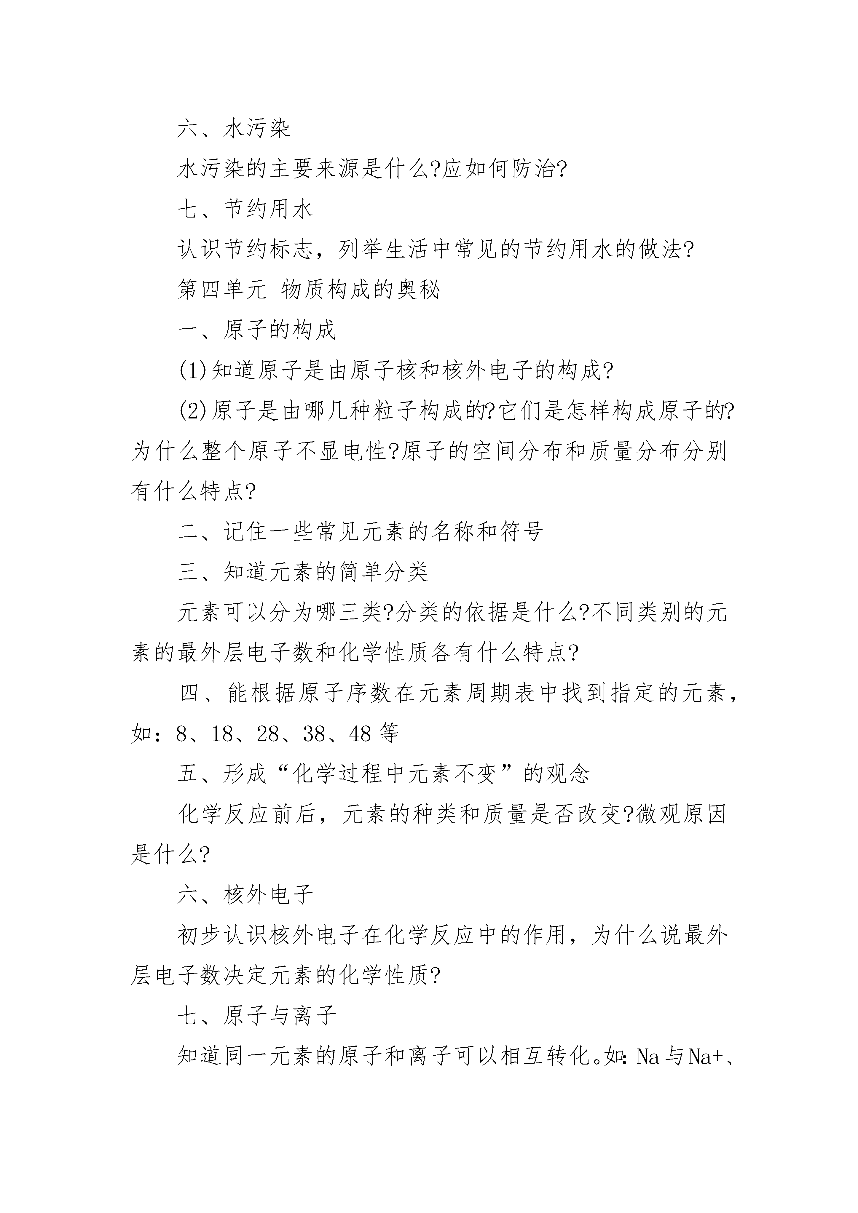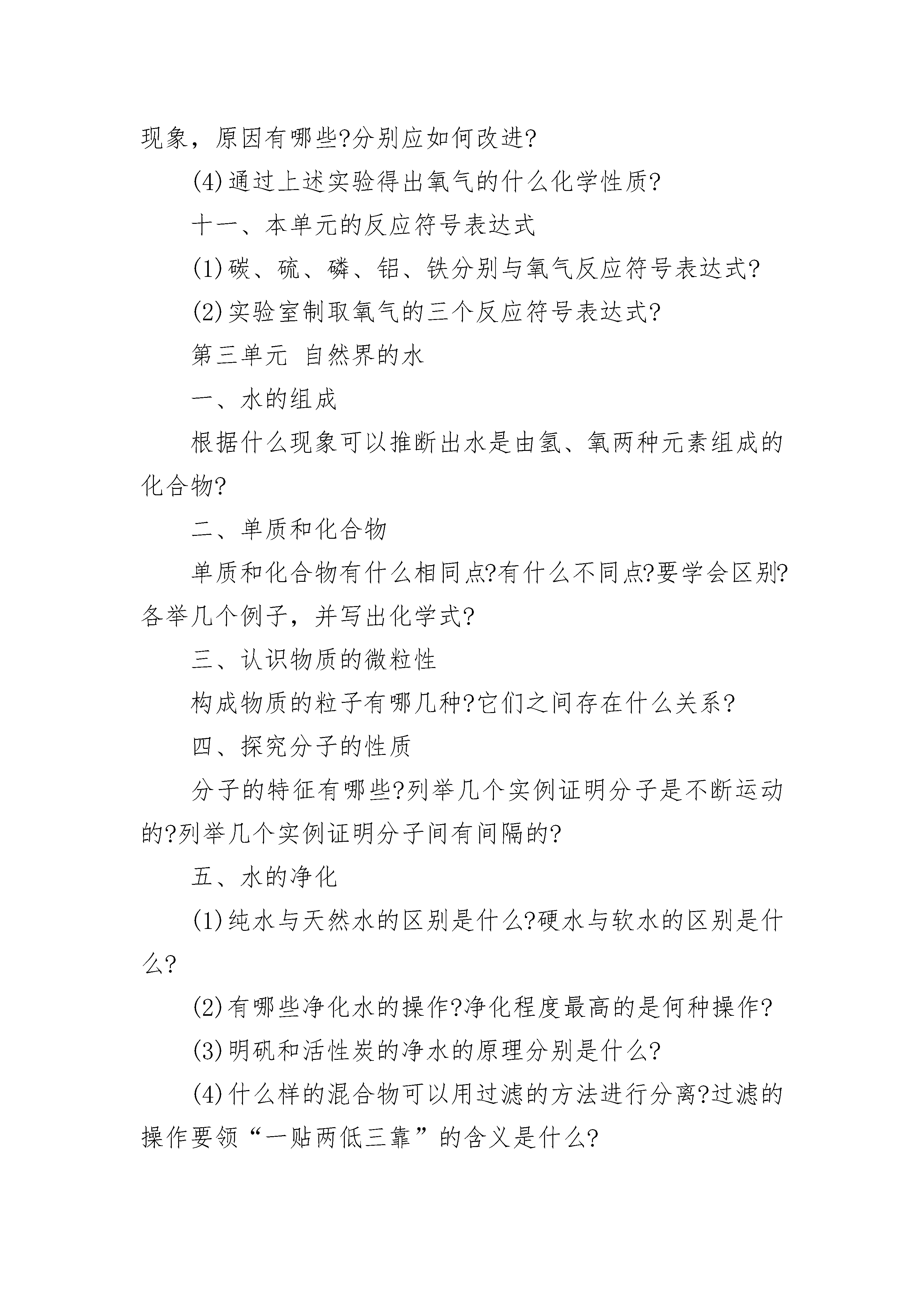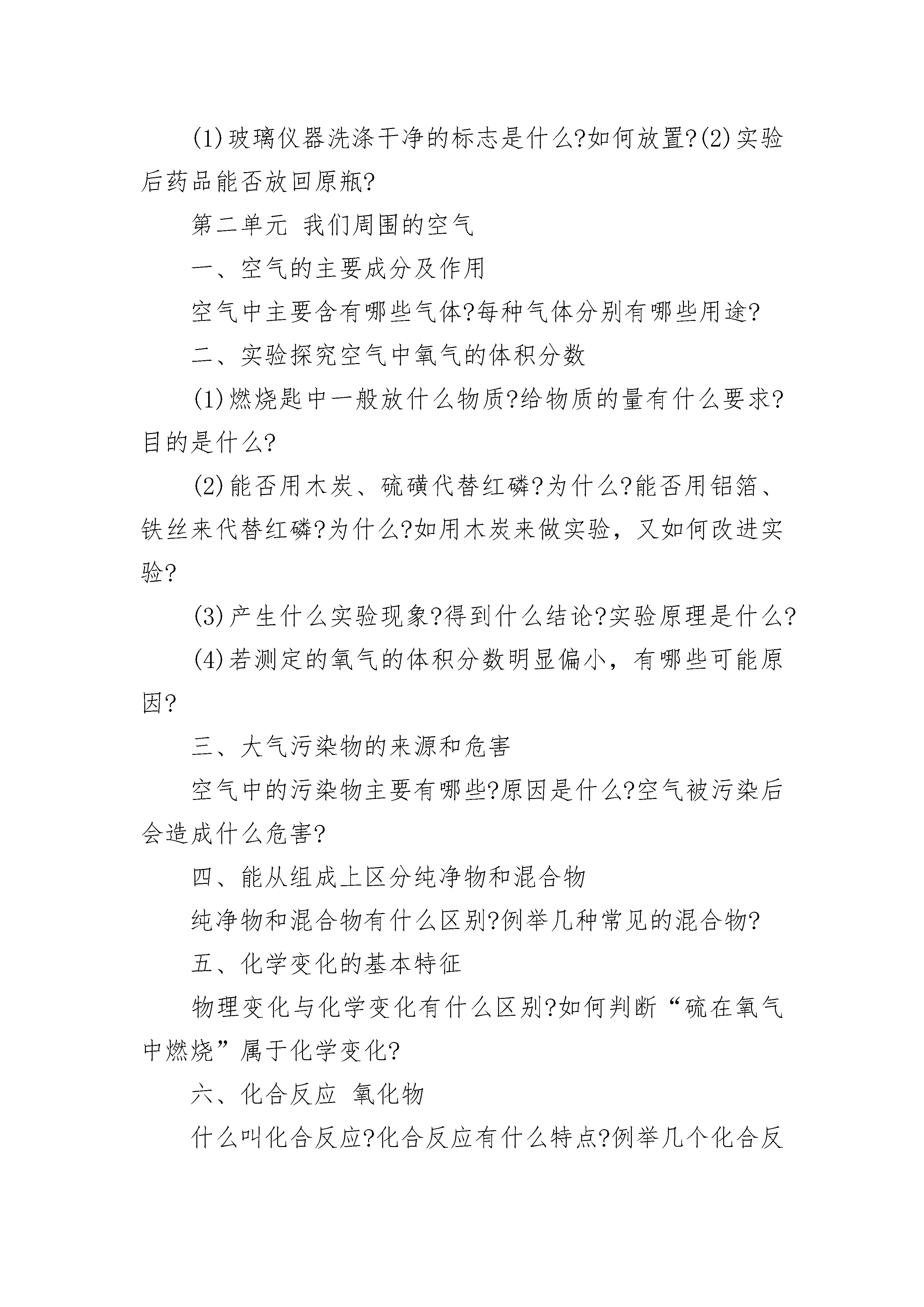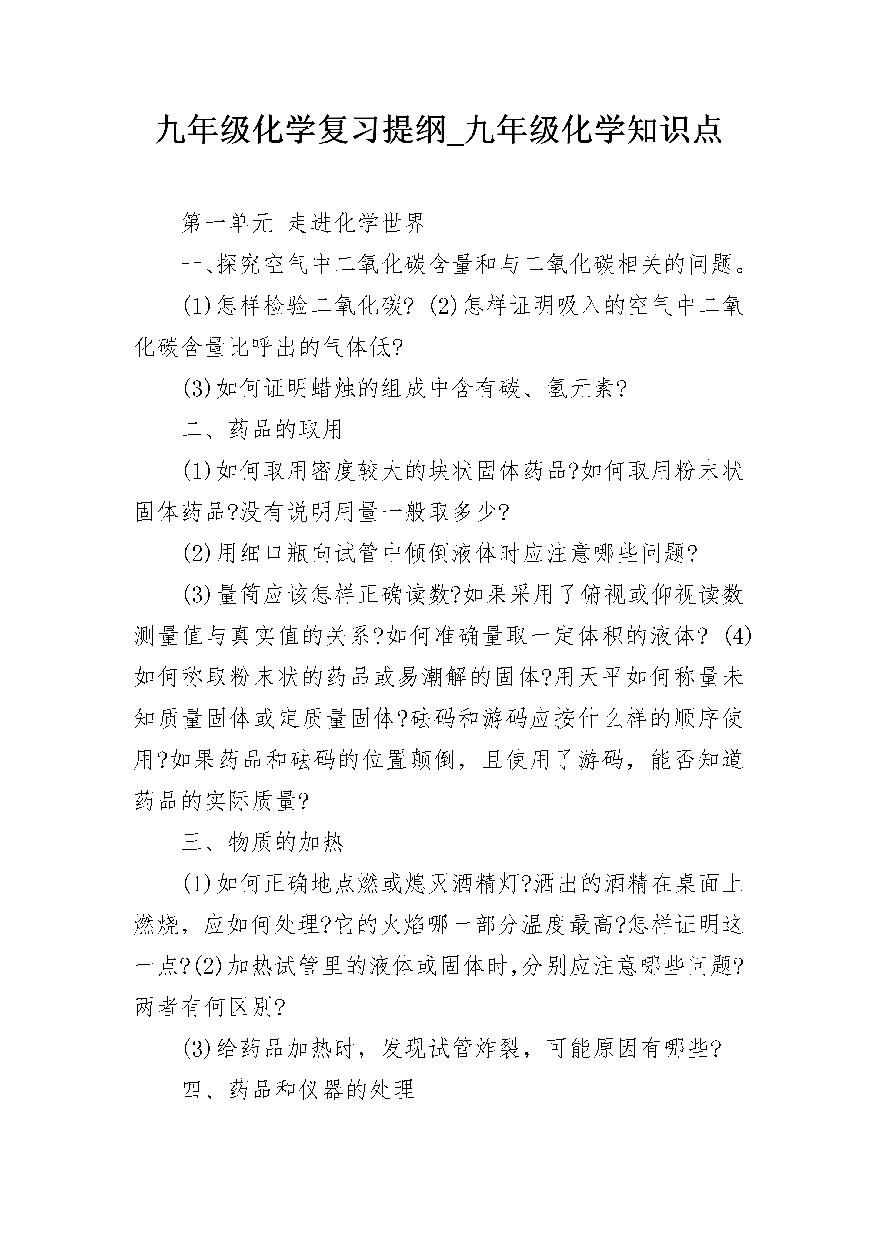 九年级化学复习提纲_九年级化学知识点第一单元走进化学世界一、探究空气中二氧化碳含量和与二氧化碳相关的问题。(1)怎样检验二氧化碳?(2)怎样证明吸入的空气中二氧化碳含量比呼出的气体低?(3)如何证明蜡烛的组成中含有碳、氢元素?二、药品的取用(1)如何取用密度较大的块状固体药品?如何取用粉末状固体药品?没有说明用量一般取多少?(2)用细口瓶向试管中倾倒液体时应注意哪些问题?(3)量筒应该怎样正确读数?如果采用了俯视或仰视读数测量值与真实值的关系?如何准确量取一定体积的液体?(4)如何称取粉末状的药品或易潮解的固体?用天平如何称量未知质量固体或定质量固体?砝码和游码应按什么样的顺序使用?如果药品和砝码的位置颠倒,且使用了游码,能否知道药品的实际质量?三、物质的加热(1)如何正确地点燃或熄灭酒精灯?洒出的酒精在桌面上燃烧,应如何处理?它的火焰哪一部分温度最高?怎样证明这一点?(2)加热试管里的液体或固体时,分别应注意哪些问题?两者有何区别?(3)给药品加热时,发现试管炸裂,可能原因有哪些?四、药品和仪器的处理(1)玻璃仪器洗涤干净的标志是什么?如何放置?(2)实验后药品能否放回原瓶?第二单元我们周围的空气一、空气的主要成分及作用空气中主要含有哪些气体?每种气体分别有哪些用途?二、实验探究空气中氧气的体积分数(1)燃烧匙中一般放什么物质?给物质的量有什么要求?目的是什么?(2)能否用木炭、硫磺代替红磷?为什么?能否用铝箔、铁丝来代替红磷?为什么?如用木炭来做实验,又如何改进实验?(3)产生什么实验现象?得到什么结论?实验原理是什么?(4)若测定的氧气的体积分数明显偏小,有哪些可能原因?三、大气污染物的来源和危害空气中的污染物主要有哪些?原因是什么?空气被污染后会造成什么危害?四、能从组成上区分纯净物和混合物纯净物和混合物有什么区别?例举几种常见的混合物?五、化学变化的基本特征物理变化与化学变化有什么区别?如何判断“硫在氧气中燃烧”属于化学变化?六、化合反应氧化物什么叫化合反应?化合反应有什么特点?例举几个化合反应?什么叫氧化物?学会识别氧化物七、探究S、Al的燃烧有关问题(1)S在空气中燃烧和在氧气中燃烧的现象有什么不同?说明什么?(2)Al燃烧时,火柴在什么时机插入集气瓶中,为什么?集气瓶底部为什么要放些细纱?八、分解反应什么叫分解反应?分解反应有什么特点?例举几个分解反应?知道催化剂的重要作用催化剂在化学反应中能起到什么作用?如果要证明MnO2是某个反应的催化剂,需要做哪些实验?九、探究氧气的实验室制法(1)有三种方法制取氧气,原料分别是什么?反应原理分别是什么?三种方法的优缺点?(2)用KMnO4制取氧气的装置需要哪些仪器?如何检查该装置的气密性?(3)用KMnO4制取氧气时,绵花的作用?试管口为什么略向下倾斜?什么时候开始收集?为什么?结束时,如何操作?为什么这样?十、探究碳和铁的燃烧(1)在空气和纯氧中的现象分别是什么?(2)为什么木炭点燃后要缓缓插入集气瓶中。(3)铁丝为什么要盘成螺旋状?如未发现“火星四射”的现象,原因有哪些?分别应如何改进?(4)通过上述实验得出氧气的什么化学性质?十一、本单元的反应符号表达式(1)碳、硫、磷、铝、铁分别与氧气反应符号表达式?(2)实验室制取氧气的三个反应符号表达式?第三单元自然界的水一、水的组成根据什么现象可以推断出水是由氢、氧两种元素组成的化合物?二、单质和化合物单质和化合物有什么相同点?有什么不同点?要学会区别?各举几个例子,并写出化学式?三、认识物质的微粒性构成物质的粒子有哪几种?它们之间存在什么关系?四、探究分子的性质分子的特征有哪些?列举几个实例证明分子是不断运动的?列举几个实例证明分子间有间隔的?五、水的净化(1)纯水与天然水的区别是什么?硬水与软水的区别是什么?(2)有哪些净化水的操作?净化程度最高的是何种操作?(3)明矾和活性炭的净水的原理分别是什么?(4)什么样的混合物可以用过滤的方法进行分离?过滤的操作要领“一贴两低三靠”的含义是什么?六、水污染水污染的主要来源是什么?应如何防治?七、节约用水认识节约标志,列举生活中常见的节约用水的做法?第四单元物质构成的奥秘一、原子的构成(1)知道原子是由原子核和核外电子的构成?(2)原子是由哪几种粒子构成的?它们是怎样构成原子的?为什么整个原子不显电性?原子的空间分布和质量分布分别有什么特点?二、记住一些常见元素的名称和符号三、知道元素的简单分类元素可以分为哪三类?分类的依据是什么?不同类别的元素的最外层电子数和化学性质各有什么特点?四、能根据原子序数在元素周期表中找到指定的元素,如:8、18、28、38、48等五、形成“化学过程中元素不变”的观念化学反应前后,元素的种类和质量是否改变?微观原因是什么?六、核外电子初步认识核