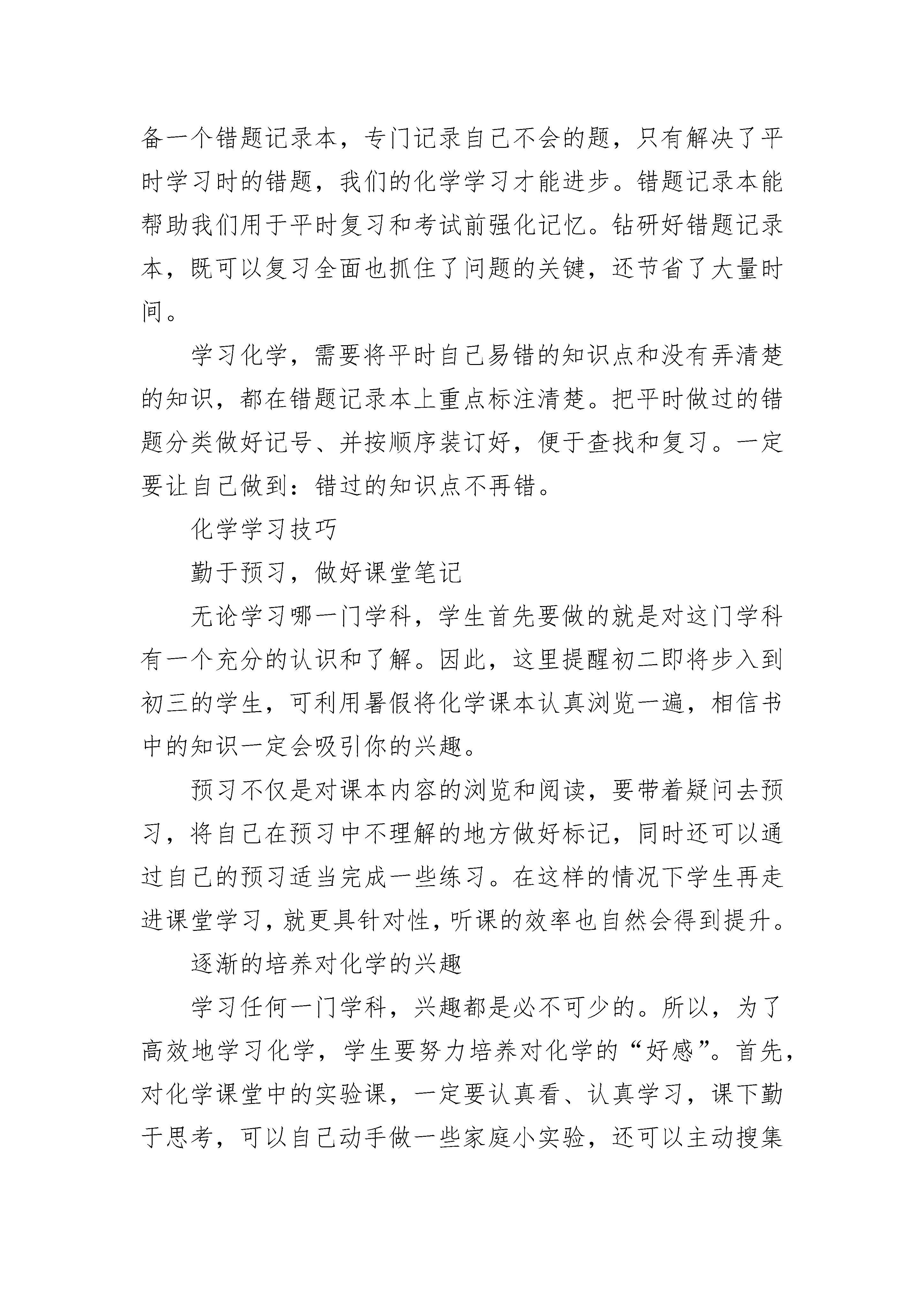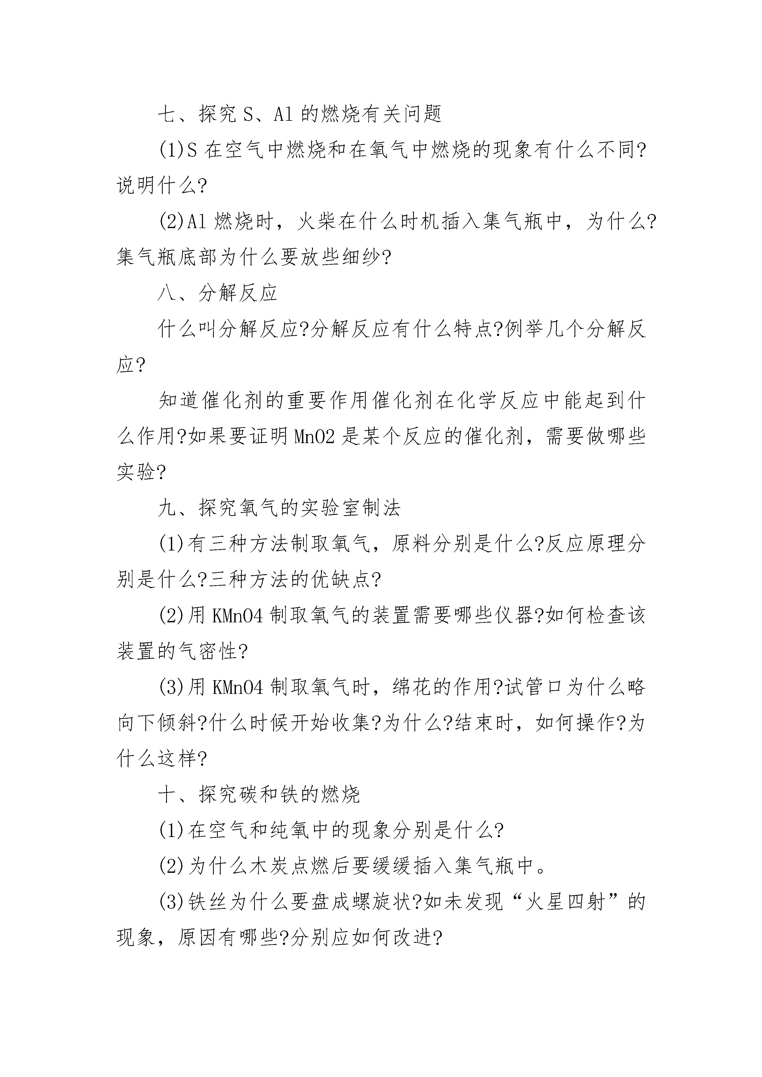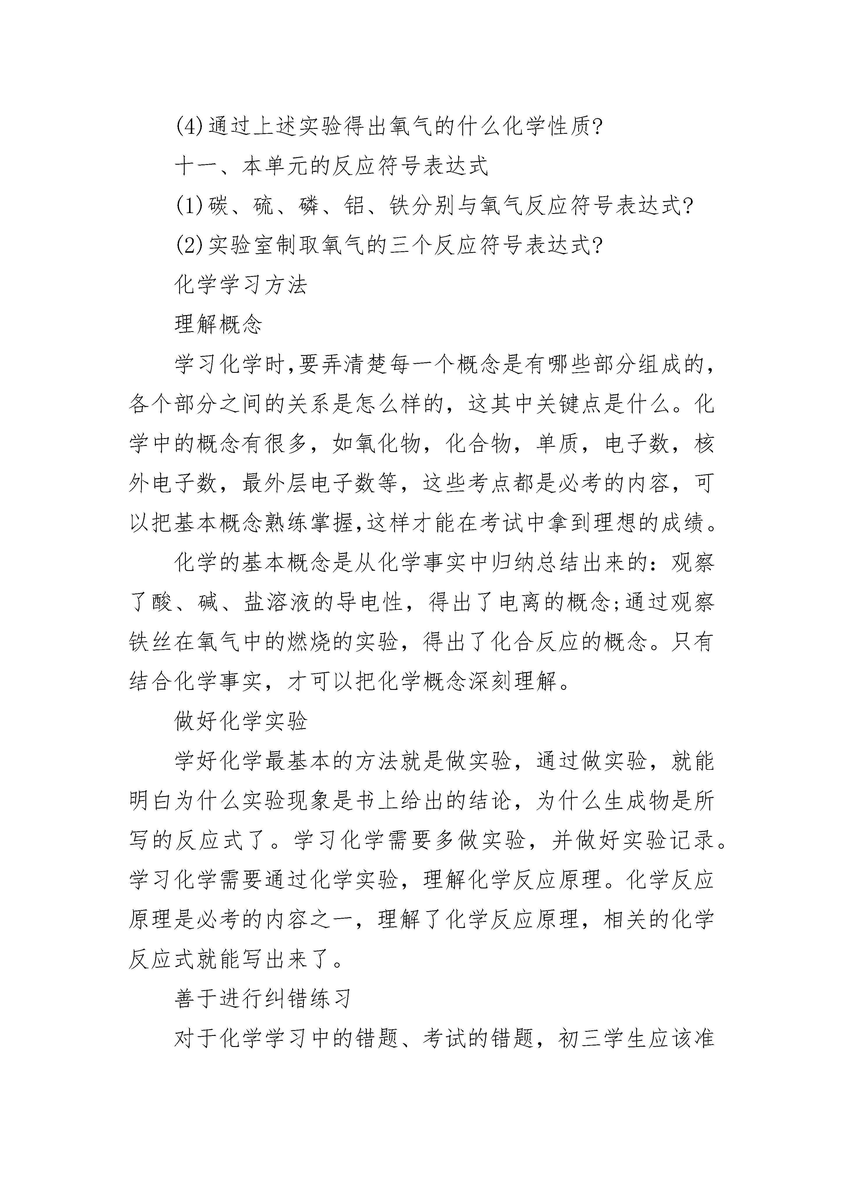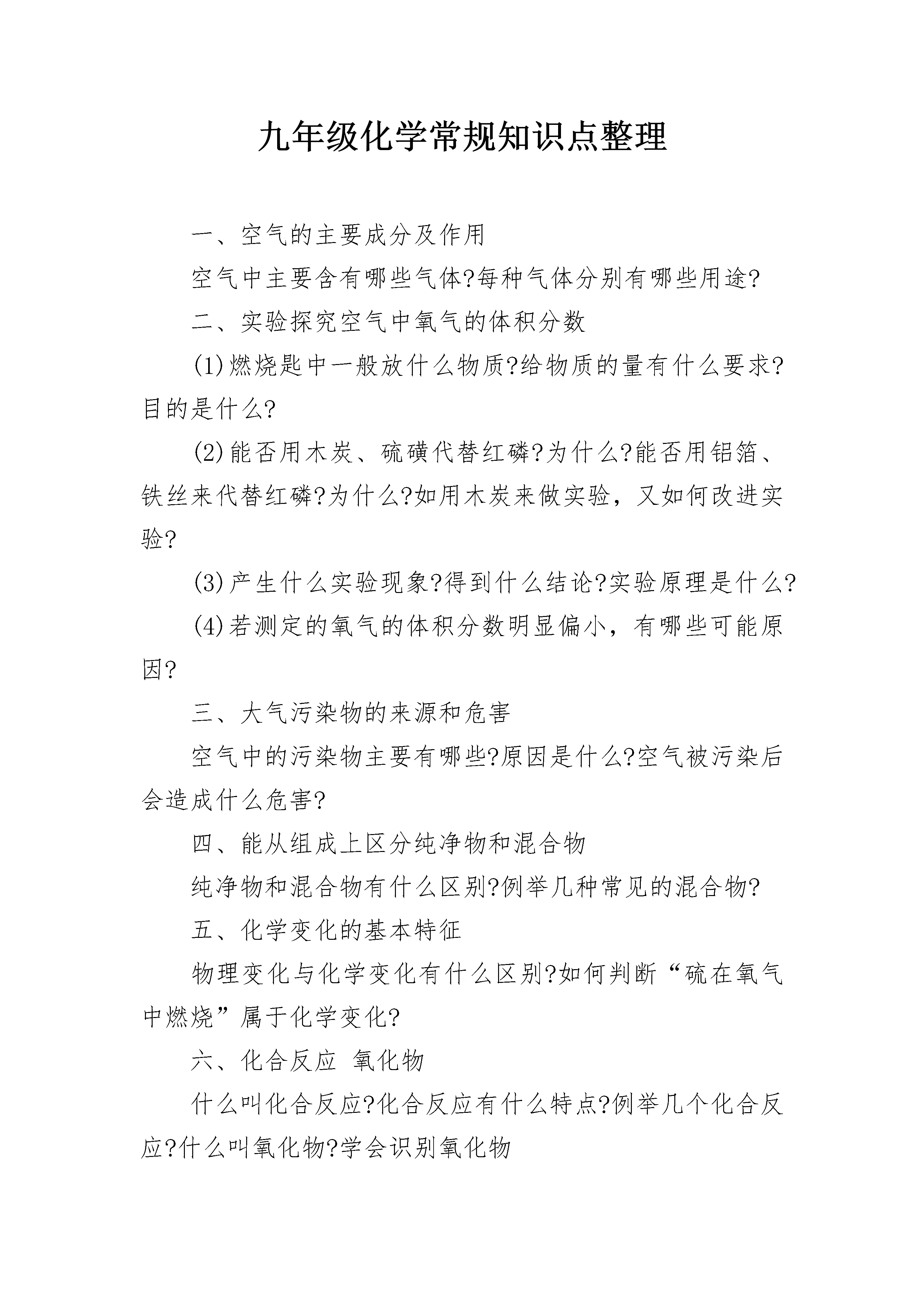 九年级化学常规知识点整理一、空气的主要成分及作用空气中主要含有哪些气体?每种气体分别有哪些用途?二、实验探究空气中氧气的体积分数(1)燃烧匙中一般放什么物质?给物质的量有什么要求?目的是什么?(2)能否用木炭、硫磺代替红磷?为什么?能否用铝箔、铁丝来代替红磷?为什么?如用木炭来做实验,又如何改进实验?(3)产生什么实验现象?得到什么结论?实验原理是什么?(4)若测定的氧气的体积分数明显偏小,有哪些可能原因?三、大气污染物的来源和危害空气中的污染物主要有哪些?原因是什么?空气被污染后会造成什么危害?四、能从组成上区分纯净物和混合物纯净物和混合物有什么区别?例举几种常见的混合物?五、化学变化的基本特征物理变化与化学变化有什么区别?如何判断“硫在氧气中燃烧”属于化学变化?六、化合反应氧化物什么叫化合反应?化合反应有什么特点?例举几个化合反应?什么叫氧化物?学会识别氧化物七、探究S、Al的燃烧有关问题(1)S在空气中燃烧和在氧气中燃烧的现象有什么不同?说明什么?(2)Al燃烧时,火柴在什么时机插入集气瓶中,为什么?集气瓶底部为什么要放些细纱?八、分解反应什么叫分解反应?分解反应有什么特点?例举几个分解反应?知道催化剂的重要作用催化剂在化学反应中能起到什么作用?如果要证明MnO2是某个反应的催化剂,需要做哪些实验?九、探究氧气的实验室制法(1)有三种方法制取氧气,原料分别是什么?反应原理分别是什么?三种方法的优缺点?(2)用KMnO4制取氧气的装置需要哪些仪器?如何检查该装置的气密性?(3)用KMnO4制取氧气时,绵花的作用?试管口为什么略向下倾斜?什么时候开始收集?为什么?结束时,如何操作?为什么这样?十、探究碳和铁的燃烧(1)在空气和纯氧中的现象分别是什么?(2)为什么木炭点燃后要缓缓插入集气瓶中。(3)铁丝为什么要盘成螺旋状?如未发现“火星四射”的现象,原因有哪些?分别应如何改进?(4)通过上述实验得出氧气的什么化学性质?十一、本单元的反应符号表达式(1)碳、硫、磷、铝、铁分别与氧气反应符号表达式?(2)实验室制取氧气的三个反应符号表达式?化学学习方法理解概念学习化学时,要弄清楚每一个概念是有哪些部分组成的,各个部分之间的关系是怎么样的,这其中关键点是什么。化学中的概念有很多,如氧化物,化合物,单质,电子数,核外电子数,最外层电子数等,这些考点都是必考的内容,可以把基本概念熟练掌握,这样才能在考试中拿到理想的成绩。化学的基本概念是从化学事实中归纳总结出来的:观察了酸、碱、盐溶液的导电性,得出了电离的概念;通过观察铁丝在氧气中的燃烧的实验,得出了化合反应的概念。只有结合化学事实,才可以把化学概念深刻理解。做好化学实验学好化学最基本的方法就是做实验,通过做实验,就能明白为什么实验现象是书上给出的结论,为什么生成物是所写的反应式了。学习化学需要多做实验,并做好实验记录。学习化学需要通过化学实验,理解化学反应原理。化学反应原理是必考的内容之一,理解了化学反应原理,相关的化学反应式就能写出来了。善于进行纠错练习对于化学学习中的错题、考试的错题,初三学生应该准备一个错题记录本,专门记录自己不会的题,只有解决了平时学习时的错题,我们的化学学习才能进步。错题记录本能帮助我们用于平时复习和考试前强化记忆。钻研好错题记录本,既可以复习全面也抓住了问题的关键,还节省了大量时间。学习化学,需要将平时自己易错的知识点和没有弄清楚的知识,都在错题记录本上重点标注清楚。把平时做过的错题分类做好记号、并按顺序装订好,便于查找和复习。一定要让自己做到:错过的知识点不再错。化学学习技巧勤于预习,做好课堂笔记无论学习哪一门学科,学生首先要做的就是对这门学科有一个充分的认识和了解。因此,这里提醒初二即将步入到初三的学生,可利用暑假将化学课本认真浏览一遍,相信书中的知识一定会吸引你的兴趣。预习不仅是对课本内容的浏览和阅读,要带着疑问去预习,将自己在预习中不理解的地方做好标记,同时还可以通过自己的预习适当完成一些练习。在这样的情况下学生再走进课堂学习,就更具针对性,听课的效率也自然会得到提升。逐渐的培养对化学的兴趣学习任何一门学科,兴趣都是必不可少的。所以,为了高效地学习化学,学生要努力培养对化学的“好感”。首先,对化学课堂中的实验课,一定要认真看、认真学习,课下勤于思考,可以自己动手做一些家庭小实验,还可以主动搜集一些与课本相关的化学小故事,通过这些方式逐渐建立起对化学的兴趣。加强对化学公式、符号的记忆初中化学知识理解起来相对容易,但内容比较繁杂。所以下课花时间对一些公式和符号进行记忆是必不可少的。学生在学习化学时一定要熟练掌握相关化学用语。初三阶段会学习到水、氢气、氧气、二氧化碳这些物质,对于它们特有的化学符号,学生必须要牢记。“元素”这一章所涉及的诸多元素名称、符