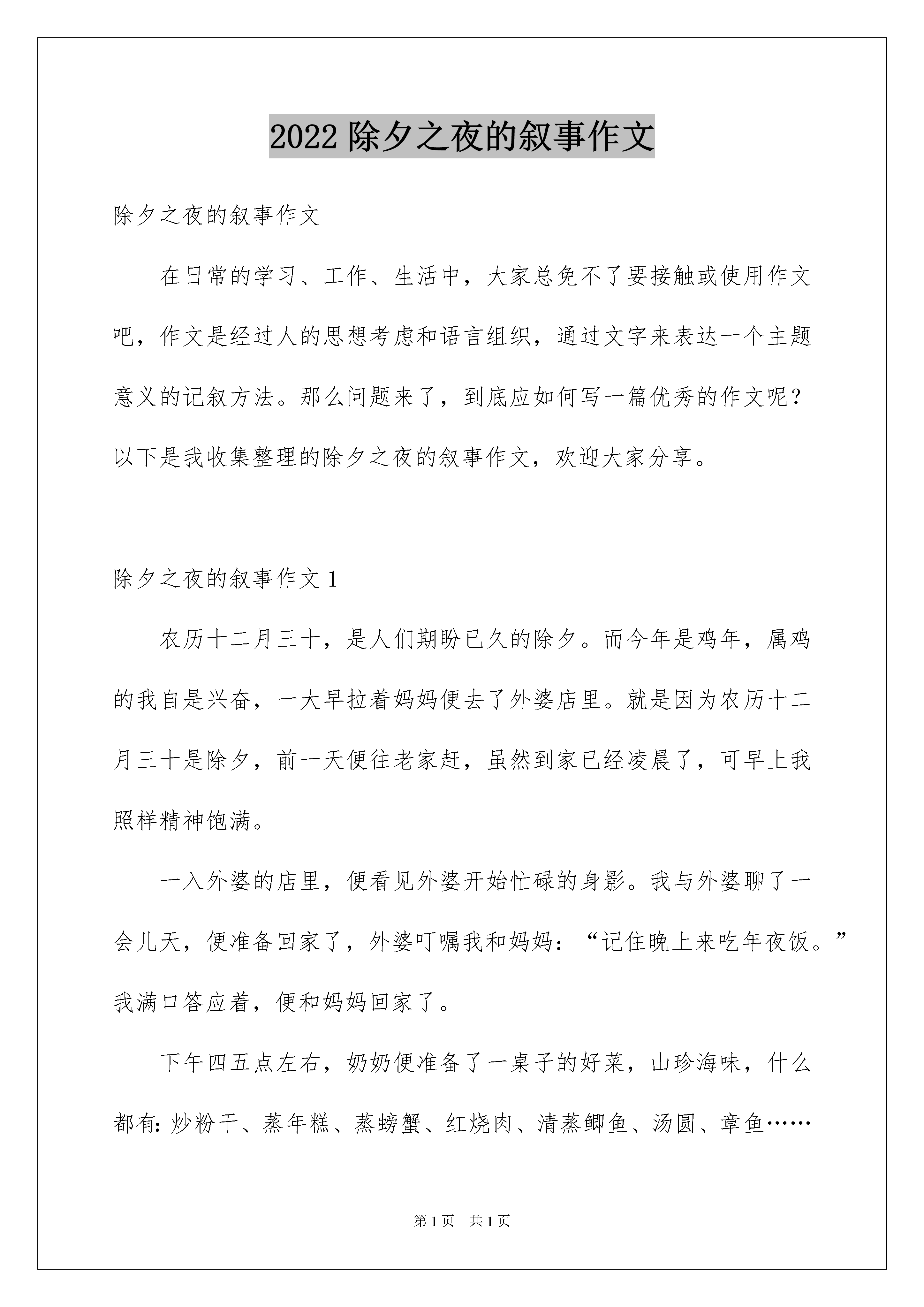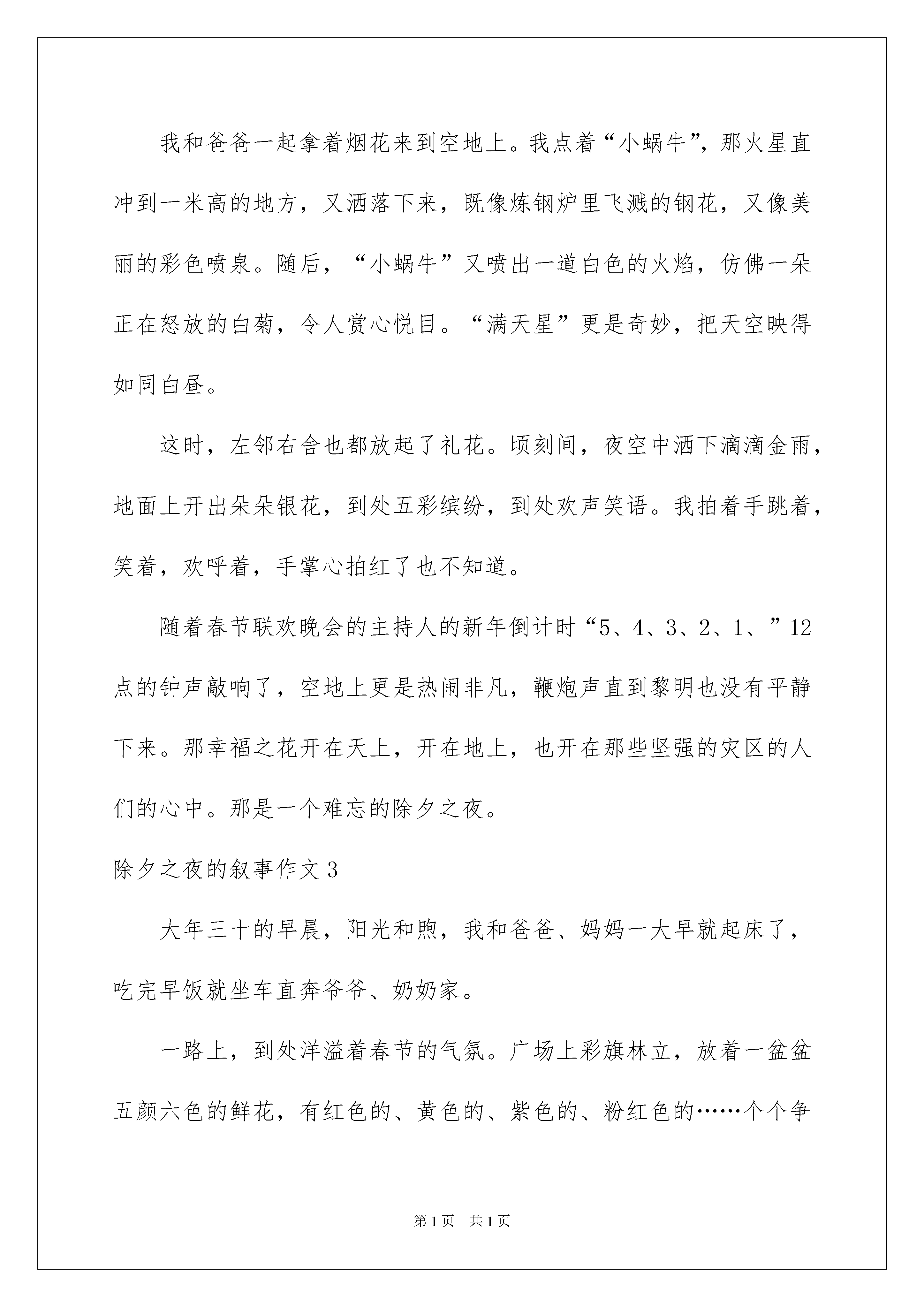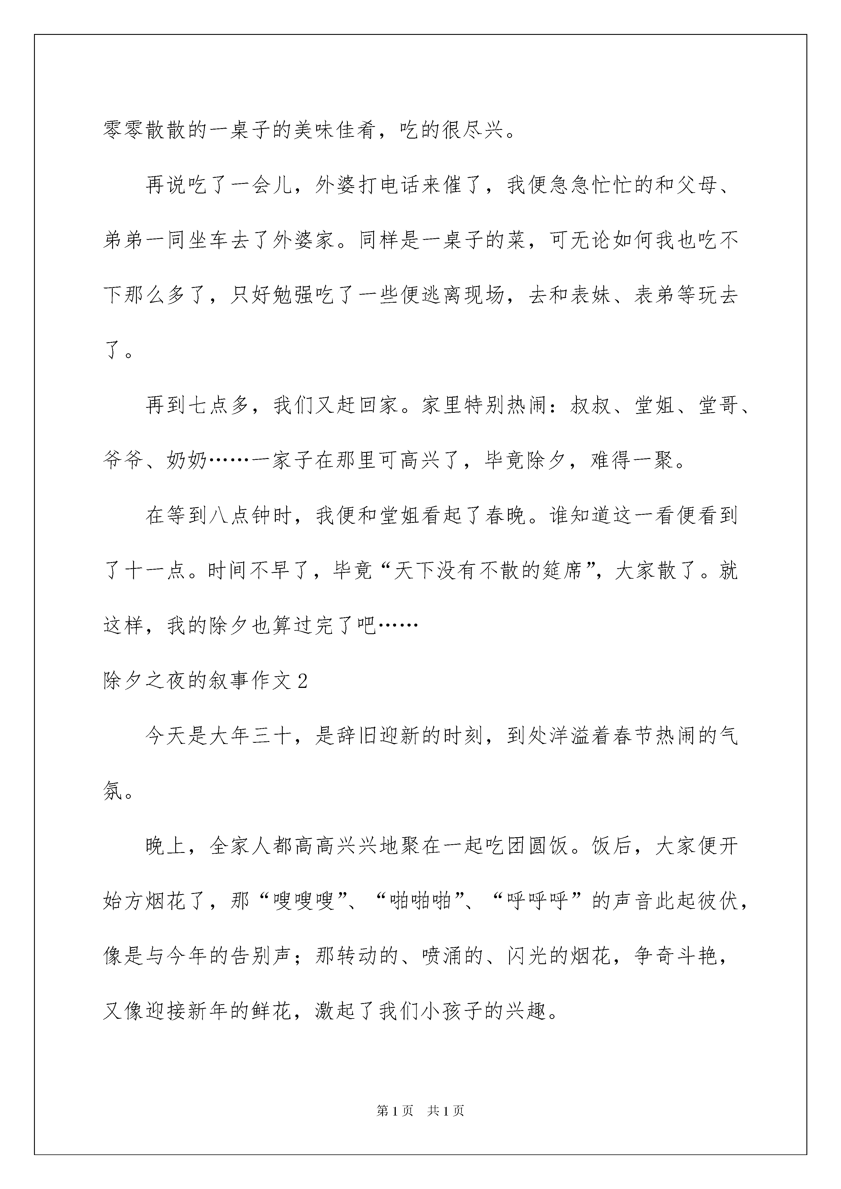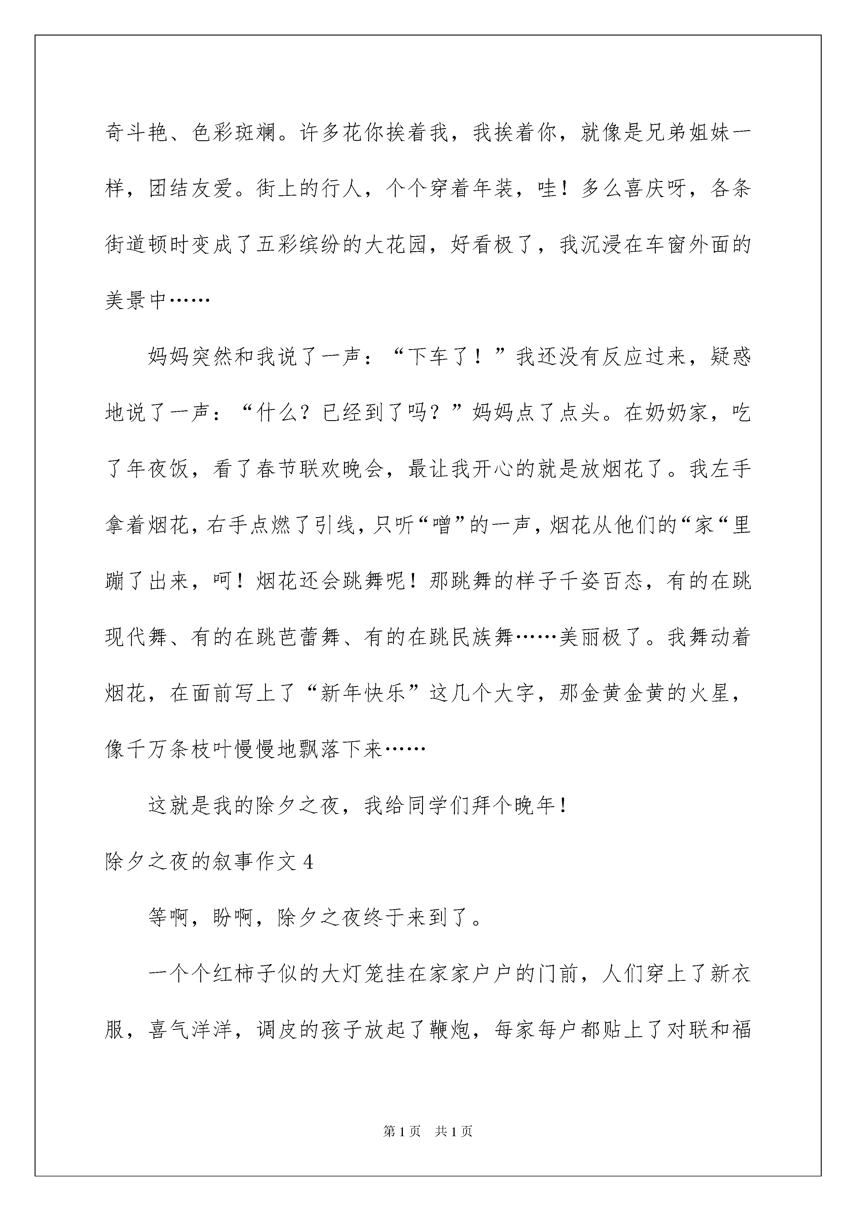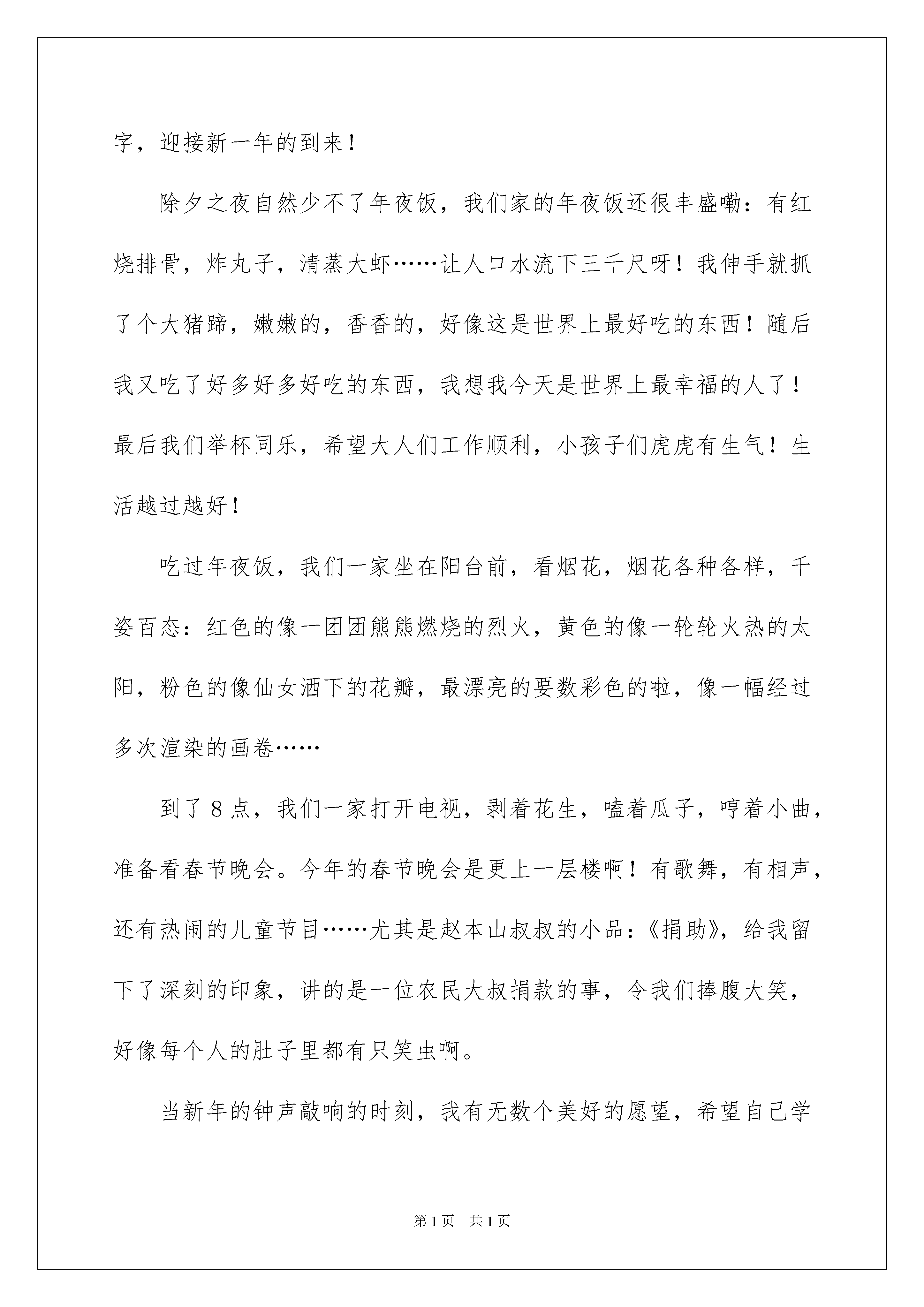 2022除夕之夜的叙事作文除夕之夜的叙事作文在日常的学习、工作、生活中,大家总免不了要接触或使用作文吧,作文是经过人的思想考虑和语言组织,通过文字来表达一个主题意义的记叙方法。那么问题来了,到底应如何写一篇优秀的作文呢?以下是我收集整理的除夕之夜的叙事作文,欢迎大家分享。除夕之夜的叙事作文1农历十二月三十,是人们期盼已久的除夕。而今年是鸡年,属鸡的我自是兴奋,一大早拉着妈妈便去了外婆店里。就是因为农历十二月三十是除夕,前一天便往老家赶,虽然到家已经凌晨了,可早上我照样精神饱满。一入外婆的店里,便看见外婆开始忙碌的身影。我与外婆聊了一会儿天,便准备回家了,外婆叮嘱我和妈妈:“记住晚上来吃年夜饭。”我满口答应着,便和妈妈回家了。下午四五点左右,奶奶便准备了一桌子的好菜,山珍海味,什么都有:炒粉干、蒸年糕、蒸螃蟹、红烧肉、清蒸鲫鱼、汤圆、章鱼……零零散散的一桌子的美味佳肴,吃的很尽兴。再说吃了一会儿,外婆打电话来催了,我便急急忙忙的和父母、弟弟一同坐车去了外婆家。同样是一桌子的菜,可无论如何我也吃不下那么多了,只好勉强吃了一些便逃离现场,去和表妹、表弟等玩去了。再到七点多,我们又赶回家。家里特别热闹:叔叔、堂姐、堂哥、爷爷、奶奶……一家子在那里可高兴了,毕竟除夕,难得一聚。在等到八点钟时,我便和堂姐看起了春晚。谁知道这一看便看到了十一点。时间不早了,毕竟“天下没有不散的筵席”,大家散了。就这样,我的除夕也算过完了吧……除夕之夜的叙事作文2今天是大年三十,是辞旧迎新的时刻,到处洋溢着春节热闹的气氛。晚上,全家人都高高兴兴地聚在一起吃团圆饭。饭后,大家便开始方烟花了,那“嗖嗖嗖”、“啪啪啪”、“呼呼呼”的声音此起彼伏,像是与今年的告别声;那转动的、喷涌的、闪光的烟花,争奇斗艳,又像迎接新年的鲜花,激起了我们小孩子的兴趣。我和爸爸一起拿着烟花来到空地上。我点着“小蜗牛”,那火星直冲到一米高的地方,又洒落下来,既像炼钢炉里飞溅的钢花,又像美丽的彩色喷泉。随后,“小蜗牛”又喷出一道白色的火焰,仿佛一朵正在怒放的白菊,令人赏心悦目。“满天星”更是奇妙,把天空映得如同白昼。这时,左邻右舍也都放起了礼花。顷刻间,夜空中洒下滴滴金雨,地面上开出朵朵银花,到处五彩缤纷,到处欢声笑语。我拍着手跳着,笑着,欢呼着,手掌心拍红了也不知道。随着春节联欢晚会的主持人的新年倒计时“5、4、3、2、1、”12点的钟声敲响了,空地上更是热闹非凡,鞭炮声直到黎明也没有平静下来。那幸福之花开在天上,开在地上,也开在那些坚强的灾区的人们的心中。那是一个难忘的除夕之夜。除夕之夜的叙事作文3大年三十的早晨,阳光和煦,我和爸爸、妈妈一大早就起床了,吃完早饭就坐车直奔爷爷、奶奶家。一路上,到处洋溢着春节的气氛。广场上彩旗林立,放着一盆盆五颜六色的鲜花,有红色的、黄色的、紫色的、粉红色的……个个争奇斗艳、色彩斑斓。许多花你挨着我,我挨着你,就像是兄弟姐妹一样,团结友爱。街上的行人,个个穿着年装,哇!多么喜庆呀,各条街道顿时变成了五彩缤纷的大花园,好看极了,我沉浸在车窗外面的美景中……妈妈突然和我说了一声:“下车了!”我还没有反应过来,疑惑地说了一声:“什么?已经到了吗?”妈妈点了点头。在奶奶家,吃了年夜饭,看了春节联欢晚会,最让我开心的就是放烟花了。我左手拿着烟花,右手点燃了引线,只听“噌”的一声,烟花从他们的“家“里蹦了出来,呵!烟花还会跳舞呢!那跳舞的样子千姿百态,有的在跳现代舞、有的在跳芭蕾舞、有的在跳民族舞……美丽极了。我舞动着烟花,在面前写上了“新年快乐”这几个大字,那金黄金黄的火星,像千万条枝叶慢慢地飘落下来……这就是我的除夕之夜,我给同学们拜个晚年!除夕之夜的叙事作文4等啊,盼啊,除夕之夜终于来到了。一个个红柿子似的大灯笼挂在家家户户的门前,人们穿上了新衣服,喜气洋洋,调皮的孩子放起了鞭炮,每家每户都贴上了对联和福字,迎接新一年的到来!除夕之夜自然少不了年夜饭,我们家的年夜饭还很丰盛嘞:有红烧排骨,炸丸子,清蒸大虾……让人口水流下三千尺呀!我伸手就抓了个大猪蹄,嫩嫩的,香香的,好像这是世界上最好吃的东西!随后我又吃了好多好多好吃的东西,我想我今天是世界上最幸福的人了!最后我们举杯同乐,希望大人们工作顺利,小孩子们虎虎有生气!生活越过越好!吃过年夜饭,我们一家坐在阳台前,看烟花,烟花各种各样,千姿百态:红色的像一团团熊熊燃烧的烈火,黄色的像一轮轮火热的太阳,粉色的像仙女洒下的花瓣,最漂亮的要数彩色的啦,像一幅经过多次渲染的画卷……到了8点,我们一家打开电视,剥着花生,嗑着瓜子,哼着小曲,准备看春节晚会。今年的春节晚会