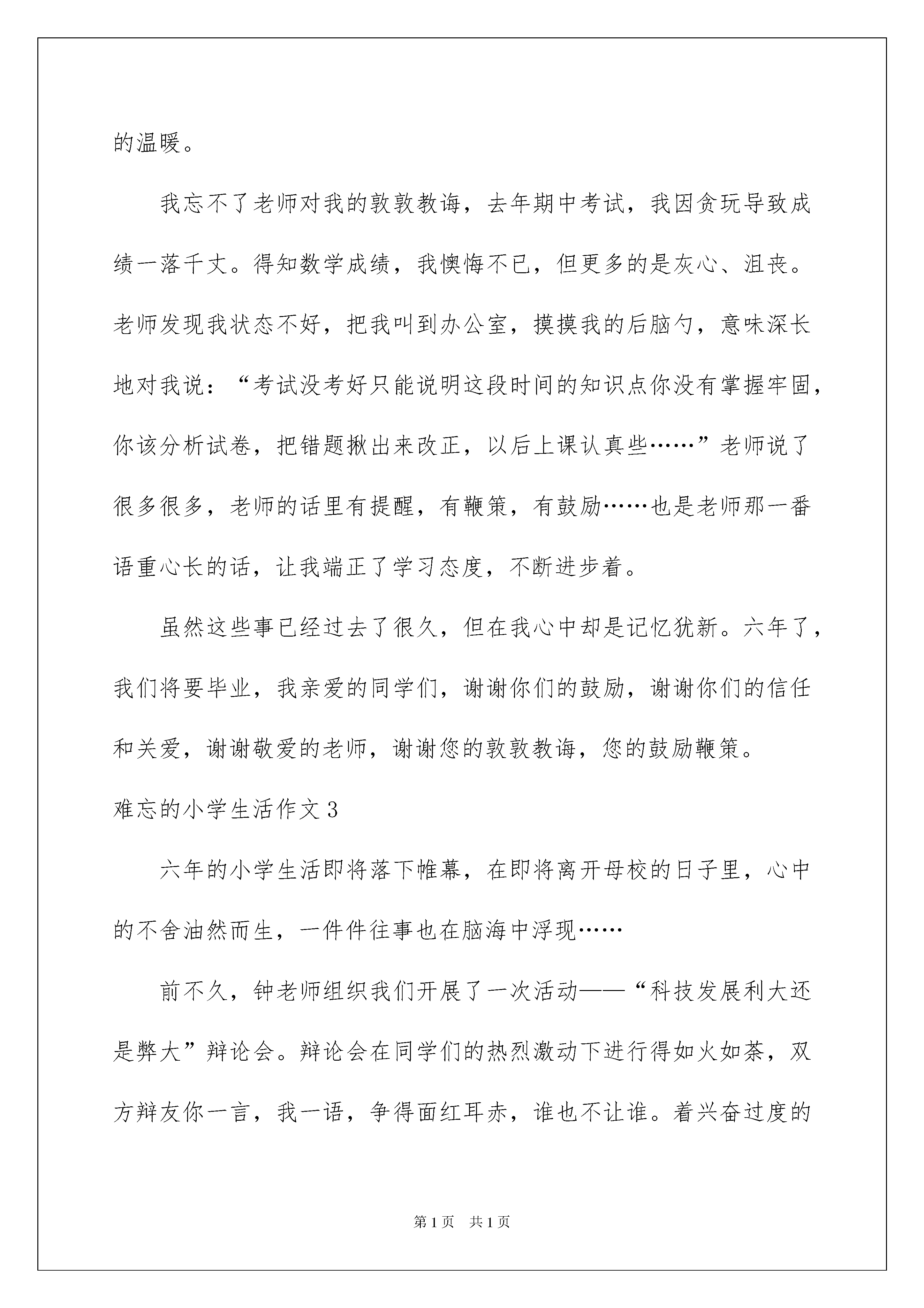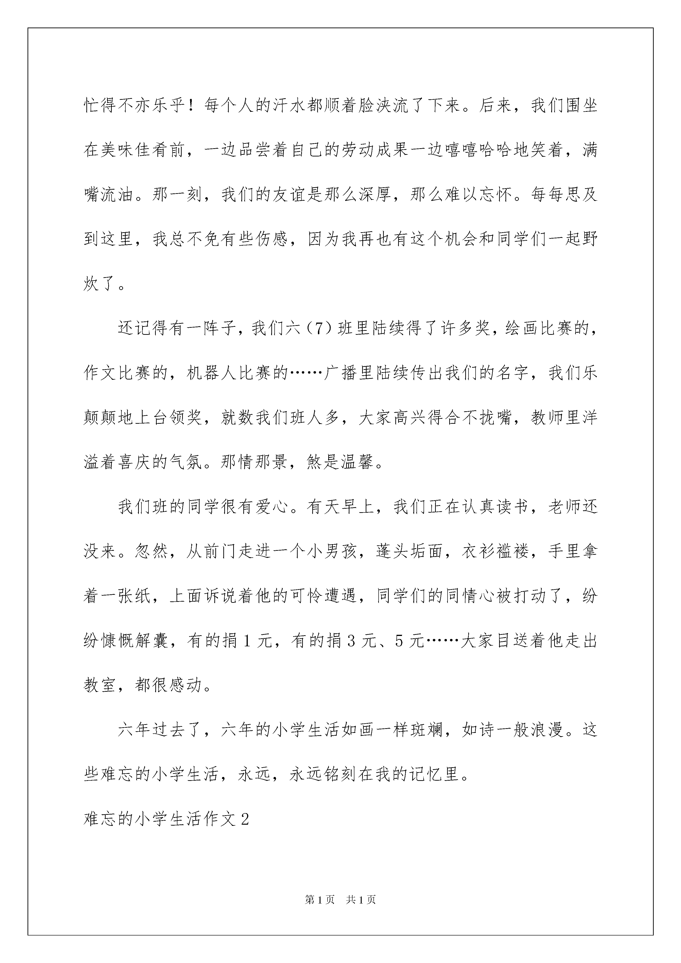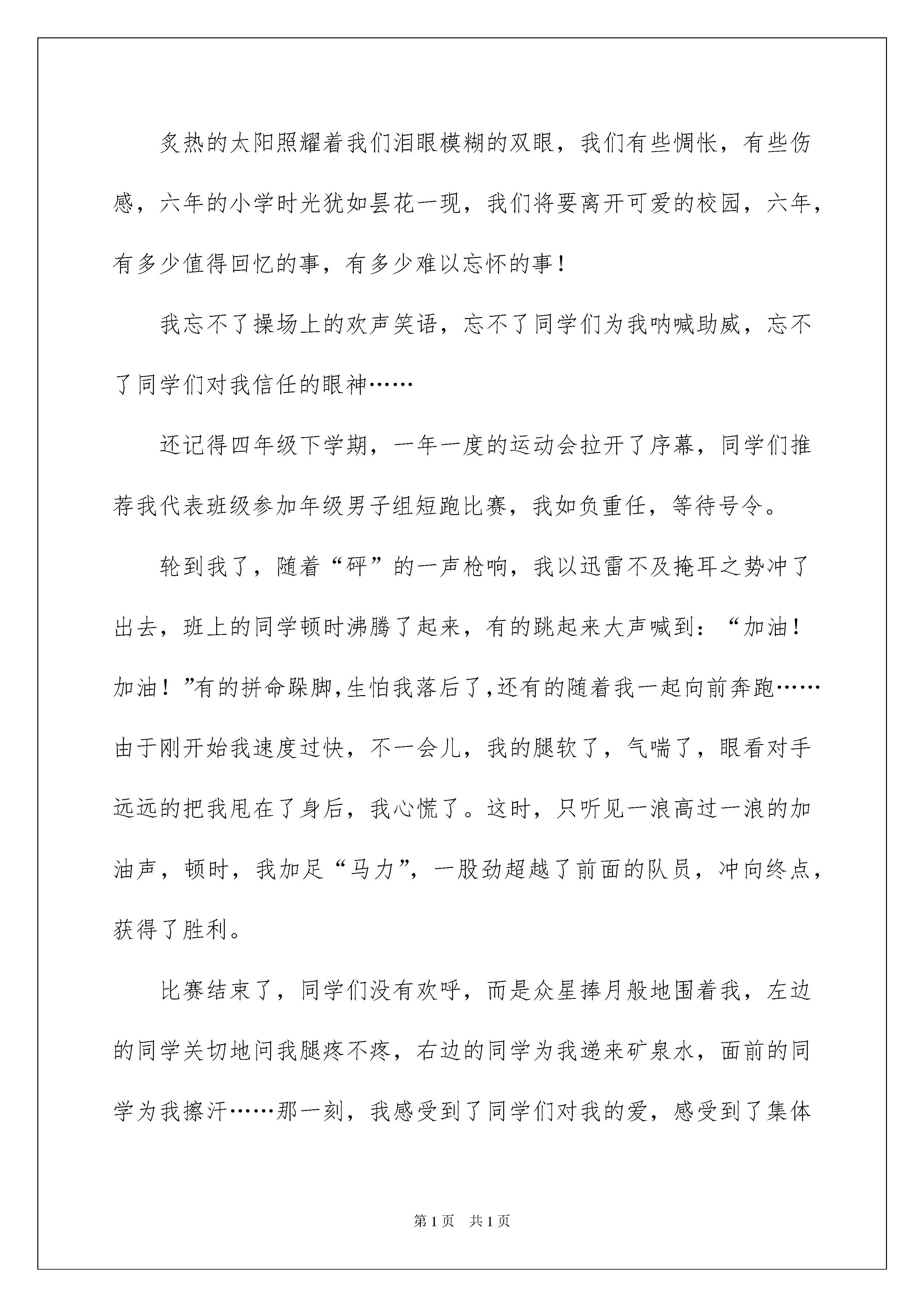 2022难忘的小学生活作文15篇难忘的小学生活作文15篇在日常生活或是工作学习中,许多人都写过作文吧,作文是一种言语活动,具有高度的综合性和创造性。那么你知道一篇好的作文该怎么写吗?以下是我为大家收集的难忘的小学生活作文,希望能够帮助到大家。难忘的小学生活作文1六年的小学生涯转眼即逝。当倒计时赫然醒目地出现在后方黑板上,当同学递给我一本精美的同学录,当我被叫到操场上拍毕业照,当我学到最后一课——《明天,我们毕业》时,我才意识到,噢,我要毕业了。六一不再属于我们,少先队员不再是我们的光荣称号,我们即将成为共青团员,即将由儿童变为少年。但是,到了这个即将离别的时刻,难忘的小学生活的点点滴滴仍是那么记忆犹新……还记得那回我们去野炊。烈日当头,我们背着锅碗瓢盆、柴米油盐等厨具,尽管大汗淋漓,可高兴的心情胜过了苦累。到了目的地,我们一起动手,团结一心,挖灶的挖灶,切菜的切菜,烤肉的烤肉,忙得不亦乐乎!每个人的汗水都顺着脸浃流了下来。后来,我们围坐在美味佳肴前,一边品尝着自己的劳动成果一边嘻嘻哈哈地笑着,满嘴流油。那一刻,我们的友谊是那么深厚,那么难以忘怀。每每思及到这里,我总不免有些伤感,因为我再也有这个机会和同学们一起野炊了。还记得有一阵子,我们六(7)班里陆续得了许多奖,绘画比赛的,作文比赛的,机器人比赛的……广播里陆续传出我们的名字,我们乐颠颠地上台领奖,就数我们班人多,大家高兴得合不拢嘴,教师里洋溢着喜庆的气氛。那情那景,煞是温馨。我们班的同学很有爱心。有天早上,我们正在认真读书,老师还没来。忽然,从前门走进一个小男孩,蓬头垢面,衣衫褴褛,手里拿着一张纸,上面诉说着他的可怜遭遇,同学们的同情心被打动了,纷纷慷慨解囊,有的捐1元,有的捐3元、5元……大家目送着他走出教室,都很感动。六年过去了,六年的小学生活如画一样斑斓,如诗一般浪漫。这些难忘的小学生活,永远,永远铭刻在我的记忆里。难忘的小学生活作文2炙热的太阳照耀着我们泪眼模糊的双眼,我们有些惆怅,有些伤感,六年的小学时光犹如昙花一现,我们将要离开可爱的校园,六年,有多少值得回忆的事,有多少难以忘怀的事!我忘不了操场上的欢声笑语,忘不了同学们为我呐喊助威,忘不了同学们对我信任的眼神……还记得四年级下学期,一年一度的运动会拉开了序幕,同学们推荐我代表班级参加年级男子组短跑比赛,我如负重任,等待号令。轮到我了,随着“砰”的一声枪响,我以迅雷不及掩耳之势冲了出去,班上的同学顿时沸腾了起来,有的跳起来大声喊到:“加油!加油!”有的拼命跺脚,生怕我落后了,还有的随着我一起向前奔跑……由于刚开始我速度过快,不一会儿,我的腿软了,气喘了,眼看对手远远的把我甩在了身后,我心慌了。这时,只听见一浪高过一浪的加油声,顿时,我加足“马力”,一股劲超越了前面的队员,冲向终点,获得了胜利。比赛结束了,同学们没有欢呼,而是众星捧月般地围着我,左边的同学关切地问我腿疼不疼,右边的同学为我递来矿泉水,面前的同学为我擦汗……那一刻,我感受到了同学们对我的爱,感受到了集体的温暖。我忘不了老师对我的敦敦教诲,去年期中考试,我因贪玩导致成绩一落千丈。得知数学成绩,我懊悔不已,但更多的是灰心、沮丧。老师发现我状态不好,把我叫到办公室,摸摸我的后脑勺,意味深长地对我说:“考试没考好只能说明这段时间的知识点你没有掌握牢固,你该分析试卷,把错题揪出来改正,以后上课认真些……”老师说了很多很多,老师的话里有提醒,有鞭策,有鼓励……也是老师那一番语重心长的话,让我端正了学习态度,不断进步着。虽然这些事已经过去了很久,但在我心中却是记忆犹新。六年了,我们将要毕业,我亲爱的同学们,谢谢你们的鼓励,谢谢你们的信任和关爱,谢谢敬爱的老师,谢谢您的敦敦教诲,您的鼓励鞭策。难忘的小学生活作文3六年的小学生活即将落下帷幕,在即将离开母校的日子里,心中的不舍油然而生,一件件往事也在脑海中浮现……前不久,钟老师组织我们开展了一次活动——“科技发展利大还是弊大”辩论会。辩论会在同学们的热烈激动下进行得如火如荼,双方辩友你一言,我一语,争得面红耳赤,谁也不让谁。着兴奋过度的场面让主持人王缤彬喊了好几次安静才控制住局面,最后,时达两节课的辩论会在一片抱怨声中结束了,钟老师在最后为我们的辩论会做了精彩的总结,让我们心服口服。可是,同学们还是觉得意犹未尽呢。我还记得五年级时,我和李雨馨,邬浩超等同学,一起表演了“乌鸦与狐狸”并被选到台门社区去表演。在演出前的日子里,我们几个人每天晚上放学时,我们还要留下来,继续排练一个小时,有时还会把家庭作业拖到8,9点钟才做完,甚至我们连双休日的休息时间都得用来到学校