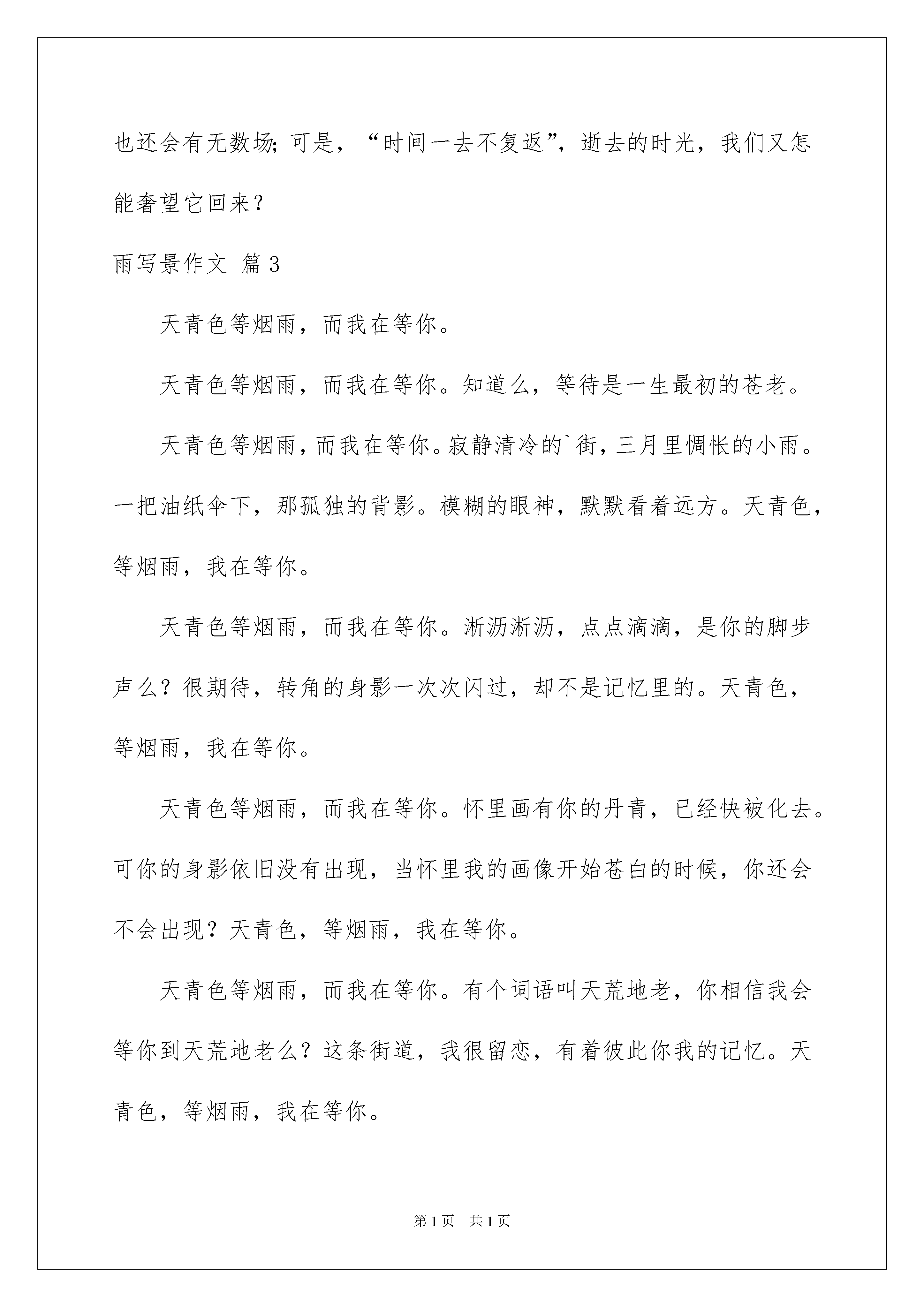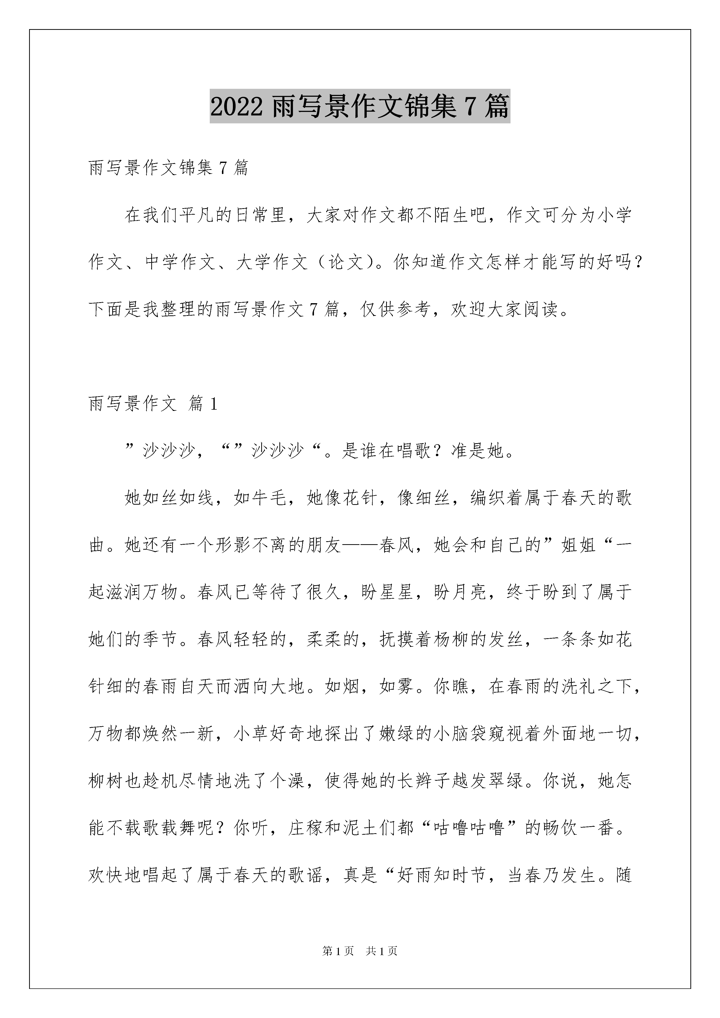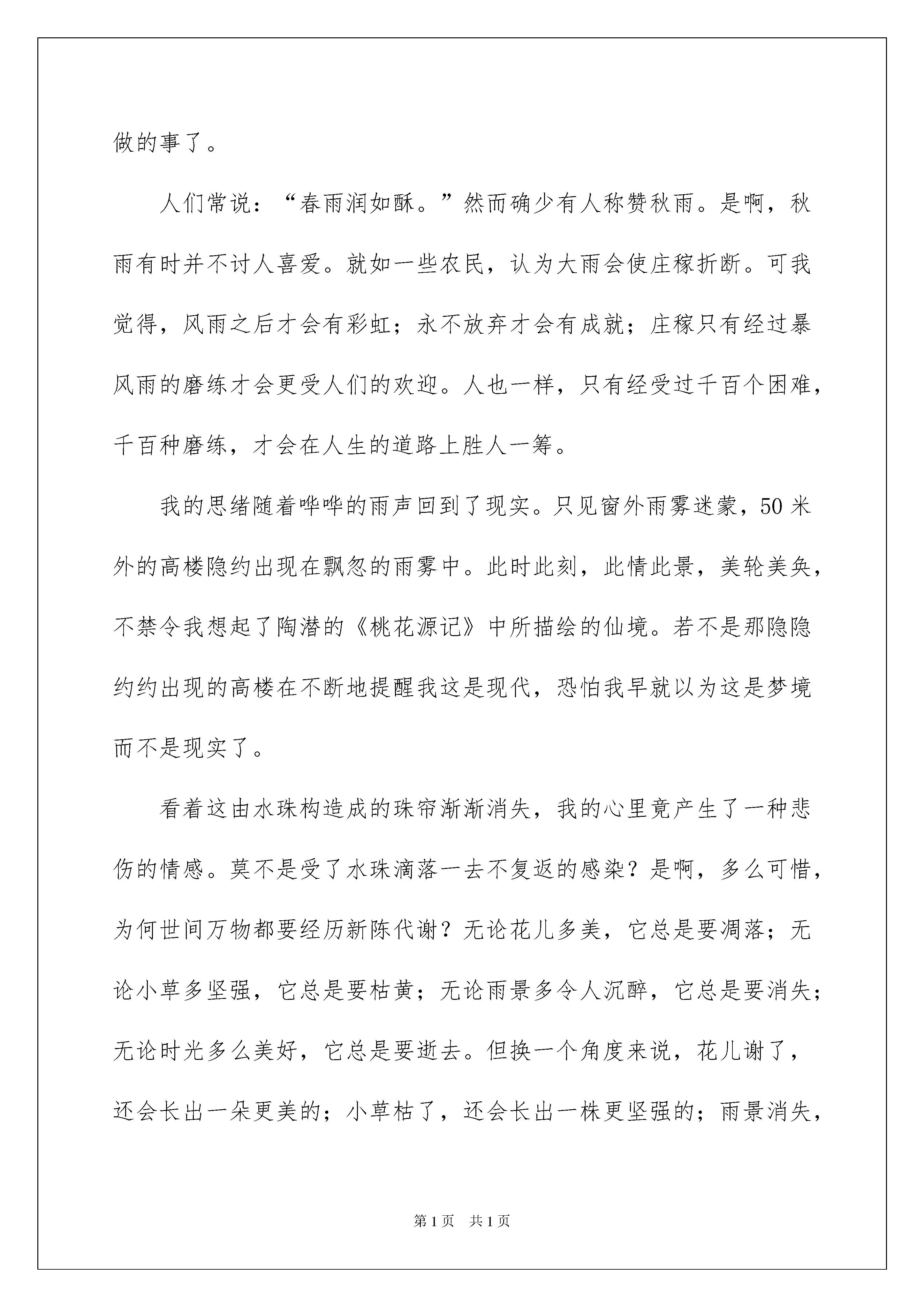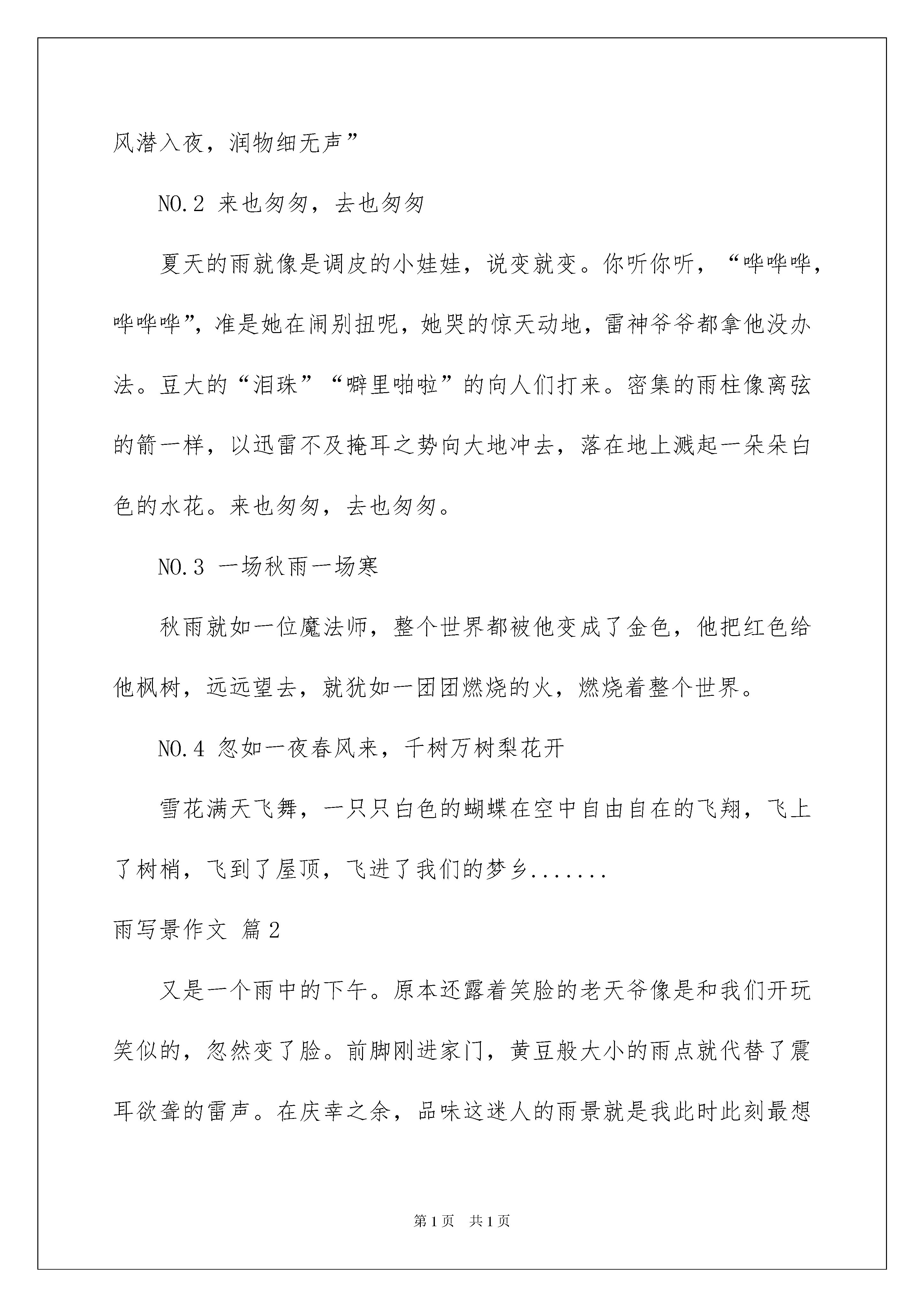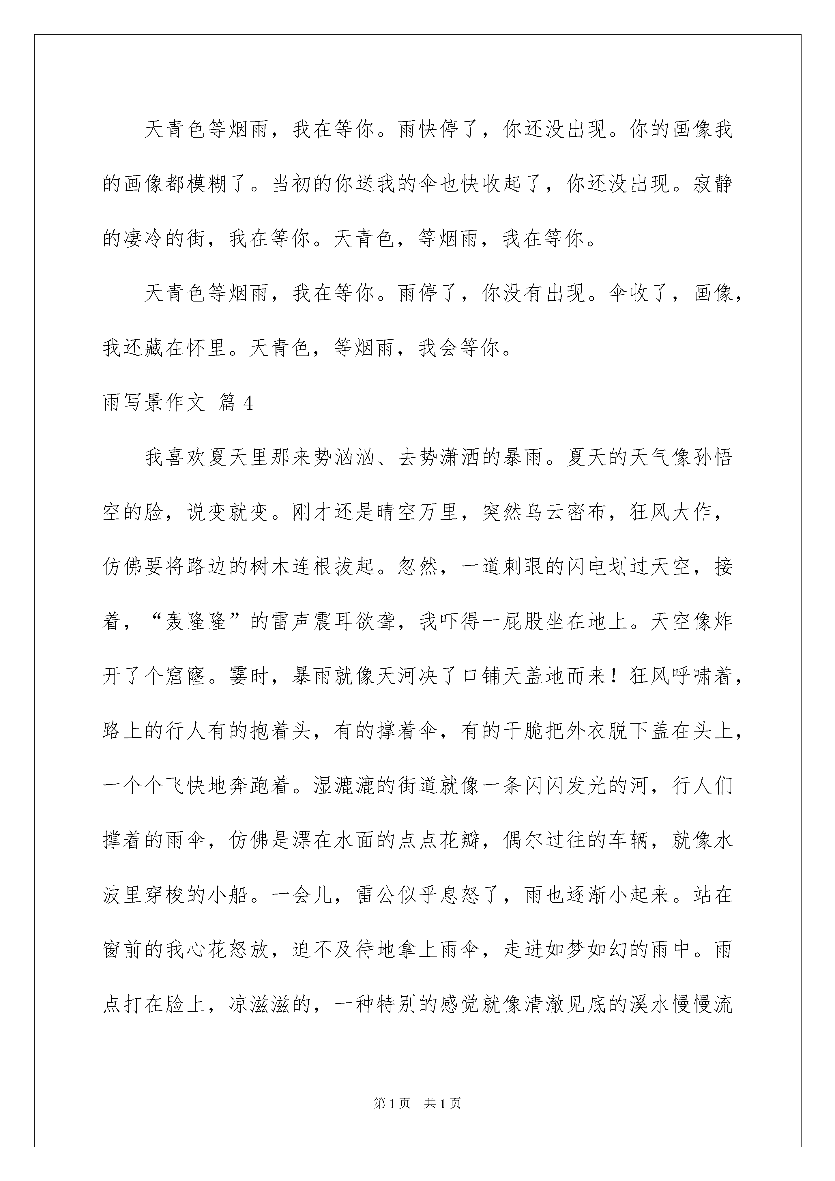 2022雨写景作文锦集7篇雨写景作文锦集7篇在我们平凡的日常里,大家对作文都不陌生吧,作文可分为小学作文、中学作文、大学作文(论文)。你知道作文怎样才能写的好吗?下面是我整理的雨写景作文7篇,仅供参考,欢迎大家阅读。雨写景作文篇1”沙沙沙,“”沙沙沙“。是谁在唱歌?准是她。她如丝如线,如牛毛,她像花针,像细丝,编织着属于春天的歌曲。她还有一个形影不离的朋友——春风,她会和自己的”姐姐“一起滋润万物。春风已等待了很久,盼星星,盼月亮,终于盼到了属于她们的季节。春风轻轻的,柔柔的,抚摸着杨柳的发丝,一条条如花针细的春雨自天而洒向大地。如烟,如雾。你瞧,在春雨的洗礼之下,万物都焕然一新,小草好奇地探出了嫩绿的小脑袋窥视着外面地一切,柳树也趁机尽情地洗了个澡,使得她的长辫子越发翠绿。你说,她怎能不载歌载舞呢?你听,庄稼和泥土们都“咕噜咕噜”的畅饮一番。欢快地唱起了属于春天的歌谣,真是“好雨知时节,当春乃发生。随风潜入夜,润物细无声”NO.2来也匆匆,去也匆匆夏天的雨就像是调皮的小娃娃,说变就变。你听你听,“哗哗哗,哗哗哗”,准是她在闹别扭呢,她哭的惊天动地,雷神爷爷都拿他没办法。豆大的“泪珠”“噼里啪啦”的向人们打来。密集的雨柱像离弦的箭一样,以迅雷不及掩耳之势向大地冲去,落在地上溅起一朵朵白色的水花。来也匆匆,去也匆匆。NO.3一场秋雨一场寒秋雨就如一位魔法师,整个世界都被他变成了金色,他把红色给他枫树,远远望去,就犹如一团团燃烧的火,燃烧着整个世界。NO.4忽如一夜春风来,千树万树梨花开雪花满天飞舞,一只只白色的蝴蝶在空中自由自在的飞翔,飞上了树梢,飞到了屋顶,飞进了我们的梦乡.......雨写景作文篇2又是一个雨中的下午。原本还露着笑脸的老天爷像是和我们开玩笑似的,忽然变了脸。前脚刚进家门,黄豆般大小的雨点就代替了震耳欲聋的雷声。在庆幸之余,品味这迷人的雨景就是我此时此刻最想做的事了。人们常说:“春雨润如酥。”然而确少有人称赞秋雨。是啊,秋雨有时并不讨人喜爱。就如一些农民,认为大雨会使庄稼折断。可我觉得,风雨之后才会有彩虹;永不放弃才会有成就;庄稼只有经过暴风雨的磨练才会更受人们的欢迎。人也一样,只有经受过千百个困难,千百种磨练,才会在人生的道路上胜人一筹。我的思绪随着哗哗的雨声回到了现实。只见窗外雨雾迷蒙,50米外的高楼隐约出现在飘忽的雨雾中。此时此刻,此情此景,美轮美奂,不禁令我想起了陶潜的《桃花源记》中所描绘的仙境。若不是那隐隐约约出现的高楼在不断地提醒我这是现代,恐怕我早就以为这是梦境而不是现实了。看着这由水珠构造成的珠帘渐渐消失,我的心里竟产生了一种悲伤的情感。莫不是受了水珠滴落一去不复返的感染?是啊,多么可惜,为何世间万物都要经历新陈代谢?无论花儿多美,它总是要凋落;无论小草多坚强,它总是要枯黄;无论雨景多令人沉醉,它总是要消失;无论时光多么美好,它总是要逝去。但换一个角度来说,花儿谢了,还会长出一朵更美的;小草枯了,还会长出一株更坚强的;雨景消失,也还会有无数场;可是,“时间一去不复返”,逝去的时光,我们又怎能奢望它回来?雨写景作文篇3天青色等烟雨,而我在等你。天青色等烟雨,而我在等你。知道么,等待是一生最初的苍老。天青色等烟雨,而我在等你。寂静清冷的`街,三月里惆怅的小雨。一把油纸伞下,那孤独的背影。模糊的眼神,默默看着远方。天青色,等烟雨,我在等你。天青色等烟雨,而我在等你。淅沥淅沥,点点滴滴,是你的脚步声么?很期待,转角的身影一次次闪过,却不是记忆里的。天青色,等烟雨,我在等你。天青色等烟雨,而我在等你。怀里画有你的丹青,已经快被化去。可你的身影依旧没有出现,当怀里我的画像开始苍白的时候,你还会不会出现?天青色,等烟雨,我在等你。天青色等烟雨,而我在等你。有个词语叫天荒地老,你相信我会等你到天荒地老么?这条街道,我很留恋,有着彼此你我的记忆。天青色,等烟雨,我在等你。天青色等烟雨,我在等你。雨快停了,你还没出现。你的画像我的画像都模糊了。当初的你送我的伞也快收起了,你还没出现。寂静的凄冷的街,我在等你。天青色,等烟雨,我在等你。天青色等烟雨,我在等你。雨停了,你没有出现。伞收了,画像,我还藏在怀里。天青色,等烟雨,我会等你。雨写景作文篇4我喜欢夏天里那来势汹汹、去势潇洒的暴雨。夏天的天气像孙悟空的脸,说变就变。刚才还是晴空万里,突然乌云密布,狂风大作,仿佛要将路边的树木连根拔起。忽然,一道刺眼的闪电划过天空,接着,“轰隆隆”的雷声震耳欲聋,我吓得一屁股坐在地上。天空像炸开了个窟窿。霎时,暴雨就像天河决了口铺天盖地而来!狂风呼啸着,路上的行人有的抱着头,有