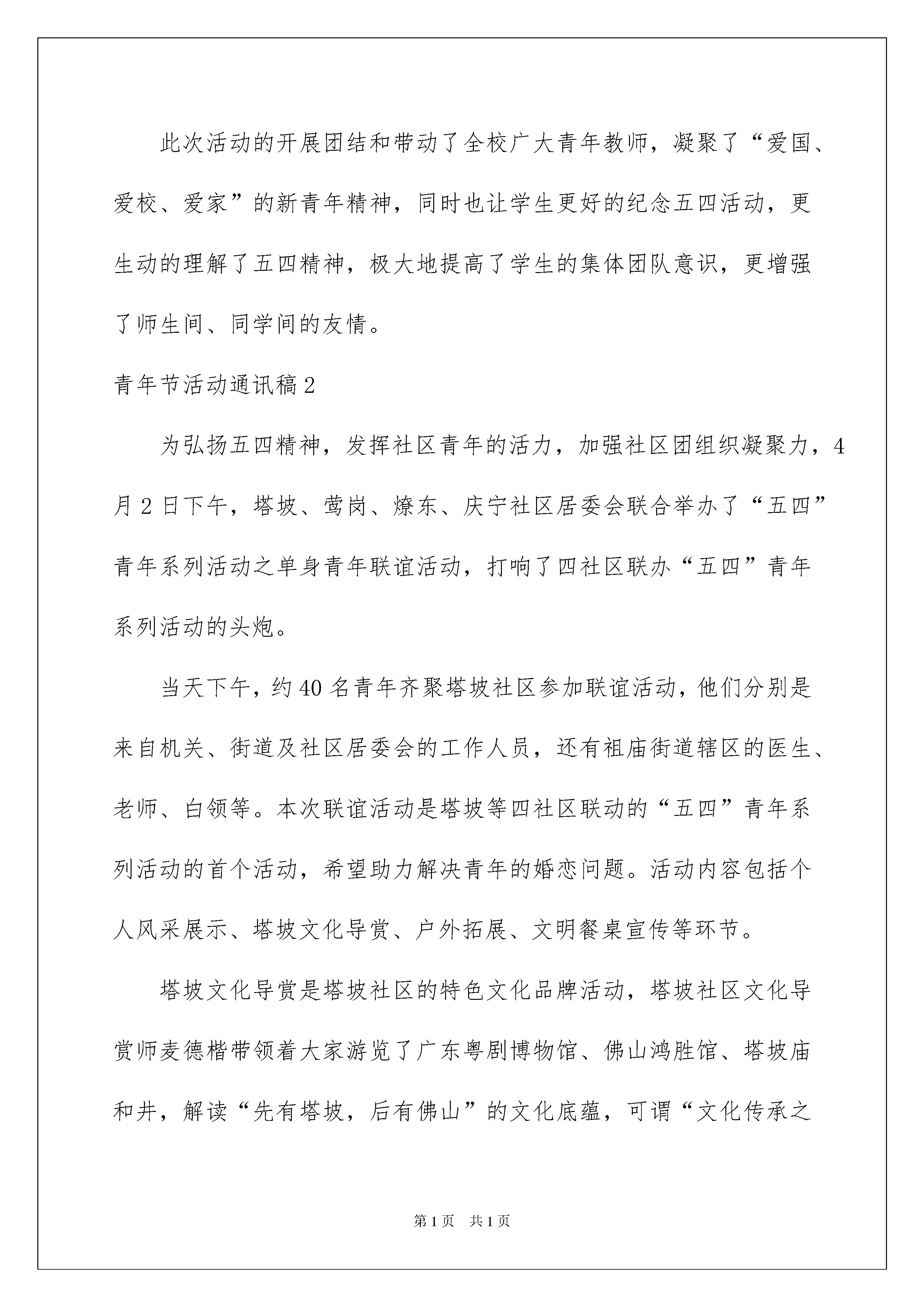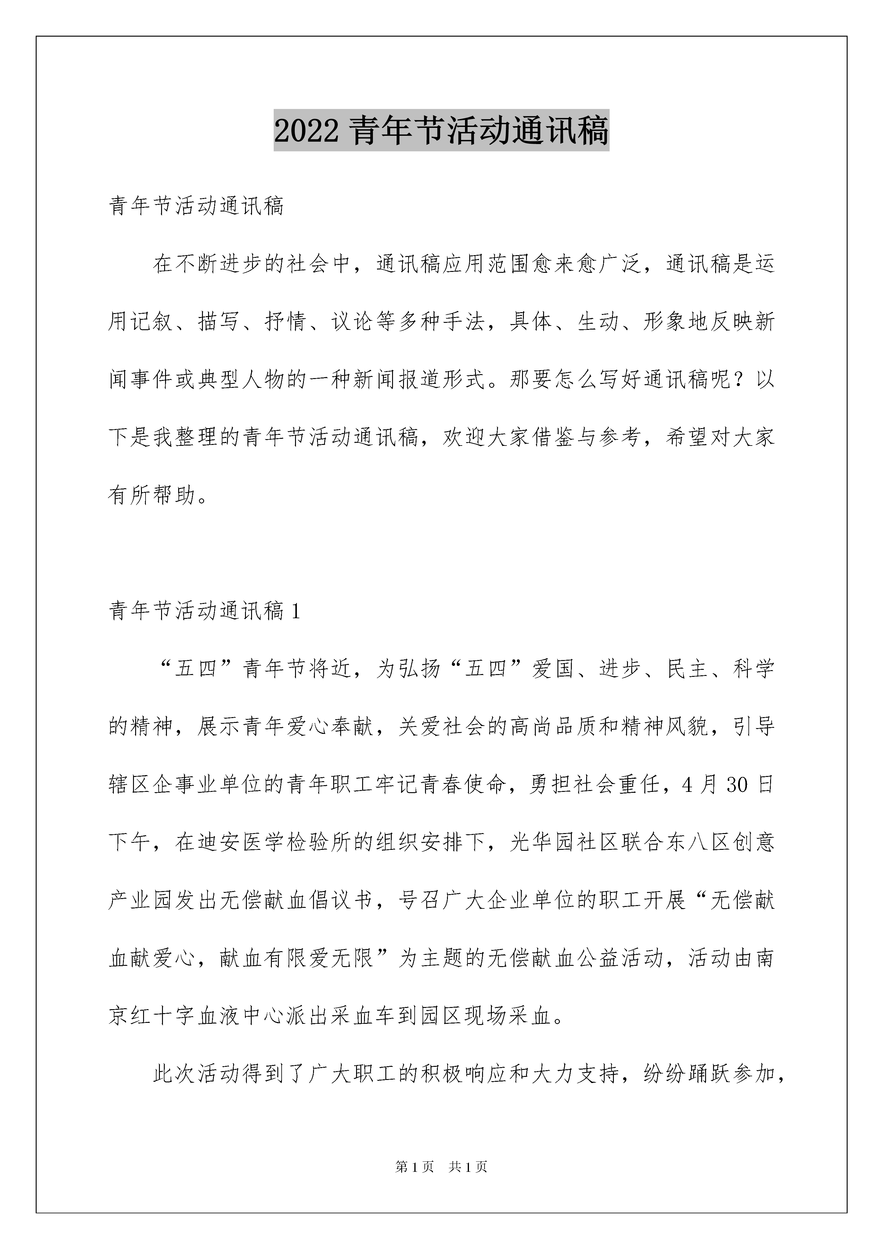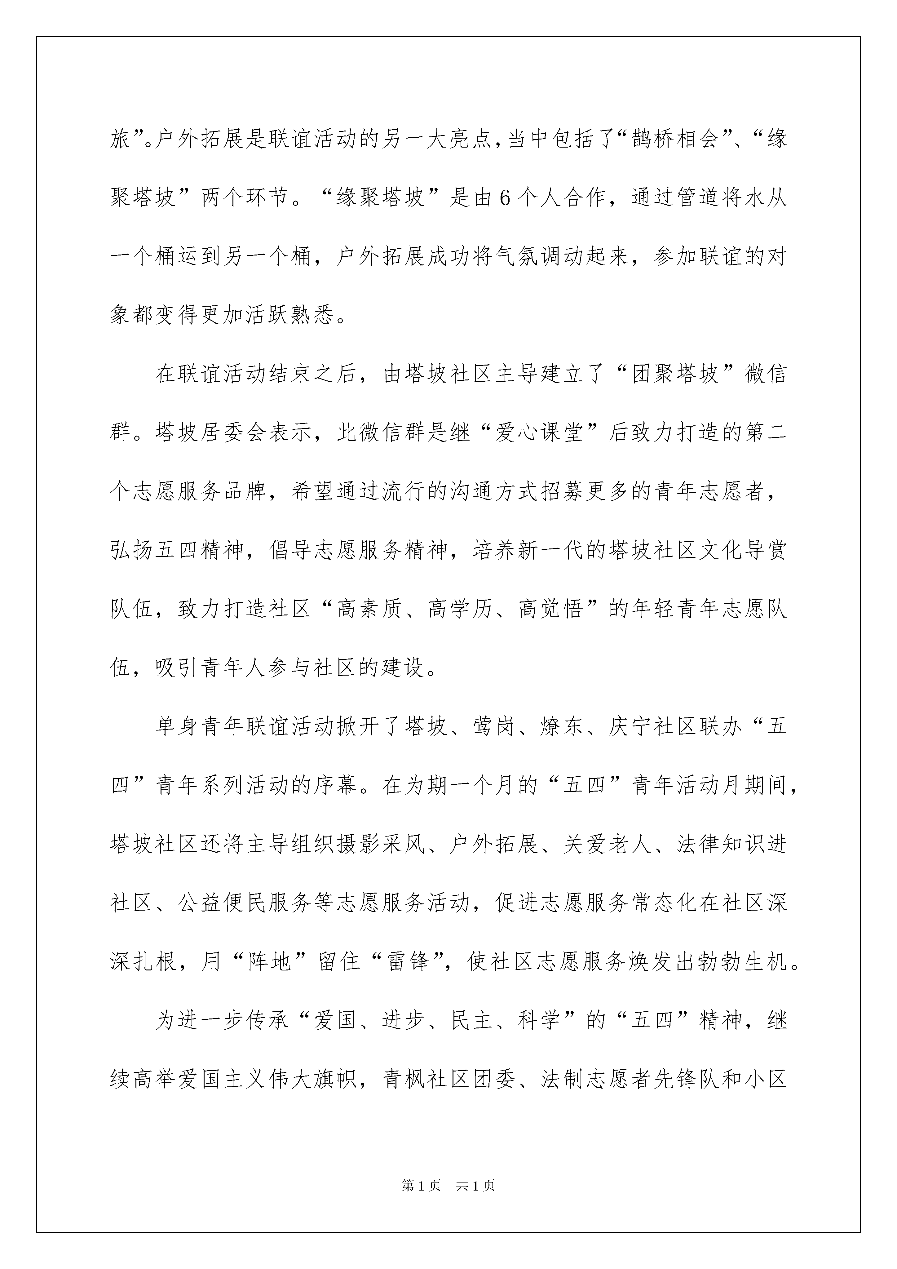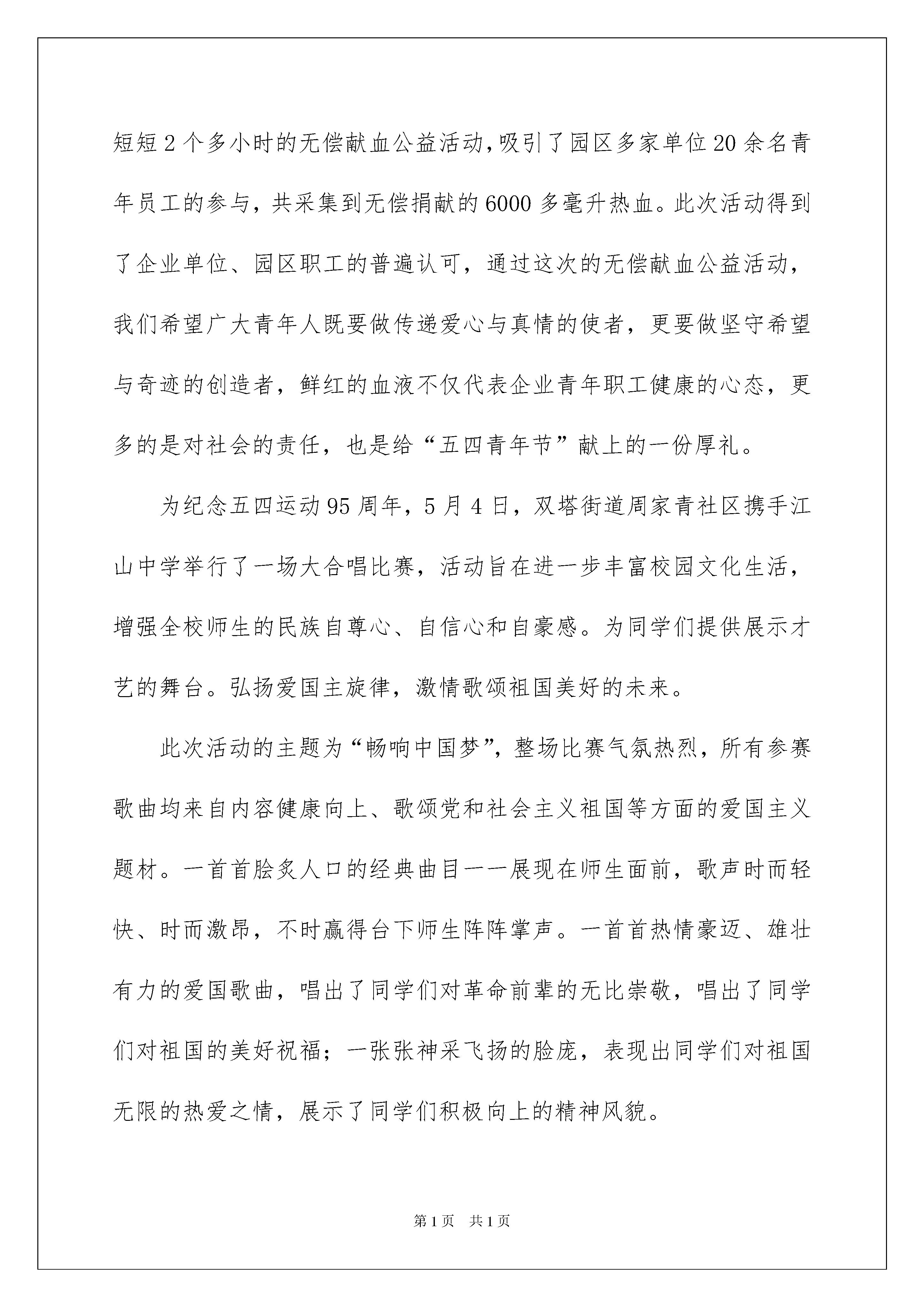 2022青年节活动通讯稿青年节活动通讯稿在不断进步的社会中,通讯稿应用范围愈来愈广泛,通讯稿是运用记叙、描写、抒情、议论等多种手法,具体、生动、形象地反映新闻事件或典型人物的一种新闻报道形式。那要怎么写好通讯稿呢?以下是我整理的青年节活动通讯稿,欢迎大家借鉴与参考,希望对大家有所帮助。青年节活动通讯稿1“五四”青年节将近,为弘扬“五四”爱国、进步、民主、科学的精神,展示青年爱心奉献,关爱社会的高尚品质和精神风貌,引导辖区企事业单位的青年职工牢记青春使命,勇担社会重任,4月30日下午,在迪安医学检验所的组织安排下,光华园社区联合东八区创意产业园发出无偿献血倡议书,号召广大企业单位的职工开展“无偿献血献爱心,献血有限爱无限”为主题的无偿献血公益活动,活动由南京红十字血液中心派出采血车到园区现场采血。此次活动得到了广大职工的积极响应和大力支持,纷纷踊跃参加,短短2个多小时的无偿献血公益活动,吸引了园区多家单位20余名青年员工的参与,共采集到无偿捐献的6000多毫升热血。此次活动得到了企业单位、园区职工的普遍认可,通过这次的无偿献血公益活动,我们希望广大青年人既要做传递爱心与真情的使者,更要做坚守希望与奇迹的创造者,鲜红的血液不仅代表企业青年职工健康的心态,更多的是对社会的责任,也是给“五四青年节”献上的一份厚礼。为纪念五四运动95周年,5月4日,双塔街道周家青社区携手江山中学举行了一场大合唱比赛,活动旨在进一步丰富校园文化生活,增强全校师生的民族自尊心、自信心和自豪感。为同学们提供展示才艺的舞台。弘扬爱国主旋律,激情歌颂祖国美好的未来。此次活动的主题为“畅响中国梦”,整场比赛气氛热烈,所有参赛歌曲均来自内容健康向上、歌颂党和社会主义祖国等方面的爱国主义题材。一首首脍炙人口的经典曲目一一展现在师生面前,歌声时而轻快、时而激昂,不时赢得台下师生阵阵掌声。一首首热情豪迈、雄壮有力的爱国歌曲,唱出了同学们对革命前辈的无比崇敬,唱出了同学们对祖国的美好祝福;一张张神采飞扬的脸庞,表现出同学们对祖国无限的热爱之情,展示了同学们积极向上的精神风貌。此次活动的开展团结和带动了全校广大青年教师,凝聚了“爱国、爱校、爱家”的新青年精神,同时也让学生更好的纪念五四活动,更生动的理解了五四精神,极大地提高了学生的集体团队意识,更增强了师生间、同学间的友情。青年节活动通讯稿2为弘扬五四精神,发挥社区青年的活力,加强社区团组织凝聚力,4月2日下午,塔坡、莺岗、燎东、庆宁社区居委会联合举办了“五四”青年系列活动之单身青年联谊活动,打响了四社区联办“五四”青年系列活动的头炮。当天下午,约40名青年齐聚塔坡社区参加联谊活动,他们分别是来自机关、街道及社区居委会的工作人员,还有祖庙街道辖区的医生、老师、白领等。本次联谊活动是塔坡等四社区联动的“五四”青年系列活动的首个活动,希望助力解决青年的婚恋问题。活动内容包括个人风采展示、塔坡文化导赏、户外拓展、文明餐桌宣传等环节。塔坡文化导赏是塔坡社区的特色文化品牌活动,塔坡社区文化导赏师麦德楷带领着大家游览了广东粤剧博物馆、佛山鸿胜馆、塔坡庙和井,解读“先有塔坡,后有佛山”的文化底蕴,可谓“文化传承之旅”。户外拓展是联谊活动的另一大亮点,当中包括了“鹊桥相会”、“缘聚塔坡”两个环节。“缘聚塔坡”是由6个人合作,通过管道将水从一个桶运到另一个桶,户外拓展成功将气氛调动起来,参加联谊的对象都变得更加活跃熟悉。在联谊活动结束之后,由塔坡社区主导建立了“团聚塔坡”微信群。塔坡居委会表示,此微信群是继“爱心课堂”后致力打造的第二个志愿服务品牌,希望通过流行的沟通方式招募更多的青年志愿者,弘扬五四精神,倡导志愿服务精神,培养新一代的塔坡社区文化导赏队伍,致力打造社区“高素质、高学历、高觉悟”的年轻青年志愿队伍,吸引青年人参与社区的建设。单身青年联谊活动掀开了塔坡、莺岗、燎东、庆宁社区联办“五四”青年系列活动的序幕。在为期一个月的“五四”青年活动月期间,塔坡社区还将主导组织摄影采风、户外拓展、关爱老人、法律知识进社区、公益便民服务等志愿服务活动,促进志愿服务常态化在社区深深扎根,用“阵地”留住“雷锋”,使社区志愿服务焕发出勃勃生机。为进一步传承“爱国、进步、民主、科学”的“五四”精神,继续高举爱国主义伟大旗帜,青枫社区团委、法制志愿者先锋队和小区物业在辖区范围内开展“五四燃烧青春”志愿服务活动。社区组织团员青年志愿者二十余人,对小区及周边的街道和花圃进行了地毯式打扫,清理辖区内卫生死角、清除不文明张贴,同时向过往的行人及居民发放环保宣传材料。经过志愿者相互配合和不懈努力,社区内的卫生死
