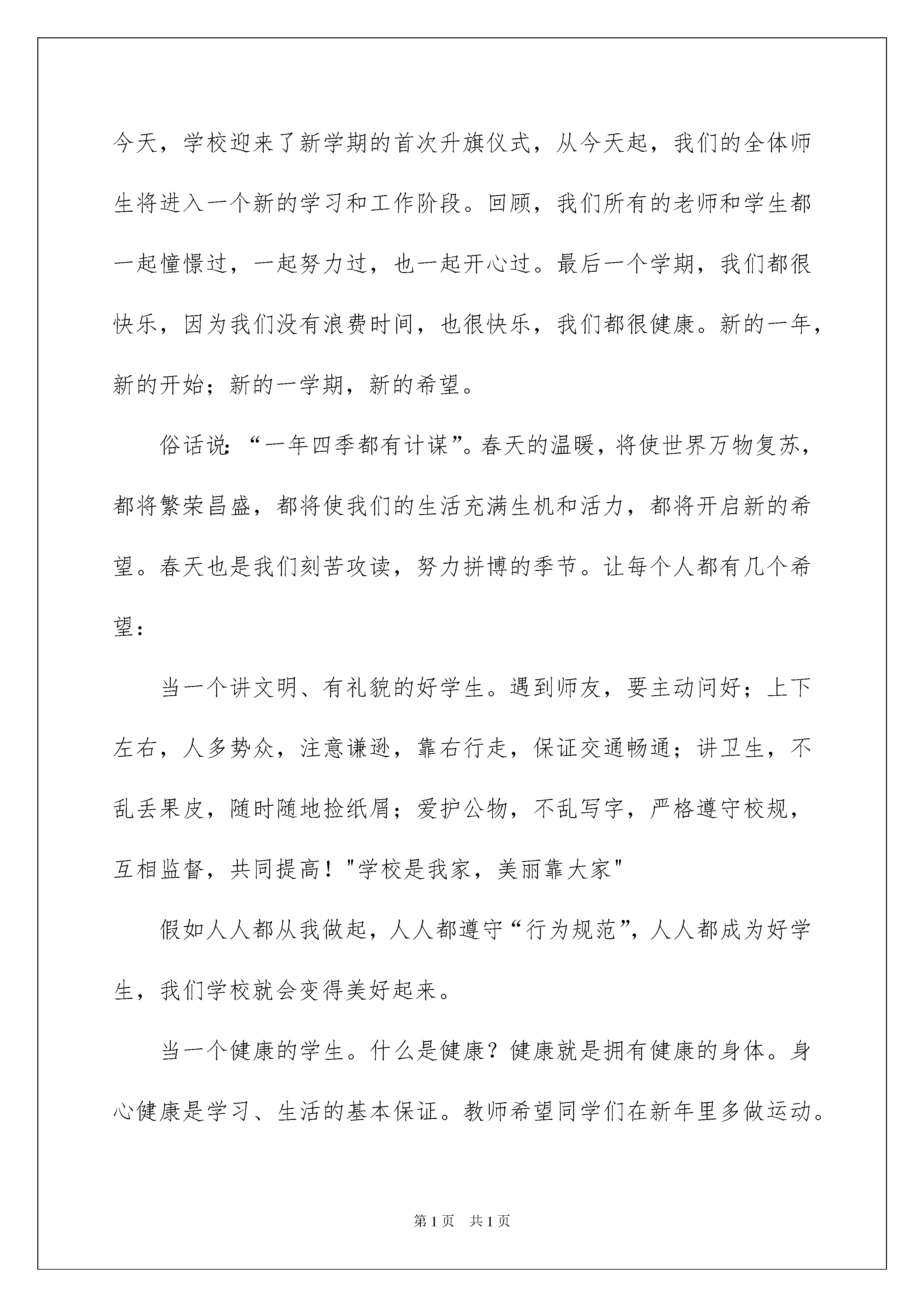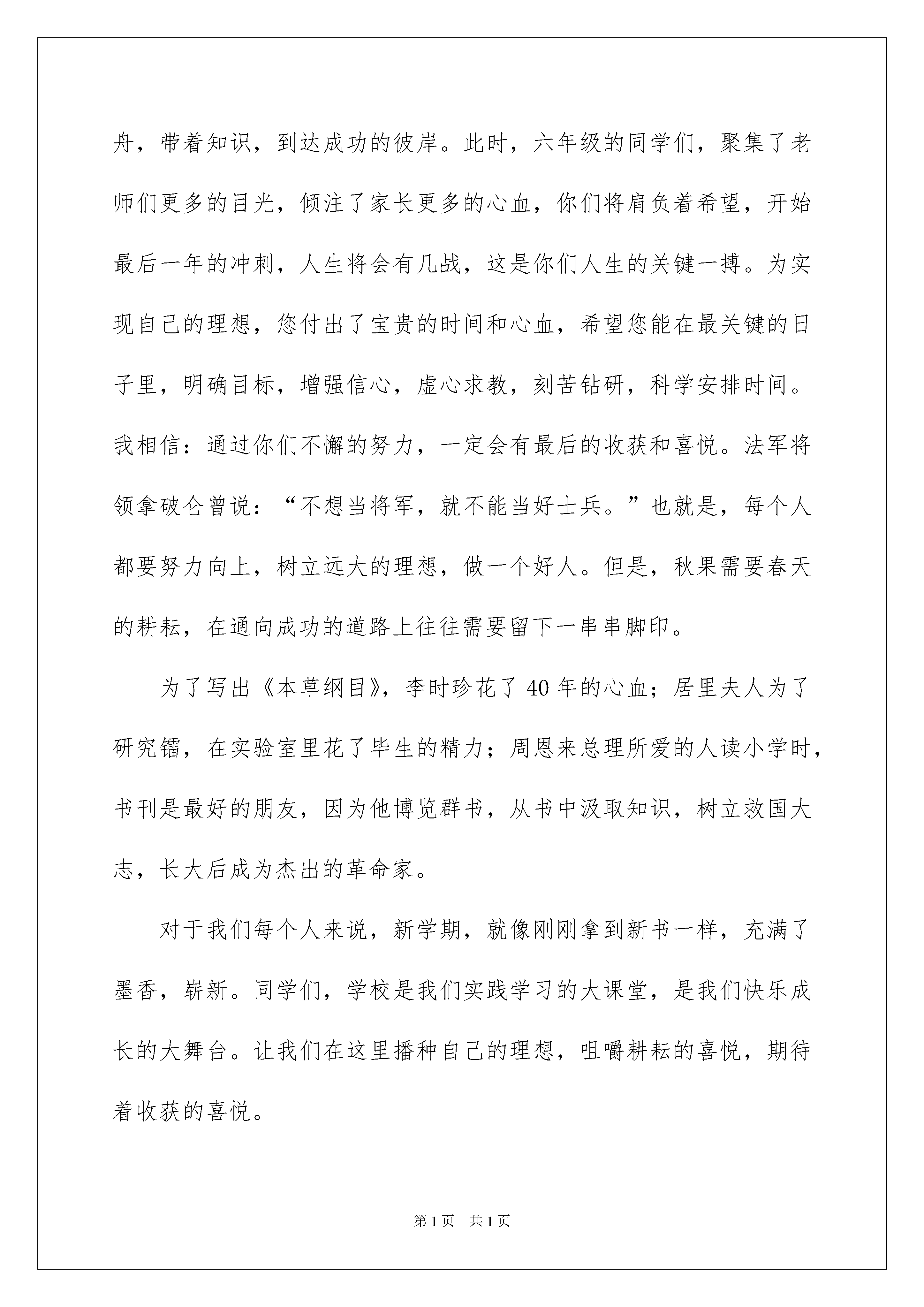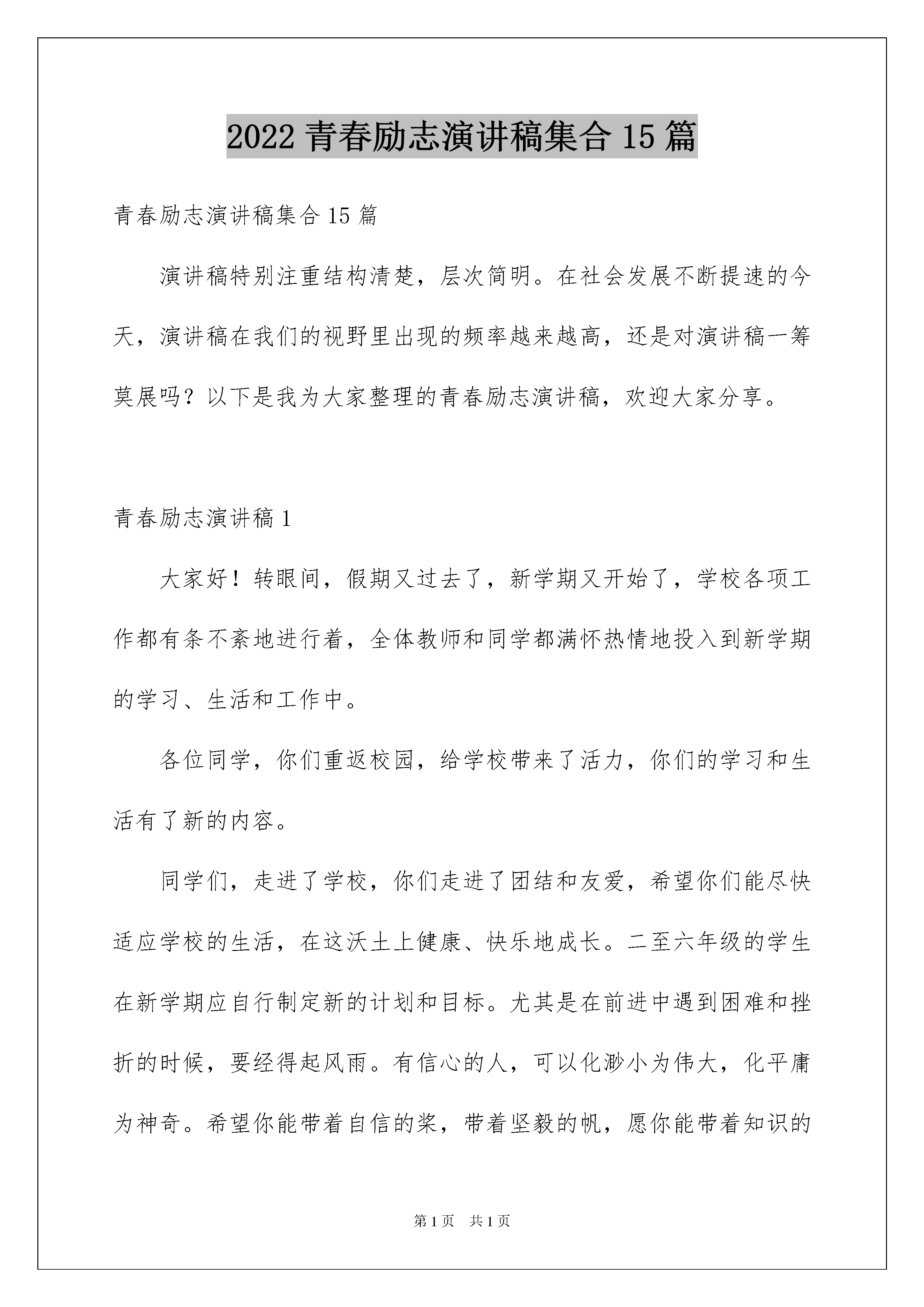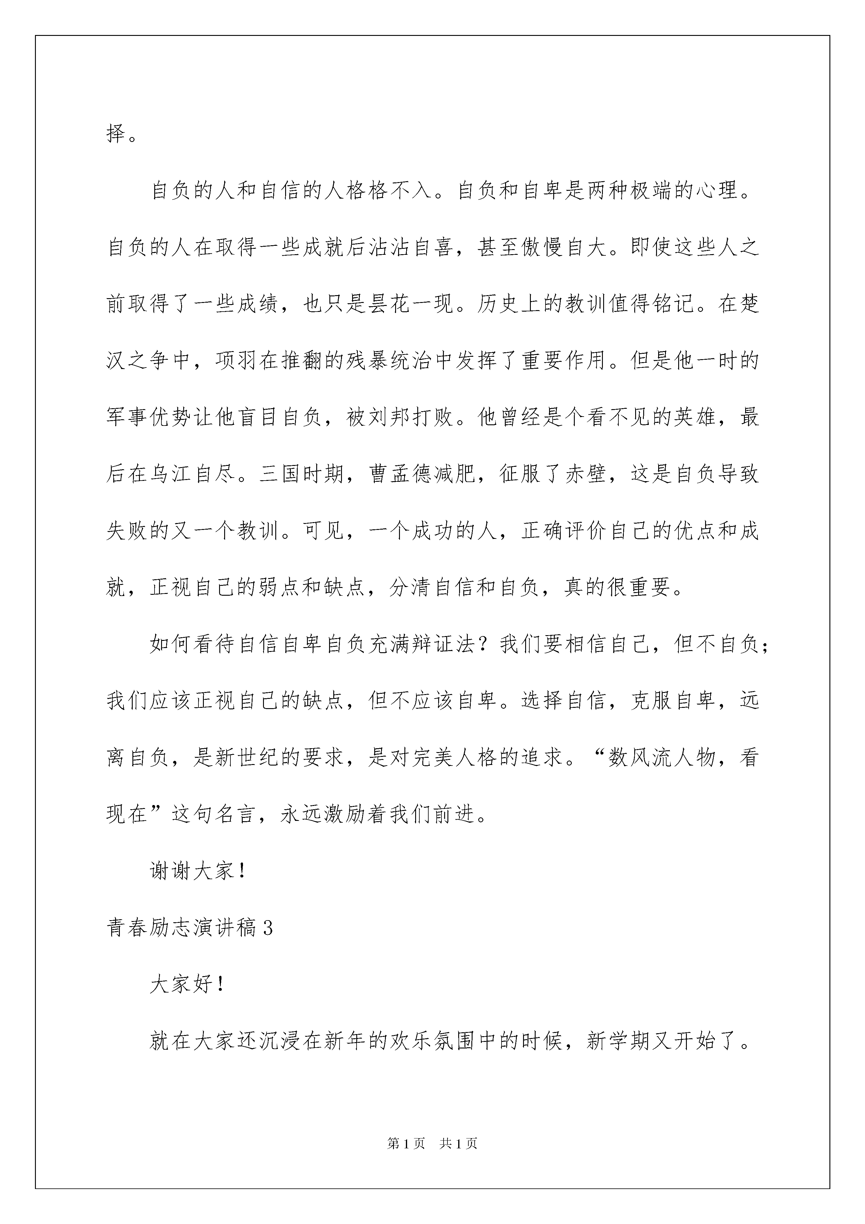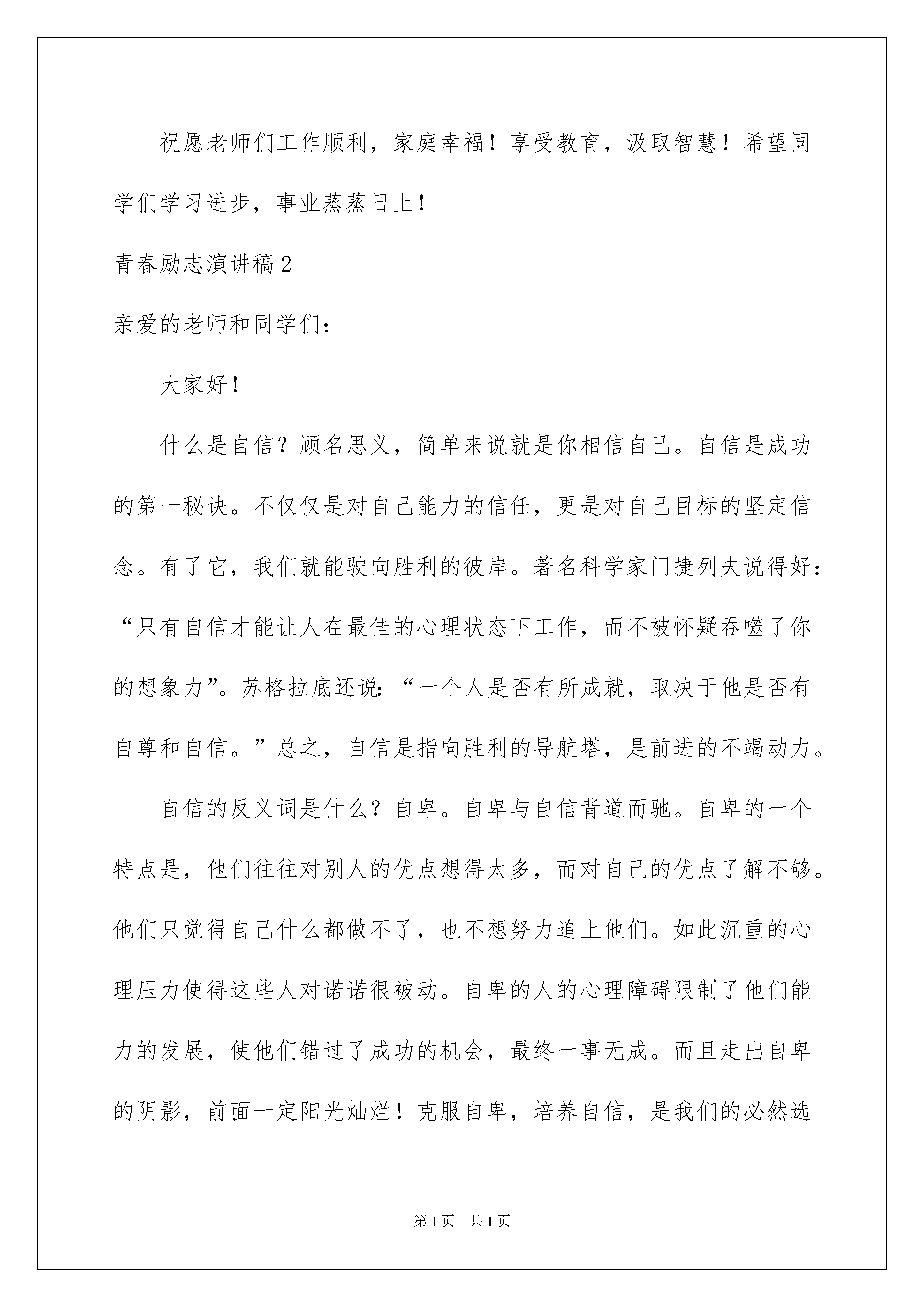 2022青春励志演讲稿集合15篇青春励志演讲稿集合15篇演讲稿特别注重结构清楚,层次简明。在社会发展不断提速的今天,演讲稿在我们的视野里出现的频率越来越高,还是对演讲稿一筹莫展吗?以下是我为大家整理的青春励志演讲稿,欢迎大家分享。青春励志演讲稿1大家好!转眼间,假期又过去了,新学期又开始了,学校各项工作都有条不紊地进行着,全体教师和同学都满怀热情地投入到新学期的学习、生活和工作中。各位同学,你们重返校园,给学校带来了活力,你们的学习和生活有了新的内容。同学们,走进了学校,你们走进了团结和友爱,希望你们能尽快适应学校的生活,在这沃土上健康、快乐地成长。二至六年级的学生在新学期应自行制定新的计划和目标。尤其是在前进中遇到困难和挫折的时候,要经得起风雨。有信心的人,可以化渺小为伟大,化平庸为神奇。希望你能带着自信的桨,带着坚毅的帆,愿你能带着知识的舟,带着知识,到达成功的彼岸。此时,六年级的同学们,聚集了老师们更多的目光,倾注了家长更多的心血,你们将肩负着希望,开始最后一年的冲刺,人生将会有几战,这是你们人生的关键一搏。为实现自己的理想,您付出了宝贵的时间和心血,希望您能在最关键的日子里,明确目标,增强信心,虚心求教,刻苦钻研,科学安排时间。我相信:通过你们不懈的努力,一定会有最后的收获和喜悦。法军将领拿破仑曾说:“不想当将军,就不能当好士兵。”也就是,每个人都要努力向上,树立远大的理想,做一个好人。但是,秋果需要春天的耕耘,在通向成功的道路上往往需要留下一串串脚印。为了写出《本草纲目》,李时珍花了40年的心血;居里夫人为了研究镭,在实验室里花了毕生的精力;周恩来总理所爱的人读小学时,书刊是最好的朋友,因为他博览群书,从书中汲取知识,树立救国大志,长大后成为杰出的革命家。对于我们每个人来说,新学期,就像刚刚拿到新书一样,充满了墨香,崭新。同学们,学校是我们实践学习的大课堂,是我们快乐成长的大舞台。让我们在这里播种自己的理想,咀嚼耕耘的喜悦,期待着收获的喜悦。祝愿老师们工作顺利,家庭幸福!享受教育,汲取智慧!希望同学们学习进步,事业蒸蒸日上!青春励志演讲稿2亲爱的老师和同学们:大家好!什么是自信?顾名思义,简单来说就是你相信自己。自信是成功的第一秘诀。不仅仅是对自己能力的信任,更是对自己目标的坚定信念。有了它,我们就能驶向胜利的彼岸。著名科学家门捷列夫说得好:“只有自信才能让人在最佳的心理状态下工作,而不被怀疑吞噬了你的想象力”。苏格拉底还说:“一个人是否有所成就,取决于他是否有自尊和自信。”总之,自信是指向胜利的导航塔,是前进的不竭动力。自信的反义词是什么?自卑。自卑与自信背道而驰。自卑的一个特点是,他们往往对别人的优点想得太多,而对自己的优点了解不够。他们只觉得自己什么都做不了,也不想努力追上他们。如此沉重的心理压力使得这些人对诺诺很被动。自卑的人的心理障碍限制了他们能力的发展,使他们错过了成功的机会,最终一事无成。而且走出自卑的阴影,前面一定阳光灿烂!克服自卑,培养自信,是我们的必然选择。自负的人和自信的人格格不入。自负和自卑是两种极端的心理。自负的人在取得一些成就后沾沾自喜,甚至傲慢自大。即使这些人之前取得了一些成绩,也只是昙花一现。历史上的教训值得铭记。在楚汉之争中,项羽在推翻的残暴统治中发挥了重要作用。但是他一时的军事优势让他盲目自负,被刘邦打败。他曾经是个看不见的英雄,最后在乌江自尽。三国时期,曹孟德减肥,征服了赤壁,这是自负导致失败的又一个教训。可见,一个成功的人,正确评价自己的优点和成就,正视自己的弱点和缺点,分清自信和自负,真的很重要。如何看待自信自卑自负充满辩证法?我们要相信自己,但不自负;我们应该正视自己的缺点,但不应该自卑。选择自信,克服自卑,远离自负,是新世纪的要求,是对完美人格的追求。“数风流人物,看现在”这句名言,永远激励着我们前进。谢谢大家!青春励志演讲稿3大家好!就在大家还沉浸在新年的欢乐氛围中的时候,新学期又开始了。今天,学校迎来了新学期的首次升旗仪式,从今天起,我们的全体师生将进入一个新的学习和工作阶段。回顾,我们所有的老师和学生都一起憧憬过,一起努力过,也一起开心过。最后一个学期,我们都很快乐,因为我们没有浪费时间,也很快乐,我们都很健康。新的一年,新的开始;新的一学期,新的希望。俗话说:“一年四季都有计谋”。春天的温暖,将使世界万物复苏,都将繁荣昌盛,都将使我们的生活充满生机和活力,都将开启新的希望。春天也是我们刻苦攻读,努力拼博的季节。让每个人都有几个希望:当一个讲文明、有礼貌的好学生。遇到师友,要主动问好;上下左右,人多势众,注意谦