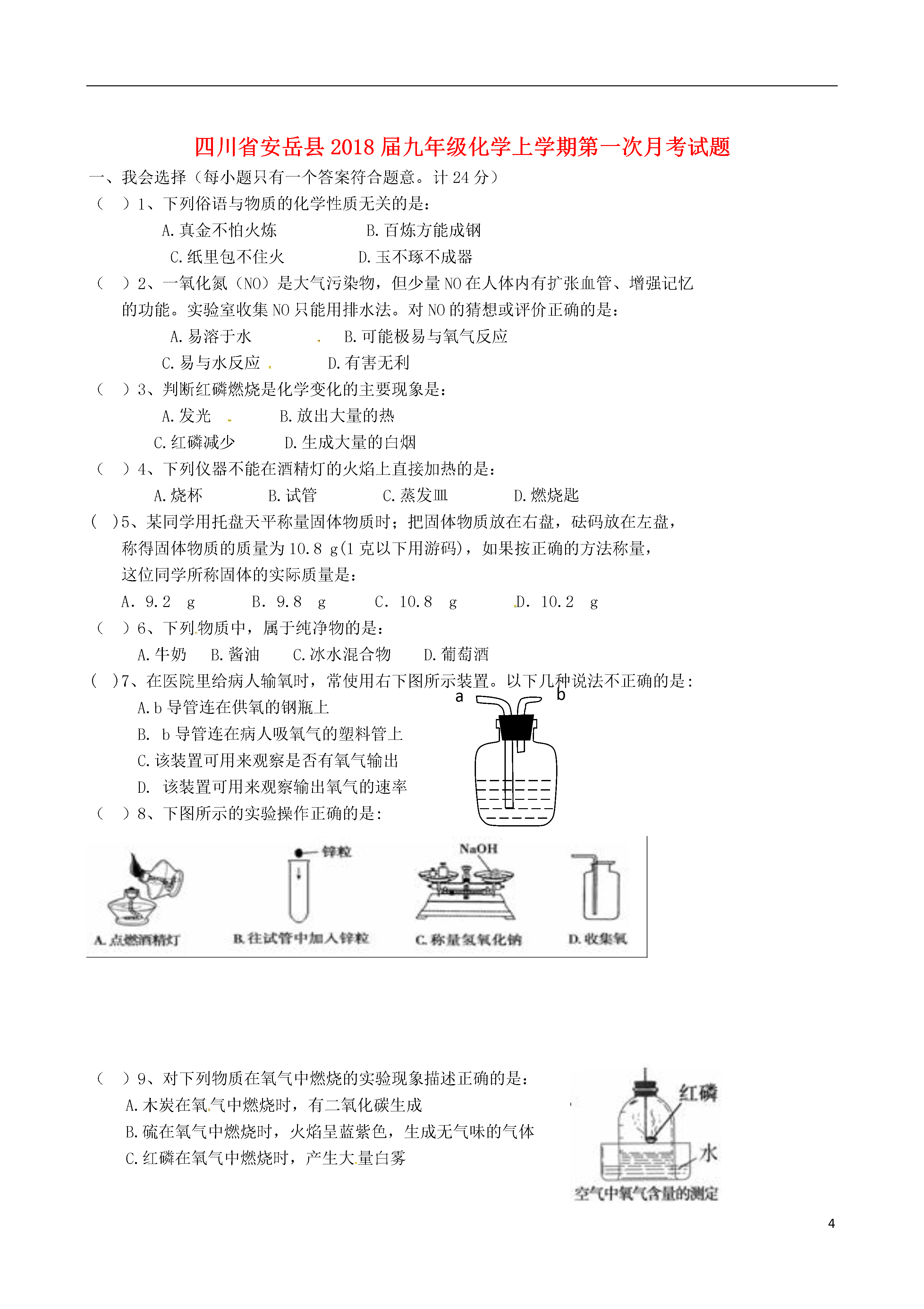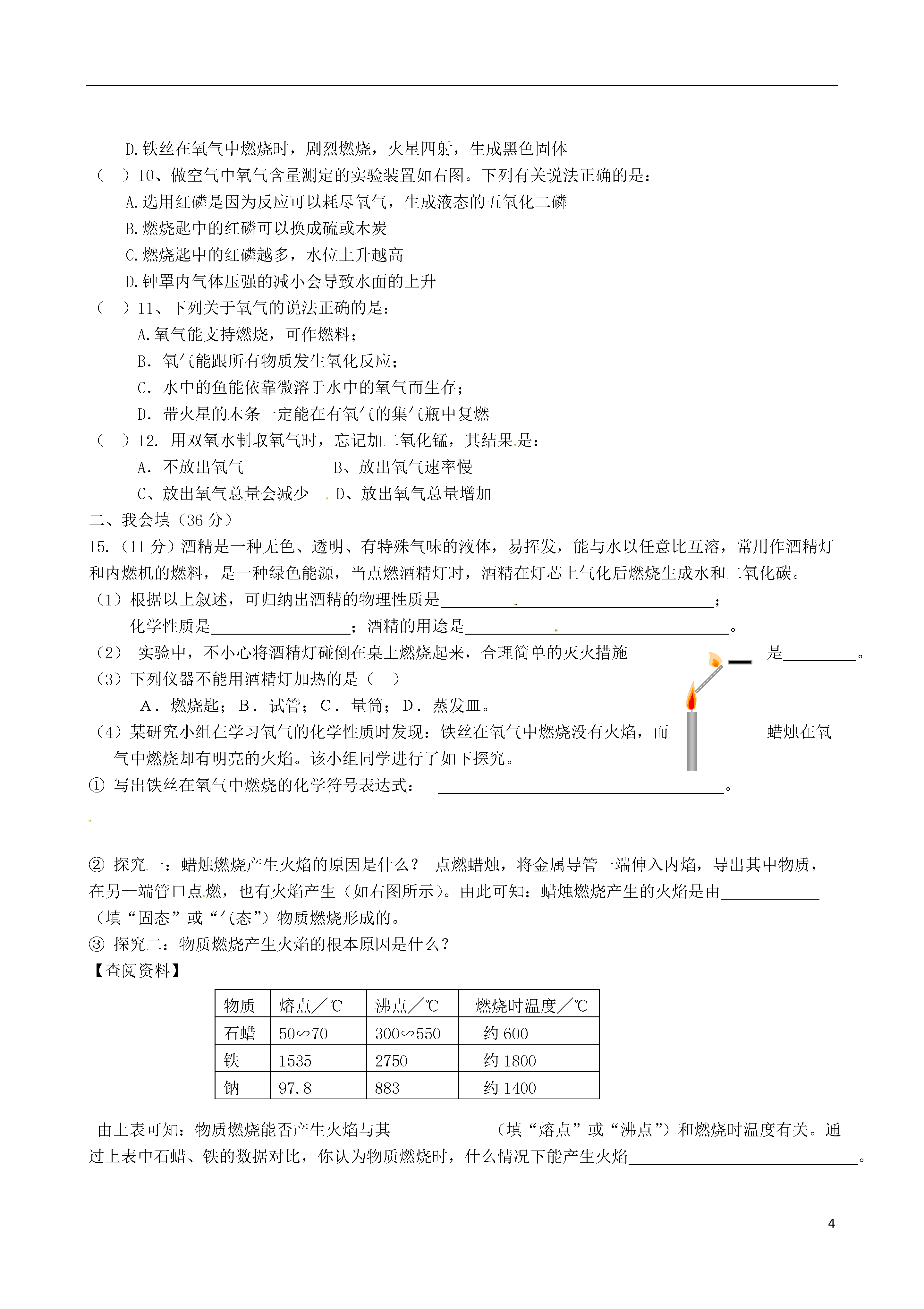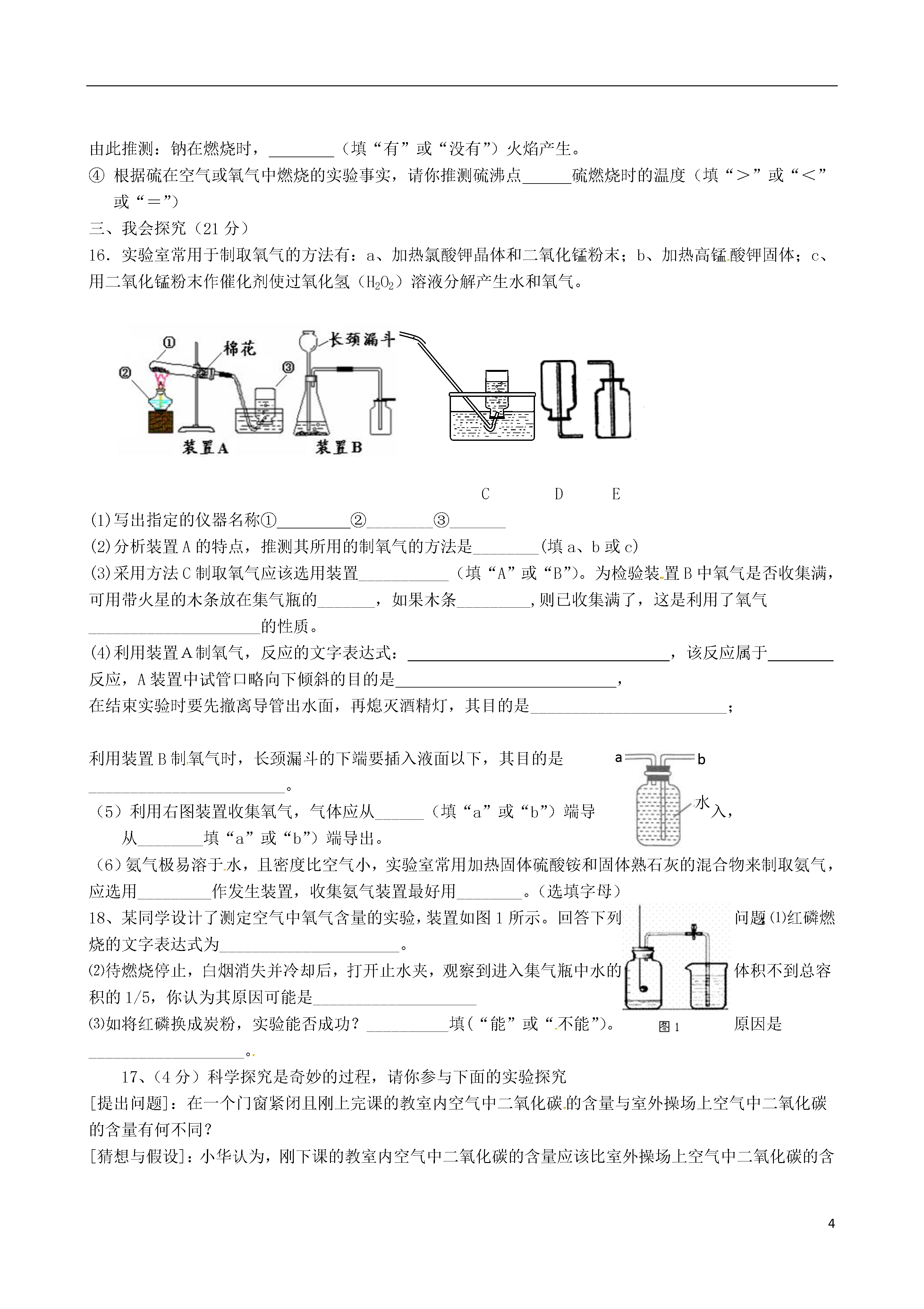 4四川省安岳县2018届九年级化学上学期第一次月考试题一、我会选择(每小题只有一个答案符合题意。计24分)()1、下列俗语与物质的化学性质无关的是:A.真金不怕火炼B.百炼方能成钢C.纸里包不住火D.玉不琢不成器()2、一氧化氮(NO)是大气污染物,但少量NO在人体内有扩张血管、增强记忆的功能。实验室收集NO只能用排水法。对NO的猜想或评价正确的是:A.易溶于水B.可能极易与氧气反应C.易与水反应D.有害无利()3、判断红磷燃烧是化学变化的主要现象是:A.发光B.放出大量的热C.红磷减少D.生成大量的白烟()4、下列仪器不能在酒精灯的火焰上直接加热的是:A.烧杯B.试管C.蒸发皿D.燃烧匙()5、某同学用托盘天平称量固体物质时;把固体物质放在右盘,砝码放在左盘,称得固体物质的质量为10.8g(1克以下用游码),如果按正确的方法称量,这位同学所称固体的实际质量是:A.9.2gB.9.8gC.10.8gD.10.2g()6、下列物质中,属于纯净物的是:A.牛奶B.酱油C.冰水混合物D.葡萄酒ab()7、在医院里给病人输氧时,常使用右下图所示装置。以下几种说法不正确的是:A.b导管连在供氧的钢瓶上B.b导管连在病人吸氧气的塑料管上C.该装置可用来观察是否有氧气输出D.该装置可用来观察输出氧气的速率()8、下图所示的实验操作正确的是:()9、对下列物质在氧气中燃烧的实验现象描述正确的是:A.木炭在氧气中燃烧时,有二氧化碳生成B.硫在氧气中燃烧时,火焰呈蓝紫色,生成无气味的气体C.红磷在氧气中燃烧时,产生大量白雾D.铁丝在氧气中燃烧时,剧烈燃烧,火星四射,生成黑色固体()10、做空气中氧气含量测定的实验装置如右图。下列有关说法正确的是:A.选用红磷是因为反应可以耗尽氧气,生成液态的五氧化二磷B.燃烧匙中的红磷可以换成硫或木炭C.燃烧匙中的红磷越多,水位上升越高D.钟罩内气体压强的减小会导致水面的上升()11、下列关于氧气的说法正确的是:A.氧气能支持燃烧,可作燃料;B.氧气能跟所有物质发生氧化反应;C.水中的鱼能依靠微溶于水中的氧气而生存;D.带火星的木条一定能在有氧气的集气瓶中复燃()12.用双氧水制取氧气时,忘记加二氧化锰,其结果是:A.不放出氧气B、放出氧气速率慢C、放出氧气总量会减少D、放出氧气总量增加二、我会填(36分)15.(11分)酒精是一种无色、透明、有特殊气味的液体,易挥发,能与水以任意比互溶,常用作酒精灯和内燃机的燃料,是一种绿色能源,当点燃酒精灯时,酒精在灯芯上气化后燃烧生成水和二氧化碳。(1)根据以上叙述,可归纳出酒精的物理性质是;化学性质是;酒精的用途是。(2)实验中,不小心将酒精灯碰倒在桌上燃烧起来,合理简单的灭火措施是。(3)下列仪器不能用酒精灯加热的是()A.燃烧匙;B.试管;C.量筒;D.蒸发皿。(4)某研究小组在学习氧气的化学性质时发现:铁丝在氧气中燃烧没有火焰,而蜡烛在氧气中燃烧却有明亮的火焰。该小组同学进行了如下探究。①写出铁丝在氧气中燃烧的化学符号表达式:。②探究一:蜡烛燃烧产生火焰的原因是什么?点燃蜡烛,将金属导管一端伸入内焰,导出其中物质,在另一端管口点燃,也有火焰产生(如右图所示)。由此可知:蜡烛燃烧产生的火焰是由(填“固态”或“气态”)物质燃烧形成的。③探究二:物质燃烧产生火焰的根本原因是什么?【查阅资料】物质熔点╱℃沸点╱℃燃烧时温度╱℃石蜡50∽70300∽550约600铁15352750约1800钠97.8883约1400由上表可知:物质燃烧能否产生火焰与其(填“熔点”或“沸点”)和燃烧时温度有关。通过上表中石蜡、铁的数据对比,你认为物质燃烧时,什么情况下能产生火焰。由此推测:钠在燃烧时,(填“有”或“没有”)火焰产生。④根据硫在空气或氧气中燃烧的实验事实,请你推测硫沸点硫燃烧时的温度(填“>”或“<”或“=”)三、我会探究(21分)16.实验室常用于制取氧气的方法有:a、加热氯酸钾晶体和二氧化锰粉末;b、加热高锰酸钾固体;c、用二氧化锰粉末作催化剂使过氧化氢(H2O2)溶液分解产生水和氧气。CDE(1)写出指定的仪器名称①②________③_______(2)分析装置A的特点,推测其所用的制氧气的方法是________(填a、b或c)(3)采用方法C制取氧气应该选用装置___________(填“A”或“B”)。为检验装置B中氧气是否收集满,可用带火星的木条放在集气瓶的_______,如果木条_________,则已收集满了,这是利用了氧气_______________