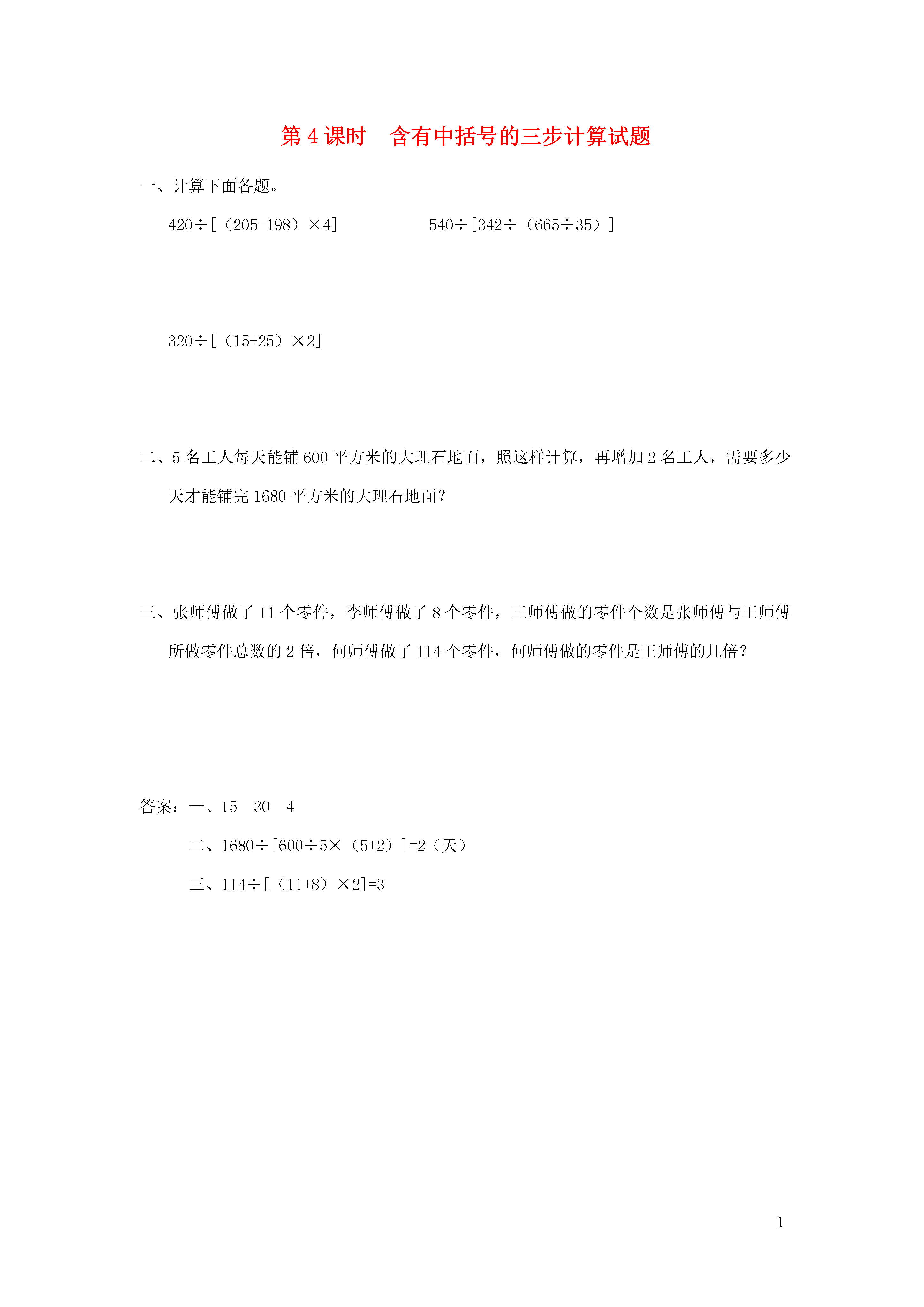 1第4课时含有中括号的三步计算试题计算下面各题。420÷[(205-198)×4]540÷[342÷(665÷35)]320÷[(15+25)×2]5名工人每天能铺600平方米的大理石地面,照这样计算,再增加2名工人,需要多少天才能铺完1680平方米的大理石地面?三、张师傅做了11个零件,李师傅做了8个零件,王师傅做的零件个数是张师傅与王师傅所做零件总数的2倍,何师傅做了114个零件,何师傅做的零件是王师傅的几倍?答案:一、15304二、1680÷[600÷5×(5+2)]=2(天)三、114÷[(11+8)×2]=3