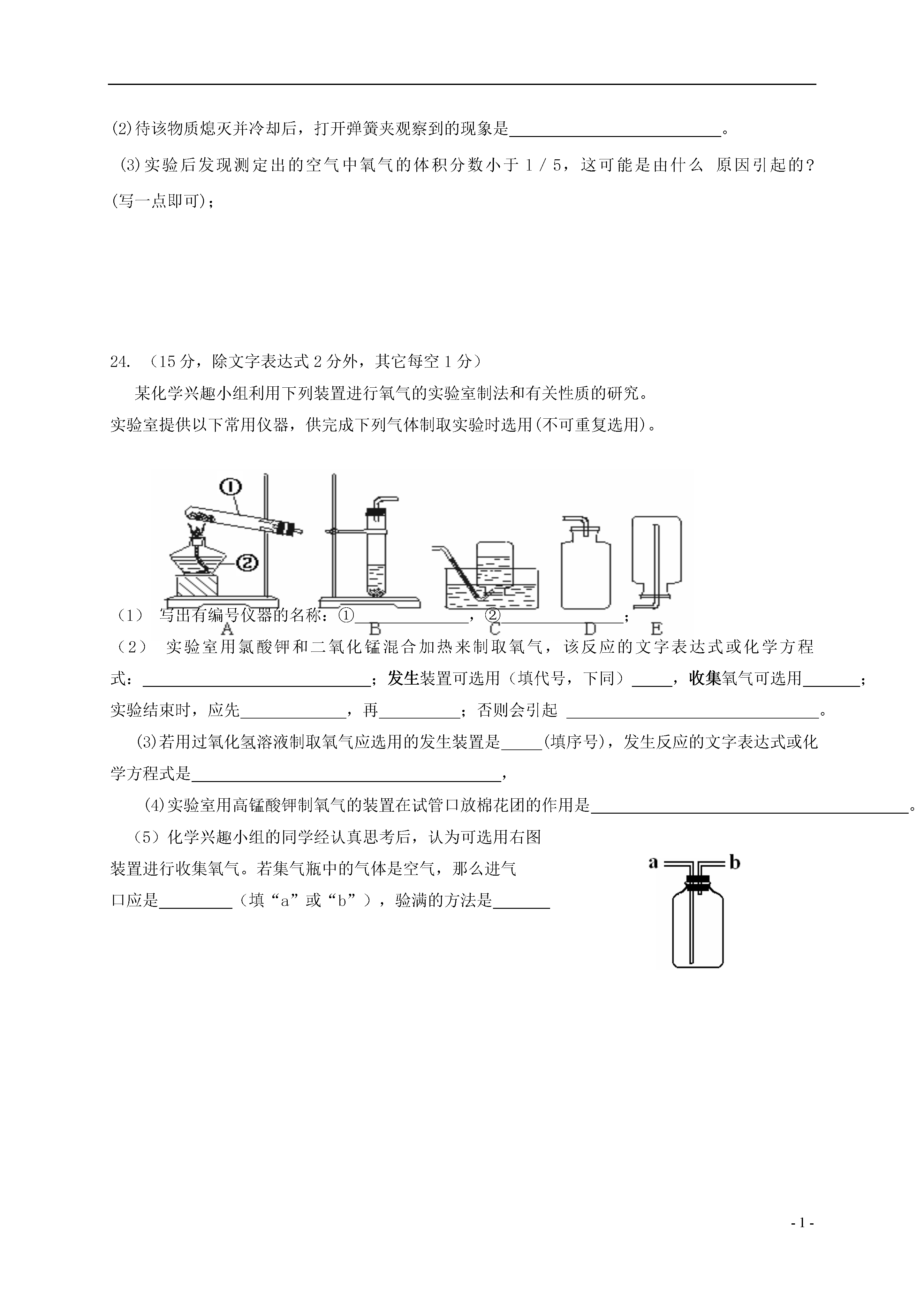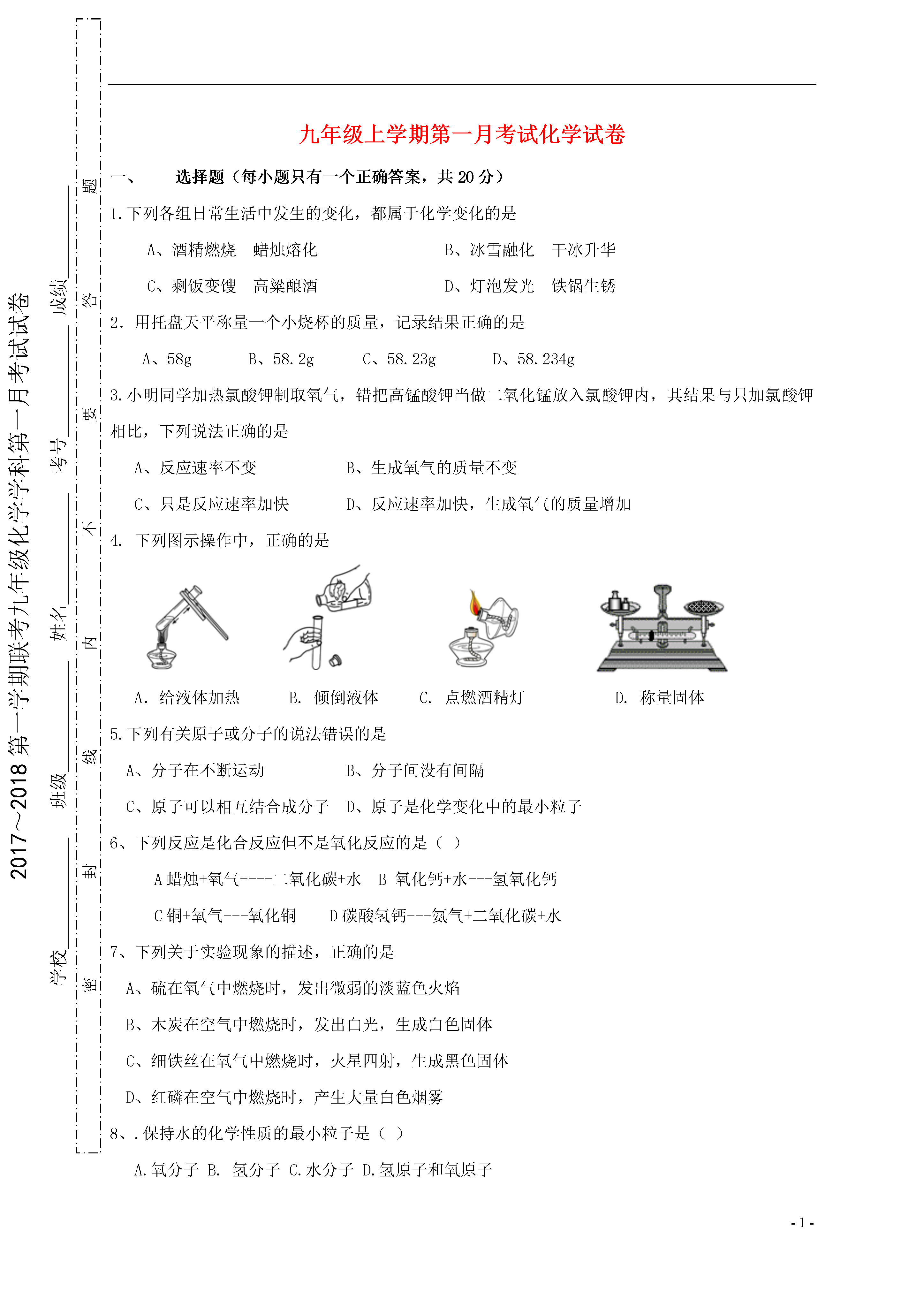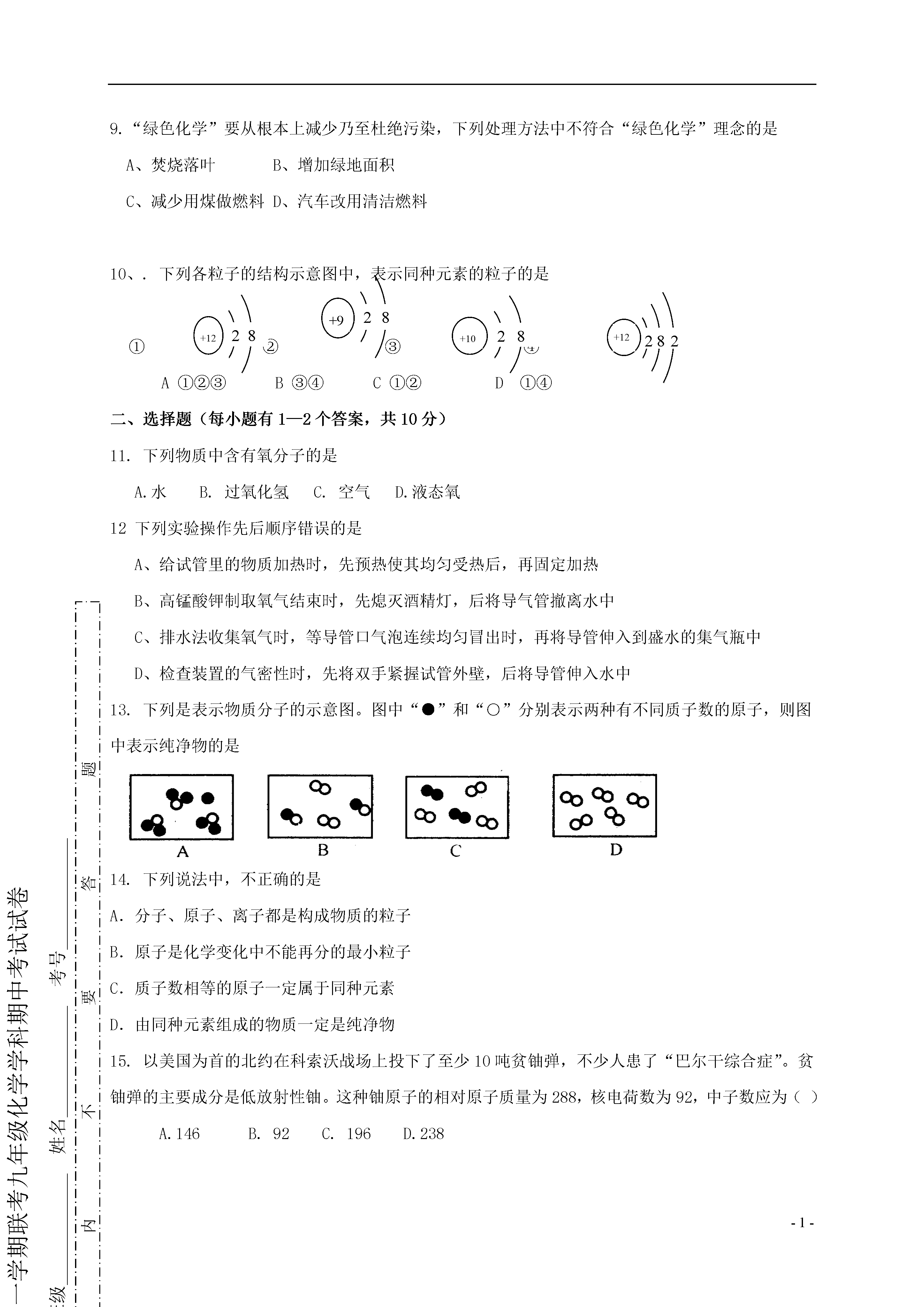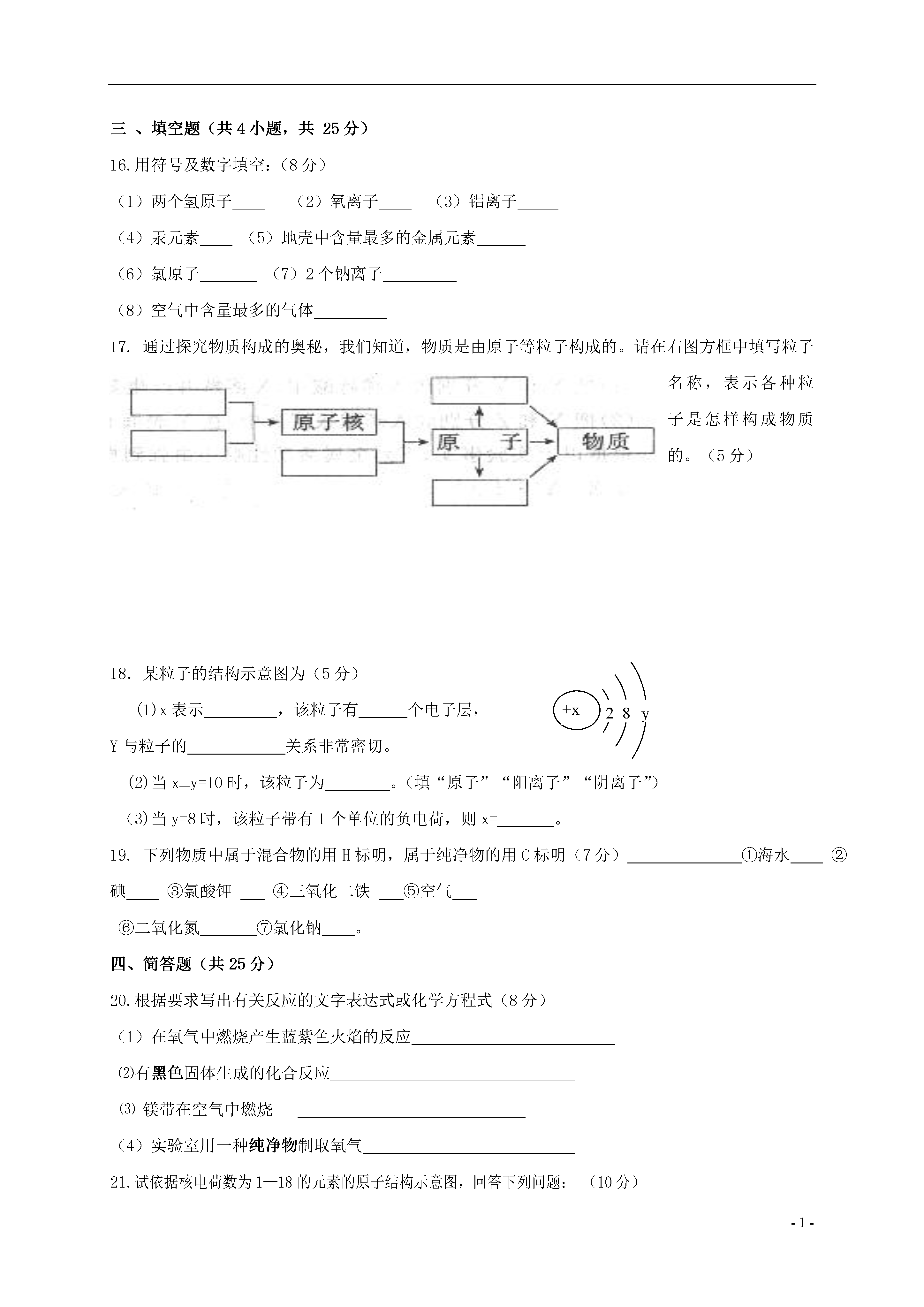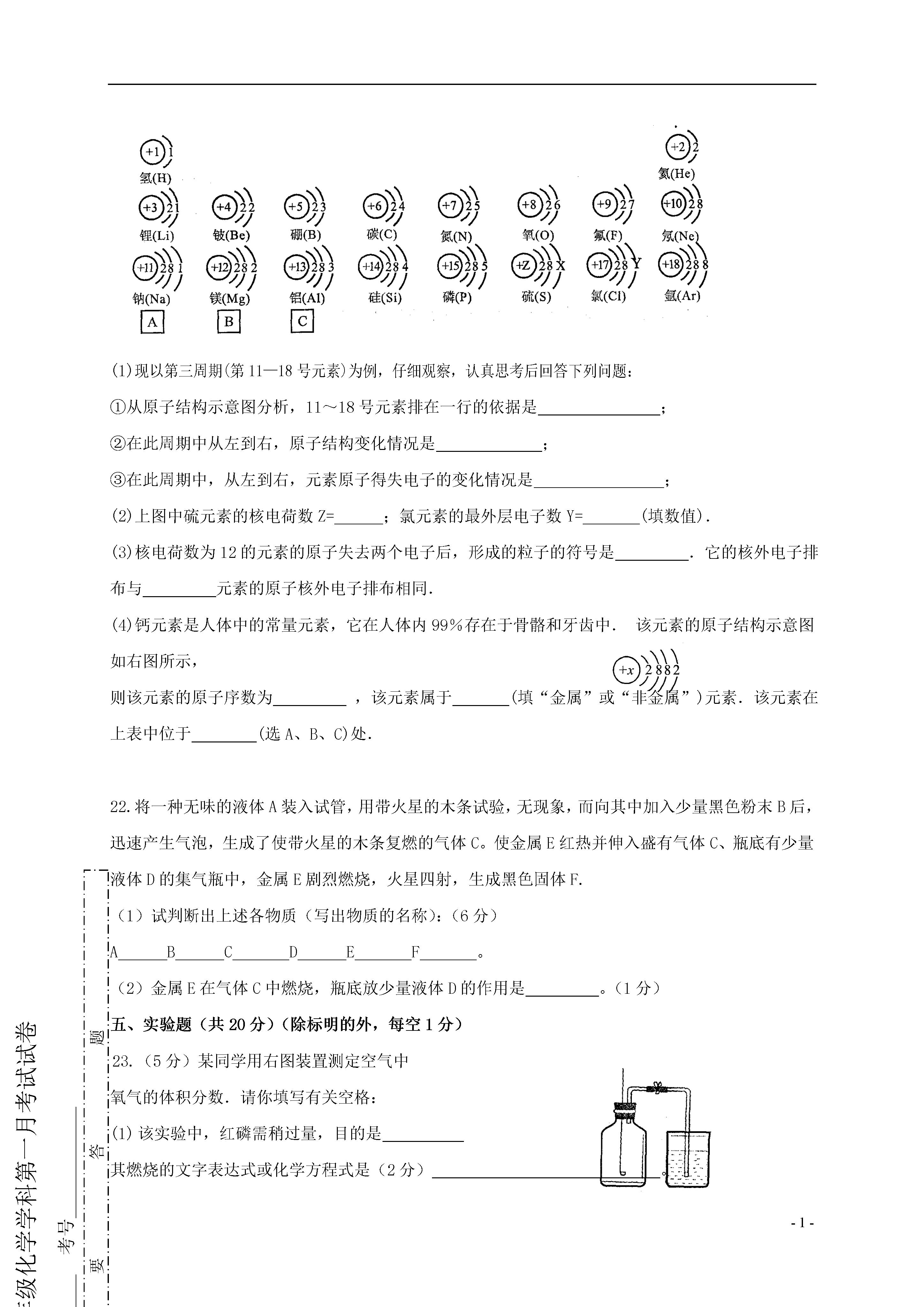 -1-密封线内不要答题2017~2018第一学期联考九年级化学学科第一月考试试卷学校____________班级____________姓名____________考号____________成绩__________九年级上学期第一月考试化学试卷选择题(每小题只有一个正确答案,共20分)1.下列各组日常生活中发生的变化,都属于化学变化的是A、酒精燃烧蜡烛熔化B、冰雪融化干冰升华C、剩饭变馊高粱酿酒D、灯泡发光铁锅生锈2.用托盘天平称量一个小烧杯的质量,记录结果正确的是A、58gB、58.2gC、58.23gD、58.234g3.小明同学加热氯酸钾制取氧气,错把高锰酸钾当做二氧化锰放入氯酸钾内,其结果与只加氯酸钾相比,下列说法正确的是A、反应速率不变B、生成氧气的质量不变C、只是反应速率加快D、反应速率加快,生成氧气的质量增加4.下列图示操作中,正确的是A.给液体加热B.倾倒液体C.点燃酒精灯D.称量固体5.下列有关原子或分子的说法错误的是A、分子在不断运动B、分子间没有间隔C、原子可以相互结合成分子D、原子是化学变化中的最小粒子6、下列反应是化合反应但不是氧化反应的是()A蜡烛+氧气----二氧化碳+水B氧化钙+水---氢氧化钙C铜+氧气---氧化铜D碳酸氢钙---氨气+二氧化碳+水7、下列关于实验现象的描述,正确的是A、硫在氧气中燃烧时,发出微弱的淡蓝色火焰B、木炭在空气中燃烧时,发出白光,生成白色固体C、细铁丝在氧气中燃烧时,火星四射,生成黑色固体D、红磷在空气中燃烧时,产生大量白色烟雾8、.保持水的化学性质的最小粒子是()A.氧分子B.氢分子C.水分子D.氢原子和氧原子9.“绿色化学”要从根本上减少乃至杜绝污染,下列处理方法中不符合“绿色化学”理念的是A、焚烧落叶B、增加绿地面积C、减少用煤做燃料D、汽车改用清洁燃料10、.下列各粒子的结构示意图中,表示同种元素的粒子的是+928282+12+1228+1028②③④A①②③B③④C①②D①④二、选择题(每小题有1—2个答案,共10分)11.下列物质中含有氧分子的是A.水B.过氧化氢C.空气D.液态氧12下列实验操作先后顺序错误的是A、给试管里的物质加热时,先预热使其均匀受热后,再固定加热B、高锰酸钾制取氧气结束时,先熄灭酒精灯,后将导气管撤离水中C、排水法收集氧气时,等导管口气泡连续均匀冒出时,再将导管伸入到盛水的集气瓶中D、检查装置的气密性时,先将双手紧握试管外壁,后将导管伸入水中密封线内不要答题2016~2017第一学期联考九年级化学学科期中考试试卷学校____________班级____________姓名____________考号____________13.下列是表示物质分子的示意图。图中“●”和“○”分别表示两种有不同质子数的原子,则图中表示纯净物的是14.下列说法中,不正确的是A.分子、原子、离子都是构成物质的粒子B.原子是化学变化中不能再分的最小粒子C.质子数相等的原子一定属于同种元素D.由同种元素组成的物质一定是纯净物15.以美国为首的北约在科索沃战场上投下了至少10吨贫铀弹,不少人患了“巴尔干综合症”。贫铀弹的主要成分是低放射性铀。这种铀原子的相对原子质量为288,核电荷数为92,中子数应为()A.146B.92C.196D.238三、填空题(共4小题,共25分)16.用符号及数字填空:(8分)(1)两个氢原子(2)氧离子(3)铝离子(4)汞元素(5)地壳中含量最多的金属元素(6)氯原子(7)2个钠离子(8)空气中含量最多的气体17.通过探究物质构成的奥秘,我们知道,物质是由原子等粒子构成的。请在右图方框中填写粒子名称,表示各种粒子是怎样构成物质的。(5分)28y+x18.某粒子的结构示意图为(5分)(1)x表示,该粒子有个电子层,Y与粒子的关系非常密切。(2)当x—y=10时,该粒子为。(填“原子”“阳离子”“阴离子”)(3)当y=8时,该粒子带有1个单位的负电荷,则x=。19.下列物质中属于混合物的用H标明,属于纯净物的用C标明(7分)①海水②碘③氯酸钾④三氧化二铁⑤空气⑥二氧化氮⑦氯化钠。四、简答题(共25分)20.根据要求写出有关反应的文字表达式或化学方程式(8分)(1)在氧气中燃烧产生蓝紫色火焰的反应⑵有黑色固体生成的化合反应镁带在空气中燃烧(4)实验室用一种纯净物制取氧气21.试依据核电荷数为1—18的元素的原子结构示意图,回答下列问题:(10分)(1)现以第三周期(第11—18号元素)为例,仔细观察,认真思考后回答