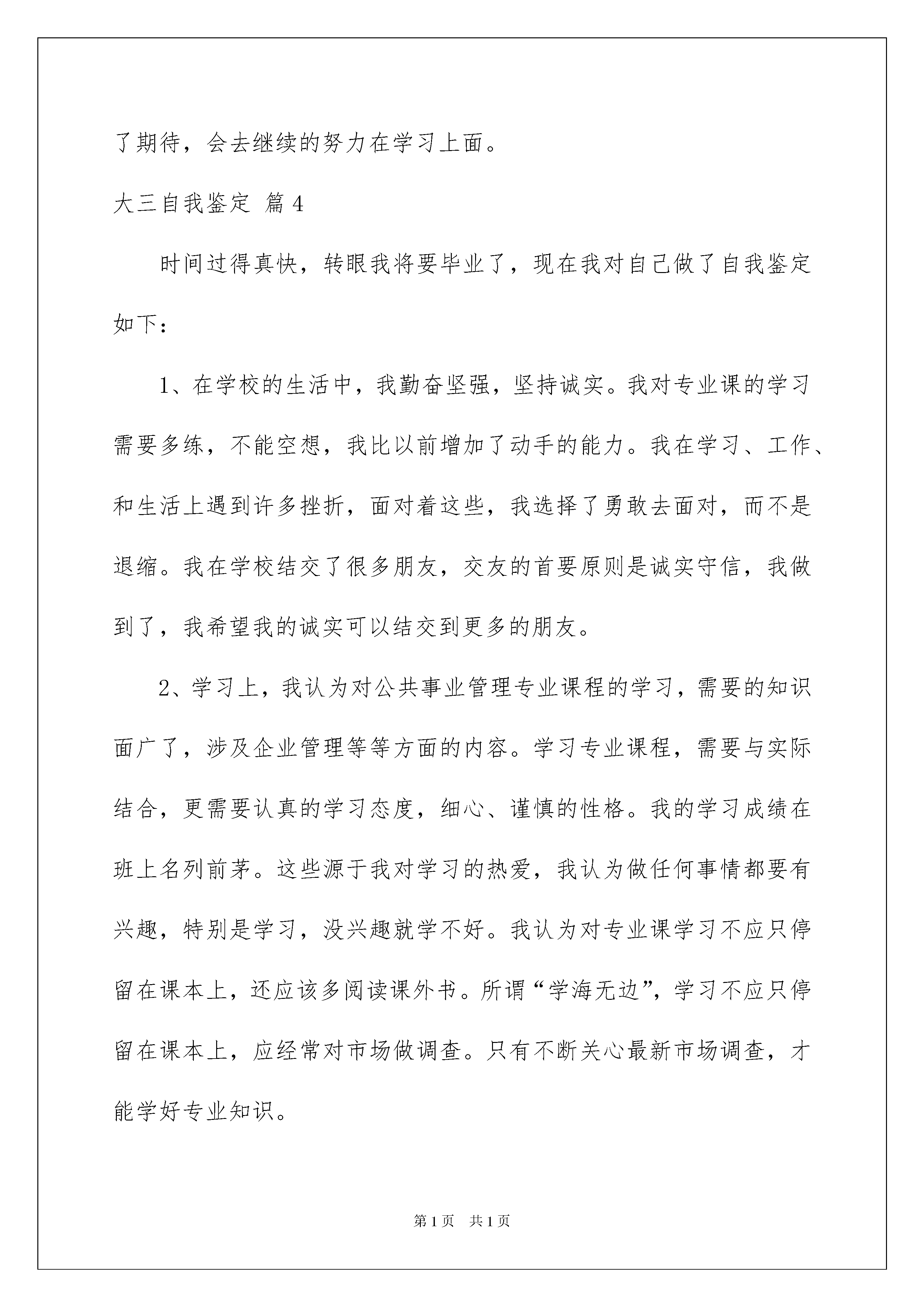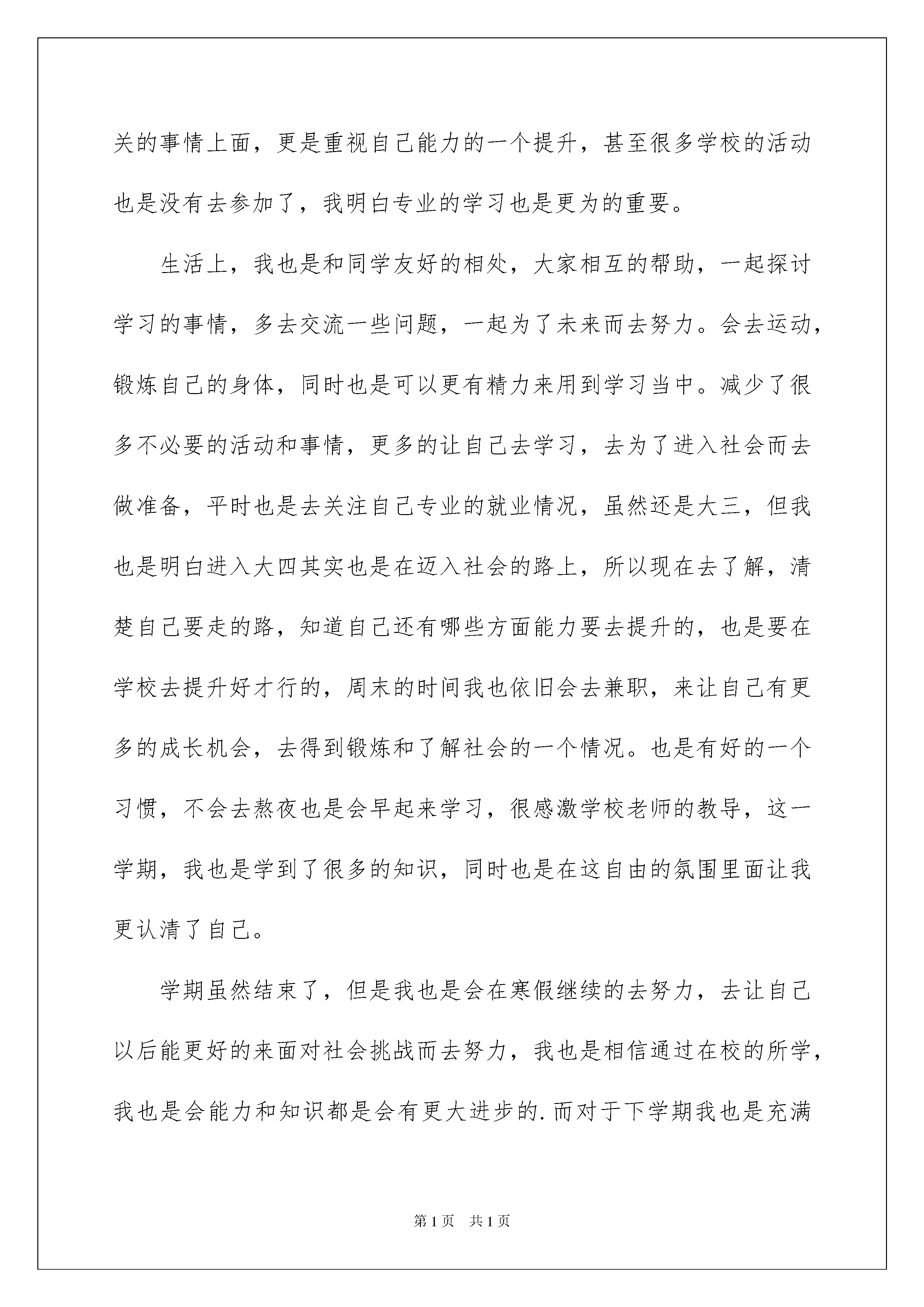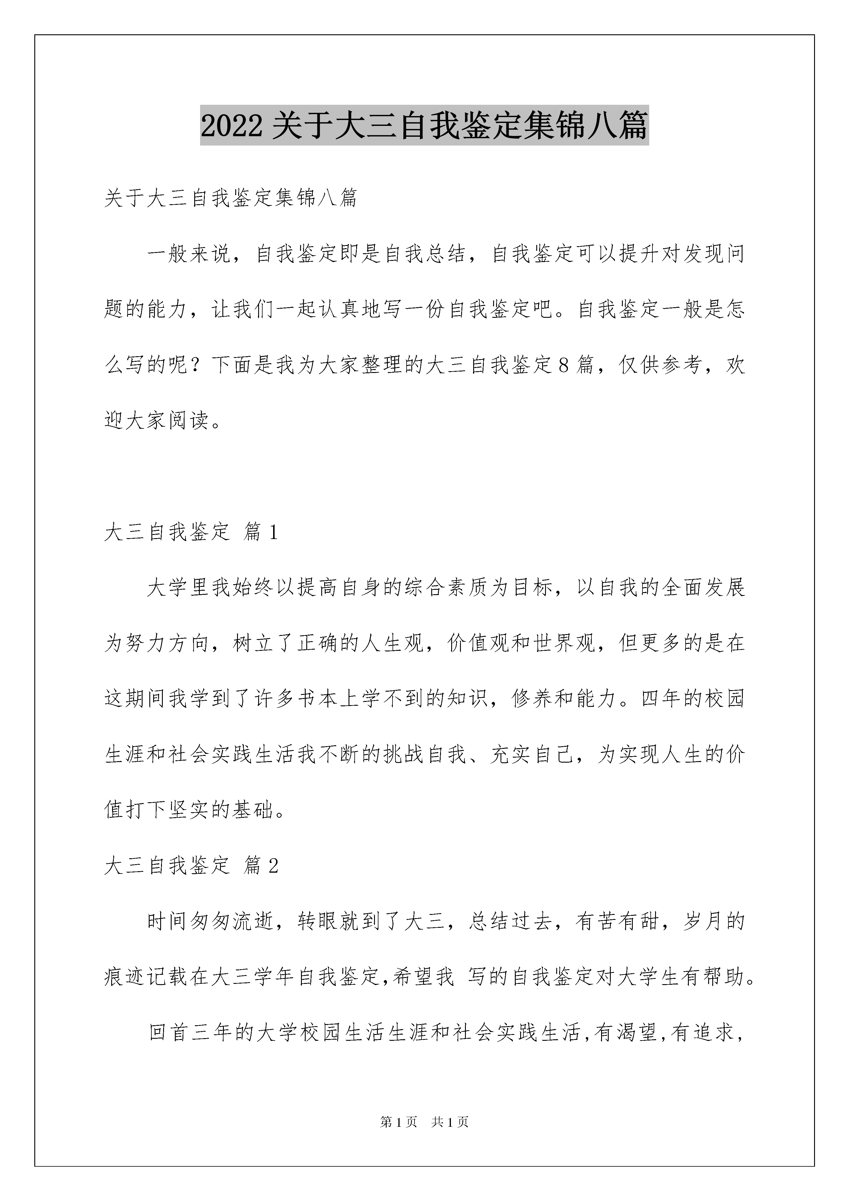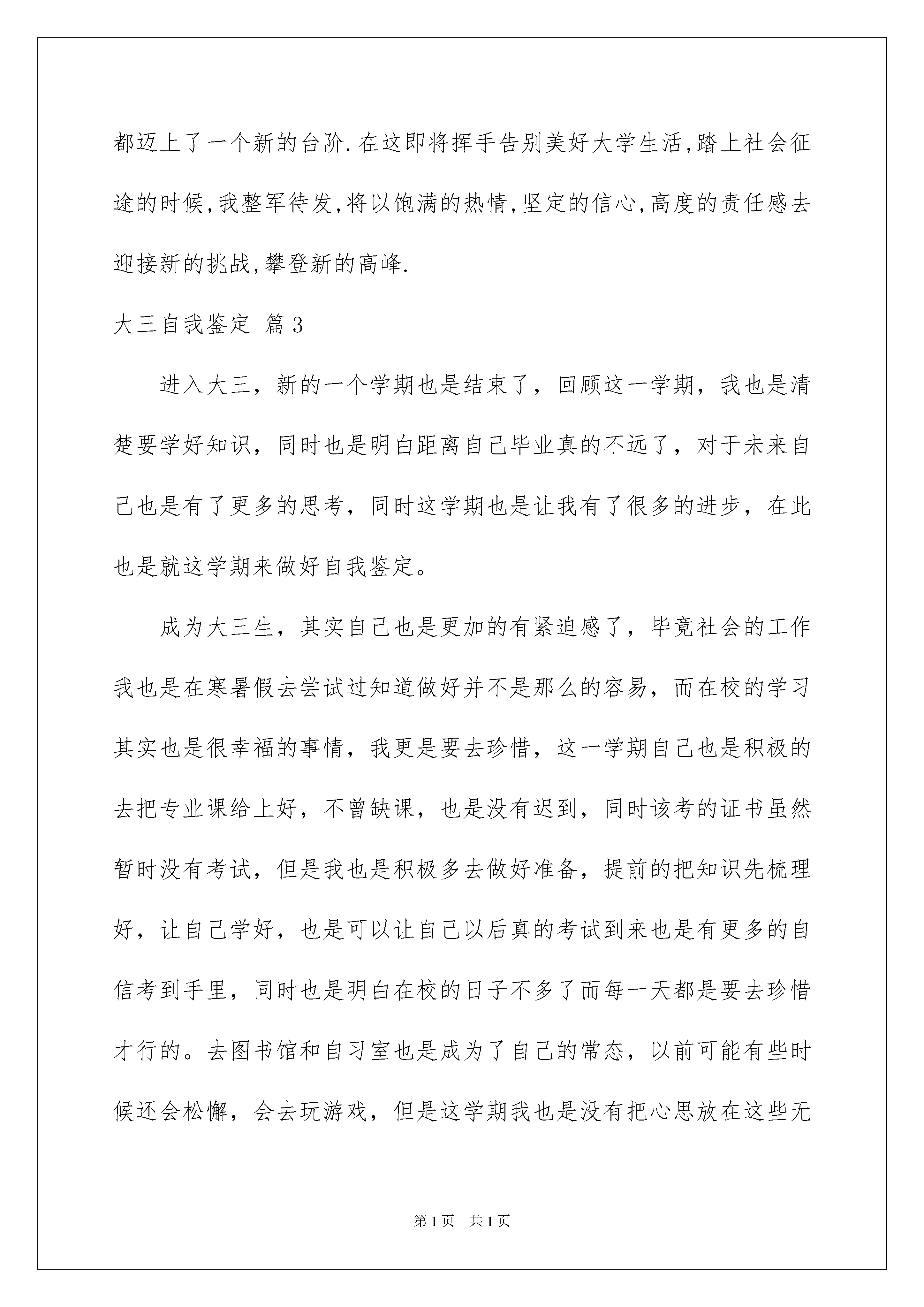 2022关于大三自我鉴定集锦八篇关于大三自我鉴定集锦八篇一般来说,自我鉴定即是自我总结,自我鉴定可以提升对发现问题的能力,让我们一起认真地写一份自我鉴定吧。自我鉴定一般是怎么写的呢?下面是我为大家整理的大三自我鉴定8篇,仅供参考,欢迎大家阅读。大三自我鉴定篇1大学里我始终以提高自身的综合素质为目标,以自我的全面发展为努力方向,树立了正确的人生观,价值观和世界观,但更多的是在这期间我学到了许多书本上学不到的知识,修养和能力。四年的校园生涯和社会实践生活我不断的挑战自我、充实自己,为实现人生的价值打下坚实的基础。大三自我鉴定篇2时间匆匆流逝,转眼就到了大三,总结过去,有苦有甜,岁月的痕迹记载在大三学年自我鉴定,希望我写的自我鉴定对大学生有帮助。回首三年的大学校园生活生涯和社会实践生活,有渴望,有追求,有成功也有失败,我孜孜不倦,不断地挑战自我,充实自己,为实现人生的价值打下坚实的基础.自我鉴定在思想品德上,本人有良好道德修养,并有坚定的政治方向,我积极地向党组织靠拢,使我对我们党有了更为深刻的认识.本人遵纪守法,爱护公共财产,关心和帮助他人,并以务实求真的精神热心参与学校的公益宣传和爱国活动.在学习上,我热爱自己的专业,还利用课余时间专修计算机专业知识,使我能轻松操作各种网络和办公软件.除了在专业知识方面精益求精外,平时我还涉猎了大量网络编程,网络管理与维护,网页设计等知识.并且相信在以后理论与实际结合当中,能有更大提高.在生活上,我最大的特点是诚实守信,热心待人,勇于挑战自我,时间观念强,有着良好的生活习惯和正派作风.由于平易近人待人友好,所以一直以来与人相处甚是融洽。在工作上,对工作热情,任劳任怨,责任心强,具有良好的组织交际能力,和同学团结一致,注重配合其他学生干部出色完成各项工作,得到了大家的一致好评.三年的大学生活,使自己的知识水平,思想境界,工作能力等方面都迈上了一个新的台阶.在这即将挥手告别美好大学生活,踏上社会征途的时候,我整军待发,将以饱满的热情,坚定的信心,高度的责任感去迎接新的挑战,攀登新的高峰.大三自我鉴定篇3进入大三,新的一个学期也是结束了,回顾这一学期,我也是清楚要学好知识,同时也是明白距离自己毕业真的不远了,对于未来自己也是有了更多的思考,同时这学期也是让我有了很多的进步,在此也是就这学期来做好自我鉴定。成为大三生,其实自己也是更加的有紧迫感了,毕竟社会的工作我也是在寒暑假去尝试过知道做好并不是那么的容易,而在校的学习其实也是很幸福的事情,我更是要去珍惜,这一学期自己也是积极的去把专业课给上好,不曾缺课,也是没有迟到,同时该考的证书虽然暂时没有考试,但是我也是积极多去做好准备,提前的把知识先梳理好,让自己学好,也是可以让自己以后真的考试到来也是有更多的自信考到手里,同时也是明白在校的日子不多了而每一天都是要去珍惜才行的。去图书馆和自习室也是成为了自己的常态,以前可能有些时候还会松懈,会去玩游戏,但是这学期我也是没有把心思放在这些无关的事情上面,更是重视自己能力的一个提升,甚至很多学校的活动也是没有去参加了,我明白专业的学习也是更为的重要。生活上,我也是和同学友好的相处,大家相互的帮助,一起探讨学习的事情,多去交流一些问题,一起为了未来而去努力。会去运动,锻炼自己的身体,同时也是可以更有精力来用到学习当中。减少了很多不必要的活动和事情,更多的让自己去学习,去为了进入社会而去做准备,平时也是去关注自己专业的就业情况,虽然还是大三,但我也是明白进入大四其实也是在迈入社会的路上,所以现在去了解,清楚自己要走的路,知道自己还有哪些方面能力要去提升的,也是要在学校去提升好才行的,周末的时间我也依旧会去兼职,来让自己有更多的成长机会,去得到锻炼和了解社会的一个情况。也是有好的一个习惯,不会去熬夜也是会早起来学习,很感激学校老师的教导,这一学期,我也是学到了很多的知识,同时也是在这自由的氛围里面让我更认清了自己。学期虽然结束了,但是我也是会在寒假继续的去努力,去让自己以后能更好的来面对社会挑战而去努力,我也是相信通过在校的所学,我也是会能力和知识都是会有更大进步的.而对于下学期我也是充满了期待,会去继续的努力在学习上面。大三自我鉴定篇4时间过得真快,转眼我将要毕业了,现在我对自己做了自我鉴定如下:1、在学校的生活中,我勤奋坚强,坚持诚实。我对专业课的学习需要多练,不能空想,我比以前增加了动手的能力。我在学习、工作、和生活上遇到许多挫折,面对着这些,我选择了勇敢去面对,而不是退缩。我在学校结交了很多朋友,交友的首要原则是诚实守信,我做到了,我希望我的诚实可以结交到