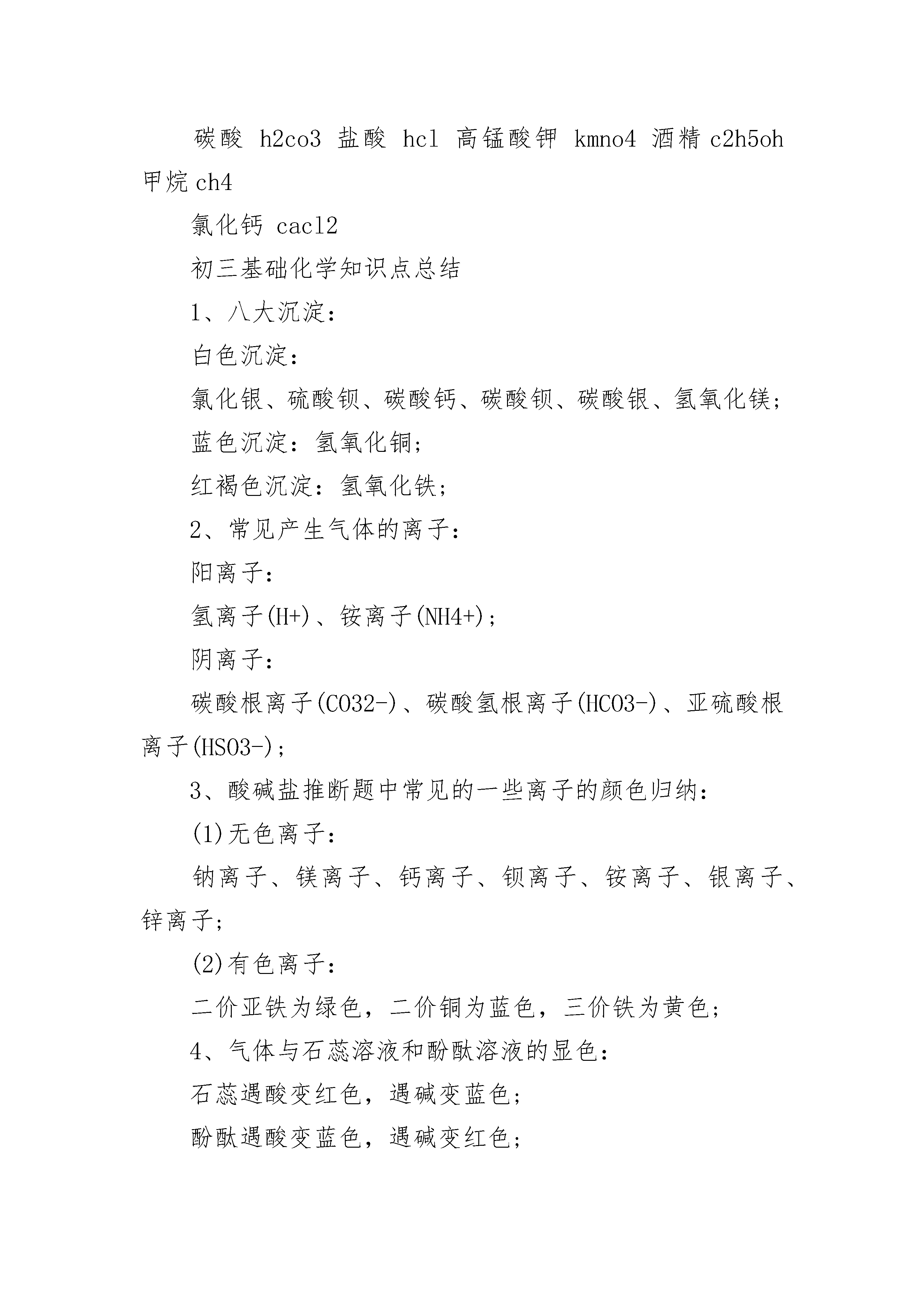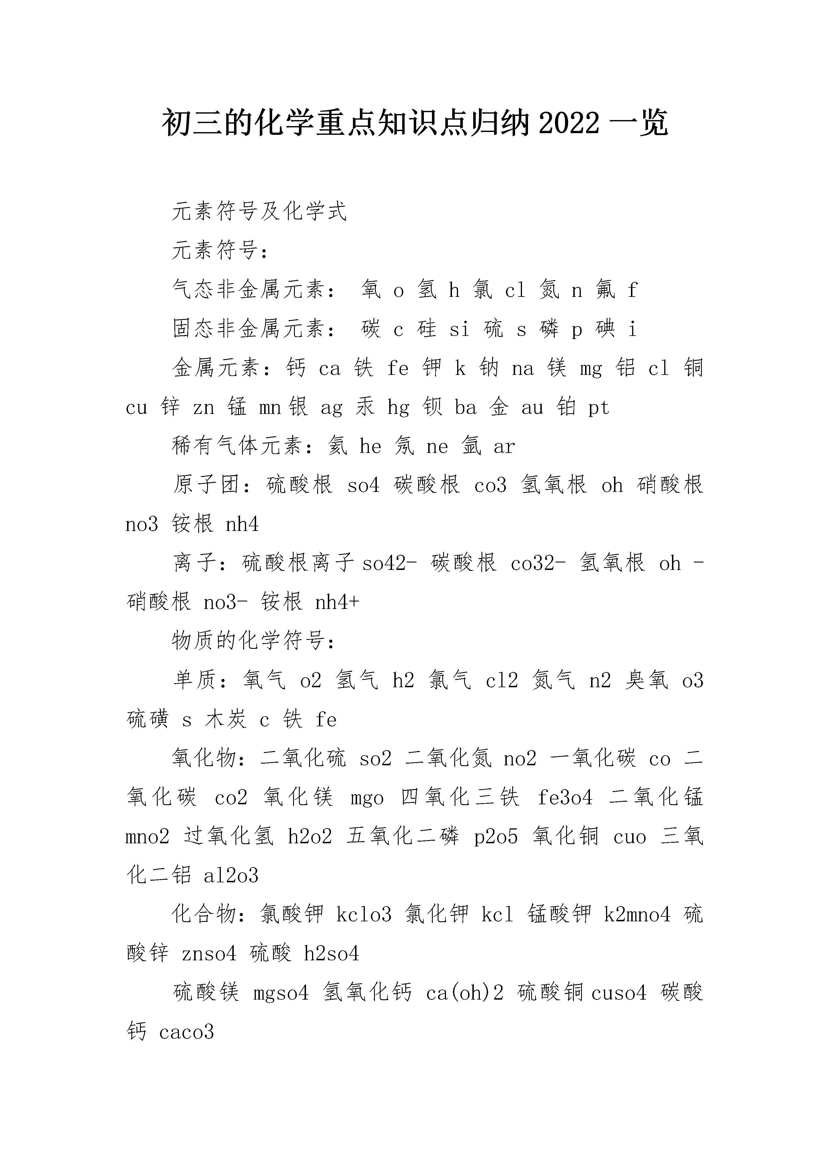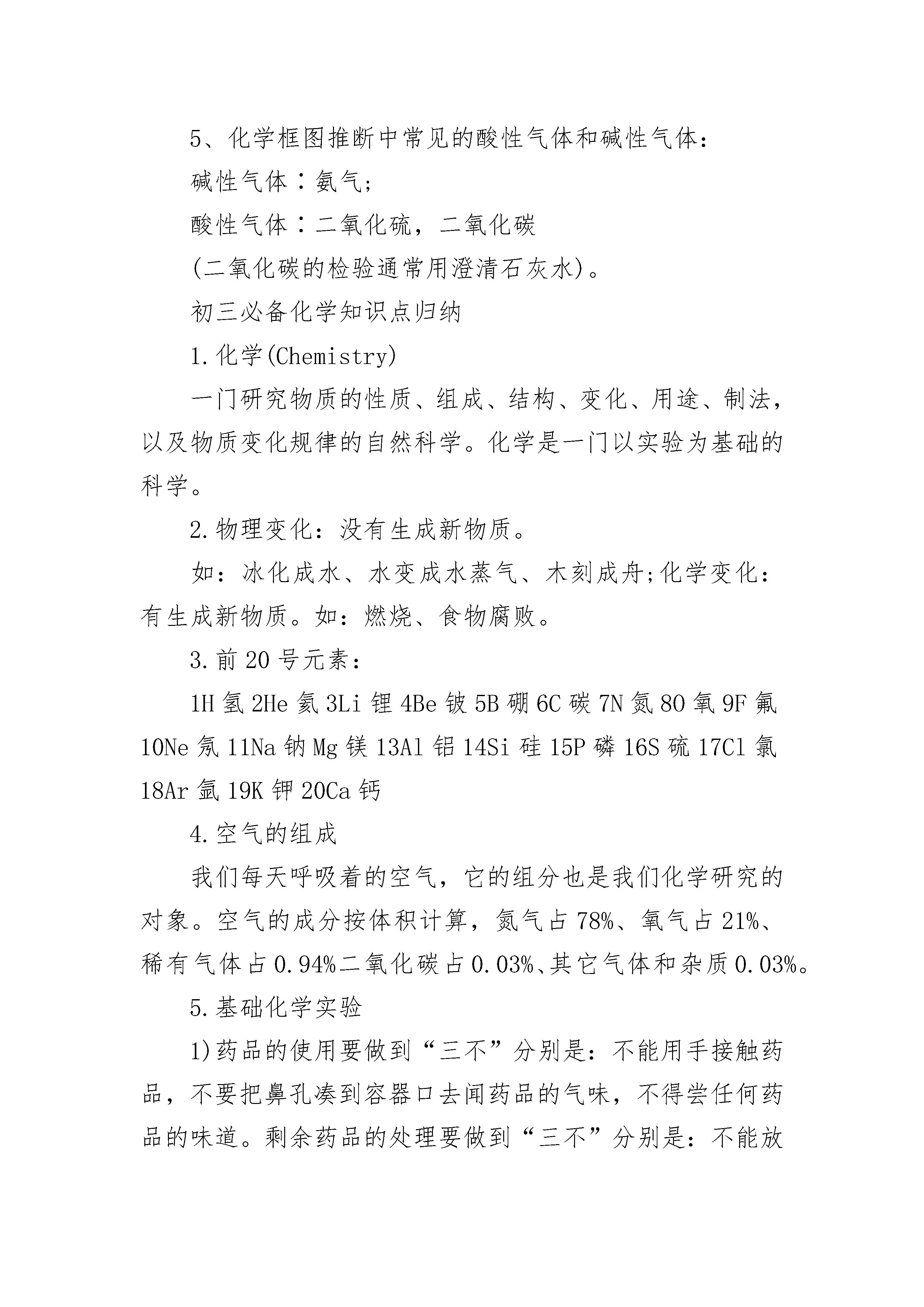 初三的化学重点知识点归纳2022一览元素符号及化学式元素符号:气态非金属元素:氧o氢h氯cl氮n氟f固态非金属元素:碳c硅si硫s磷p碘i金属元素:钙ca铁fe钾k钠na镁mg铝cl铜cu锌zn锰mn银ag汞hg钡ba金au铂pt稀有气体元素:氦he氖ne氩ar原子团:硫酸根so4碳酸根co3氢氧根oh硝酸根no3铵根nh4离子:硫酸根离子so42-碳酸根co32-氢氧根oh-硝酸根no3-铵根nh4+物质的化学符号:单质:氧气o2氢气h2氯气cl2氮气n2臭氧o3硫磺s木炭c铁fe氧化物:二氧化硫so2二氧化氮no2一氧化碳co二氧化碳co2氧化镁mgo四氧化三铁fe3o4二氧化锰mno2过氧化氢h2o2五氧化二磷p2o5氧化铜cuo三氧化二铝al2o3化合物:氯酸钾kclo3氯化钾kcl锰酸钾k2mno4硫酸锌znso4硫酸h2so4硫酸镁mgso4氢氧化钙ca(oh)2硫酸铜cuso4碳酸钙caco3碳酸h2co3盐酸hcl高锰酸钾kmno4酒精c2h5oh甲烷ch4氯化钙cacl2初三基础化学知识点总结1、八大沉淀:白色沉淀:氯化银、硫酸钡、碳酸钙、碳酸钡、碳酸银、氢氧化镁;蓝色沉淀:氢氧化铜;红褐色沉淀:氢氧化铁;2、常见产生气体的离子:阳离子:氢离子(H+)、铵离子(NH4+);阴离子:碳酸根离子(CO32-)、碳酸氢根离子(HCO3-)、亚硫酸根离子(HSO3-);3、酸碱盐推断题中常见的一些离子的颜色归纳:(1)无色离子:钠离子、镁离子、钙离子、钡离子、铵离子、银离子、锌离子;(2)有色离子:二价亚铁为绿色,二价铜为蓝色,三价铁为黄色;4、气体与石蕊溶液和酚酞溶液的显色:石蕊遇酸变红色,遇碱变蓝色;酚酞遇酸变蓝色,遇碱变红色;5、化学框图推断中常见的酸性气体和碱性气体:碱性气体∶氨气;酸性气体∶二氧化硫,二氧化碳(二氧化碳的检验通常用澄清石灰水)。初三必备化学知识点归纳1.化学(Chemistry)一门研究物质的性质、组成、结构、变化、用途、制法,以及物质变化规律的自然科学。化学是一门以实验为基础的科学。2.物理变化:没有生成新物质。如:冰化成水、水变成水蒸气、木刻成舟;化学变化:有生成新物质。如:燃烧、食物腐败。3.前20号元素:1H氢2He氦3Li锂4Be铍5B硼6C碳7N氮8O氧9F氟10Ne氖11Na钠Mg镁13Al铝14Si硅15P磷16S硫17Cl氯18Ar氩19K钾20Ca钙4.空气的组成我们每天呼吸着的空气,它的组分也是我们化学研究的对象。空气的成分按体积计算,氮气占78%、氧气占21%、稀有气体占0.94%二氧化碳占0.03%、其它气体和杂质0.03%。5.基础化学实验1)药品的使用要做到“三不”分别是:不能用手接触药品,不要把鼻孔凑到容器口去闻药品的气味,不得尝任何药品的味道。剩余药品的处理要做到“三不”分别是:不能放回原瓶,不要随意丢弃,不要拿出实验室。2)固体药品的取用小颗粒或粉末状用药匙或纸槽。操作方法是:一、先使试管倾斜。二、把盛有药品的药匙送至试管底部。三、再把容器慢慢竖立起来,如没有注明用量应取盖满试管底部为宜。块状或颗粒大的药品用镊子取。操作方法:一、先把容器横放。二、把药品放入容器口。三、再把容器慢慢竖立起来。3)液体药品的取用:①少量液体用滴管。②细口瓶倒液体时,瓶塞应倒放,标签向手心,否则残留的液体会腐蚀标签。如果没有注明用量应取1-2ml。③准确取液体用量筒和滴管,俯视读数比实际偏大,仰视读数比实际偏小。4)酒精灯火焰分为外焰、内焰、焰芯,温度最高的是外焰,最低的是焰芯,加热时用外焰加热。5)可直加热的仪器有(四种)试管、燃烧匙、石棉网、坩埚。必须垫上石棉网才可加热的仪器有烧杯、烧瓶、锥形瓶,不能加热的有量筒。加热前必须预热,操作方法是把试管在火焰上来回移动或把酒精灯火焰在药品下方来回移动。给固体加热试管口要略向下倾斜,给液体加热试管与桌面倾角为45°。6)玻璃仪器洗刷干净的标准是仪器内壁附着的水既不聚成水滴,也不成股流下。7)试管夹夹在离管口约1/3处,酒精灯内酒精不能超过容积的2/3,加热试管内的液体不能超过容积的1/3。8)给试管里的液体加热,可能会造成试管破裂的原因有:试管外壁有水珠或没有预热试管、灼热的试管用冷水冲洗等。