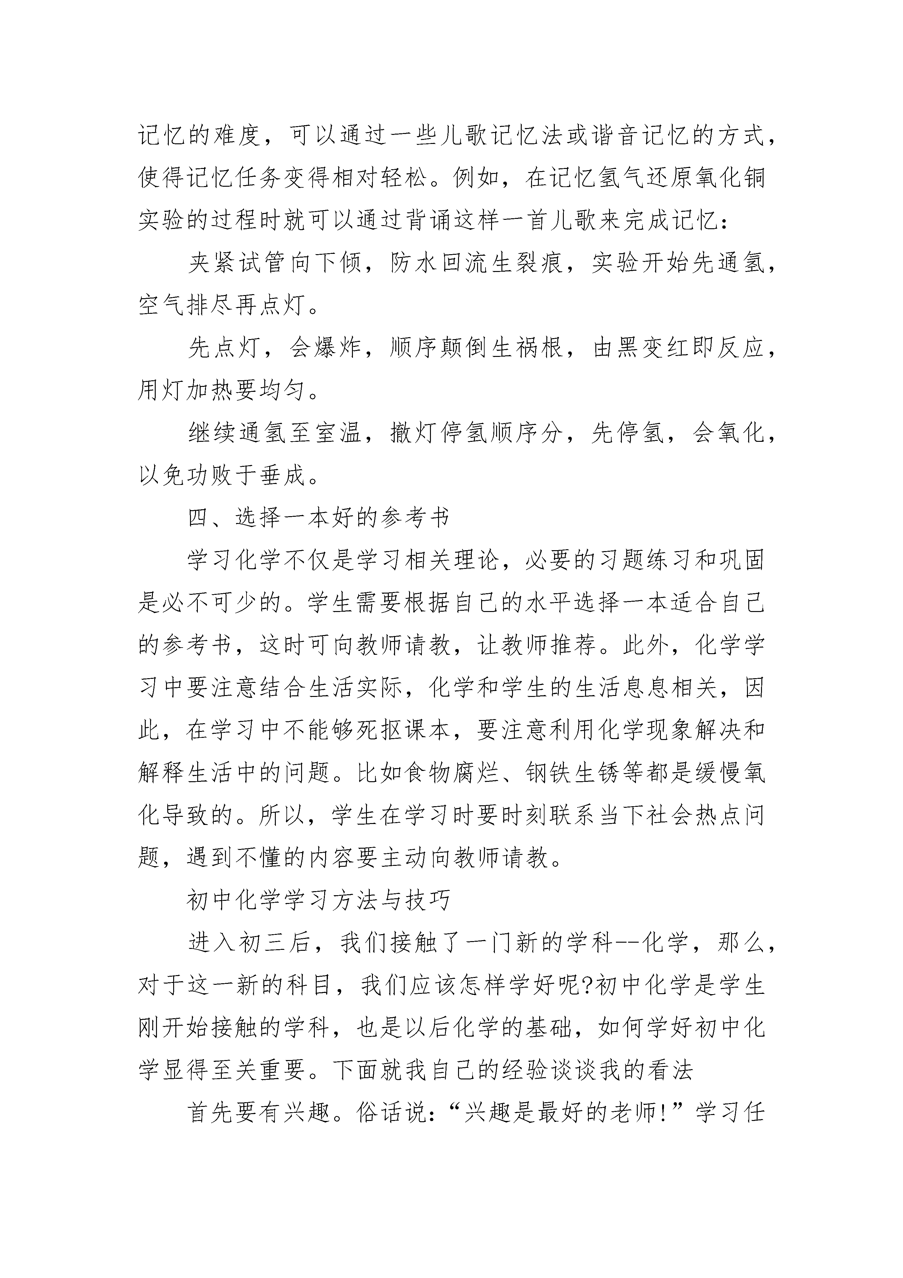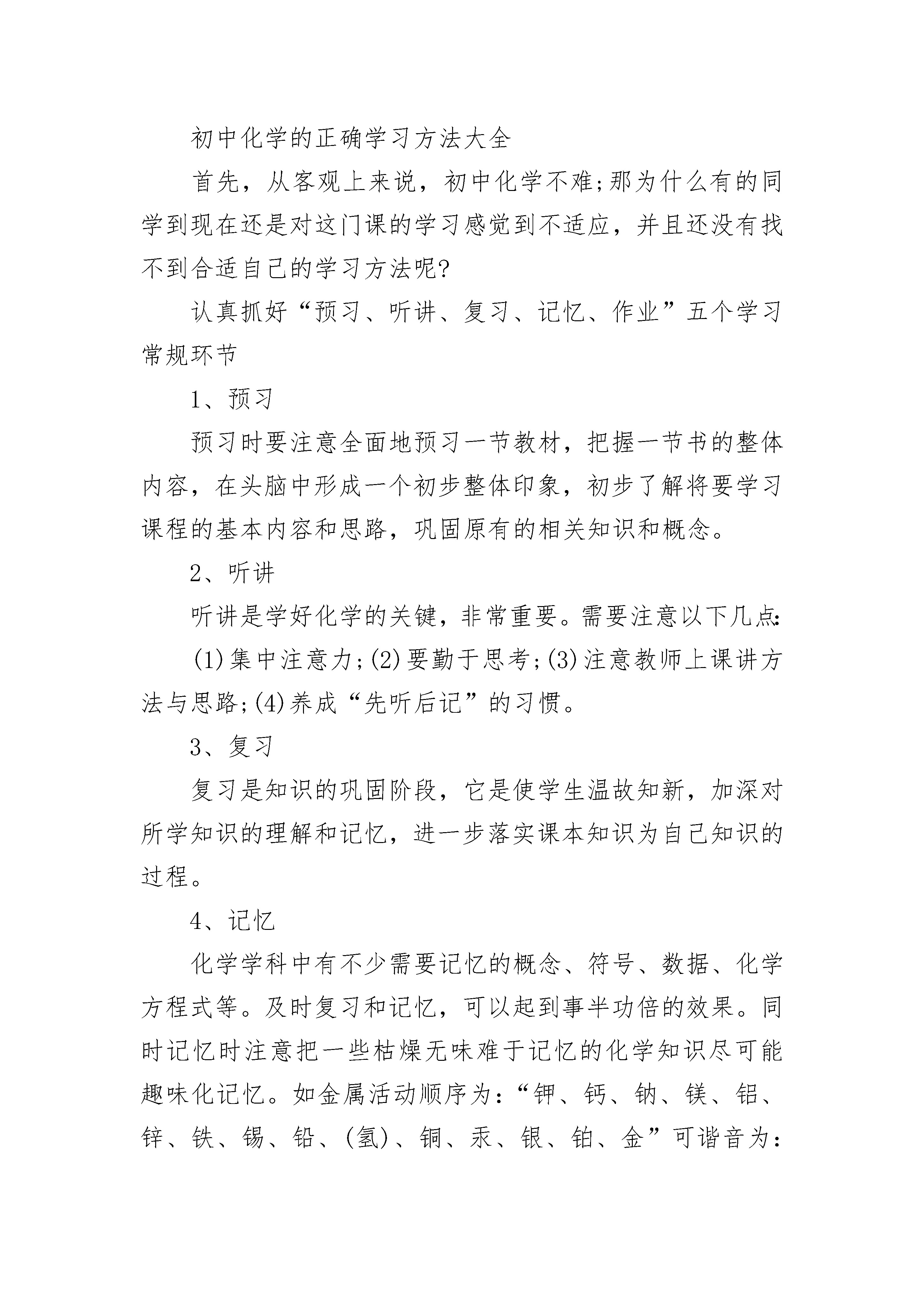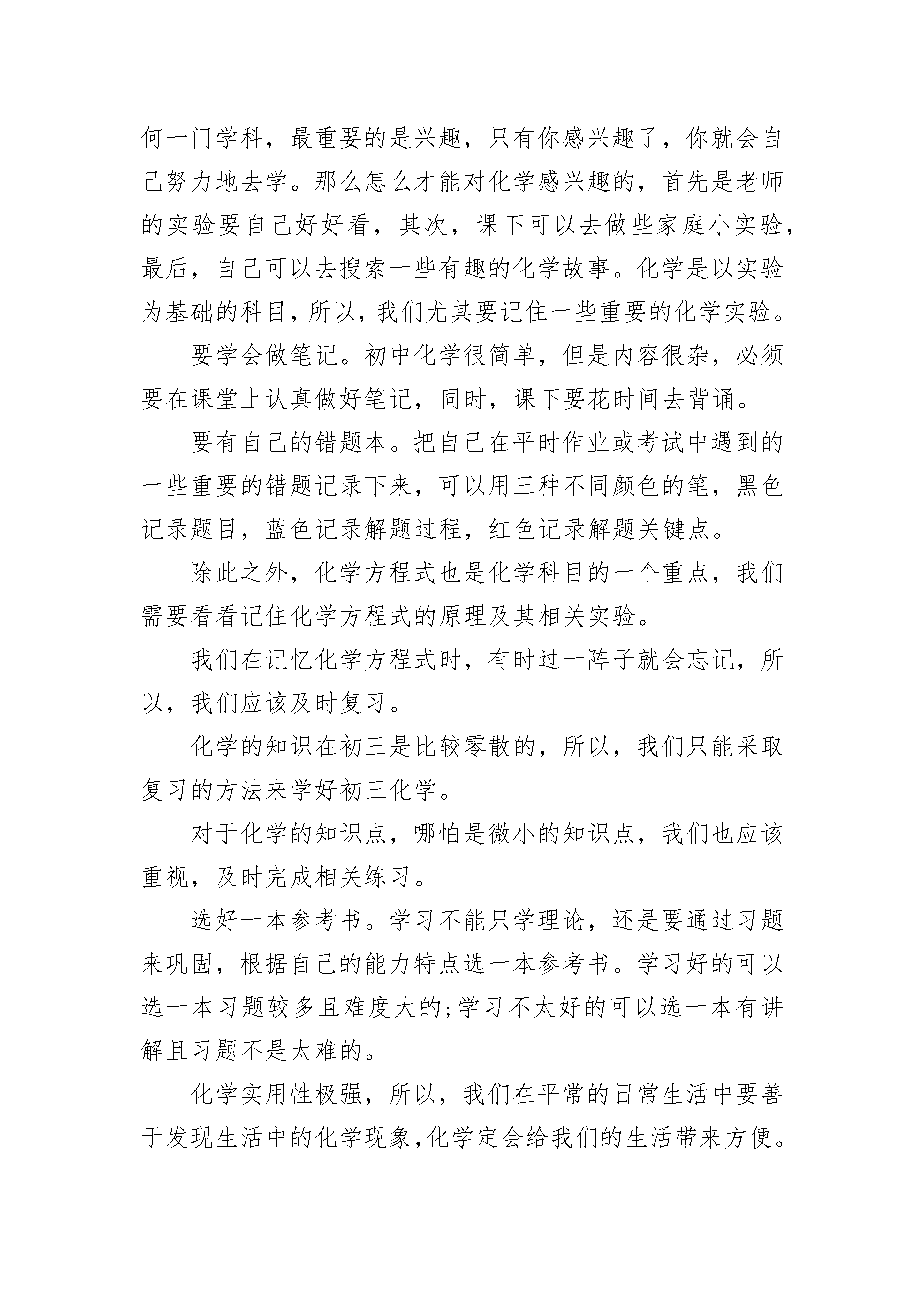 初中学习化学的方法有哪些_学习方法汇总进入初三,学生开始接触化学,此阶段化学学习质量的高低至关重要,它能为学生今后的化学学习奠定基础,直接决定学生日后的化学水平。但在化学学习中,很多学生因缺乏必要的方法,学习起来相对吃力,从而出现了自暴自弃、恶性循环的现象。因此,学好化学,好的学习方法是非常有必要的。一、勤于预习,做好课堂笔记无论学习哪一门学科,学生首先要做的就是对这门学科有一个充分的认识和了解。因此,这里提醒初二即将步入到初三的学生,可利用暑假将化学课本认真浏览一遍,相信书中的知识一定会吸引你的兴趣。尤其是书中涉及的一些化学实验,如氧气制取、二氧化碳的制取等。在真正开始学习这门课程后,学生要在每堂课前预习新知识。预习不仅是对课本内容的浏览和阅读,要带着疑问去预习,将自己在预习中不理解的地方做好标记,同时还可以通过自己的预习适当完成一些练习。在这样的情况下学生再走进课堂学习,就更具针对性,听课的效率也自然会得到提升。初中阶段的化学知识相对较多,所以教师讲内容不可能面面俱到,对于教师讲的重点的知识,学生一定要积极记录笔记、认真听课,化学课堂绝对不允许出现走神现象。一旦走神,可能就会和教师的思路脱节,教师讲的下一个知识点可能就没有办法很好地理解,学生切勿成为被动的倾听者,要在课堂中积极地和教师进行互动和交流。二、逐渐的培养对化学的兴趣学习任何一门学科,兴趣都是必不可少的。所以,为了高效地学习化学,学生要努力培养对化学的“好感”。首先,对化学课堂中的实验课,一定要认真看、认真学习,课下勤于思考,可以自己动手做一些家庭小实验,还可以主动搜集一些与课本相关的化学小故事,通过这些方式逐渐建立起对化学的兴趣。例如,在学习人教版九年级上册化學第四单元《水的净化》这部分内容时,课本中涉及了一个自制简易净水器的小实验,学生完全可以在家制作这个小装置:找一个空饮料瓶,瓶口用一个单孔胶塞塞住,然后将瓶子倒立过来,瓶子里放一些纱布、活性炭等,制作好后测试它的净化效果。通过动手制作这样一个小装置,学生既能感受到化学知识的神奇之处,还能为自己做好这样一个装置而感受到满满的成就感。三、加强对化学公式、符号的记忆初中化学知识理解起来相对容易,但内容比较繁杂。所以下课花时间对一些公式和符号进行记忆是必不可少的。学生在学习化学时一定要熟练掌握相关化学用语。初三阶段会学习到水、氢气、氧气、二氧化碳这些物质,对于它们特有的化学符号,学生必须要牢记。“元素”这一章所涉及的诸多元素名称、符号也应该熟记于心,这些都离不开学生下功夫去记忆。所以,学习化学必须下费功夫对一些固定的知识和内容进行强化记忆,这是学生学好化学的保障。为了降低记忆的难度,可以通过一些儿歌记忆法或谐音记忆的方式,使得记忆任务变得相对轻松。例如,在记忆氢气还原氧化铜实验的过程时就可以通过背诵这样一首儿歌来完成记忆:夹紧试管向下倾,防水回流生裂痕,实验开始先通氢,空气排尽再点灯。先点灯,会爆炸,顺序颠倒生祸根,由黑变红即反应,用灯加热要均匀。继续通氢至室温,撤灯停氢顺序分,先停氢,会氧化,以免功败于垂成。四、选择一本好的参考书学习化学不仅是学习相关理论,必要的习题练习和巩固是必不可少的。学生需要根据自己的水平选择一本适合自己的参考书,这时可向教师请教,让教师推荐。此外,化学学习中要注意结合生活实际,化学和学生的生活息息相关,因此,在学习中不能够死抠课本,要注意利用化学现象解决和解释生活中的问题。比如食物腐烂、钢铁生锈等都是缓慢氧化导致的。所以,学生在学习时要时刻联系当下社会热点问题,遇到不懂的内容要主动向教师请教。初中化学学习方法与技巧进入初三后,我们接触了一门新的学科--化学,那么,对于这一新的科目,我们应该怎样学好呢?初中化学是学生刚开始接触的学科,也是以后化学的基础,如何学好初中化学显得至关重要。下面就我自己的经验谈谈我的看法首先要有兴趣。俗话说:“兴趣是最好的老师!”学习任何一门学科,最重要的是兴趣,只有你感兴趣了,你就会自己努力地去学。那么怎么才能对化学感兴趣的,首先是老师的实验要自己好好看,其次,课下可以去做些家庭小实验,最后,自己可以去搜索一些有趣的化学故事。化学是以实验为基础的科目,所以,我们尤其要记住一些重要的化学实验。要学会做笔记。初中化学很简单,但是内容很杂,必须要在课堂上认真做好笔记,同时,课下要花时间去背诵。要有自己的错题本。把自己在平时作业或考试中遇到的一些重要的错题记录下来,可以用三种不同颜色的笔,黑色记录题目,蓝色记录解题过程,红色记录解题关键点。除此之外,化学方程式也是化学科目的一个重点,我们需要看看记住化学方程式的原理及其相关实验。我们在记忆化学方程式时,有时过一阵子就会忘记,所以,我们应该及时复习。化学的知识在初三是比较零散的,所以,我们只能采取复习的方法来学好初三化
