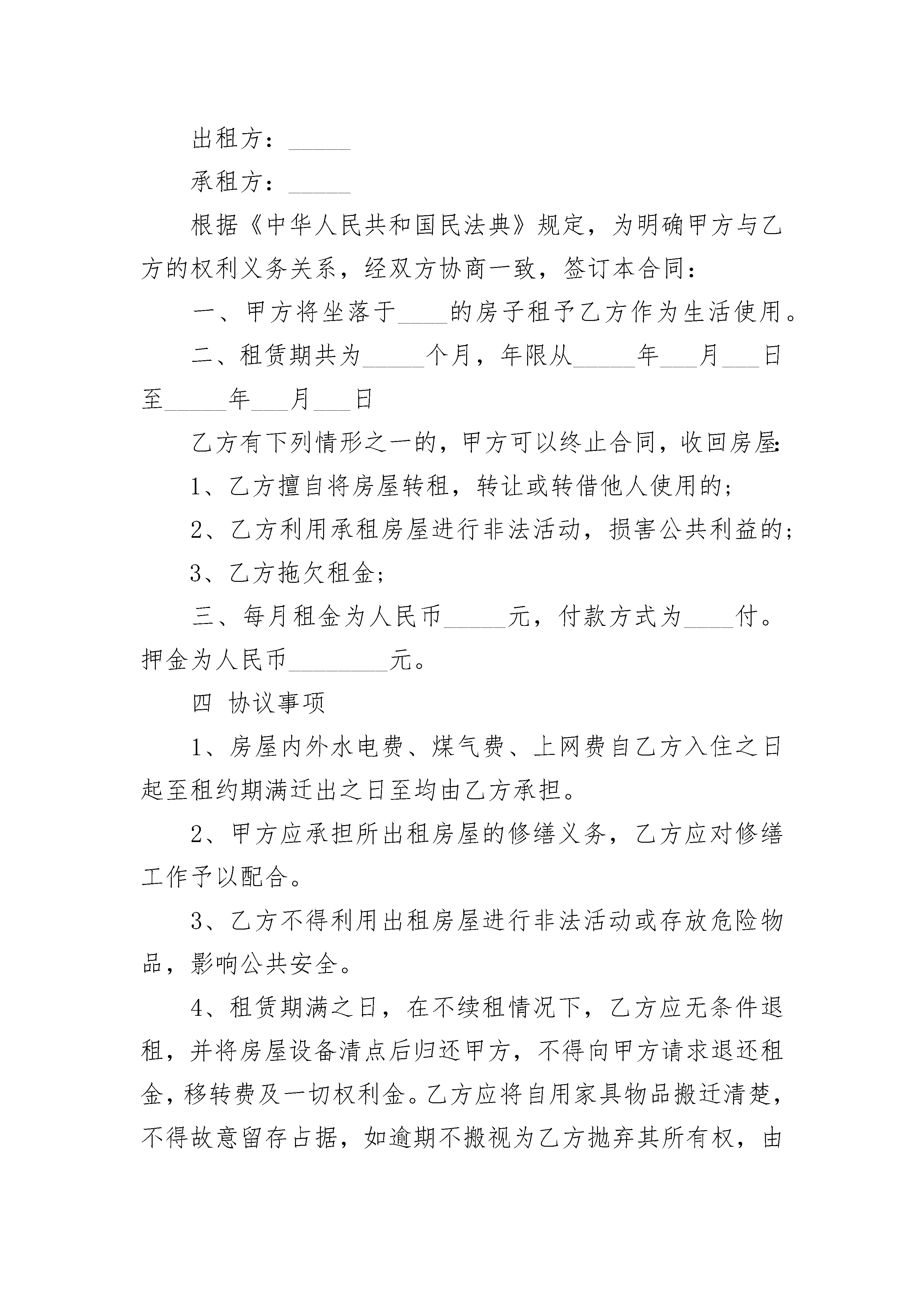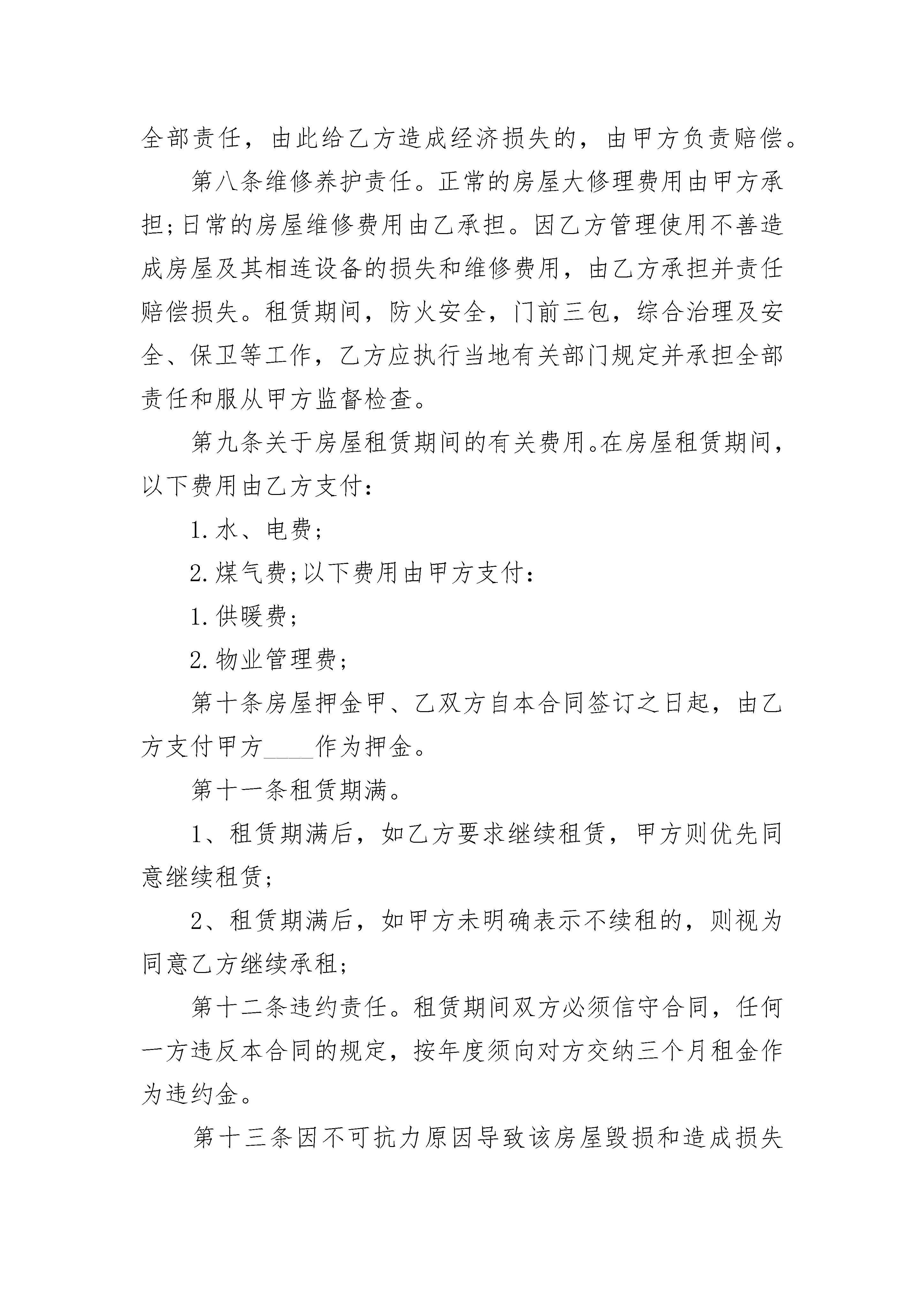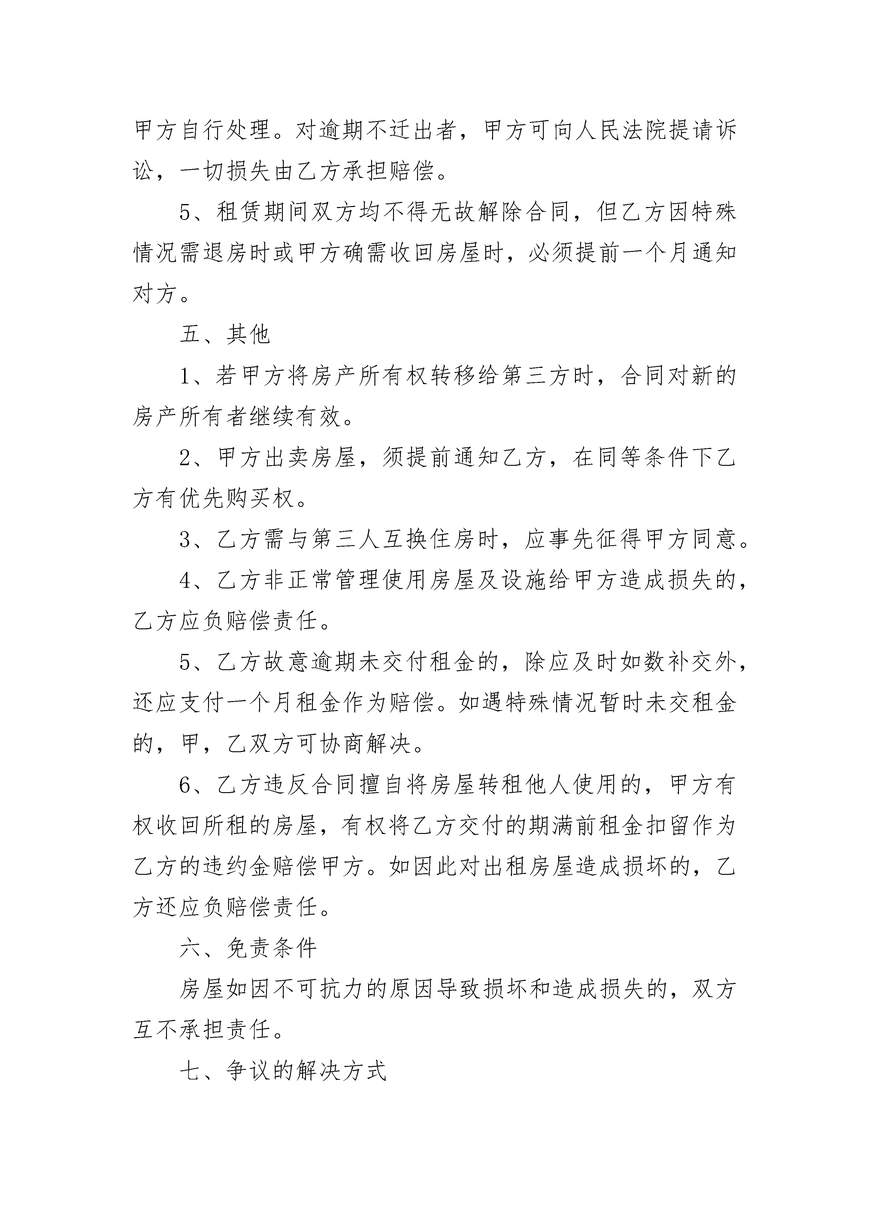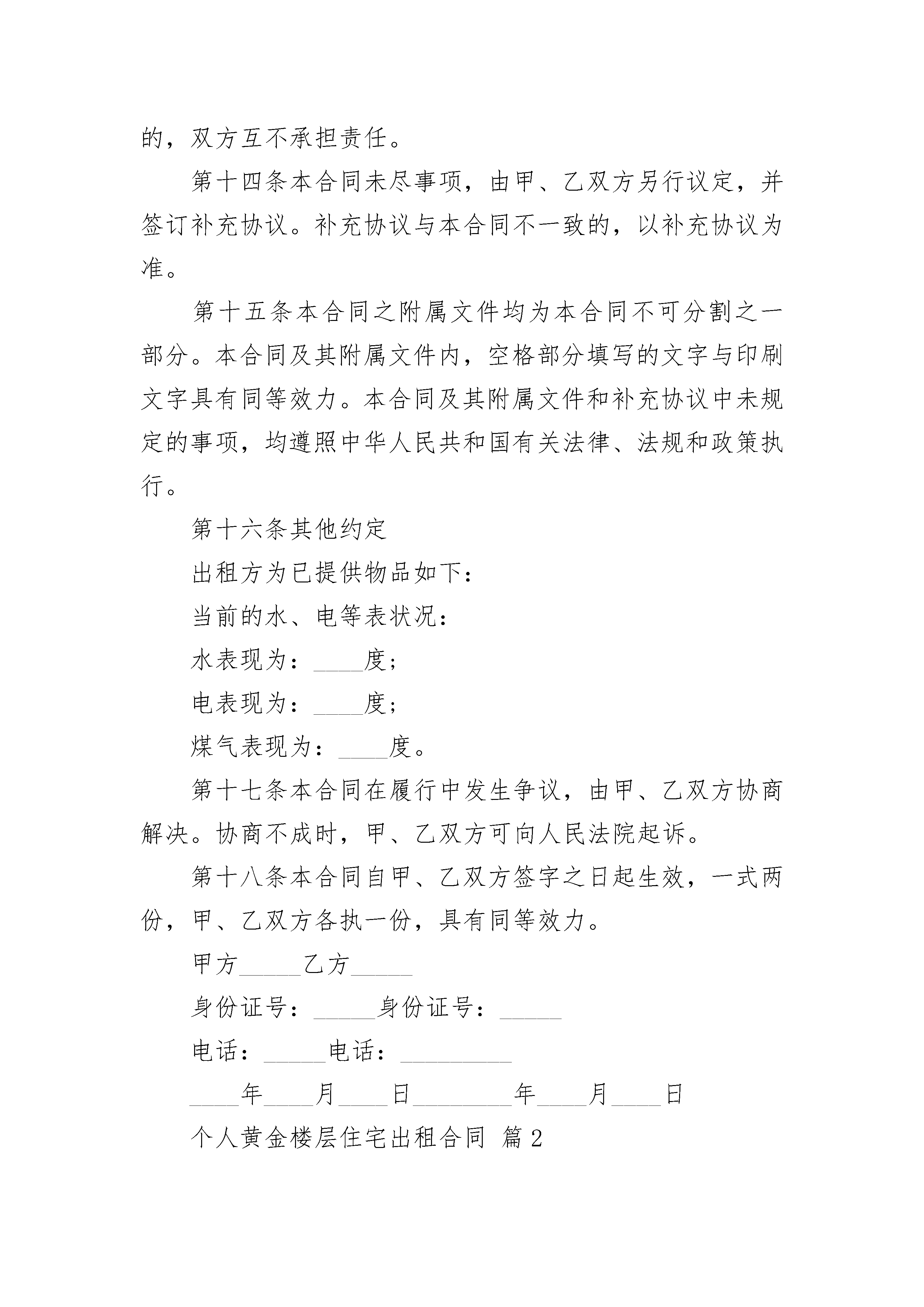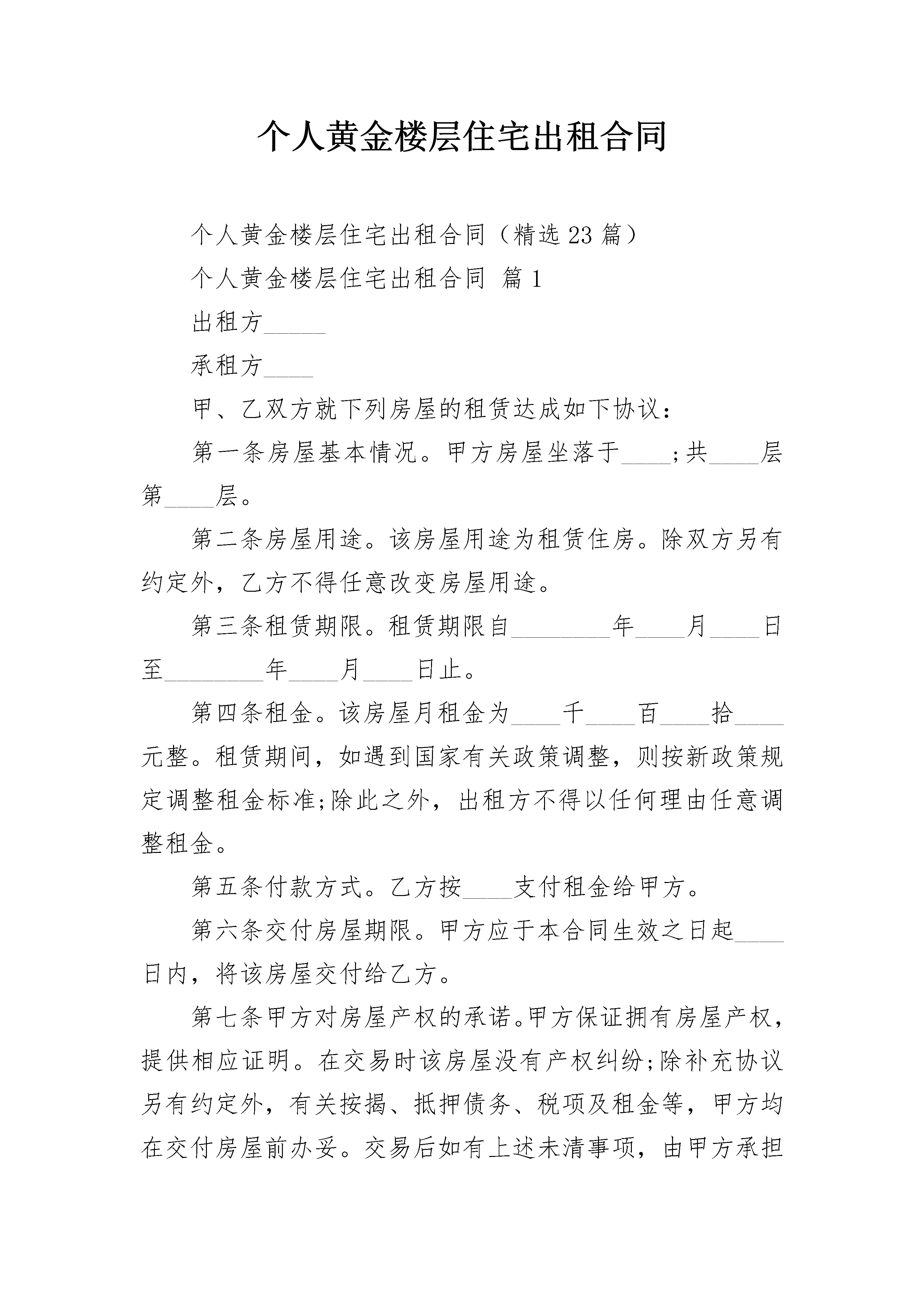 个人黄金楼层住宅出租合同个人黄金楼层住宅出租合同(精选23篇)个人黄金楼层住宅出租合同篇1出租方_____承租方____甲、乙双方就下列房屋的租赁达成如下协议:第一条房屋基本情况。甲方房屋坐落于____;共____层第____层。第二条房屋用途。该房屋用途为租赁住房。除双方另有约定外,乙方不得任意改变房屋用途。第三条租赁期限。租赁期限自________年____月____日至________年____月____日止。第四条租金。该房屋月租金为____千____百____拾____元整。租赁期间,如遇到国家有关政策调整,则按新政策规定调整租金标准;除此之外,出租方不得以任何理由任意调整租金。第五条付款方式。乙方按____支付租金给甲方。第六条交付房屋期限。甲方应于本合同生效之日起____日内,将该房屋交付给乙方。第七条甲方对房屋产权的承诺。甲方保证拥有房屋产权,提供相应证明。在交易时该房屋没有产权纠纷;除补充协议另有约定外,有关按揭、抵押债务、税项及租金等,甲方均在交付房屋前办妥。交易后如有上述未清事项,由甲方承担全部责任,由此给乙方造成经济损失的,由甲方负责赔偿。第八条维修养护责任。正常的房屋大修理费用由甲方承担;日常的房屋维修费用由乙承担。因乙方管理使用不善造成房屋及其相连设备的损失和维修费用,由乙方承担并责任赔偿损失。租赁期间,防火安全,门前三包,综合治理及安全、保卫等工作,乙方应执行当地有关部门规定并承担全部责任和服从甲方监督检查。第九条关于房屋租赁期间的有关费用。在房屋租赁期间,以下费用由乙方支付:1.水、电费;2.煤气费;以下费用由甲方支付:1.供暖费;2.物业管理费;第十条房屋押金甲、乙双方自本合同签订之日起,由乙方支付甲方____作为押金。第十一条租赁期满。1、租赁期满后,如乙方要求继续租赁,甲方则优先同意继续租赁;2、租赁期满后,如甲方未明确表示不续租的,则视为同意乙方继续承租;第十二条违约责任。租赁期间双方必须信守合同,任何一方违反本合同的规定,按年度须向对方交纳三个月租金作为违约金。第十三条因不可抗力原因导致该房屋毁损和造成损失的,双方互不承担责任。第十四条本合同未尽事项,由甲、乙双方另行议定,并签订补充协议。补充协议与本合同不一致的,以补充协议为准。第十五条本合同之附属文件均为本合同不可分割之一部分。本合同及其附属文件内,空格部分填写的文字与印刷文字具有同等效力。本合同及其附属文件和补充协议中未规定的事项,均遵照中华人民共和国有关法律、法规和政策执行。第十六条其他约定出租方为已提供物品如下:当前的水、电等表状况:水表现为:____度;电表现为:____度;煤气表现为:____度。第十七条本合同在履行中发生争议,由甲、乙双方协商解决。协商不成时,甲、乙双方可向人民法院起诉。第十八条本合同自甲、乙双方签字之日起生效,一式两份,甲、乙双方各执一份,具有同等效力。甲方_____乙方_____身份证号:_____身份证号:_____电话:_____电话:_____________年____月____日________年____月____日个人黄金楼层住宅出租合同篇2出租方:_____承租方:_____根据《中华人民共和国民法典》规定,为明确甲方与乙方的权利义务关系,经双方协商一致,签订本合同:一、甲方将坐落于____的房子租予乙方作为生活使用。二、租赁期共为_____个月,年限从_____年___月___日至_____年___月___日乙方有下列情形之一的,甲方可以终止合同,收回房屋:1、乙方擅自将房屋转租,转让或转借他人使用的;2、乙方利用承租房屋进行非法活动,损害公共利益的;3、乙方拖欠租金;三、每月租金为人民币_____元,付款方式为____付。押金为人民币________元。四协议事项1、房屋内外水电费、煤气费、上网费自乙方入住之日起至租约期满迁出之日至均由乙方承担。2、甲方应承担所出租房屋的修缮义务,乙方应对修缮工作予以配合。3、乙方不得利用出租房屋进行非法活动或存放危险物品,影响公共安全。4、租赁期满之日,在不续租情况下,乙方应无条件退租,并将房屋设备清点后归还甲方,不得向甲方请求退还租金,移转费及一切权利金。乙方应将自用家具物品搬迁清楚,不得故意留存占据,如逾期不搬视为乙方抛弃其所有权,由甲方自行处理。对逾期不迁出者,甲方可向人民法院提请诉讼,一切损失由乙方承担赔偿。5、租赁期间双方均不得无故解除合同,但乙方因特殊情况需退房时或甲方确需收回房屋时,必须提前一个月通知对方。五、其他1、若甲方将房产所有权转移给第三方时,合同对新的房产所有者继续有效。2、甲方出卖房屋,须提前通知乙方,在同等条件下乙方有优先购买权。3、乙方需与第三人互换住房时,应事先征得甲方同意。4、乙方非正常管理使用房屋及设施给甲方造