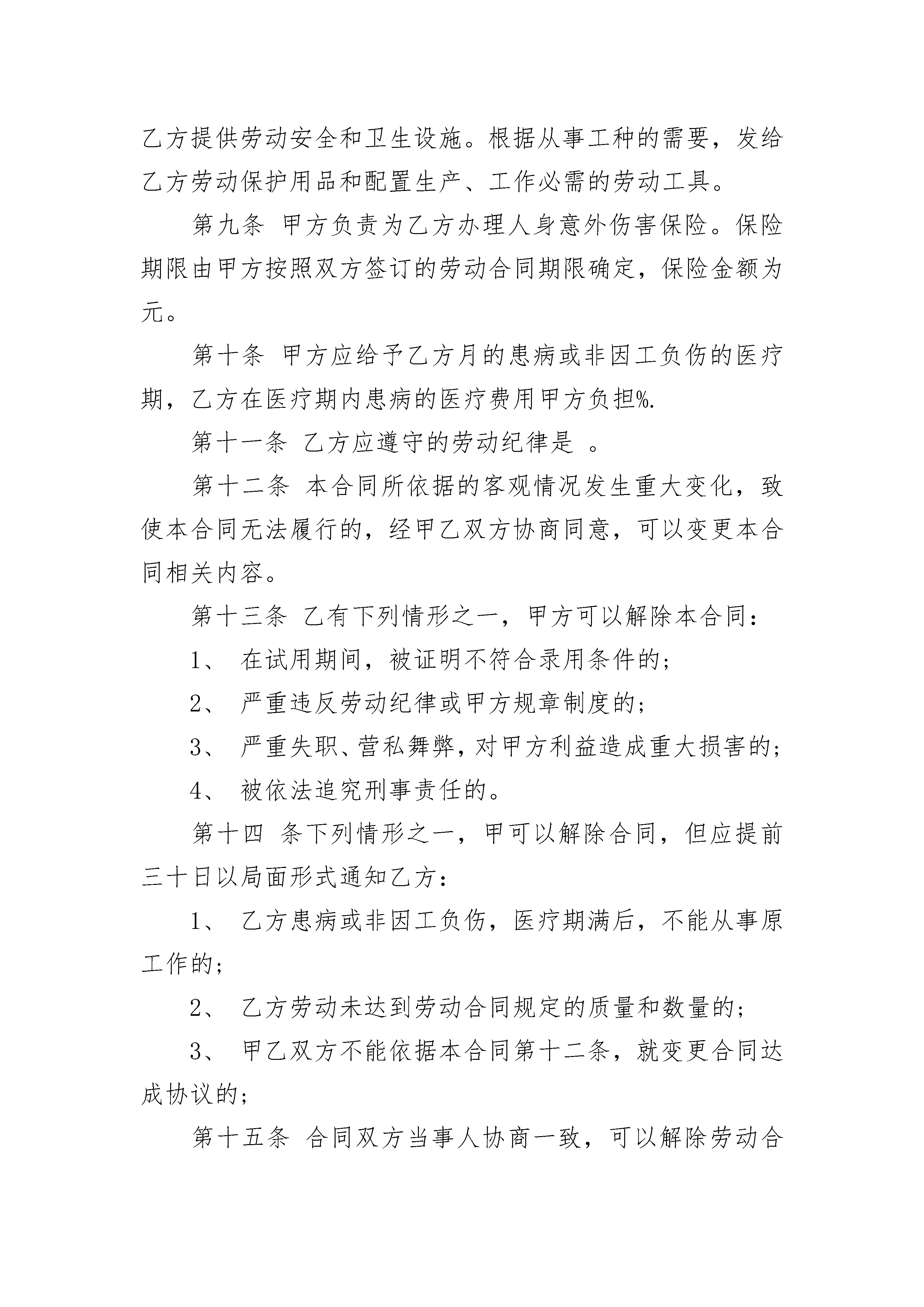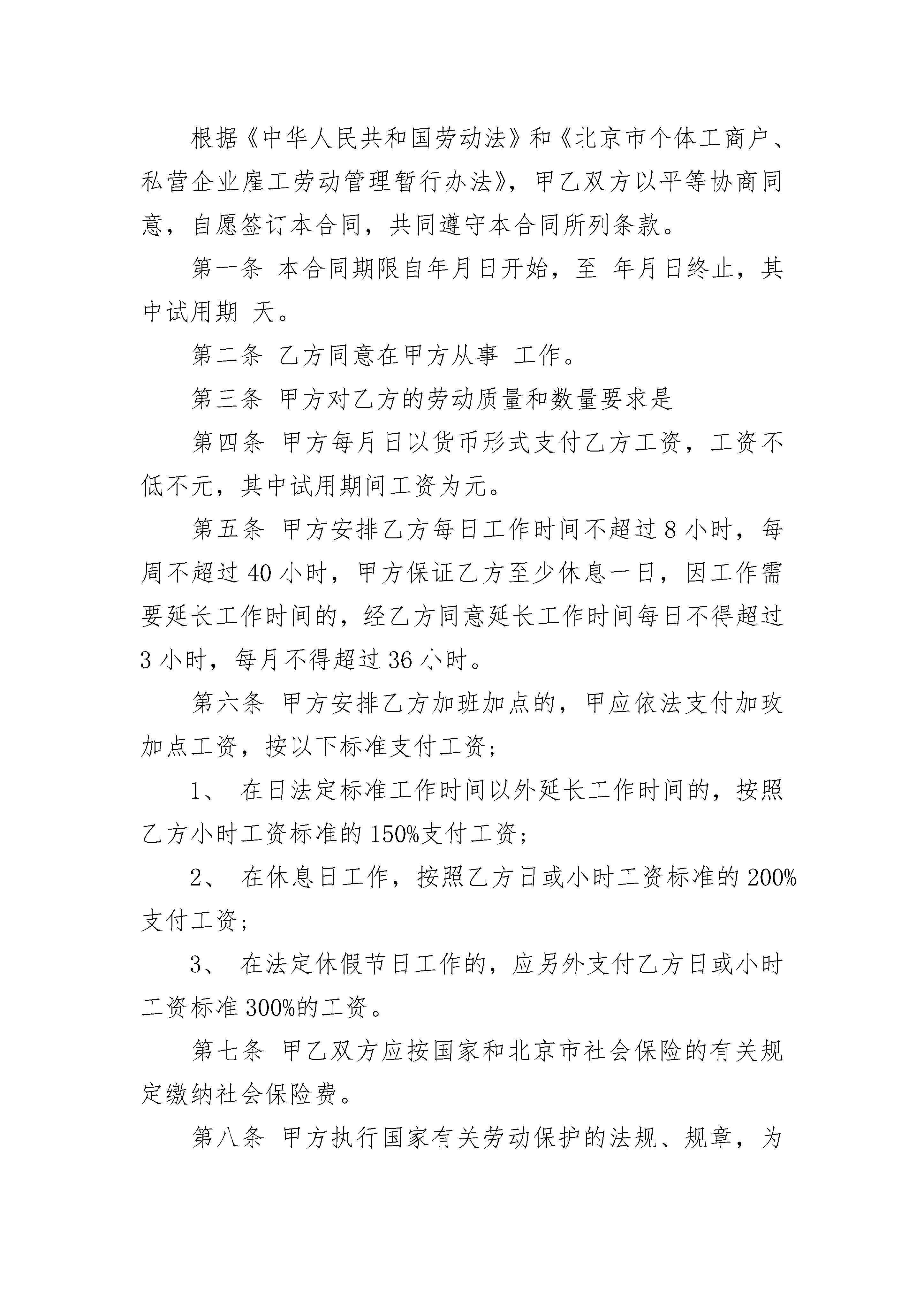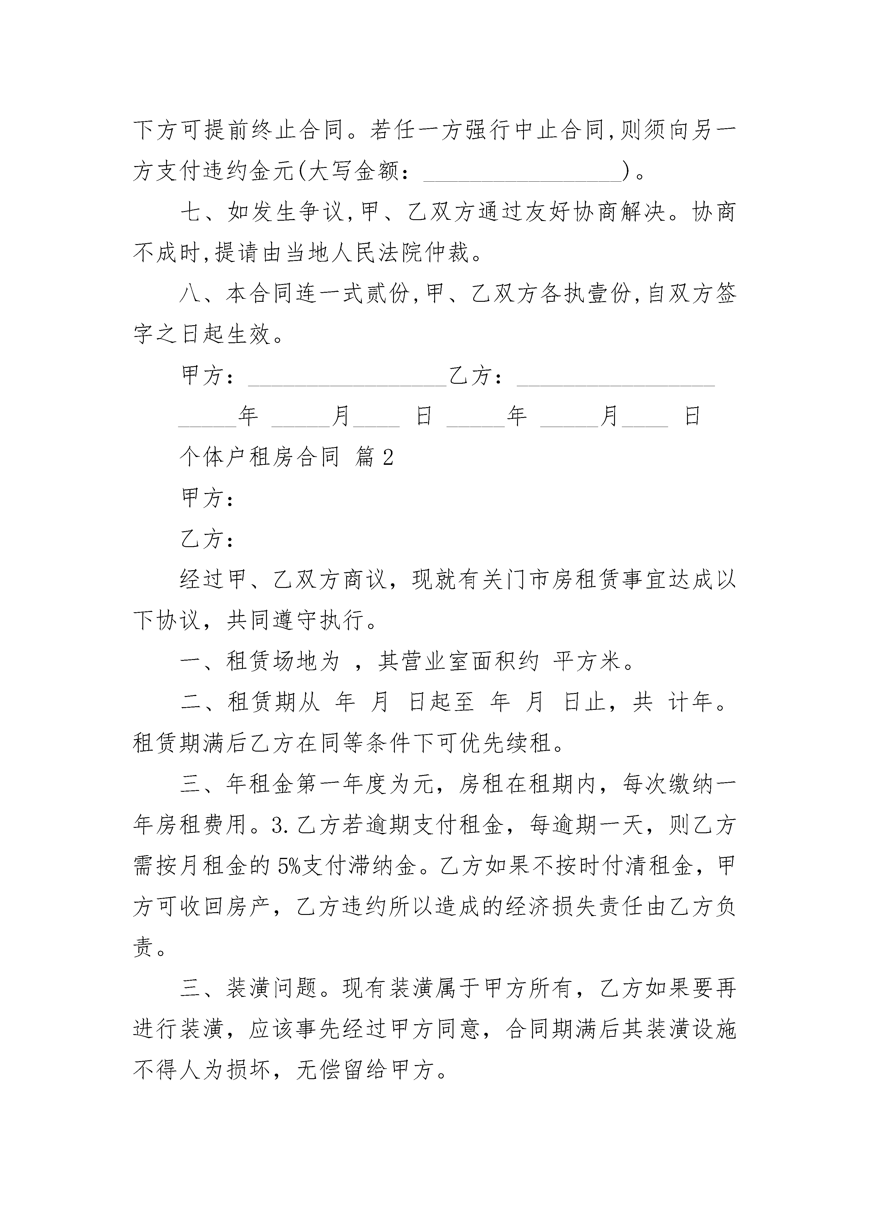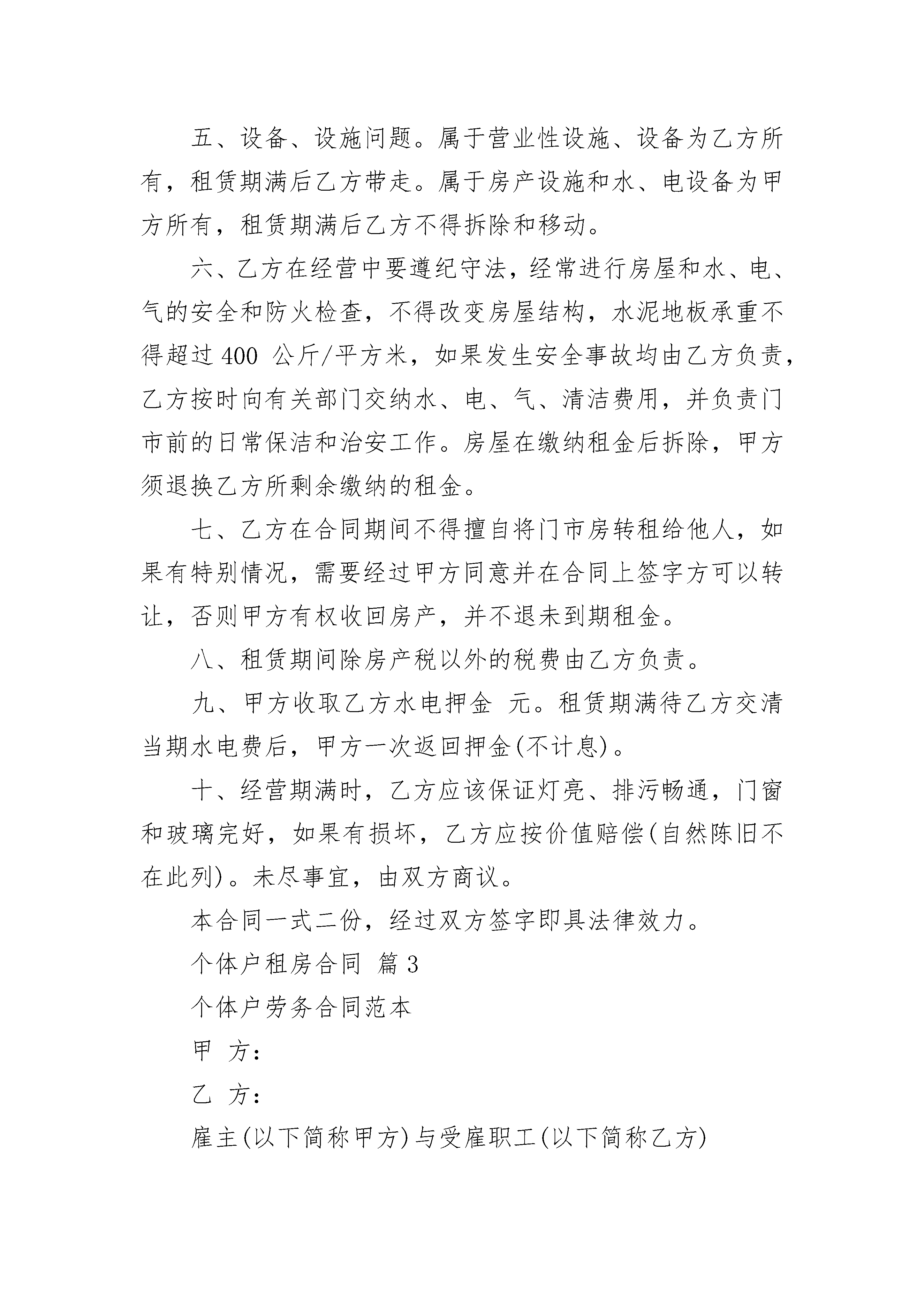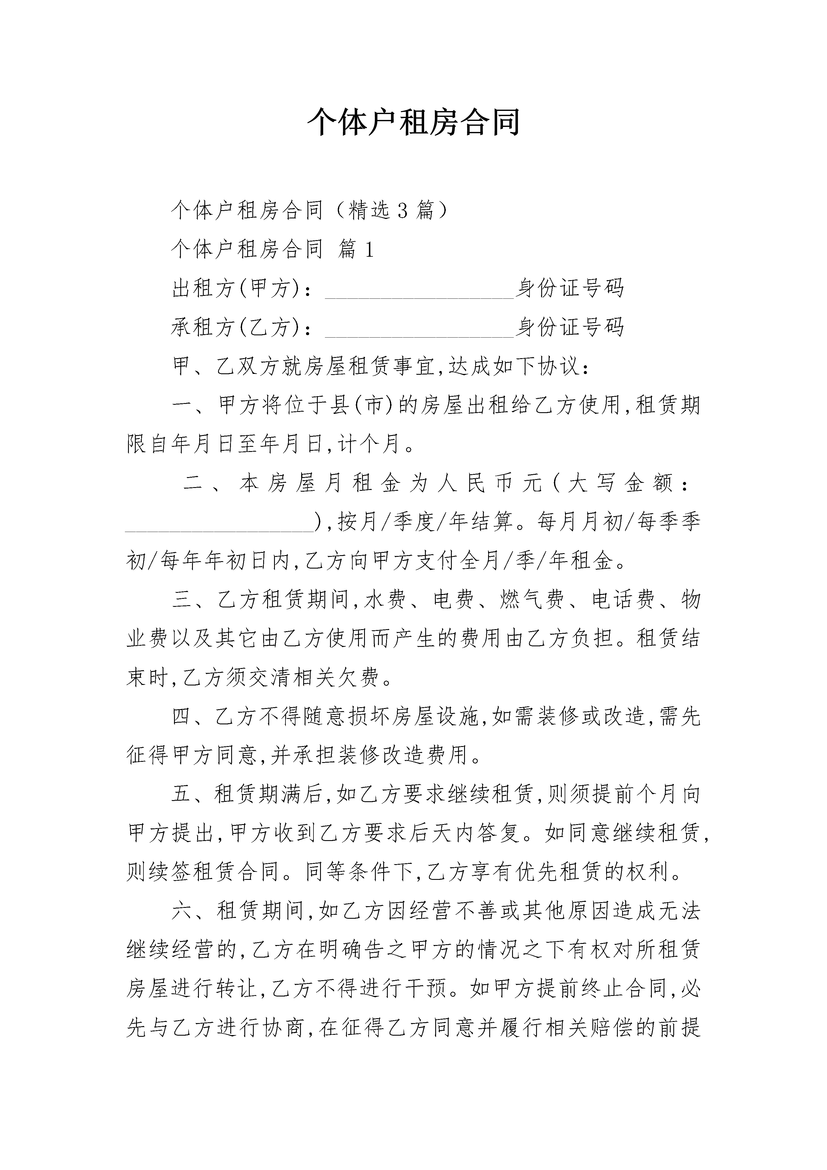 个体户租房合同个体户租房合同(精选3篇)个体户租房合同篇1出租方(甲方):_________________身份证号码承租方(乙方):_________________身份证号码甲、乙双方就房屋租赁事宜,达成如下协议:一、甲方将位于县(市)的房屋出租给乙方使用,租赁期限自年月日至年月日,计个月。二、本房屋月租金为人民币元(大写金额:_________________),按月/季度/年结算。每月月初/每季季初/每年年初日内,乙方向甲方支付全月/季/年租金。三、乙方租赁期间,水费、电费、燃气费、电话费、物业费以及其它由乙方使用而产生的费用由乙方负担。租赁结束时,乙方须交清相关欠费。四、乙方不得随意损坏房屋设施,如需装修或改造,需先征得甲方同意,并承担装修改造费用。五、租赁期满后,如乙方要求继续租赁,则须提前个月向甲方提出,甲方收到乙方要求后天内答复。如同意继续租赁,则续签租赁合同。同等条件下,乙方享有优先租赁的权利。六、租赁期间,如乙方因经营不善或其他原因造成无法继续经营的,乙方在明确告之甲方的情况之下有权对所租赁房屋进行转让,乙方不得进行干预。如甲方提前终止合同,必先与乙方进行协商,在征得乙方同意并履行相关赔偿的前提下方可提前终止合同。若任一方强行中止合同,则须向另一方支付违约金元(大写金额:_________________)。七、如发生争议,甲、乙双方通过友好协商解决。协商不成时,提请由当地人民法院仲裁。八、本合同连一式贰份,甲、乙双方各执壹份,自双方签字之日起生效。甲方:_________________乙方:______________________年_____月____日_____年_____月____日个体户租房合同篇2甲方:乙方:经过甲、乙双方商议,现就有关门市房租赁事宜达成以下协议,共同遵守执行。一、租赁场地为,其营业室面积约平方米。二、租赁期从年月日起至年月日止,共计年。租赁期满后乙方在同等条件下可优先续租。三、年租金第一年度为元,房租在租期内,每次缴纳一年房租费用。3.乙方若逾期支付租金,每逾期一天,则乙方需按月租金的5%支付滞纳金。乙方如果不按时付清租金,甲方可收回房产,乙方违约所以造成的经济损失责任由乙方负责。三、装潢问题。现有装潢属于甲方所有,乙方如果要再进行装潢,应该事先经过甲方同意,合同期满后其装潢设施不得人为损坏,无偿留给甲方。五、设备、设施问题。属于营业性设施、设备为乙方所有,租赁期满后乙方带走。属于房产设施和水、电设备为甲方所有,租赁期满后乙方不得拆除和移动。六、乙方在经营中要遵纪守法,经常进行房屋和水、电、气的安全和防火检查,不得改变房屋结构,水泥地板承重不得超过400公斤/平方米,如果发生安全事故均由乙方负责,乙方按时向有关部门交纳水、电、气、清洁费用,并负责门市前的日常保洁和治安工作。房屋在缴纳租金后拆除,甲方须退换乙方所剩余缴纳的租金。七、乙方在合同期间不得擅自将门市房转租给他人,如果有特别情况,需要经过甲方同意并在合同上签字方可以转让,否则甲方有权收回房产,并不退未到期租金。八、租赁期间除房产税以外的税费由乙方负责。九、甲方收取乙方水电押金元。租赁期满待乙方交清当期水电费后,甲方一次返回押金(不计息)。十、经营期满时,乙方应该保证灯亮、排污畅通,门窗和玻璃完好,如果有损坏,乙方应按价值赔偿(自然陈旧不在此列)。未尽事宜,由双方商议。本合同一式二份,经过双方签字即具法律效力。个体户租房合同篇3个体户劳务合同范本甲方:乙方:雇主(以下简称甲方)与受雇职工(以下简称乙方)根据《中华人民共和国劳动法》和《北京市个体工商户、私营企业雇工劳动管理暂行办法》,甲乙双方以平等协商同意,自愿签订本合同,共同遵守本合同所列条款。第一条本合同期限自年月日开始,至年月日终止,其中试用期天。第二条乙方同意在甲方从事工作。第三条甲方对乙方的劳动质量和数量要求是第四条甲方每月日以货币形式支付乙方工资,工资不低不元,其中试用期间工资为元。第五条甲方安排乙方每日工作时间不超过8小时,每周不超过40小时,甲方保证乙方至少休息一日,因工作需要延长工作时间的,经乙方同意延长工作时间每日不得超过3小时,每月不得超过36小时。第六条甲方安排乙方加班加点的,甲应依法支付加玫加点工资,按以下标准支付工资;1、在日法定标准工作时间以外延长工作时间的,按照乙方小时工资标准的150%支付工资;2、在休息日工作,按照乙方日或小时工资标准的200%支付工资;3、在法定休假节日工作的,应另外支付乙方日或小时工资标准300%的工资。第七条甲乙双方应按国家和北京市社会保险的有关规定缴纳社会保险费。第八条甲方执行国家有关劳动保护的法规、规章,为乙方提供劳动安全和卫生设施。根据从事工种的需要,发给乙方劳动保护用品和配置生产、工作必需的劳动工具。