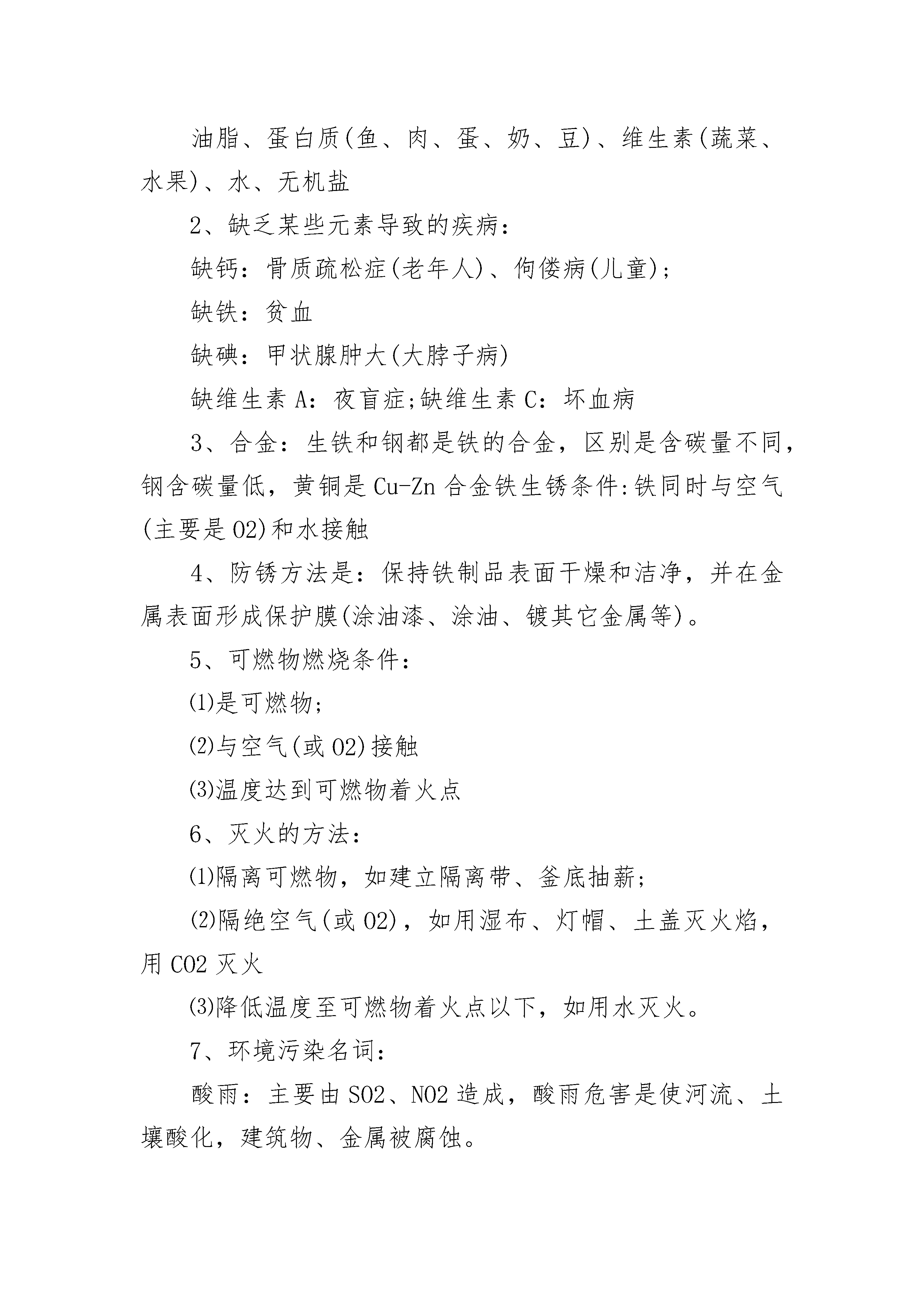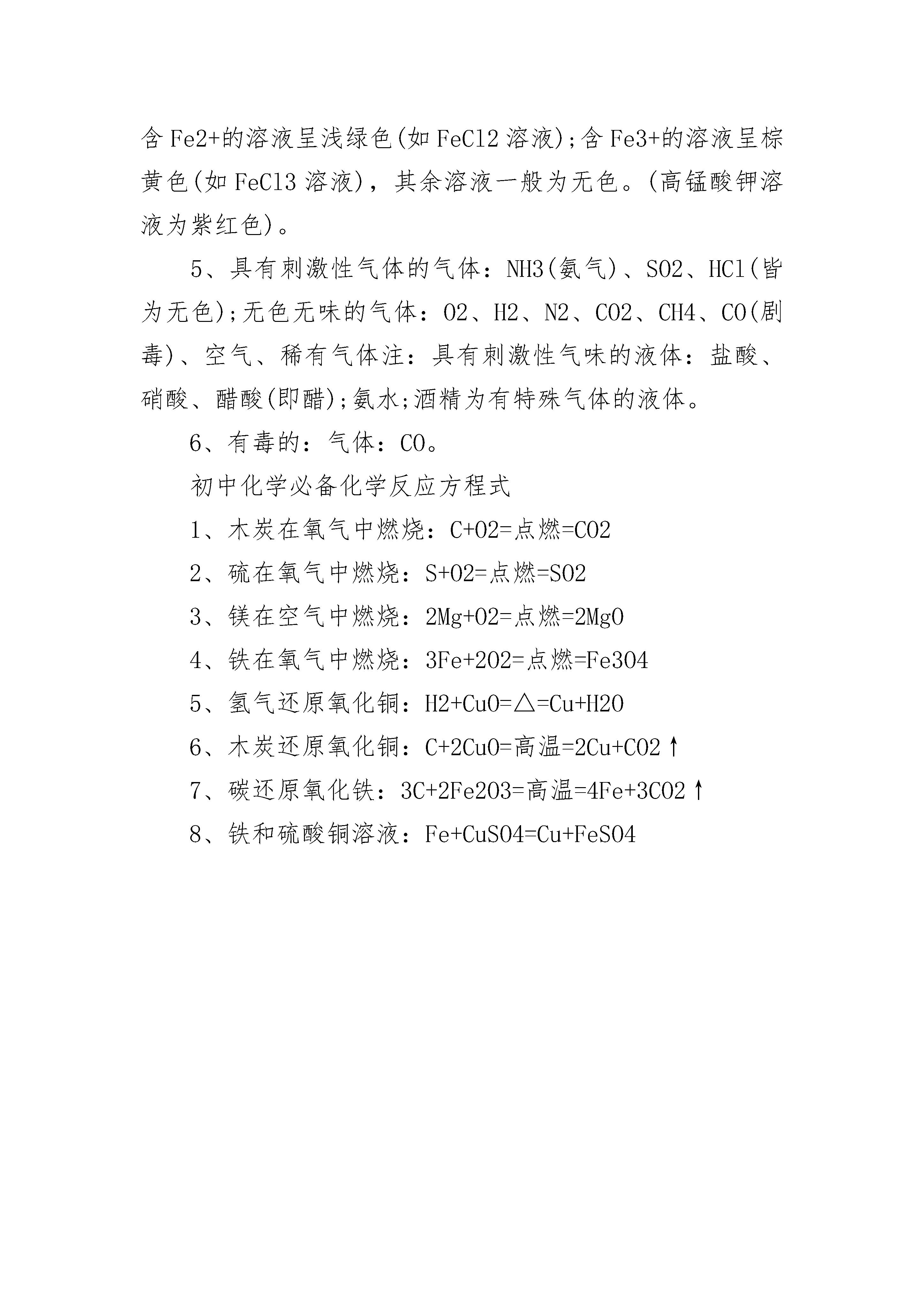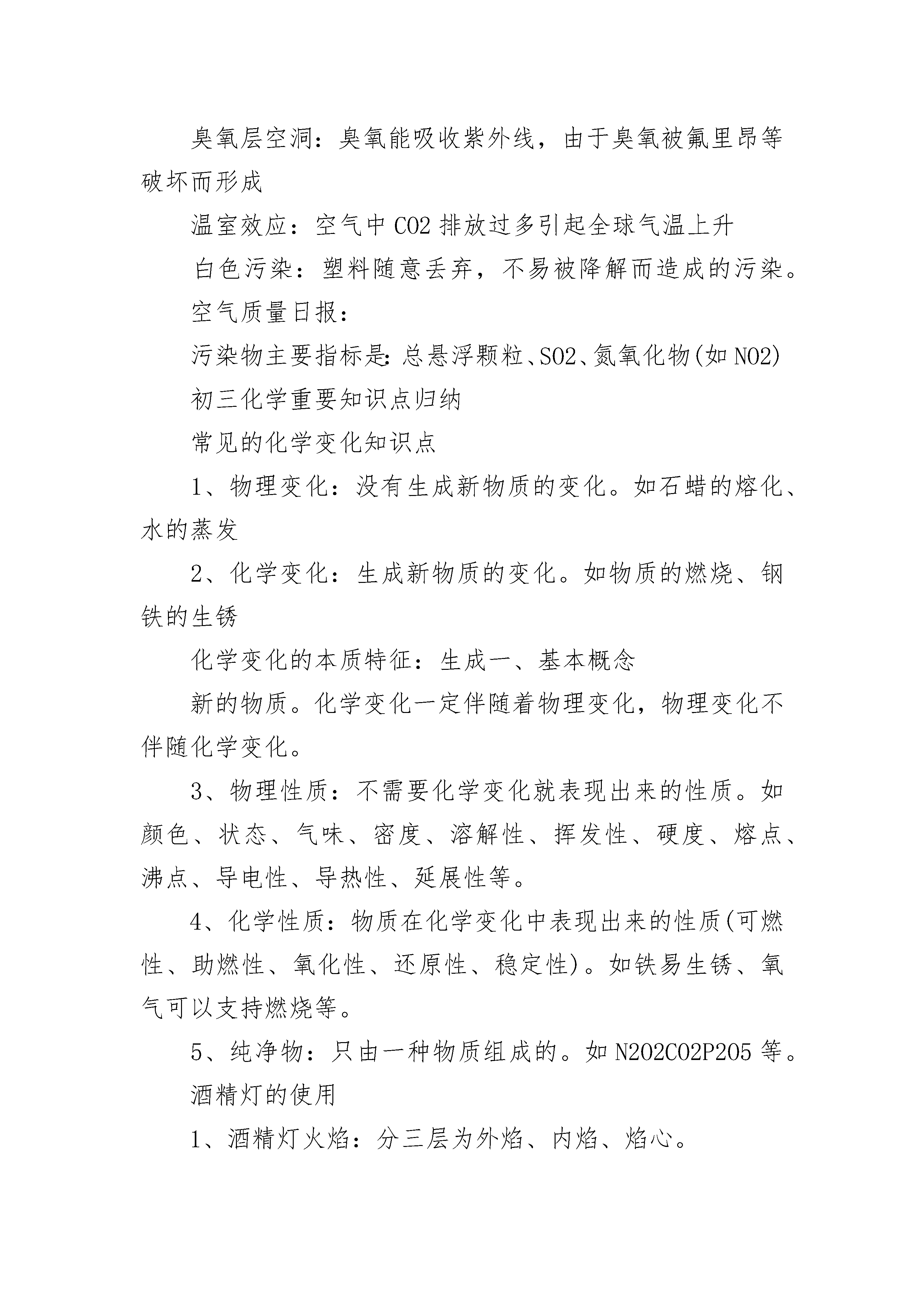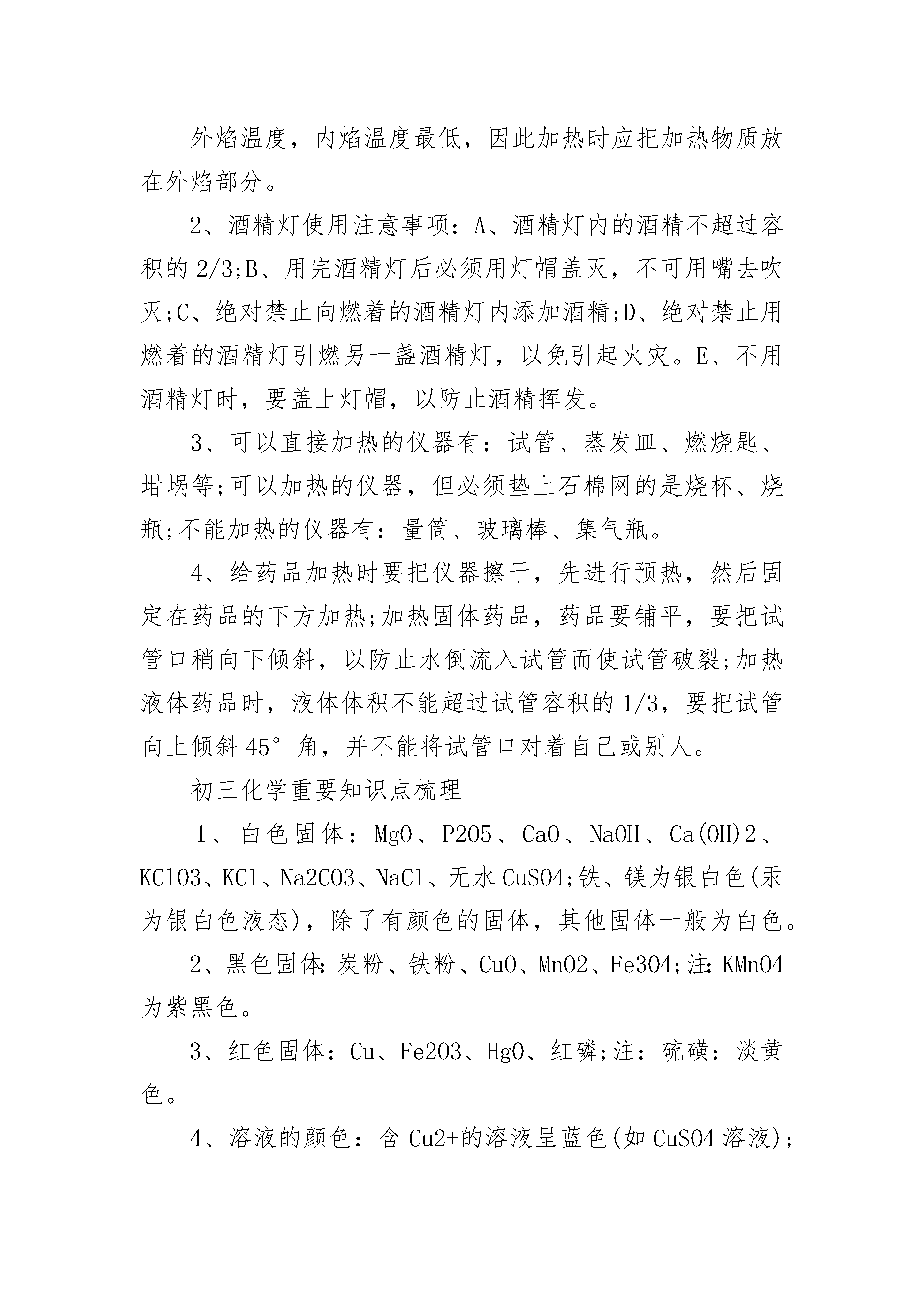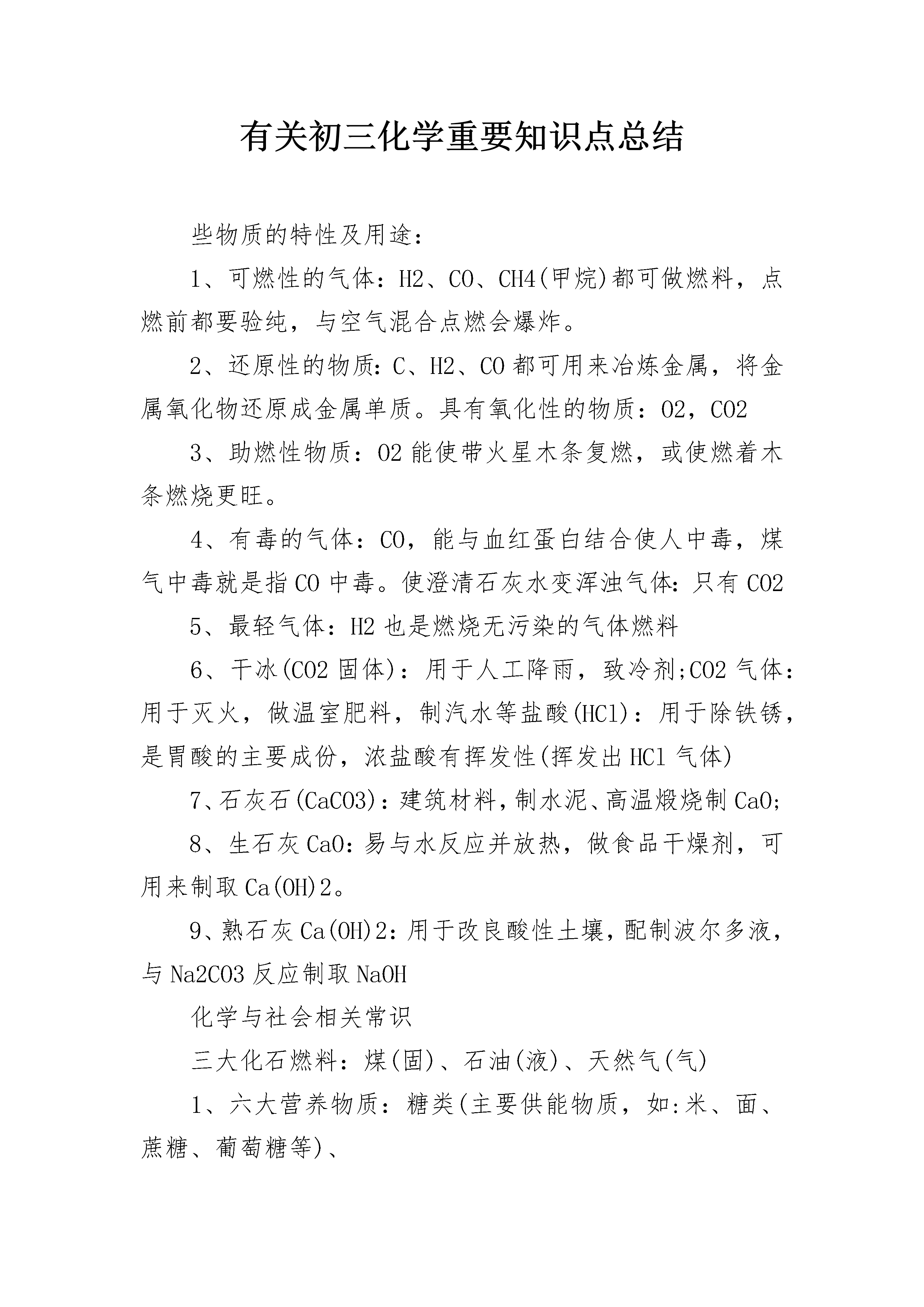 有关初三化学重要知识点总结些物质的特性及用途:1、可燃性的气体:H2、CO、CH4(甲烷)都可做燃料,点燃前都要验纯,与空气混合点燃会爆炸。2、还原性的物质:C、H2、CO都可用来冶炼金属,将金属氧化物还原成金属单质。具有氧化性的物质:O2,CO23、助燃性物质:O2能使带火星木条复燃,或使燃着木条燃烧更旺。4、有毒的气体:CO,能与血红蛋白结合使人中毒,煤气中毒就是指CO中毒。使澄清石灰水变浑浊气体:只有CO25、最轻气体:H2也是燃烧无污染的气体燃料6、干冰(CO2固体):用于人工降雨,致冷剂;CO2气体:用于灭火,做温室肥料,制汽水等盐酸(HCl):用于除铁锈,是胃酸的主要成份,浓盐酸有挥发性(挥发出HCl气体)7、石灰石(CaCO3):建筑材料,制水泥、高温煅烧制CaO;8、生石灰CaO:易与水反应并放热,做食品干燥剂,可用来制取Ca(OH)2。9、熟石灰Ca(OH)2:用于改良酸性土壤,配制波尔多液,与Na2CO3反应制取NaOH化学与社会相关常识三大化石燃料:煤(固)、石油(液)、天然气(气)1、六大营养物质:糖类(主要供能物质,如:米、面、蔗糖、葡萄糖等)、油脂、蛋白质(鱼、肉、蛋、奶、豆)、维生素(蔬菜、水果)、水、无机盐2、缺乏某些元素导致的疾病:缺钙:骨质疏松症(老年人)、佝偻病(儿童);缺铁:贫血缺碘:甲状腺肿大(大脖子病)缺维生素A:夜盲症;缺维生素C:坏血病3、合金:生铁和钢都是铁的合金,区别是含碳量不同,钢含碳量低,黄铜是Cu-Zn合金铁生锈条件:铁同时与空气(主要是O2)和水接触4、防锈方法是:保持铁制品表面干燥和洁净,并在金属表面形成保护膜(涂油漆、涂油、镀其它金属等)。5、可燃物燃烧条件:⑴是可燃物;⑵与空气(或O2)接触⑶温度达到可燃物着火点6、灭火的方法:⑴隔离可燃物,如建立隔离带、釜底抽薪;⑵隔绝空气(或O2),如用湿布、灯帽、土盖灭火焰,用CO2灭火⑶降低温度至可燃物着火点以下,如用水灭火。7、环境污染名词:酸雨:主要由SO2、NO2造成,酸雨危害是使河流、土壤酸化,建筑物、金属被腐蚀。臭氧层空洞:臭氧能吸收紫外线,由于臭氧被氟里昂等破坏而形成温室效应:空气中CO2排放过多引起全球气温上升白色污染:塑料随意丢弃,不易被降解而造成的污染。空气质量日报:污染物主要指标是:总悬浮颗粒、SO2、氮氧化物(如NO2)初三化学重要知识点归纳常见的化学变化知识点1、物理变化:没有生成新物质的变化。如石蜡的熔化、水的蒸发2、化学变化:生成新物质的变化。如物质的燃烧、钢铁的生锈化学变化的本质特征:生成一、基本概念新的物质。化学变化一定伴随着物理变化,物理变化不伴随化学变化。3、物理性质:不需要化学变化就表现出来的性质。如颜色、状态、气味、密度、溶解性、挥发性、硬度、熔点、沸点、导电性、导热性、延展性等。4、化学性质:物质在化学变化中表现出来的性质(可燃性、助燃性、氧化性、还原性、稳定性)。如铁易生锈、氧气可以支持燃烧等。5、纯净物:只由一种物质组成的。如N2O2CO2P2O5等。酒精灯的使用1、酒精灯火焰:分三层为外焰、内焰、焰心。外焰温度,内焰温度最低,因此加热时应把加热物质放在外焰部分。2、酒精灯使用注意事项:A、酒精灯内的酒精不超过容积的2/3;B、用完酒精灯后必须用灯帽盖灭,不可用嘴去吹灭;C、绝对禁止向燃着的酒精灯内添加酒精;D、绝对禁止用燃着的酒精灯引燃另一盏酒精灯,以免引起火灾。E、不用酒精灯时,要盖上灯帽,以防止酒精挥发。3、可以直接加热的仪器有:试管、蒸发皿、燃烧匙、坩埚等;可以加热的仪器,但必须垫上石棉网的是烧杯、烧瓶;不能加热的仪器有:量筒、玻璃棒、集气瓶。4、给药品加热时要把仪器擦干,先进行预热,然后固定在药品的下方加热;加热固体药品,药品要铺平,要把试管口稍向下倾斜,以防止水倒流入试管而使试管破裂;加热液体药品时,液体体积不能超过试管容积的1/3,要把试管向上倾斜45°角,并不能将试管口对着自己或别人。初三化学重要知识点梳理1、白色固体:MgO、P2O5、CaO、NaOH、Ca(OH)2、KClO3、KCl、Na2CO3、NaCl、无水CuSO4;铁、镁为银白色(汞为银白色液态),除了有颜色的固体,其他固体一般为白色。2、黑色固体:炭粉、铁粉、CuO、MnO2、Fe3O4;注:KMnO4为紫黑色。3、红色固体:Cu、Fe2O3、HgO、红磷;注:硫磺:淡黄色。4、溶液的颜色:含Cu2+的溶液呈蓝色(如CuSO4溶液);含Fe2+的溶液呈浅绿色(如FeCl2溶液);含Fe3+的溶液呈棕黄色(如FeCl3溶液),其余溶液一般为无色。(高锰酸钾溶液为紫红色)。5、具有刺激性气体的气体:NH3(氨气)、SO2、HCl(皆为无色);无色无味的气体:O2、H2、N2、CO2、CH4、C