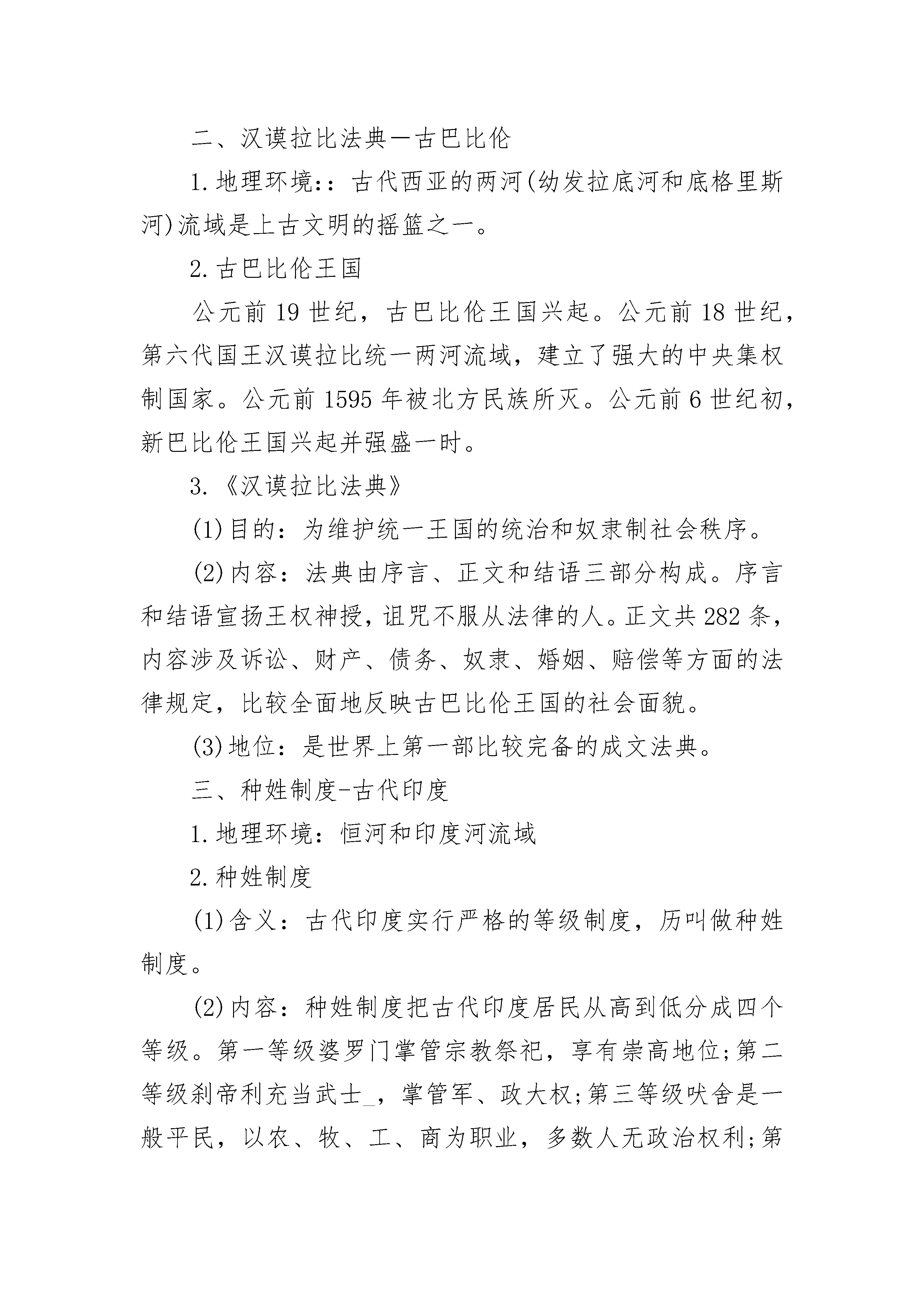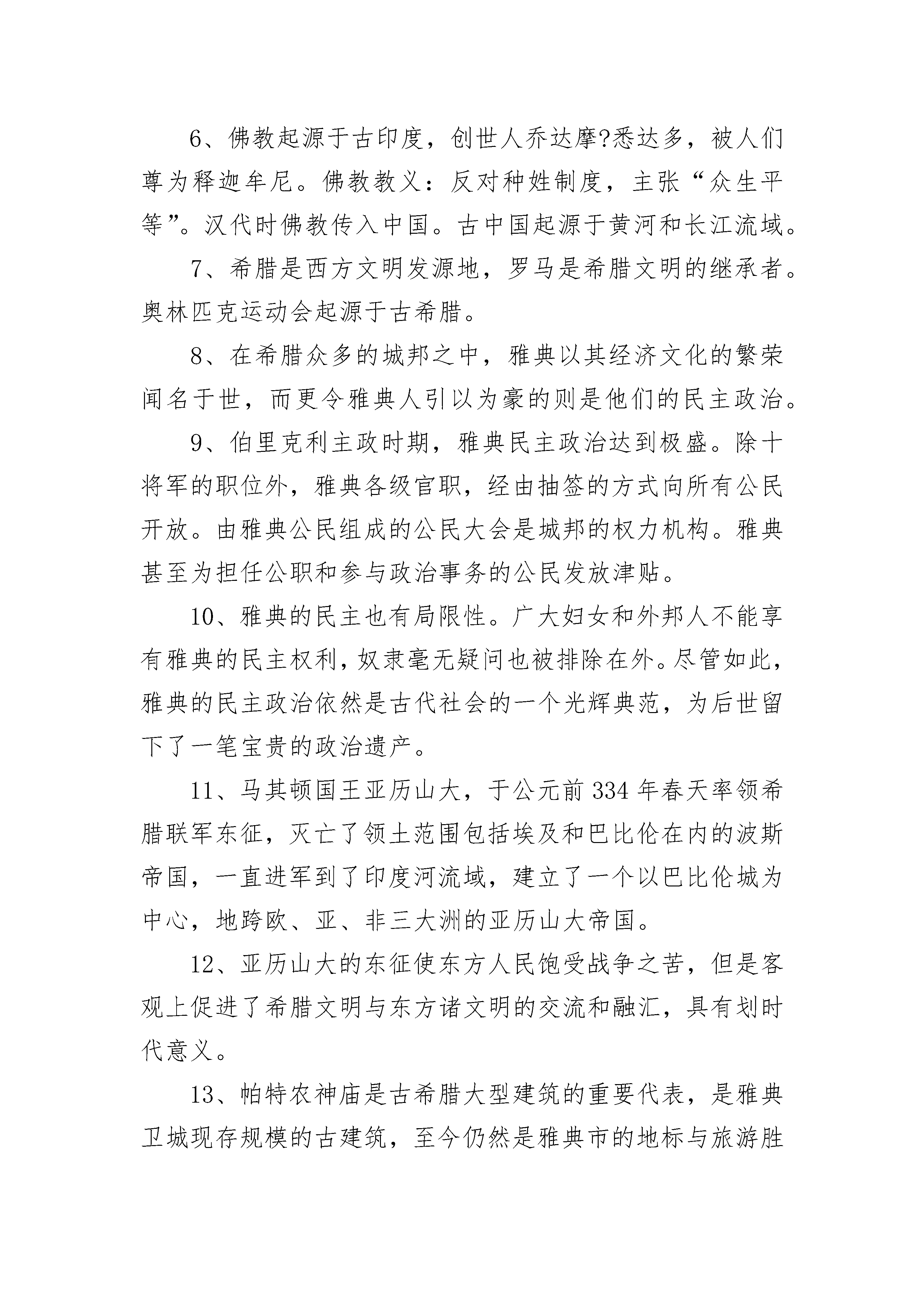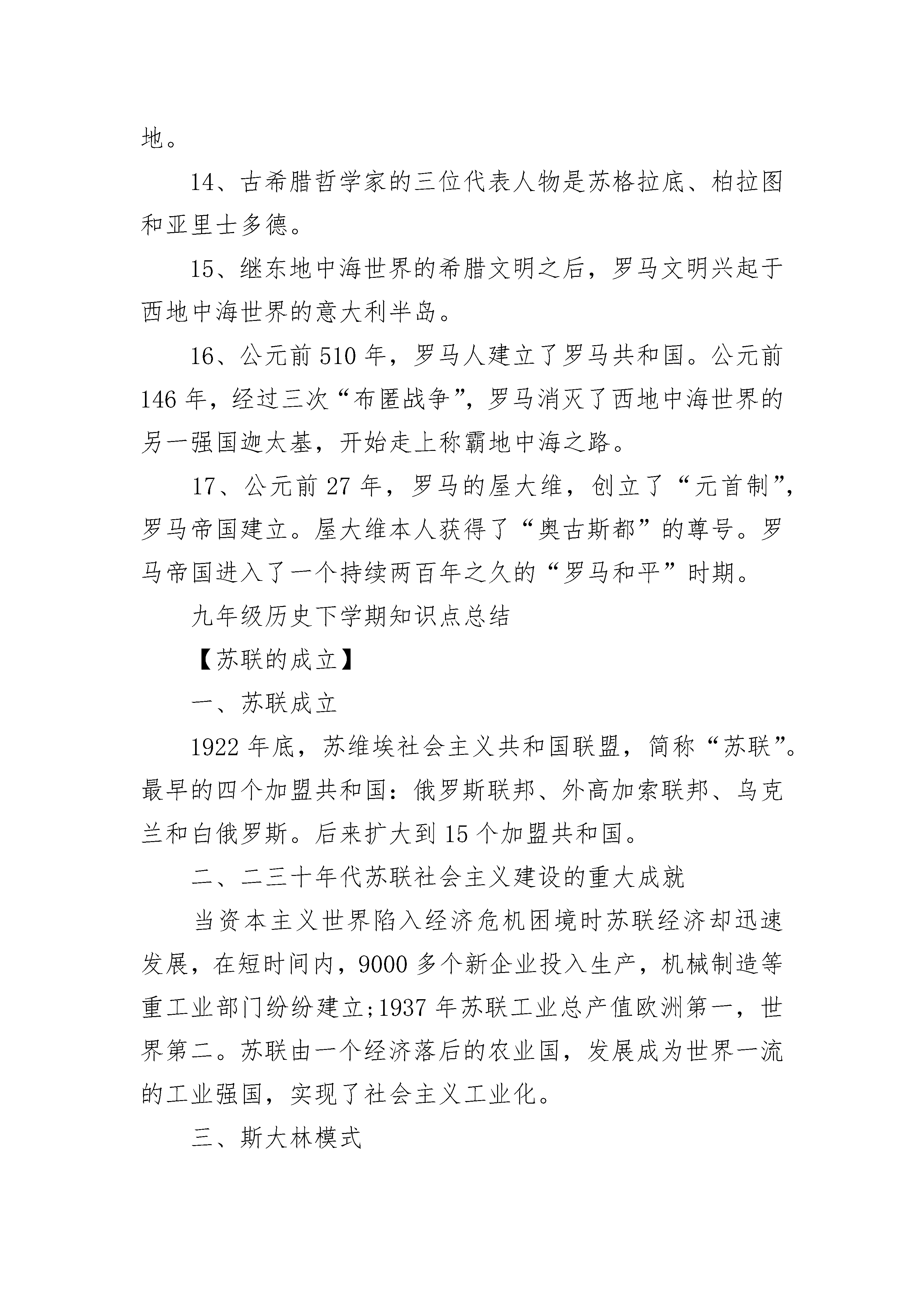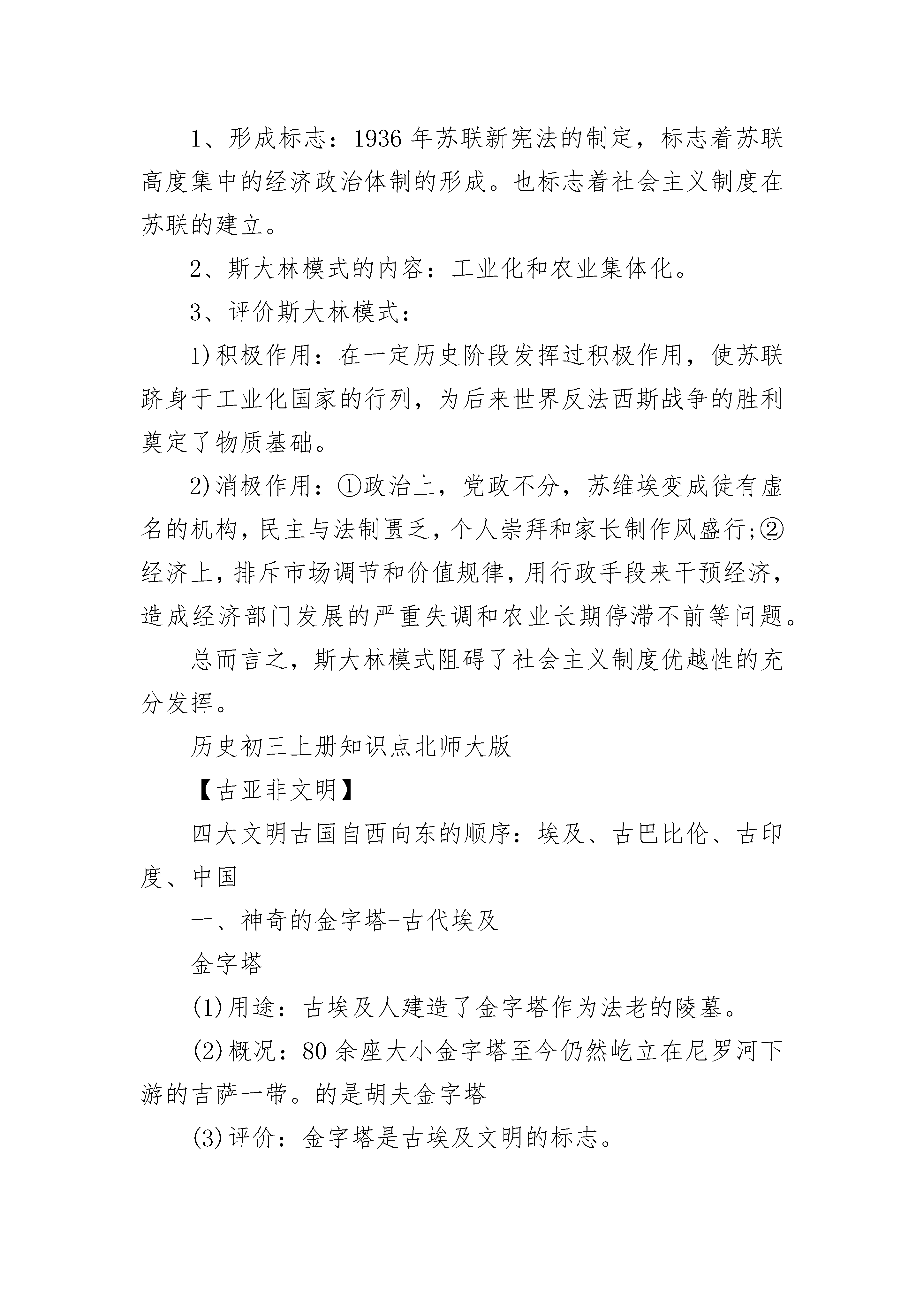 九年级历史单元知识点20221、公元前4300年,位于西亚幼发拉底河和底格里斯河流域南部的苏美尔文明是世界最早产生的文明之一;公元前3000年左右,苏美尔人创造了楔形文字。2、公元前1894年,阿摩利人建立古巴比伦王国。第六代国王汉谟拉比颁布世界上第一部体系完备的成文法典——《汉谟拉比法典》,法典由前言、正文和结语三部分组成,法典旨在维护奴隶制的等级制度。3、古埃及兴起于尼罗河流域,公元前3100年,埃及形成统一的国家,国家的统治者是法老;金字塔是法老的坟墓,因形似汉字“金”字而得名;的金字塔是胡夫金字塔,在它不远处矗立着狮身人面雕像斯芬克斯。金字塔体现了埃及人高超的建筑艺术和卓越的聪明才智,象征着古代埃及的高度文明。4、古印度文明起源于印度河和恒河流域,印度河流域的早期文明大约存在于公元前2300-前1750年,典型代表是公元前2300年出现的哈拉帕文化。5、公元前2000-前1600年,雅利安人建立了新的国家,并确立的森严的等级制度,史称种姓制度。种姓制度第一等级是婆罗门,即僧侣贵族;第二等级刹帝利,即武士,掌握军政大权;第三等级是吠舍,从事农业、牧业和商业;第四等级是首陀罗,多为非雅利安人。种姓制度阻碍了社会不同等级间的自由流动,严重束缚印度社会发展的活力。6、佛教起源于古印度,创世人乔达摩?悉达多,被人们尊为释迦牟尼。佛教教义:反对种姓制度,主张“众生平等”。汉代时佛教传入中国。古中国起源于黄河和长江流域。7、希腊是西方文明发源地,罗马是希腊文明的继承者。奥林匹克运动会起源于古希腊。8、在希腊众多的城邦之中,雅典以其经济文化的繁荣闻名于世,而更令雅典人引以为豪的则是他们的民主政治。9、伯里克利主政时期,雅典民主政治达到极盛。除十将军的职位外,雅典各级官职,经由抽签的方式向所有公民开放。由雅典公民组成的公民大会是城邦的权力机构。雅典甚至为担任公职和参与政治事务的公民发放津贴。10、雅典的民主也有局限性。广大妇女和外邦人不能享有雅典的民主权利,奴隶毫无疑问也被排除在外。尽管如此,雅典的民主政治依然是古代社会的一个光辉典范,为后世留下了一笔宝贵的政治遗产。11、马其顿国王亚历山大,于公元前334年春天率领希腊联军东征,灭亡了领土范围包括埃及和巴比伦在内的波斯帝国,一直进军到了印度河流域,建立了一个以巴比伦城为中心,地跨欧、亚、非三大洲的亚历山大帝国。12、亚历山大的东征使东方人民饱受战争之苦,但是客观上促进了希腊文明与东方诸文明的交流和融汇,具有划时代意义。13、帕特农神庙是古希腊大型建筑的重要代表,是雅典卫城现存规模的古建筑,至今仍然是雅典市的地标与旅游胜地。14、古希腊哲学家的三位代表人物是苏格拉底、柏拉图和亚里士多德。15、继东地中海世界的希腊文明之后,罗马文明兴起于西地中海世界的意大利半岛。16、公元前510年,罗马人建立了罗马共和国。公元前146年,经过三次“布匿战争”,罗马消灭了西地中海世界的另一强国迦太基,开始走上称霸地中海之路。17、公元前27年,罗马的屋大维,创立了“元首制”,罗马帝国建立。屋大维本人获得了“奥古斯都”的尊号。罗马帝国进入了一个持续两百年之久的“罗马和平”时期。九年级历史下学期知识点总结【苏联的成立】一、苏联成立1922年底,苏维埃社会主义共和国联盟,简称“苏联”。最早的四个加盟共和国:俄罗斯联邦、外高加索联邦、乌克兰和白俄罗斯。后来扩大到15个加盟共和国。二、二三十年代苏联社会主义建设的重大成就当资本主义世界陷入经济危机困境时苏联经济却迅速发展,在短时间内,9000多个新企业投入生产,机械制造等重工业部门纷纷建立;1937年苏联工业总产值欧洲第一,世界第二。苏联由一个经济落后的农业国,发展成为世界一流的工业强国,实现了社会主义工业化。三、斯大林模式1、形成标志:1936年苏联新宪法的制定,标志着苏联高度集中的经济政治体制的形成。也标志着社会主义制度在苏联的建立。2、斯大林模式的内容:工业化和农业集体化。3、评价斯大林模式:1)积极作用:在一定历史阶段发挥过积极作用,使苏联跻身于工业化国家的行列,为后来世界反法西斯战争的胜利奠定了物质基础。2)消极作用:①政治上,党政不分,苏维埃变成徒有虚名的机构,民主与法制匮乏,个人崇拜和家长制作风盛行;②经济上,排斥市场调节和价值规律,用行政手段来干预经济,造成经济部门发展的严重失调和农业长期停滞不前等问题。总而言之,斯大林模式阻碍了社会主义制度优越性的充分发挥。历史初三上册知识点北师大版【古亚非文明】四大文明古国自西向东的顺序:埃及、古巴比伦、古印度、中国一、神奇的金字塔-古代埃及金字塔(1)用途:古埃及人建造了金字塔作为法老的陵墓。(2)概况:80余座大小金字塔至今仍然屹立在尼罗河下游的吉萨一带。的是胡夫金字塔(3)评价:金字塔是古埃及文明的标志