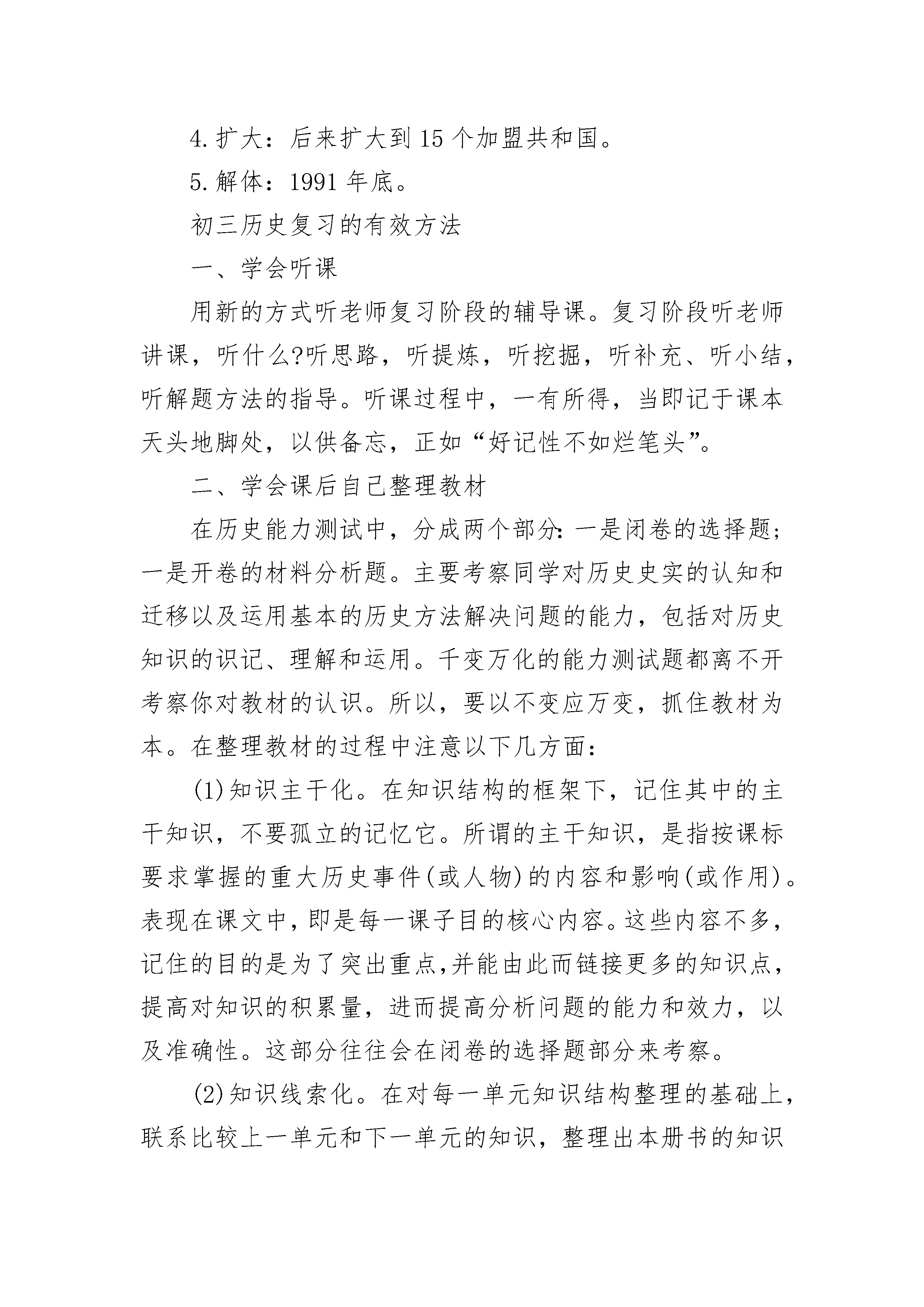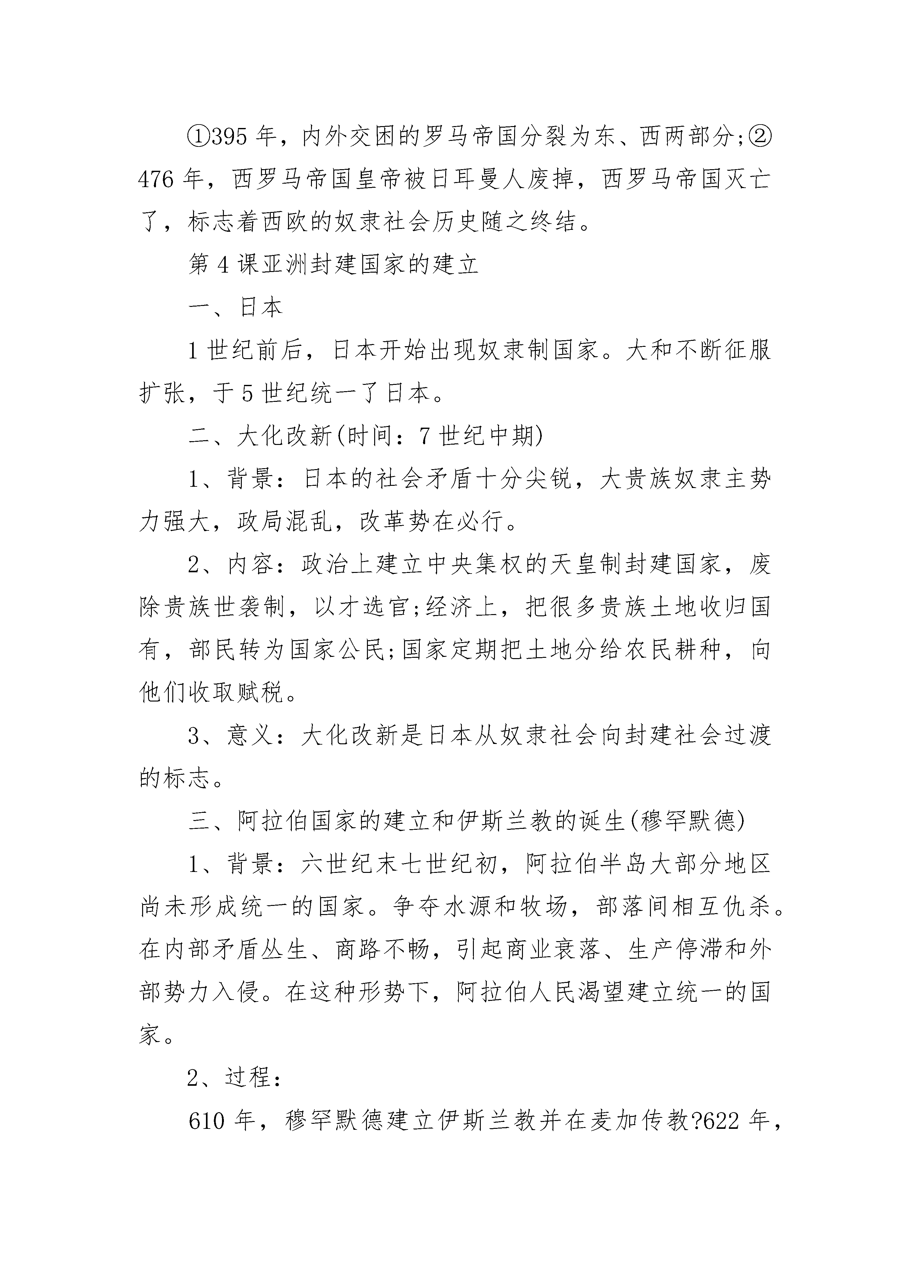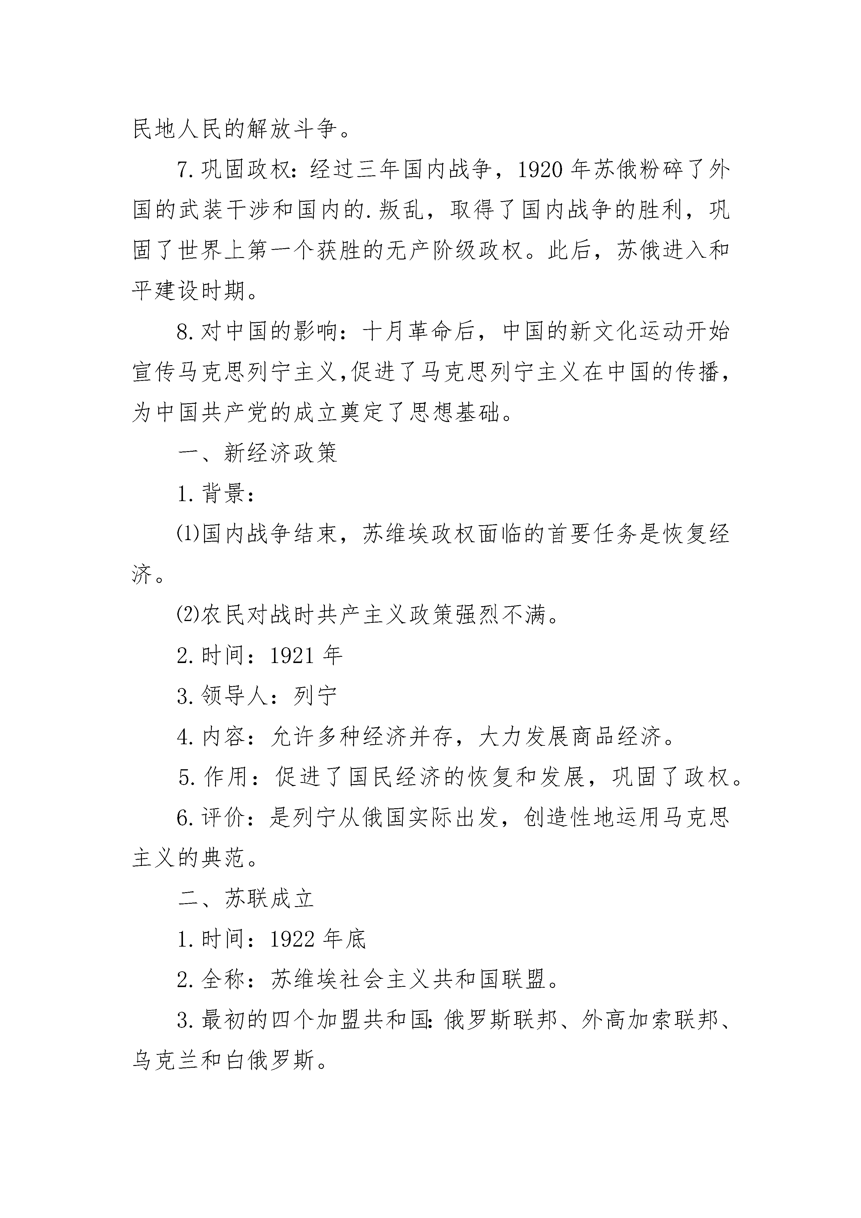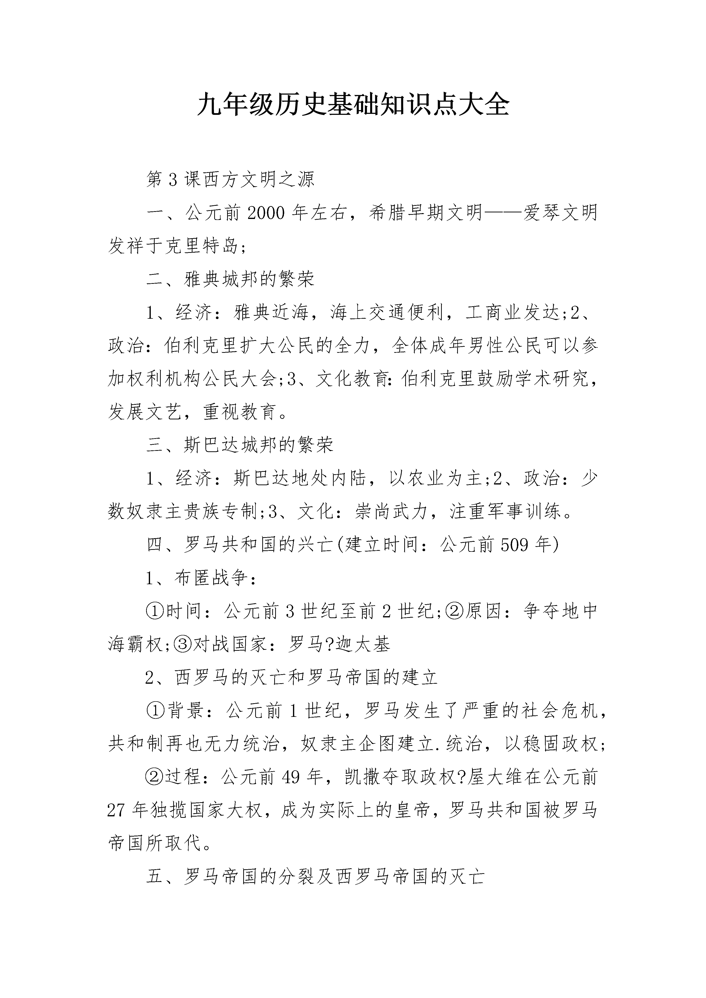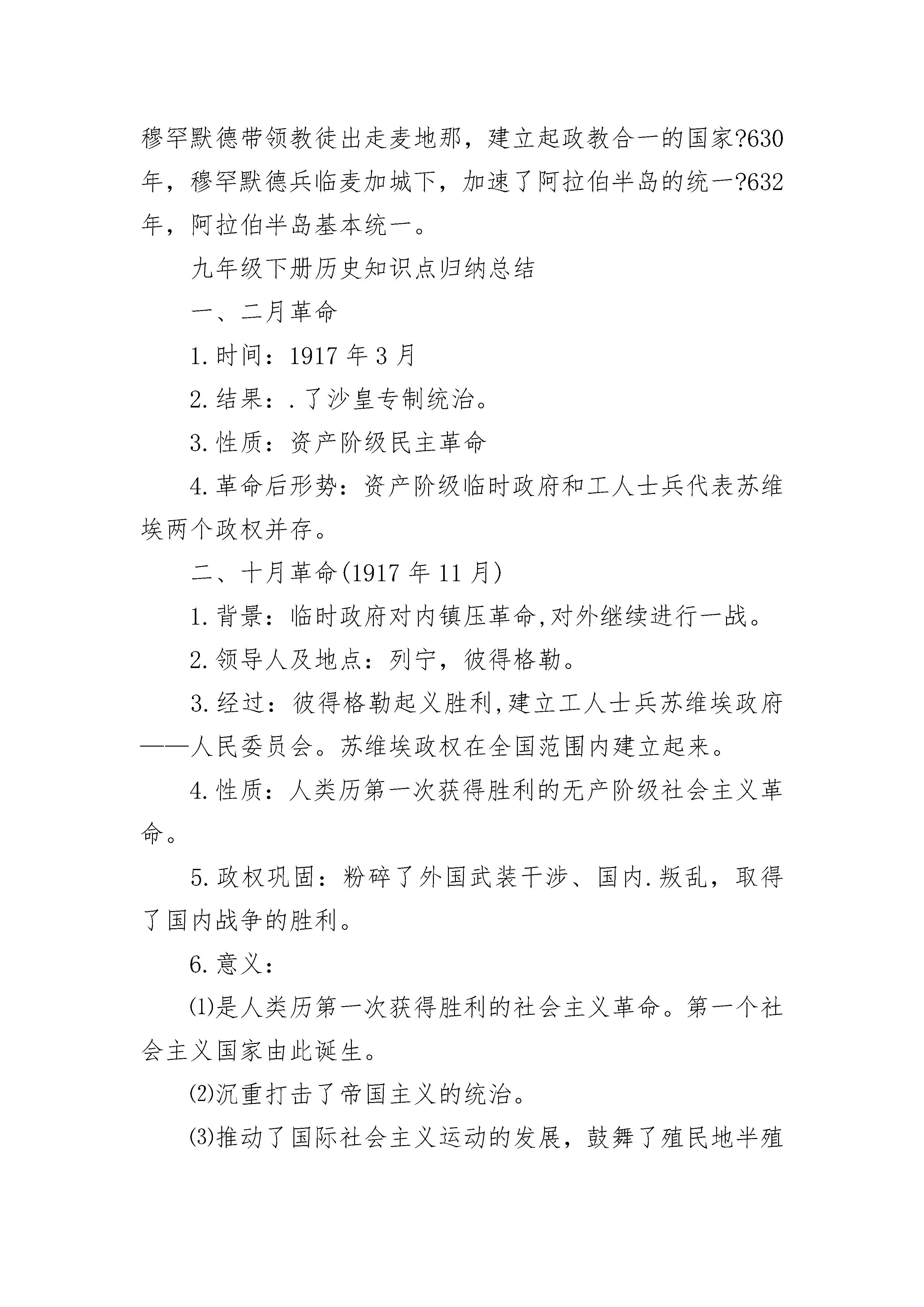 九年级历史基础知识点大全第3课西方文明之源一、公元前2000年左右,希腊早期文明——爱琴文明发祥于克里特岛;二、雅典城邦的繁荣1、经济:雅典近海,海上交通便利,工商业发达;2、政治:伯利克里扩大公民的全力,全体成年男性公民可以参加权利机构公民大会;3、文化教育:伯利克里鼓励学术研究,发展文艺,重视教育。三、斯巴达城邦的繁荣1、经济:斯巴达地处内陆,以农业为主;2、政治:少数奴隶主贵族专制;3、文化:崇尚武力,注重军事训练。四、罗马共和国的兴亡(建立时间:公元前509年)1、布匿战争:①时间:公元前3世纪至前2世纪;②原因:争夺地中海霸权;③对战国家:罗马?迦太基2、西罗马的灭亡和罗马帝国的建立①背景:公元前1世纪,罗马发生了严重的社会危机,共和制再也无力统治,奴隶主企图建立.统治,以稳固政权;②过程:公元前49年,凯撒夺取政权?屋大维在公元前27年独揽国家大权,成为实际上的皇帝,罗马共和国被罗马帝国所取代。五、罗马帝国的分裂及西罗马帝国的灭亡①395年,内外交困的罗马帝国分裂为东、西两部分;②476年,西罗马帝国皇帝被日耳曼人废掉,西罗马帝国灭亡了,标志着西欧的奴隶社会历史随之终结。第4课亚洲封建国家的建立一、日本1世纪前后,日本开始出现奴隶制国家。大和不断征服扩张,于5世纪统一了日本。二、大化改新(时间:7世纪中期)1、背景:日本的社会矛盾十分尖锐,大贵族奴隶主势力强大,政局混乱,改革势在必行。2、内容:政治上建立中央集权的天皇制封建国家,废除贵族世袭制,以才选官;经济上,把很多贵族土地收归国有,部民转为国家公民;国家定期把土地分给农民耕种,向他们收取赋税。3、意义:大化改新是日本从奴隶社会向封建社会过渡的标志。三、阿拉伯国家的建立和伊斯兰教的诞生(穆罕默德)1、背景:六世纪末七世纪初,阿拉伯半岛大部分地区尚未形成统一的国家。争夺水源和牧场,部落间相互仇杀。在内部矛盾丛生、商路不畅,引起商业衰落、生产停滞和外部势力入侵。在这种形势下,阿拉伯人民渴望建立统一的国家。2、过程:610年,穆罕默德建立伊斯兰教并在麦加传教?622年,穆罕默德带领教徒出走麦地那,建立起政教合一的国家?630年,穆罕默德兵临麦加城下,加速了阿拉伯半岛的统一?632年,阿拉伯半岛基本统一。九年级下册历史知识点归纳总结一、二月革命1.时间:1917年3月2.结果:.了沙皇专制统治。3.性质:资产阶级民主革命4.革命后形势:资产阶级临时政府和工人士兵代表苏维埃两个政权并存。二、十月革命(1917年11月)1.背景:临时政府对内镇压革命,对外继续进行一战。2.领导人及地点:列宁,彼得格勒。3.经过:彼得格勒起义胜利,建立工人士兵苏维埃政府——人民委员会。苏维埃政权在全国范围内建立起来。4.性质:人类历第一次获得胜利的无产阶级社会主义革命。5.政权巩固:粉碎了外国武装干涉、国内.叛乱,取得了国内战争的胜利。6.意义:⑴是人类历第一次获得胜利的社会主义革命。第一个社会主义国家由此诞生。⑵沉重打击了帝国主义的统治。⑶推动了国际社会主义运动的发展,鼓舞了殖民地半殖民地人民的解放斗争。7.巩固政权:经过三年国内战争,1920年苏俄粉碎了外国的武装干涉和国内的.叛乱,取得了国内战争的胜利,巩固了世界上第一个获胜的无产阶级政权。此后,苏俄进入和平建设时期。8.对中国的影响:十月革命后,中国的新文化运动开始宣传马克思列宁主义,促进了马克思列宁主义在中国的传播,为中国共产党的成立奠定了思想基础。一、新经济政策1.背景:⑴国内战争结束,苏维埃政权面临的首要任务是恢复经济。⑵农民对战时共产主义政策强烈不满。2.时间:1921年3.领导人:列宁4.内容:允许多种经济并存,大力发展商品经济。5.作用:促进了国民经济的恢复和发展,巩固了政权。6.评价:是列宁从俄国实际出发,创造性地运用马克思主义的典范。二、苏联成立1.时间:1922年底2.全称:苏维埃社会主义共和国联盟。3.最初的四个加盟共和国:俄罗斯联邦、外高加索联邦、乌克兰和白俄罗斯。4.扩大:后来扩大到15个加盟共和国。5.解体:1991年底。初三历史复习的有效方法一、学会听课用新的方式听老师复习阶段的辅导课。复习阶段听老师讲课,听什么?听思路,听提炼,听挖掘,听补充、听小结,听解题方法的指导。听课过程中,一有所得,当即记于课本天头地脚处,以供备忘,正如“好记性不如烂笔头”。二、学会课后自己整理教材在历史能力测试中,分成两个部分:一是闭卷的选择题;一是开卷的材料分析题。主要考察同学对历史史实的认知和迁移以及运用基本的历史方法解决问题的能力,包括对历史知识的识记、理解和运用。千变万化的能力测试题都离不开考察你对教材的认识。所以,要以不变应万变,抓住教材为本。在整理教材的过程中注意以下几方面:(1)知识主干化。在知识结构的框架下,