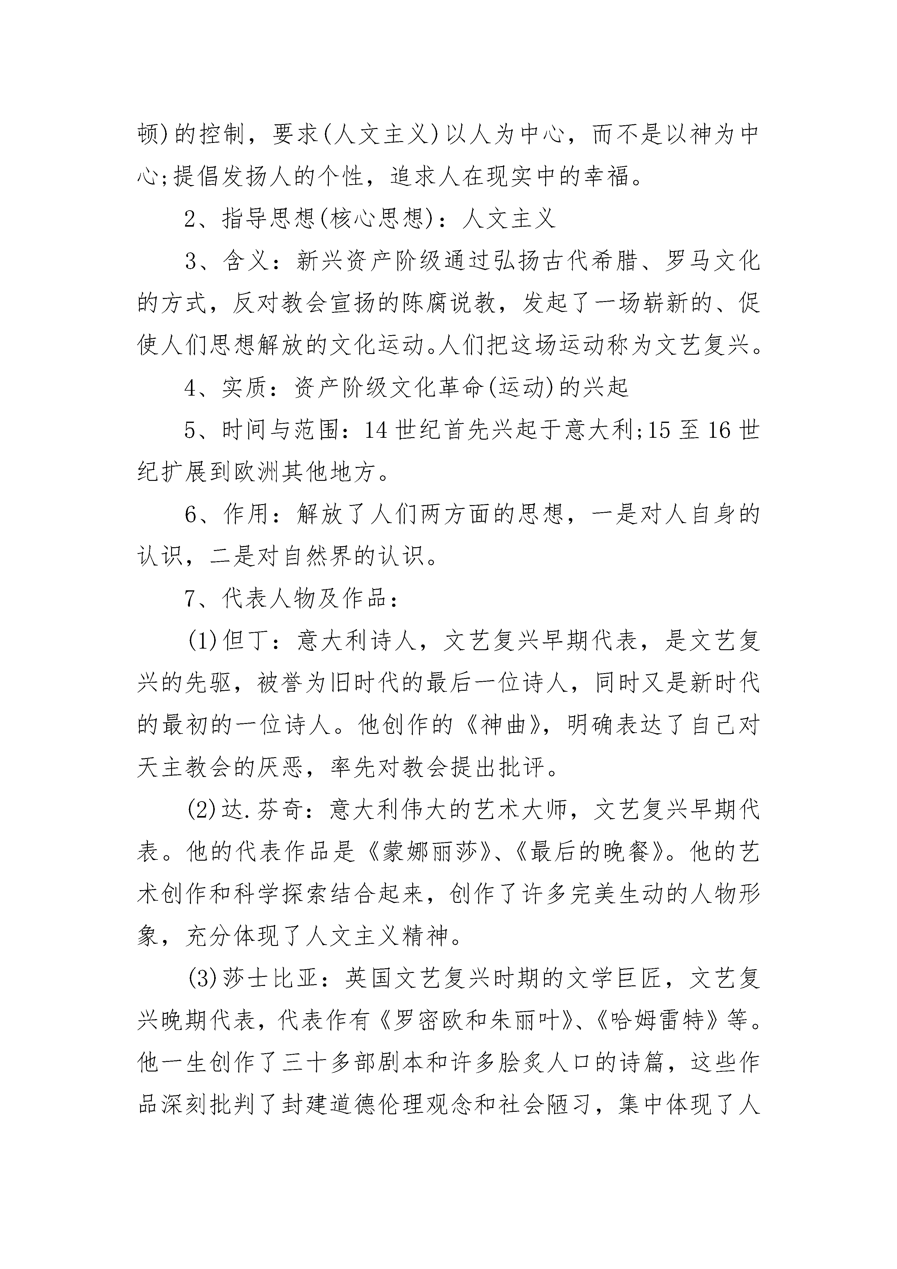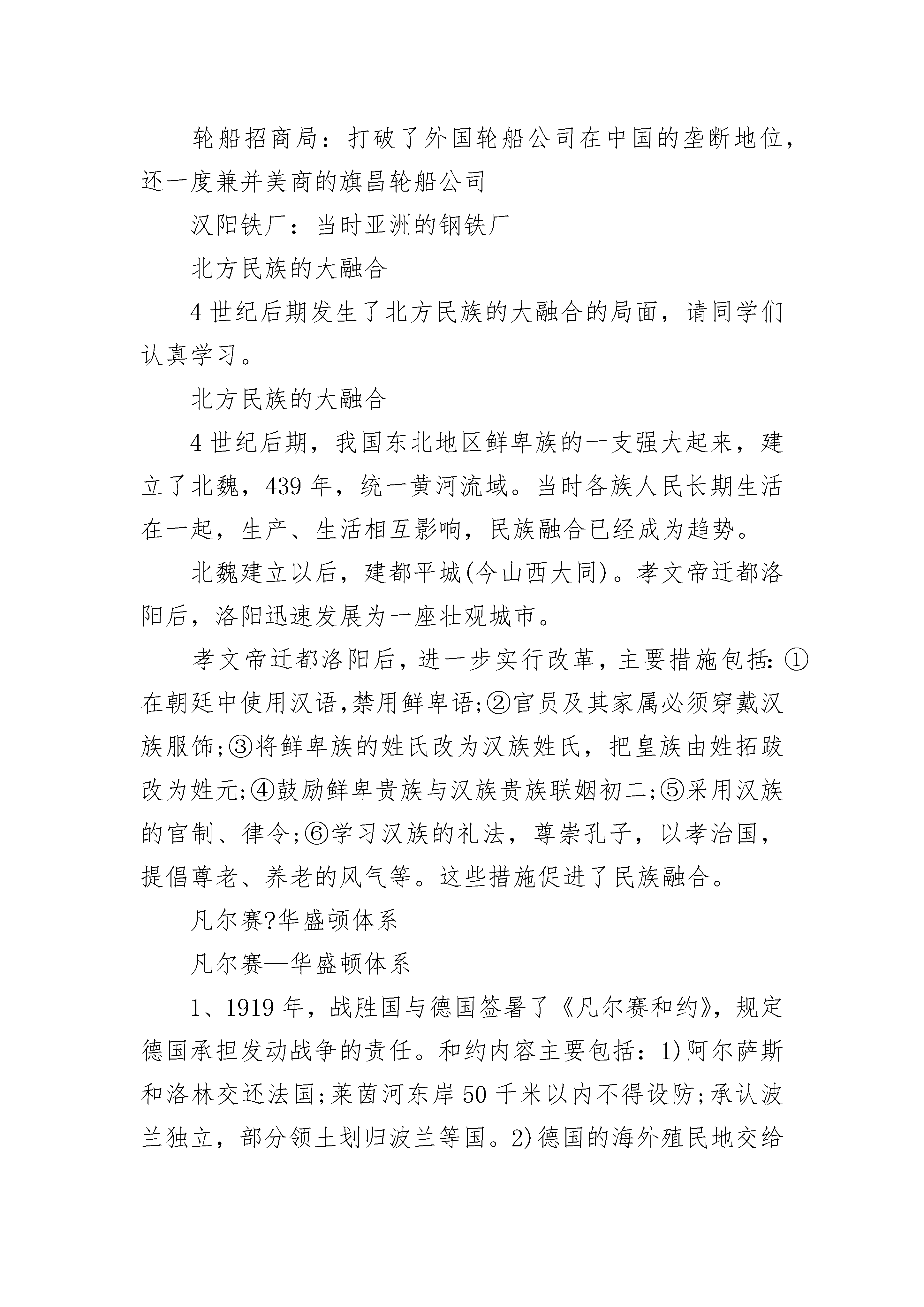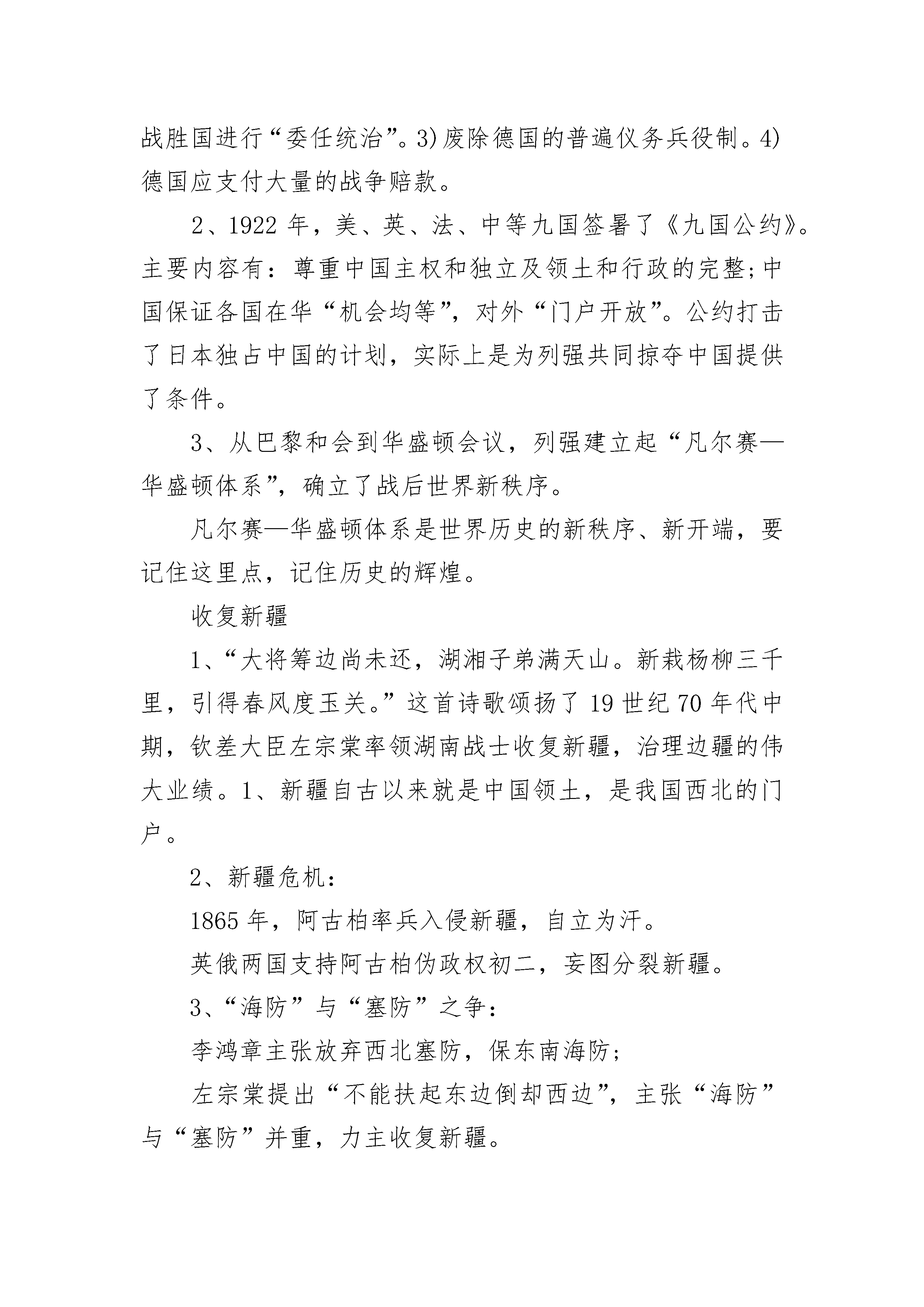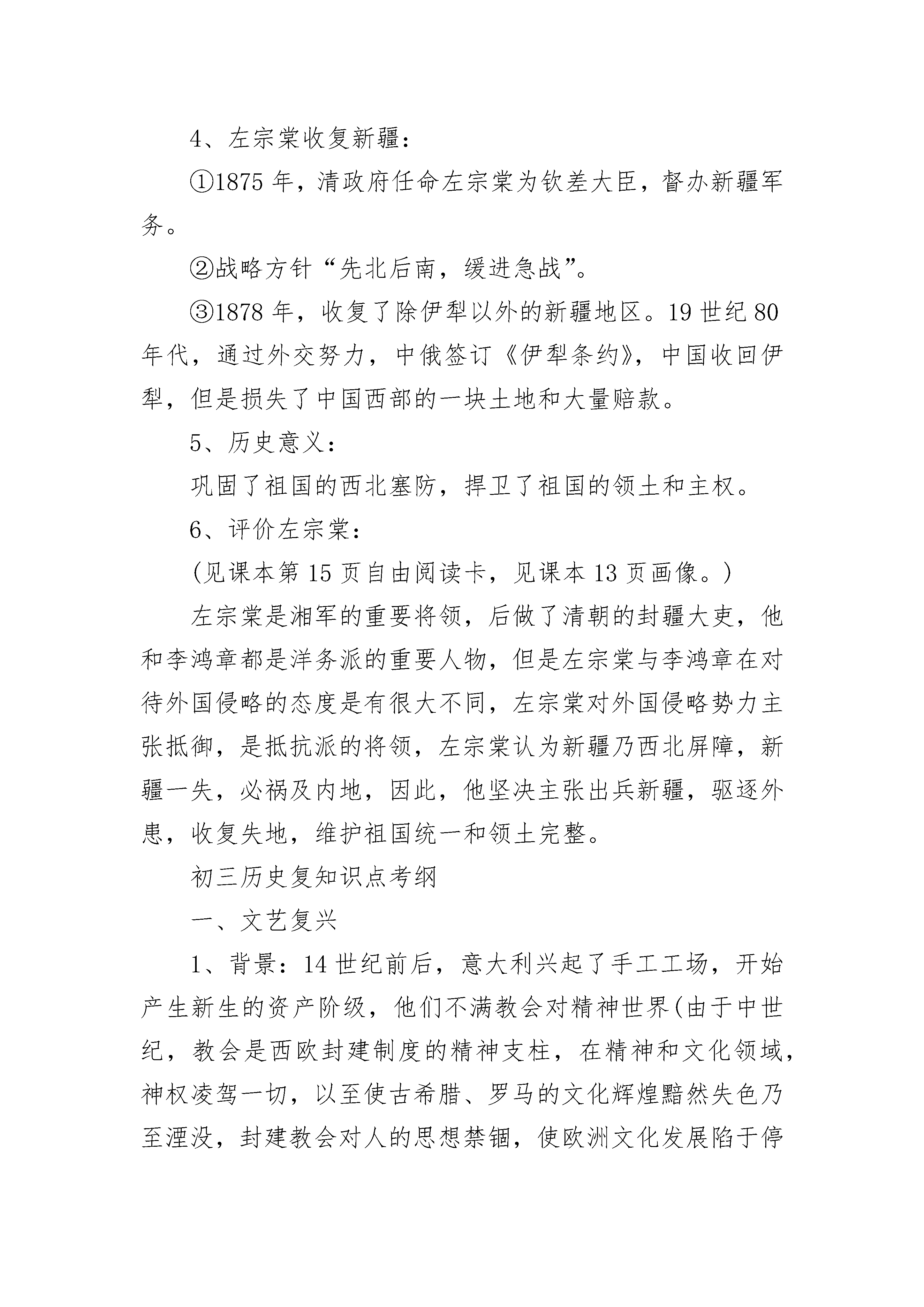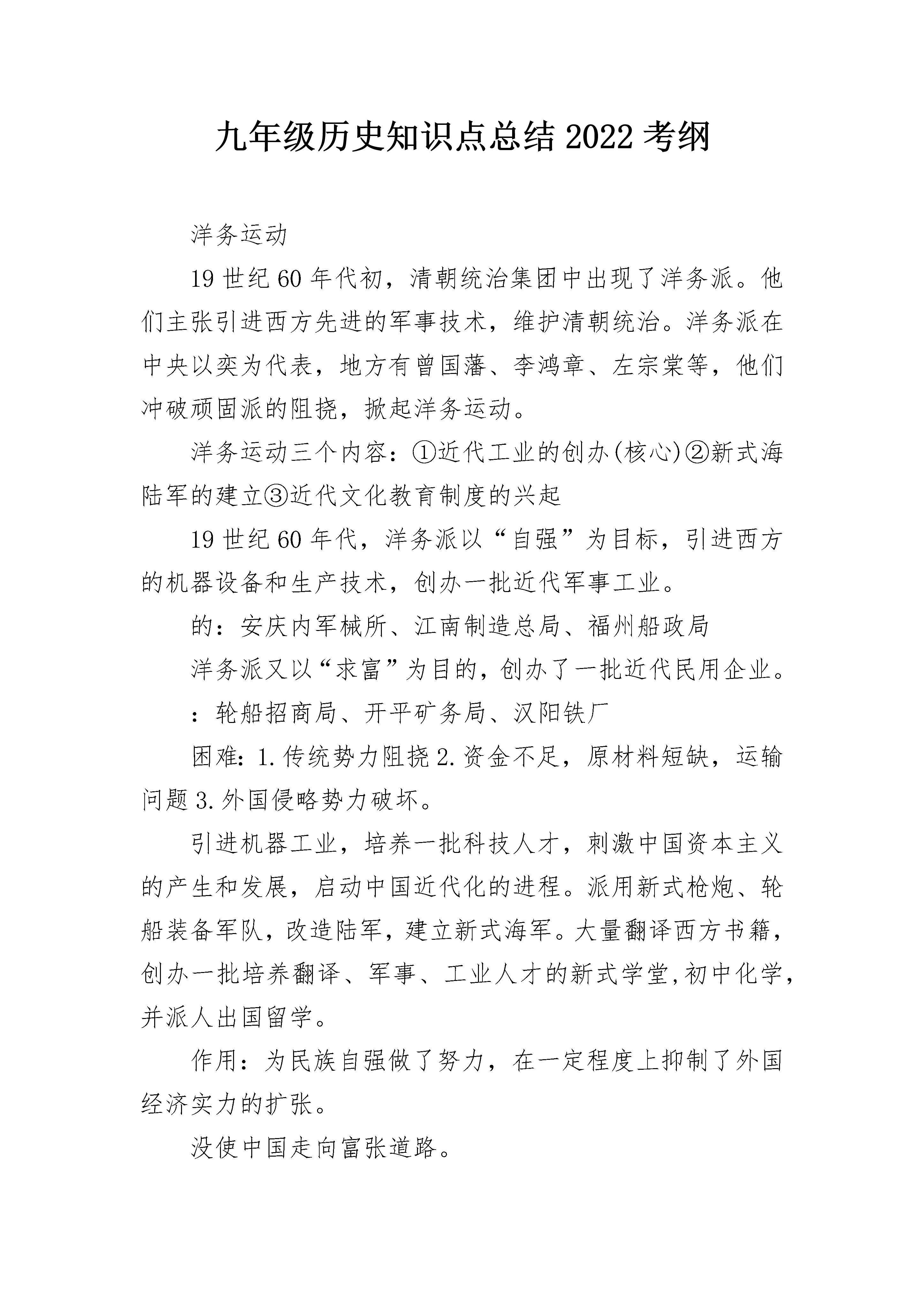 九年级历史知识点总结2022考纲洋务运动19世纪60年代初,清朝统治集团中出现了洋务派。他们主张引进西方先进的军事技术,维护清朝统治。洋务派在中央以奕为代表,地方有曾国藩、李鸿章、左宗棠等,他们冲破顽固派的阻挠,掀起洋务运动。洋务运动三个内容:①近代工业的创办(核心)②新式海陆军的建立③近代文化教育制度的兴起19世纪60年代,洋务派以“自强”为目标,引进西方的机器设备和生产技术,创办一批近代军事工业。的:安庆内军械所、江南制造总局、福州船政局洋务派又以“求富”为目的,创办了一批近代民用企业。:轮船招商局、开平矿务局、汉阳铁厂困难:1.传统势力阻挠2.资金不足,原材料短缺,运输问题3.外国侵略势力破坏。引进机器工业,培养一批科技人才,刺激中国资本主义的产生和发展,启动中国近代化的进程。派用新式枪炮、轮船装备军队,改造陆军,建立新式海军。大量翻译西方书籍,创办一批培养翻译、军事、工业人才的新式学堂,初中化学,并派人出国留学。作用:为民族自强做了努力,在一定程度上抑制了外国经济实力的扩张。没使中国走向富张道路。轮船招商局:打破了外国轮船公司在中国的垄断地位,还一度兼并美商的旗昌轮船公司汉阳铁厂:当时亚洲的钢铁厂北方民族的大融合4世纪后期发生了北方民族的大融合的局面,请同学们认真学习。北方民族的大融合4世纪后期,我国东北地区鲜卑族的一支强大起来,建立了北魏,439年,统一黄河流域。当时各族人民长期生活在一起,生产、生活相互影响,民族融合已经成为趋势。北魏建立以后,建都平城(今山西大同)。孝文帝迁都洛阳后,洛阳迅速发展为一座壮观城市。孝文帝迁都洛阳后,进一步实行改革,主要措施包括:①在朝廷中使用汉语,禁用鲜卑语;②官员及其家属必须穿戴汉族服饰;③将鲜卑族的姓氏改为汉族姓氏,把皇族由姓拓跋改为姓元;④鼓励鲜卑贵族与汉族贵族联姻初二;⑤采用汉族的官制、律令;⑥学习汉族的礼法,尊崇孔子,以孝治国,提倡尊老、养老的风气等。这些措施促进了民族融合。凡尔赛?华盛顿体系凡尔赛—华盛顿体系1、1919年,战胜国与德国签暑了《凡尔赛和约》,规定德国承担发动战争的责任。和约内容主要包括:1)阿尔萨斯和洛林交还法国;莱茵河东岸50千米以内不得设防;承认波兰独立,部分领土划归波兰等国。2)德国的海外殖民地交给战胜国进行“委任统治”。3)废除德国的普遍仪务兵役制。4)德国应支付大量的战争赔款。2、1922年,美、英、法、中等九国签暑了《九国公约》。主要内容有:尊重中国主权和独立及领土和行政的完整;中国保证各国在华“机会均等”,对外“门户开放”。公约打击了日本独占中国的计划,实际上是为列强共同掠夺中国提供了条件。3、从巴黎和会到华盛顿会议,列强建立起“凡尔赛—华盛顿体系”,确立了战后世界新秩序。凡尔赛—华盛顿体系是世界历史的新秩序、新开端,要记住这里点,记住历史的辉煌。收复新疆1、“大将筹边尚未还,湖湘子弟满天山。新栽杨柳三千里,引得春风度玉关。”这首诗歌颂扬了19世纪70年代中期,钦差大臣左宗棠率领湖南战士收复新疆,治理边疆的伟大业绩。1、新疆自古以来就是中国领土,是我国西北的门户。2、新疆危机:1865年,阿古柏率兵入侵新疆,自立为汗。英俄两国支持阿古柏伪政权初二,妄图分裂新疆。3、“海防”与“塞防”之争:李鸿章主张放弃西北塞防,保东南海防;左宗棠提出“不能扶起东边倒却西边”,主张“海防”与“塞防”并重,力主收复新疆。4、左宗棠收复新疆:①1875年,清政府任命左宗棠为钦差大臣,督办新疆军务。②战略方针“先北后南,缓进急战”。③1878年,收复了除伊犁以外的新疆地区。19世纪80年代,通过外交努力,中俄签订《伊犁条约》,中国收回伊犁,但是损失了中国西部的一块土地和大量赔款。5、历史意义:巩固了祖国的西北塞防,捍卫了祖国的领土和主权。6、评价左宗棠:(见课本自由阅读卡,见课本13页画像。)左宗棠是湘军的重要将领,后做了清朝的封疆大吏,他和李鸿章都是洋务派的重要人物,但是左宗棠与李鸿章在对待外国侵略的态度是有很大不同,左宗棠对外国侵略势力主张抵御,是抵抗派的将领,左宗棠认为新疆乃西北屏障,新疆一失,必祸及内地,因此,他坚决主张出兵新疆,驱逐外患,收复失地,维护祖国统一和领土完整。初三历史复知识点考纲一、文艺复兴1、背景:14世纪前后,意大利兴起了手工工场,开始产生新生的资产阶级,他们不满教会对精神世界(由于中世纪,教会是西欧封建制度的精神支柱,在精神和文化领域,神权凌驾一切,以至使古希腊、罗马的文化辉煌黯然失色乃至湮没,封建教会对人的思想禁锢,使欧洲文化发展陷于停顿)的控制,要求(人文主义)以人为中心,而不是以神为中心;提倡发扬人的个性,追求人在现实中的幸福。2、指导思想(核心思想):人文主义3、含义:新兴资产阶级通过弘扬古代希腊、罗马文化的方式,反对