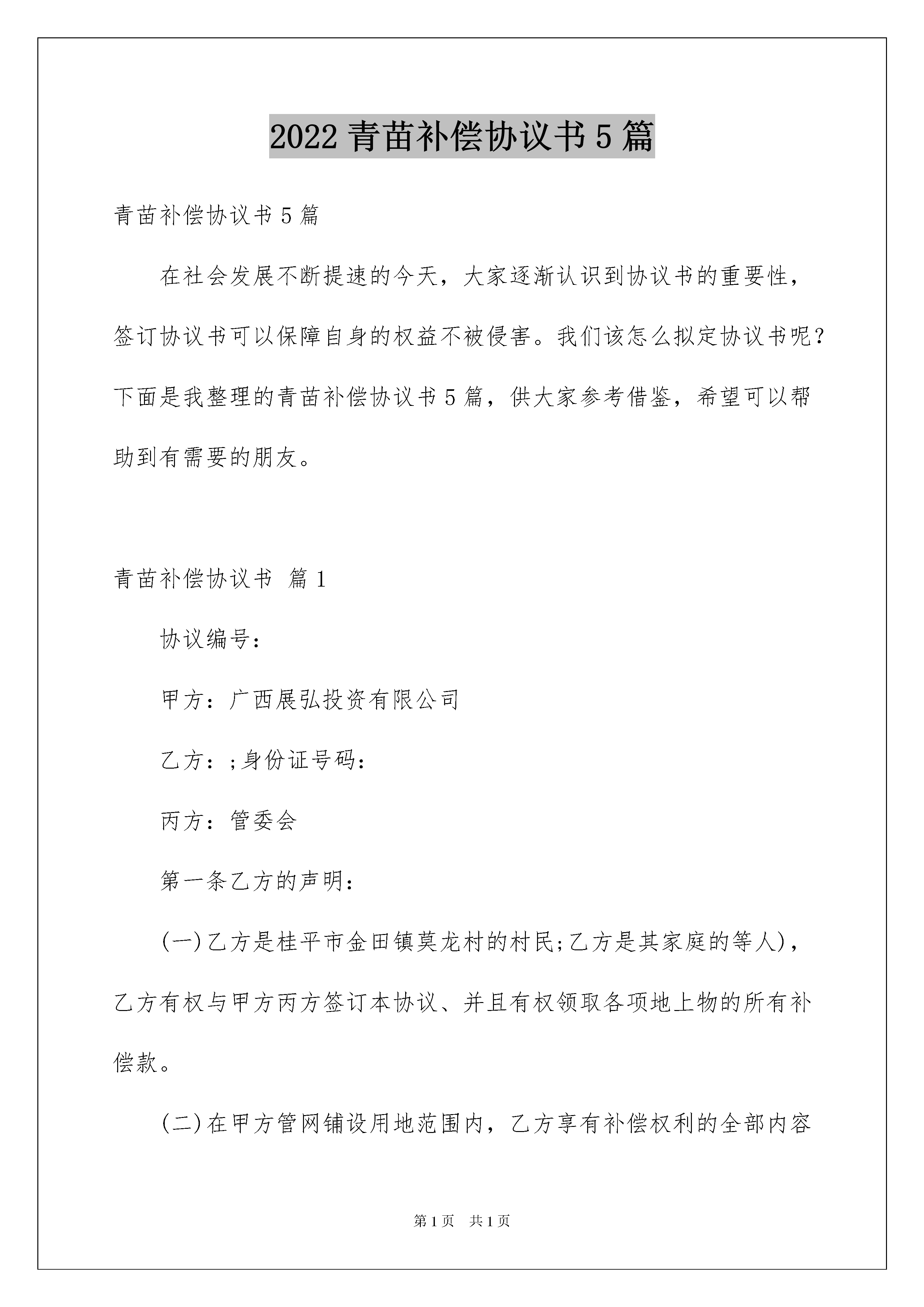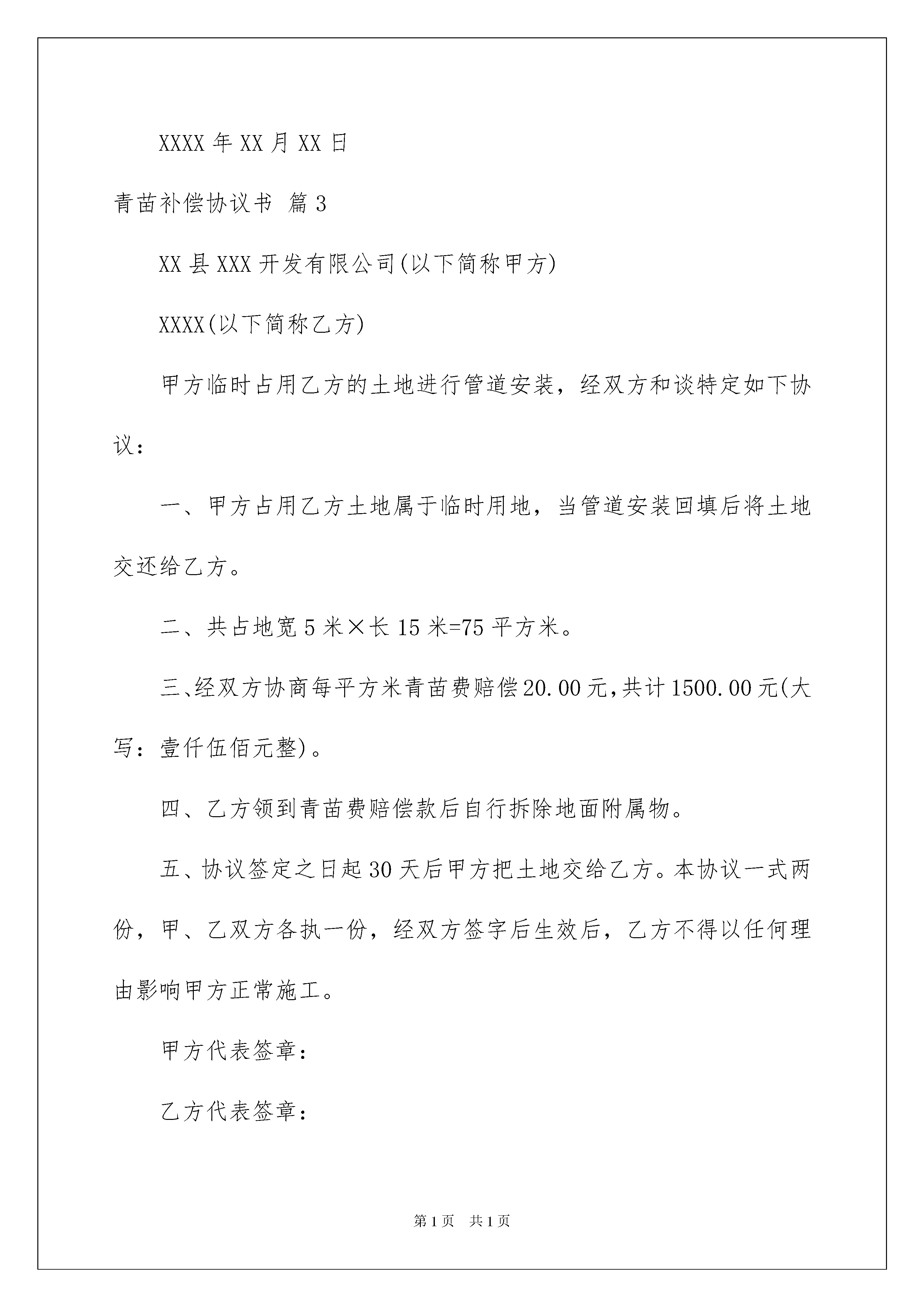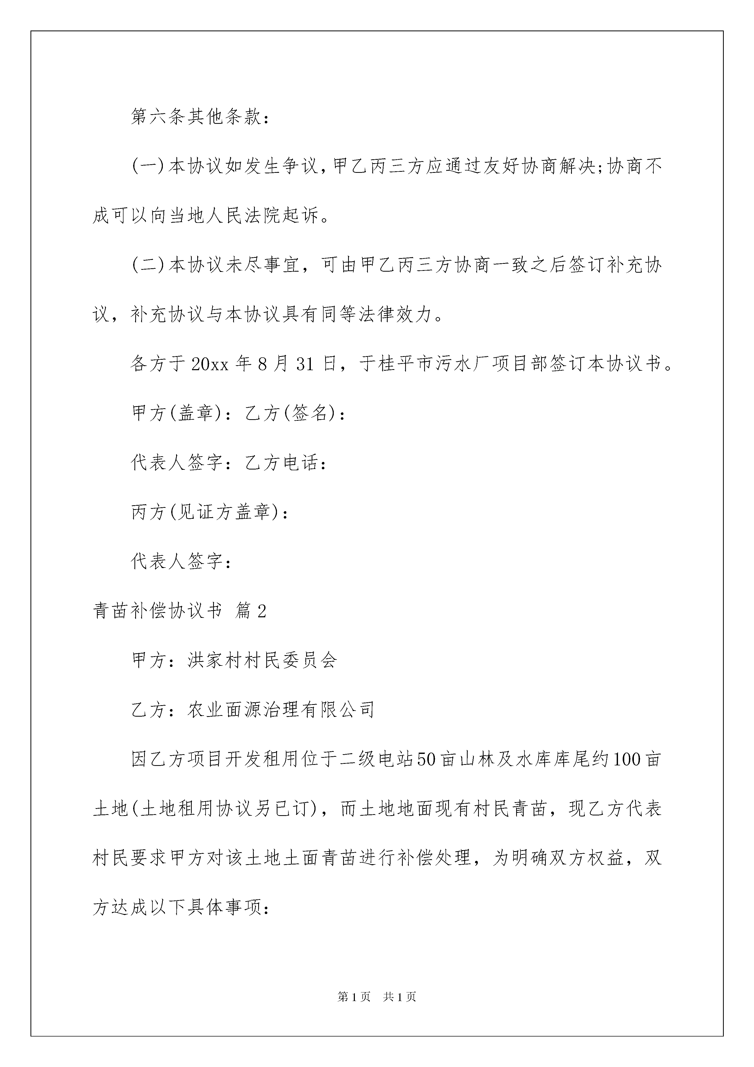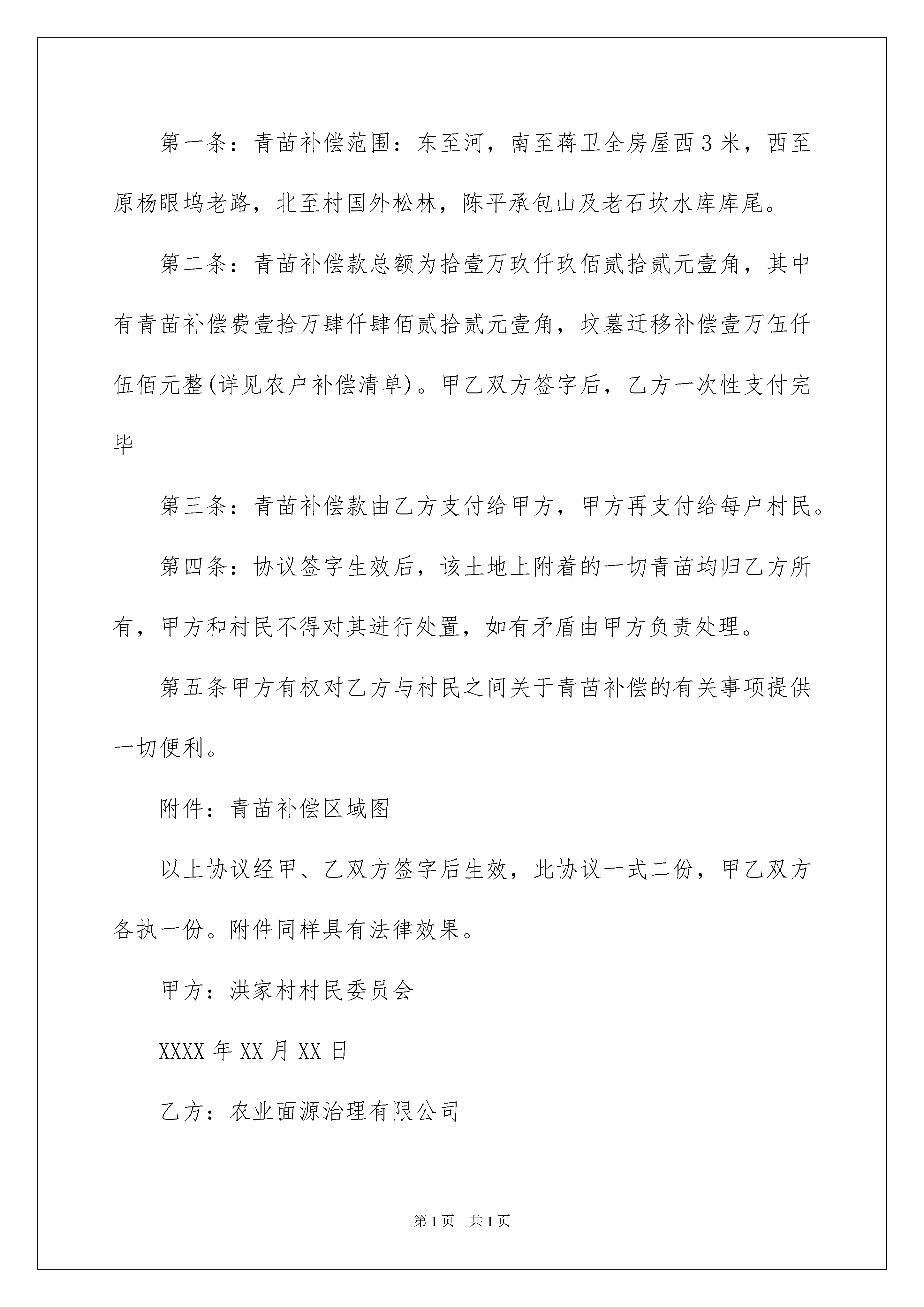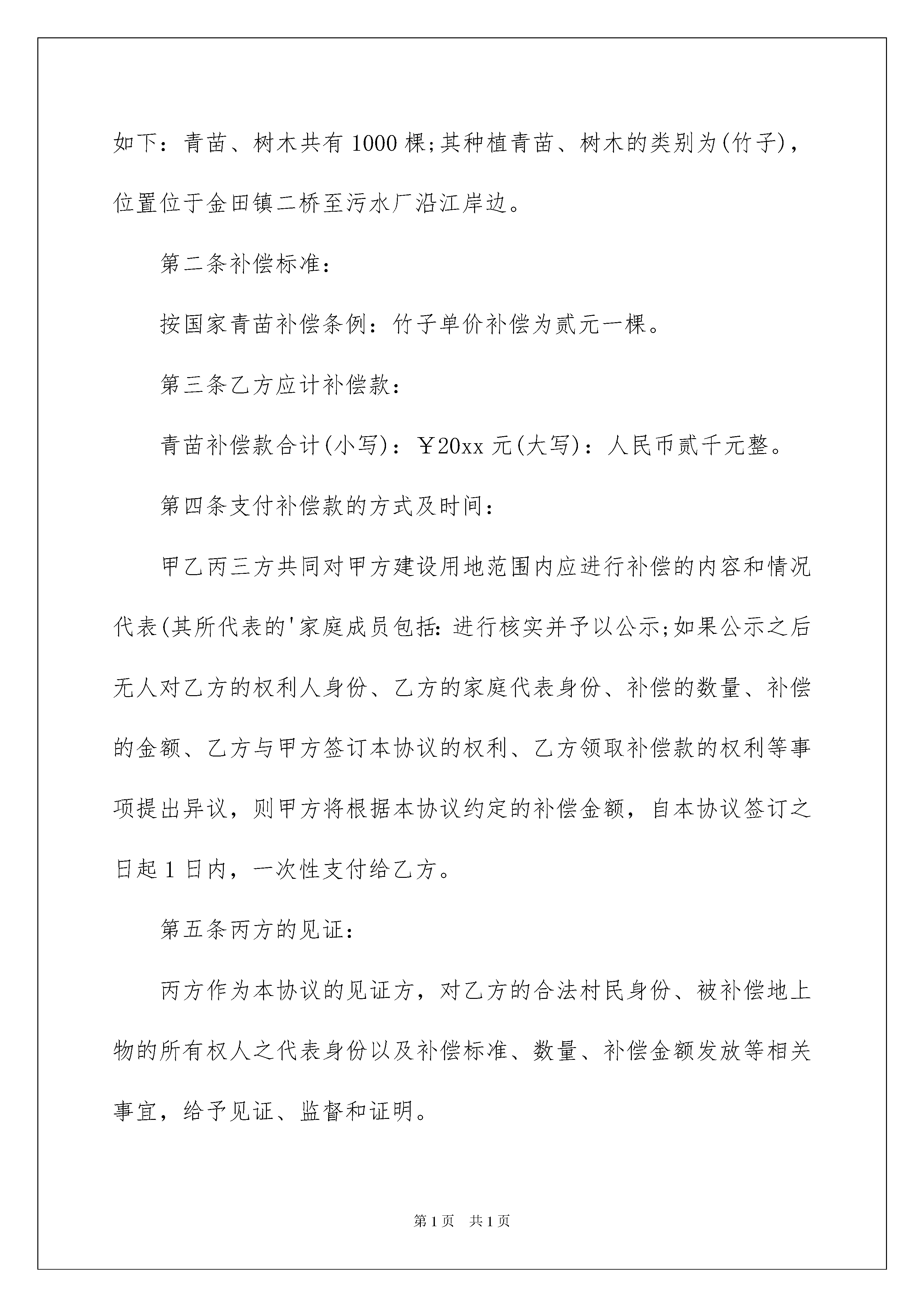 2022青苗补偿协议书5篇青苗补偿协议书5篇在社会发展不断提速的今天,大家逐渐认识到协议书的重要性,签订协议书可以保障自身的权益不被侵害。我们该怎么拟定协议书呢?下面是我整理的青苗补偿协议书5篇,供大家参考借鉴,希望可以帮助到有需要的朋友。青苗补偿协议书篇1协议编号:甲方:广西展弘投资有限公司乙方:;身份证号码:丙方:管委会第一条乙方的声明:(一)乙方是桂平市金田镇莫龙村的村民;乙方是其家庭的等人),乙方有权与甲方丙方签订本协议、并且有权领取各项地上物的所有补偿款。(二)在甲方管网铺设用地范围内,乙方享有补偿权利的全部内容如下:青苗、树木共有1000棵;其种植青苗、树木的类别为(竹子),位置位于金田镇二桥至污水厂沿江岸边。第二条补偿标准:按国家青苗补偿条例:竹子单价补偿为贰元一棵。第三条乙方应计补偿款:青苗补偿款合计(小写):¥20xx元(大写):人民币贰千元整。第四条支付补偿款的方式及时间:甲乙丙三方共同对甲方建设用地范围内应进行补偿的内容和情况代表(其所代表的'家庭成员包括:进行核实并予以公示;如果公示之后无人对乙方的权利人身份、乙方的家庭代表身份、补偿的数量、补偿的金额、乙方与甲方签订本协议的权利、乙方领取补偿款的权利等事项提出异议,则甲方将根据本协议约定的补偿金额,自本协议签订之日起1日内,一次性支付给乙方。第五条丙方的见证:丙方作为本协议的见证方,对乙方的合法村民身份、被补偿地上物的所有权人之代表身份以及补偿标准、数量、补偿金额发放等相关事宜,给予见证、监督和证明。第六条其他条款:(一)本协议如发生争议,甲乙丙三方应通过友好协商解决;协商不成可以向当地人民法院起诉。(二)本协议未尽事宜,可由甲乙丙三方协商一致之后签订补充协议,补充协议与本协议具有同等法律效力。各方于20xx年8月31日,于桂平市污水厂项目部签订本协议书。甲方(盖章):乙方(签名):代表人签字:乙方电话:丙方(见证方盖章):代表人签字:青苗补偿协议书篇2甲方:洪家村村民委员会乙方:农业面源治理有限公司因乙方项目开发租用位于二级电站50亩山林及水库库尾约100亩土地(土地租用协议另已订),而土地地面现有村民青苗,现乙方代表村民要求甲方对该土地土面青苗进行补偿处理,为明确双方权益,双方达成以下具体事项:第一条:青苗补偿范围:东至河,南至蒋卫全房屋西3米,西至原杨眼坞老路,北至村国外松林,陈平承包山及老石坎水库库尾。第二条:青苗补偿款总额为拾壹万玖仟玖佰贰拾贰元壹角,其中有青苗补偿费壹拾万肆仟肆佰贰拾贰元壹角,坟墓迁移补偿壹万伍仟伍佰元整(详见农户补偿清单)。甲乙双方签字后,乙方一次性支付完毕第三条:青苗补偿款由乙方支付给甲方,甲方再支付给每户村民。第四条:协议签字生效后,该土地上附着的一切青苗均归乙方所有,甲方和村民不得对其进行处置,如有矛盾由甲方负责处理。第五条甲方有权对乙方与村民之间关于青苗补偿的有关事项提供一切便利。附件:青苗补偿区域图以上协议经甲、乙双方签字后生效,此协议一式二份,甲乙双方各执一份。附件同样具有法律效果。甲方:洪家村村民委员会XXXX年XX月XX日乙方:农业面源治理有限公司XXXX年XX月XX日青苗补偿协议书篇3XX县XXX开发有限公司(以下简称甲方)XXXX(以下简称乙方)甲方临时占用乙方的土地进行管道安装,经双方和谈特定如下协议:一、甲方占用乙方土地属于临时用地,当管道安装回填后将土地交还给乙方。二、共占地宽5米×长15米=75平方米。三、经双方协商每平方米青苗费赔偿20.00元,共计1500.00元(大写:壹仟伍佰元整)。四、乙方领到青苗费赔偿款后自行拆除地面附属物。五、协议签定之日起30天后甲方把土地交给乙方。本协议一式两份,甲、乙双方各执一份,经双方签字后生效后,乙方不得以任何理由影响甲方正常施工。甲方代表签章:乙方代表签章:20xx年七月九日青苗补偿协议书篇4甲方:河北九瑞麟房地产开发有限公司乙方:XX乙方地址:XX市(县)XX镇(乡)XX村乙方身份证号:根据《合同法》和《土地管理法》以及相关的法律法规规定,经甲乙双方协商一致,并经乙方村委会证明。现就甲方建设用地范围内的地上青苗进行补偿。达成如下协议:一、经村委会证明乙方有权与甲方签订本协议。并且有权领取属于乙方所有权或管辖范围内的青苗补偿款。二、在甲方建设用地范围内,乙方享有补偿权利的全部内容如下:以上青苗补偿款合计为(小写):XX元(大写):人民币XX元乙方签字:XX(盖章)三、甲乙双方共同对甲方建设用地范围内应当补偿的内容和情况进行核实并予以公示。如果公示之后无人对乙方的权利人身份、补偿的数量、补偿的金额、乙