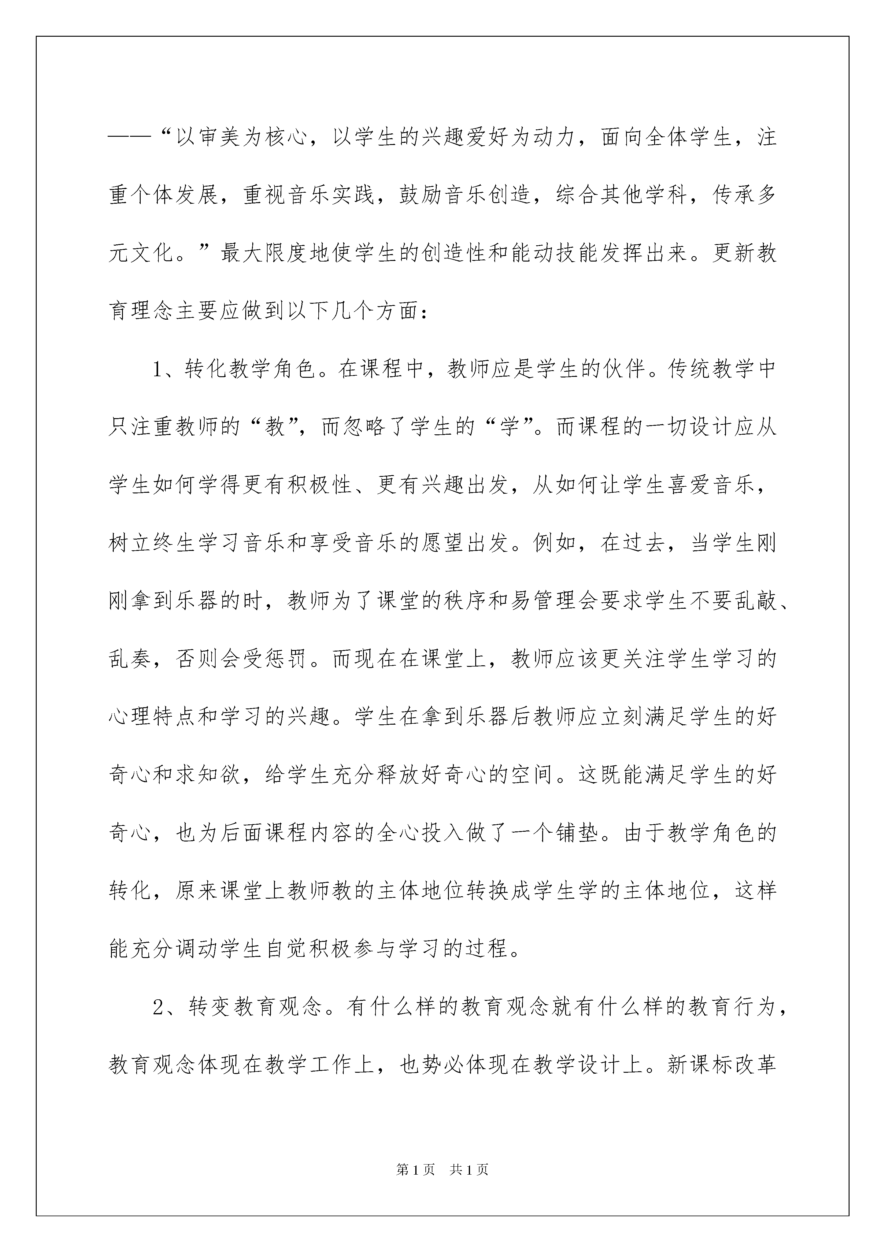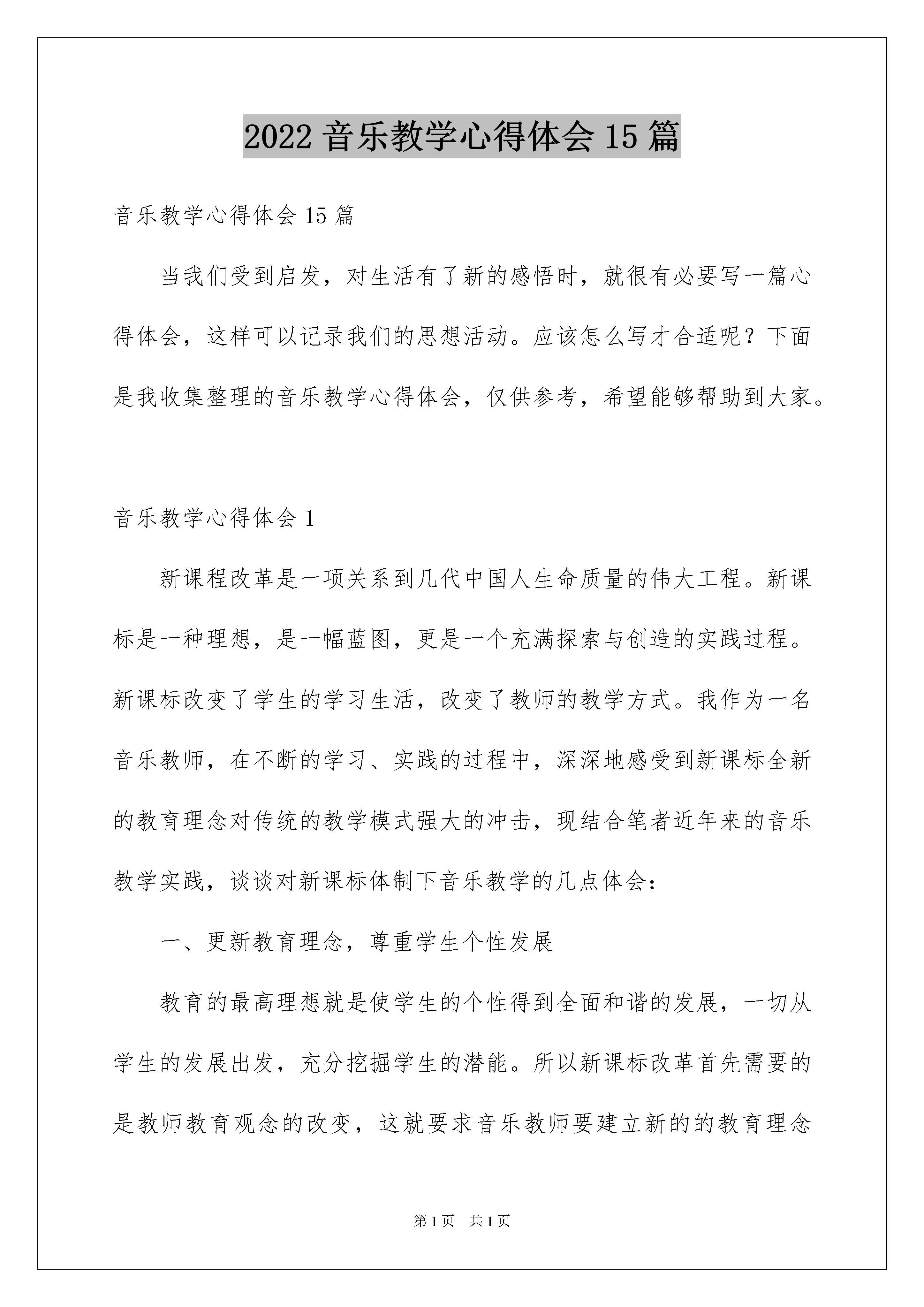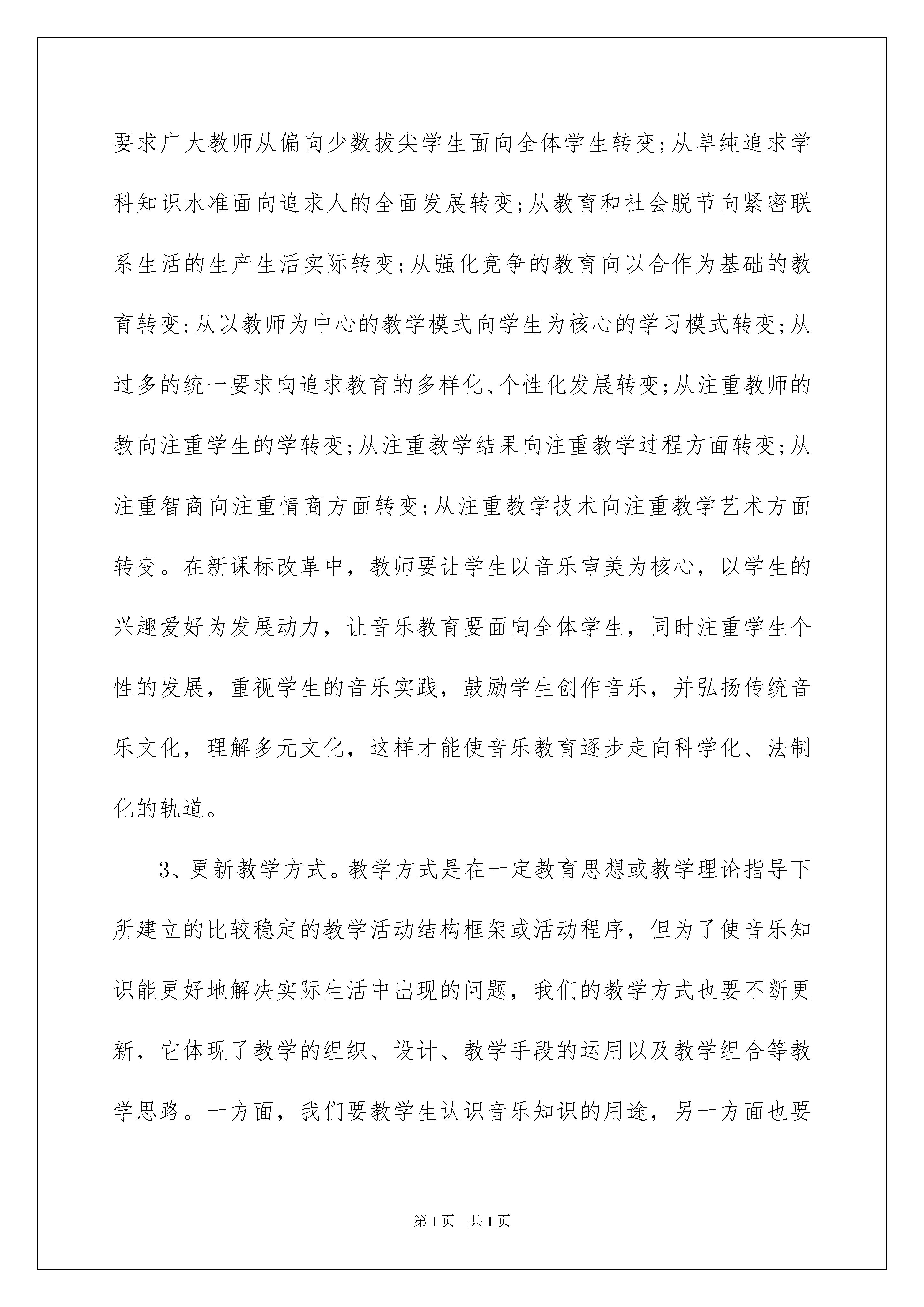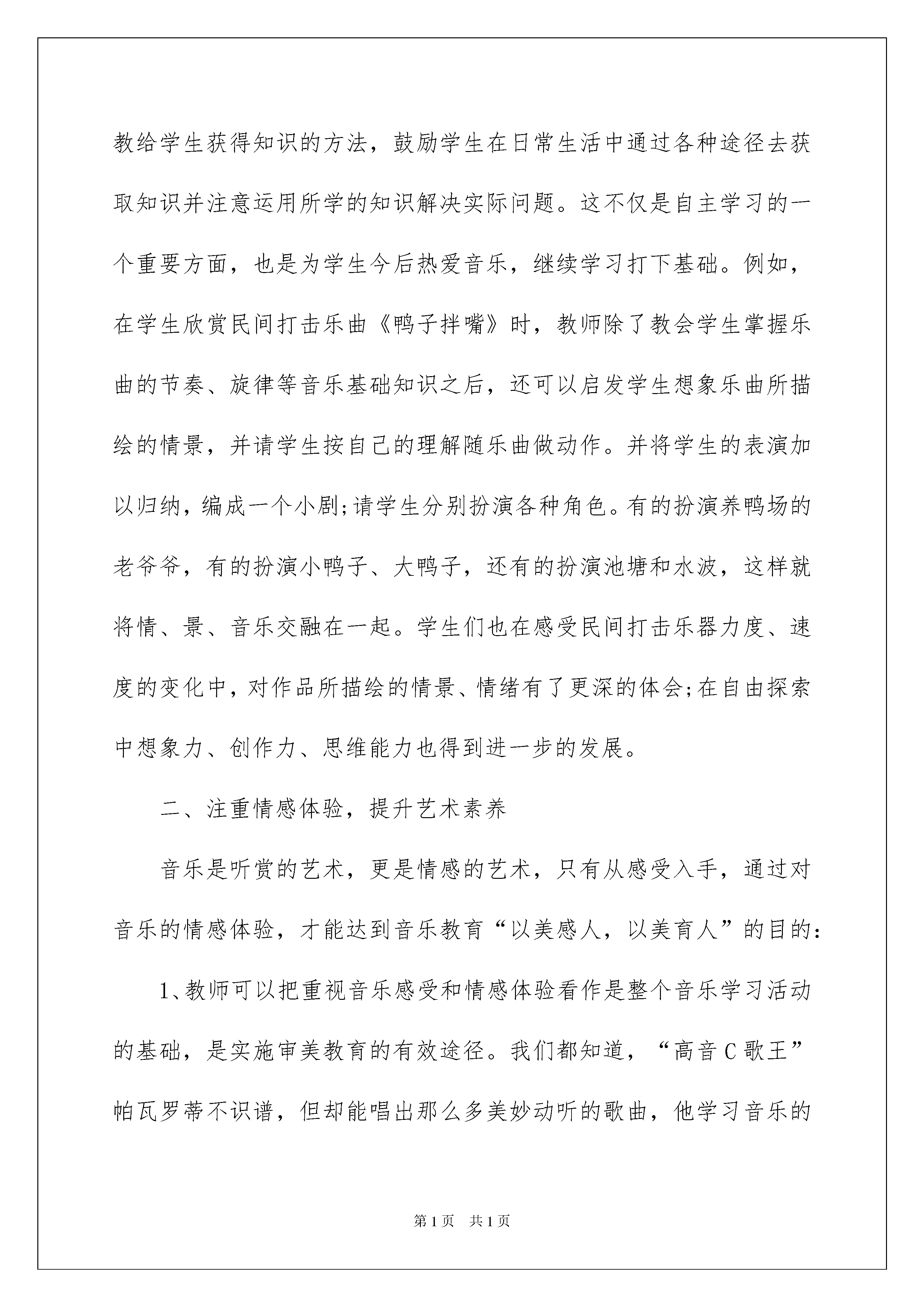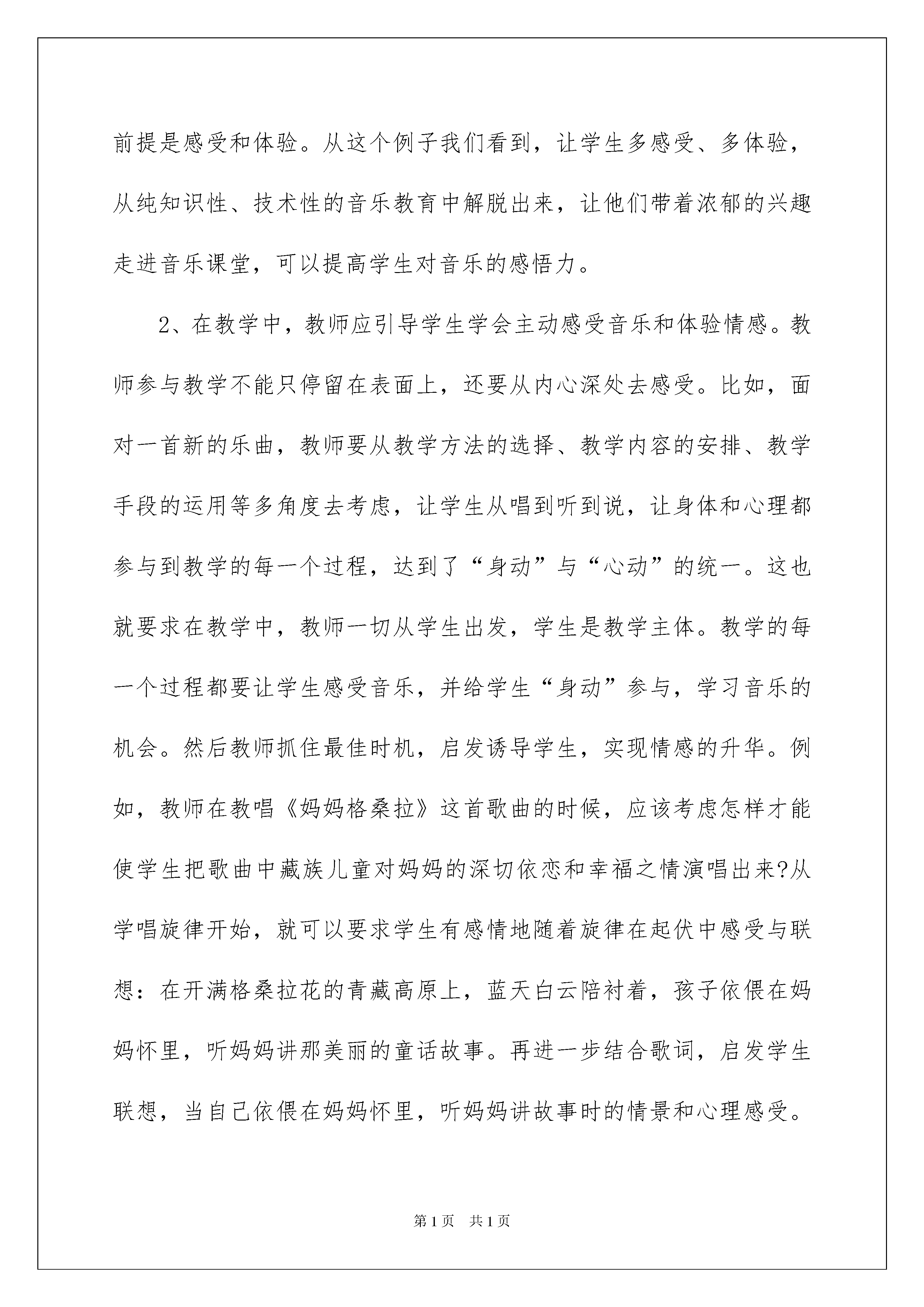 2022音乐教学心得体会15篇音乐教学心得体会15篇当我们受到启发,对生活有了新的感悟时,就很有必要写一篇心得体会,这样可以记录我们的思想活动。应该怎么写才合适呢?下面是我收集整理的音乐教学心得体会,仅供参考,希望能够帮助到大家。音乐教学心得体会1新课程改革是一项关系到几代中国人生命质量的伟大工程。新课标是一种理想,是一幅蓝图,更是一个充满探索与创造的实践过程。新课标改变了学生的学习生活,改变了教师的教学方式。我作为一名音乐教师,在不断的学习、实践的过程中,深深地感受到新课标全新的教育理念对传统的教学模式强大的冲击,现结合笔者近年来的音乐教学实践,谈谈对新课标体制下音乐教学的几点体会:一、更新教育理念,尊重学生个性发展教育的最高理想就是使学生的个性得到全面和谐的发展,一切从学生的发展出发,充分挖掘学生的潜能。所以新课标改革首先需要的是教师教育观念的改变,这就要求音乐教师要建立新的的教育理念——“以审美为核心,以学生的兴趣爱好为动力,面向全体学生,注重个体发展,重视音乐实践,鼓励音乐创造,综合其他学科,传承多元文化。”最大限度地使学生的创造性和能动技能发挥出来。更新教育理念主要应做到以下几个方面:1、转化教学角色。在课程中,教师应是学生的伙伴。传统教学中只注重教师的“教”,而忽略了学生的“学”。而课程的一切设计应从学生如何学得更有积极性、更有兴趣出发,从如何让学生喜爱音乐,树立终生学习音乐和享受音乐的愿望出发。例如,在过去,当学生刚刚拿到乐器的时,教师为了课堂的秩序和易管理会要求学生不要乱敲、乱奏,否则会受惩罚。而现在在课堂上,教师应该更关注学生学习的心理特点和学习的兴趣。学生在拿到乐器后教师应立刻满足学生的好奇心和求知欲,给学生充分释放好奇心的空间。这既能满足学生的好奇心,也为后面课程内容的全心投入做了一个铺垫。由于教学角色的转化,原来课堂上教师教的主体地位转换成学生学的主体地位,这样能充分调动学生自觉积极参与学习的过程。2、转变教育观念。有什么样的教育观念就有什么样的教育行为,教育观念体现在教学工作上,也势必体现在教学设计上。新课标改革要求广大教师从偏向少数拔尖学生面向全体学生转变;从单纯追求学科知识水准面向追求人的全面发展转变;从教育和社会脱节向紧密联系生活的生产生活实际转变;从强化竞争的教育向以合作为基础的教育转变;从以教师为中心的教学模式向学生为核心的学习模式转变;从过多的统一要求向追求教育的多样化、个性化发展转变;从注重教师的教向注重学生的学转变;从注重教学结果向注重教学过程方面转变;从注重智商向注重情商方面转变;从注重教学技术向注重教学艺术方面转变。在新课标改革中,教师要让学生以音乐审美为核心,以学生的兴趣爱好为发展动力,让音乐教育要面向全体学生,同时注重学生个性的发展,重视学生的音乐实践,鼓励学生创作音乐,并弘扬传统音乐文化,理解多元文化,这样才能使音乐教育逐步走向科学化、法制化的轨道。3、更新教学方式。教学方式是在一定教育思想或教学理论指导下所建立的比较稳定的教学活动结构框架或活动程序,但为了使音乐知识能更好地解决实际生活中出现的问题,我们的教学方式也要不断更新,它体现了教学的组织、设计、教学手段的运用以及教学组合等教学思路。一方面,我们要教学生认识音乐知识的用途,另一方面也要教给学生获得知识的方法,鼓励学生在日常生活中通过各种途径去获取知识并注意运用所学的知识解决实际问题。这不仅是自主学习的一个重要方面,也是为学生今后热爱音乐,继续学习打下基础。例如,在学生欣赏民间打击乐曲《鸭子拌嘴》时,教师除了教会学生掌握乐曲的节奏、旋律等音乐基础知识之后,还可以启发学生想象乐曲所描绘的情景,并请学生按自己的理解随乐曲做动作。并将学生的表演加以归纳,编成一个小剧;请学生分别扮演各种角色。有的扮演养鸭场的老爷爷,有的扮演小鸭子、大鸭子,还有的扮演池塘和水波,这样就将情、景、音乐交融在一起。学生们也在感受民间打击乐器力度、速度的变化中,对作品所描绘的情景、情绪有了更深的体会;在自由探索中想象力、创作力、思维能力也得到进一步的发展。二、注重情感体验,提升艺术素养音乐是听赏的艺术,更是情感的艺术,只有从感受入手,通过对音乐的情感体验,才能达到音乐教育“以美感人,以美育人”的目的:1、教师可以把重视音乐感受和情感体验看作是整个音乐学习活动的基础,是实施审美教育的有效途径。我们都知道,“高音C歌王”帕瓦罗蒂不识谱,但却能唱出那么多美妙动听的歌曲,他学习音乐的前提是感受和体验。从这个例子我们看到,让学生多感受、多体验,从纯知识性、技术性的音乐教育中解脱出来,让他们带着浓郁的兴趣走进