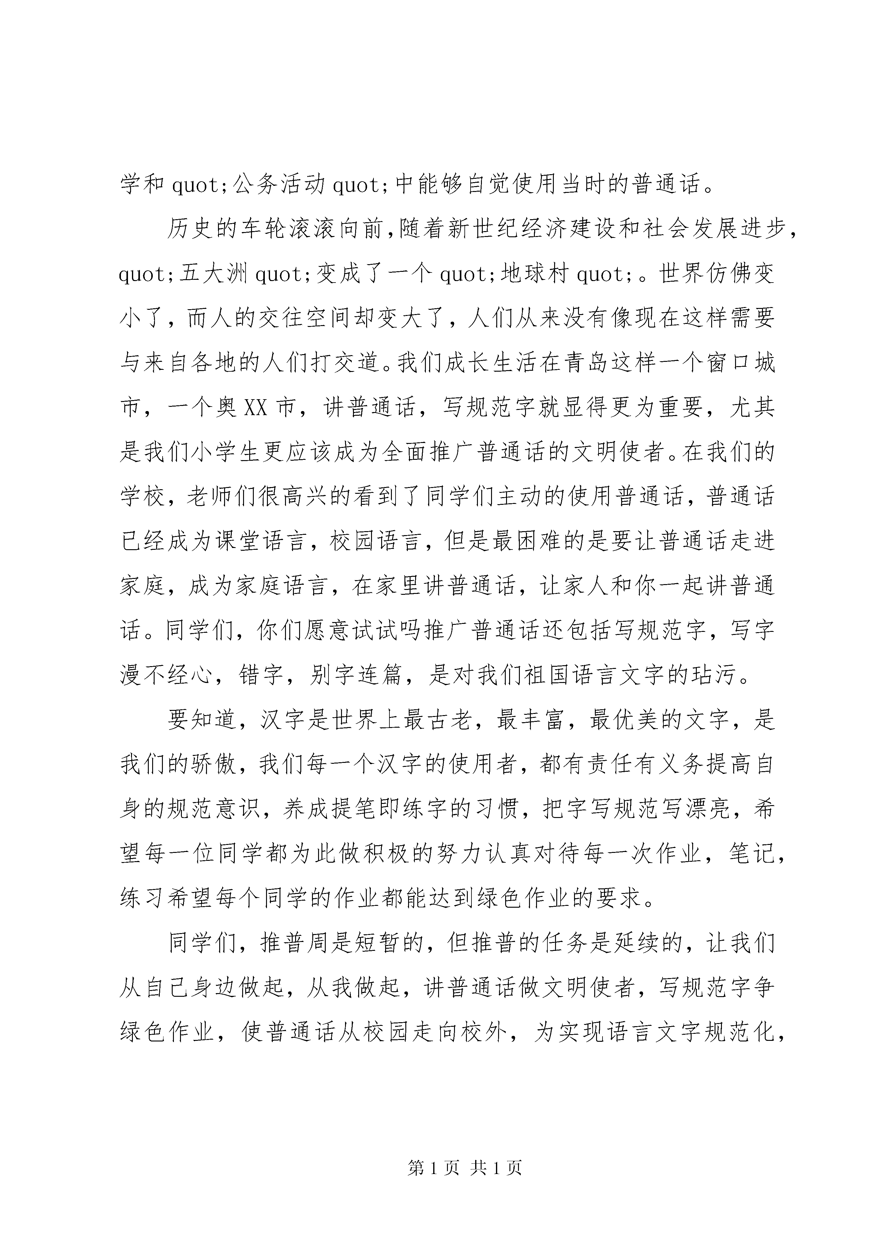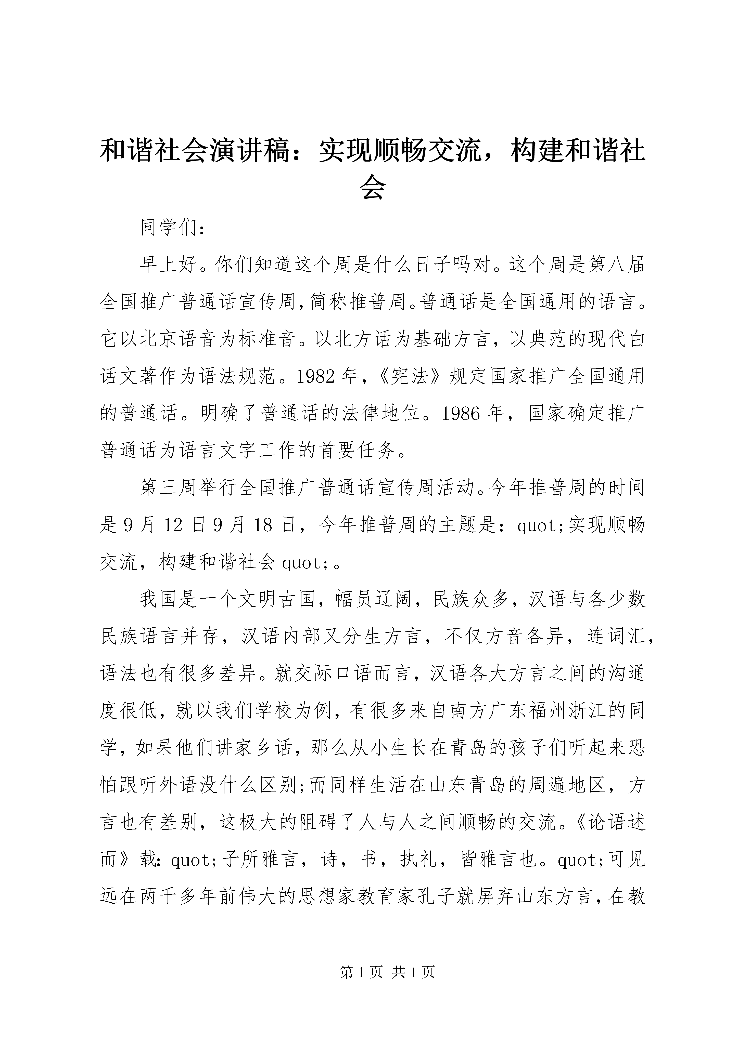 和谐社会演讲稿:实现顺畅交流,构建和谐社会同学们:早上好。你们知道这个周是什么日子吗对。这个周是第八届全国推广普通话宣传周,简称推普周。普通话是全国通用的语言。它以北京语音为标准音。以北方话为基础方言,以典范的现代白话文著作为语法规范。1982年,《宪法》规定国家推广全国通用的普通话。明确了普通话的法律地位。1986年,国家确定推广普通话为语言文字工作的首要任务。第三周举行全国推广普通话宣传周活动。今年推普周的时间是9月12日9月18日,今年推普周的主题是:quot;实现顺畅交流,构建和谐社会quot;。我国是一个文明古国,幅员辽阔,民族众多,汉语与各少数民族语言并存,汉语内部又分生方言,不仅方音各异,连词汇,语法也有很多差异。就交际口语而言,汉语各大方言之间的沟通度很低,就以我们学校为例,有很多来自南方广东福州浙江的同学,如果他们讲家乡话,那么从小生长在青岛的孩子们听起来恐怕跟听外语没什么区别;而同样生活在山东青岛的周遍地区,方言也有差别,这极大的阻碍了人与人之间顺畅的交流。《论语述而》载:quot;子所雅言,诗,书,执礼,皆雅言也。quot;可见远在两千多年前伟大的思想家教育家孔子就屏弃山东方言,在教学和quot;公务活动quot;中能够自觉使用当时的普通话。历史的车轮滚滚向前,随着新世纪经济建设和社会发展进步,quot;五大洲quot;变成了一个quot;地球村quot;。世界仿佛变小了,而人的交往空间却变大了,人们从来没有像现在这样需要与来自各地的人们打交道。我们成长生活在青岛这样一个窗口城市,一个奥XX市,讲普通话,写规范字就显得更为重要,尤其是我们小学生更应该成为全面推广普通话的文明使者。在我们的学校,老师们很高兴的看到了同学们主动的使用普通话,普通话已经成为课堂语言,校园语言,但是最困难的是要让普通话走进家庭,成为家庭语言,在家里讲普通话,让家人和你一起讲普通话。同学们,你们愿意试试吗推广普通话还包括写规范字,写字漫不经心,错字,别字连篇,是对我们祖国语言文字的玷污。要知道,汉字是世界上最古老,最丰富,最优美的文字,是我们的骄傲,我们每一个汉字的使用者,都有责任有义务提高自身的规范意识,养成提笔即练字的习惯,把字写规范写漂亮,希望每一位同学都为此做积极的努力认真对待每一次作业,笔记,练习希望每个同学的作业都能达到绿色作业的要求。同学们,推普周是短暂的,但推普的任务是延续的,让我们从自己身边做起,从我做起,讲普通话做文明使者,写规范字争绿色作业,使普通话从校园走向校外,为实现语言文字规范化,实现顺畅交流,构建和谐社会而努力。
