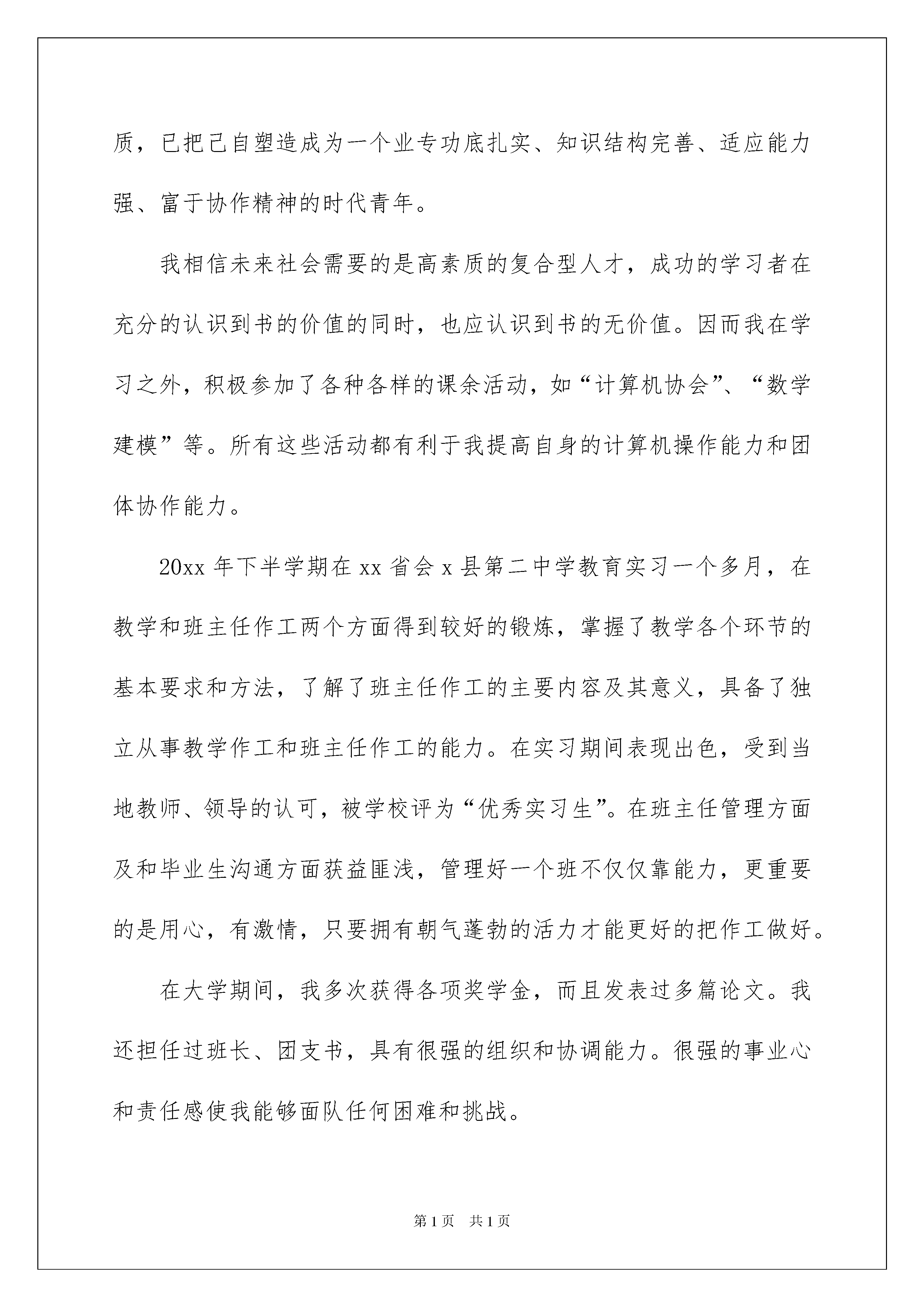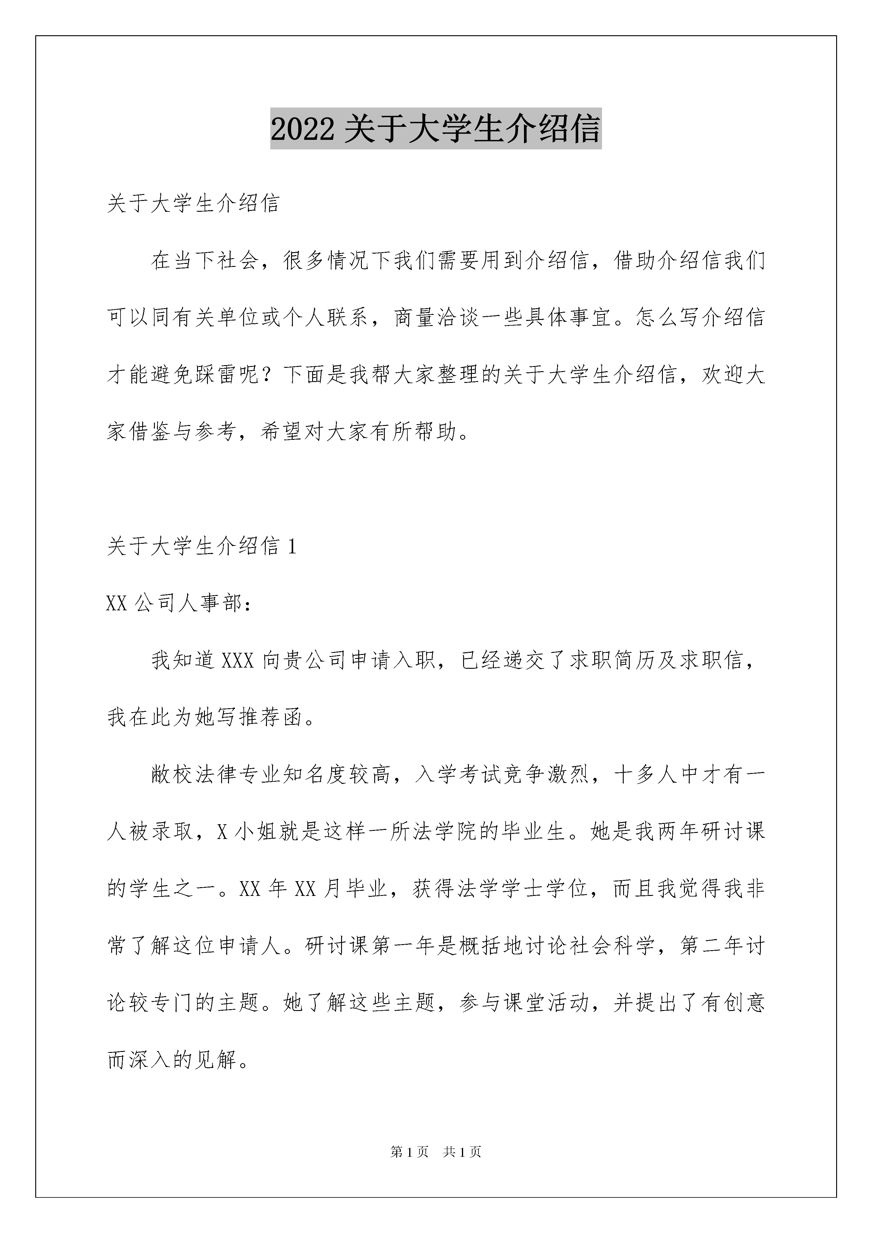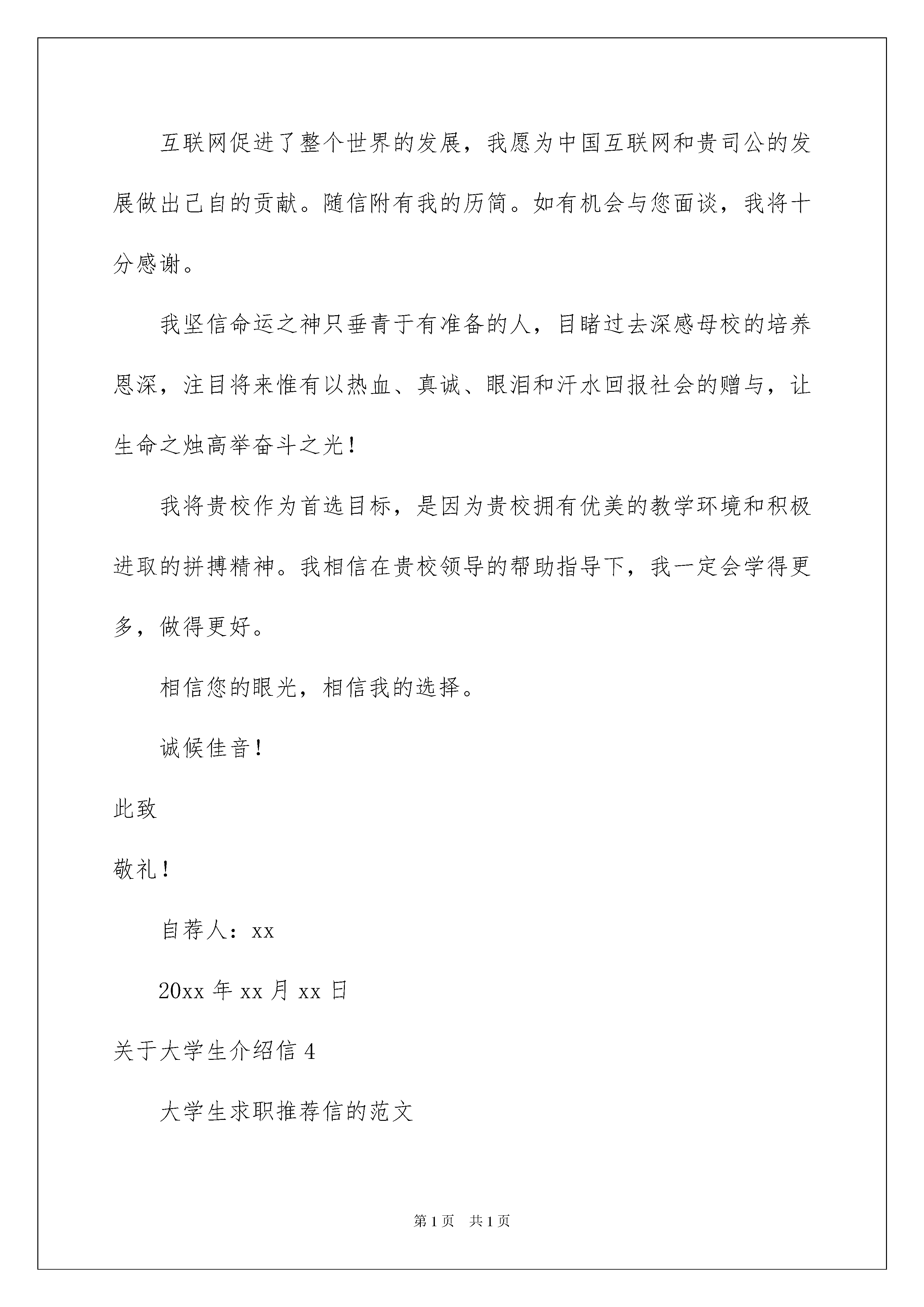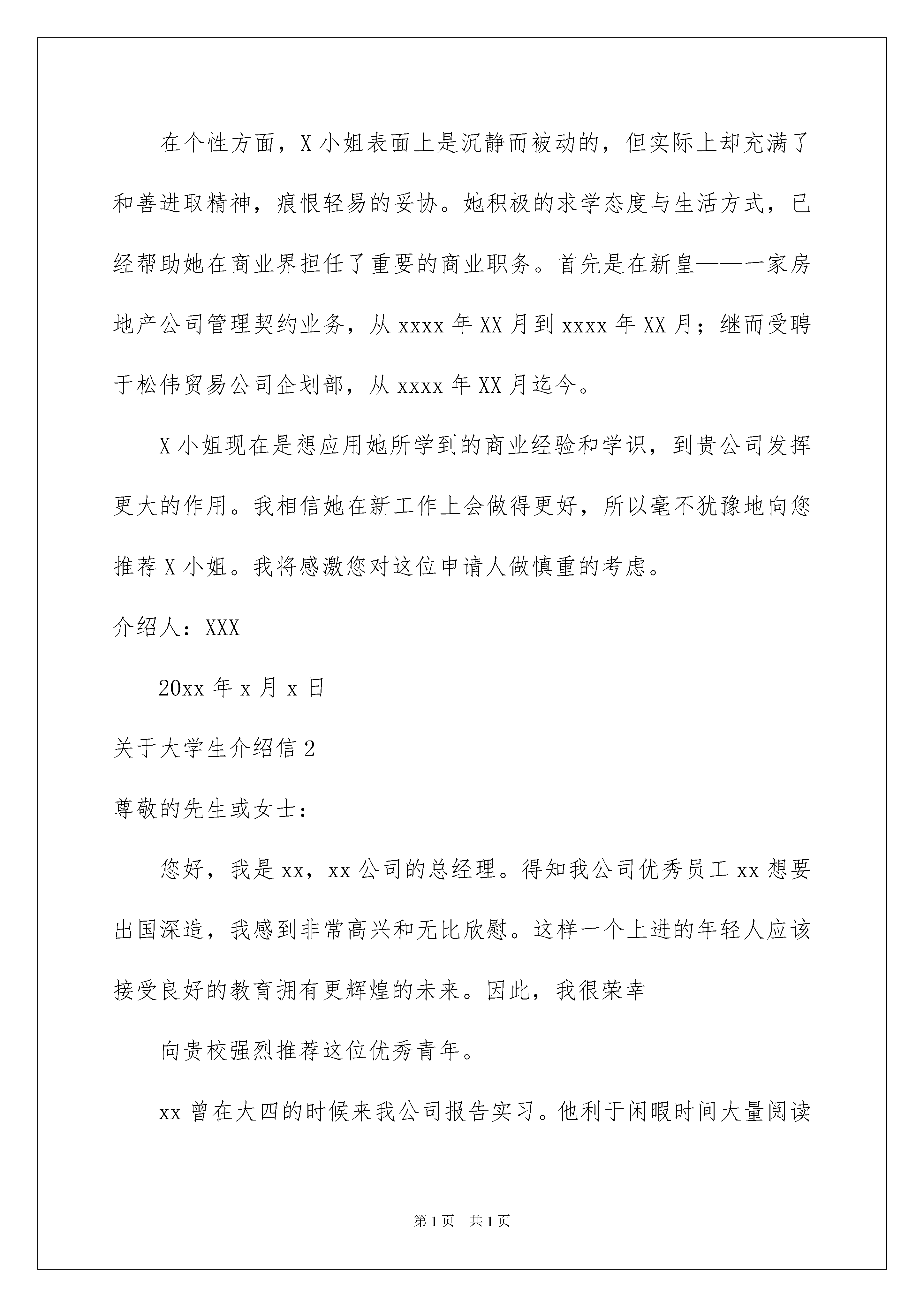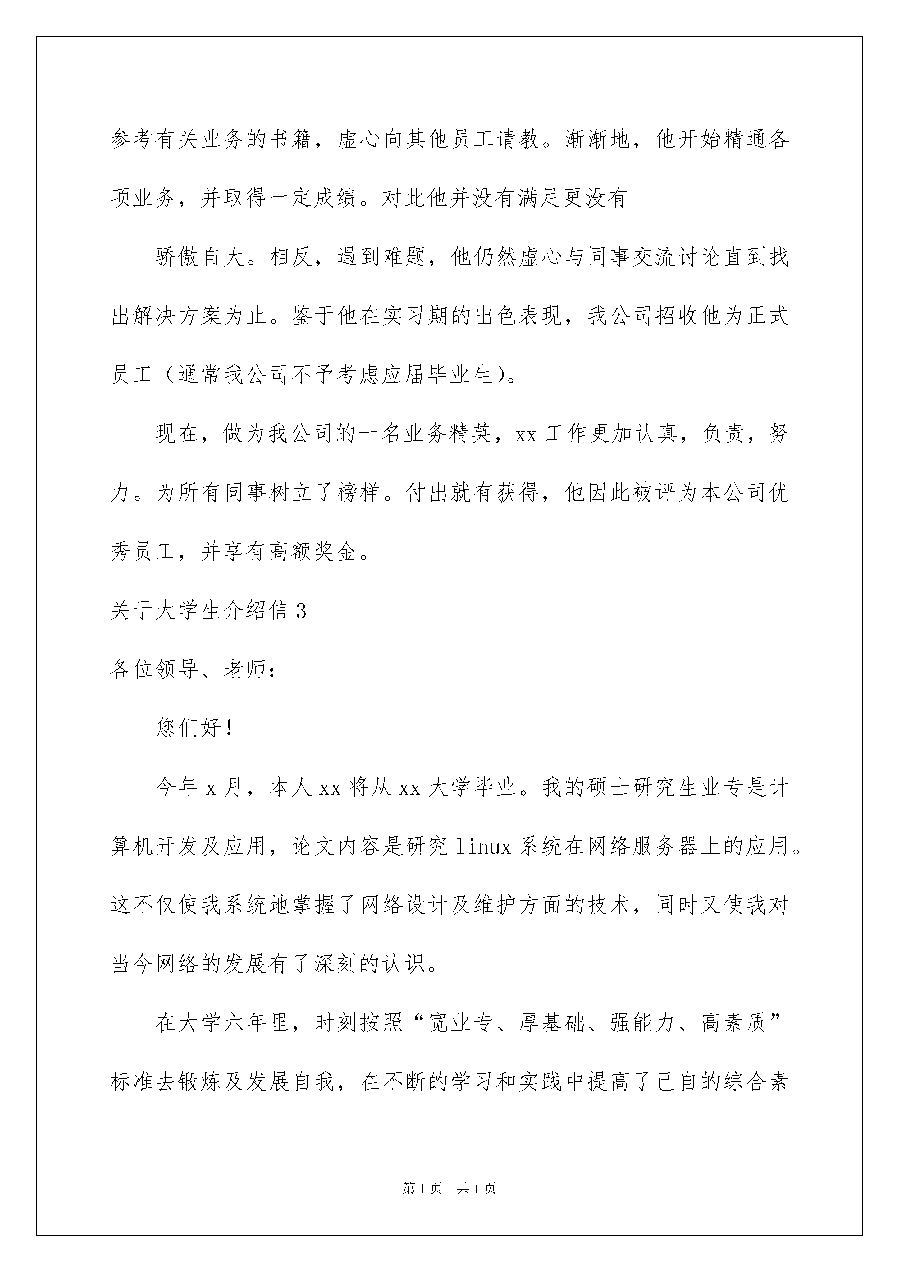 2022关于大学生介绍信关于大学生介绍信在当下社会,很多情况下我们需要用到介绍信,借助介绍信我们可以同有关单位或个人联系,商量洽谈一些具体事宜。怎么写介绍信才能避免踩雷呢?下面是我帮大家整理的关于大学生介绍信,欢迎大家借鉴与参考,希望对大家有所帮助。关于大学生介绍信1XX公司人事部:我知道XXX向贵公司申请入职,已经递交了求职简历及求职信,我在此为她写推荐函。敝校法律专业知名度较高,入学考试竞争激烈,十多人中才有一人被录取,X小姐就是这样一所法学院的毕业生。她是我两年研讨课的学生之一。XX年XX月毕业,获得法学学士学位,而且我觉得我非常了解这位申请人。研讨课第一年是概括地讨论社会科学,第二年讨论较专门的主题。她了解这些主题,参与课堂活动,并提出了有创意而深入的见解。在个性方面,X小姐表面上是沉静而被动的,但实际上却充满了和善进取精神,痕恨轻易的妥协。她积极的求学态度与生活方式,已经帮助她在商业界担任了重要的商业职务。首先是在新皇——一家房地产公司管理契约业务,从xxxx年XX月到xxxx年XX月;继而受聘于松伟贸易公司企划部,从xxxx年XX月迄今。X小姐现在是想应用她所学到的商业经验和学识,到贵公司发挥更大的作用。我相信她在新工作上会做得更好,所以毫不犹豫地向您推荐X小姐。我将感激您对这位申请人做慎重的考虑。介绍人:XXX20xx年x月x日关于大学生介绍信2尊敬的先生或女士:您好,我是xx,xx公司的总经理。得知我公司优秀员工xx想要出国深造,我感到非常高兴和无比欣慰。这样一个上进的年轻人应该接受良好的教育拥有更辉煌的未来。因此,我很荣幸向贵校强烈推荐这位优秀青年。xx曾在大四的时候来我公司报告实习。他利于闲暇时间大量阅读参考有关业务的书籍,虚心向其他员工请教。渐渐地,他开始精通各项业务,并取得一定成绩。对此他并没有满足更没有骄傲自大。相反,遇到难题,他仍然虚心与同事交流讨论直到找出解决方案为止。鉴于他在实习期的出色表现,我公司招收他为正式员工(通常我公司不予考虑应届毕业生)。现在,做为我公司的一名业务精英,xx工作更加认真,负责,努力。为所有同事树立了榜样。付出就有获得,他因此被评为本公司优秀员工,并享有高额奖金。关于大学生介绍信3各位领导、老师:您们好!今年x月,本人xx将从xx大学毕业。我的硕士研究生业专是计算机开发及应用,论文内容是研究linux系统在网络服务器上的应用。这不仅使我系统地掌握了网络设计及维护方面的技术,同时又使我对当今网络的发展有了深刻的认识。在大学六年里,时刻按照“宽业专、厚基础、强能力、高素质”标准去锻炼及发展自我,在不断的学习和实践中提高了己自的综合素质,已把己自塑造成为一个业专功底扎实、知识结构完善、适应能力强、富于协作精神的时代青年。我相信未来社会需要的是高素质的复合型人才,成功的学习者在充分的认识到书的价值的同时,也应认识到书的无价值。因而我在学习之外,积极参加了各种各样的课余活动,如“计算机协会”、“数学建模”等。所有这些活动都有利于我提高自身的计算机操作能力和团体协作能力。20xx年下半学期在xx省会x县第二中学教育实习一个多月,在教学和班主任作工两个方面得到较好的锻炼,掌握了教学各个环节的基本要求和方法,了解了班主任作工的主要内容及其意义,具备了独立从事教学作工和班主任作工的能力。在实习期间表现出色,受到当地教师、领导的认可,被学校评为“优秀实习生”。在班主任管理方面及和毕业生沟通方面获益匪浅,管理好一个班不仅仅靠能力,更重要的是用心,有激情,只要拥有朝气蓬勃的活力才能更好的把作工做好。在大学期间,我多次获得各项奖学金,而且发表过多篇论文。我还担任过班长、团支书,具有很强的组织和协调能力。很强的事业心和责任感使我能够面队任何困难和挑战。互联网促进了整个世界的发展,我愿为中国互联网和贵司公的发展做出己自的贡献。随信附有我的历简。如有机会与您面谈,我将十分感谢。我坚信命运之神只垂青于有准备的人,目睹过去深感母校的培养恩深,注目将来惟有以热血、真诚、眼泪和汗水回报社会的赠与,让生命之烛高举奋斗之光!我将贵校作为首选目标,是因为贵校拥有优美的教学环境和积极进取的拼搏精神。我相信在贵校领导的帮助指导下,我一定会学得更多,做得更好。相信您的眼光,相信我的选择。诚候佳音!此致敬礼!自荐人:xx20xx年xx月xx日关于大学生介绍信4大学生求职推荐信的范文××公司人事部:我知道李丽馨向贵公司申请入职,已经递交了求职简历及求职信,我在此为她写推荐函。敝校法律专业知名度较高,入学考试竞争激烈,十多人中才有一人被录取,李小姐就是这样一所法学院的毕业生