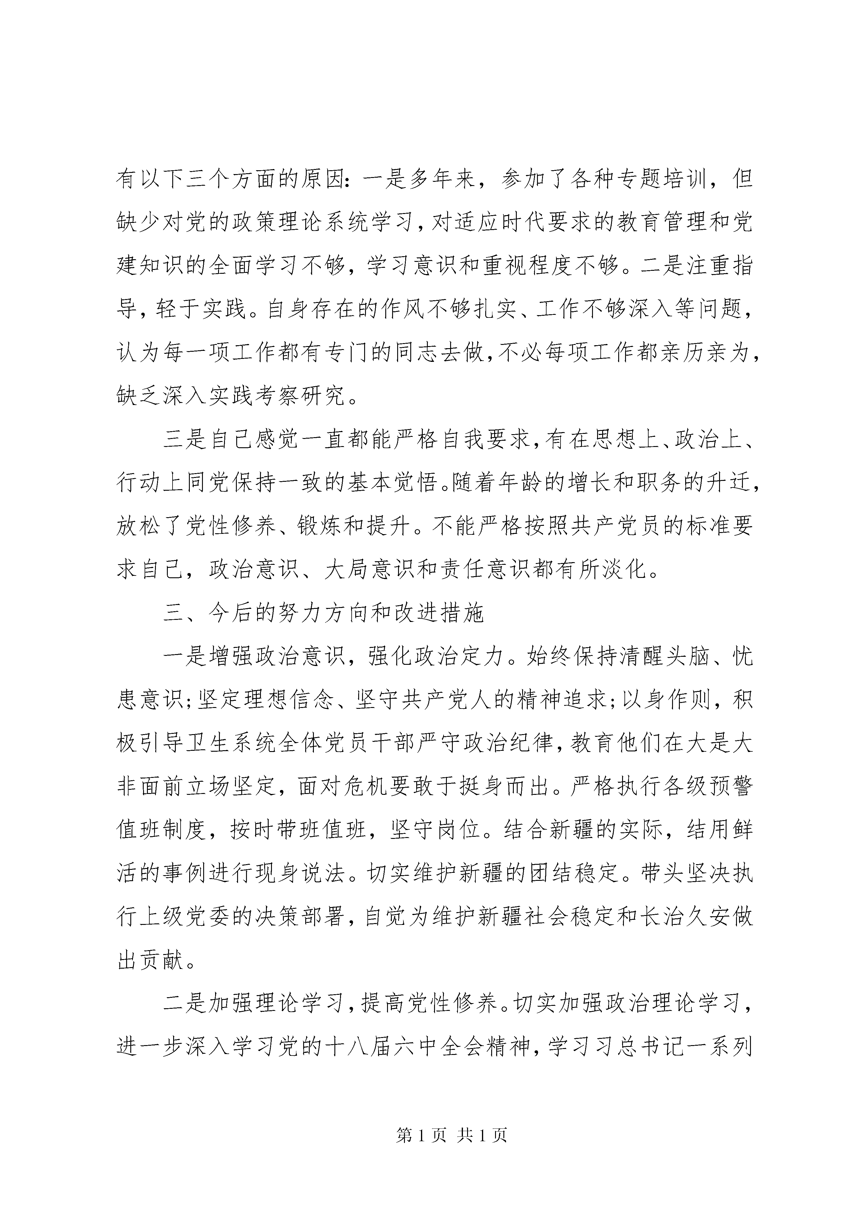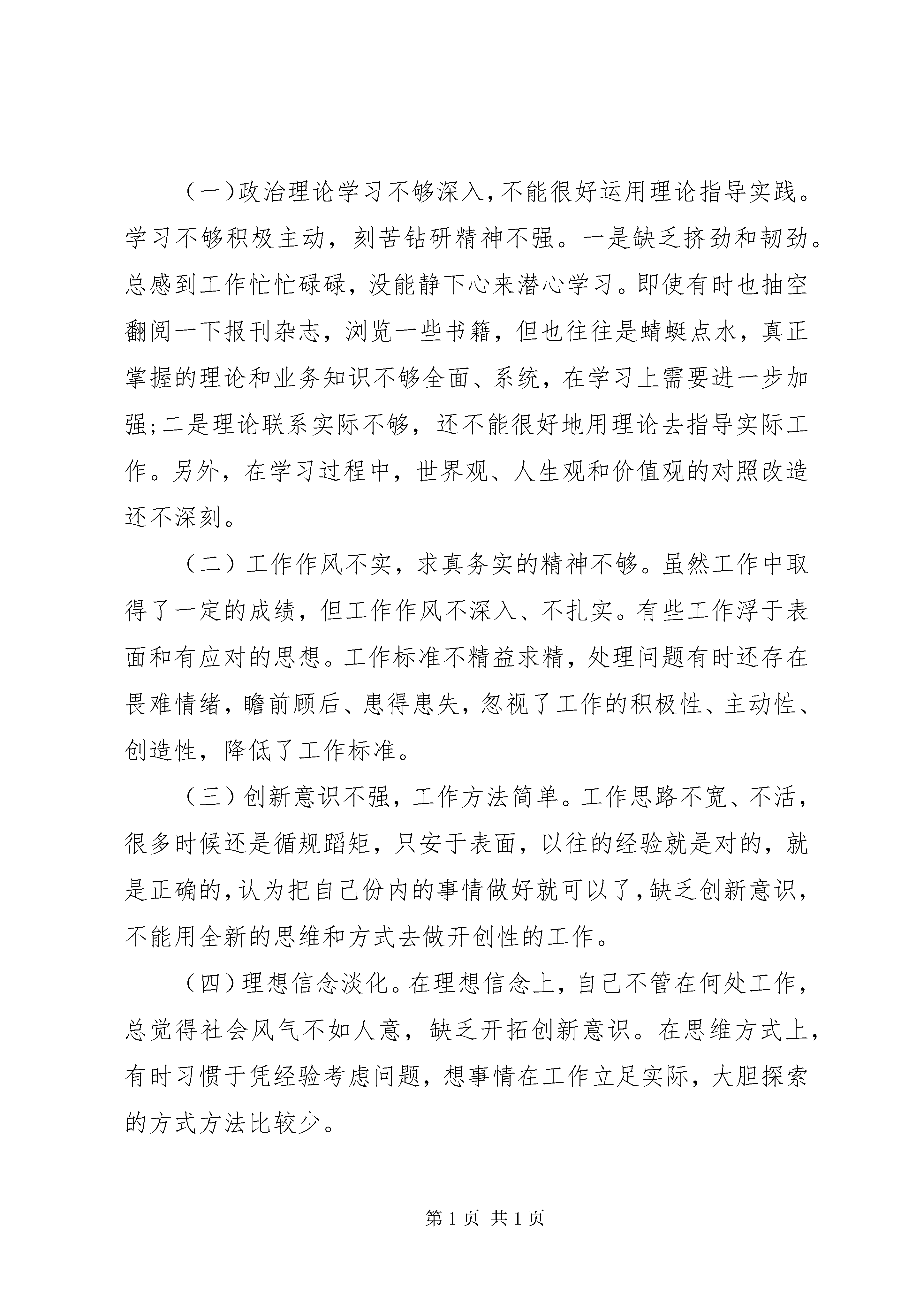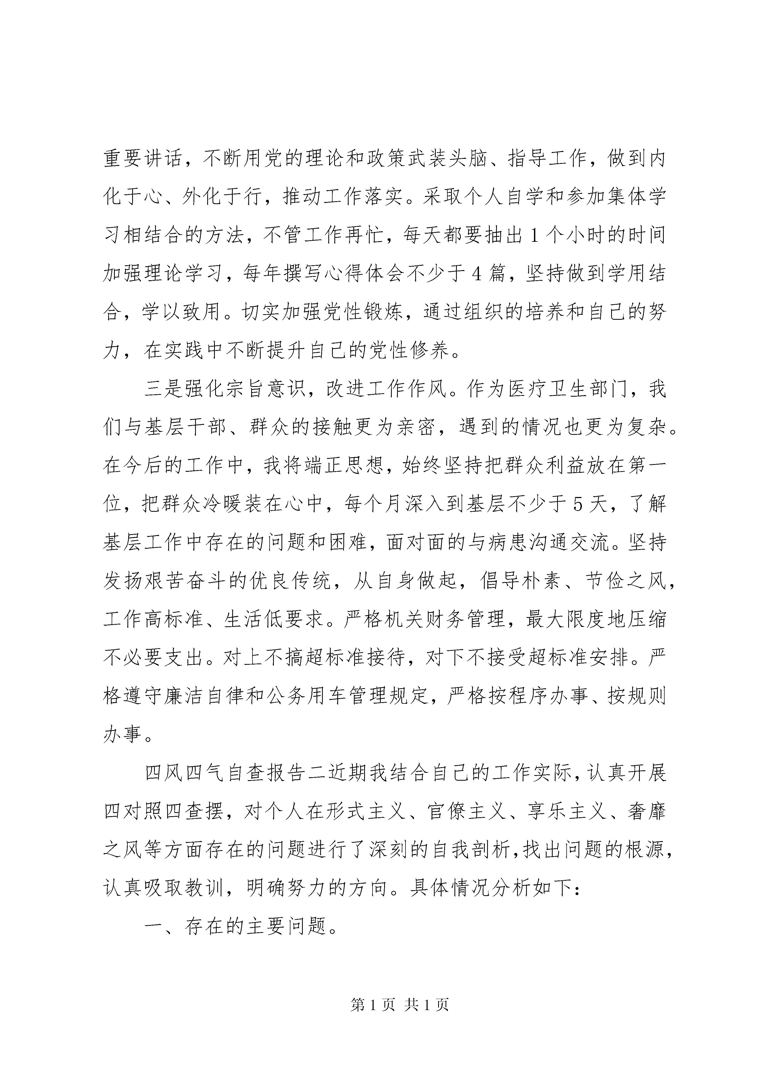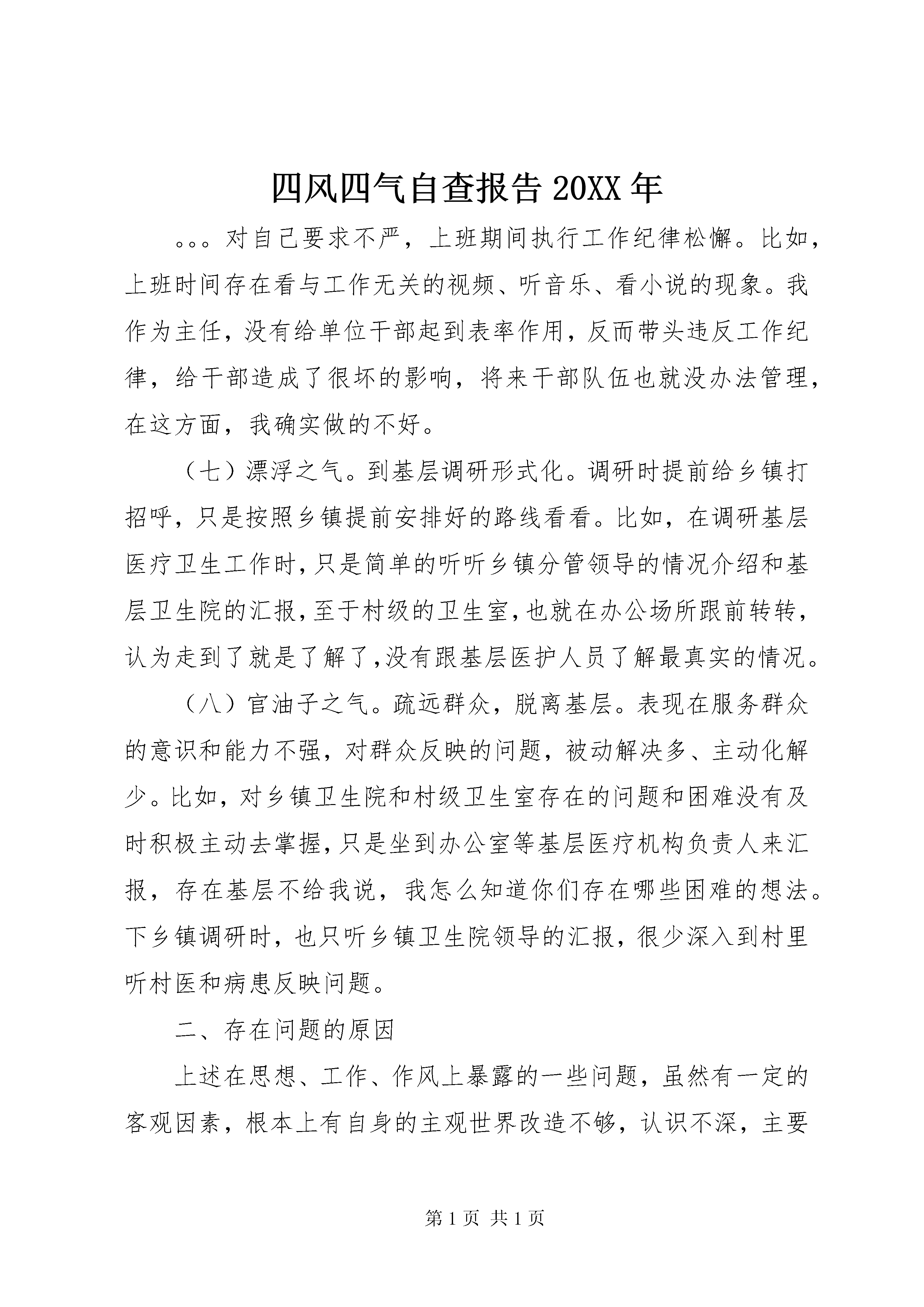 四风四气自查报告20XX年。。。对自己要求不严,上班期间执行工作纪律松懈。比如,上班时间存在看与工作无关的视频、听音乐、看小说的现象。我作为主任,没有给单位干部起到表率作用,反而带头违反工作纪律,给干部造成了很坏的影响,将来干部队伍也就没办法管理,在这方面,我确实做的不好。(七)漂浮之气。到基层调研形式化。调研时提前给乡镇打招呼,只是按照乡镇提前安排好的路线看看。比如,在调研基层医疗卫生工作时,只是简单的听听乡镇分管领导的情况介绍和基层卫生院的汇报,至于村级的卫生室,也就在办公场所跟前转转,认为走到了就是了解了,没有跟基层医护人员了解最真实的情况。(八)官油子之气。疏远群众,脱离基层。表现在服务群众的意识和能力不强,对群众反映的问题,被动解决多、主动化解少。比如,对乡镇卫生院和村级卫生室存在的问题和困难没有及时积极主动去掌握,只是坐到办公室等基层医疗机构负责人来汇报,存在基层不给我说,我怎么知道你们存在哪些困难的想法。下乡镇调研时,也只听乡镇卫生院领导的汇报,很少深入到村里听村医和病患反映问题。二、存在问题的原因上述在思想、工作、作风上暴露的一些问题,虽然有一定的客观因素,根本上有自身的主观世界改造不够,认识不深,主要有以下三个方面的原因:一是多年来,参加了各种专题培训,但缺少对党的政策理论系统学习,对适应时代要求的教育管理和党建知识的全面学习不够,学习意识和重视程度不够。二是注重指导,轻于实践。自身存在的作风不够扎实、工作不够深入等问题,认为每一项工作都有专门的同志去做,不必每项工作都亲历亲为,缺乏深入实践考察研究。三是自己感觉一直都能严格自我要求,有在思想上、政治上、行动上同党保持一致的基本觉悟。随着年龄的增长和职务的升迁,放松了党性修养、锻炼和提升。不能严格按照共产党员的标准要求自己,政治意识、大局意识和责任意识都有所淡化。三、今后的努力方向和改进措施一是增强政治意识,强化政治定力。始终保持清醒头脑、忧患意识;坚定理想信念、坚守共产党人的精神追求;以身作则,积极引导卫生系统全体党员干部严守政治纪律,教育他们在大是大非面前立场坚定,面对危机要敢于挺身而出。严格执行各级预警值班制度,按时带班值班,坚守岗位。结合新疆的实际,结用鲜活的事例进行现身说法。切实维护新疆的团结稳定。带头坚决执行上级党委的决策部署,自觉为维护新疆社会稳定和长治久安做出贡献。二是加强理论学习,提高党性修养。切实加强政治理论学习,进一步深入学习党的十八届六中全会精神,学习习总书记一系列重要讲话,不断用党的理论和政策武装头脑、指导工作,做到内化于心、外化于行,推动工作落实。采取个人自学和参加集体学习相结合的方法,不管工作再忙,每天都要抽出1个小时的时间加强理论学习,每年撰写心得体会不少于4篇,坚持做到学用结合,学以致用。切实加强党性锻炼,通过组织的培养和自己的努力,在实践中不断提升自己的党性修养。三是强化宗旨意识,改进工作作风。作为医疗卫生部门,我们与基层干部、群众的接触更为亲密,遇到的情况也更为复杂。在今后的工作中,我将端正思想,始终坚持把群众利益放在第一位,把群众冷暖装在心中,每个月深入到基层不少于5天,了解基层工作中存在的问题和困难,面对面的与病患沟通交流。坚持发扬艰苦奋斗的优良传统,从自身做起,倡导朴素、节俭之风,工作高标准、生活低要求。严格机关财务管理,最大限度地压缩不必要支出。对上不搞超标准接待,对下不接受超标准安排。严格遵守廉洁自律和公务用车管理规定,严格按程序办事、按规则办事。四风四气自查报告二近期我结合自己的工作实际,认真开展四对照四查摆,对个人在形式主义、官僚主义、享乐主义、奢靡之风等方面存在的问题进行了深刻的自我剖析,找出问题的根源,认真吸取教训,明确努力的方向。具体情况分析如下:一、存在的主要问题。(一)政治理论学习不够深入,不能很好运用理论指导实践。学习不够积极主动,刻苦钻研精神不强。一是缺乏挤劲和韧劲。总感到工作忙忙碌碌,没能静下心来潜心学习。即使有时也抽空翻阅一下报刊杂志,浏览一些书籍,但也往往是蜻蜓点水,真正掌握的理论和业务知识不够全面、系统,在学习上需要进一步加强;二是理论联系实际不够,还不能很好地用理论去指导实际工作。另外,在学习过程中,世界观、人生观和价值观的对照改造还不深刻。(二)工作作风不实,求真务实的精神不够。虽然工作中取得了一定的成绩,但工作作风不深入、不扎实。有些工作浮于表面和有应对的思想。工作标准不精益求精,处理问题有时还存在畏难情绪,瞻前顾后、患得患失,忽视了工作的积极性、主动性、创造性,降低了工作标准。(三)创新意识不强,工作方法简单。工作思路不宽、不活,很多时候还是循规蹈矩,只安于表面,以往的经验就是对的,就是正确的,认为把自己份内的事情做好就可以了,缺乏创新意识,不能用全新的