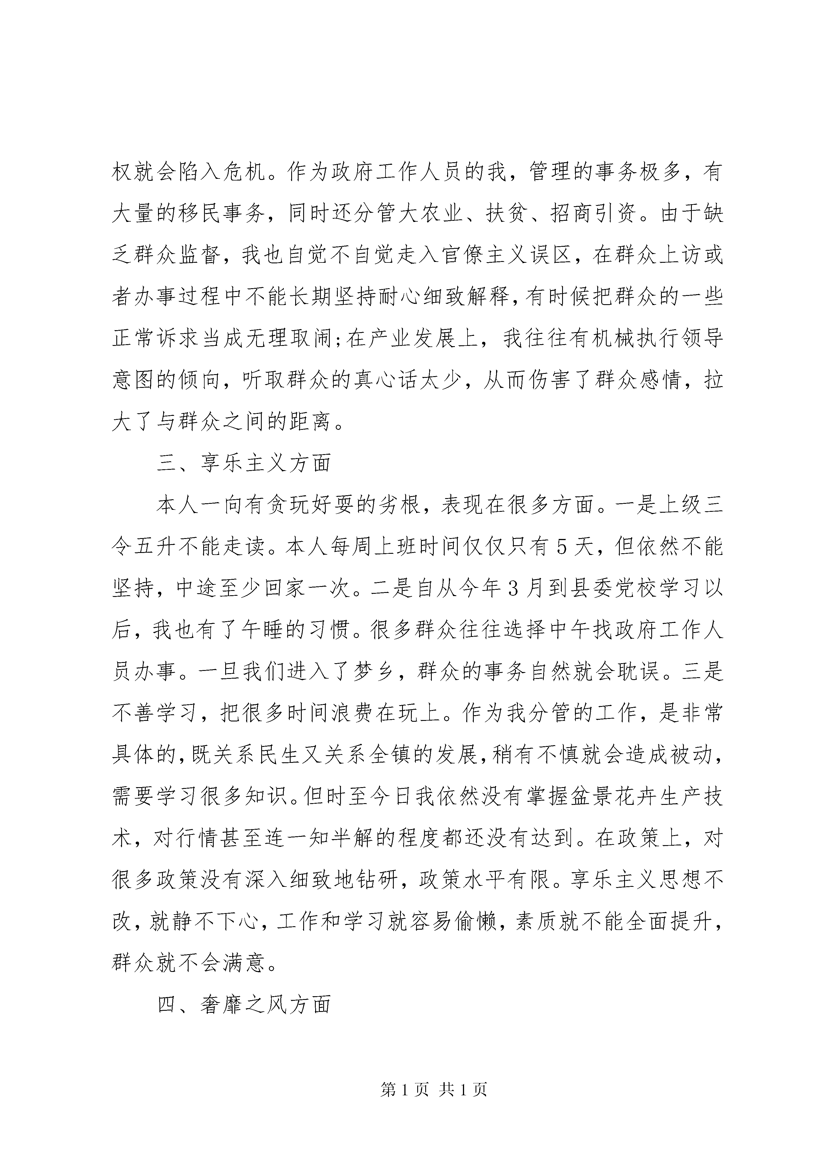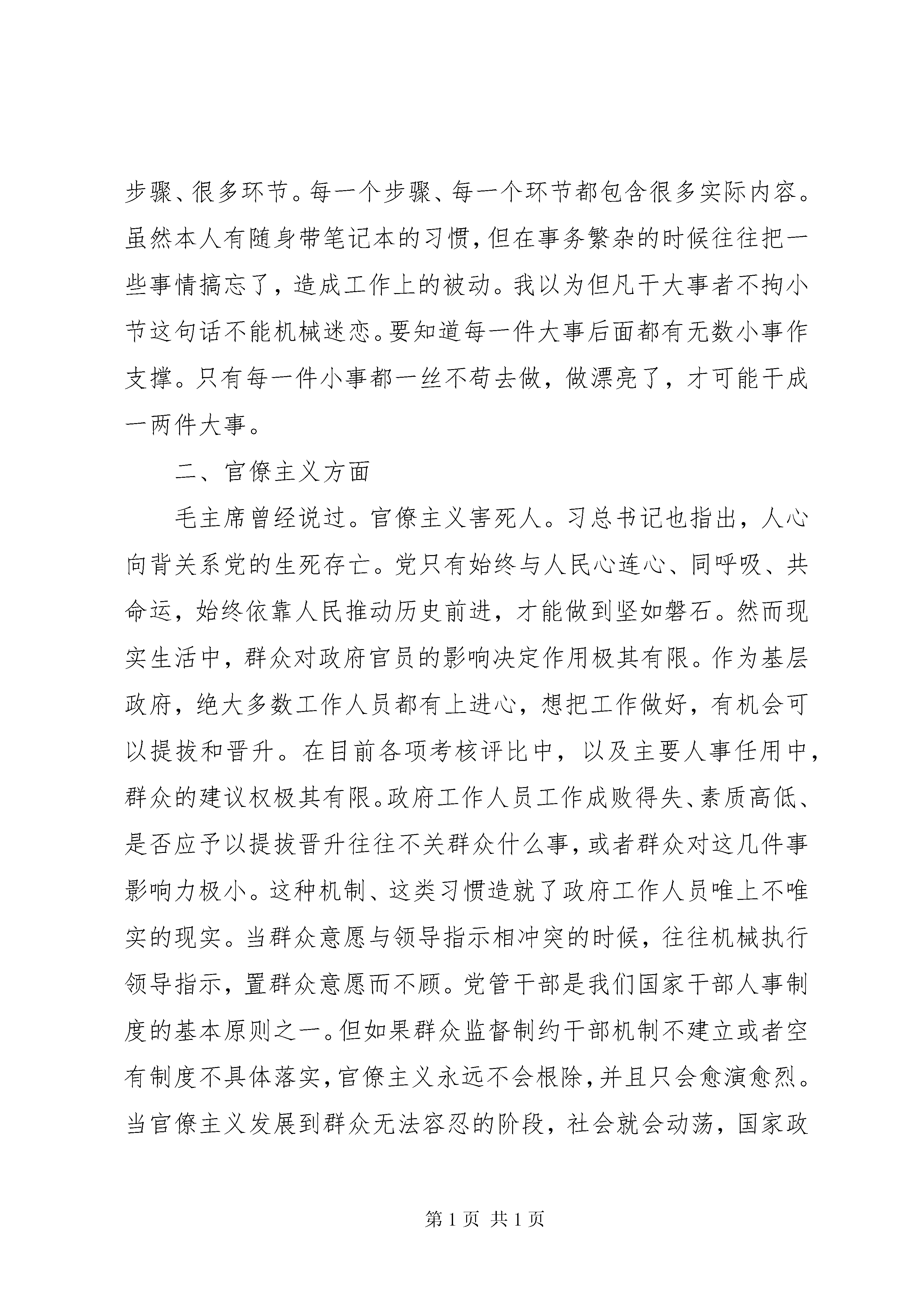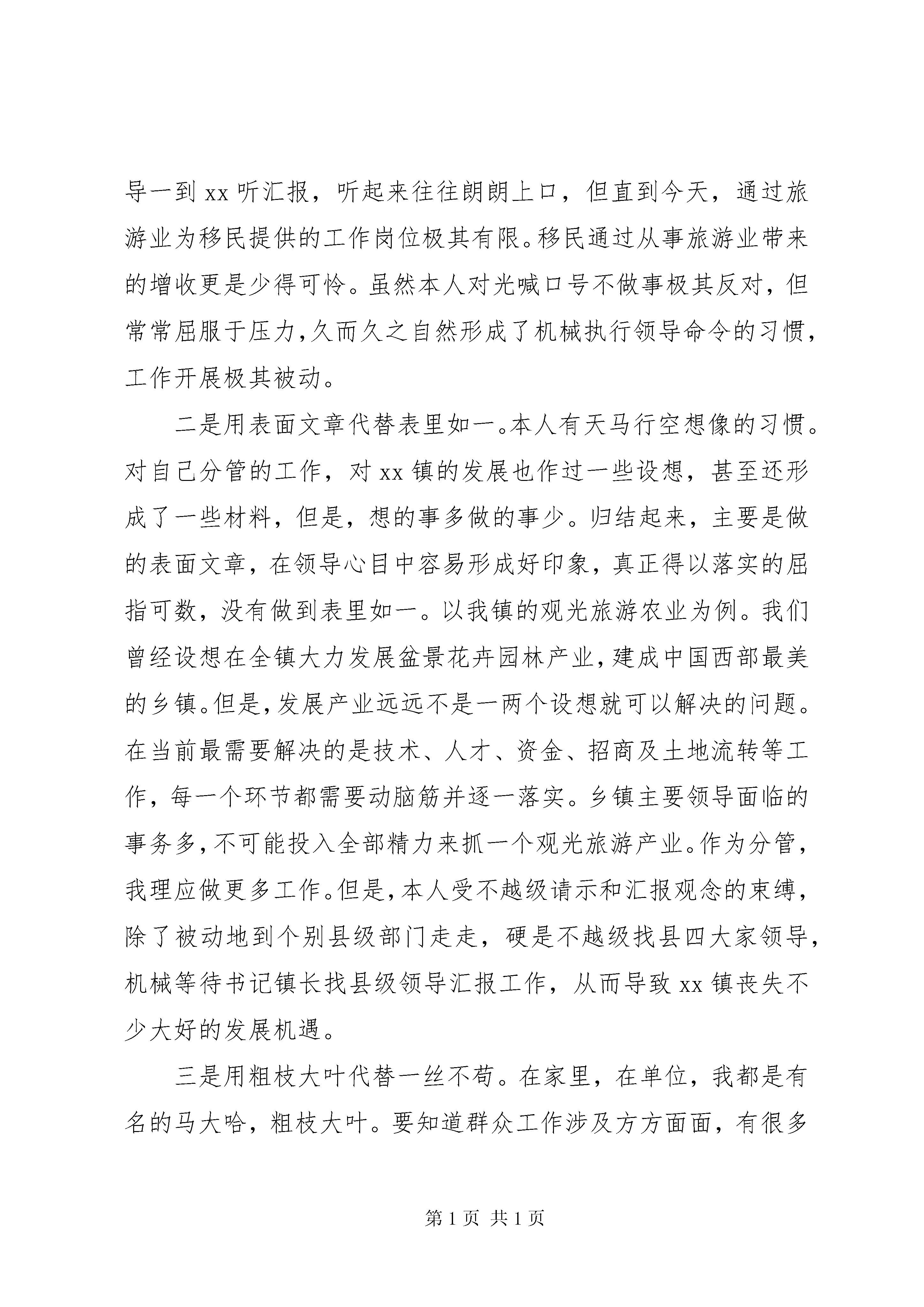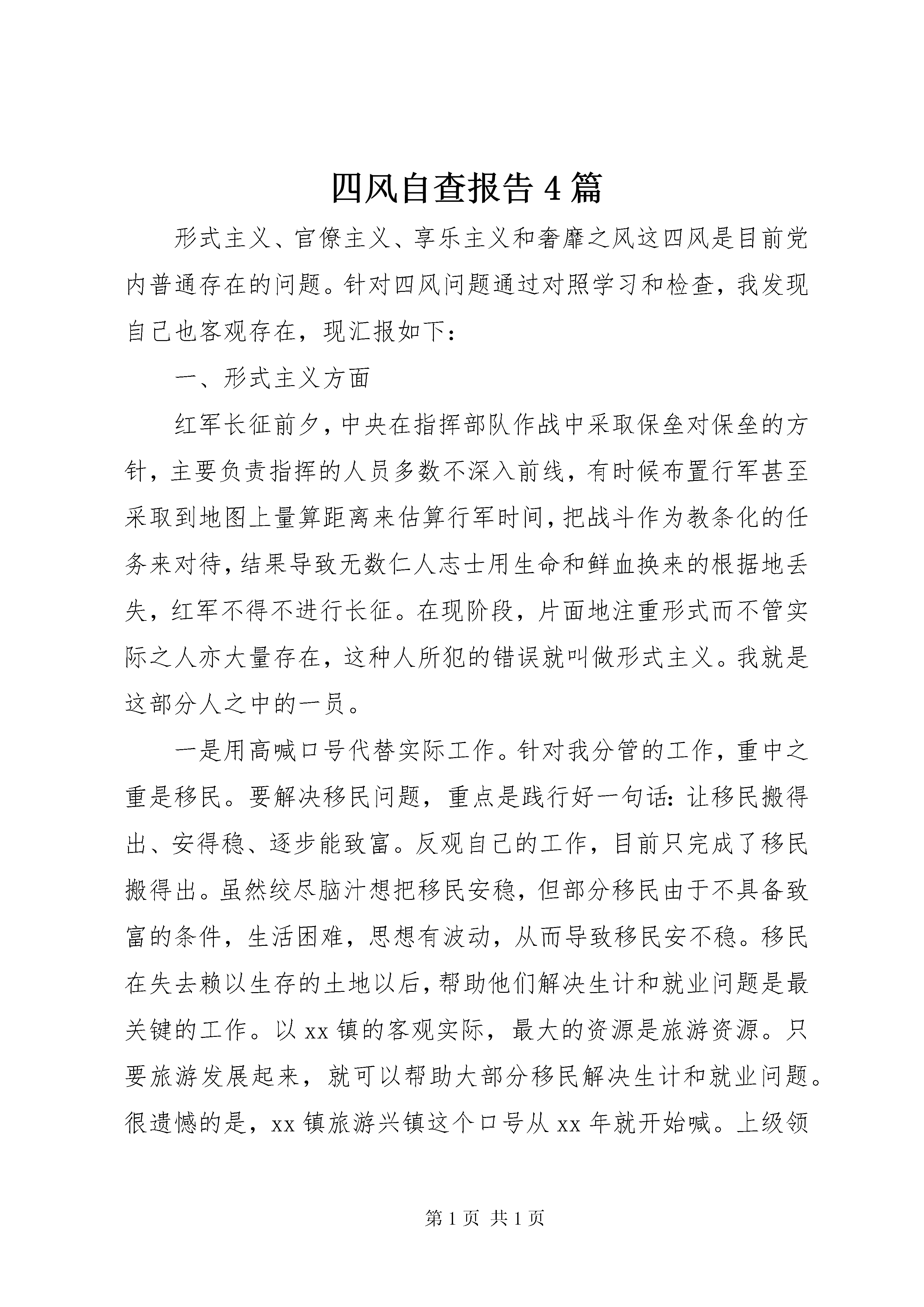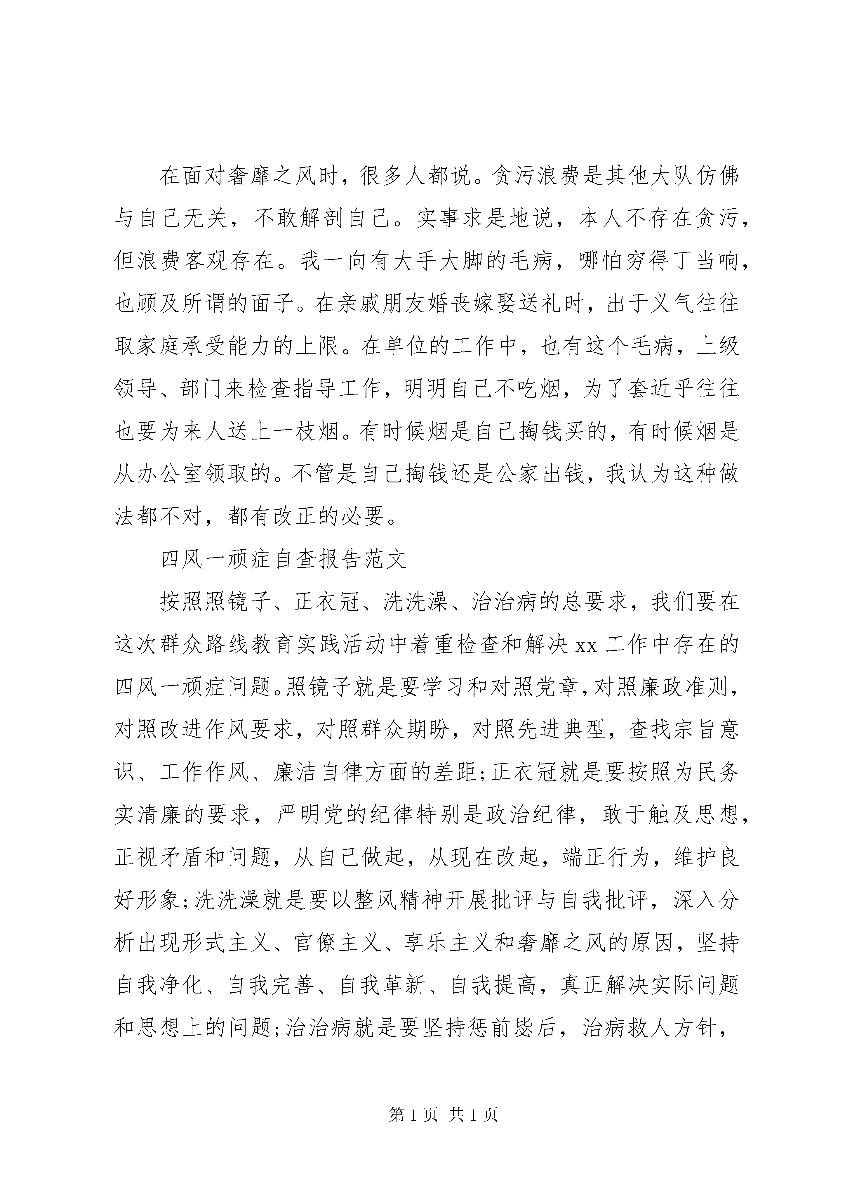 四风自查报告4篇形式主义、官僚主义、享乐主义和奢靡之风这四风是目前党内普通存在的问题。针对四风问题通过对照学习和检查,我发现自己也客观存在,现汇报如下:一、形式主义方面红军长征前夕,中央在指挥部队作战中采取保垒对保垒的方针,主要负责指挥的人员多数不深入前线,有时候布置行军甚至采取到地图上量算距离来估算行军时间,把战斗作为教条化的任务来对待,结果导致无数仁人志士用生命和鲜血换来的根据地丢失,红军不得不进行长征。在现阶段,片面地注重形式而不管实际之人亦大量存在,这种人所犯的错误就叫做形式主义。我就是这部分人之中的一员。一是用高喊口号代替实际工作。针对我分管的工作,重中之重是移民。要解决移民问题,重点是践行好一句话:让移民搬得出、安得稳、逐步能致富。反观自己的工作,目前只完成了移民搬得出。虽然绞尽脑汁想把移民安稳,但部分移民由于不具备致富的条件,生活困难,思想有波动,从而导致移民安不稳。移民在失去赖以生存的土地以后,帮助他们解决生计和就业问题是最关键的工作。以xx镇的客观实际,最大的资源是旅游资源。只要旅游发展起来,就可以帮助大部分移民解决生计和就业问题。很遗憾的是,xx镇旅游兴镇这个口号从xx年就开始喊。上级领导一到xx听汇报,听起来往往朗朗上口,但直到今天,通过旅游业为移民提供的工作岗位极其有限。移民通过从事旅游业带来的增收更是少得可怜。虽然本人对光喊口号不做事极其反对,但常常屈服于压力,久而久之自然形成了机械执行领导命令的习惯,工作开展极其被动。二是用表面文章代替表里如一。本人有天马行空想像的习惯。对自己分管的工作,对xx镇的发展也作过一些设想,甚至还形成了一些材料,但是,想的事多做的事少。归结起来,主要是做的表面文章,在领导心目中容易形成好印象,真正得以落实的屈指可数,没有做到表里如一。以我镇的观光旅游农业为例。我们曾经设想在全镇大力发展盆景花卉园林产业,建成中国西部最美的乡镇。但是,发展产业远远不是一两个设想就可以解决的问题。在当前最需要解决的是技术、人才、资金、招商及土地流转等工作,每一个环节都需要动脑筋并逐一落实。乡镇主要领导面临的事务多,不可能投入全部精力来抓一个观光旅游产业。作为分管,我理应做更多工作。但是,本人受不越级请示和汇报观念的束缚,除了被动地到个别县级部门走走,硬是不越级找县四大家领导,机械等待书记镇长找县级领导汇报工作,从而导致xx镇丧失不少大好的发展机遇。三是用粗枝大叶代替一丝不苟。在家里,在单位,我都是有名的马大哈,粗枝大叶。要知道群众工作涉及方方面面,有很多步骤、很多环节。每一个步骤、每一个环节都包含很多实际内容。虽然本人有随身带笔记本的习惯,但在事务繁杂的时候往往把一些事情搞忘了,造成工作上的被动。我以为但凡干大事者不拘小节这句话不能机械迷恋。要知道每一件大事后面都有无数小事作支撑。只有每一件小事都一丝不苟去做,做漂亮了,才可能干成一两件大事。二、官僚主义方面毛主席曾经说过。官僚主义害死人。习总书记也指出,人心向背关系党的生死存亡。党只有始终与人民心连心、同呼吸、共命运,始终依靠人民推动历史前进,才能做到坚如磐石。然而现实生活中,群众对政府官员的影响决定作用极其有限。作为基层政府,绝大多数工作人员都有上进心,想把工作做好,有机会可以提拔和晋升。在目前各项考核评比中,以及主要人事任用中,群众的建议权极其有限。政府工作人员工作成败得失、素质高低、是否应予以提拔晋升往往不关群众什么事,或者群众对这几件事影响力极小。这种机制、这类习惯造就了政府工作人员唯上不唯实的现实。当群众意愿与领导指示相冲突的时候,往往机械执行领导指示,置群众意愿而不顾。党管干部是我们国家干部人事制度的基本原则之一。但如果群众监督制约干部机制不建立或者空有制度不具体落实,官僚主义永远不会根除,并且只会愈演愈烈。当官僚主义发展到群众无法容忍的阶段,社会就会动荡,国家政权就会陷入危机。作为政府工作人员的我,管理的事务极多,有大量的移民事务,同时还分管大农业、扶贫、招商引资。由于缺乏群众监督,我也自觉不自觉走入官僚主义误区,在群众上访或者办事过程中不能长期坚持耐心细致解释,有时候把群众的一些正常诉求当成无理取闹;在产业发展上,我往往有机械执行领导意图的倾向,听取群众的真心话太少,从而伤害了群众感情,拉大了与群众之间的距离。三、享乐主义方面本人一向有贪玩好耍的劣根,表现在很多方面。一是上级三令五升不能走读。本人每周上班时间仅仅只有5天,但依然不能坚持,中途至少回家一次。二是自从今年3月到县委党校学习以后,我也有了午睡的习惯。很多群众往往选择中午找政府工作人员办事。一旦我们进入了梦乡,群众的事务自然就会耽误。三是不善学习,把很多时间浪费在玩上。作为我分管的工作,是非常具体的,既关系民生又关系全镇的发展,稍有不慎就会造