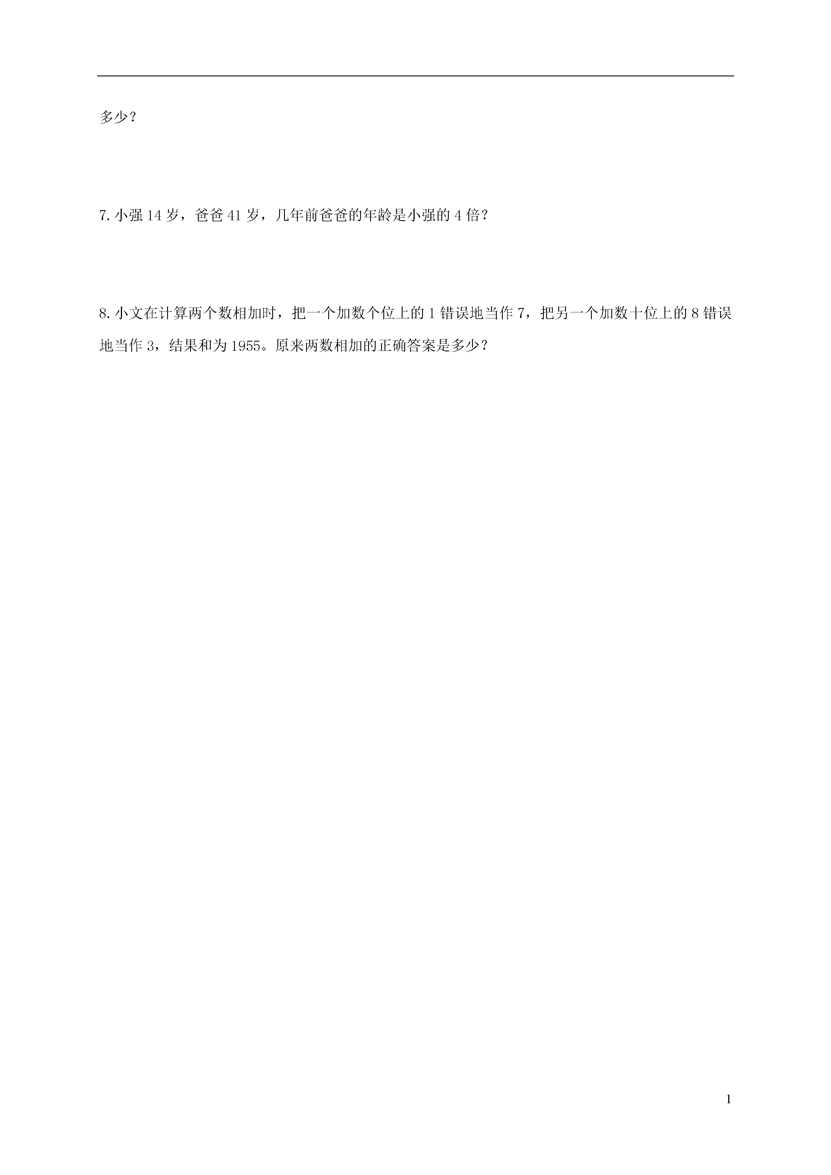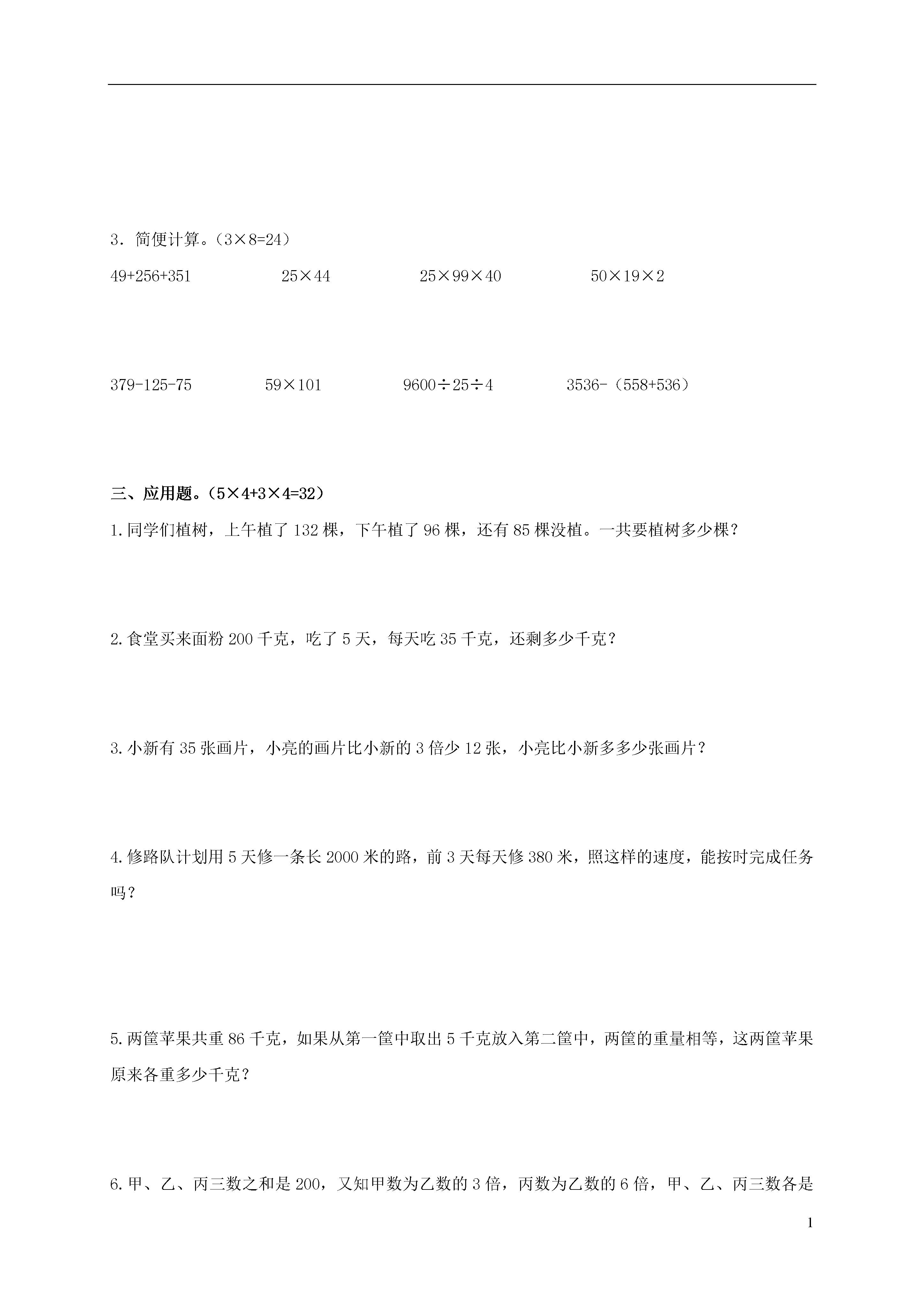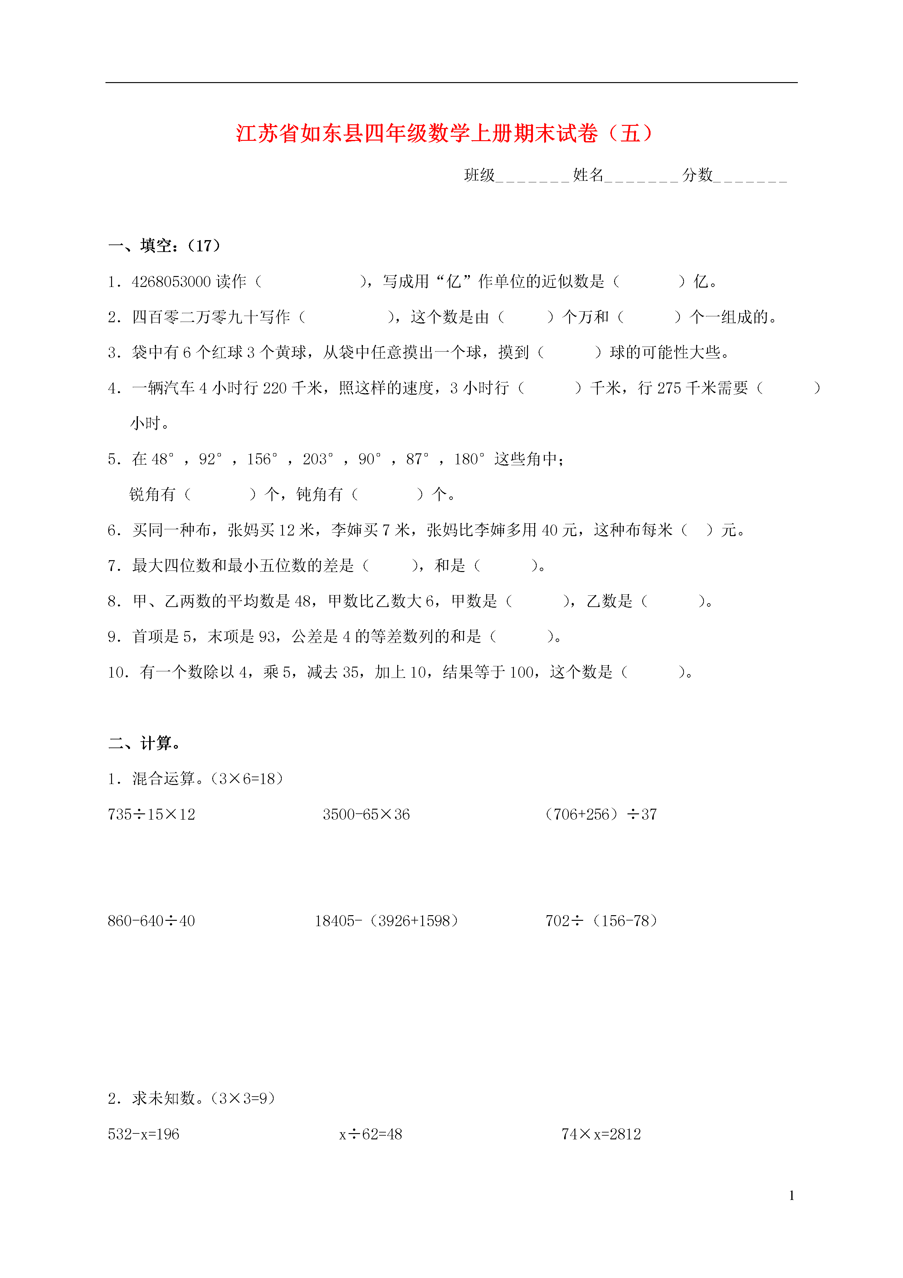 1江苏省如东县四年级数学上册期末试卷(五)班级_______姓名_______分数_______一、填空:(17)1.4268053000读作(),写成用“亿”作单位的近似数是()亿。2.四百零二万零九十写作(),这个数是由()个万和()个一组成的。3.袋中有6个红球3个黄球,从袋中任意摸出一个球,摸到()球的可能性大些。4.一辆汽车4小时行220千米,照这样的速度,3小时行()千米,行275千米需要()小时。5.在48°,92°,156°,203°,90°,87°,180°这些角中;锐角有()个,钝角有()个。6.买同一种布,张妈买12米,李婶买7米,张妈比李婶多用40元,这种布每米()元。7.最大四位数和最小五位数的差是(),和是()。8.甲、乙两数的平均数是48,甲数比乙数大6,甲数是(),乙数是()。9.首项是5,末项是93,公差是4的等差数列的和是()。10.有一个数除以4,乘5,减去35,加上10,结果等于100,这个数是()。二、计算。1.混合运算。(3×6=18)735÷15×123500-65×36(706+256)÷37860-640÷4018405-(3926+1598)702÷(156-78)2.求未知数。(3×3=9)532-x=196x÷62=4874×x=28123.简便计算。(3×8=24)49+256+35125×4425×99×4050×19×2379-125-7559×1019600÷25÷43536-(558+536)三、应用题。(5×4+3×4=32)1.同学们植树,上午植了132棵,下午植了96棵,还有85棵没植。一共要植树多少棵?2.食堂买来面粉200千克,吃了5天,每天吃35千克,还剩多少千克?3.小新有35张画片,小亮的画片比小新的3倍少12张,小亮比小新多多少张画片?4.修路队计划用5天修一条长2000米的路,前3天每天修380米,照这样的速度,能按时完成任务吗?5.两筐苹果共重86千克,如果从第一筐中取出5千克放入第二筐中,两筐的重量相等,这两筐苹果原来各重多少千克?6.甲、乙、丙三数之和是200,又知甲数为乙数的3倍,丙数为乙数的6倍,甲、乙、丙三数各是多少?7.小强14岁,爸爸41岁,几年前爸爸的年龄是小强的4倍?8.小文在计算两个数相加时,把一个加数个位上的1错误地当作7,把另一个加数十位上的8错误地当作3,结果和为1955。原来两数相加的正确答案是多少?