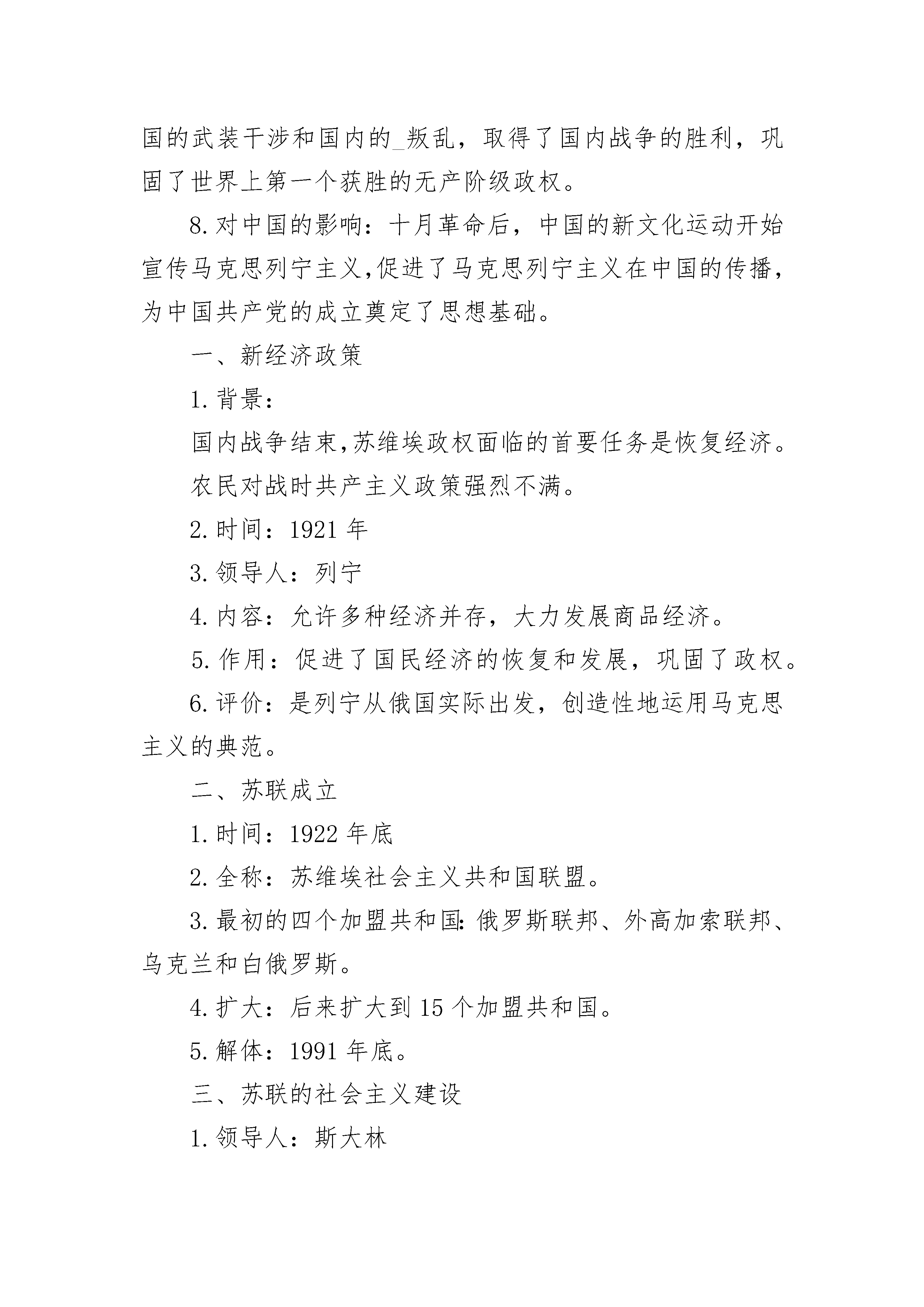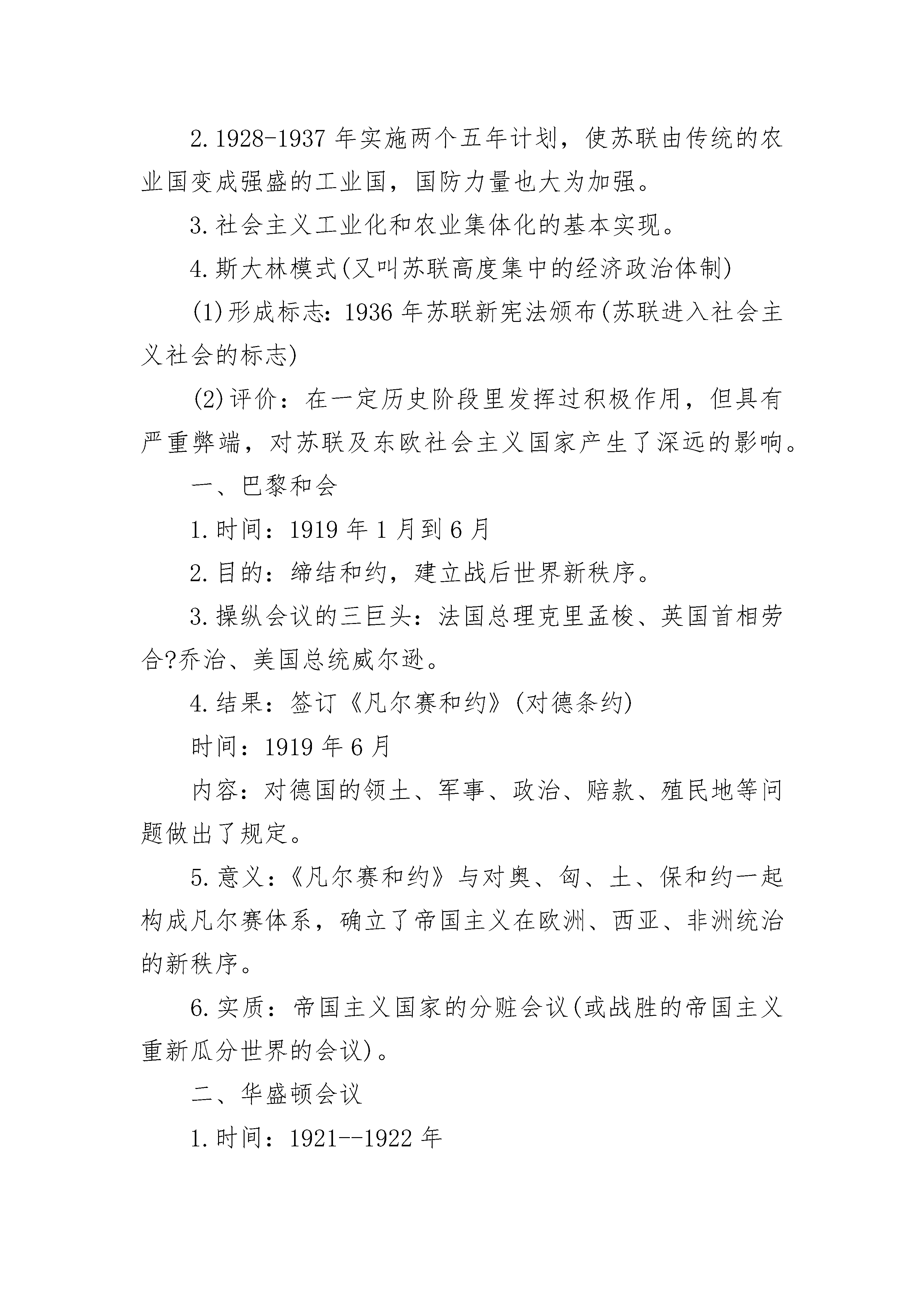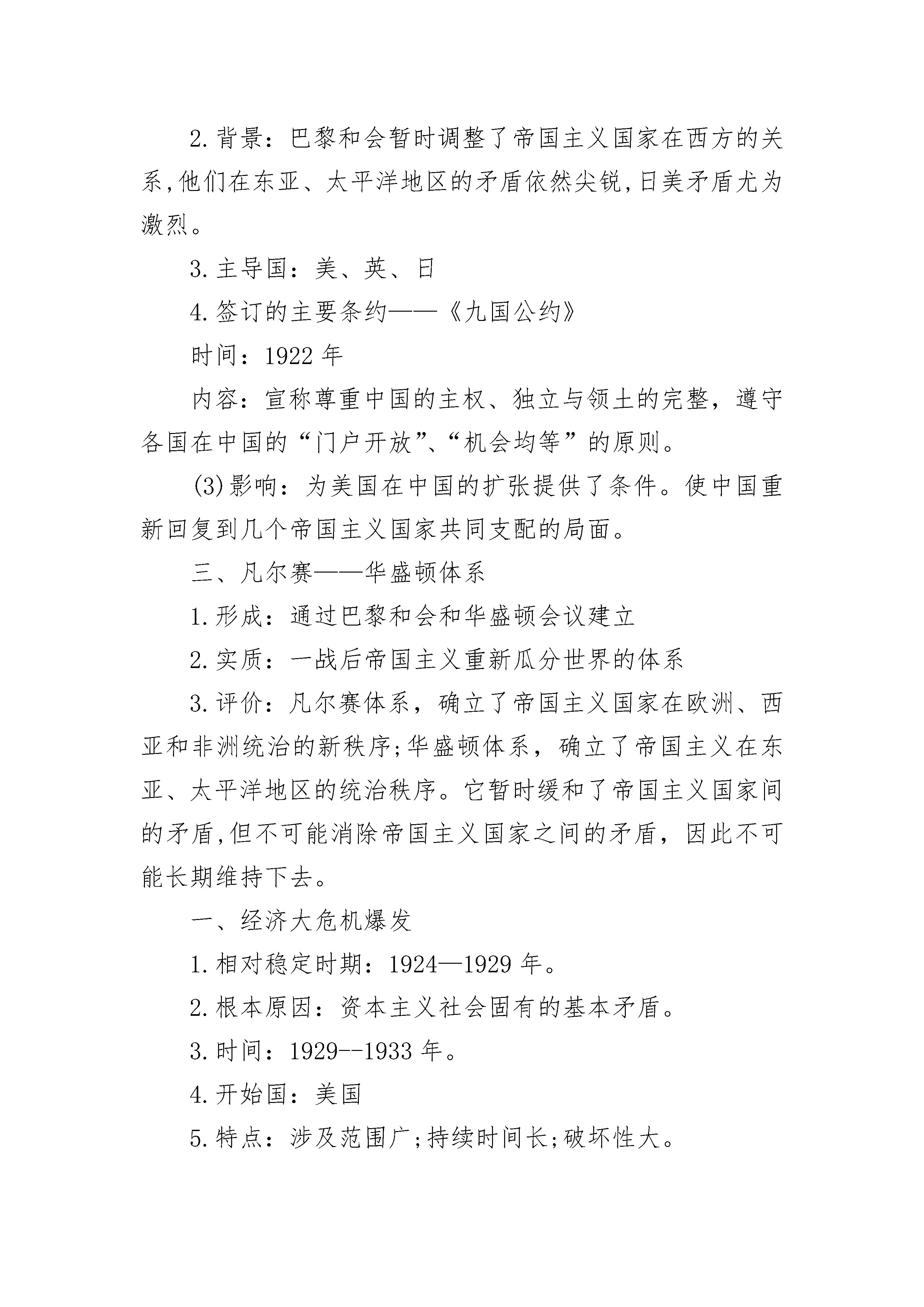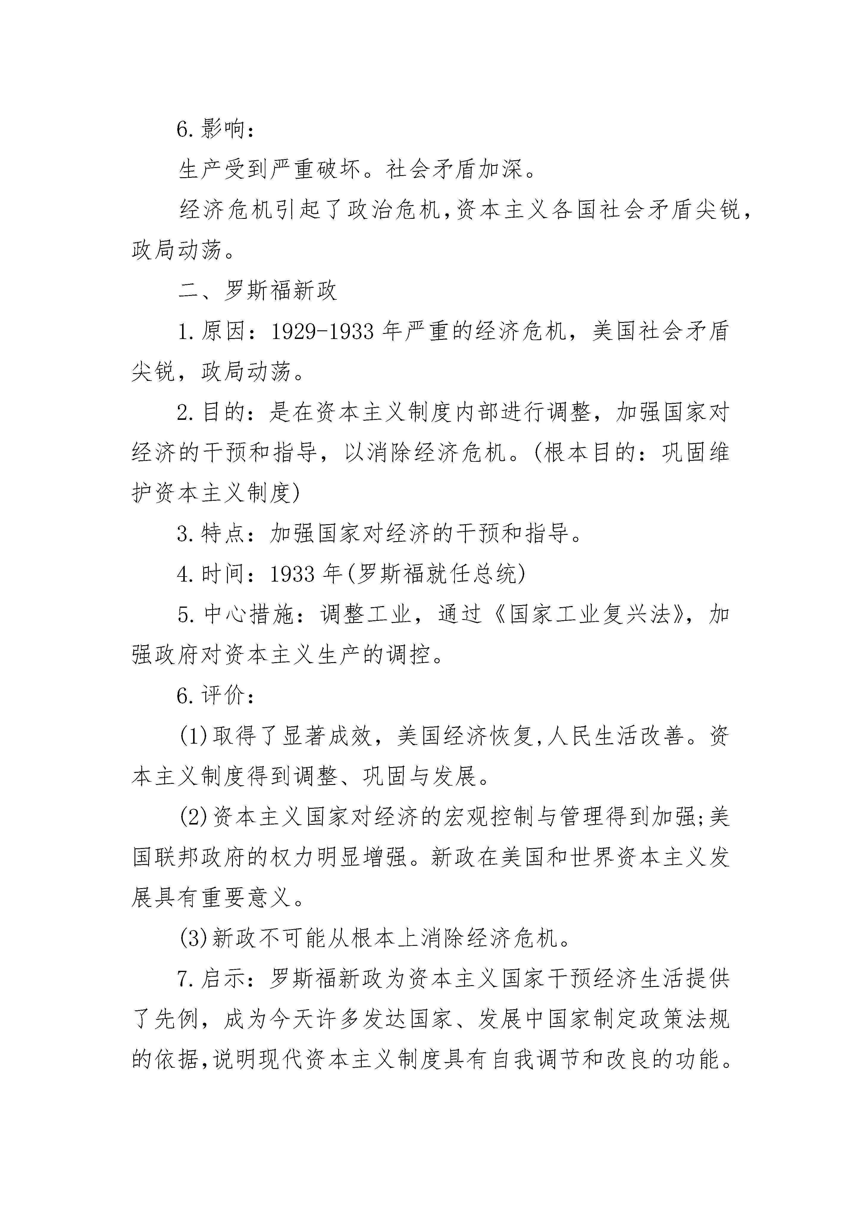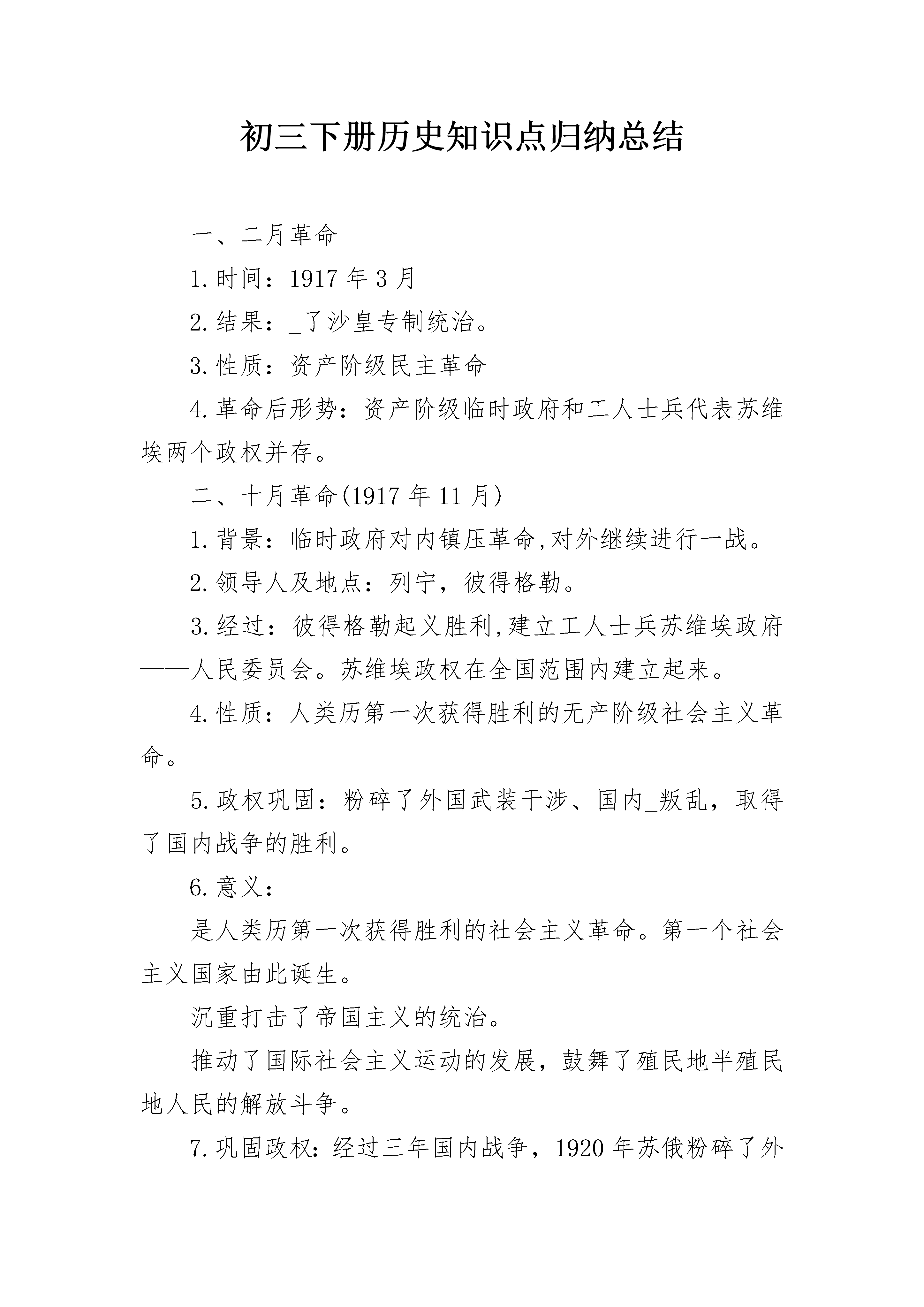 初三下册历史知识点归纳总结一、二月革命1.时间:1917年3月2.结果:_了沙皇专制统治。3.性质:资产阶级民主革命4.革命后形势:资产阶级临时政府和工人士兵代表苏维埃两个政权并存。二、十月革命(1917年11月)1.背景:临时政府对内镇压革命,对外继续进行一战。2.领导人及地点:列宁,彼得格勒。3.经过:彼得格勒起义胜利,建立工人士兵苏维埃政府——人民委员会。苏维埃政权在全国范围内建立起来。4.性质:人类历第一次获得胜利的无产阶级社会主义革命。5.政权巩固:粉碎了外国武装干涉、国内_叛乱,取得了国内战争的胜利。6.意义:是人类历第一次获得胜利的社会主义革命。第一个社会主义国家由此诞生。沉重打击了帝国主义的统治。推动了国际社会主义运动的发展,鼓舞了殖民地半殖民地人民的解放斗争。7.巩固政权:经过三年国内战争,1920年苏俄粉碎了外国的武装干涉和国内的_叛乱,取得了国内战争的胜利,巩固了世界上第一个获胜的无产阶级政权。8.对中国的影响:十月革命后,中国的新文化运动开始宣传马克思列宁主义,促进了马克思列宁主义在中国的传播,为中国共产党的成立奠定了思想基础。一、新经济政策1.背景:国内战争结束,苏维埃政权面临的首要任务是恢复经济。农民对战时共产主义政策强烈不满。2.时间:1921年3.领导人:列宁4.内容:允许多种经济并存,大力发展商品经济。5.作用:促进了国民经济的恢复和发展,巩固了政权。6.评价:是列宁从俄国实际出发,创造性地运用马克思主义的典范。二、苏联成立1.时间:1922年底2.全称:苏维埃社会主义共和国联盟。3.最初的四个加盟共和国:俄罗斯联邦、外高加索联邦、乌克兰和白俄罗斯。4.扩大:后来扩大到15个加盟共和国。5.解体:1991年底。三、苏联的社会主义建设1.领导人:斯大林2.1928-1937年实施两个五年计划,使苏联由传统的农业国变成强盛的工业国,国防力量也大为加强。3.社会主义工业化和农业集体化的基本实现。4.斯大林模式(又叫苏联高度集中的经济政治体制)(1)形成标志:1936年苏联新宪法颁布(苏联进入社会主义社会的标志)(2)评价:在一定历史阶段里发挥过积极作用,但具有严重弊端,对苏联及东欧社会主义国家产生了深远的影响。一、巴黎和会1.时间:1919年1月到6月2.目的:缔结和约,建立战后世界新秩序。3.操纵会议的三巨头:法国总理克里孟梭、英国首相劳合?乔治、美国总统威尔逊。4.结果:签订《凡尔赛和约》(对德条约)时间:1919年6月内容:对德国的领土、军事、政治、赔款、殖民地等问题做出了规定。5.意义:《凡尔赛和约》与对奥、匈、土、保和约一起构成凡尔赛体系,确立了帝国主义在欧洲、西亚、非洲统治的新秩序。6.实质:帝国主义国家的分赃会议(或战胜的帝国主义重新瓜分世界的会议)。二、华盛顿会议1.时间:1921--1922年2.背景:巴黎和会暂时调整了帝国主义国家在西方的关系,他们在东亚、太平洋地区的矛盾依然尖锐,日美矛盾尤为激烈。3.主导国:美、英、日4.签订的主要条约——《九国公约》时间:1922年内容:宣称尊重中国的主权、独立与领土的完整,遵守各国在中国的“门户开放”、“机会均等”的原则。(3)影响:为美国在中国的扩张提供了条件。使中国重新回复到几个帝国主义国家共同支配的局面。三、凡尔赛——华盛顿体系1.形成:通过巴黎和会和华盛顿会议建立2.实质:一战后帝国主义重新瓜分世界的体系3.评价:凡尔赛体系,确立了帝国主义国家在欧洲、西亚和非洲统治的新秩序;华盛顿体系,确立了帝国主义在东亚、太平洋地区的统治秩序。它暂时缓和了帝国主义国家间的矛盾,但不可能消除帝国主义国家之间的矛盾,因此不可能长期维持下去。一、经济大危机爆发1.相对稳定时期:1924—1929年。2.根本原因:资本主义社会固有的基本矛盾。3.时间:1929--1933年。4.开始国:美国5.特点:涉及范围广;持续时间长;破坏性大。6.影响:生产受到严重破坏。社会矛盾加深。经济危机引起了政治危机,资本主义各国社会矛盾尖锐,政局动荡。二、罗斯福新政1.原因:1929-1933年严重的经济危机,美国社会矛盾尖锐,政局动荡。2.目的:是在资本主义制度内部进行调整,加强国家对经济的干预和指导,以消除经济危机。(根本目的:巩固维护资本主义制度)3.特点:加强国家对经济的干预和指导。4.时间:1933年(罗斯福就任总统)5.中心措施:调整工业,通过《国家工业复兴法》,加强政府对资本主义生产的调控。6.评价:(1)取得了显著成效,美国经济恢复,人民生活改善。资本主义制度得到调整、巩固与发展。(2)资本主义国家对经济的宏观控制与管理得到加强;美国联邦政府的权力明显增强。新政在美国和世界资本主义发展具有重要意义。(3)新政不可能从根本上消除经济危机。7.启示:罗斯福
