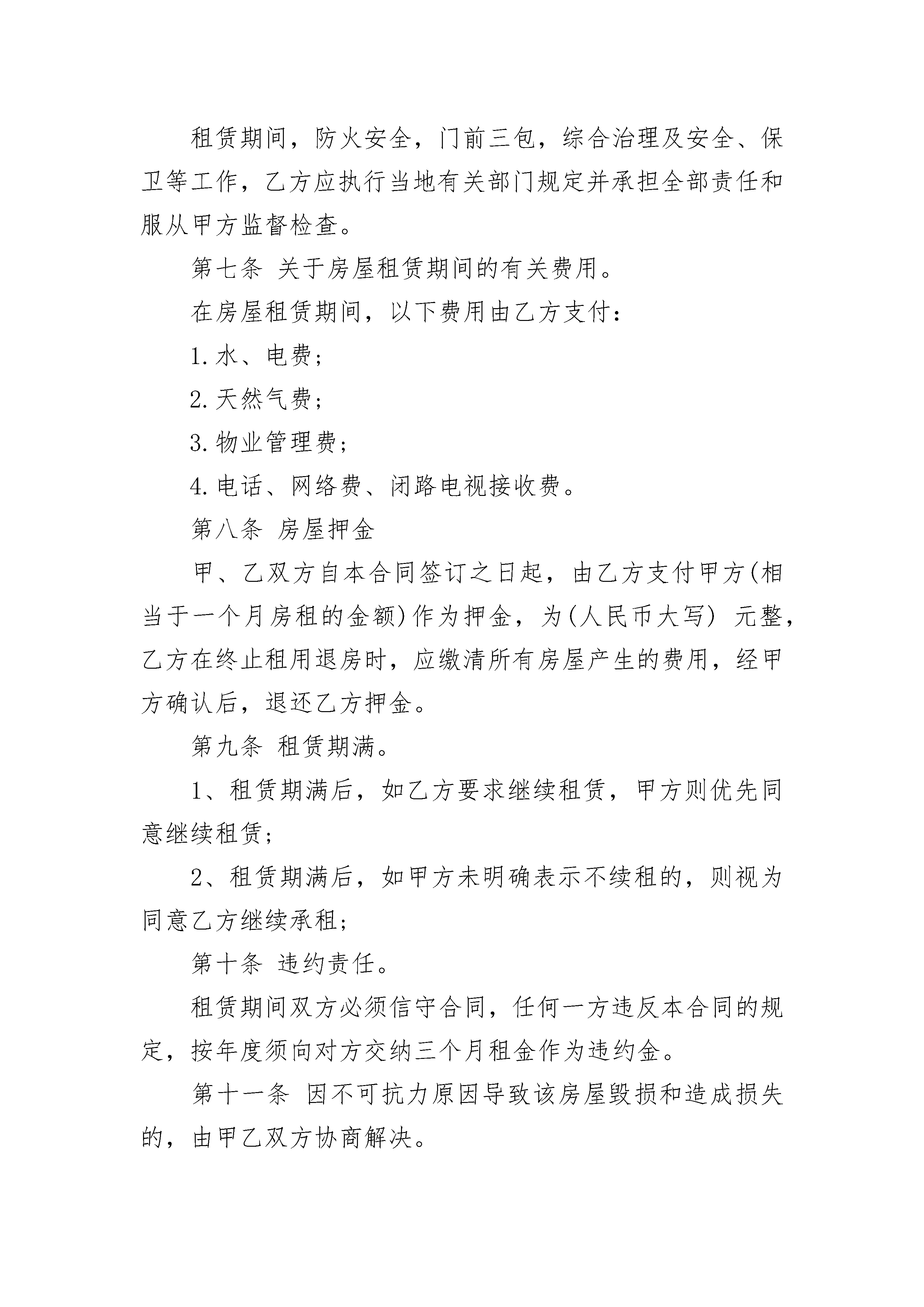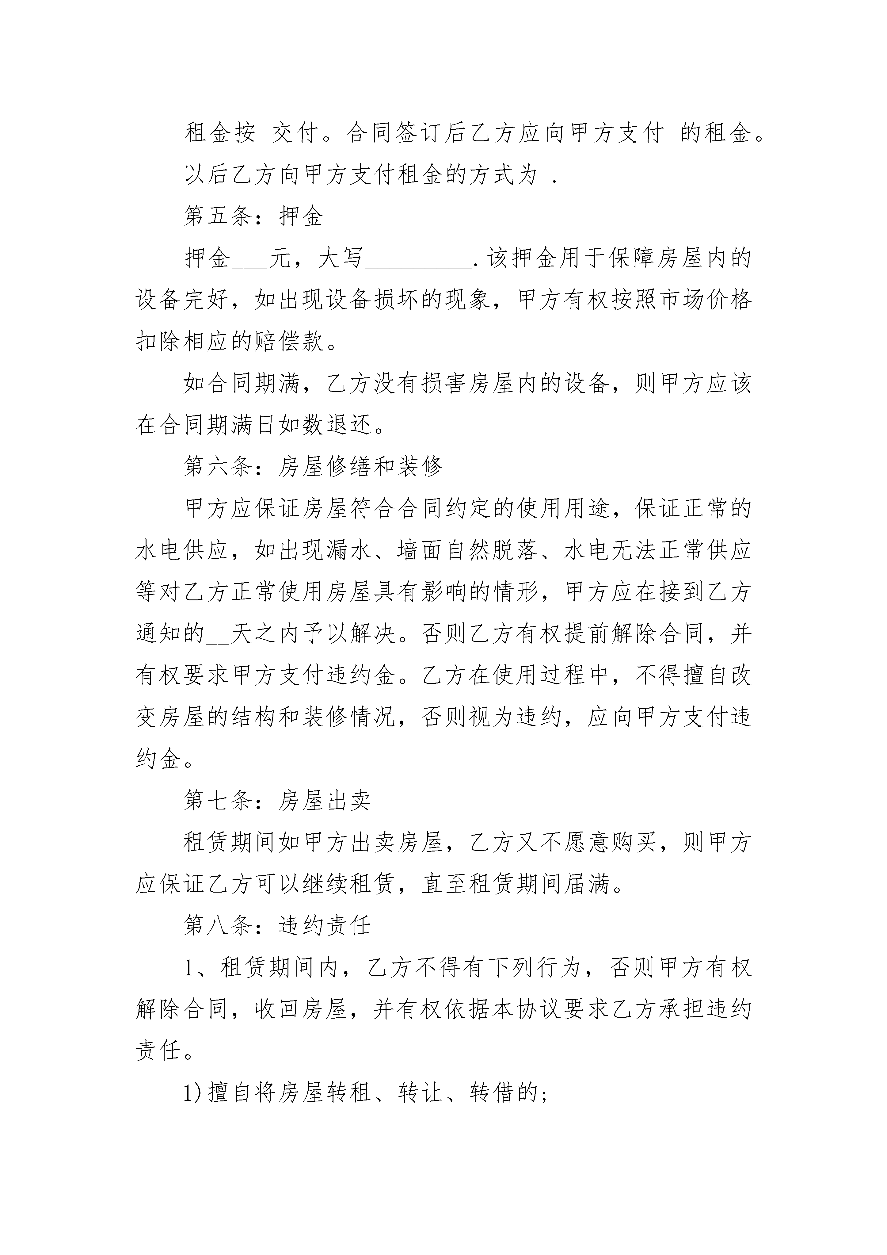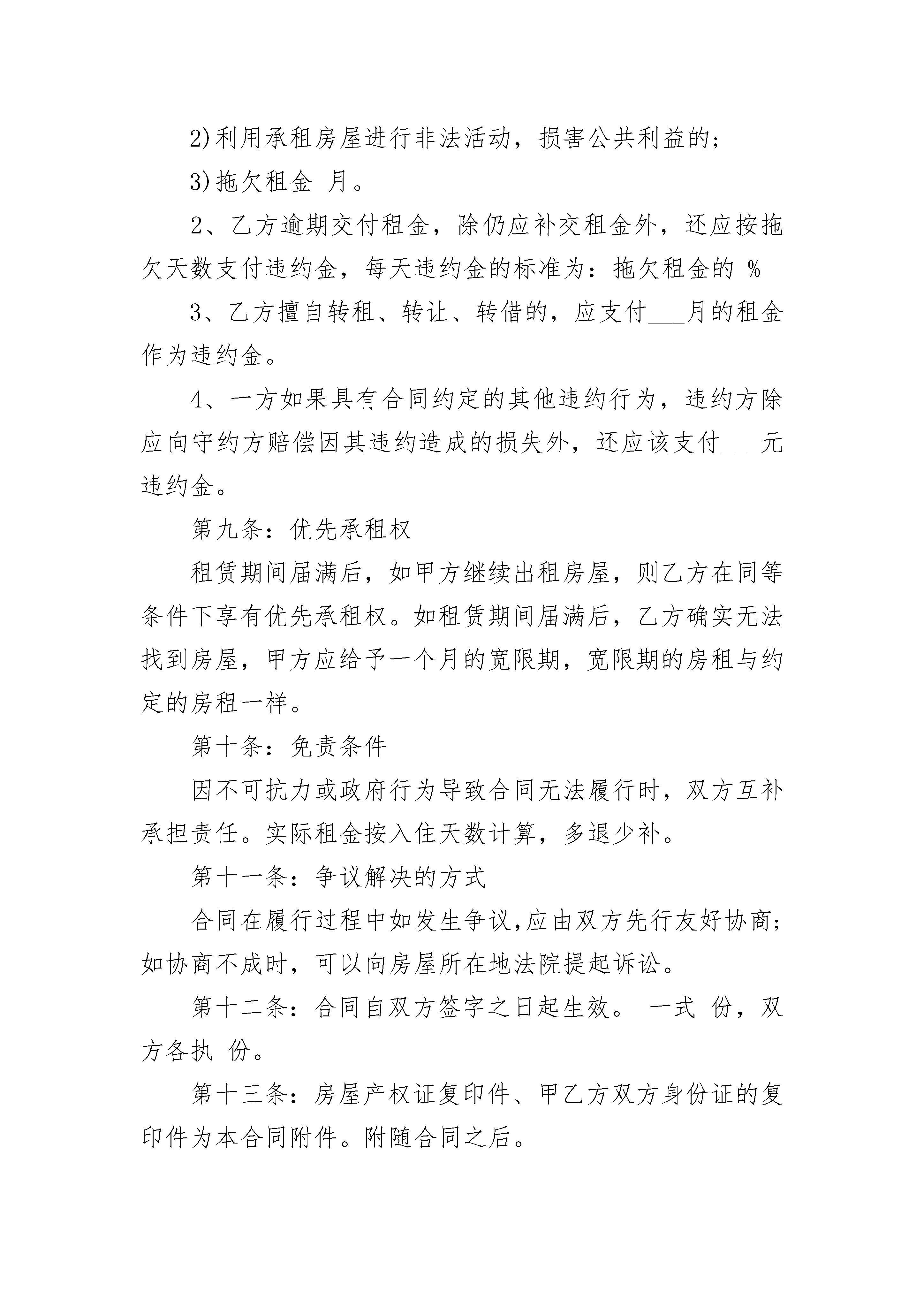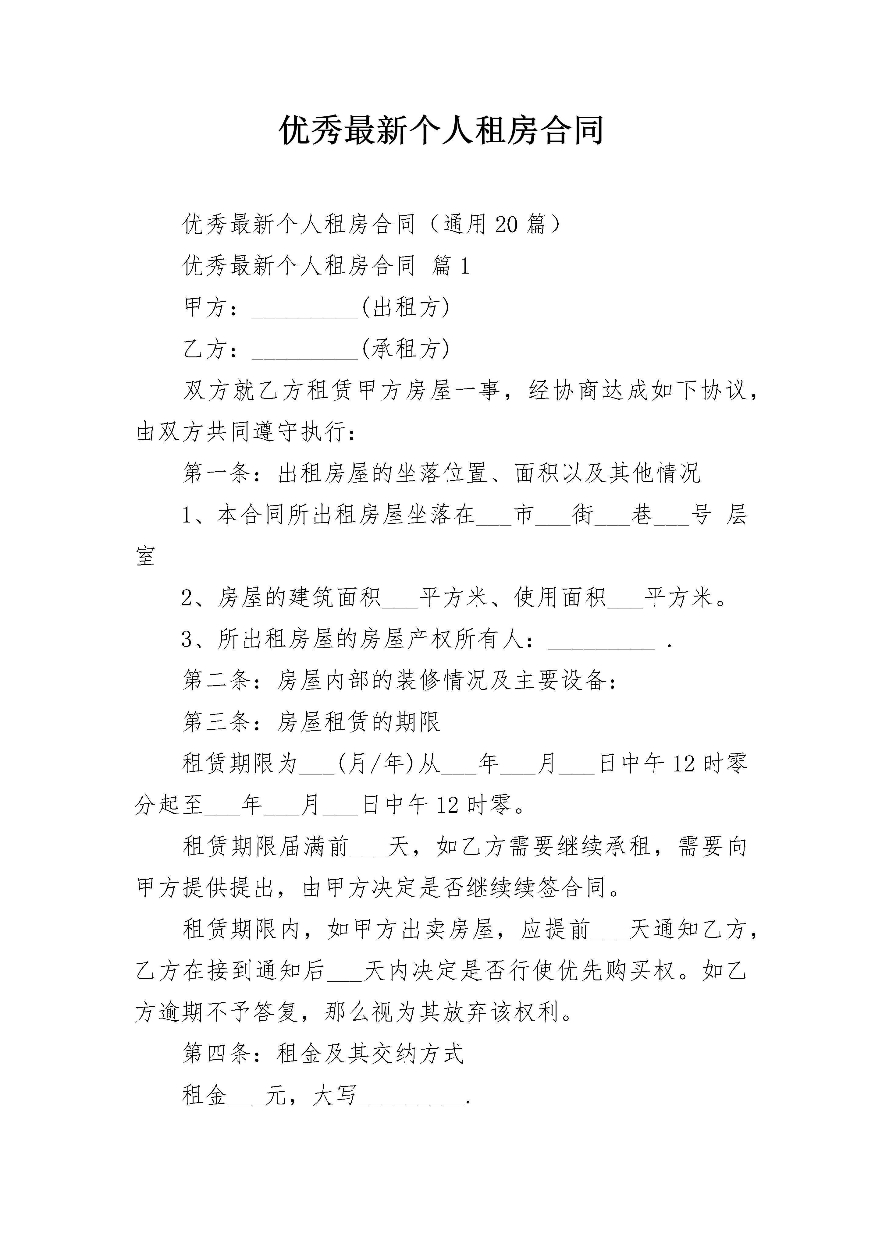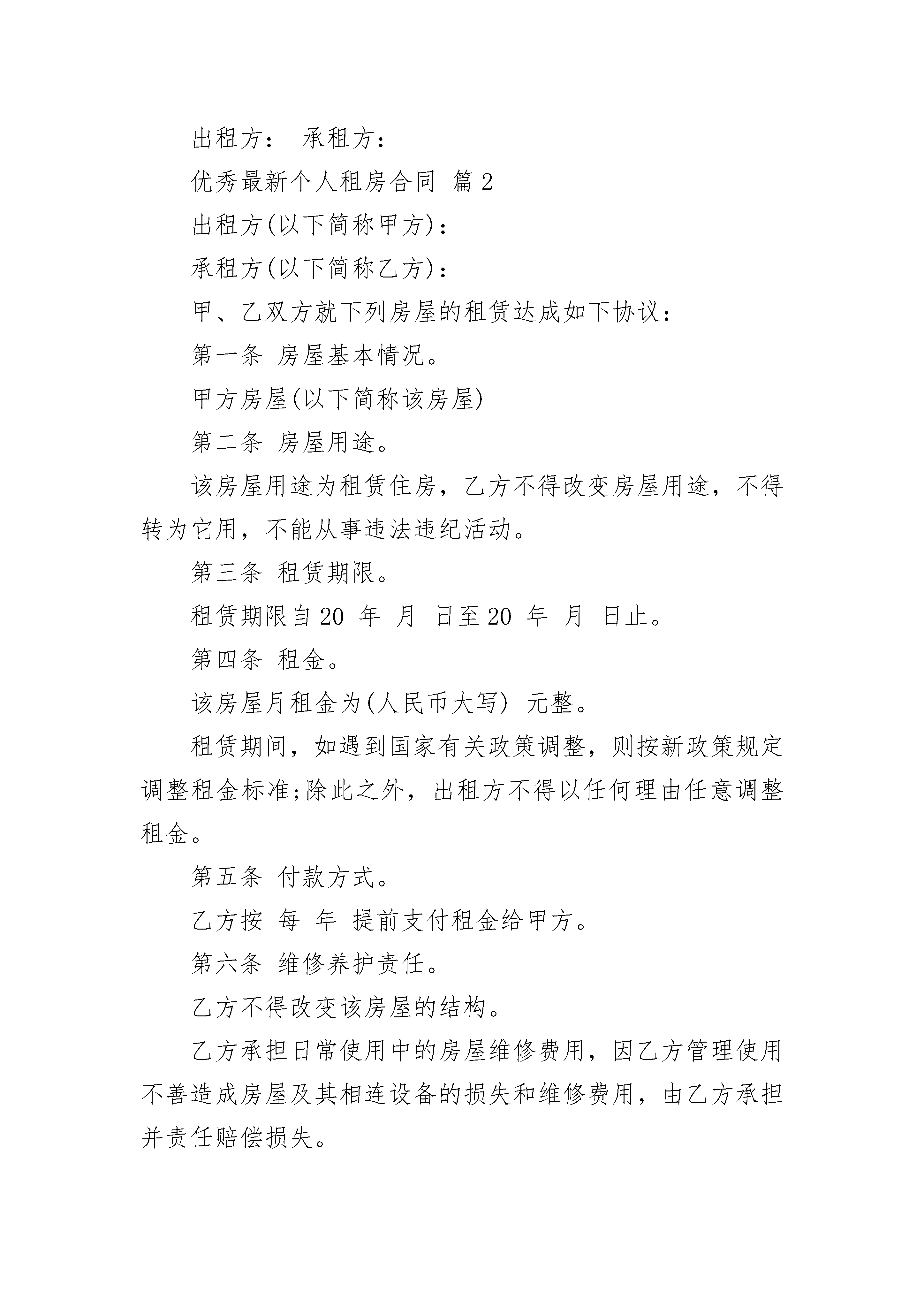 优秀最新个人租房合同优秀最新个人租房合同(通用20篇)优秀最新个人租房合同篇1甲方:_________(出租方)乙方:_________(承租方)双方就乙方租赁甲方房屋一事,经协商达成如下协议,由双方共同遵守执行:第一条:出租房屋的坐落位置、面积以及其他情况1、本合同所出租房屋坐落在___市___街___巷___号层室2、房屋的建筑面积___平方米、使用面积___平方米。3、所出租房屋的房屋产权所有人:_________.第二条:房屋内部的装修情况及主要设备:第三条:房屋租赁的期限租赁期限为___(月/年)从___年___月___日中午12时零分起至___年___月___日中午12时零。租赁期限届满前___天,如乙方需要继续承租,需要向甲方提供提出,由甲方决定是否继续续签合同。租赁期限内,如甲方出卖房屋,应提前___天通知乙方,乙方在接到通知后___天内决定是否行使优先购买权。如乙方逾期不予答复,那么视为其放弃该权利。第四条:租金及其交纳方式租金___元,大写_________.租金按交付。合同签订后乙方应向甲方支付的租金。以后乙方向甲方支付租金的方式为.第五条:押金押金___元,大写_________.该押金用于保障房屋内的设备完好,如出现设备损坏的现象,甲方有权按照市场价格扣除相应的赔偿款。如合同期满,乙方没有损害房屋内的设备,则甲方应该在合同期满日如数退还。第六条:房屋修缮和装修甲方应保证房屋符合合同约定的使用用途,保证正常的水电供应,如出现漏水、墙面自然脱落、水电无法正常供应等对乙方正常使用房屋具有影响的情形,甲方应在接到乙方通知的__天之内予以解决。否则乙方有权提前解除合同,并有权要求甲方支付违约金。乙方在使用过程中,不得擅自改变房屋的结构和装修情况,否则视为违约,应向甲方支付违约金。第七条:房屋出卖租赁期间如甲方出卖房屋,乙方又不愿意购买,则甲方应保证乙方可以继续租赁,直至租赁期间届满。第八条:违约责任1、租赁期间内,乙方不得有下列行为,否则甲方有权解除合同,收回房屋,并有权依据本协议要求乙方承担违约责任。1)擅自将房屋转租、转让、转借的;2)利用承租房屋进行非法活动,损害公共利益的;3)拖欠租金月。2、乙方逾期交付租金,除仍应补交租金外,还应按拖欠天数支付违约金,每天违约金的标准为:拖欠租金的%3、乙方擅自转租、转让、转借的,应支付___月的租金作为违约金。4、一方如果具有合同约定的其他违约行为,违约方除应向守约方赔偿因其违约造成的损失外,还应该支付___元违约金。第九条:优先承租权租赁期间届满后,如甲方继续出租房屋,则乙方在同等条件下享有优先承租权。如租赁期间届满后,乙方确实无法找到房屋,甲方应给予一个月的宽限期,宽限期的房租与约定的房租一样。第十条:免责条件因不可抗力或政府行为导致合同无法履行时,双方互补承担责任。实际租金按入住天数计算,多退少补。第十一条:争议解决的方式合同在履行过程中如发生争议,应由双方先行友好协商;如协商不成时,可以向房屋所在地法院提起诉讼。第十二条:合同自双方签字之日起生效。一式份,双方各执份。第十三条:房屋产权证复印件、甲乙方双方身份证的复印件为本合同附件。附随合同之后。出租方:承租方:优秀最新个人租房合同篇2出租方(以下简称甲方):承租方(以下简称乙方):甲、乙双方就下列房屋的租赁达成如下协议:第一条房屋基本情况。甲方房屋(以下简称该房屋)第二条房屋用途。该房屋用途为租赁住房,乙方不得改变房屋用途,不得转为它用,不能从事违法违纪活动。第三条租赁期限。租赁期限自20年月日至20年月日止。第四条租金。该房屋月租金为(人民币大写)元整。租赁期间,如遇到国家有关政策调整,则按新政策规定调整租金标准;除此之外,出租方不得以任何理由任意调整租金。第五条付款方式。乙方按每年提前支付租金给甲方。第六条维修养护责任。乙方不得改变该房屋的结构。乙方承担日常使用中的房屋维修费用,因乙方管理使用不善造成房屋及其相连设备的损失和维修费用,由乙方承担并责任赔偿损失。租赁期间,防火安全,门前三包,综合治理及安全、保卫等工作,乙方应执行当地有关部门规定并承担全部责任和服从甲方监督检查。第七条关于房屋租赁期间的有关费用。在房屋租赁期间,以下费用由乙方支付:1.水、电费;2.天然气费;3.物业管理费;4.电话、网络费、闭路电视接收费。第八条房屋押金甲、乙双方自本合同签订之日起,由乙方支付甲方(相当于一个月房租的金额)作为押金,为(人民币大写)元整,乙方在终止租用退房时,应缴清所有房屋产生的费用,经甲方确认后,退还乙方押金。第九条租赁期满。1、租赁期满后,如乙方要求继续租赁,甲方则优先同意继续租赁;2、租赁期满后,如甲方未明确表示不续租的,则视为同意乙方继续承租;第十条违约责任。租赁期间双方必须信守合同,任何一方违