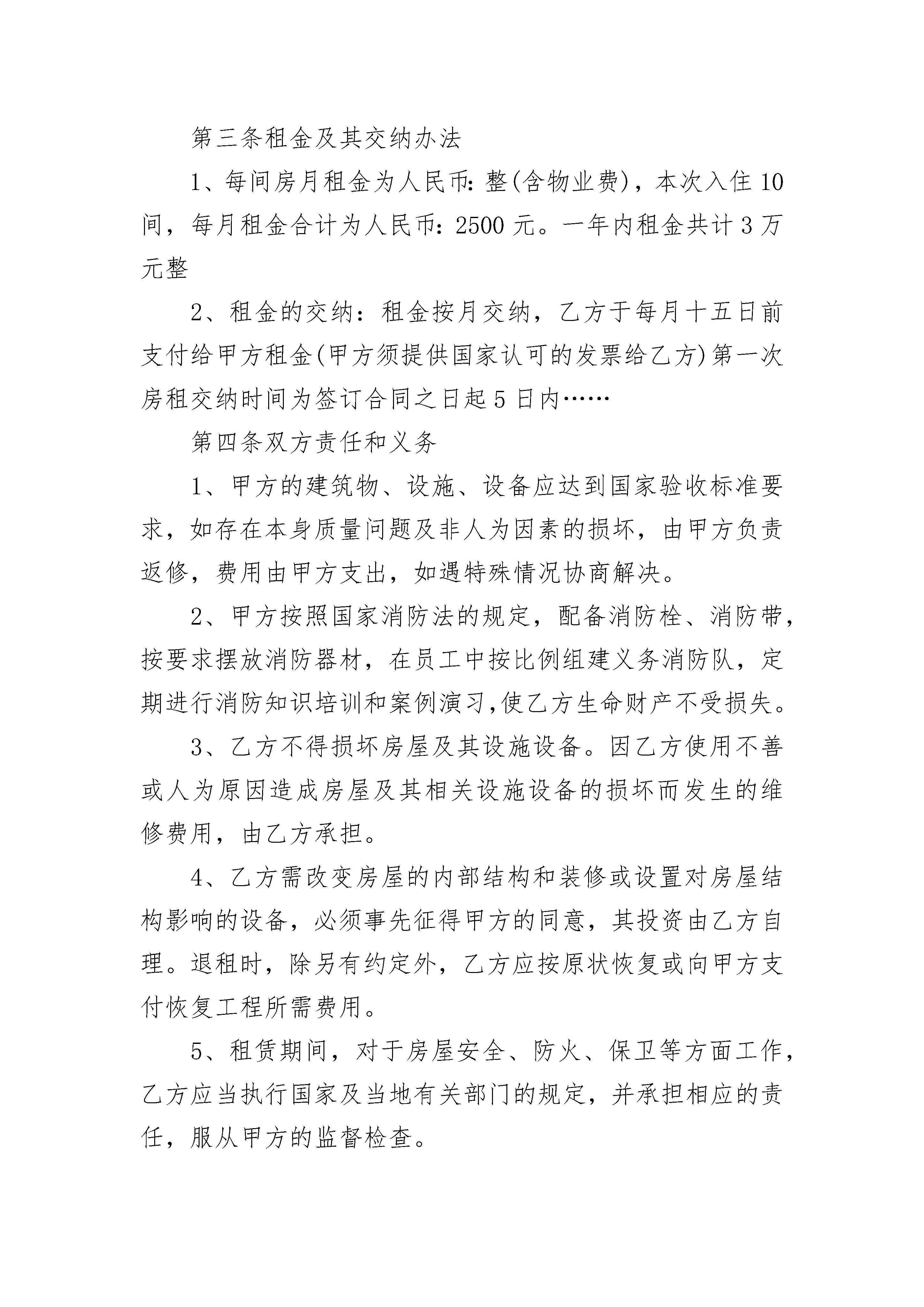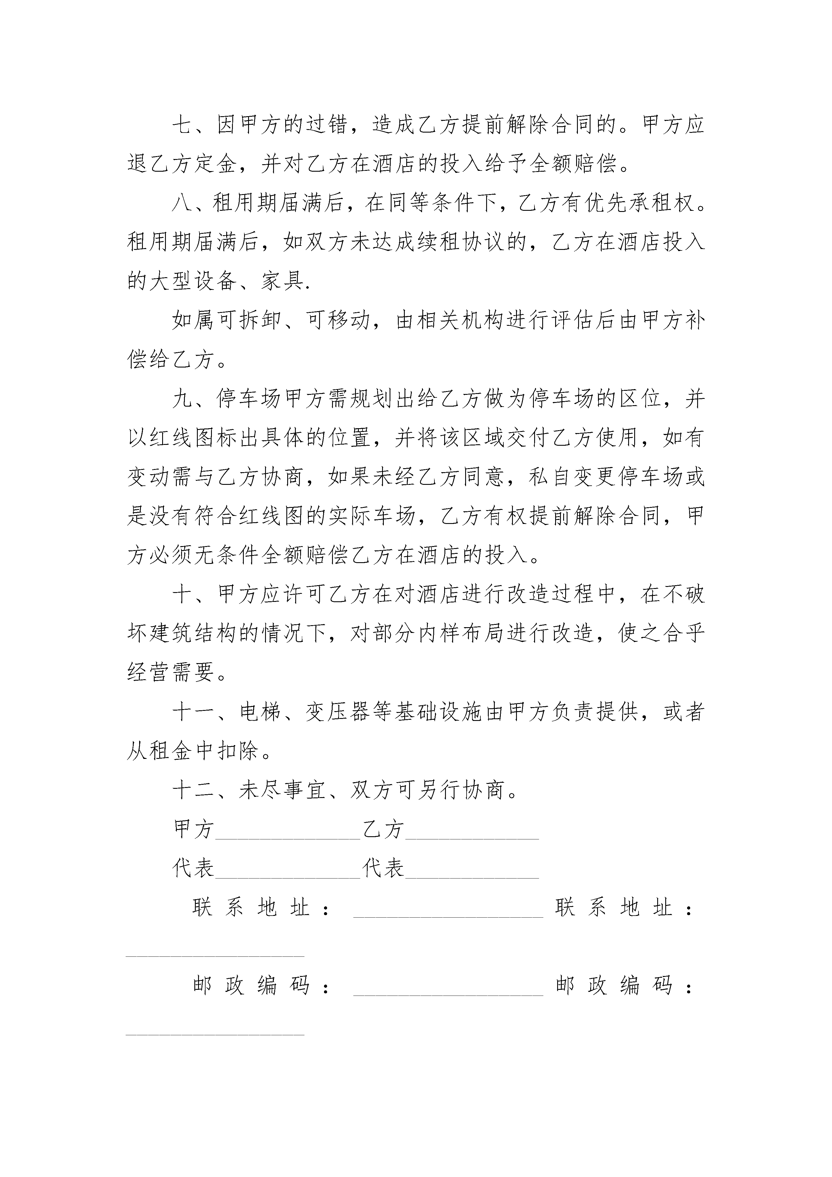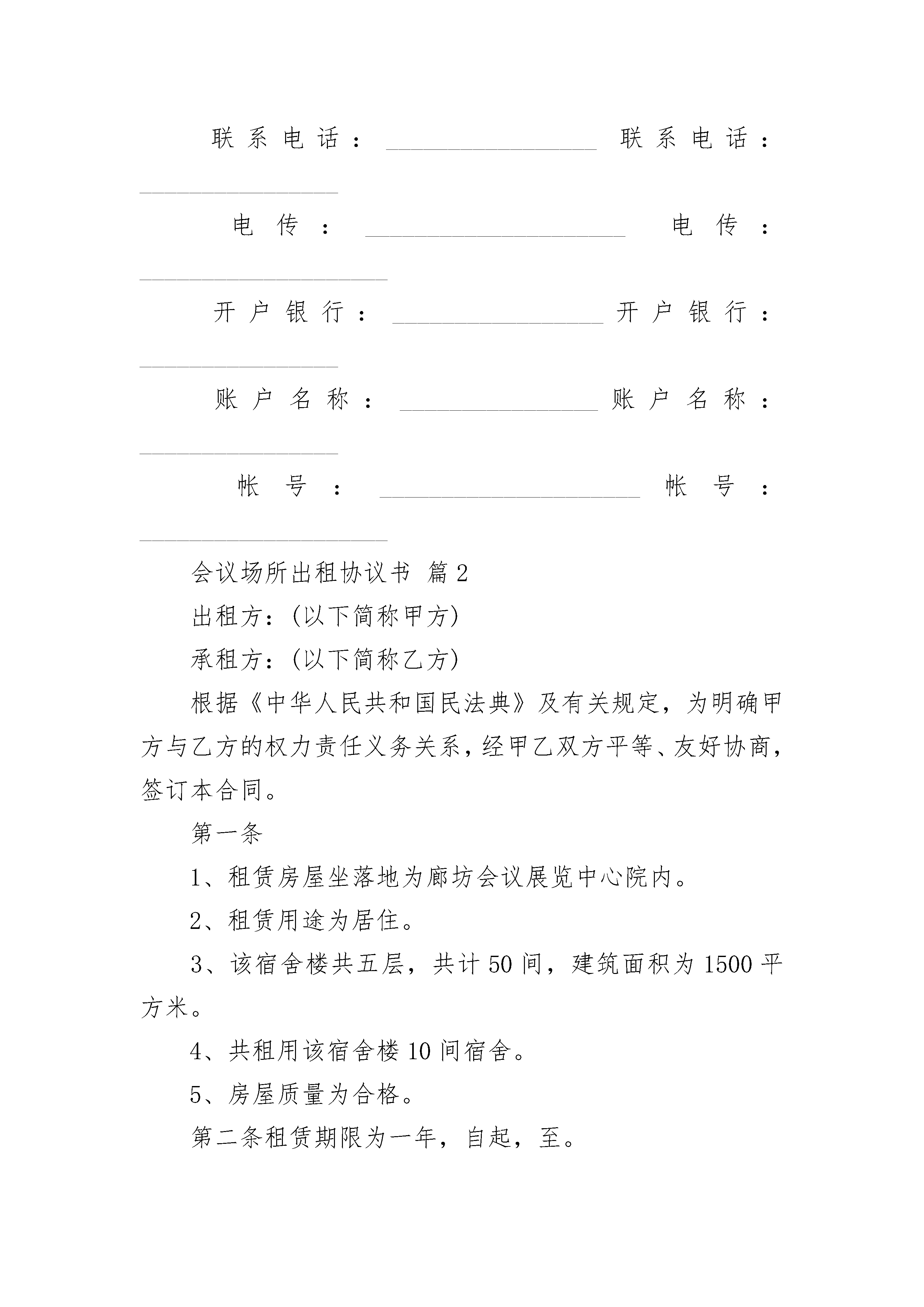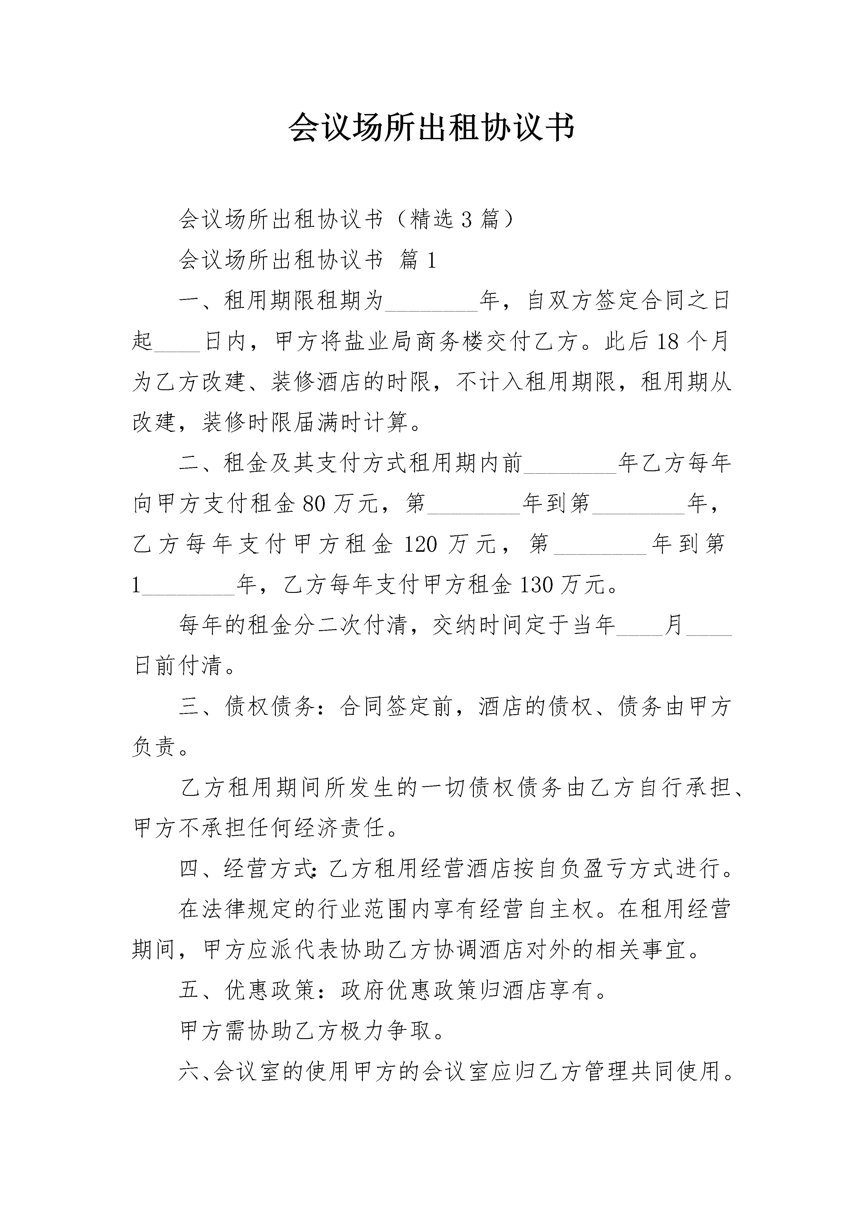 会议场所出租协议书会议场所出租协议书(精选3篇)会议场所出租协议书篇1一、租用期限租期为________年,自双方签定合同之日起____日内,甲方将盐业局商务楼交付乙方。此后18个月为乙方改建、装修酒店的时限,不计入租用期限,租用期从改建,装修时限届满时计算。二、租金及其支付方式租用期内前________年乙方每年向甲方支付租金80万元,第________年到第________年,乙方每年支付甲方租金120万元,第________年到第1________年,乙方每年支付甲方租金130万元。每年的租金分二次付清,交纳时间定于当年____月____日前付清。三、债权债务:合同签定前,酒店的债权、债务由甲方负责。乙方租用期间所发生的一切债权债务由乙方自行承担、甲方不承担任何经济责任。四、经营方式:乙方租用经营酒店按自负盈亏方式进行。在法律规定的行业范围内享有经营自主权。在租用经营期间,甲方应派代表协助乙方协调酒店对外的相关事宜。五、优惠政策:政府优惠政策归酒店享有。甲方需协助乙方极力争取。六、会议室的使用甲方的会议室应归乙方管理共同使用。七、因甲方的过错,造成乙方提前解除合同的。甲方应退乙方定金,并对乙方在酒店的投入给予全额赔偿。八、租用期届满后,在同等条件下,乙方有优先承租权。租用期届满后,如双方未达成续租协议的,乙方在酒店投入的大型设备、家具.如属可拆卸、可移动,由相关机构进行评估后由甲方补偿给乙方。九、停车场甲方需规划出给乙方做为停车场的区位,并以红线图标出具体的位置,并将该区域交付乙方使用,如有变动需与乙方协商,如果未经乙方同意,私自变更停车场或是没有符合红线图的实际车场,乙方有权提前解除合同,甲方必须无条件全额赔偿乙方在酒店的投入。十、甲方应许可乙方在对酒店进行改造过程中,在不破坏建筑结构的情况下,对部分内样布局进行改造,使之合乎经营需要。十一、电梯、变压器等基础设施由甲方负责提供,或者从租金中扣除。十二、未尽事宜、双方可另行协商。甲方_____________乙方____________代表_____________代表____________联系地址:_________________联系地址:________________邮政编码:_________________邮政编码:________________联系电话:_________________联系电话:________________电传:_____________________电传:____________________开户银行:_________________开户银行:________________账户名称:________________账户名称:________________帐号:_____________________帐号:____________________会议场所出租协议书篇2出租方:(以下简称甲方)承租方:(以下简称乙方)根据《中华人民共和国民法典》及有关规定,为明确甲方与乙方的权力责任义务关系,经甲乙双方平等、友好协商,签订本合同。第一条1、租赁房屋坐落地为廊坊会议展览中心院内。2、租赁用途为居住。3、该宿舍楼共五层,共计50间,建筑面积为1500平方米。4、共租用该宿舍楼10间宿舍。5、房屋质量为合格。第二条租赁期限为一年,自起,至。第三条租金及其交纳办法1、每间房月租金为人民币:整(含物业费),本次入住10间,每月租金合计为人民币:2500元。一年内租金共计3万元整2、租金的交纳:租金按月交纳,乙方于每月十五日前支付给甲方租金(甲方须提供国家认可的发票给乙方)第一次房租交纳时间为签订合同之日起5日内……第四条双方责任和义务1、甲方的建筑物、设施、设备应达到国家验收标准要求,如存在本身质量问题及非人为因素的损坏,由甲方负责返修,费用由甲方支出,如遇特殊情况协商解决。2、甲方按照国家消防法的规定,配备消防栓、消防带,按要求摆放消防器材,在员工中按比例组建义务消防队,定期进行消防知识培训和案例演习,使乙方生命财产不受损失。3、乙方不得损坏房屋及其设施设备。因乙方使用不善或人为原因造成房屋及其相关设施设备的损坏而发生的维修费用,由乙方承担。4、乙方需改变房屋的内部结构和装修或设置对房屋结构影响的设备,必须事先征得甲方的同意,其投资由乙方自理。退租时,除另有约定外,乙方应按原状恢复或向甲方支付恢复工程所需费用。5、租赁期间,对于房屋安全、防火、保卫等方面工作,乙方应当执行国家及当地有关部门的规定,并承担相应的责任,服从甲方的监督检查。6、租赁期间,乙方入住人员由乙方自行负责内部管理,必要时需要甲方的协助管理。7、乙方租赁房屋的水电费,由乙方每月按时交纳。8、租赁期间,如果发生政府有关部门征收本合同未列项目但与使用该房屋有关的费