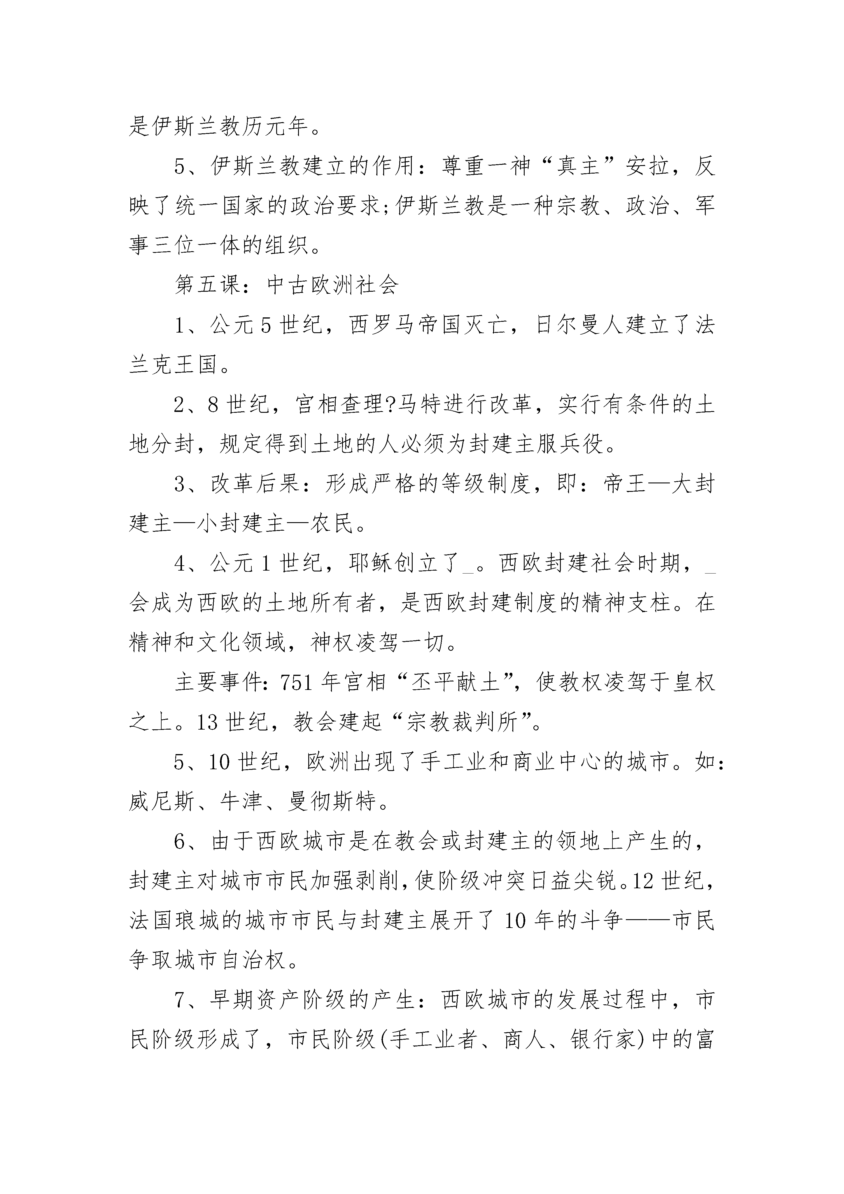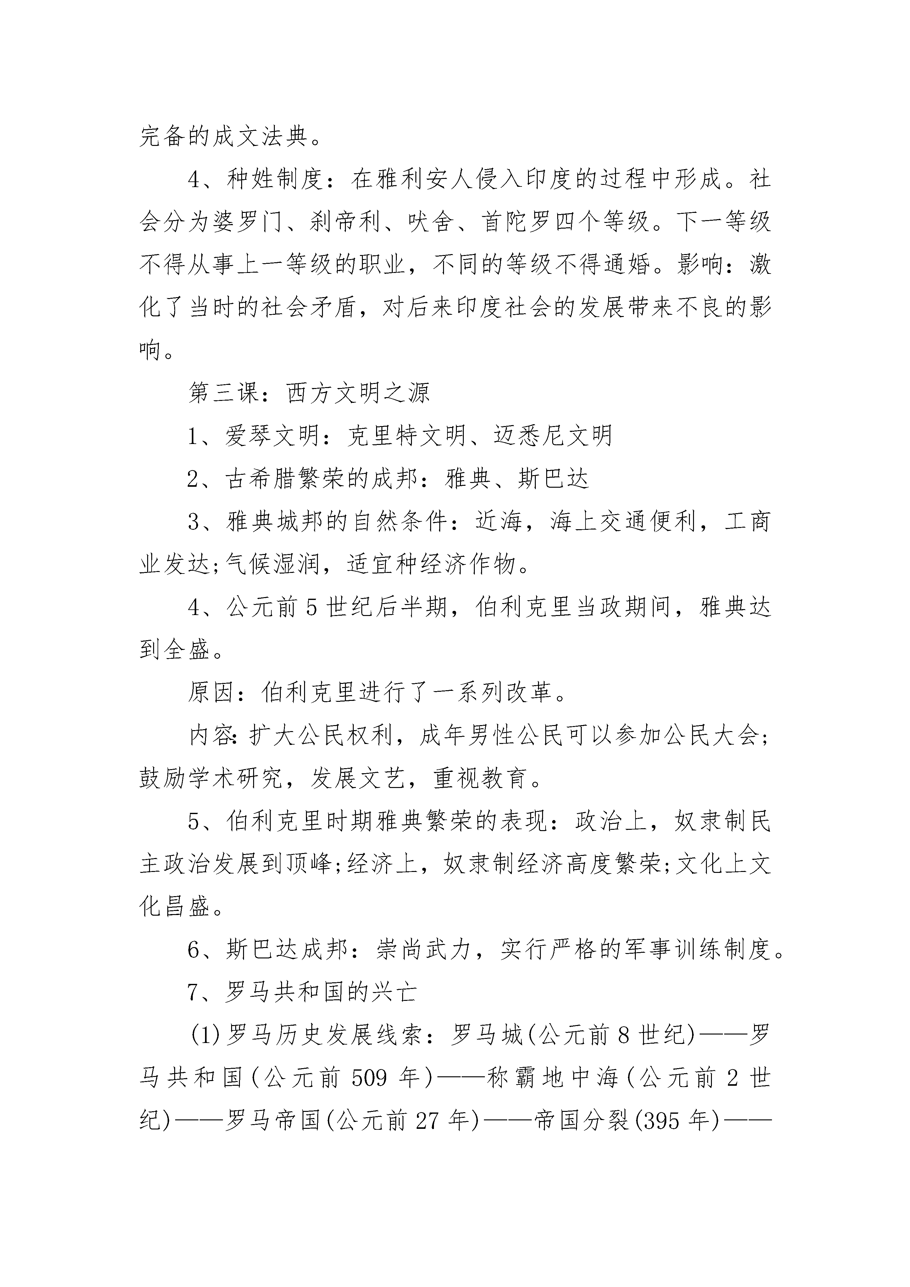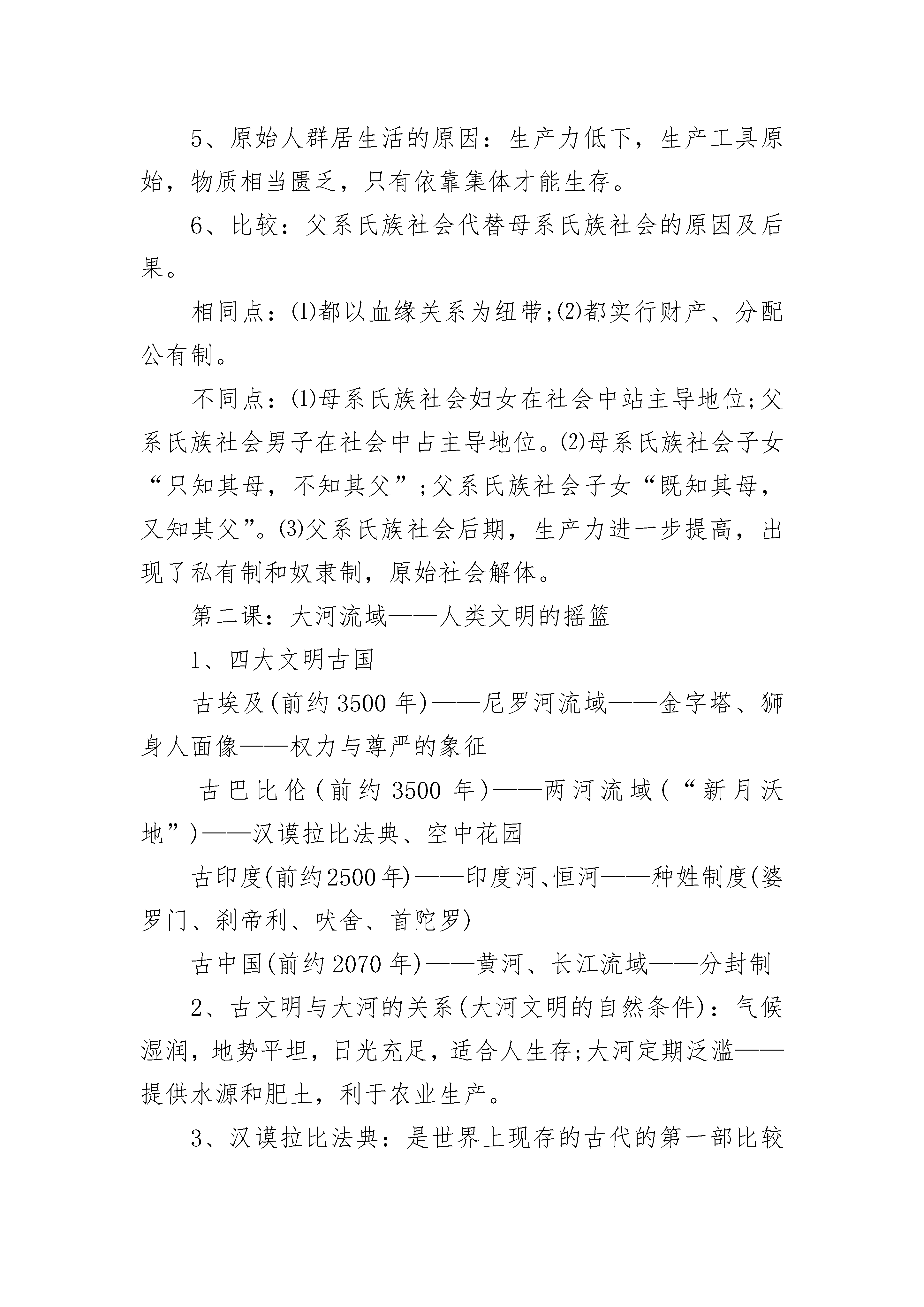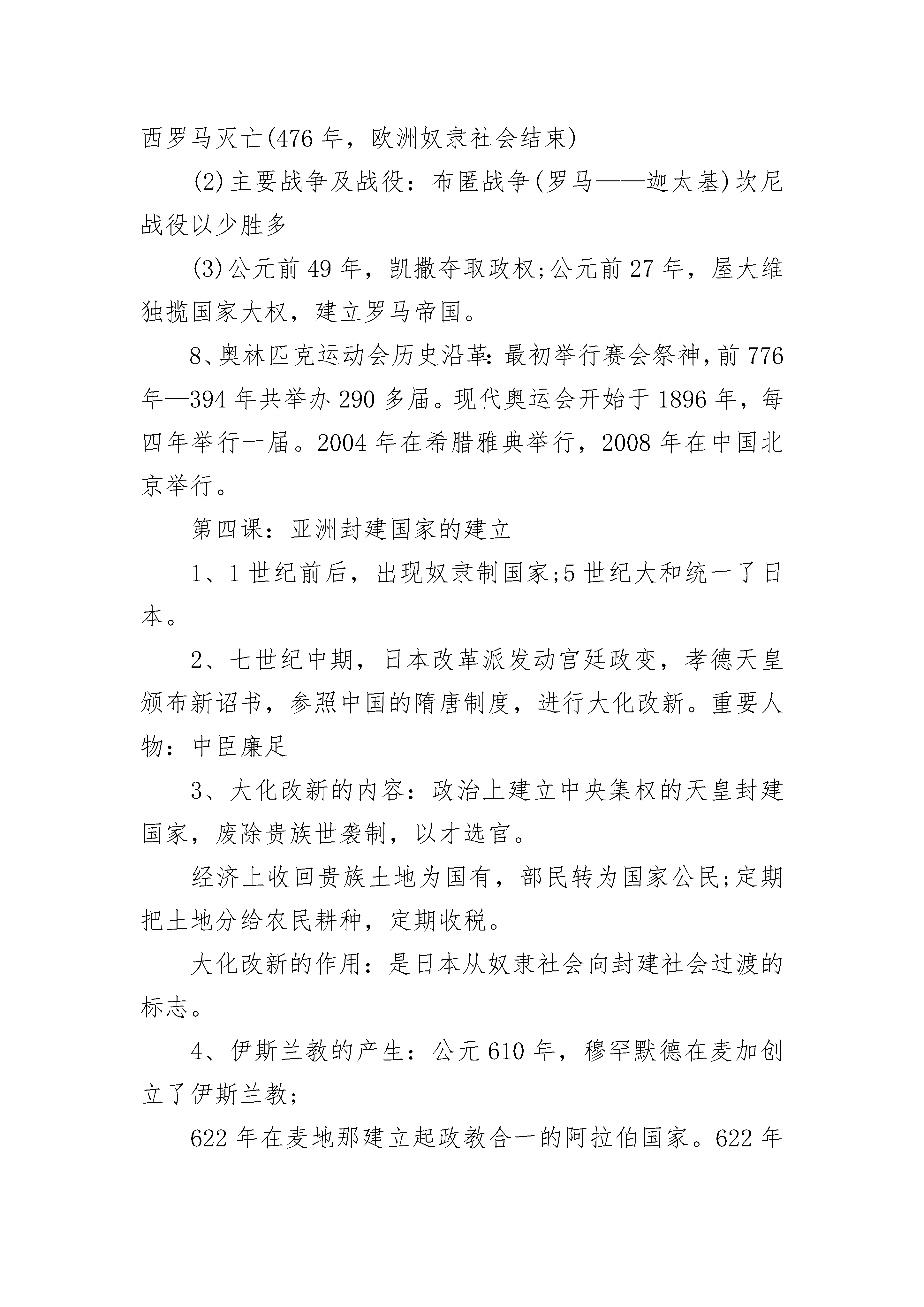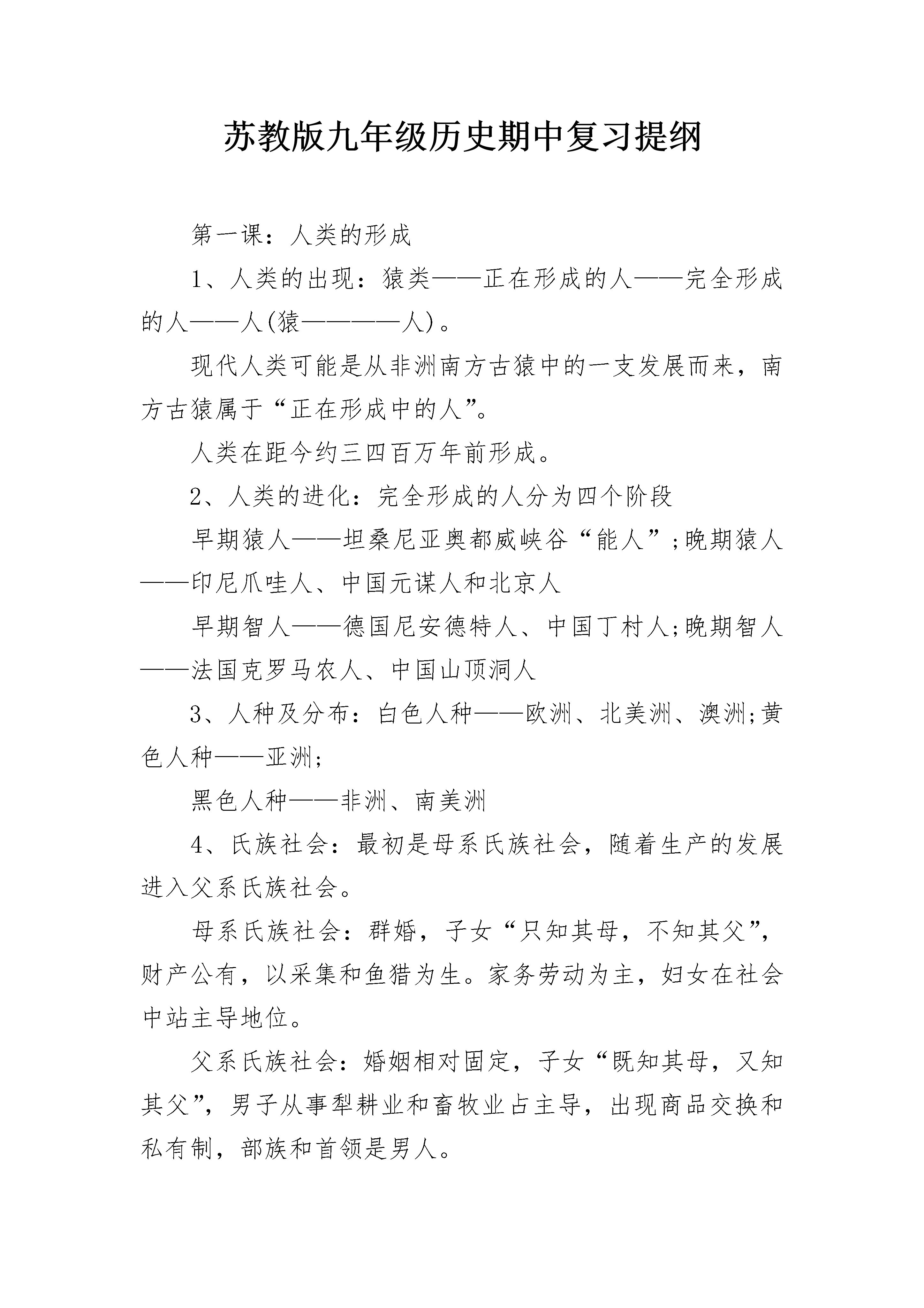 苏教版九年级历史期中复习提纲第一课:人类的形成1、人类的出现:猿类——正在形成的人——完全形成的人——人(猿————人)。现代人类可能是从非洲南方古猿中的一支发展而来,南方古猿属于“正在形成中的人”。人类在距今约三四百万年前形成。2、人类的进化:完全形成的人分为四个阶段早期猿人——坦桑尼亚奥都威峡谷“能人”;晚期猿人——印尼爪哇人、中国元谋人和北京人早期智人——德国尼安德特人、中国丁村人;晚期智人——法国克罗马农人、中国山顶洞人3、人种及分布:白色人种——欧洲、北美洲、澳洲;黄色人种——亚洲;黑色人种——非洲、南美洲4、氏族社会:最初是母系氏族社会,随着生产的发展进入父系氏族社会。母系氏族社会:群婚,子女“只知其母,不知其父”,财产公有,以采集和鱼猎为生。家务劳动为主,妇女在社会中站主导地位。父系氏族社会:婚姻相对固定,子女“既知其母,又知其父”,男子从事犁耕业和畜牧业占主导,出现商品交换和私有制,部族和首领是男人。5、原始人群居生活的原因:生产力低下,生产工具原始,物质相当匮乏,只有依靠集体才能生存。6、比较:父系氏族社会代替母系氏族社会的原因及后果。相同点:⑴都以血缘关系为纽带;⑵都实行财产、分配公有制。不同点:⑴母系氏族社会妇女在社会中站主导地位;父系氏族社会男子在社会中占主导地位。⑵母系氏族社会子女“只知其母,不知其父”;父系氏族社会子女“既知其母,又知其父”。⑶父系氏族社会后期,生产力进一步提高,出现了私有制和奴隶制,原始社会解体。第二课:大河流域——人类文明的摇篮1、四大文明古国古埃及(前约3500年)——尼罗河流域——金字塔、狮身人面像——权力与尊严的象征古巴比伦(前约3500年)——两河流域(“新月沃地”)——汉谟拉比法典、空中花园古印度(前约2500年)——印度河、恒河——种姓制度(婆罗门、刹帝利、吠舍、首陀罗)古中国(前约2070年)——黄河、长江流域——分封制2、古文明与大河的关系(大河文明的自然条件):气候湿润,地势平坦,日光充足,适合人生存;大河定期泛滥——提供水源和肥土,利于农业生产。3、汉谟拉比法典:是世界上现存的古代的第一部比较完备的成文法典。4、种姓制度:在雅利安人侵入印度的过程中形成。社会分为婆罗门、刹帝利、吠舍、首陀罗四个等级。下一等级不得从事上一等级的职业,不同的等级不得通婚。影响:激化了当时的社会矛盾,对后来印度社会的发展带来不良的影响。第三课:西方文明之源1、爱琴文明:克里特文明、迈悉尼文明2、古希腊繁荣的成邦:雅典、斯巴达3、雅典城邦的自然条件:近海,海上交通便利,工商业发达;气候湿润,适宜种经济作物。4、公元前5世纪后半期,伯利克里当政期间,雅典达到全盛。原因:伯利克里进行了一系列改革。内容:扩大公民权利,成年男性公民可以参加公民大会;鼓励学术研究,发展文艺,重视教育。5、伯利克里时期雅典繁荣的表现:政治上,奴隶制民主政治发展到顶峰;经济上,奴隶制经济高度繁荣;文化上文化昌盛。6、斯巴达成邦:崇尚武力,实行严格的军事训练制度。7、罗马共和国的兴亡(1)罗马历史发展线索:罗马城(公元前8世纪)——罗马共和国(公元前509年)——称霸地中海(公元前2世纪)——罗马帝国(公元前27年)——帝国分裂(395年)——西罗马灭亡(476年,欧洲奴隶社会结束)(2)主要战争及战役:布匿战争(罗马——迦太基)坎尼战役以少胜多(3)公元前49年,凯撒夺取政权;公元前27年,屋大维独揽国家大权,建立罗马帝国。8、奥林匹克运动会历史沿革:最初举行赛会祭神,前776年—394年共举办290多届。现代奥运会开始于1896年,每四年举行一届。2004年在希腊雅典举行,2008年在中国北京举行。第四课:亚洲封建国家的建立1、1世纪前后,出现奴隶制国家;5世纪大和统一了日本。2、七世纪中期,日本改革派发动宫廷政变,孝德天皇颁布新诏书,参照中国的隋唐制度,进行大化改新。重要人物:中臣廉足3、大化改新的内容:政治上建立中央集权的天皇封建国家,废除贵族世袭制,以才选官。经济上收回贵族土地为国有,部民转为国家公民;定期把土地分给农民耕种,定期收税。大化改新的作用:是日本从奴隶社会向封建社会过渡的标志。4、伊斯兰教的产生:公元610年,穆罕默德在麦加创立了伊斯兰教;622年在麦地那建立起政教合一的阿拉伯国家。622年是伊斯兰教历元年。5、伊斯兰教建立的作用:尊重一神“真主”安拉,反映了统一国家的政治要求;伊斯兰教是一种宗教、政治、军事三位一体的组织。第五课:中古欧洲社会1、公元5世纪,西罗马帝国灭亡,日尔曼人建立了法兰克王国。2、8世纪,宫相查理?马特进行改革,实行有条件的土地分封,规定得到土地的人必须为封建主服兵役。3、改革后果:形成严格的等级制度,即:帝王—大封建主—小封建主—农民。4、公元1世纪,耶稣创立了_。