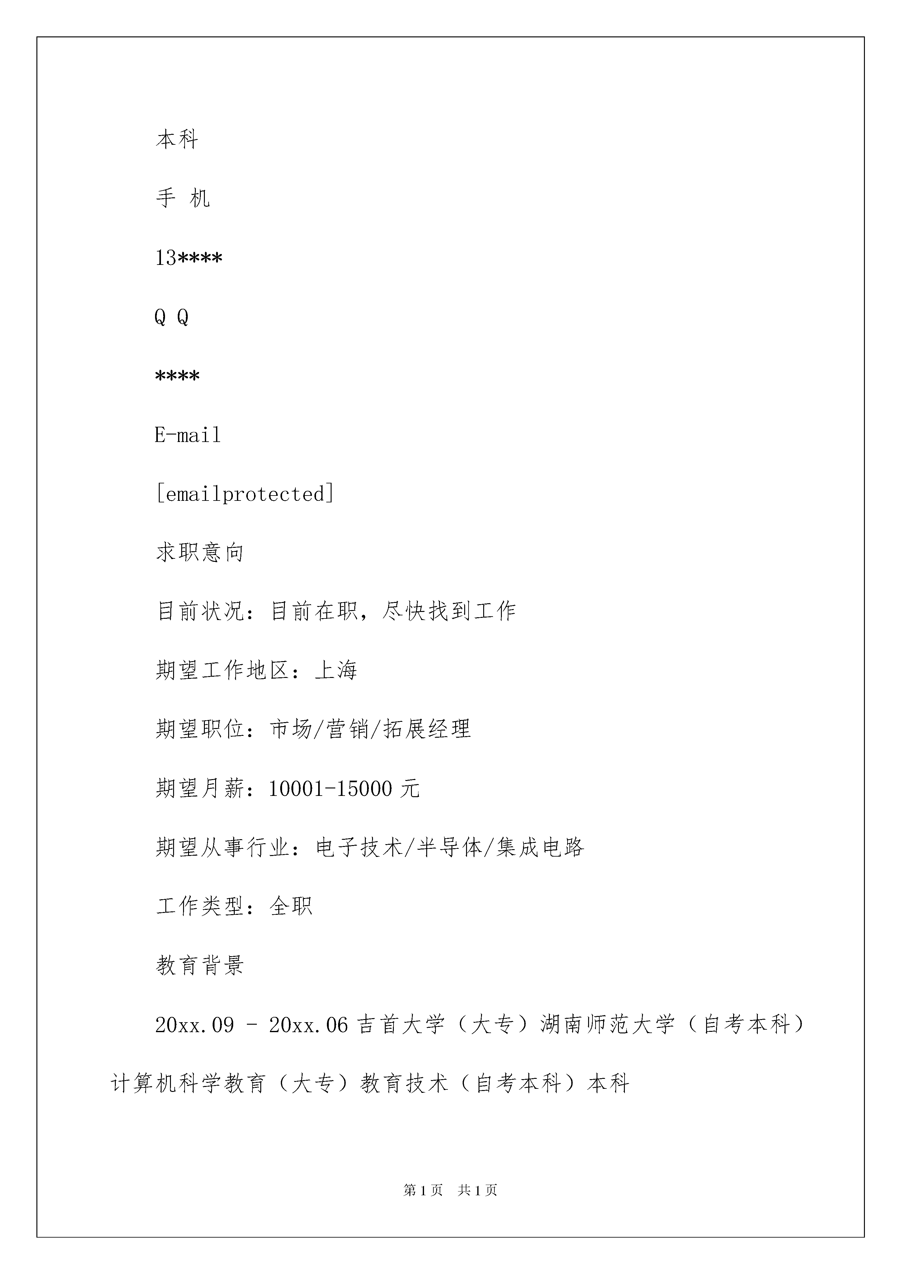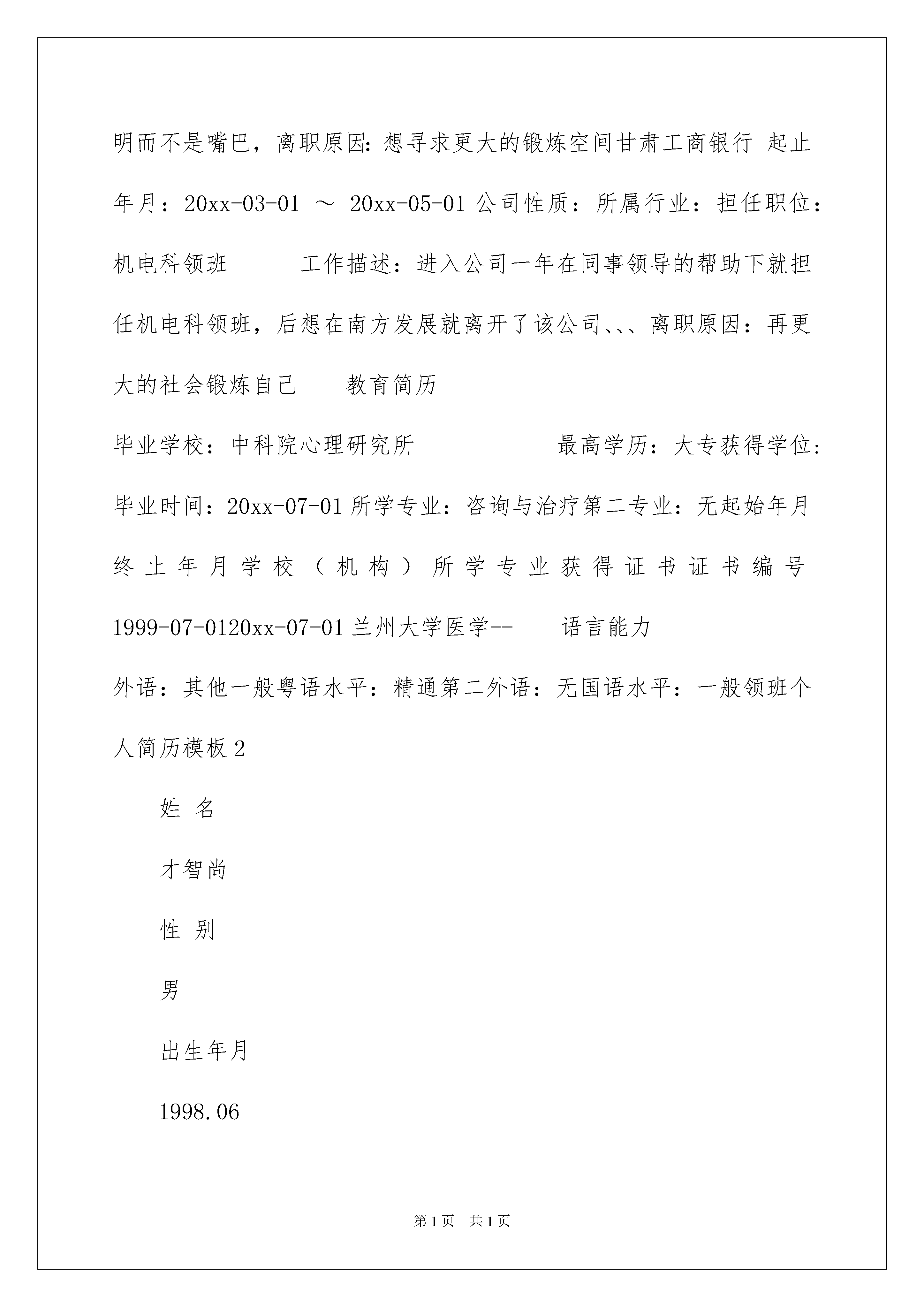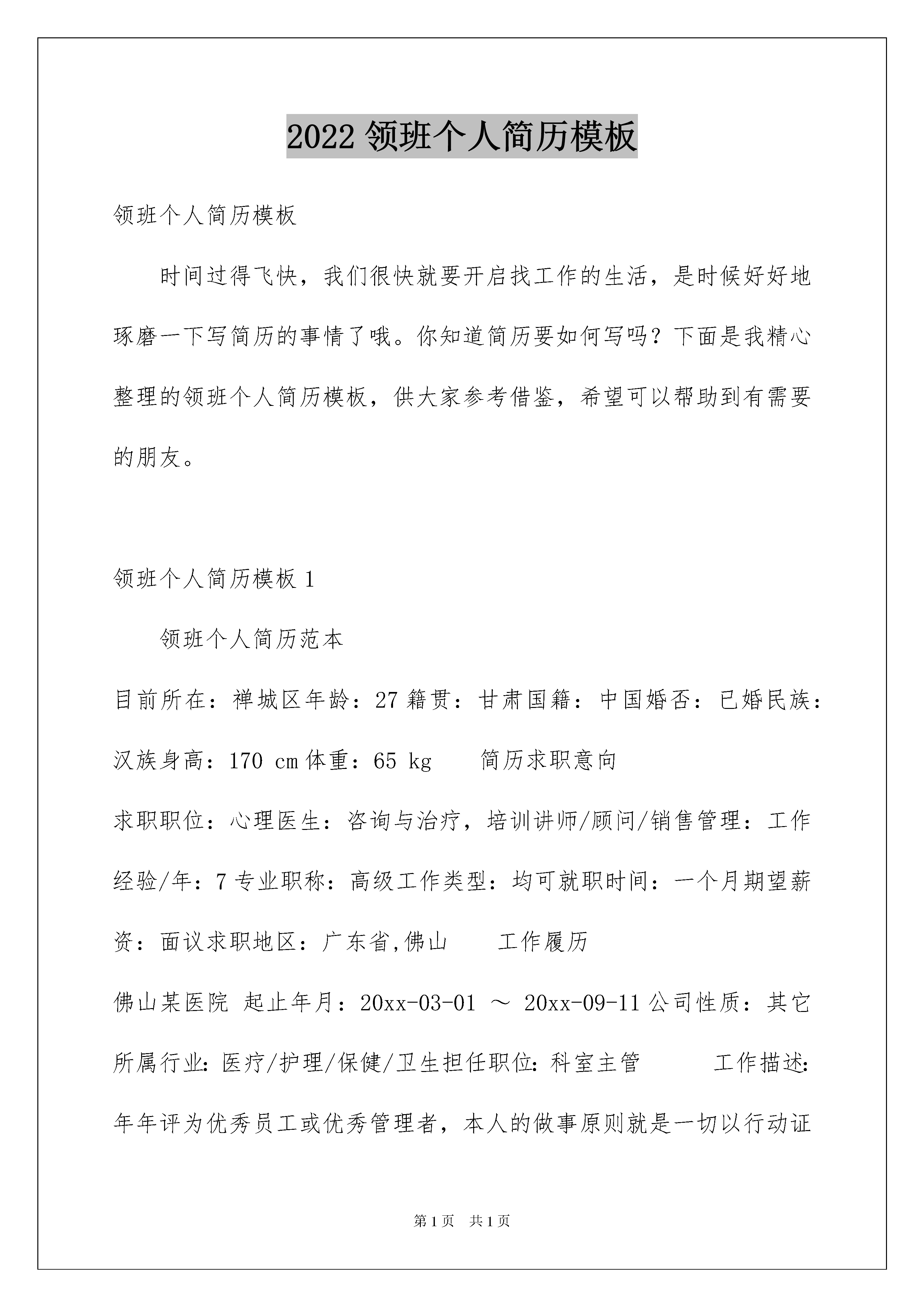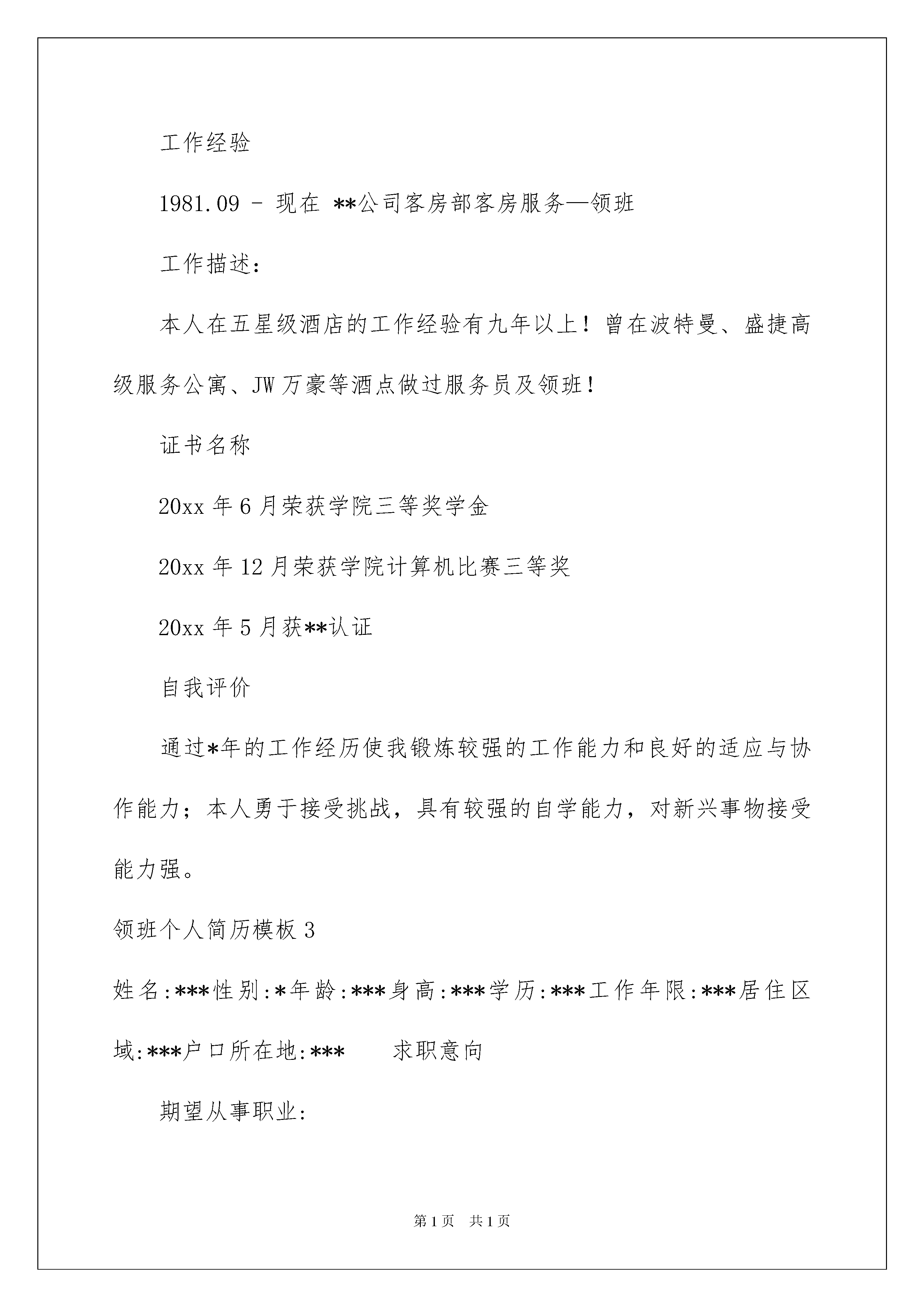 2022领班个人简历模板领班个人简历模板时间过得飞快,我们很快就要开启找工作的生活,是时候好好地琢磨一下写简历的事情了哦。你知道简历要如何写吗?下面是我精心整理的领班个人简历模板,供大家参考借鉴,希望可以帮助到有需要的朋友。领班个人简历模板1领班个人简历范本目前所在:禅城区年龄:27籍贯:甘肃国籍:中国婚否:已婚民族:汉族身高:170cm体重:65kg简历求职意向求职职位:心理医生:咨询与治疗,培训讲师/顾问/销售管理:工作经验/年:7专业职称:高级工作类型:均可就职时间:一个月期望薪资:面议求职地区:广东省,佛山工作履历佛山某医院起止年月:20xx-03-01~20xx-09-11公司性质:其它所属行业:医疗/护理/保健/卫生担任职位:科室主管工作描述:年年评为优秀员工或优秀管理者,本人的做事原则就是一切以行动证明而不是嘴巴,离职原因:想寻求更大的锻炼空间甘肃工商银行起止年月:20xx-03-01~20xx-05-01公司性质:所属行业:担任职位:机电科领班工作描述:进入公司一年在同事领导的帮助下就担任机电科领班,后想在南方发展就离开了该公司、、、离职原因:再更大的社会锻炼自己教育简历毕业学校:中科院心理研究所最高学历:大专获得学位:毕业时间:20xx-07-01所学专业:咨询与治疗第二专业:无起始年月终止年月学校(机构)所学专业获得证书证书编号1999-07-0120xx-07-01兰州大学医学--语言能力外语:其他一般粤语水平:精通第二外语:无国语水平:一般领班个人简历模板2姓名才智尚性别男出生年月1998.06民族汉籍贯上海户口上海婚姻状况未婚健康状况良好毕业时间20xx.07毕业院校**学院专业名称**专业学历本科手机13****QQ****E-mail[emailprotected]求职意向目前状况:目前在职,尽快找到工作期望工作地区:上海期望职位:市场/营销/拓展经理期望月薪:10001-15000元期望从事行业:电子技术/半导体/集成电路工作类型:全职教育背景20xx.09-20xx.06吉首大学(大专)湖南师范大学(自考本科)计算机科学教育(大专)教育技术(自考本科)本科工作经验1981.09-现在**公司客房部客房服务—领班工作描述:本人在五星级酒店的工作经验有九年以上!曾在波特曼、盛捷高级服务公寓、JW万豪等酒点做过服务员及领班!证书名称20xx年6月荣获学院三等奖学金20xx年12月荣获学院计算机比赛三等奖20xx年5月获**认证自我评价通过*年的工作经历使我锻炼较强的工作能力和良好的适应与协作能力;本人勇于接受挑战,具有较强的自学能力,对新兴事物接受能力强。领班个人简历模板3姓名:***性别:*年龄:***身高:***学历:***工作年限:***居住区域:***户口所在地:***求职意向期望从事职业:领班|大堂经理期望月薪:3000元工作经历20xx/07-20xx/12北京301医院附属酒店领班主管角色描述:做为酒店的领班主管,负责和上司酒店经理沟通,安排下属服务员的工作,及时而有效的和客户沟通沟流,构建良好的客户关系;激励和鼓舞团队成员,营造良好的工作环境;承接和处理客户的抱怨和投诉,将自己这个层级无法处理投诉问题及时汇报给上级,将客户的不满意度降到最低水平;对重要或特别重要的客人或领导,直接自己服务,确保服务的质量直接下属:10位汇报上司:前厅经理主要业绩:在每个月的领班小组排名中,连续6个月都在5个小组中名列第一,在6个月的工作,本小组零投诉效,卓越的服务品质赢得了前厅经理的高度赞赏,被评为本酒店年度优秀员工角色描述:由于在领班主管方面所表现出的与年龄所不相符的成熟和干练,得到酒店管理层的一致赞誉和认可,被破格提升为前厅经理,顶替离职的前厅经理职位;做为酒店的前厅经理,负责管理和调度整个前厅的50位服务员和前台收银人员,参与酒店总经理的管理层会议,贯彻总经理的管理精神;负责领班人员的职效考核和升迁建议;负责投诉处理和客户关系的'深化建设。直接下属:50位汇报上司:酒店总经理主要业绩:干练的职业形象很好的在整个酒店树立起来,确保了整个酒店前厅的业务的正常顺畅开展。素质技能:熟悉掌握酒店管理相关知识、英语阅读能力良好、富有团队协作精神、具备较强的领导能力、与人沟通能力强、信息收集分析能力强、拥有细心、耐心、责任心;尽管年龄较少,但是已经有过独立管理50位下属人员的经验,具有独挡一面的自信和执着。自我描述计算机技能:熟练掌握word、excel、powerpoint等办公软件。礼仪形态:受过专业的礼仪培训,具备良好的礼仪技能。沟通技术:具备良好