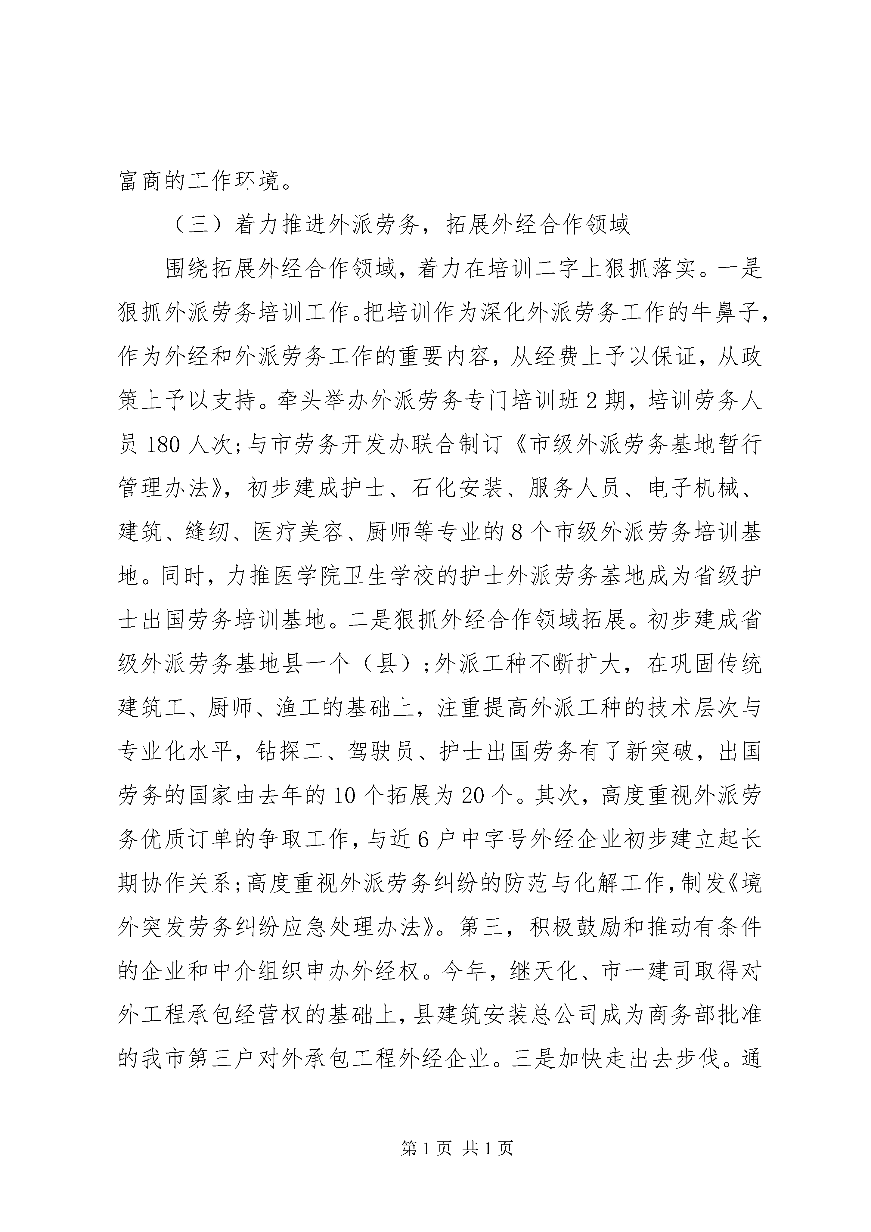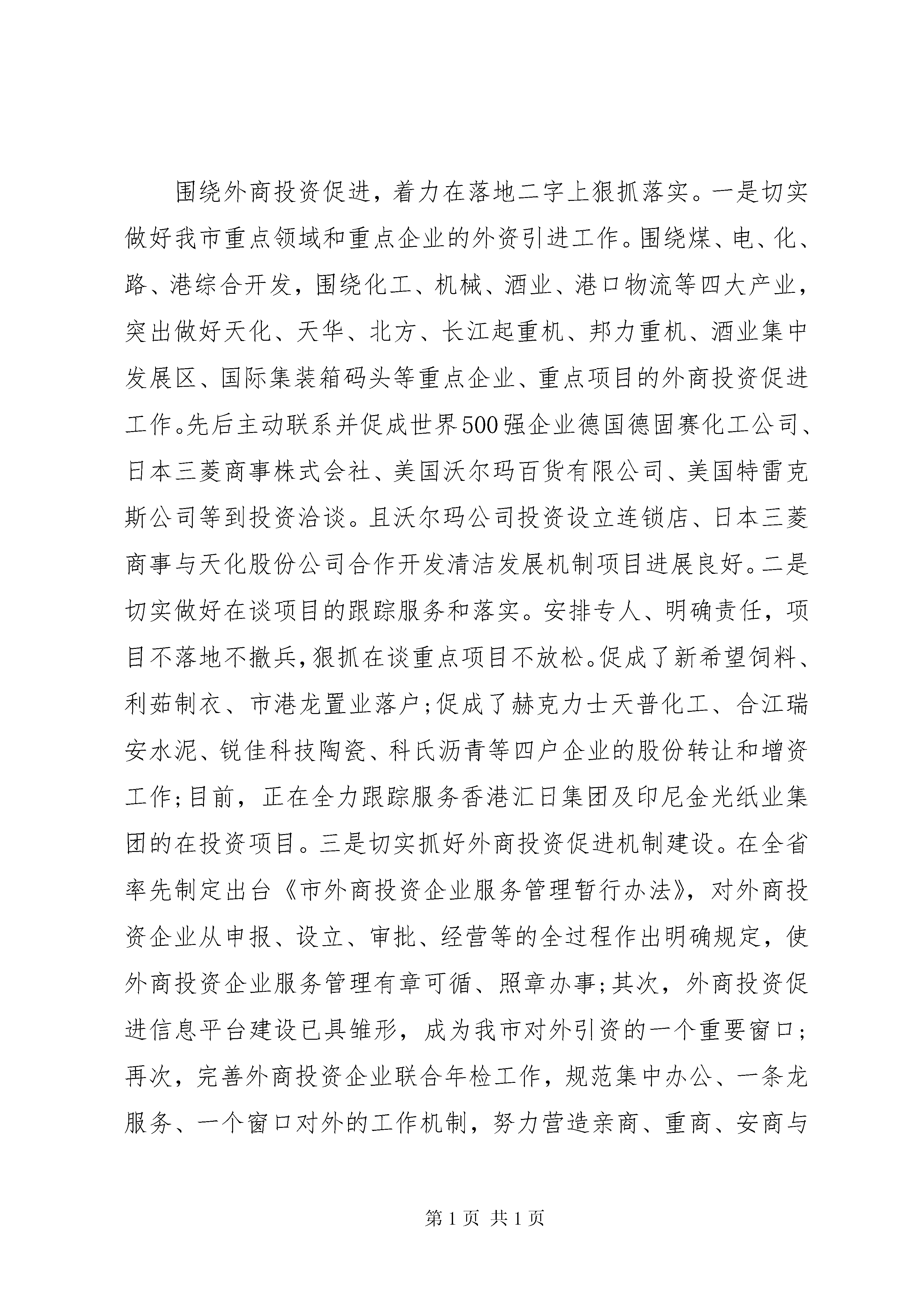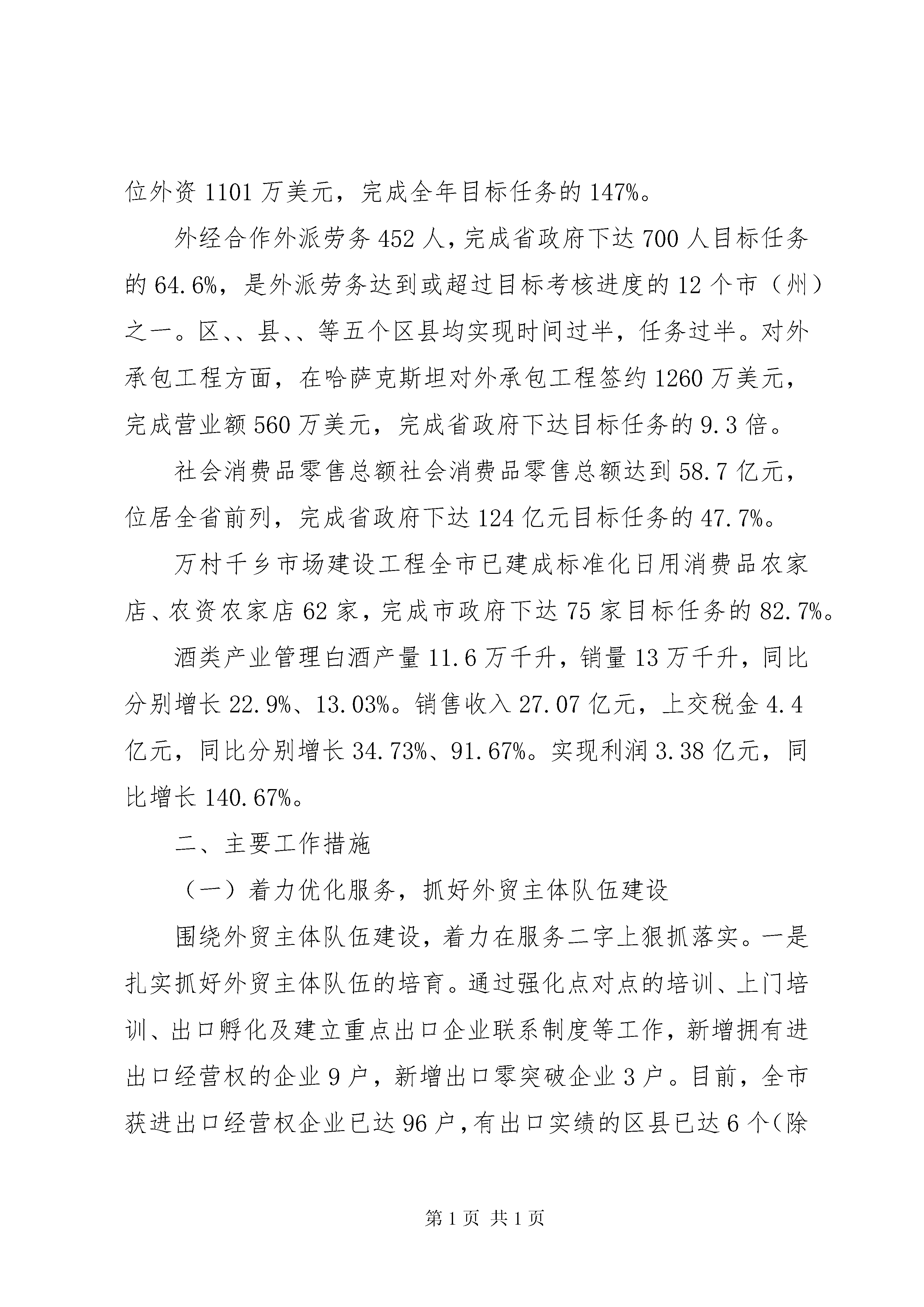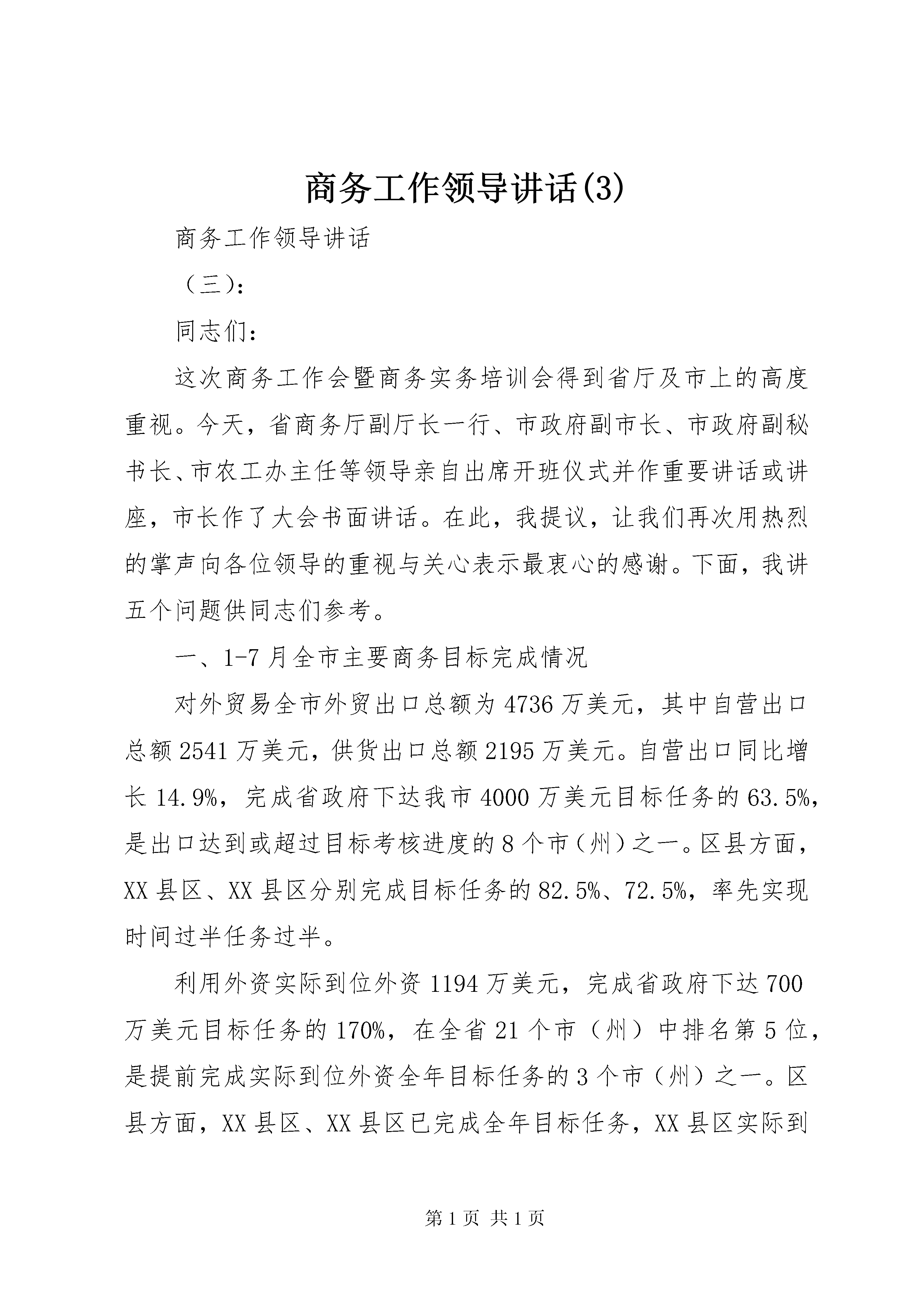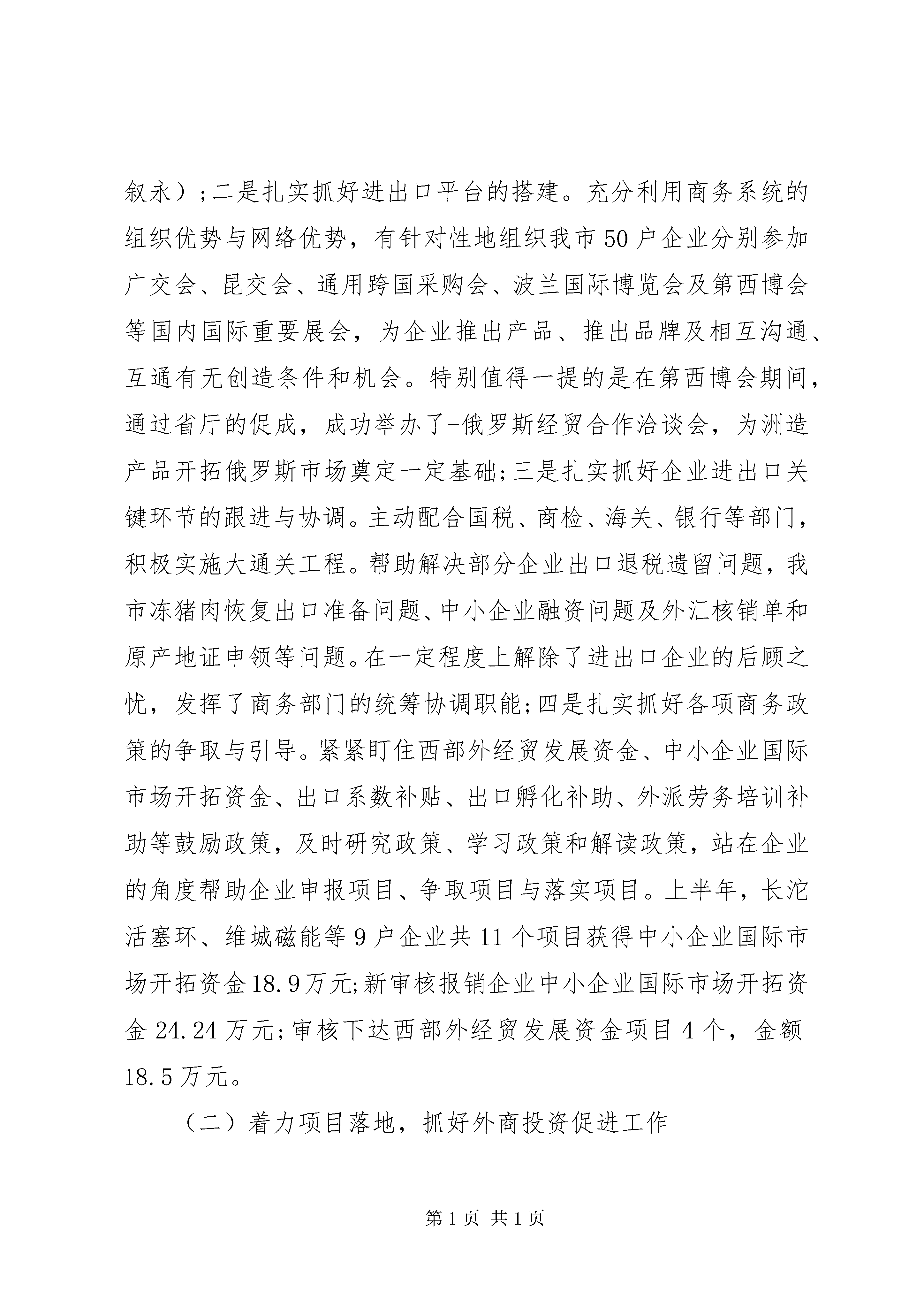 商务工作领导讲话(3)商务工作领导讲话(三):同志们:这次商务工作会暨商务实务培训会得到省厅及市上的高度重视。今天,省商务厅副厅长一行、市政府副市长、市政府副秘书长、市农工办主任等领导亲自出席开班仪式并作重要讲话或讲座,市长作了大会书面讲话。在此,我提议,让我们再次用热烈的掌声向各位领导的重视与关心表示最衷心的感谢。下面,我讲五个问题供同志们参考。一、1-7月全市主要商务目标完成情况对外贸易全市外贸出口总额为4736万美元,其中自营出口总额2541万美元,供货出口总额2195万美元。自营出口同比增长14.9%,完成省政府下达我市4000万美元目标任务的63.5%,是出口达到或超过目标考核进度的8个市(州)之一。区县方面,XX县区、XX县区分别完成目标任务的82.5%、72.5%,率先实现时间过半任务过半。利用外资实际到位外资1194万美元,完成省政府下达700万美元目标任务的170%,在全省21个市(州)中排名第5位,是提前完成实际到位外资全年目标任务的3个市(州)之一。区县方面,XX县区、XX县区已完成全年目标任务,XX县区实际到位外资1101万美元,完成全年目标任务的147%。外经合作外派劳务452人,完成省政府下达700人目标任务的64.6%,是外派劳务达到或超过目标考核进度的12个市(州)之一。区、、县、、等五个区县均实现时间过半,任务过半。对外承包工程方面,在哈萨克斯坦对外承包工程签约1260万美元,完成营业额560万美元,完成省政府下达目标任务的9.3倍。社会消费品零售总额社会消费品零售总额达到58.7亿元,位居全省前列,完成省政府下达124亿元目标任务的47.7%。万村千乡市场建设工程全市已建成标准化日用消费品农家店、农资农家店62家,完成市政府下达75家目标任务的82.7%。酒类产业管理白酒产量11.6万千升,销量13万千升,同比分别增长22.9%、13.03%。销售收入27.07亿元,上交税金4.4亿元,同比分别增长34.73%、91.67%。实现利润3.38亿元,同比增长140.67%。二、主要工作措施(一)着力优化服务,抓好外贸主体队伍建设围绕外贸主体队伍建设,着力在服务二字上狠抓落实。一是扎实抓好外贸主体队伍的培育。通过强化点对点的培训、上门培训、出口孵化及建立重点出口企业联系制度等工作,新增拥有进出口经营权的企业9户,新增出口零突破企业3户。目前,全市获进出口经营权企业已达96户,有出口实绩的区县已达6个(除叙永);二是扎实抓好进出口平台的搭建。充分利用商务系统的组织优势与网络优势,有针对性地组织我市50户企业分别参加广交会、昆交会、通用跨国采购会、波兰国际博览会及第西博会等国内国际重要展会,为企业推出产品、推出品牌及相互沟通、互通有无创造条件和机会。特别值得一提的是在第西博会期间,通过省厅的促成,成功举办了-俄罗斯经贸合作洽谈会,为洲造产品开拓俄罗斯市场奠定一定基础;三是扎实抓好企业进出口关键环节的跟进与协调。主动配合国税、商检、海关、银行等部门,积极实施大通关工程。帮助解决部分企业出口退税遗留问题,我市冻猪肉恢复出口准备问题、中小企业融资问题及外汇核销单和原产地证申领等问题。在一定程度上解除了进出口企业的后顾之忧,发挥了商务部门的统筹协调职能;四是扎实抓好各项商务政策的争取与引导。紧紧盯住西部外经贸发展资金、中小企业国际市场开拓资金、出口系数补贴、出口孵化补助、外派劳务培训补助等鼓励政策,及时研究政策、学习政策和解读政策,站在企业的角度帮助企业申报项目、争取项目与落实项目。上半年,长沱活塞环、维城磁能等9户企业共11个项目获得中小企业国际市场开拓资金18.9万元;新审核报销企业中小企业国际市场开拓资金24.24万元;审核下达西部外经贸发展资金项目4个,金额18.5万元。(二)着力项目落地,抓好外商投资促进工作围绕外商投资促进,着力在落地二字上狠抓落实。一是切实做好我市重点领域和重点企业的外资引进工作。围绕煤、电、化、路、港综合开发,围绕化工、机械、酒业、港口物流等四大产业,突出做好天化、天华、北方、长江起重机、邦力重机、酒业集中发展区、国际集装箱码头等重点企业、重点项目的外商投资促进工作。先后主动联系并促成世界500强企业德国德固赛化工公司、日本三菱商事株式会社、美国沃尔玛百货有限公司、美国特雷克斯公司等到投资洽谈。且沃尔玛公司投资设立连锁店、日本三菱商事与天化股份公司合作开发清洁发展机制项目进展良好。二是切实做好在谈项目的跟踪服务和落实。安排专人、明确责任,项目不落地不撤兵,狠抓在谈重点项目不放松。促成了新希望饲料、利茹制衣、市港龙置业落户;促成了赫克力士天普化工、合江瑞安水泥、锐佳科技陶瓷、科氏沥青等四户企业的股份转让和增资工作;目前,正在全力跟踪服务香港汇日集团及印