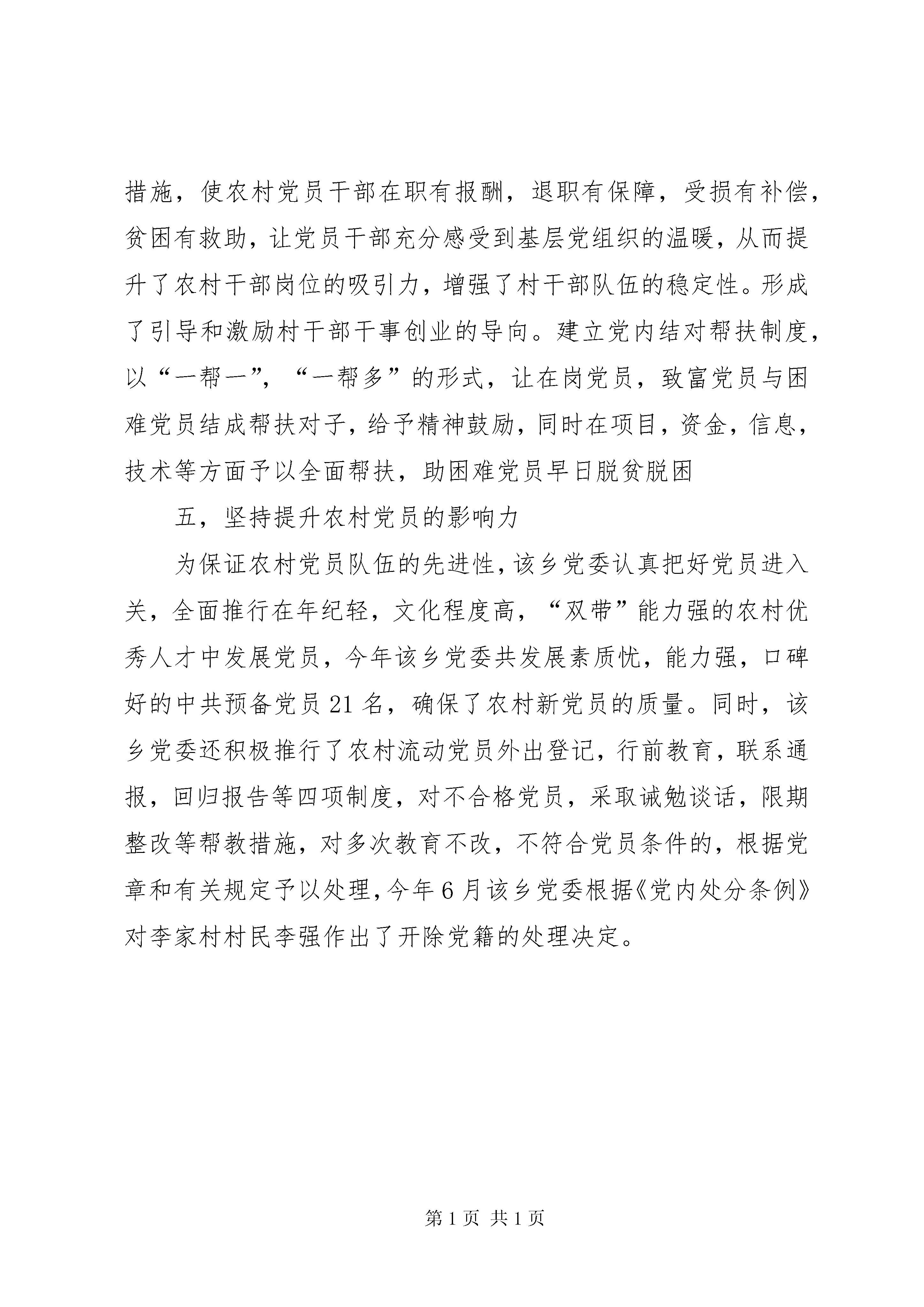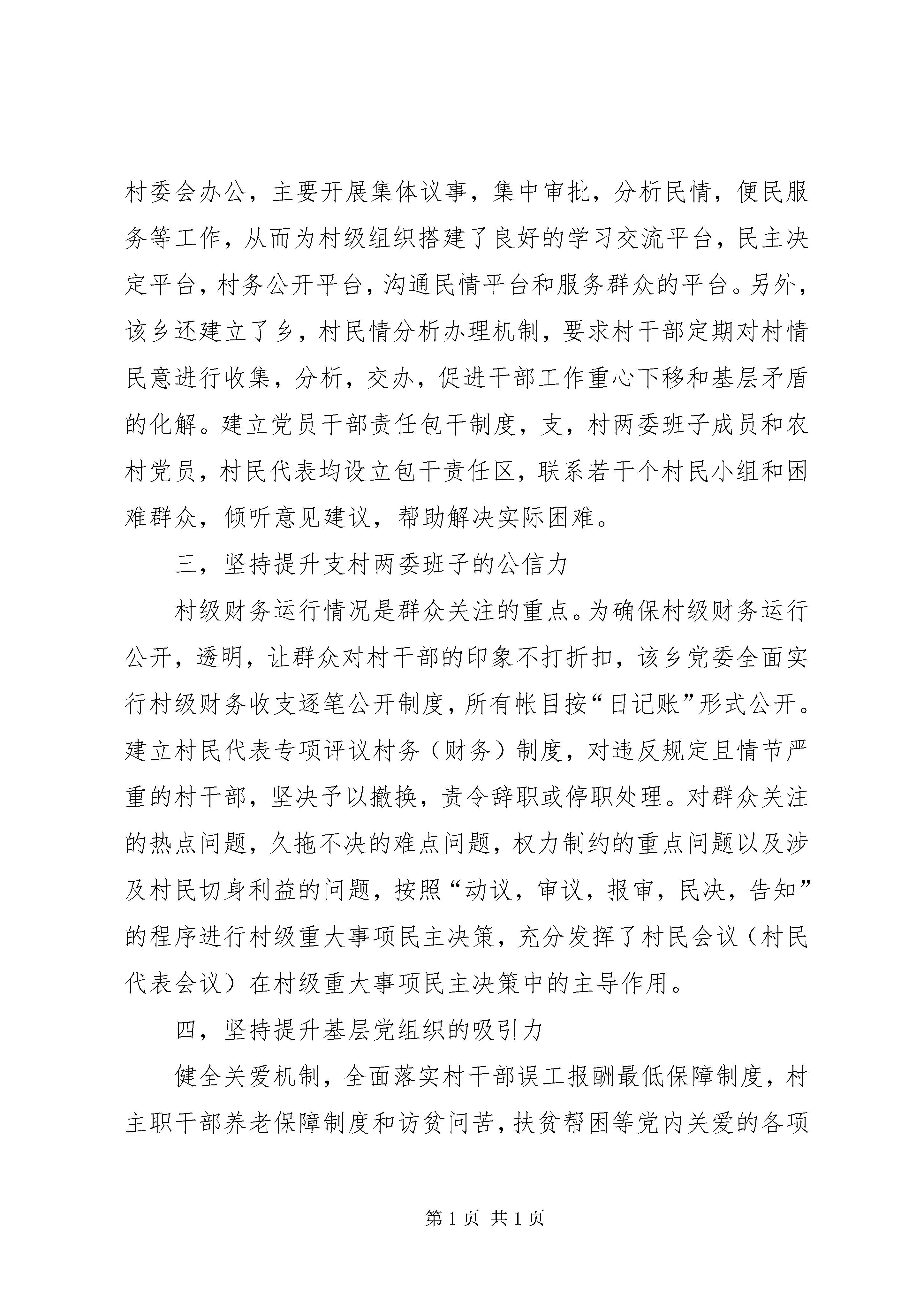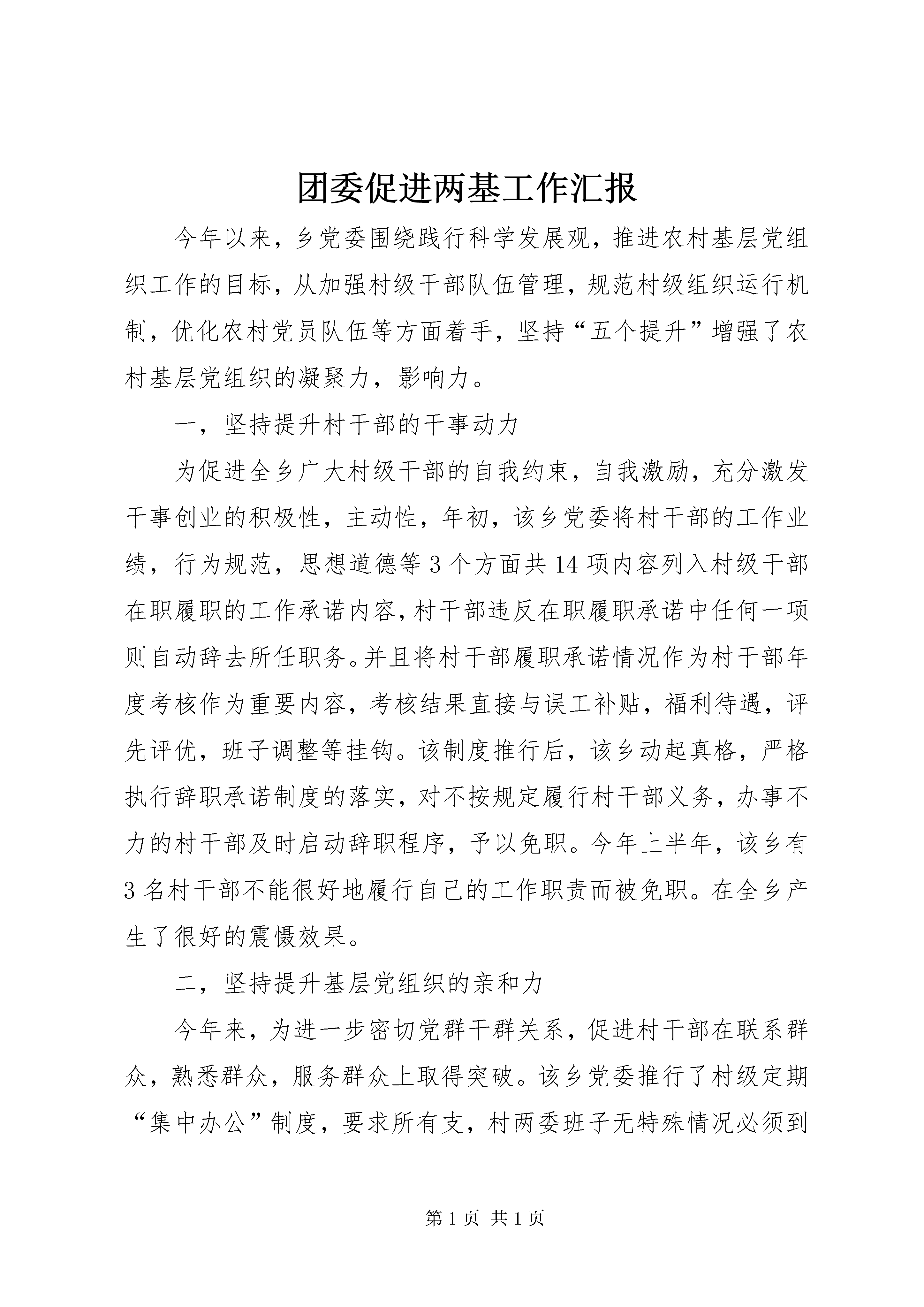 团委促进两基工作汇报今年以来,乡党委围绕践行科学发展观,推进农村基层党组织工作的目标,从加强村级干部队伍管理,规范村级组织运行机制,优化农村党员队伍等方面着手,坚持“五个提升”增强了农村基层党组织的凝聚力,影响力。一,坚持提升村干部的干事动力为促进全乡广大村级干部的自我约束,自我激励,充分激发干事创业的积极性,主动性,年初,该乡党委将村干部的工作业绩,行为规范,思想道德等3个方面共14项内容列入村级干部在职履职的工作承诺内容,村干部违反在职履职承诺中任何一项则自动辞去所任职务。并且将村干部履职承诺情况作为村干部年度考核作为重要内容,考核结果直接与误工补贴,福利待遇,评先评优,班子调整等挂钩。该制度推行后,该乡动起真格,严格执行辞职承诺制度的落实,对不按规定履行村干部义务,办事不力的村干部及时启动辞职程序,予以免职。今年上半年,该乡有3名村干部不能很好地履行自己的工作职责而被免职。在全乡产生了很好的震慑效果。二,坚持提升基层党组织的亲和力今年来,为进一步密切党群干群关系,促进村干部在联系群众,熟悉群众,服务群众上取得突破。该乡党委推行了村级定期“集中办公”制度,要求所有支,村两委班子无特殊情况必须到村委会办公,主要开展集体议事,集中审批,分析民情,便民服务等工作,从而为村级组织搭建了良好的学习交流平台,民主决定平台,村务公开平台,沟通民情平台和服务群众的平台。另外,该乡还建立了乡,村民情分析办理机制,要求村干部定期对村情民意进行收集,分析,交办,促进干部工作重心下移和基层矛盾的化解。建立党员干部责任包干制度,支,村两委班子成员和农村党员,村民代表均设立包干责任区,联系若干个村民小组和困难群众,倾听意见建议,帮助解决实际困难。三,坚持提升支村两委班子的公信力村级财务运行情况是群众关注的重点。为确保村级财务运行公开,透明,让群众对村干部的印象不打折扣,该乡党委全面实行村级财务收支逐笔公开制度,所有帐目按“日记账”形式公开。建立村民代表专项评议村务(财务)制度,对违反规定且情节严重的村干部,坚决予以撤换,责令辞职或停职处理。对群众关注的热点问题,久拖不决的难点问题,权力制约的重点问题以及涉及村民切身利益的问题,按照“动议,审议,报审,民决,告知”的程序进行村级重大事项民主决策,充分发挥了村民会议(村民代表会议)在村级重大事项民主决策中的主导作用。四,坚持提升基层党组织的吸引力健全关爱机制,全面落实村干部误工报酬最低保障制度,村主职干部养老保障制度和访贫问苦,扶贫帮困等党内关爱的各项措施,使农村党员干部在职有报酬,退职有保障,受损有补偿,贫困有救助,让党员干部充分感受到基层党组织的温暖,从而提升了农村干部岗位的吸引力,增强了村干部队伍的稳定性。形成了引导和激励村干部干事创业的导向。建立党内结对帮扶制度,以“一帮一”,“一帮多”的形式,让在岗党员,致富党员与困难党员结成帮扶对子,给予精神鼓励,同时在项目,资金,信息,技术等方面予以全面帮扶,助困难党员早日脱贫脱困五,坚持提升农村党员的影响力为保证农村党员队伍的先进性,该乡党委认真把好党员进入关,全面推行在年纪轻,文化程度高,“双带”能力强的农村优秀人才中发展党员,今年该乡党委共发展素质忧,能力强,口碑好的中共预备党员21名,确保了农村新党员的质量。同时,该乡党委还积极推行了农村流动党员外出登记,行前教育,联系通报,回归报告等四项制度,对不合格党员,采取诫勉谈话,限期整改等帮教措施,对多次教育不改,不符合党员条件的,根据党章和有关规定予以处理,今年6月该乡党委根据《党内处分条例》对李家村村民李强作出了开除党籍的处理决定。